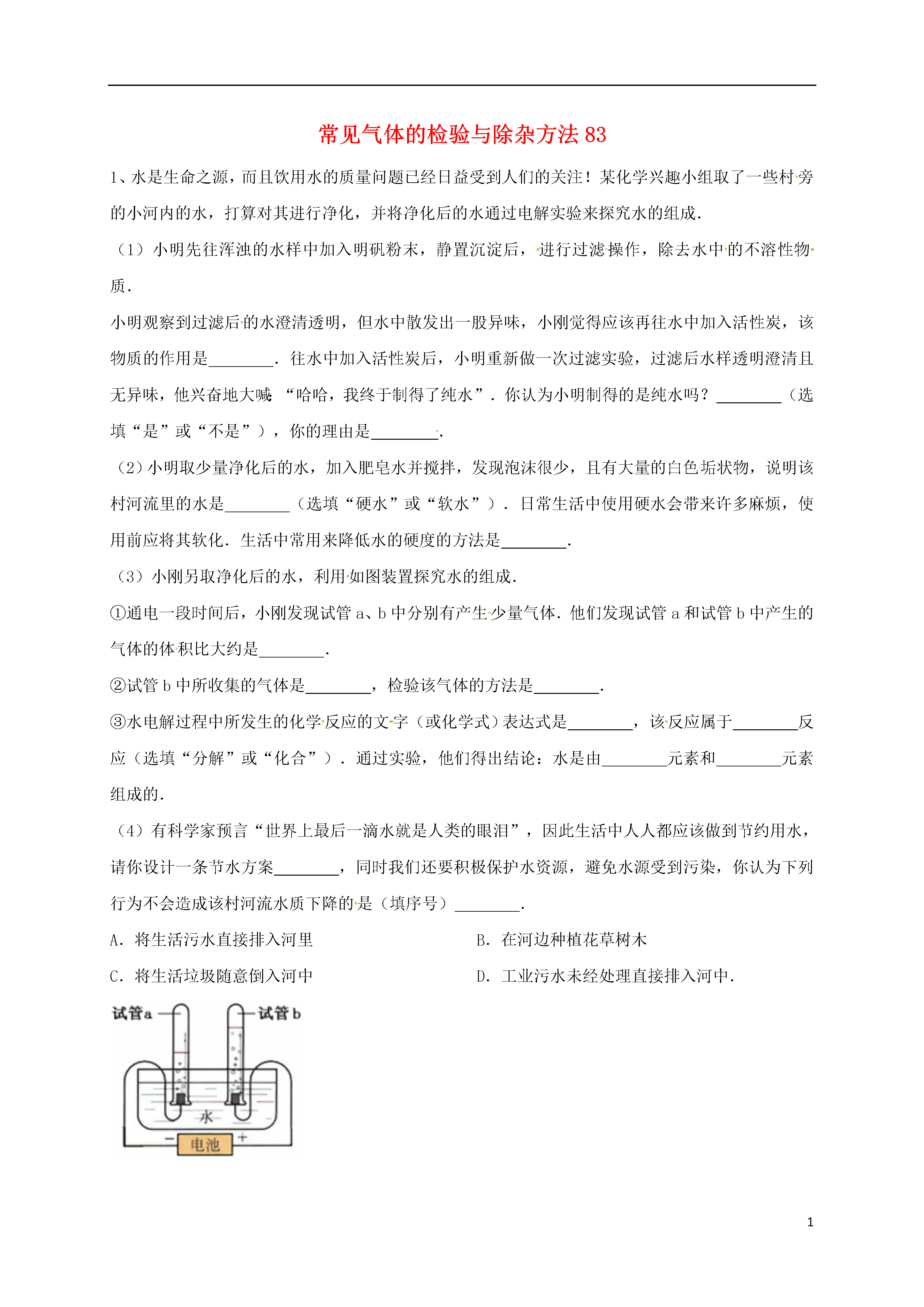 1常见气体的检验与除杂方法831、水是生命之源,而且饮用水的质量问题已经日益受到人们的关注!某化学兴趣小组取了一些村旁的小河内的水,打算对其进行净化,并将净化后的水通过电解实验来探究水的组成.(1)小明先往浑浊的水样中加入明矾粉末,静置沉淀后,进行过滤操作,除去水中的不溶性物质.小明观察到过滤后的水澄清透明,但水中散发出一股异味,小刚觉得应该再往水中加入活性炭,该物质的作用是.往水中加入活性炭后,小明重新做一次过滤实验,过滤后水样透明澄清且无异味,他兴奋地大喊:“哈哈,我终于制得了纯水”.你认为小明制得的是纯水吗?(选填“是”或“不是”),你的理由是.(2)小明取少量净化后的水,加入肥皂水并搅拌,发现泡沫很少,且有大量的白色垢状物,说明该村河流里的水是(选填“硬水”或“软水”).日常生活中使用硬水会带来许多麻烦,使用前应将其软化.生活中常用来降低水的硬度的方法是.(3)小刚另取净化后的水,利用如图装置探究水的组成.①通电一段时间后,小刚发现试管a、b中分别有产生少量气体.他们发现试管a和试管b中产生的气体的体积比大约是.②试管b中所收集的气体是,检验该气体的方法是.③水电解过程中所发生的化学反应的文字(或化学式)表达式是,该反应属于反应(选填“分解”或“化合”).通过实验,他们得出结论:水是由元素和元素组成的.(4)有科学家预言“世界上最后一滴水就是人类的眼泪”,因此生活中人人都应该做到节约用水,请你设计一条节水方案,同时我们还要积极保护水资源,避免水源受到污染,你认为下列行为不会造成该村河流水质下降的是(填序号).A.将生活污水直接排入河里B.在河边种植花草树木C.将生活垃圾随意倒入河中D.工业污水未经处理直接排入河中.