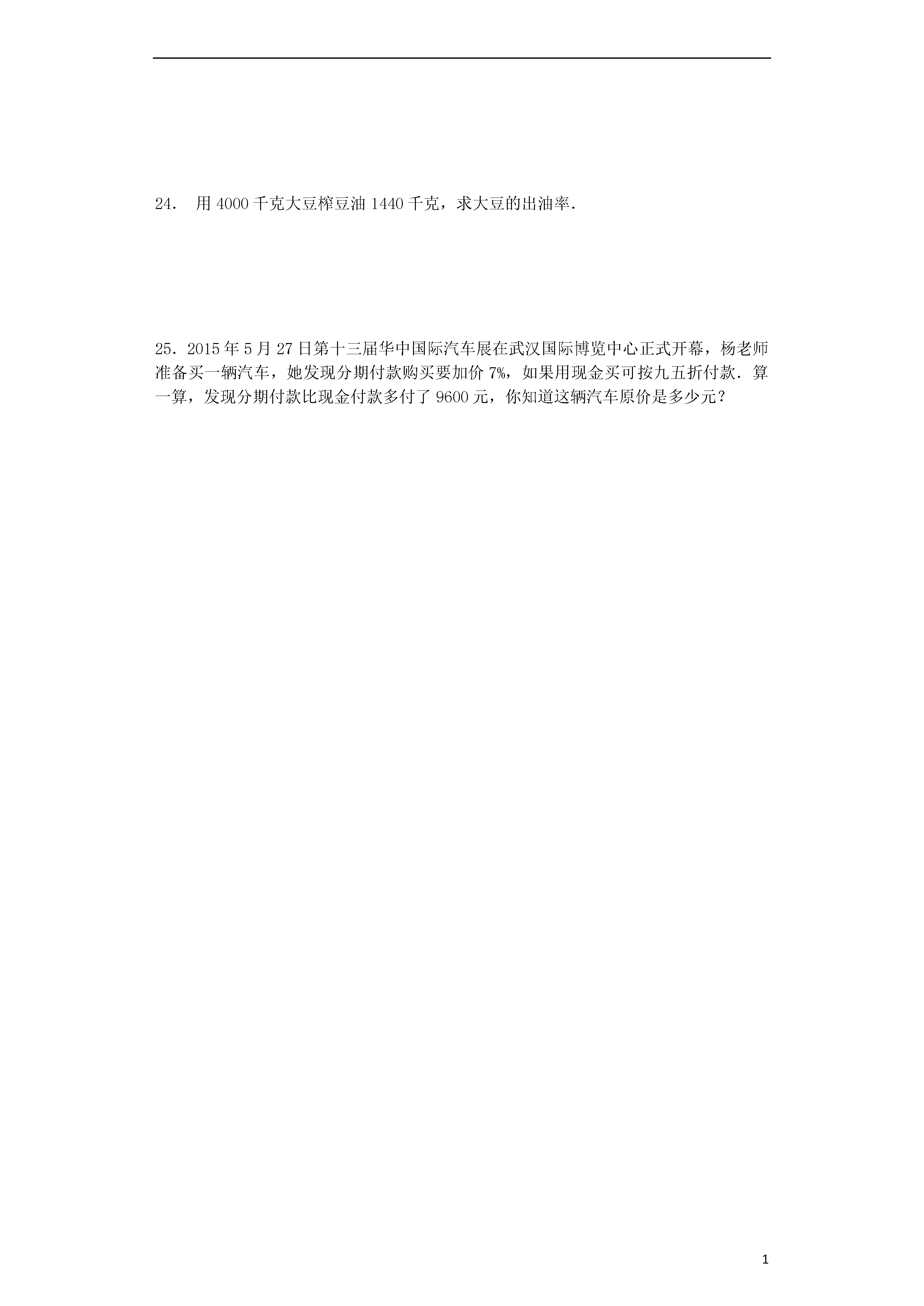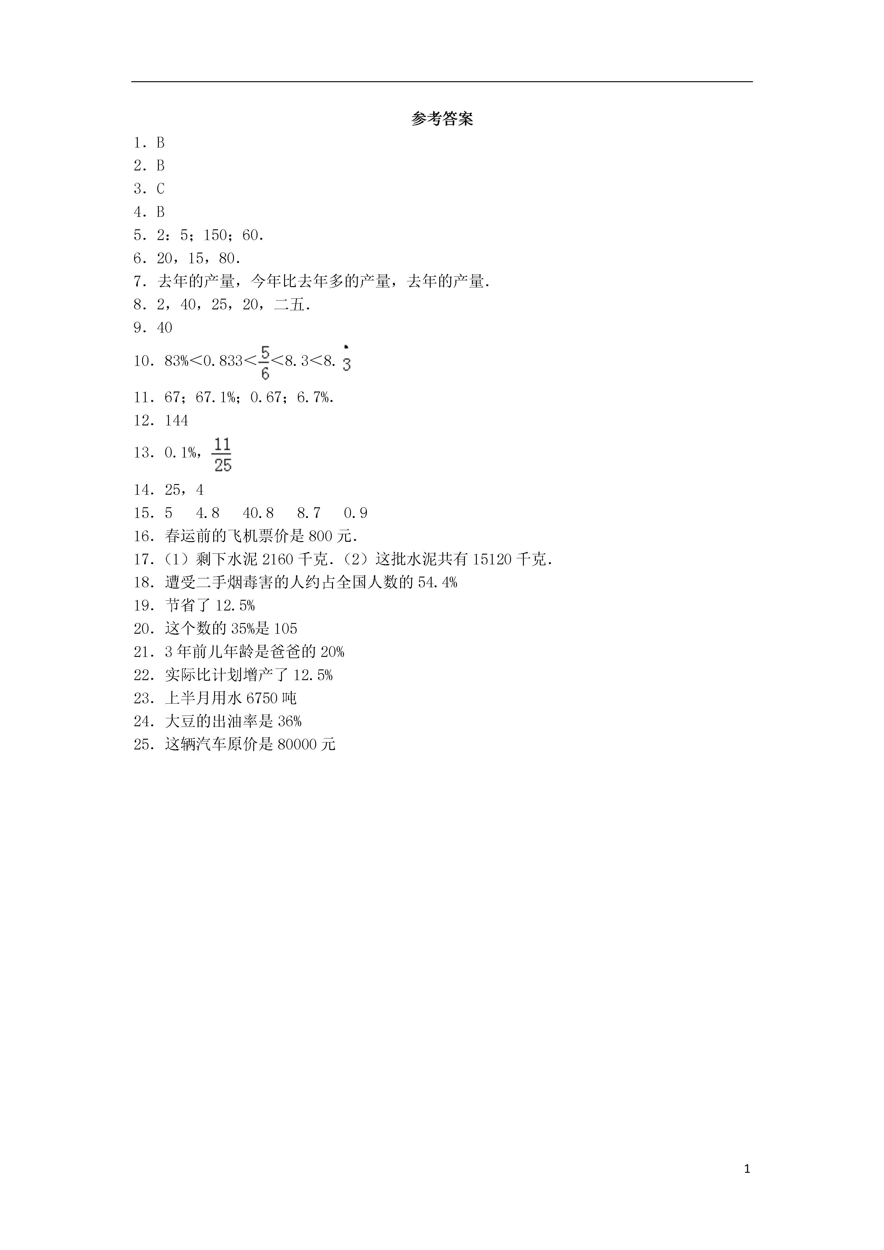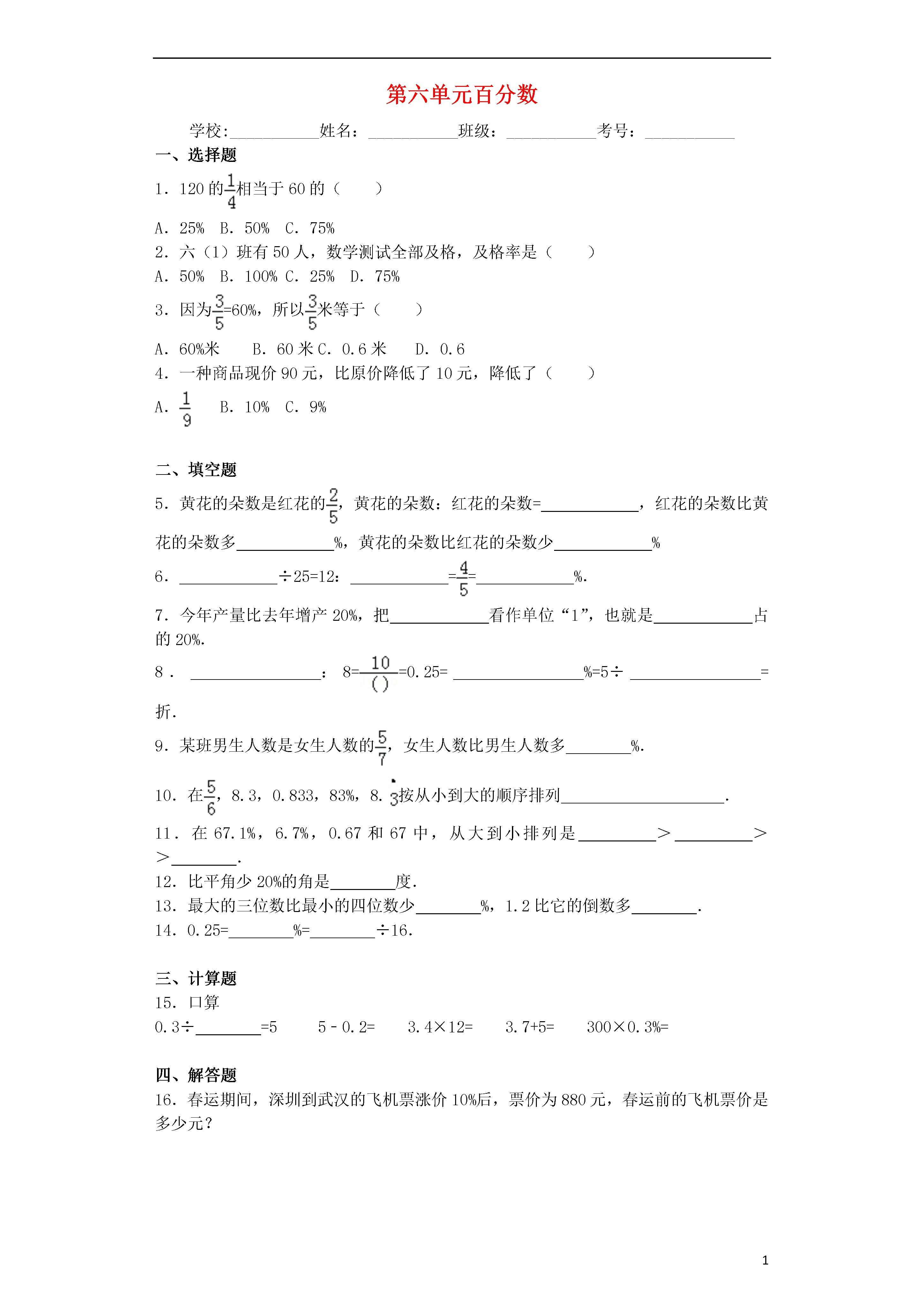 试卷,总3页1第六单元百分数学校:___________姓名:___________班级:___________考号:___________一、选择题1.120的相当于60的()A.25%B.50%C.75%2.六(1)班有50人,数学测试全部及格,及格率是()A.50%B.100%C.25%D.75%3.因为=60%,所以米等于()A.60%米B.60米C.0.6米D.0.64.一种商品现价90元,比原价降低了10元,降低了()A.B.10%C.9%二、填空题5.黄花的朵数是红花的,黄花的朵数:红花的朵数=,红花的朵数比黄花的朵数多%,黄花的朵数比红花的朵数少%6.÷25=12:==%.7.今年产量比去年增产20%,把看作单位“1”,也就是占的20%.8.:8==0.25=%=5÷=折.9.某班男生人数是女生人数的,女生人数比男生人数多%.10.在,8.3,0.833,83%,8.按从小到大的顺序排列.11.在67.1%,6.7%,0.67和67中,从大到小排列是>>>.12.比平角少20%的角是度.13.最大的三位数比最小的四位数少%,1.2比它的倒数多.14.0.25=%=÷16.三、计算题15.口算0.3÷=55﹣0.2=3.4×12=3.7+5=300×0.3%=四、解答题16.春运期间,深圳到武汉的飞机票涨价10%后,票价为880元,春运前的飞机票价是多少元?17.建筑工地有一批水泥,第一次用去7200千克,比第二次多用,剩下的水泥是第一次用去的30%,问(1)剩下水泥多少千克?这批水泥共有多少千克?“你有吸烟的自由,但你不能自由吸烟.”日前,国务院法制办公布《公共场所控制吸烟条例》,称为“最强禁烟令”.我国人口总数大约有13.6亿,据统计大约有3.6亿人吸烟,大约有7.4亿人不吸烟却遭受二手烟的毒害,那么遭受二手烟毒害的人占全国人数的百分之几?某校建房设计投资64万元,实际投资56万元,节省了百分之几?一个数的是240,求这个数的35%是多少?爸爸今年43岁,女儿今年11岁,几年前女儿年龄是爸爸的20%?洗衣机厂去年生产洗衣机5400台,比计划多生产600台,实际比计划增产了百分之几?某工厂四月份下半月用水5400吨,比上半月节约20%,上半月用水多少吨?用4000千克大豆榨豆油1440千克,求大豆的出油率.25.2015年5月27日第十三届华中国际汽车展在武汉国际博览中心正式开幕,杨老师准备买一辆汽车,她发现分期付款购买要加价7%,如果用现金买可按九五折付款.算一算,发现分期付款比现金付款多付了9600元,你知道这辆汽车原价是多少元?参考答案1.B2.B3.C4.B5.2:5;150;60.6.20,15,80.7.去年的产量,今年比去年多的产量,去年的产量.8.2,40,25,20,二五.9.4010.83%<0.833<<8.3<8.11.67;67.1%;0.67;6.7%.12.14413.0.1%,14.25,415.54.840.88.70.916.春运前的飞机票价是800元.17.(1)剩下水泥2160千克.(2)这批水泥共有15120千克.18.遭受二手烟毒害的人约占全国人数的54.4%19.节省了12.5%20.这个数的35%是10521.3年前儿年龄是爸爸的20%22.实际比计划增产了12.5%23.上半月用水6750吨24.大豆的出油率是36%25.这辆汽车原价是80000元