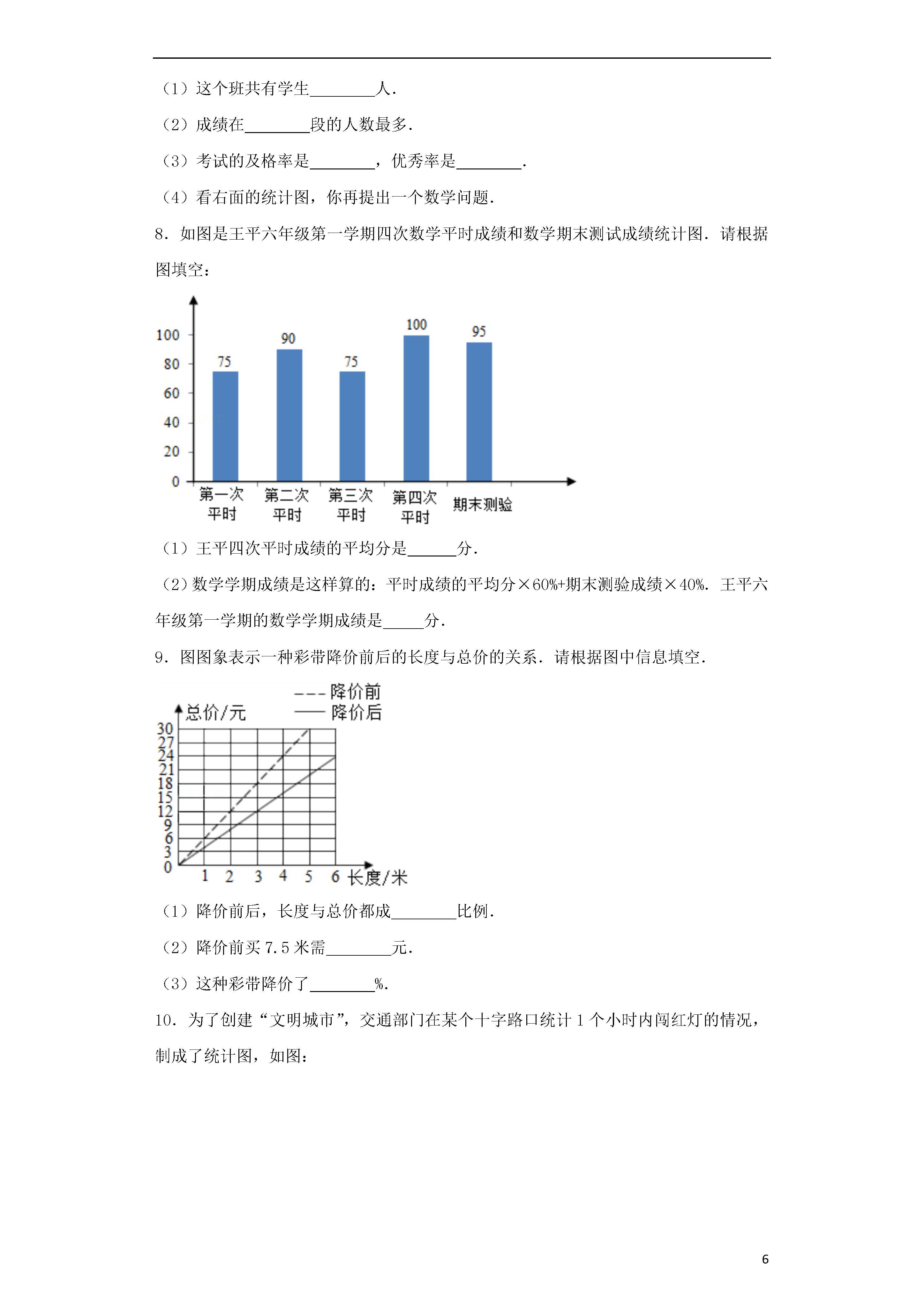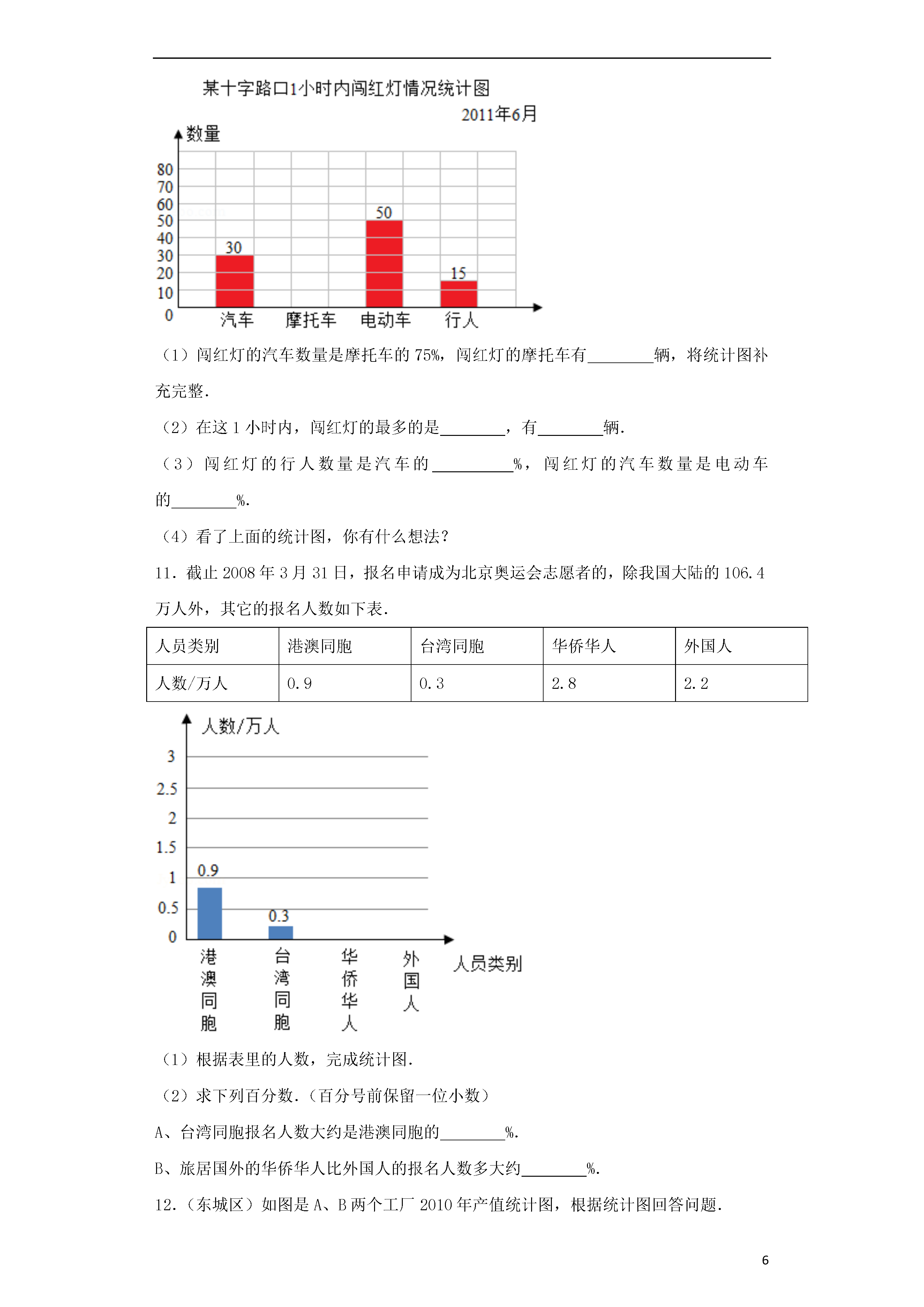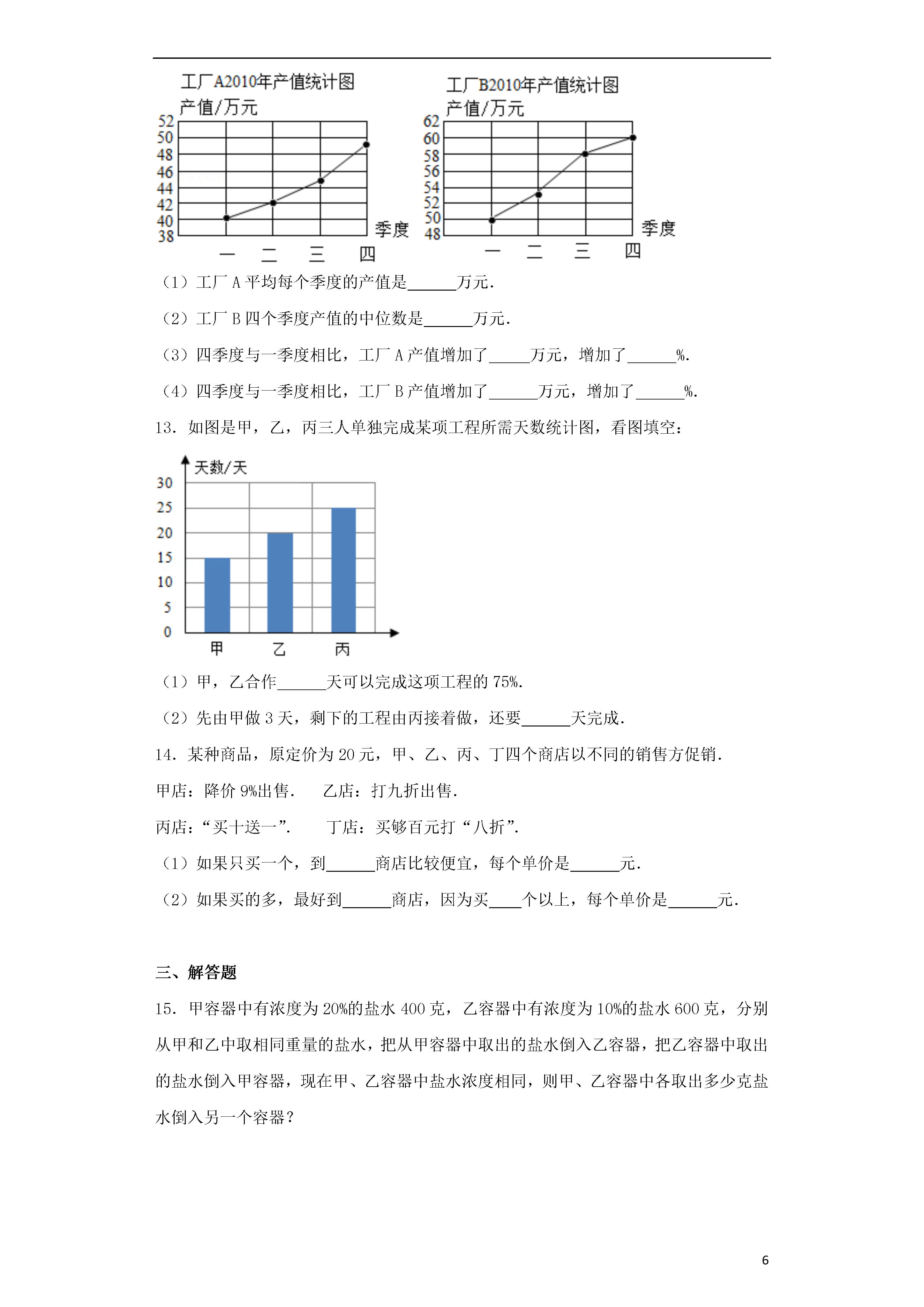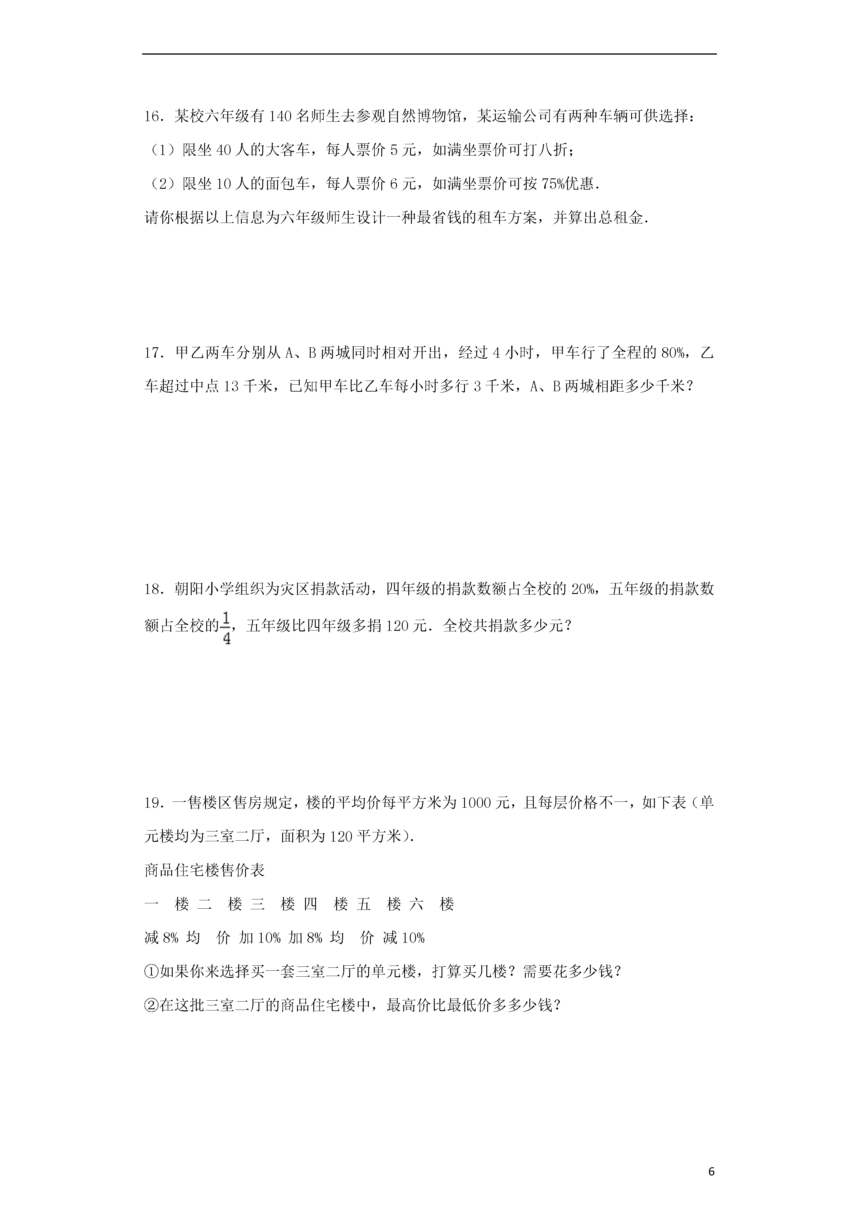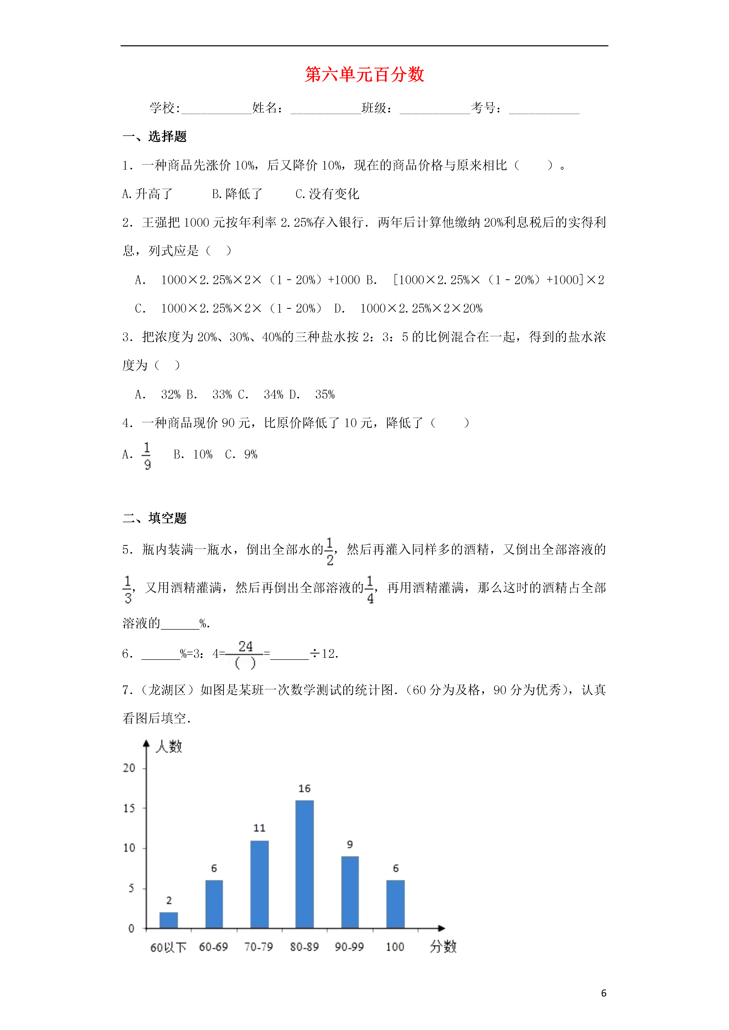试卷,总3页6第六单元百分数学校:___________姓名:___________班级:___________考号:___________一、选择题1.一种商品先涨价10%,后又降价10%,现在的商品价格与原来相比()。A.升高了B.降低了C.没有变化2.王强把1000元按年利率2.25%存入银行.两年后计算他缴纳20%利息税后的实得利息,列式应是()A.1000×2.25%×2×(1﹣20%)+1000B.[1000×2.25%×(1﹣20%)+1000]×2C.1000×2.25%×2×(1﹣20%)D.1000×2.25%×2×20%3.把浓度为20%、30%、40%的三种盐水按2:3:5的比例混合在一起,得到的盐水浓度为()A.32%B.33%C.34%D.35%4.一种商品现价90元,比原价降低了10元,降低了()A.B.10%C.9%二、填空题5.瓶内装满一瓶水,倒出全部水的,然后再灌入同样多的酒精,又倒出全部溶液的,又用酒精灌满,然后再倒出全部溶液的,再用酒精灌满,那么这时的酒精占全部溶液的%.6.%=3:4==÷12.7.(龙湖区)如图是某班一次数学测试的统计图.(60分为及格,90分为优秀),认真看图后填空.(1)这个班共有学生人.(2)成绩在段的人数最多.(3)考试的及格率是,优秀率是.(4)看右面的统计图,你再提出一个数学问题.8.如图是王平六年级第一学期四次数学平时成绩和数学期末测试成绩统计图.请根据图填空:(1)王平四次平时成绩的平均分是分.(2)数学学期成绩是这样算的:平时成绩的平均分×60%+期末测验成绩×40%.王平六年级第一学期的数学学期成绩是分.9.图图象表示一种彩带降价前后的长度与总价的关系.请根据图中信息填空.(1)降价前后,长度与总价都成比例.(2)降价前买7.5米需元.(3)这种彩带降价了%.10.为了创建“文明城市”,交通部门在某个十字路口统计1个小时内闯红灯的情况,制成了统计图,如图:(1)闯红灯的汽车数量是摩托车的75%,闯红灯的摩托车有辆,将统计图补充完整.(2)在这1小时内,闯红灯的最多的是,有辆.(3)闯红灯的行人数量是汽车的%,闯红灯的汽车数量是电动车的%.(4)看了上面的统计图,你有什么想法?11.截止2008年3月31日,报名申请成为北京奥运会志愿者的,除我国大陆的106.4万人外,其它的报名人数如下表.人员类别港澳同胞台湾同胞华侨华人外国人人数/万人0.90.32.82.2(1)根据表里的人数,完成统计图.(2)求下列百分数.(百分号前保留一位小数)A、台湾同胞报名人数大约是港澳同胞的%.B、旅居国外的华侨华人比外国人的报名人数多大约%.12.(东城区)如图是A、B两个工厂2010年产值统计图,根据统计图回答问题.(1)工厂A平均每个季度的产值是万元.(2)工厂B四个季度产值的中位数是万元.(3)四季度与一季度相比,工厂A产值增加了万元,增加了%.(4)四季度与一季度相比,工厂B产值增加了万元,增加了%.13.如图是甲,乙,丙三人单独完成某项工程所需天数统计图,看图填空:(1)甲,乙合作天可以完成这项工程的75%.(2)先由甲做3天,剩下的工程由丙接着做,还要天完成.14.某种商品,原定价为20元,甲、乙、丙、丁四个商店以不同的销售方促销.甲店:降价9%出售.乙店:打九折出售.丙店:“买十送一”.丁店:买够百元打“八折”.(1)如果只买一个,到商店比较便宜,每个单价是元.(2)如果买的多,最好到商店,因为买个以上,每个单价是元.三、解答题15.甲容器中有浓度为20%的盐水400克,乙容器中有浓度为10%的盐水600克,分别从甲和乙中取相同重量的盐水,把从甲容器中取出的盐水倒入乙容器,把乙容器中取出的盐水倒入甲容器,现在甲、乙容器中盐水浓度相同,则甲、乙容器中各取出多少克盐水倒入另一个容器?16.某校六年级有140名师生去参观自然博物馆,某运输公司有两种车辆可供选择:(1)限坐40人的大客车,每人票价5元,如满坐票价可打八折;限坐10人的面包车,每人票价6元,如满坐票价可按75%优惠.请你根据以上信息为六年级师生设计一种最省钱的租车方案,并算出总租金.甲乙两车分别从A、B两城同时相对开出,经过4小时,甲车行了全程的80%,乙车超过中点13千米,已知甲车比乙车每小时多行3千米,A、B两城相距多少千米?朝阳小学组织为灾区捐款活动,四年级的捐款数额占全校的20%,五年级的捐款数额占全校的,五年级比四年级多捐120元.全校共捐款多少元?19.一售楼区售房规定,楼的平均价每平方米为1000
