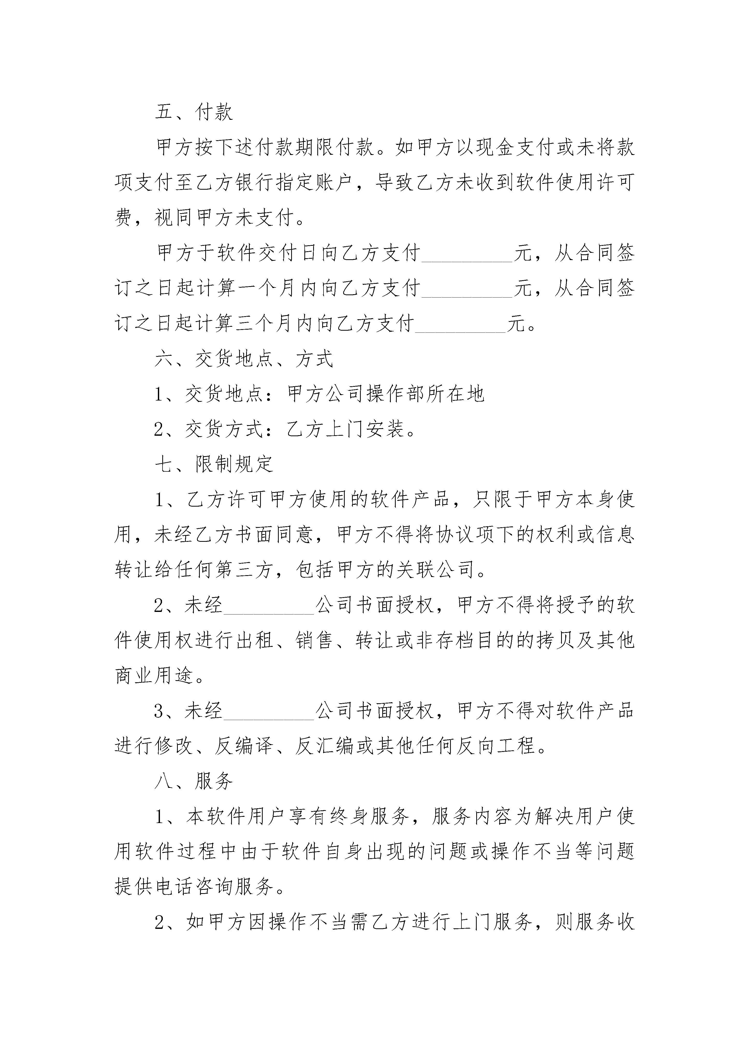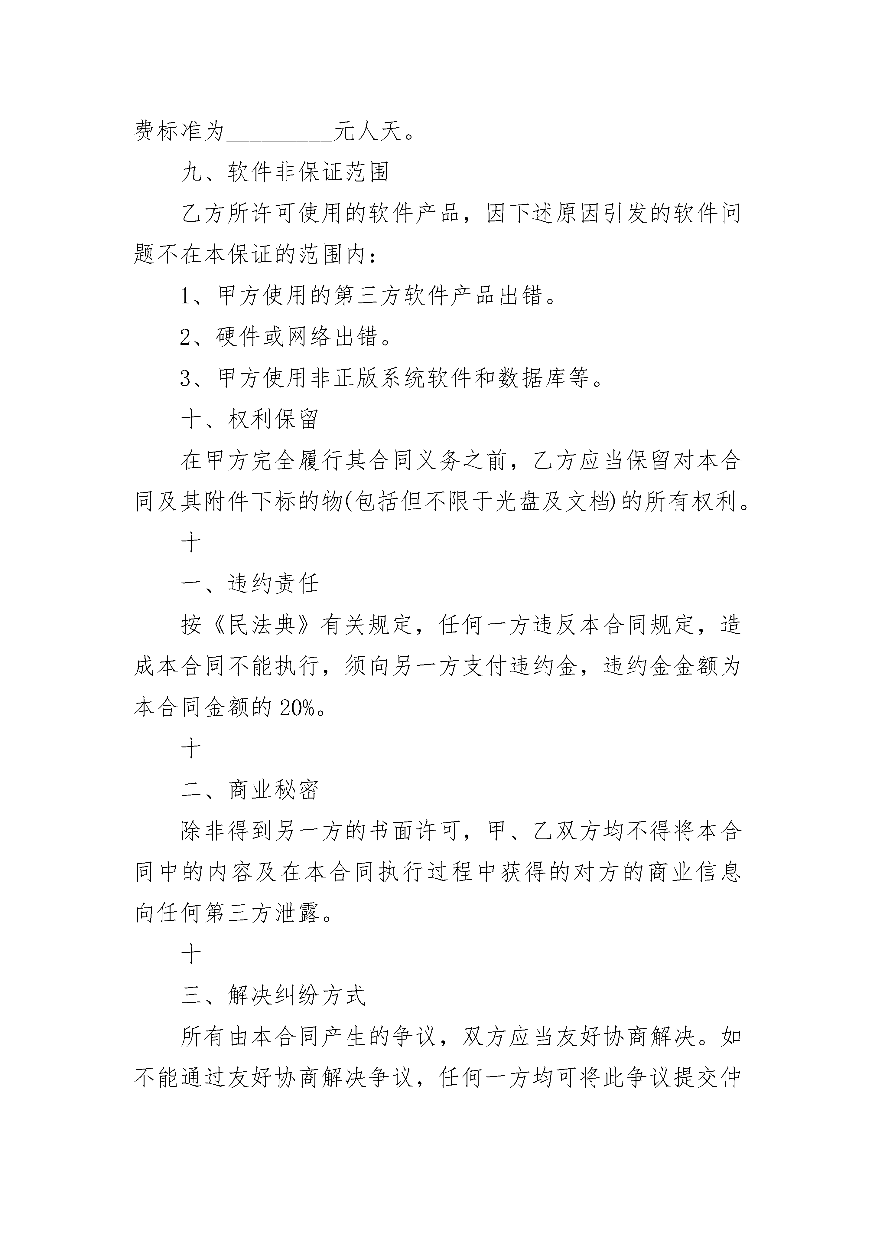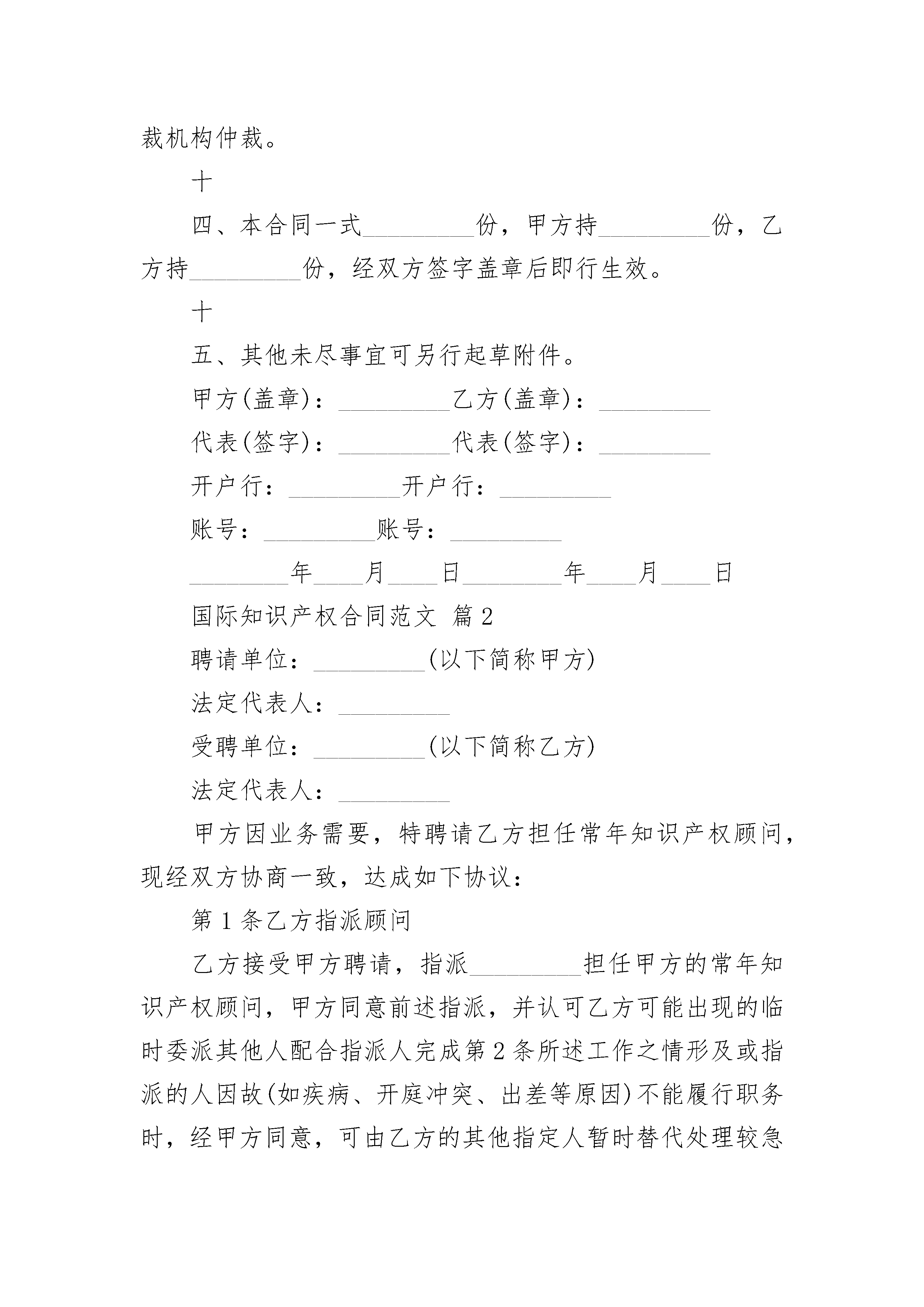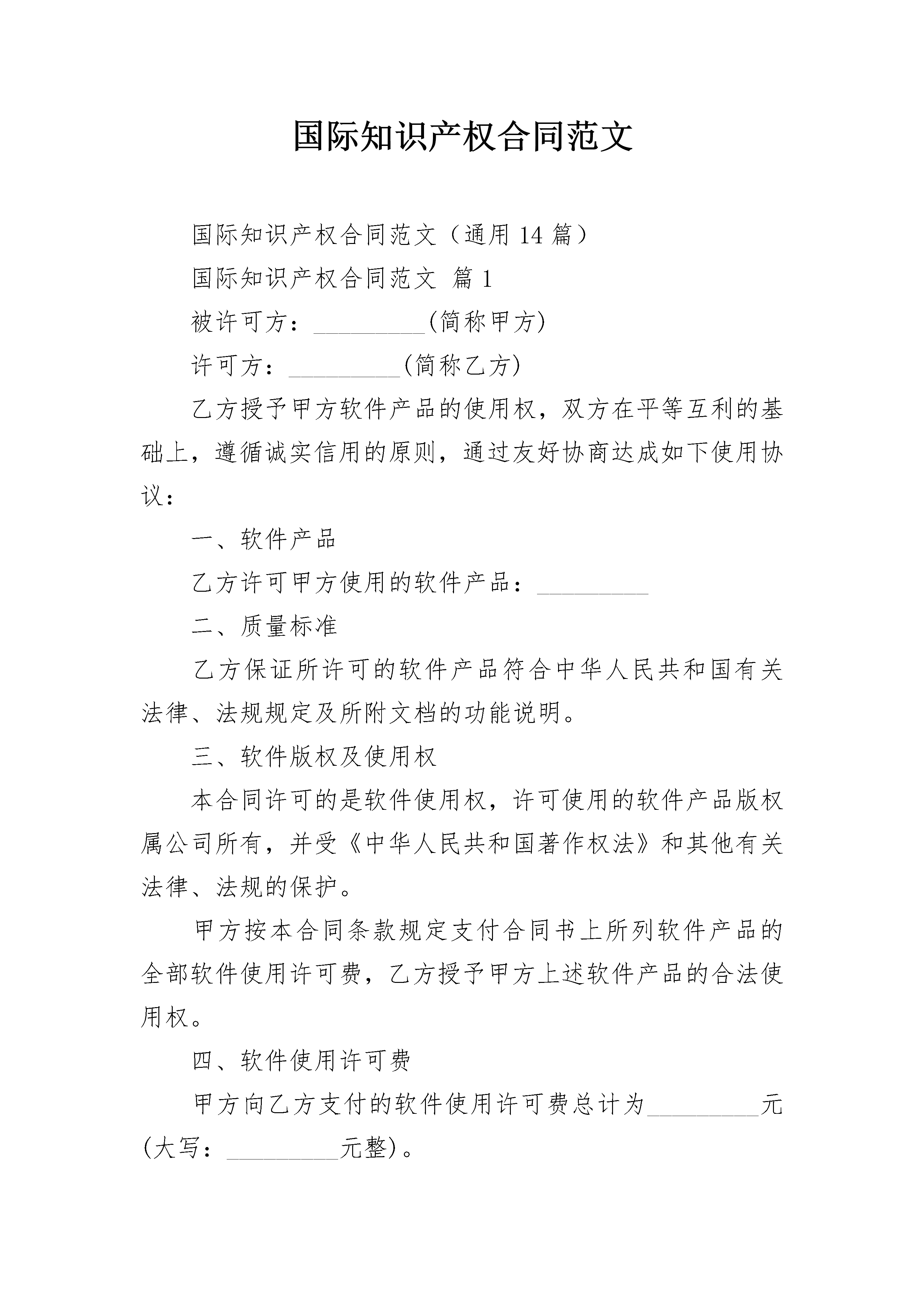 国际知识产权合同范文国际知识产权合同范文(通用14篇)国际知识产权合同范文篇1被许可方:_________(简称甲方)许可方:_________(简称乙方)乙方授予甲方软件产品的使用权,双方在平等互利的基础上,遵循诚实信用的原则,通过友好协商达成如下使用协议:一、软件产品乙方许可甲方使用的软件产品:_________二、质量标准乙方保证所许可的软件产品符合中华人民共和国有关法律、法规规定及所附文档的功能说明。三、软件版权及使用权本合同许可的是软件使用权,许可使用的软件产品版权属公司所有,并受《中华人民共和国著作权法》和其他有关法律、法规的保护。甲方按本合同条款规定支付合同书上所列软件产品的全部软件使用许可费,乙方授予甲方上述软件产品的合法使用权。四、软件使用许可费甲方向乙方支付的软件使用许可费总计为_________元(大写:_________元整)。五、付款甲方按下述付款期限付款。如甲方以现金支付或未将款项支付至乙方银行指定账户,导致乙方未收到软件使用许可费,视同甲方未支付。甲方于软件交付日向乙方支付_________元,从合同签订之日起计算一个月内向乙方支付_________元,从合同签订之日起计算三个月内向乙方支付_________元。六、交货地点、方式1、交货地点:甲方公司操作部所在地2、交货方式:乙方上门安装。七、限制规定1、乙方许可甲方使用的软件产品,只限于甲方本身使用,未经乙方书面同意,甲方不得将协议项下的权利或信息转让给任何第三方,包括甲方的关联公司。2、未经_________公司书面授权,甲方不得将授予的软件使用权进行出租、销售、转让或非存档目的的拷贝及其他商业用途。3、未经_________公司书面授权,甲方不得对软件产品进行修改、反编译、反汇编或其他任何反向工程。八、服务1、本软件用户享有终身服务,服务内容为解决用户使用软件过程中由于软件自身出现的问题或操作不当等问题提供电话咨询服务。2、如甲方因操作不当需乙方进行上门服务,则服务收费标准为_________元人天。九、软件非保证范围乙方所许可使用的软件产品,因下述原因引发的软件问题不在本保证的范围内:1、甲方使用的第三方软件产品出错。2、硬件或网络出错。3、甲方使用非正版系统软件和数据库等。十、权利保留在甲方完全履行其合同义务之前,乙方应当保留对本合同及其附件下标的物(包括但不限于光盘及文档)的所有权利。十一、违约责任按《民法典》有关规定,任何一方违反本合同规定,造成本合同不能执行,须向另一方支付违约金,违约金金额为本合同金额的20%。十二、商业秘密除非得到另一方的书面许可,甲、乙双方均不得将本合同中的内容及在本合同执行过程中获得的对方的商业信息向任何第三方泄露。十三、解决纠纷方式所有由本合同产生的争议,双方应当友好协商解决。如不能通过友好协商解决争议,任何一方均可将此争议提交仲裁机构仲裁。十四、本合同一式_________份,甲方持_________份,乙方持_________份,经双方签字盖章后即行生效。十五、其他未尽事宜可另行起草附件。甲方(盖章):_________乙方(盖章):_________代表(签字):_________代表(签字):_________开户行:_________开户行:_________账号:_________账号:_________________年____月____日________年____月____日国际知识产权合同范文篇2聘请单位:_________(以下简称甲方)法定代表人:_________受聘单位:_________(以下简称乙方)法定代表人:_________甲方因业务需要,特聘请乙方担任常年知识产权顾问,现经双方协商一致,达成如下协议:第1条乙方指派顾问乙方接受甲方聘请,指派_________担任甲方的常年知识产权顾问,甲方同意前述指派,并认可乙方可能出现的临时委派其他人配合指派人完成第2条所述工作之情形及或指派的人因故(如疾病、开庭冲突、出差等原因)不能履行职务时,经甲方同意,可由乙方的其他指定人暂时替代处理较急的事务。但乙方更换指派必须经甲方同意。第2条甲方的服务范围日常法律范围:2.1就甲方日常涉及的法律问题口头或书面解答法律咨询、提出法律建议或出具法律意见书;2.2审查、修改甲方因商务活动与第三方签署的各类合同、协议书或其他法律文件;提出修改意见及法律建议;2.3应甲方要求,对甲方签署的各种法律文书进行见证;2.4协助甲方参与较为重大商务活动的谈判、磋商,并提供分析论证;2.5受甲方委托,签署、送达或者代为收领法律文件;2.6受甲方委托,保管甲方要求乙方妥善保管的法律文件;2.7就甲方已经、面临和或可能发生的纠纷进行法律论证,提出解决方案,出具法律意见书;2.8受甲方委托,向侵害、损害甲方合
