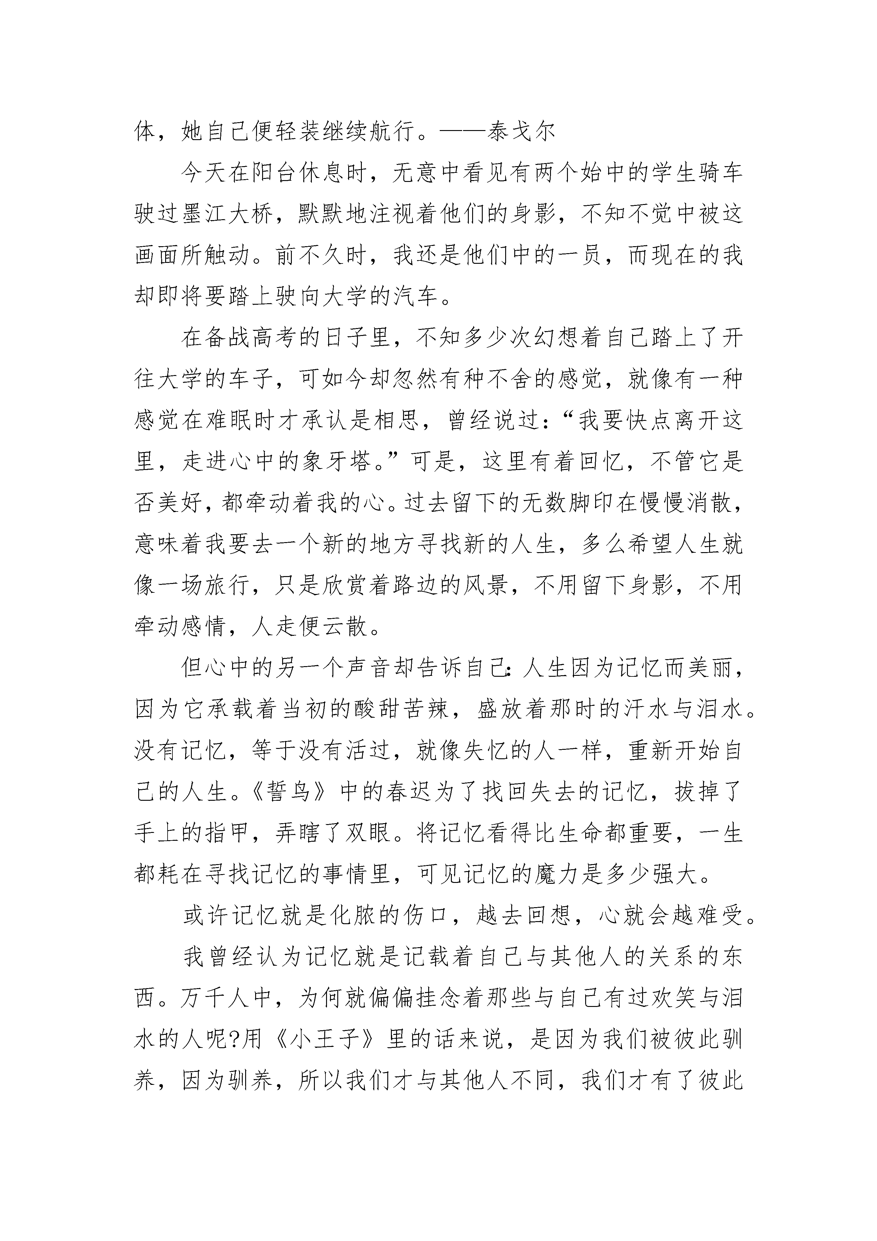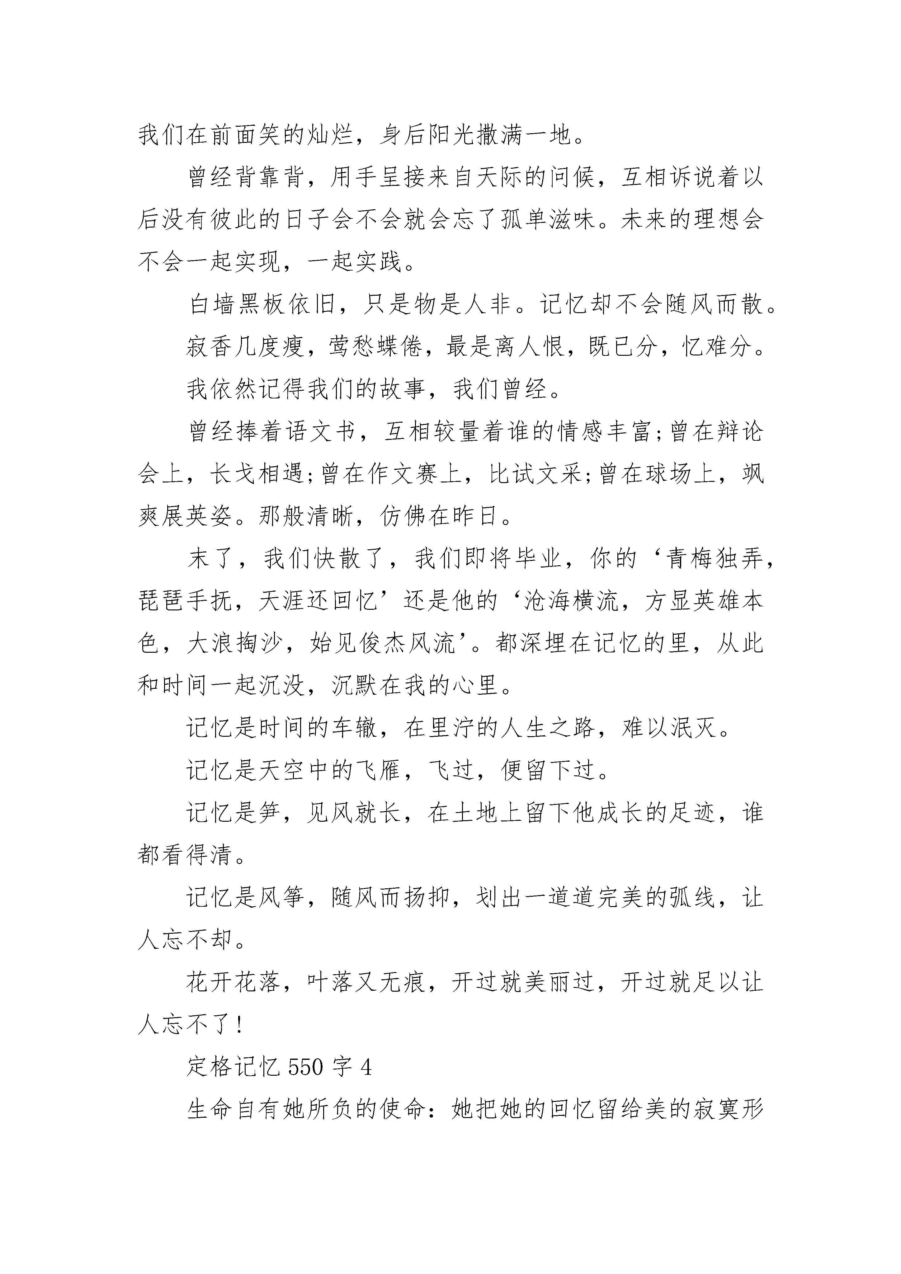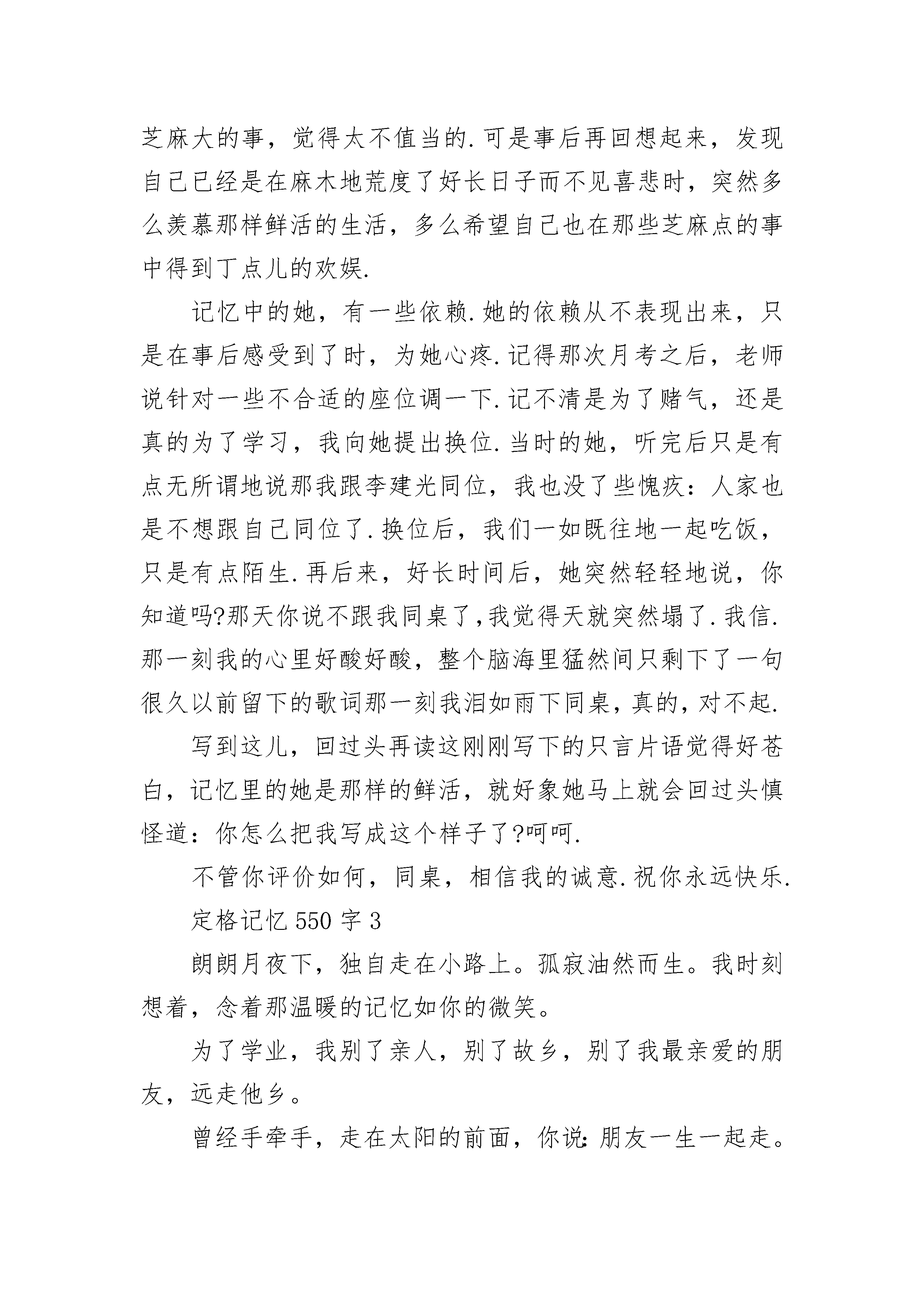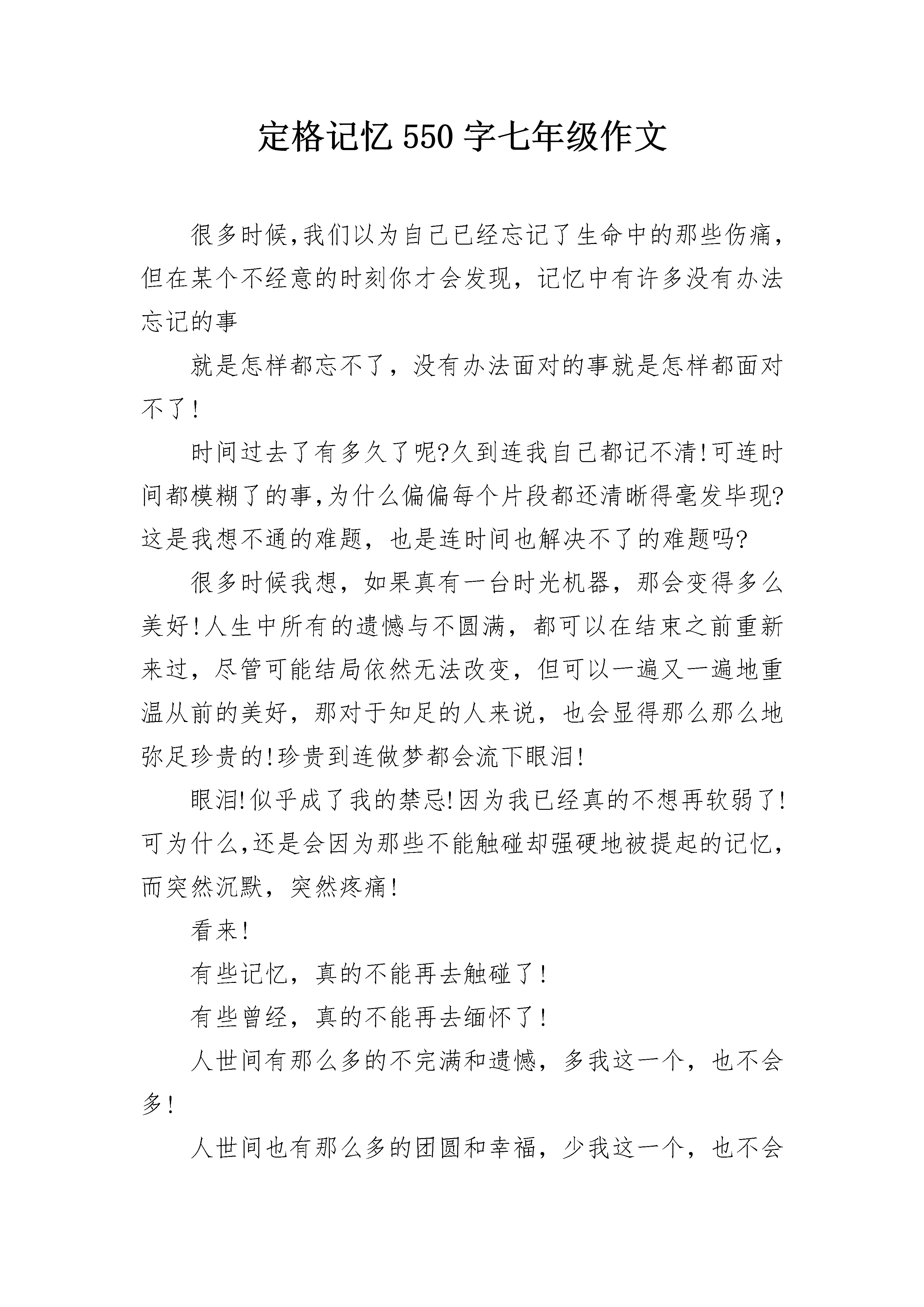 定格记忆550字七年级作文很多时候,我们以为自己已经忘记了生命中的那些伤痛,但在某个不经意的时刻你才会发现,记忆中有许多没有办法忘记的事就是怎样都忘不了,没有办法面对的事就是怎样都面对不了!时间过去了有多久了呢?久到连我自己都记不清!可连时间都模糊了的事,为什么偏偏每个片段都还清晰得毫发毕现?这是我想不通的难题,也是连时间也解决不了的难题吗?很多时候我想,如果真有一台时光机器,那会变得多么美好!人生中所有的遗憾与不圆满,都可以在结束之前重新来过,尽管可能结局依然无法改变,但可以一遍又一遍地重温从前的美好,那对于知足的人来说,也会显得那么那么地弥足珍贵的!珍贵到连做梦都会流下眼泪!眼泪!似乎成了我的禁忌!因为我已经真的不想再软弱了!可为什么,还是会因为那些不能触碰却强硬地被提起的记忆,而突然沉默,突然疼痛!看来!有些记忆,真的不能再去触碰了!有些曾经,真的不能再去缅怀了!人世间有那么多的不完满和遗憾,多我这一个,也不会多!人世间也有那么多的团圆和幸福,少我这一个,也不会少!定格记忆550字2很久之前就想好好为她写点东西,我并没有什么才华,只是想用最平实的语调记下最真实的她。怎么说呢,我想她是单纯,简单却又有些专横的吧.总是不知道自己去争取,自己去要求,只是在一切都已经过去了之后再爱惜。记得刚开学时,不知怎么样站的队,然后找了一个位子。再然后忽然发现同桌是一个胖胖的女生。短发,胖胖的脸蛋儿把眼睛挤成一条缝儿,两个大大的虎牙平添了几分蛮横。她很好。是的,我想在不是同桌的日子里,好是我对她的最多的描述.她会在我自言自语,或是胡言乱语时认真地听,然后因为那些值得或不值得的事开怀地笑.我想我们的个性中总是有一些是相同的,以至于到了后来我都分不清自己是挑剔她,还是挑剔自己.同桌很爱吃.不论是零食还是主食.闭上眼睛,眼前的她好象仍然是紧紧地握着酸奶瓶,油亮亮的眼珠兴奋地滴溜溜转个不停,一口一口仔细地在上课时偷偷地喝...在即将到来的新日子里,不知道她是否还会在寝室里守着一堆零食跟对床拼吃?不知道她是否还会在被发现偷吃东西时此地无银三百两地捂住填的满满的嘴。同桌的她真的很聪明,对于数学,物理等总让女生们头疼的课程似乎有着天生的聪慧.可是一谈起政治等就寥寥了.记忆中的她,就好象永远都带着一些固执与倔强,会在课间不停地抱怨气死了,气死了,问清原因,也不过是点点芝麻大的事,觉得太不值当的.可是事后再回想起来,发现自己已经是在麻木地荒度了好长日子而不见喜悲时,突然多么羡慕那样鲜活的生活,多么希望自己也在那些芝麻点的事中得到丁点儿的欢娱.记忆中的她,有一些依赖.她的依赖从不表现出来,只是在事后感受到了时,为她心疼.记得那次月考之后,老师说针对一些不合适的座位调一下.记不清是为了赌气,还是真的为了学习,我向她提出换位.当时的她,听完后只是有点无所谓地说那我跟李建光同位,我也没了些愧疚:人家也是不想跟自己同位了.换位后,我们一如既往地一起吃饭,只是有点陌生.再后来,好长时间后,她突然轻轻地说,你知道吗?那天你说不跟我同桌了,我觉得天就突然塌了.我信.那一刻我的心里好酸好酸,整个脑海里猛然间只剩下了一句很久以前留下的歌词那一刻我泪如雨下同桌,真的,对不起.写到这儿,回过头再读这刚刚写下的只言片语觉得好苍白,记忆里的她是那样的鲜活,就好象她马上就会回过头慎怪道:你怎么把我写成这个样子了?呵呵.不管你评价如何,同桌,相信我的诚意.祝你永远快乐.定格记忆550字3朗朗月夜下,独自走在小路上。孤寂油然而生。我时刻想着,念着那温暖的记忆如你的微笑。为了学业,我别了亲人,别了故乡,别了我最亲爱的朋友,远走他乡。曾经手牵手,走在太阳的前面,你说:朋友一生一起走。我们在前面笑的灿烂,身后阳光撒满一地。曾经背靠背,用手呈接来自天际的问候,互相诉说着以后没有彼此的日子会不会就会忘了孤单滋味。未来的理想会不会一起实现,一起实践。白墙黑板依旧,只是物是人非。记忆却不会随风而散。寂香几度瘦,莺愁蝶倦,最是离人恨,既已分,忆难分。我依然记得我们的故事,我们曾经。曾经捧着语文书,互相较量着谁的情感丰富;曾在辩论会上,长戈相遇;曾在作文赛上,比试文采;曾在球场上,飒爽展英姿。那般清晰,仿佛在昨日。末了,我们快散了,我们即将毕业,你的‘青梅独弄,琵琶手抚,天涯还回忆’还是他的‘沧海横流,方显英雄本色,大浪掏沙,始见俊杰风流’。都深埋在记忆的里,从此和时间一起沉没,沉默在我的心里。记忆是时间的车辙,在里泞的人生之路,难以泯灭。记忆是天空中的飞雁,飞过,便留下过。记忆是笋,见风就长,在土地上留下他成长的足迹,谁都看得清。记忆是风筝,随风而扬抑,划出一道道完美的弧线,让人忘不却。花开花落,叶落又无痕,开过就美丽过,开过就足以让人忘不了!定格记忆550字4生命自有她所负的使命:她把她的回忆留给美的