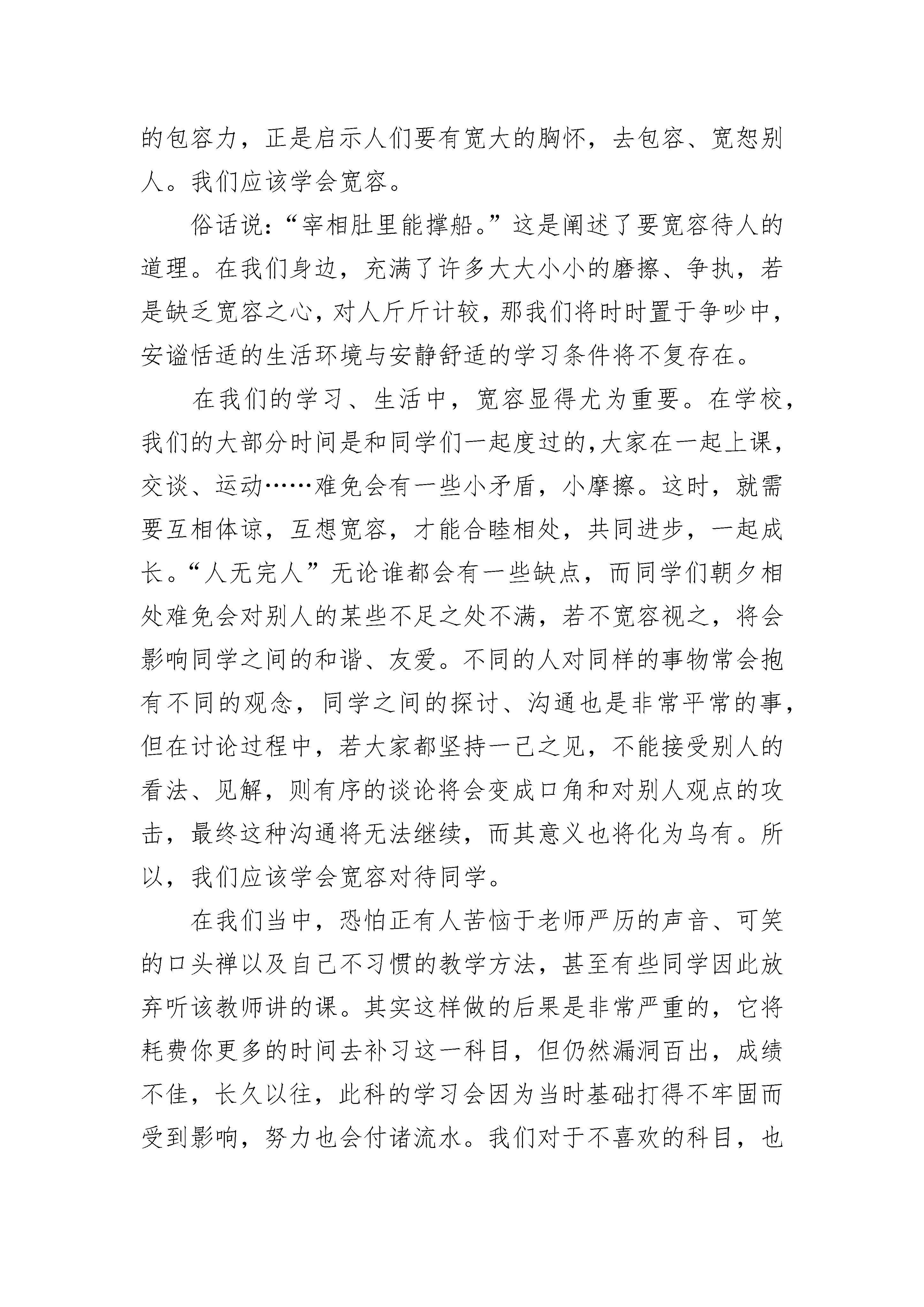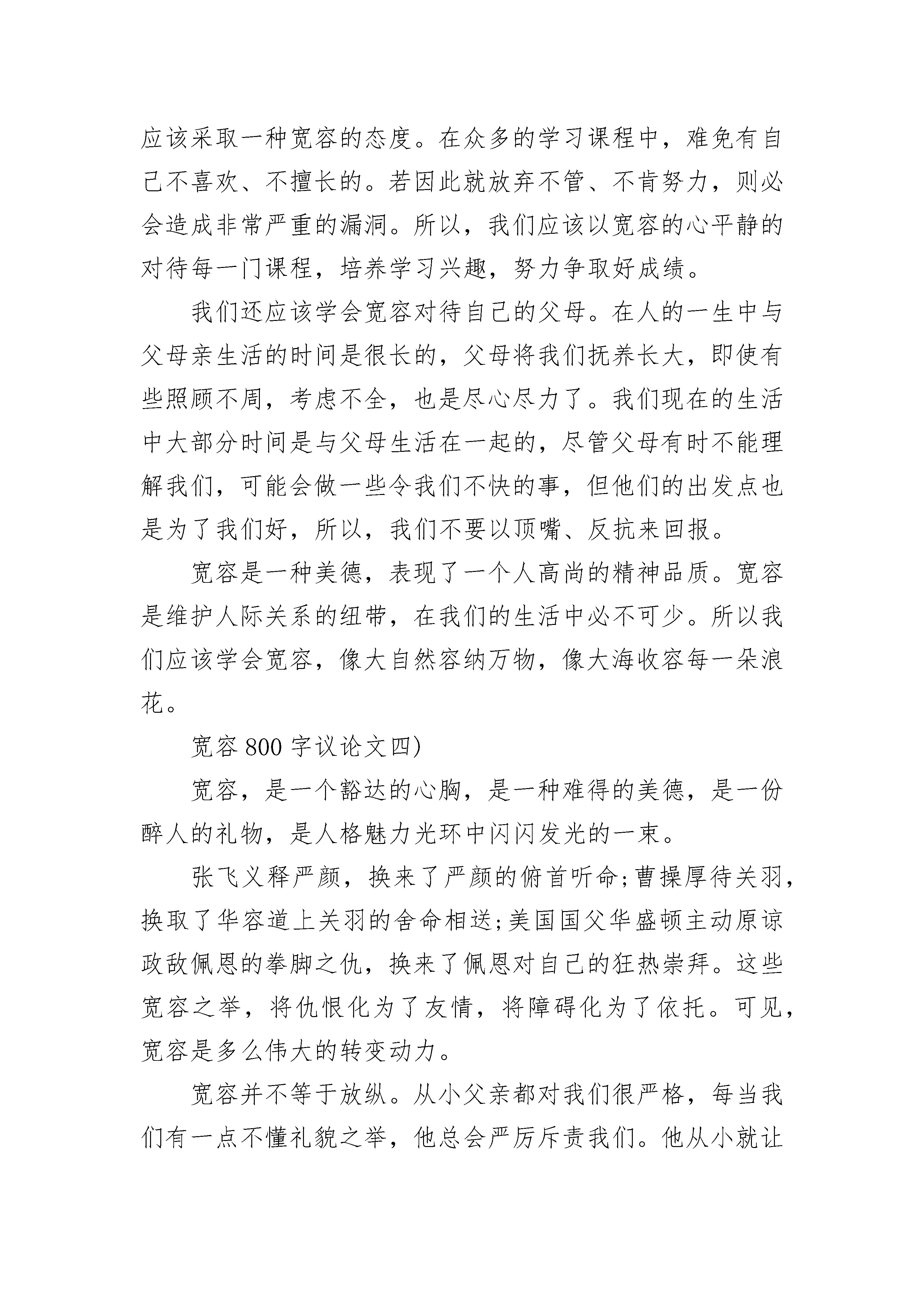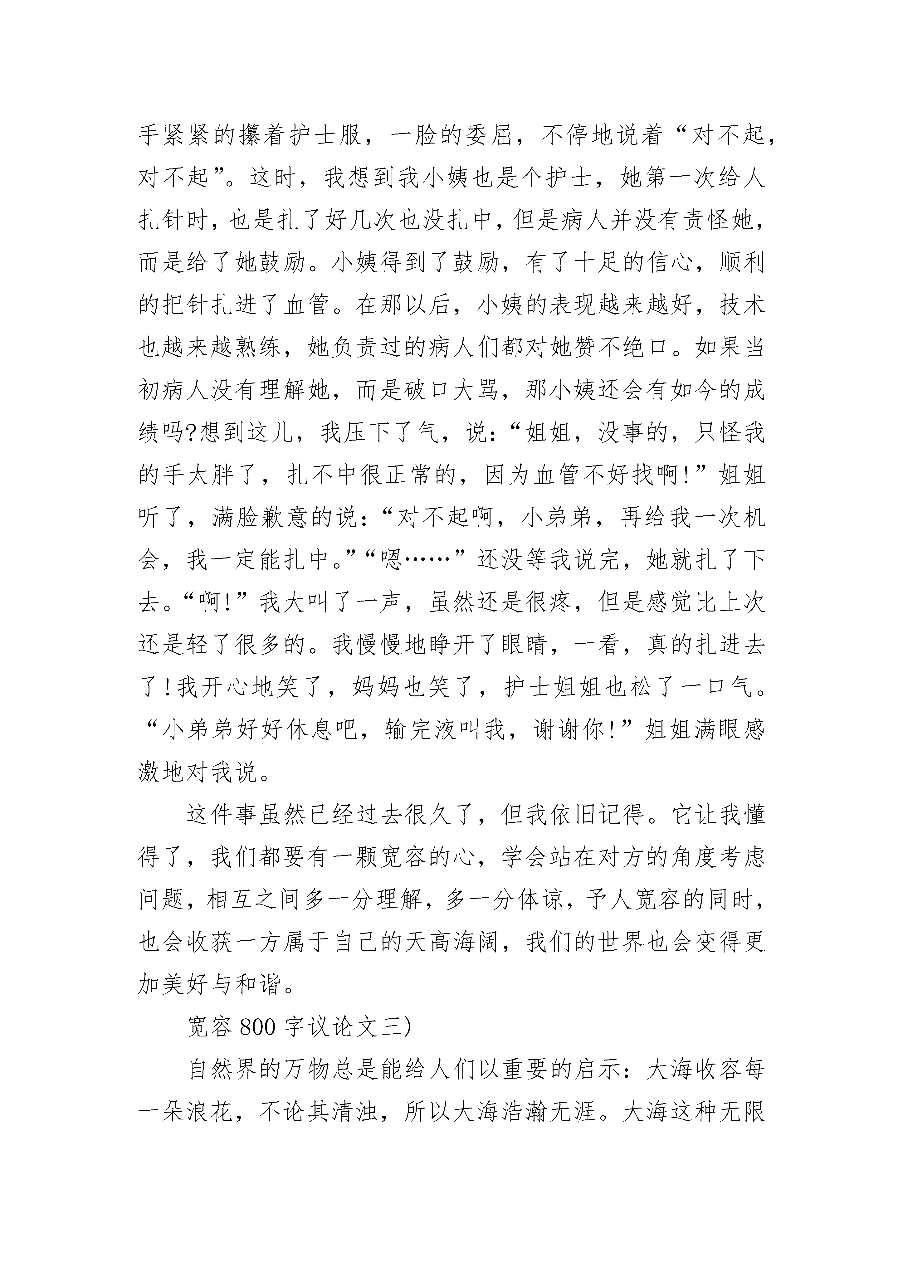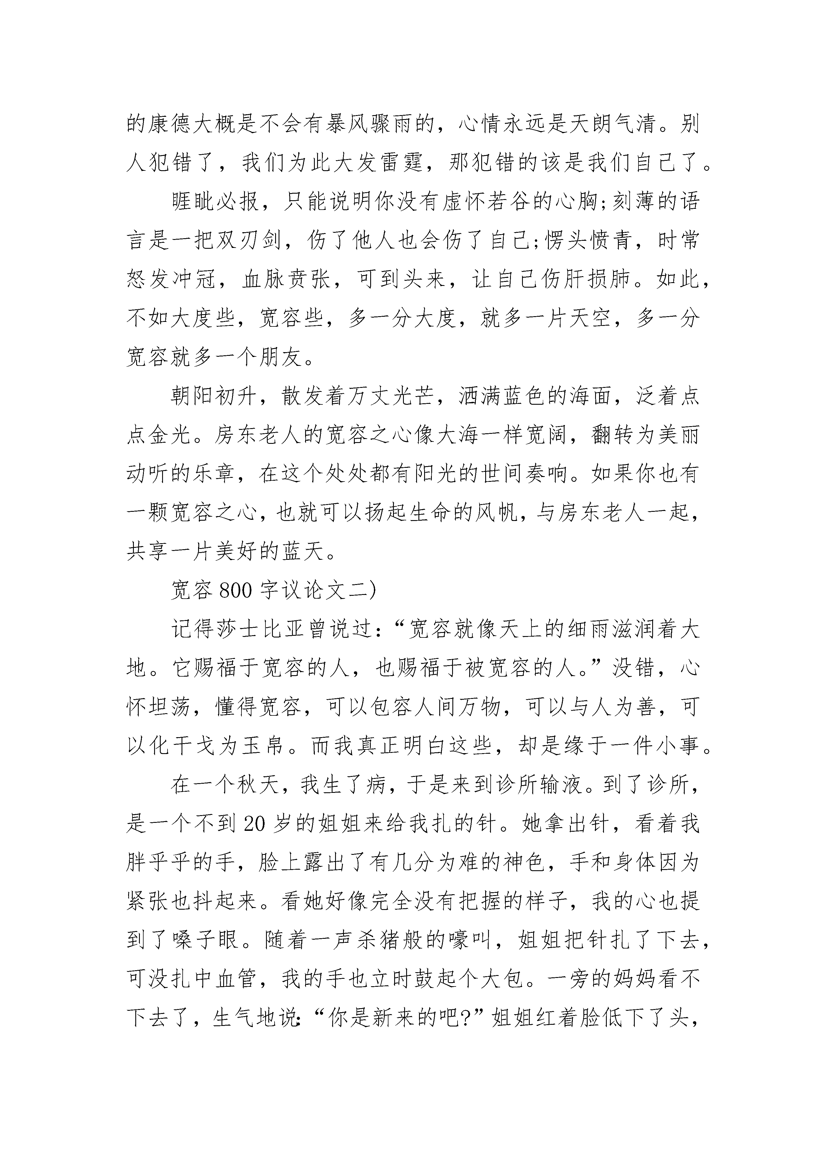 宽容800字初中优秀议论文天刚亮,我在拥挤的校园小路上跑着,一不小心踩了同学的脚,本以为这下完了,对方肯定不依不饶,会对我大动干戈。为了避免争斗,我连忙转身赔礼,可我们的眼光刚碰到了一起,而我还没有开口,他却先说“对不起!对不起!”这实在出乎我的意料。花开花落,物是人非,这世界在不停地运转。相对于自然界来说,渺小的人类,是否应该心怀宽容,共享一片蓝天?像海边那位房东老人那样,用一只玻璃杯子为筹码,换得的是打碎杯子的旅客整个心灵得以宽容。心怀一份宽容,人与人之间相处就会更融洽。记得那一年高考,一位考生的准考证掉在服装店里,等他发现时,店主已关店走人。考生焦急万分,只好请求消防员将店主的门撬开。当店主赶到现场时,消防人员向她解释情况,她没有为店门受损而生气,而是自责地说:“都怪我没有细心发现,提醒他带好自己的东西。幸好还不会耽误了孩子考试。”这位店主很平凡,但因她懂得宽容他人而显得格外伟大。人与人之间有了这样的宽容,就如细雨春风滋润田地的麦苗,在田地里更加生机勃勃。心怀宽容,海纳百川,方能让自己走向人生的顶峰。在这人生路上,心怀宽容,为自己,也是为他人创造了一片生活的蓝天。管仲说过:“闭祸在除怨。”从这句话,我又想起了德国哲学家康德说过:“生气,是拿别人的错误惩罚自己。”优雅的康德大概是不会有暴风骤雨的,心情永远是天朗气清。别人犯错了,我们为此大发雷霆,那犯错的该是我们自己了。睚眦必报,只能说明你没有虚怀若谷的心胸;刻薄的语言是一把双刃剑,伤了他人也会伤了自己;愣头愤青,时常怒发冲冠,血脉贲张,可到头来,让自己伤肝损肺。如此,不如大度些,宽容些,多一分大度,就多一片天空,多一分宽容就多一个朋友。朝阳初升,散发着万丈光芒,洒满蓝色的海面,泛着点点金光。房东老人的宽容之心像大海一样宽阔,翻转为美丽动听的乐章,在这个处处都有阳光的世间奏响。如果你也有一颗宽容之心,也就可以扬起生命的风帆,与房东老人一起,共享一片美好的蓝天。宽容800字议论文二)记得莎士比亚曾说过:“宽容就像天上的细雨滋润着大地。它赐福于宽容的人,也赐福于被宽容的人。”没错,心怀坦荡,懂得宽容,可以包容人间万物,可以与人为善,可以化干戈为玉帛。而我真正明白这些,却是缘于一件小事。在一个秋天,我生了病,于是来到诊所输液。到了诊所,是一个不到20岁的姐姐来给我扎的针。她拿出针,看着我胖乎乎的手,脸上露出了有几分为难的神色,手和身体因为紧张也抖起来。看她好像完全没有把握的样子,我的心也提到了嗓子眼。随着一声杀猪般的嚎叫,姐姐把针扎了下去,可没扎中血管,我的手也立时鼓起个大包。一旁的妈妈看不下去了,生气地说:“你是新来的吧?”姐姐红着脸低下了头,手紧紧的攥着护士服,一脸的委屈,不停地说着“对不起,对不起”。这时,我想到我小姨也是个护士,她第一次给人扎针时,也是扎了好几次也没扎中,但是病人并没有责怪她,而是给了她鼓励。小姨得到了鼓励,有了十足的信心,顺利的把针扎进了血管。在那以后,小姨的表现越来越好,技术也越来越熟练,她负责过的病人们都对她赞不绝口。如果当初病人没有理解她,而是破口大骂,那小姨还会有如今的成绩吗?想到这儿,我压下了气,说:“姐姐,没事的,只怪我的手太胖了,扎不中很正常的,因为血管不好找啊!”姐姐听了,满脸歉意的说:“对不起啊,小弟弟,再给我一次机会,我一定能扎中。”“嗯……”还没等我说完,她就扎了下去。“啊!”我大叫了一声,虽然还是很疼,但是感觉比上次还是轻了很多的。我慢慢地睁开了眼睛,一看,真的扎进去了!我开心地笑了,妈妈也笑了,护士姐姐也松了一口气。“小弟弟好好休息吧,输完液叫我,谢谢你!”姐姐满眼感激地对我说。这件事虽然已经过去很久了,但我依旧记得。它让我懂得了,我们都要有一颗宽容的心,学会站在对方的角度考虑问题,相互之间多一分理解,多一分体谅,予人宽容的同时,也会收获一方属于自己的天高海阔,我们的世界也会变得更加美好与和谐。宽容800字议论文三)自然界的万物总是能给人们以重要的启示:大海收容每一朵浪花,不论其清浊,所以大海浩瀚无涯。大海这种无限的包容力,正是启示人们要有宽大的胸怀,去包容、宽恕别人。我们应该学会宽容。俗话说:“宰相肚里能撑船。”这是阐述了要宽容待人的道理。在我们身边,充满了许多大大小小的磨擦、争执,若是缺乏宽容之心,对人斤斤计较,那我们将时时置于争吵中,安谧恬适的生活环境与安静舒适的学习条件将不复存在。在我们的学习、生活中,宽容显得尤为重要。在学校,我们的大部分时间是和同学们一起度过的,大家在一起上课,交谈、运动……难免会有一些小矛盾,小摩擦。这时,就需要互相体谅,互想宽容,才能合睦相处,共同进步,一起成长。“人无完人”无论谁都会有一些缺点,而同学们朝夕相处难免会对别人的某些不足之处不满,若不宽容视之,将会影响同学之间的和谐、友爱。不同的