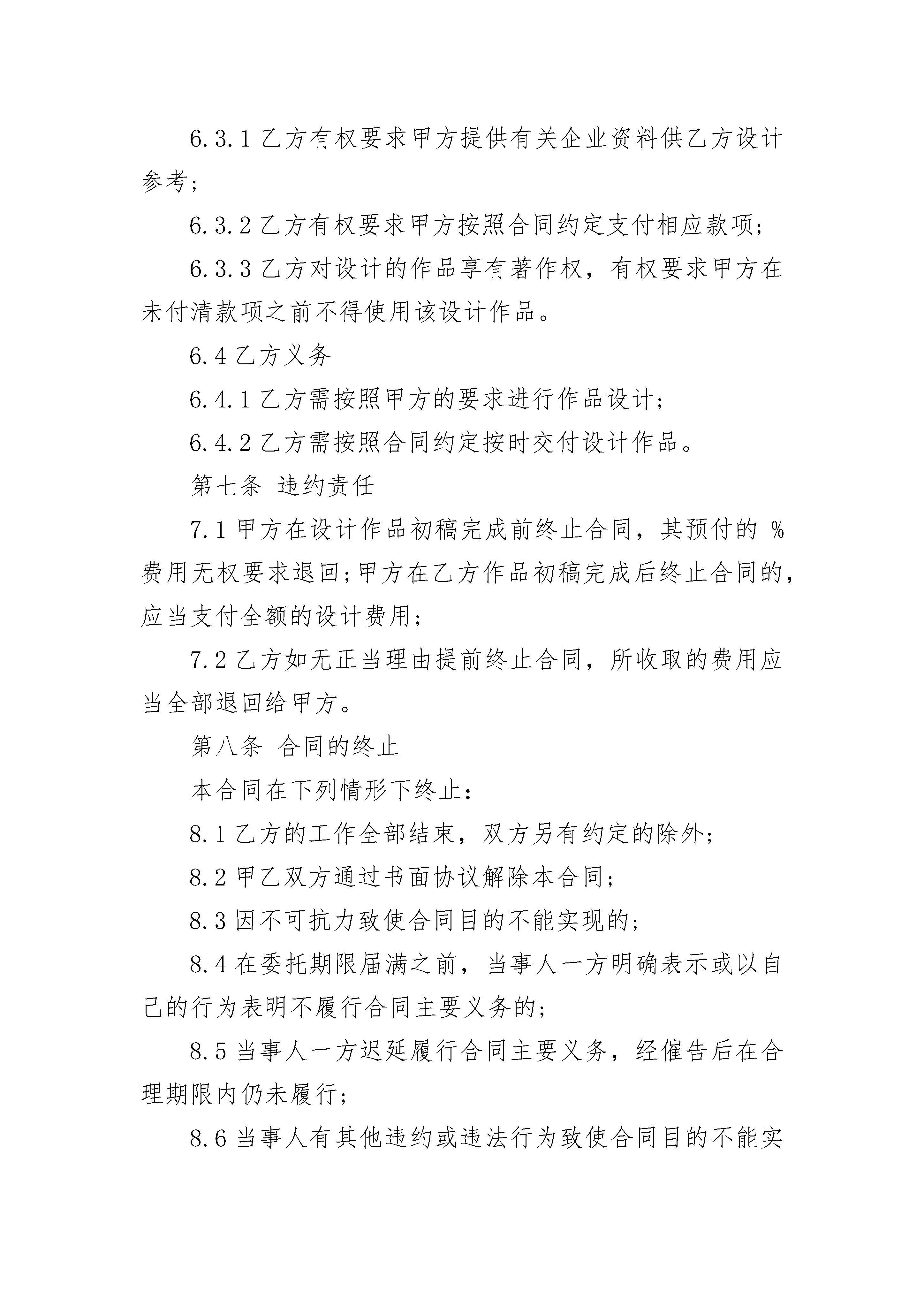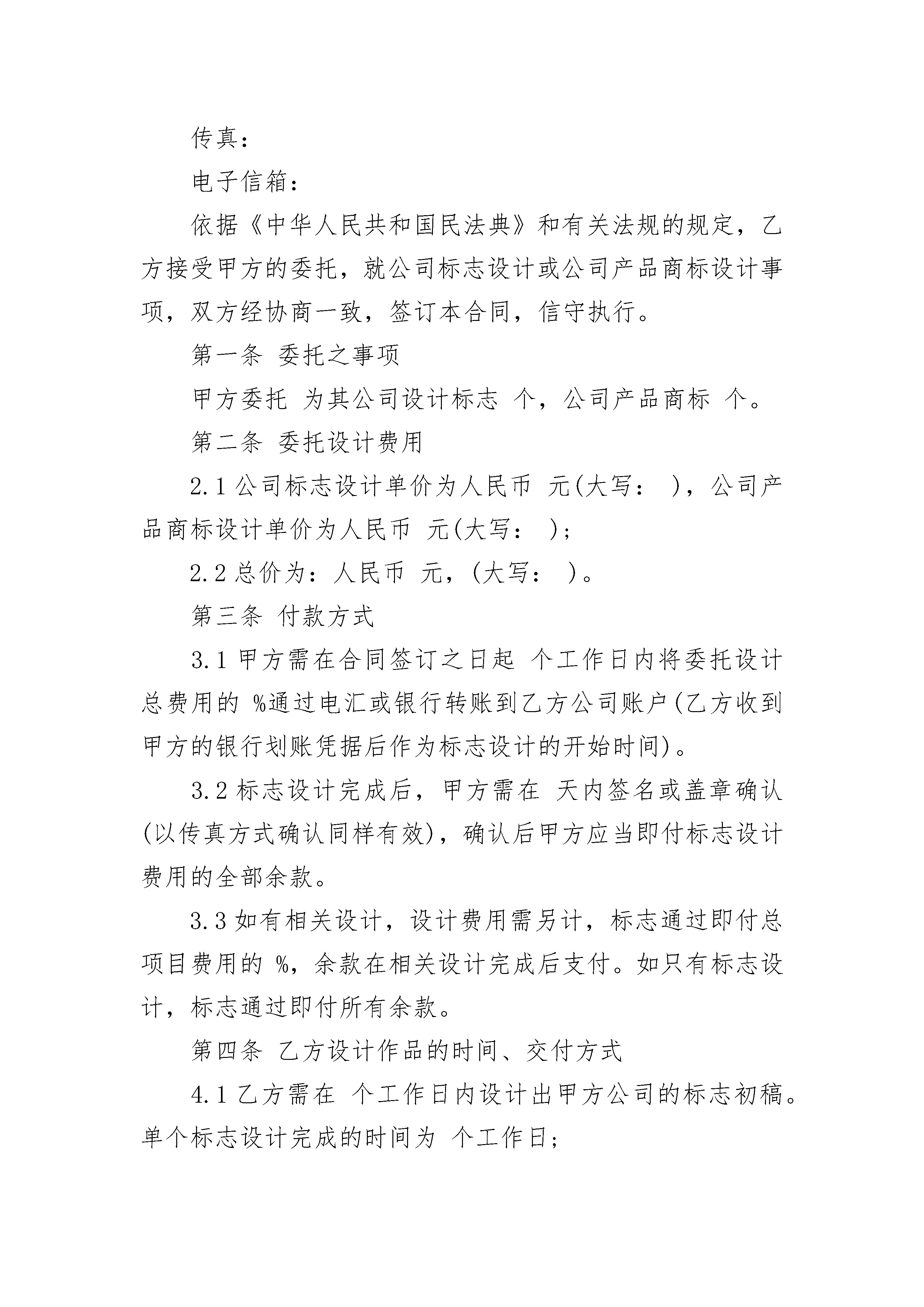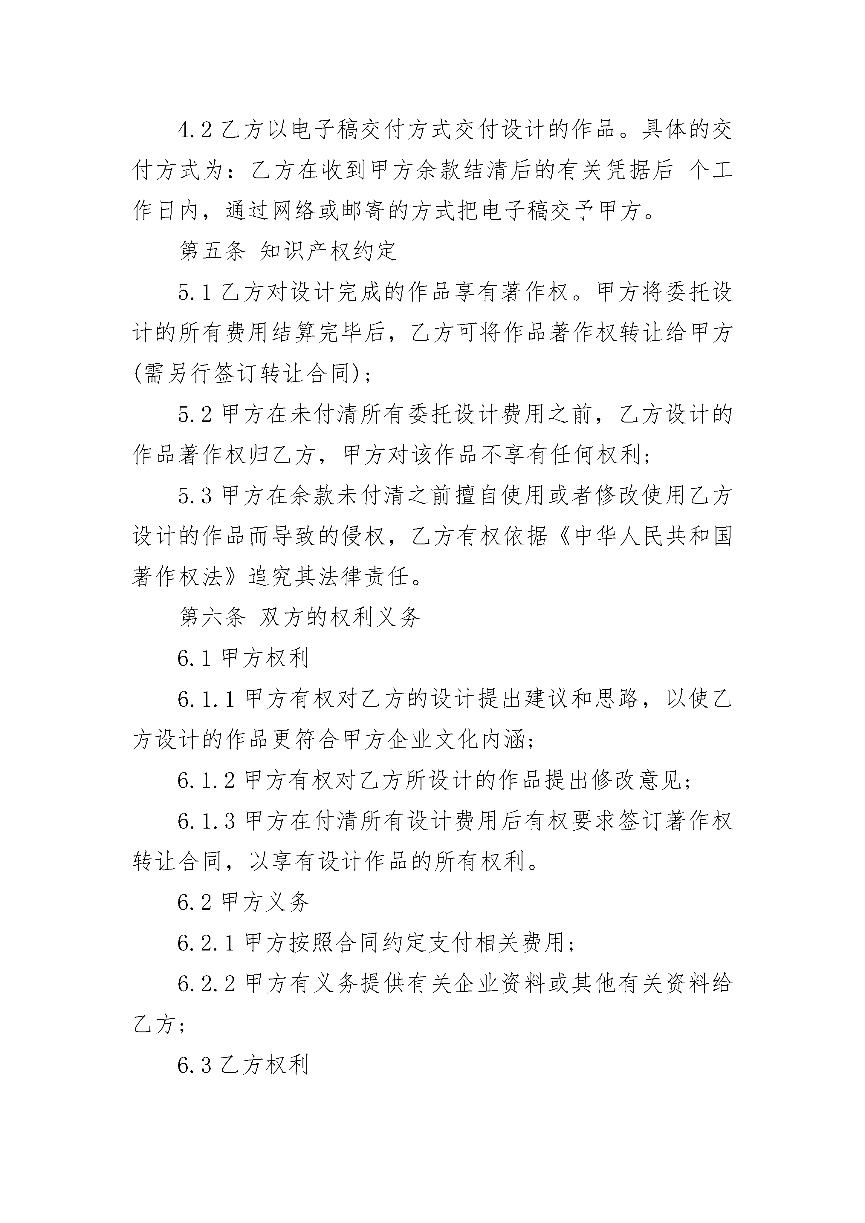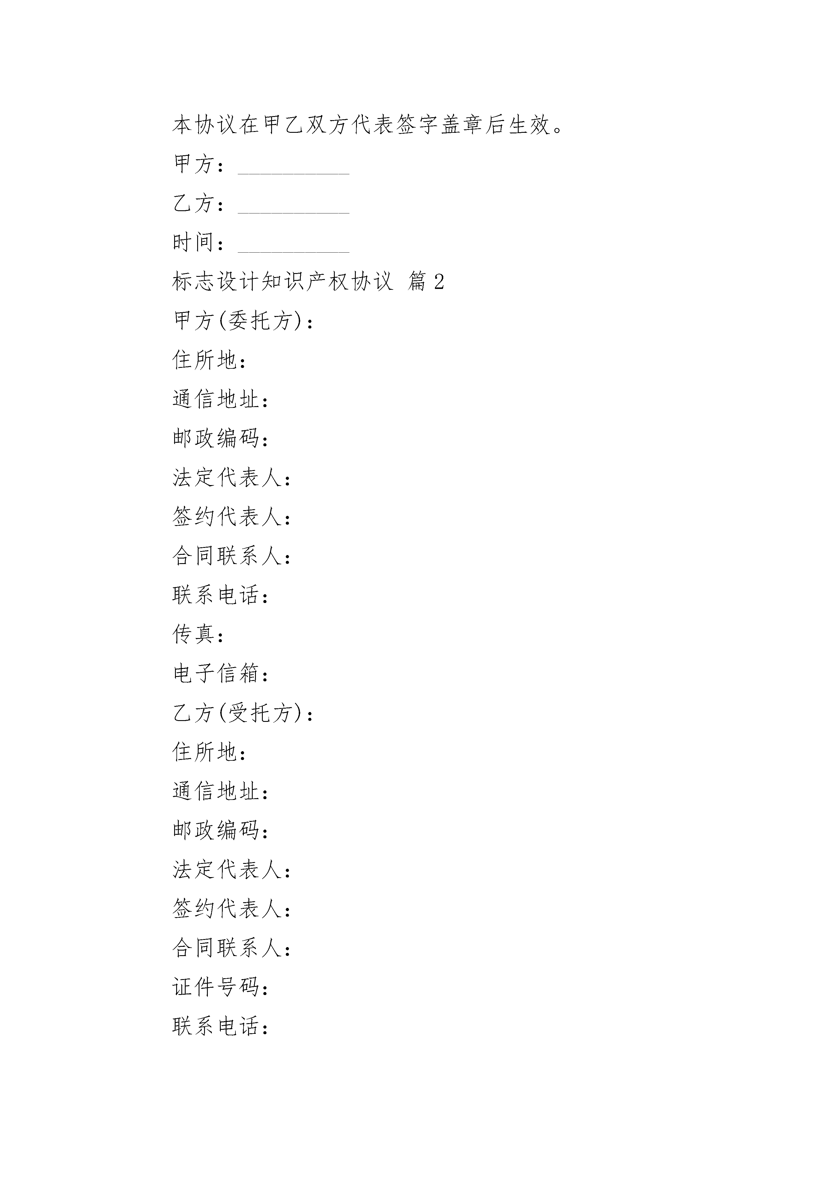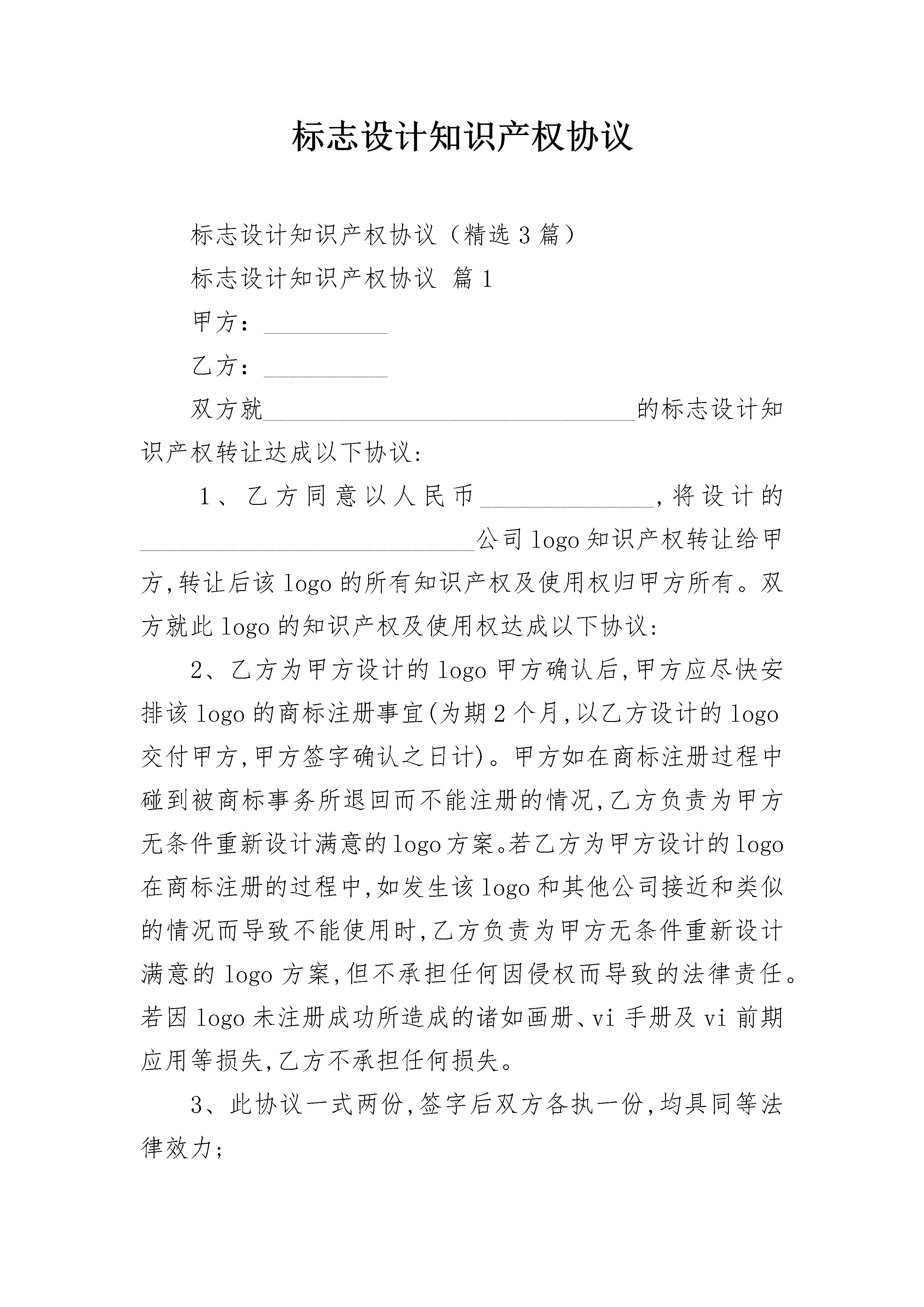 标志设计知识产权协议标志设计知识产权协议(精选3篇)标志设计知识产权协议篇1甲方:__________乙方:__________双方就______________________________的标志设计知识产权转让达成以下协议:1、乙方同意以人民币______________,将设计的___________________________公司logo知识产权转让给甲方,转让后该logo的所有知识产权及使用权归甲方所有。双方就此logo的知识产权及使用权达成以下协议:2、乙方为甲方设计的logo甲方确认后,甲方应尽快安排该logo的商标注册事宜(为期2个月,以乙方设计的logo交付甲方,甲方签字确认之日计)。甲方如在商标注册过程中碰到被商标事务所退回而不能注册的情况,乙方负责为甲方无条件重新设计满意的logo方案。若乙方为甲方设计的logo在商标注册的过程中,如发生该logo和其他公司接近和类似的情况而导致不能使用时,乙方负责为甲方无条件重新设计满意的logo方案,但不承担任何因侵权而导致的法律责任。若因logo未注册成功所造成的诸如画册、vi手册及vi前期应用等损失,乙方不承担任何损失。3、此协议一式两份,签字后双方各执一份,均具同等法律效力;本协议在甲乙双方代表签字盖章后生效。甲方:__________乙方:__________时间:__________标志设计知识产权协议篇2甲方(委托方):住所地:通信地址:邮政编码:法定代表人:签约代表人:合同联系人:联系电话:传真:电子信箱:乙方(受托方):住所地:通信地址:邮政编码:法定代表人:签约代表人:合同联系人:证件号码:联系电话:传真:电子信箱:依据《中华人民共和国民法典》和有关法规的规定,乙方接受甲方的委托,就公司标志设计或公司产品商标设计事项,双方经协商一致,签订本合同,信守执行。第一条委托之事项甲方委托为其公司设计标志个,公司产品商标个。第二条委托设计费用2.1公司标志设计单价为人民币元(大写:),公司产品商标设计单价为人民币元(大写:);2.2总价为:人民币元,(大写:)。第三条付款方式3.1甲方需在合同签订之日起个工作日内将委托设计总费用的%通过电汇或银行转账到乙方公司账户(乙方收到甲方的银行划账凭据后作为标志设计的开始时间)。3.2标志设计完成后,甲方需在天内签名或盖章确认(以传真方式确认同样有效),确认后甲方应当即付标志设计费用的全部余款。3.3如有相关设计,设计费用需另计,标志通过即付总项目费用的%,余款在相关设计完成后支付。如只有标志设计,标志通过即付所有余款。第四条乙方设计作品的时间、交付方式4.1乙方需在个工作日内设计出甲方公司的标志初稿。单个标志设计完成的时间为个工作日;4.2乙方以电子稿交付方式交付设计的作品。具体的交付方式为:乙方在收到甲方余款结清后的有关凭据后个工作日内,通过网络或邮寄的方式把电子稿交予甲方。第五条知识产权约定5.1乙方对设计完成的作品享有著作权。甲方将委托设计的所有费用结算完毕后,乙方可将作品著作权转让给甲方(需另行签订转让合同);5.2甲方在未付清所有委托设计费用之前,乙方设计的作品著作权归乙方,甲方对该作品不享有任何权利;5.3甲方在余款未付清之前擅自使用或者修改使用乙方设计的作品而导致的侵权,乙方有权依据《中华人民共和国著作权法》追究其法律责任。第六条双方的权利义务6.1甲方权利6.1.1甲方有权对乙方的设计提出建议和思路,以使乙方设计的作品更符合甲方企业文化内涵;6.1.2甲方有权对乙方所设计的作品提出修改意见;6.1.3甲方在付清所有设计费用后有权要求签订著作权转让合同,以享有设计作品的所有权利。6.2甲方义务6.2.1甲方按照合同约定支付相关费用;6.2.2甲方有义务提供有关企业资料或其他有关资料给乙方;6.3乙方权利6.3.1乙方有权要求甲方提供有关企业资料供乙方设计参考;6.3.2乙方有权要求甲方按照合同约定支付相应款项;6.3.3乙方对设计的作品享有著作权,有权要求甲方在未付清款项之前不得使用该设计作品。6.4乙方义务6.4.1乙方需按照甲方的要求进行作品设计;6.4.2乙方需按照合同约定按时交付设计作品。第七条违约责任7.1甲方在设计作品初稿完成前终止合同,其预付的%费用无权要求退回;甲方在乙方作品初稿完成后终止合同的,应当支付全额的设计费用;7.2乙方如无正当理由提前终止合同,所收取的费用应当全部退回给甲方。第八条合同的终止本合同在下列情形下终止:8.1乙方的工作全部结束,双方另有约定的除外;8.2甲乙双方通过书面协议解除本合同;8.3因不可抗力致使合同目的不能实现的;8.4在委托期限届满之前,当事人一方明确表示或以自己的行为表明不履行合同主要义务的;8.5当事人一方迟延履行合同主要义务,经催告后在合