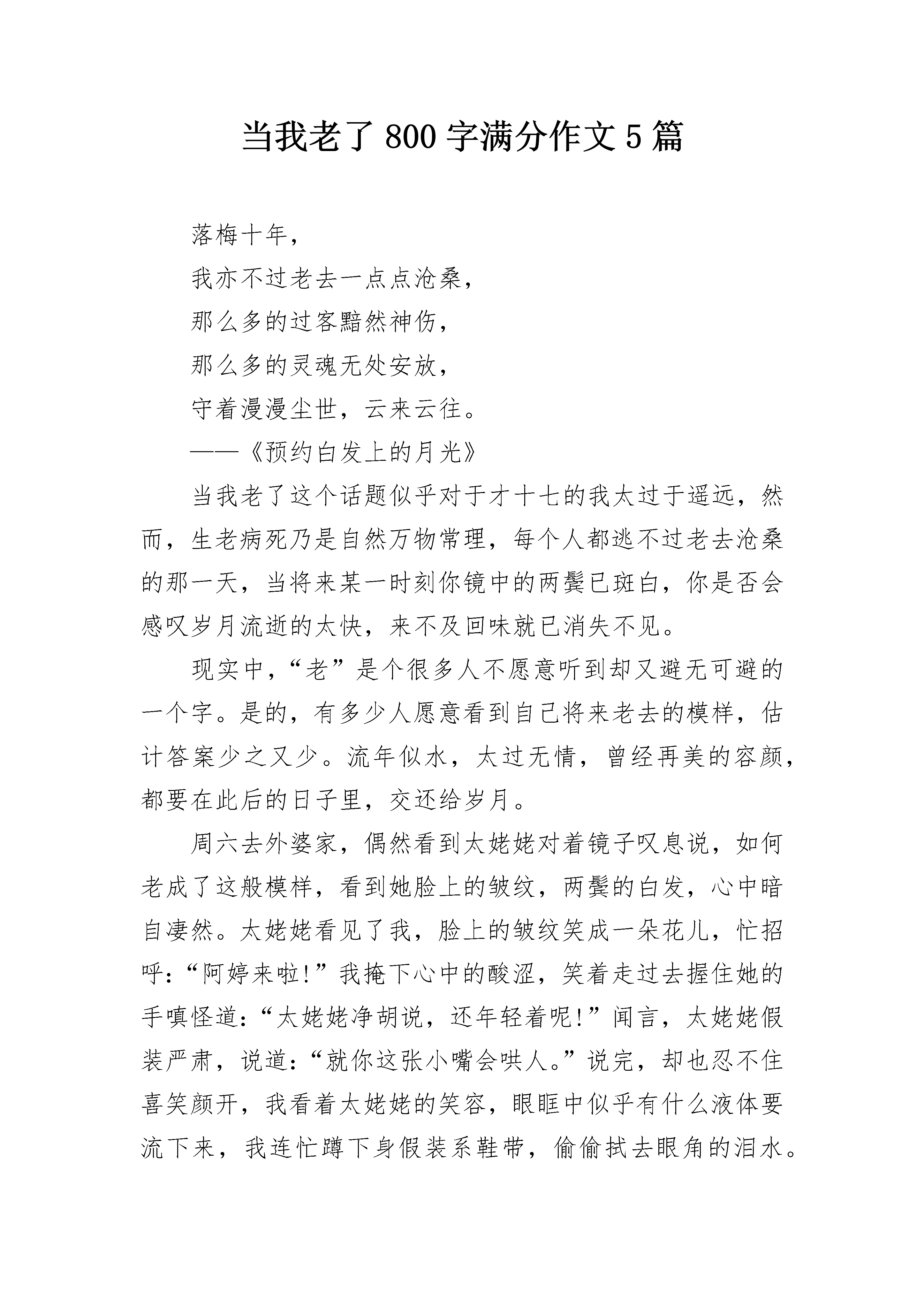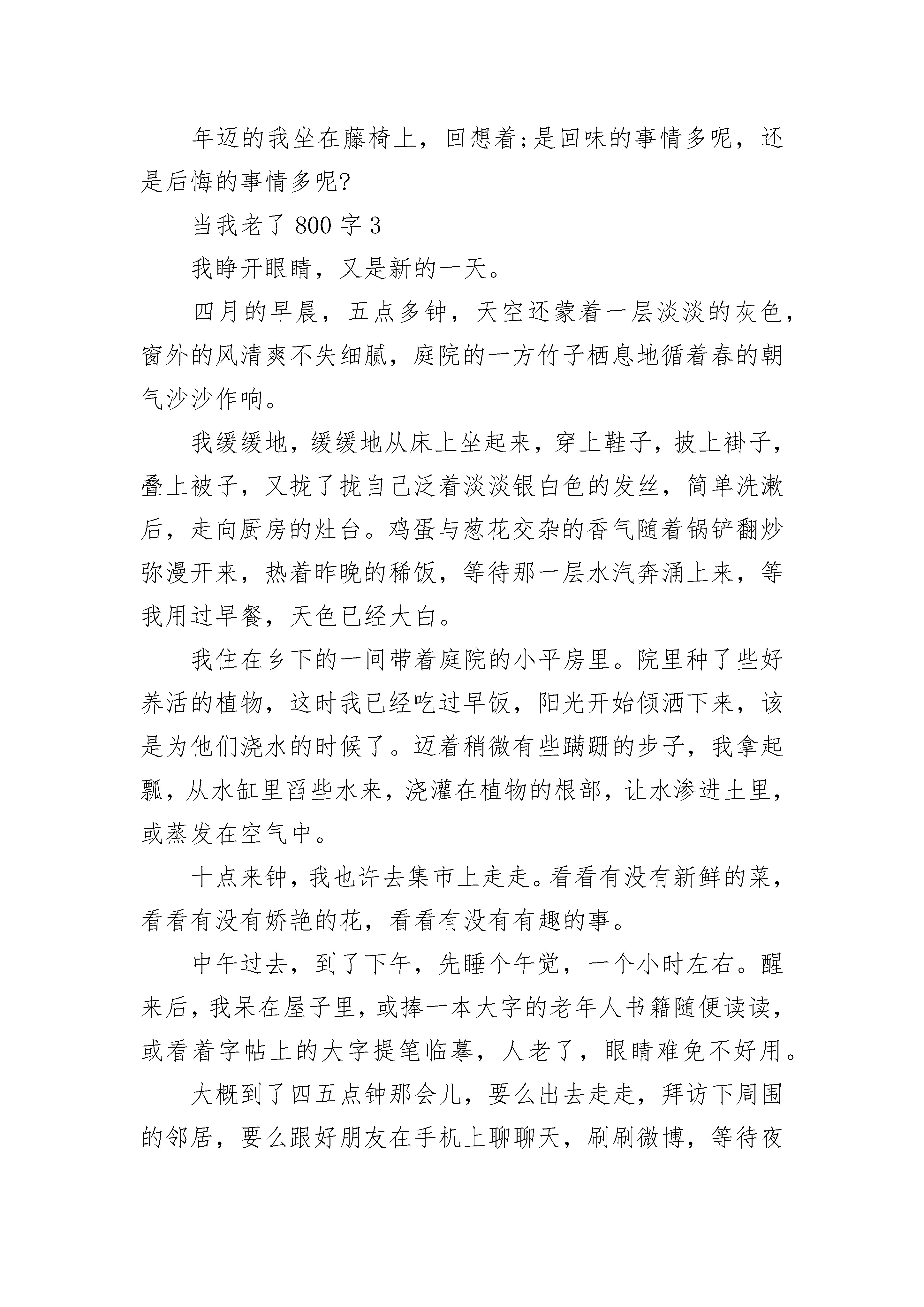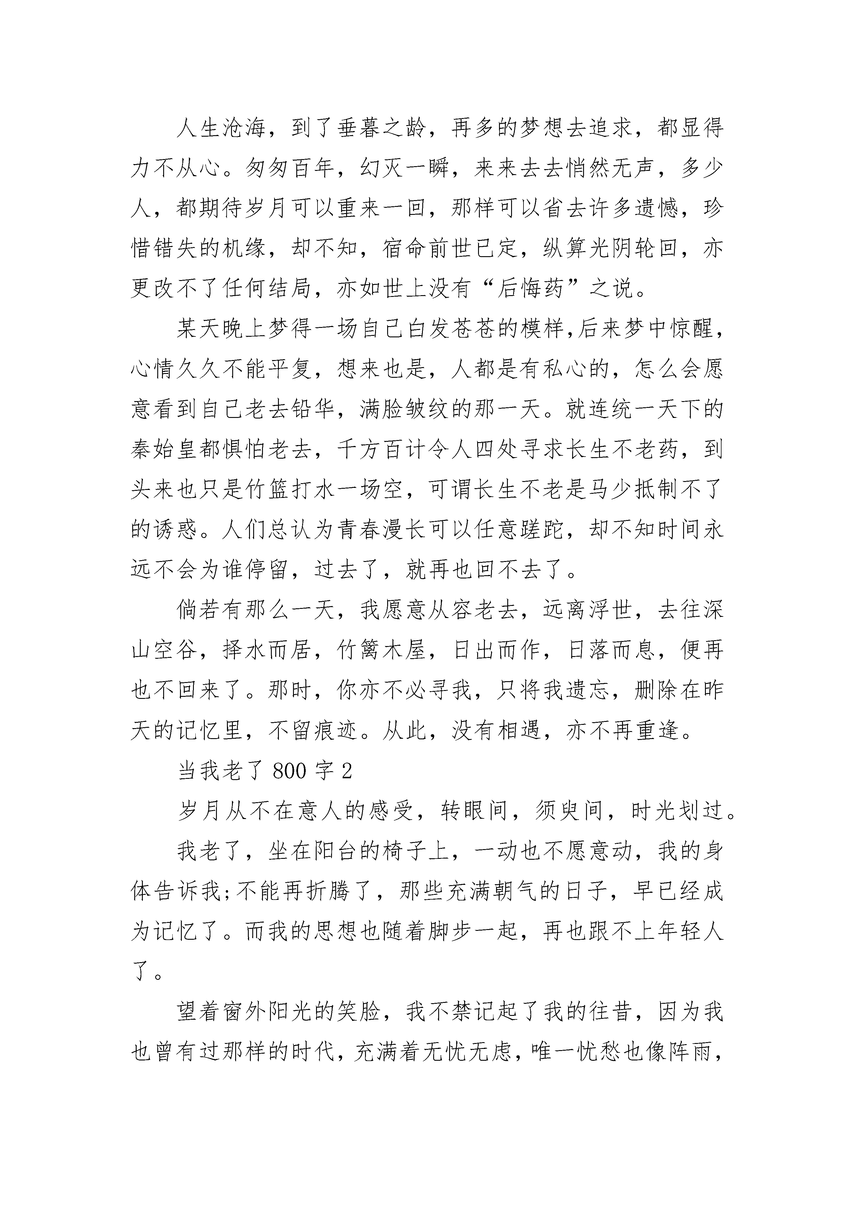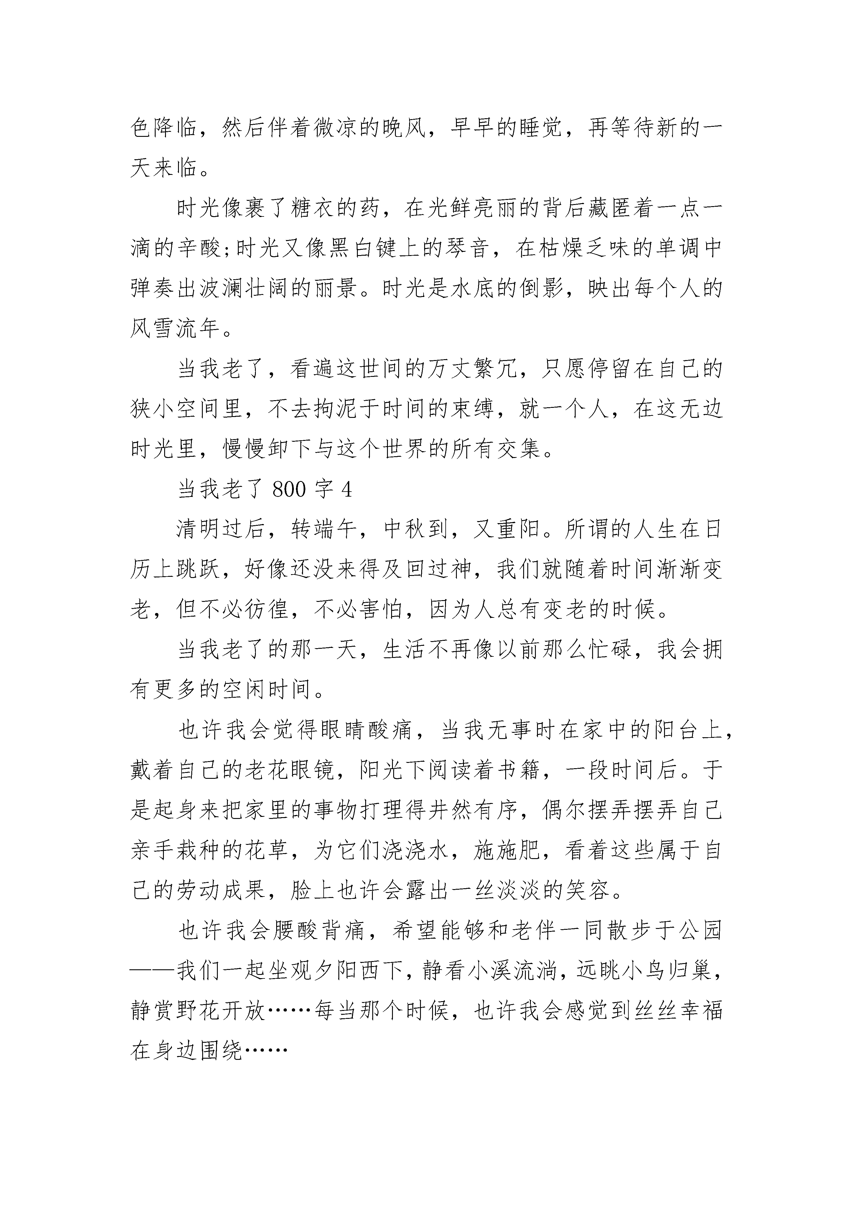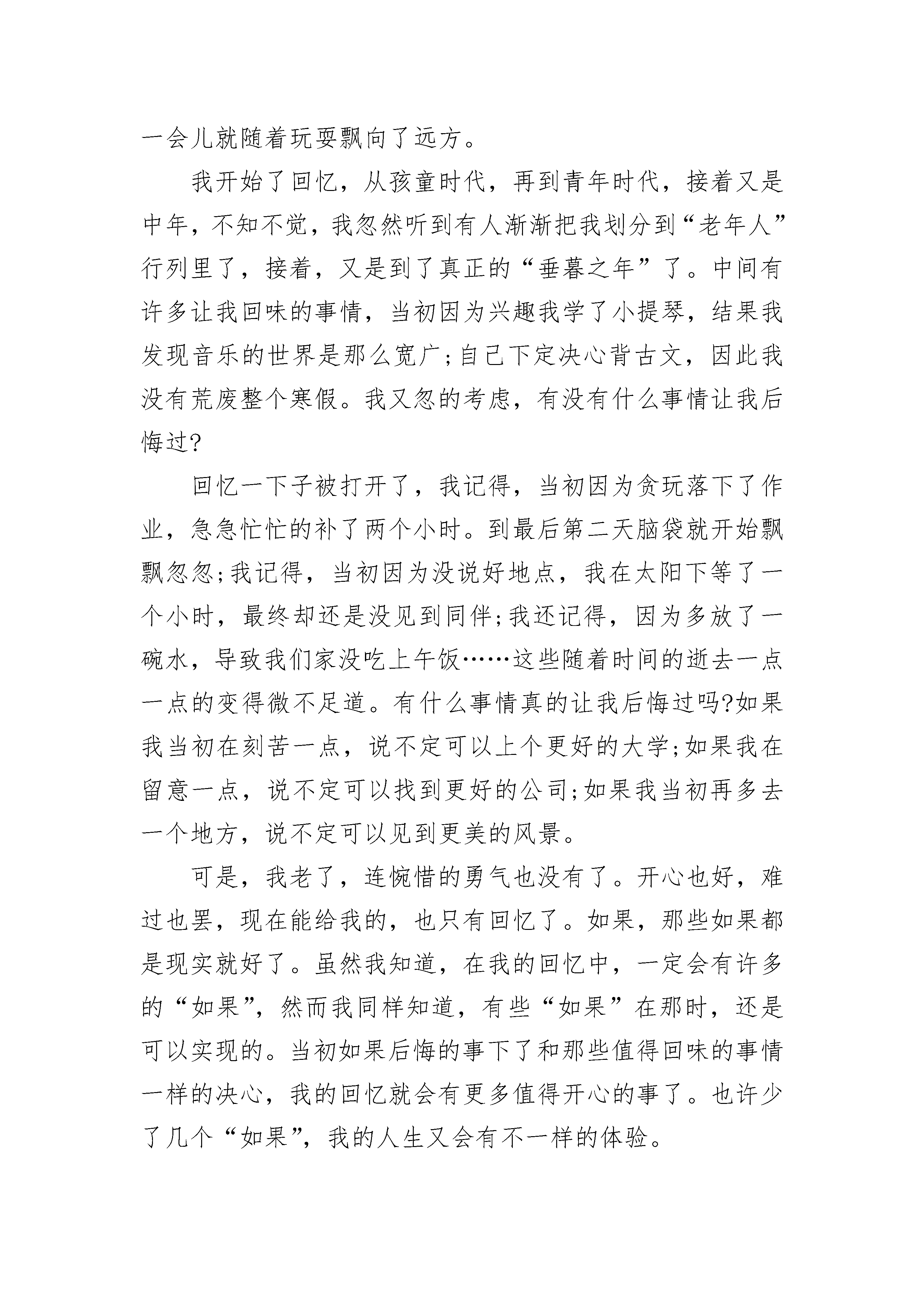 当我老了800字满分作文5篇落梅十年,我亦不过老去一点点沧桑,那么多的过客黯然神伤,那么多的灵魂无处安放,守着漫漫尘世,云来云往。——《预约白发上的月光》当我老了这个话题似乎对于才十七的我太过于遥远,然而,生老病死乃是自然万物常理,每个人都逃不过老去沧桑的那一天,当将来某一时刻你镜中的两鬓已斑白,你是否会感叹岁月流逝的太快,来不及回味就已消失不见。现实中,“老”是个很多人不愿意听到却又避无可避的一个字。是的,有多少人愿意看到自己将来老去的模样,估计答案少之又少。流年似水,太过无情,曾经再美的容颜,都要在此后的日子里,交还给岁月。周六去外婆家,偶然看到太姥姥对着镜子叹息说,如何老成了这般模样,看到她脸上的皱纹,两鬓的白发,心中暗自凄然。太姥姥看见了我,脸上的皱纹笑成一朵花儿,忙招呼:“阿婷来啦!”我掩下心中的酸涩,笑着走过去握住她的手嗔怪道:“太姥姥净胡说,还年轻着呢!”闻言,太姥姥假装严肃,说道:“就你这张小嘴会哄人。”说完,却也忍不住喜笑颜开,我看着太姥姥的笑容,眼眶中似乎有什么液体要流下来,我连忙蹲下身假装系鞋带,偷偷拭去眼角的泪水。人生沧海,到了垂暮之龄,再多的梦想去追求,都显得力不从心。匆匆百年,幻灭一瞬,来来去去悄然无声,多少人,都期待岁月可以重来一回,那样可以省去许多遗憾,珍惜错失的机缘,却不知,宿命前世已定,纵算光阴轮回,亦更改不了任何结局,亦如世上没有“后悔药”之说。某天晚上梦得一场自己白发苍苍的模样,后来梦中惊醒,心情久久不能平复,想来也是,人都是有私心的,怎么会愿意看到自己老去铅华,满脸皱纹的那一天。就连统一天下的秦始皇都惧怕老去,千方百计令人四处寻求长生不老药,到头来也只是竹篮打水一场空,可谓长生不老是马少抵制不了的诱惑。人们总认为青春漫长可以任意蹉跎,却不知时间永远不会为谁停留,过去了,就再也回不去了。倘若有那么一天,我愿意从容老去,远离浮世,去往深山空谷,择水而居,竹篱木屋,日出而作,日落而息,便再也不回来了。那时,你亦不必寻我,只将我遗忘,删除在昨天的记忆里,不留痕迹。从此,没有相遇,亦不再重逢。当我老了800字2岁月从不在意人的感受,转眼间,须臾间,时光划过。我老了,坐在阳台的椅子上,一动也不愿意动,我的身体告诉我;不能再折腾了,那些充满朝气的日子,早已经成为记忆了。而我的思想也随着脚步一起,再也跟不上年轻人了。望着窗外阳光的笑脸,我不禁记起了我的往昔,因为我也曾有过那样的时代,充满着无忧无虑,唯一忧愁也像阵雨,一会儿就随着玩耍飘向了远方。我开始了回忆,从孩童时代,再到青年时代,接着又是中年,不知不觉,我忽然听到有人渐渐把我划分到“老年人”行列里了,接着,又是到了真正的“垂暮之年”了。中间有许多让我回味的事情,当初因为兴趣我学了小提琴,结果我发现音乐的世界是那么宽广;自己下定决心背古文,因此我没有荒废整个寒假。我又忽的考虑,有没有什么事情让我后悔过?回忆一下子被打开了,我记得,当初因为贪玩落下了作业,急急忙忙的补了两个小时。到最后第二天脑袋就开始飘飘忽忽;我记得,当初因为没说好地点,我在太阳下等了一个小时,最终却还是没见到同伴;我还记得,因为多放了一碗水,导致我们家没吃上午饭……这些随着时间的逝去一点一点的变得微不足道。有什么事情真的让我后悔过吗?如果我当初在刻苦一点,说不定可以上个更好的大学;如果我在留意一点,说不定可以找到更好的公司;如果我当初再多去一个地方,说不定可以见到更美的风景。可是,我老了,连惋惜的勇气也没有了。开心也好,难过也罢,现在能给我的,也只有回忆了。如果,那些如果都是现实就好了。虽然我知道,在我的回忆中,一定会有许多的“如果”,然而我同样知道,有些“如果”在那时,还是可以实现的。当初如果后悔的事下了和那些值得回味的事情一样的决心,我的回忆就会有更多值得开心的事了。也许少了几个“如果”,我的人生又会有不一样的体验。年迈的我坐在藤椅上,回想着;是回味的事情多呢,还是后悔的事情多呢?当我老了800字3我睁开眼睛,又是新的一天。四月的早晨,五点多钟,天空还蒙着一层淡淡的灰色,窗外的风清爽不失细腻,庭院的一方竹子栖息地循着春的朝气沙沙作响。我缓缓地,缓缓地从床上坐起来,穿上鞋子,披上褂子,叠上被子,又拢了拢自己泛着淡淡银白色的发丝,简单洗漱后,走向厨房的灶台。鸡蛋与葱花交杂的香气随着锅铲翻炒弥漫开来,热着昨晚的稀饭,等待那一层水汽奔涌上来,等我用过早餐,天色已经大白。我住在乡下的一间带着庭院的小平房里。院里种了些好养活的植物,这时我已经吃过早饭,阳光开始倾洒下来,该是为他们浇水的时候了。迈着稍微有些蹒跚的步子,我拿起瓢,从水缸里舀些水来,浇灌在植物的根部,让水渗进土里,或蒸发在空气中。十点来钟,我也许去集市上走走。看看有没有新鲜的菜,看看有没有娇艳的花,看看有没有有趣的事。中午过去