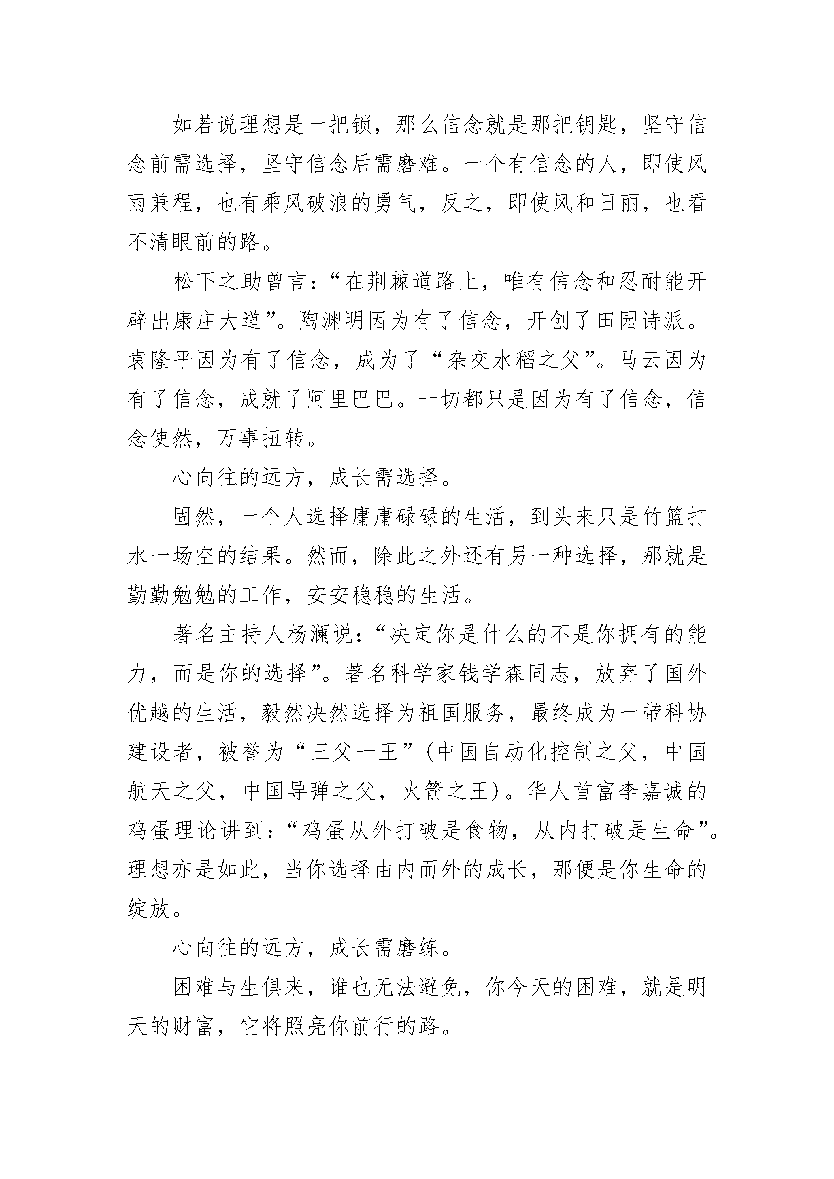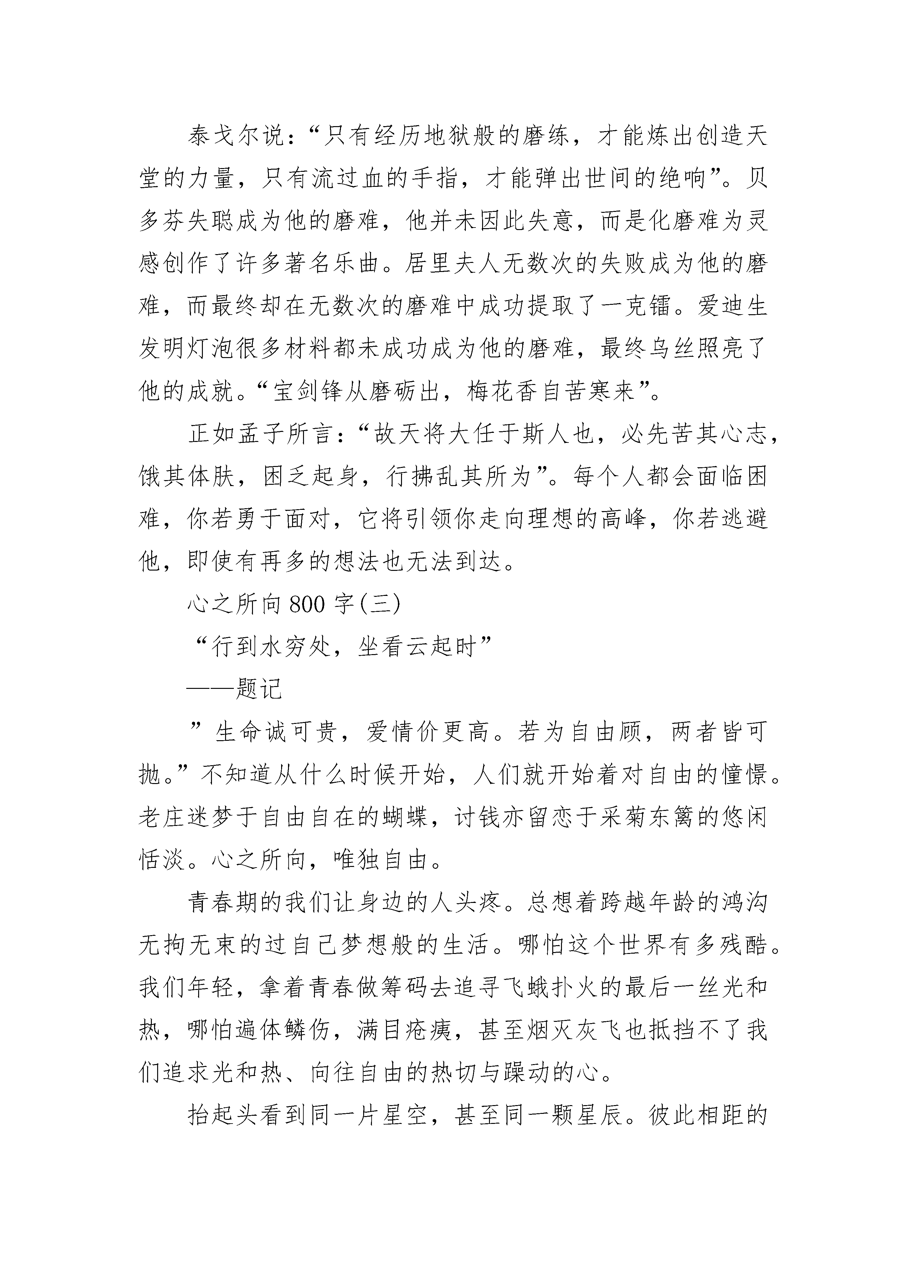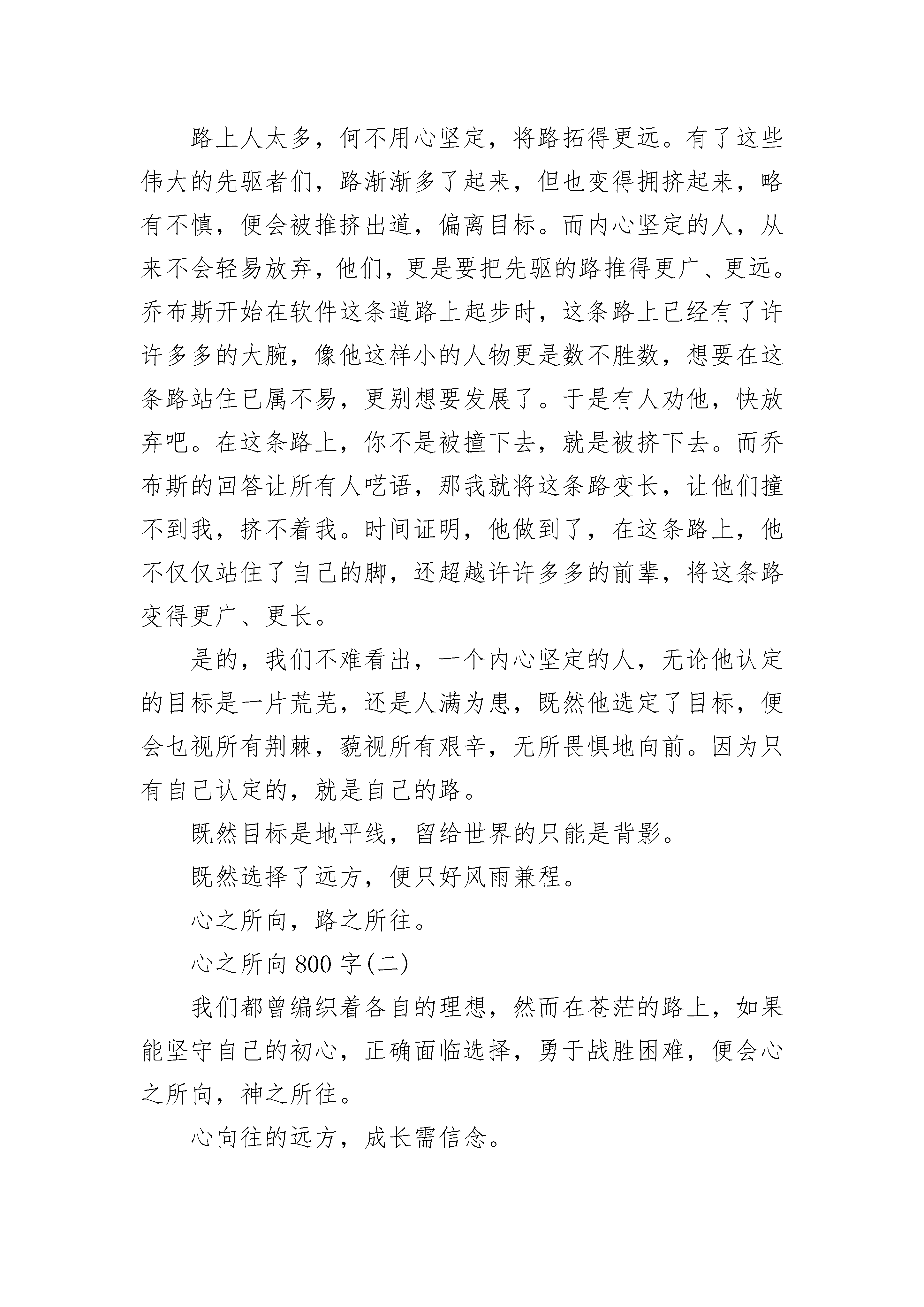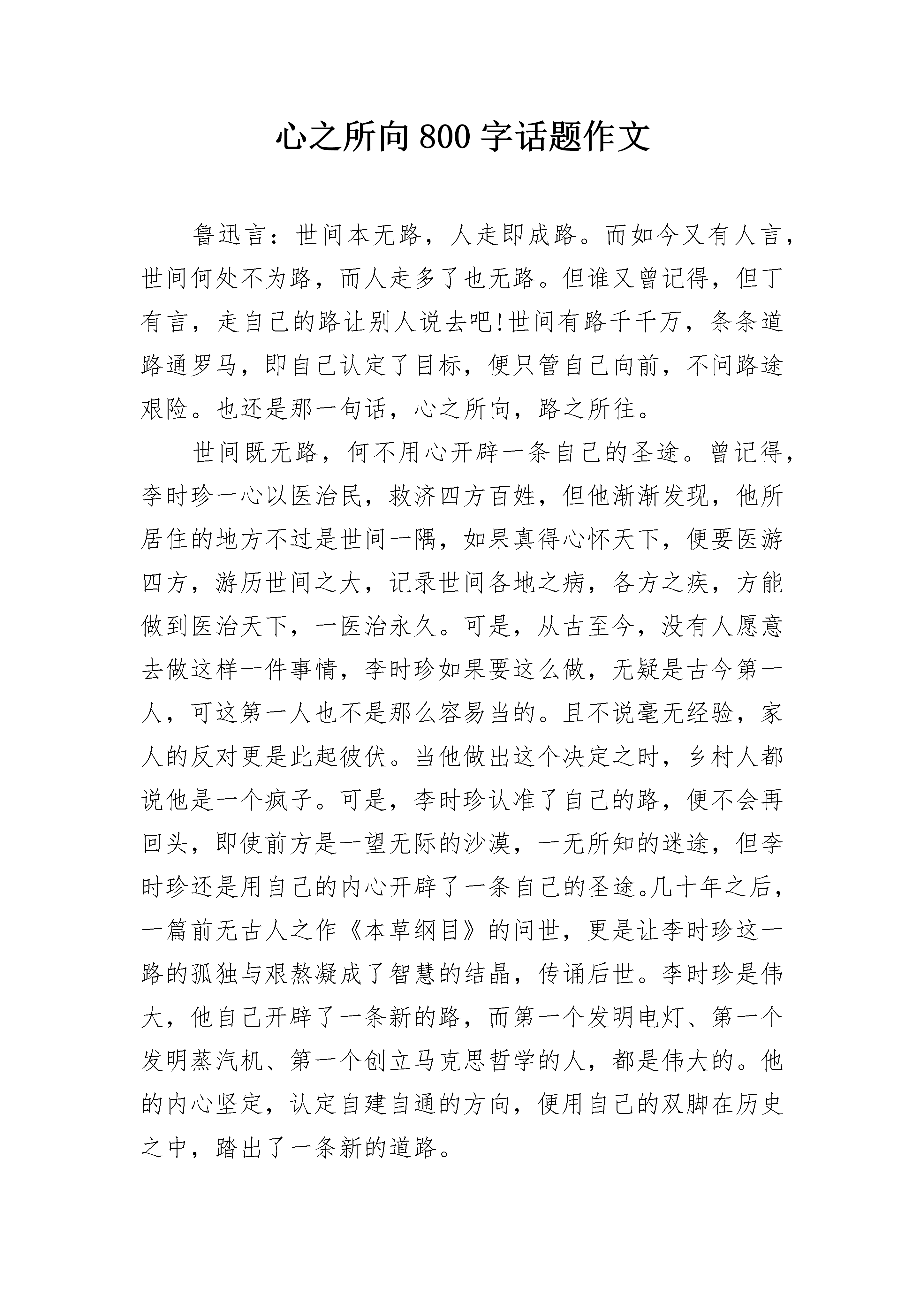心之所向800字话题作文鲁迅言:世间本无路,人走即成路。而如今又有人言,世间何处不为路,而人走多了也无路。但谁又曾记得,但丁有言,走自己的路让别人说去吧!世间有路千千万,条条道路通罗马,即自己认定了目标,便只管自己向前,不问路途艰险。也还是那一句话,心之所向,路之所往。世间既无路,何不用心开辟一条自己的圣途。曾记得,李时珍一心以医治民,救济四方百姓,但他渐渐发现,他所居住的地方不过是世间一隅,如果真得心怀天下,便要医游四方,游历世间之大,记录世间各地之病,各方之疾,方能做到医治天下,一医治永久。可是,从古至今,没有人愿意去做这样一件事情,李时珍如果要这么做,无疑是古今第一人,可这第一人也不是那么容易当的。且不说毫无经验,家人的反对更是此起彼伏。当他做出这个决定之时,乡村人都说他是一个疯子。可是,李时珍认准了自己的路,便不会再回头,即使前方是一望无际的沙漠,一无所知的迷途,但李时珍还是用自己的内心开辟了一条自己的圣途。几十年之后,一篇前无古人之作《本草纲目》的问世,更是让李时珍这一路的孤独与艰熬凝成了智慧的结晶,传诵后世。李时珍是伟大,他自己开辟了一条新的路,而第一个发明电灯、第一个发明蒸汽机、第一个创立马克思哲学的人,都是伟大的。他的内心坚定,认定自建自通的方向,便用自己的双脚在历史之中,踏出了一条新的道路。路上人太多,何不用心坚定,将路拓得更远。有了这些伟大的先驱者们,路渐渐多了起来,但也变得拥挤起来,略有不慎,便会被推挤出道,偏离目标。而内心坚定的人,从来不会轻易放弃,他们,更是要把先驱的路推得更广、更远。乔布斯开始在软件这条道路上起步时,这条路上已经有了许许多多的大腕,像他这样小的人物更是数不胜数,想要在这条路站住已属不易,更别想要发展了。于是有人劝他,快放弃吧。在这条路上,你不是被撞下去,就是被挤下去。而乔布斯的回答让所有人呓语,那我就将这条路变长,让他们撞不到我,挤不着我。时间证明,他做到了,在这条路上,他不仅仅站住了自己的脚,还超越许许多多的前辈,将这条路变得更广、更长。是的,我们不难看出,一个内心坚定的人,无论他认定的目标是一片荒芜,还是人满为患,既然他选定了目标,便会乜视所有荆棘,藐视所有艰辛,无所畏惧地向前。因为只有自己认定的,就是自己的路。既然目标是地平线,留给世界的只能是背影。既然选择了远方,便只好风雨兼程。心之所向,路之所往。心之所向800字(二)我们都曾编织着各自的理想,然而在苍茫的路上,如果能坚守自己的初心,正确面临选择,勇于战胜困难,便会心之所向,神之所往。心向往的远方,成长需信念。如若说理想是一把锁,那么信念就是那把钥匙,坚守信念前需选择,坚守信念后需磨难。一个有信念的人,即使风雨兼程,也有乘风破浪的勇气,反之,即使风和日丽,也看不清眼前的路。松下之助曾言:“在荆棘道路上,唯有信念和忍耐能开辟出康庄大道”。陶渊明因为有了信念,开创了田园诗派。袁隆平因为有了信念,成为了“杂交水稻之父”。马云因为有了信念,成就了阿里巴巴。一切都只是因为有了信念,信念使然,万事扭转。心向往的远方,成长需选择。固然,一个人选择庸庸碌碌的生活,到头来只是竹篮打水一场空的结果。然而,除此之外还有另一种选择,那就是勤勤勉勉的工作,安安稳稳的生活。著名主持人杨澜说:“决定你是什么的不是你拥有的能力,而是你的选择”。著名科学家钱学森同志,放弃了国外优越的生活,毅然决然选择为祖国服务,最终成为一带科协建设者,被誉为“三父一王”(中国自动化控制之父,中国航天之父,中国导弹之父,火箭之王)。华人首富李嘉诚的鸡蛋理论讲到:“鸡蛋从外打破是食物,从内打破是生命”。理想亦是如此,当你选择由内而外的成长,那便是你生命的绽放。心向往的远方,成长需磨练。困难与生俱来,谁也无法避免,你今天的困难,就是明天的财富,它将照亮你前行的路。泰戈尔说:“只有经历地狱般的磨练,才能炼出创造天堂的力量,只有流过血的手指,才能弹出世间的绝响”。贝多芬失聪成为他的磨难,他并未因此失意,而是化磨难为灵感创作了许多著名乐曲。居里夫人无数次的失败成为他的磨难,而最终却在无数次的磨难中成功提取了一克镭。爱迪生发明灯泡很多材料都未成功成为他的磨难,最终乌丝照亮了他的成就。“宝剑锋从磨砺出,梅花香自苦寒来”。正如孟子所言:“故天将大任于斯人也,必先苦其心志,饿其体肤,困乏起身,行拂乱其所为”。每个人都会面临困难,你若勇于面对,它将引领你走向理想的高峰,你若逃避他,即使有再多的想法也无法到达。心之所向800字(三)“行到水穷处,坐看云起时”——题记”生命诚可贵,爱情价更高。若为自由顾,两者皆可抛。”不知道从什么时候开始,人们就开始着对自由的憧憬。老庄迷梦于自由自在的蝴蝶,讨钱亦留恋于采菊东篱的悠闲恬淡。心之所向,唯独自由。青春期的我们让身边的人头疼。总想着跨越年龄的鸿沟无拘无