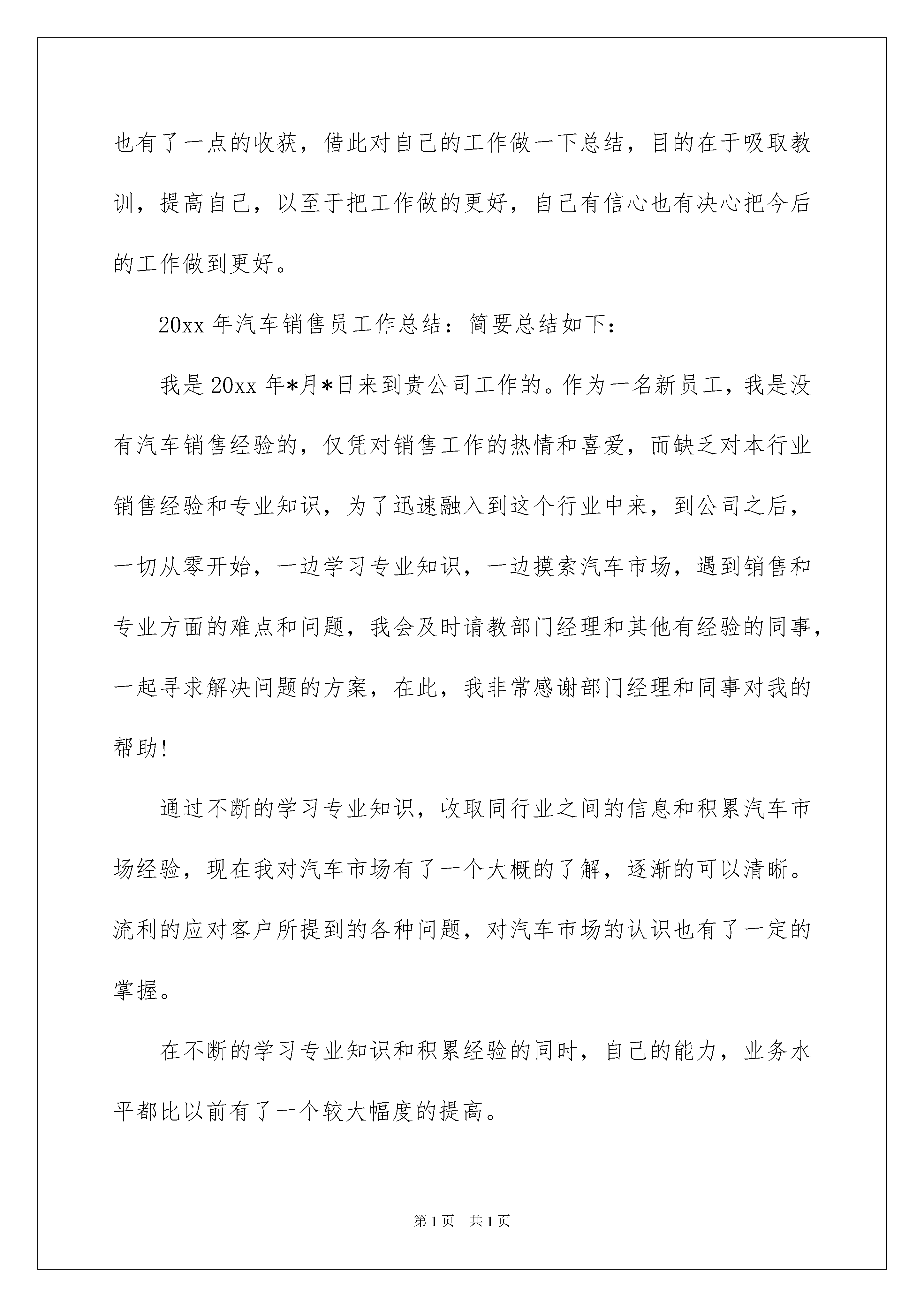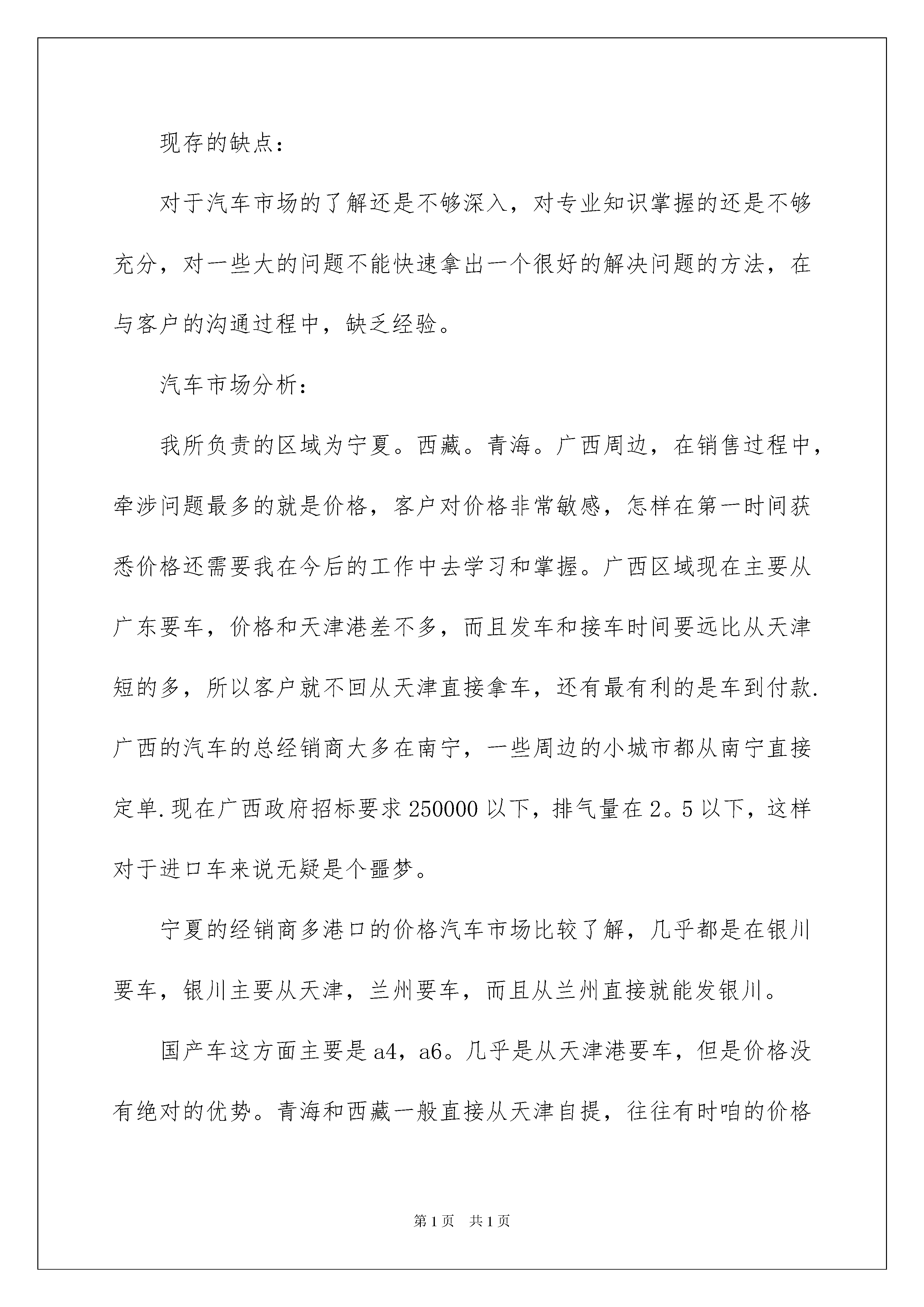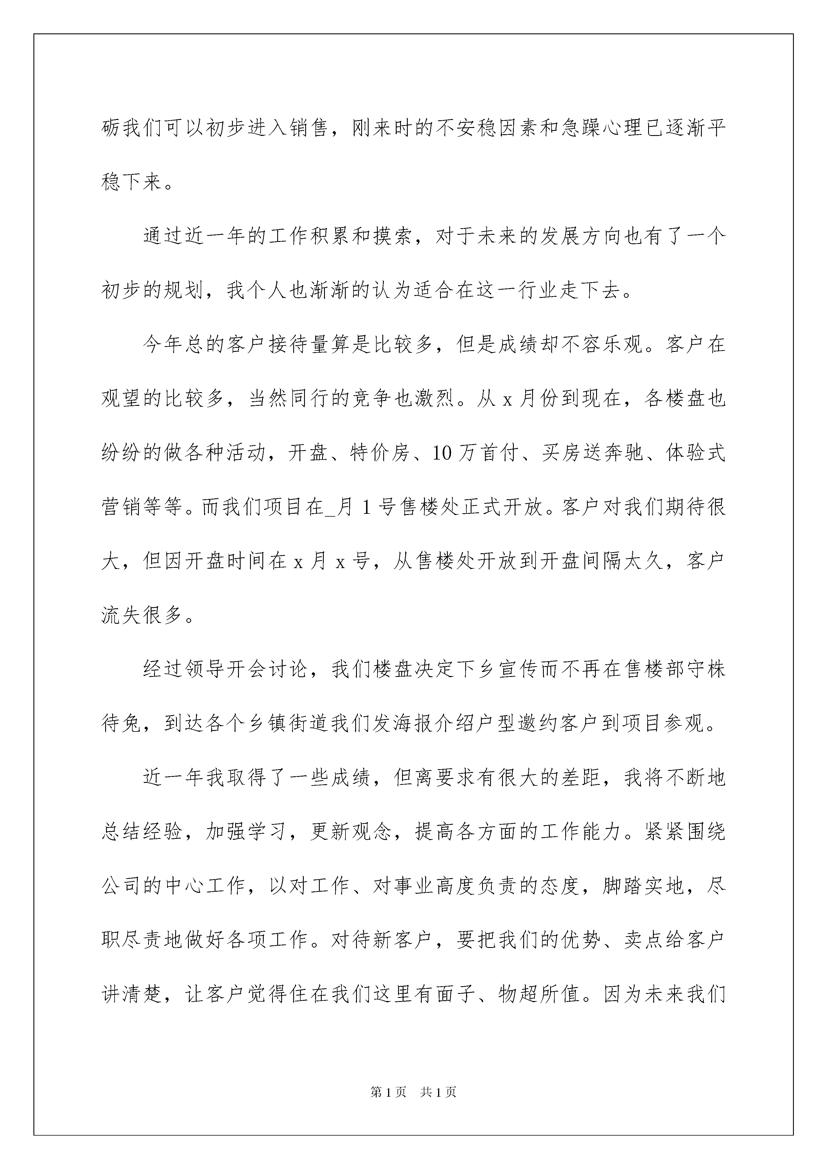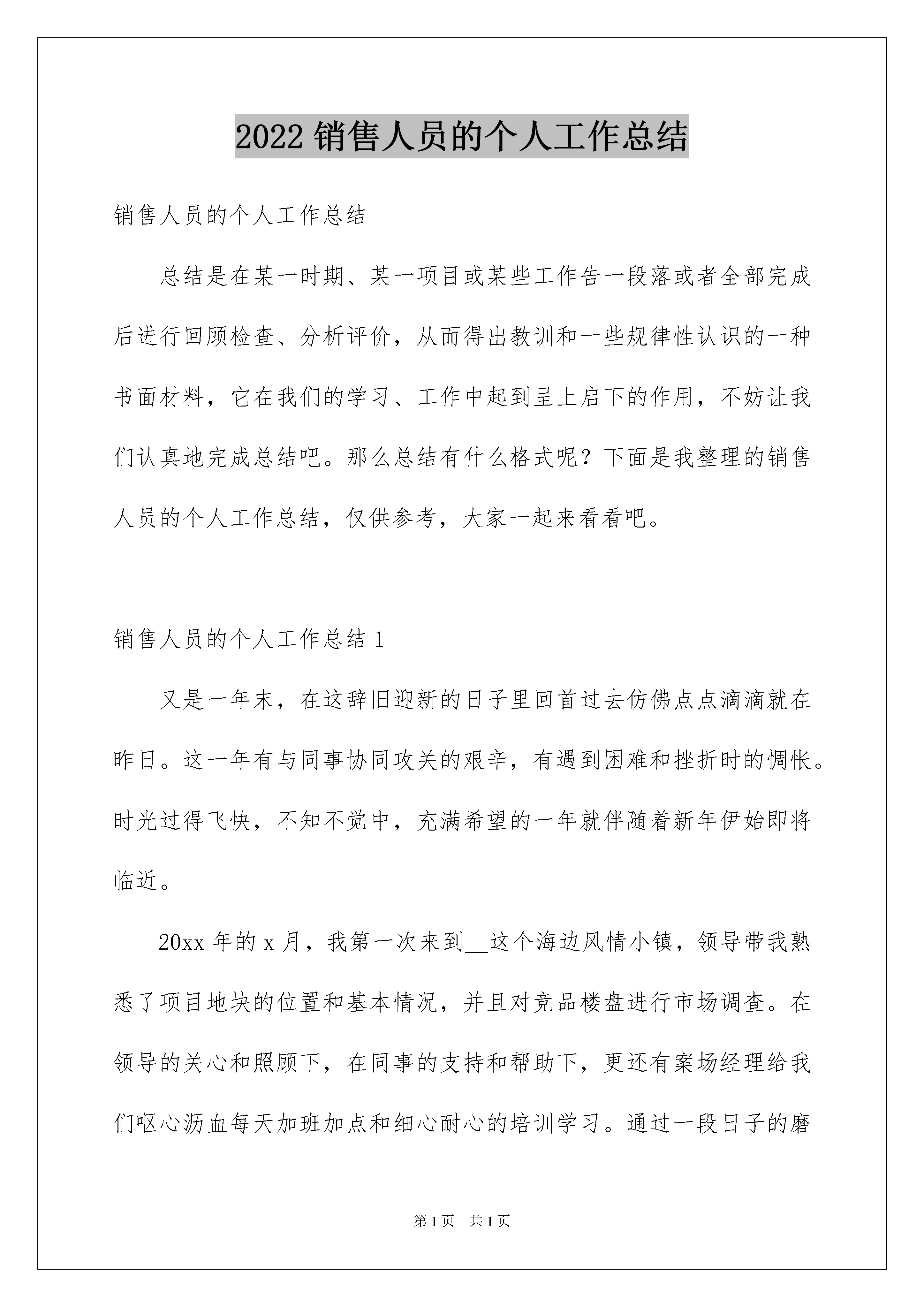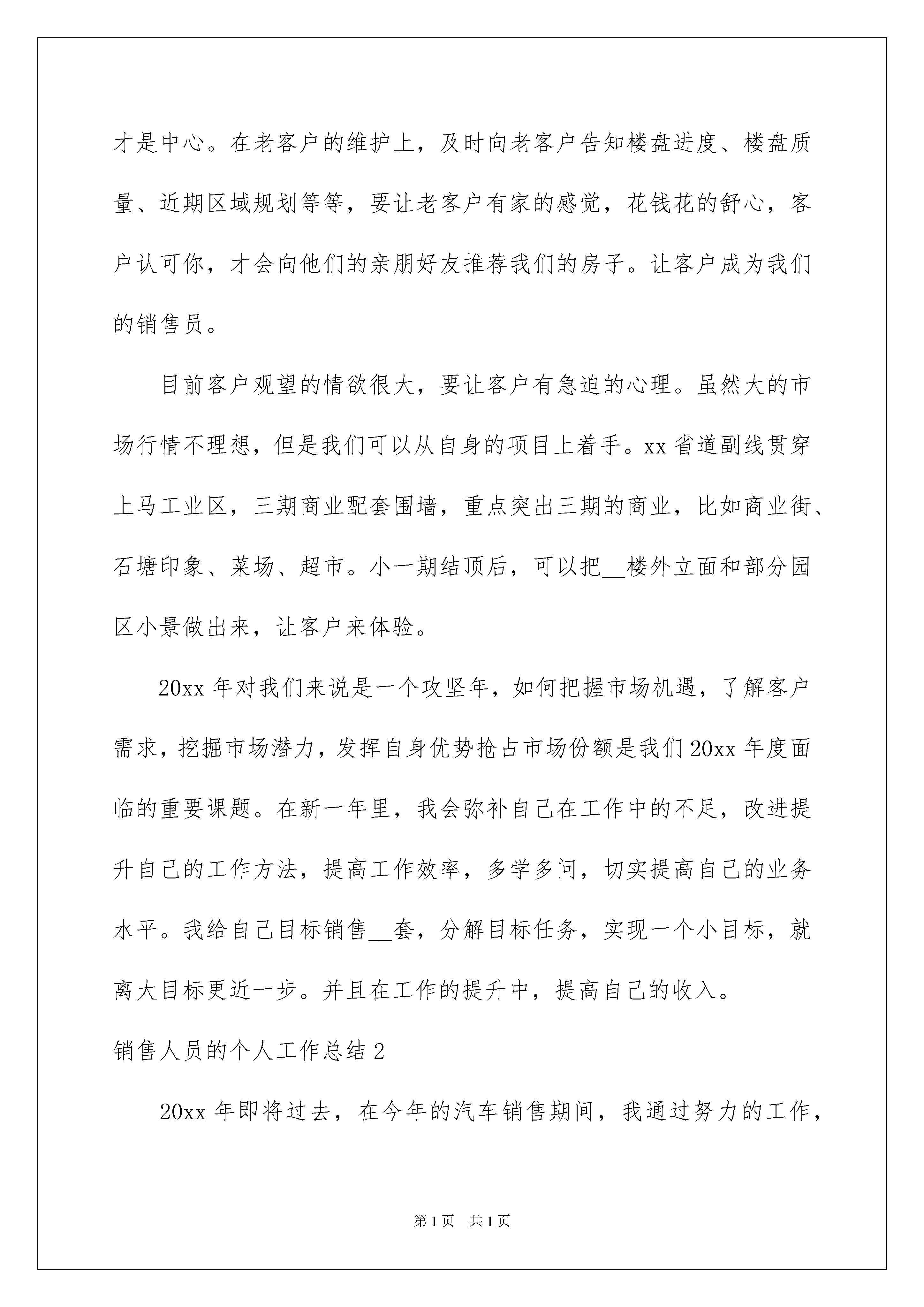 2022销售人员的个人工作总结销售人员的个人工作总结总结是在某一时期、某一项目或某些工作告一段落或者全部完成后进行回顾检查、分析评价,从而得出教训和一些规律性认识的一种书面材料,它在我们的学习、工作中起到呈上启下的作用,不妨让我们认真地完成总结吧。那么总结有什么格式呢?下面是我整理的销售人员的个人工作总结,仅供参考,大家一起来看看吧。销售人员的个人工作总结1又是一年末,在这辞旧迎新的日子里回首过去仿佛点点滴滴就在昨日。这一年有与同事协同攻关的艰辛,有遇到困难和挫折时的惆怅。时光过得飞快,不知不觉中,充满希望的一年就伴随着新年伊始即将临近。20xx年的x月,我第一次来到__这个海边风情小镇,领导带我熟悉了项目地块的位置和基本情况,并且对竞品楼盘进行市场调查。在领导的关心和照顾下,在同事的支持和帮助下,更还有案场经理给我们呕心沥血每天加班加点和细心耐心的培训学习。通过一段日子的磨砺我们可以初步进入销售,刚来时的不安稳因素和急躁心理已逐渐平稳下来。通过近一年的工作积累和摸索,对于未来的发展方向也有了一个初步的规划,我个人也渐渐的认为适合在这一行业走下去。今年总的客户接待量算是比较多,但是成绩却不容乐观。客户在观望的比较多,当然同行的竞争也激烈。从x月份到现在,各楼盘也纷纷的做各种活动,开盘、特价房、10万首付、买房送奔驰、体验式营销等等。而我们项目在_月1号售楼处正式开放。客户对我们期待很大,但因开盘时间在x月x号,从售楼处开放到开盘间隔太久,客户流失很多。经过领导开会讨论,我们楼盘决定下乡宣传而不再在售楼部守株待兔,到达各个乡镇街道我们发海报介绍户型邀约客户到项目参观。近一年我取得了一些成绩,但离要求有很大的差距,我将不断地总结经验,加强学习,更新观念,提高各方面的工作能力。紧紧围绕公司的中心工作,以对工作、对事业高度负责的态度,脚踏实地,尽职尽责地做好各项工作。对待新客户,要把我们的优势、卖点给客户讲清楚,让客户觉得住在我们这里有面子、物超所值。因为未来我们才是中心。在老客户的维护上,及时向老客户告知楼盘进度、楼盘质量、近期区域规划等等,要让老客户有家的感觉,花钱花的舒心,客户认可你,才会向他们的亲朋好友推荐我们的房子。让客户成为我们的销售员。目前客户观望的情欲很大,要让客户有急迫的心理。虽然大的市场行情不理想,但是我们可以从自身的项目上着手。xx省道副线贯穿上马工业区,三期商业配套围墙,重点突出三期的商业,比如商业街、石塘印象、菜场、超市。小一期结顶后,可以把__楼外立面和部分园区小景做出来,让客户来体验。20xx年对我们来说是一个攻坚年,如何把握市场机遇,了解客户需求,挖掘市场潜力,发挥自身优势抢占市场份额是我们20xx年度面临的重要课题。在新一年里,我会弥补自己在工作中的不足,改进提升自己的工作方法,提高工作效率,多学多问,切实提高自己的业务水平。我给自己目标销售__套,分解目标任务,实现一个小目标,就离大目标更近一步。并且在工作的提升中,提高自己的收入。销售人员的个人工作总结220xx年即将过去,在今年的汽车销售期间,我通过努力的工作,也有了一点的收获,借此对自己的工作做一下总结,目的在于吸取教训,提高自己,以至于把工作做的更好,自己有信心也有决心把今后的工作做到更好。20xx年汽车销售员工作总结:简要总结如下:我是20xx年*月*日来到贵公司工作的。作为一名新员工,我是没有汽车销售经验的,仅凭对销售工作的热情和喜爱,而缺乏对本行业销售经验和专业知识,为了迅速融入到这个行业中来,到公司之后,一切从零开始,一边学习专业知识,一边摸索汽车市场,遇到销售和专业方面的难点和问题,我会及时请教部门经理和其他有经验的同事,一起寻求解决问题的方案,在此,我非常感谢部门经理和同事对我的帮助!通过不断的学习专业知识,收取同行业之间的信息和积累汽车市场经验,现在我对汽车市场有了一个大概的了解,逐渐的可以清晰。流利的应对客户所提到的各种问题,对汽车市场的认识也有了一定的掌握。在不断的学习专业知识和积累经验的同时,自己的能力,业务水平都比以前有了一个较大幅度的提高。现存的缺点:对于汽车市场的了解还是不够深入,对专业知识掌握的还是不够充分,对一些大的问题不能快速拿出一个很好的解决问题的方法,在与客户的沟通过程中,缺乏经验。汽车市场分析:我所负责的区域为宁夏。西藏。青海。广西周边,在销售过程中,牵涉问题最多的就是价格,客户对价格非常敏感,怎样在第一时间获悉价格还需要我在今后的工作中去学习和掌握。广西区域现在主要从广东要车,价格和天津港差不多,而且发车和接车时间要远比从天津短的多,所以客户就不回