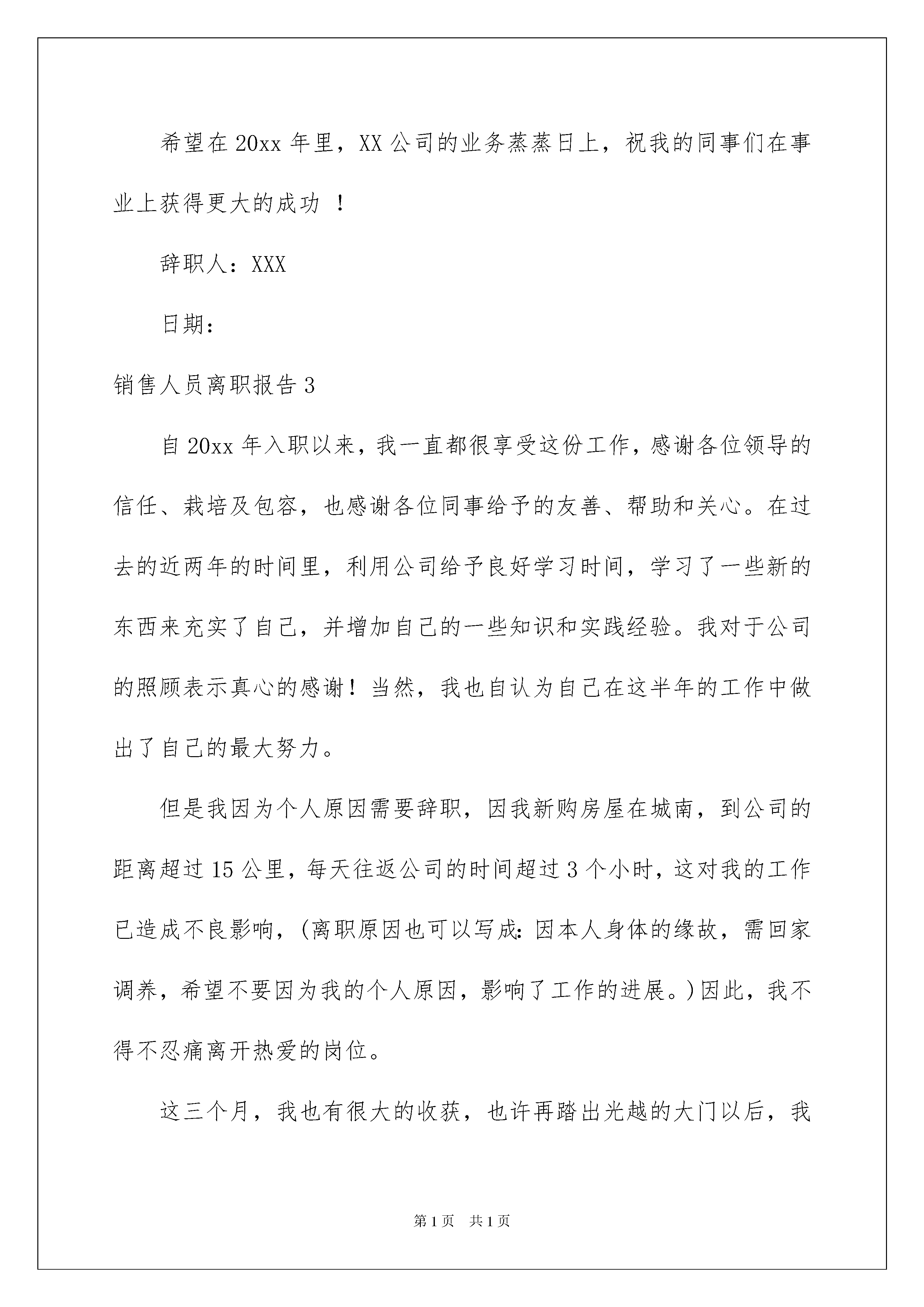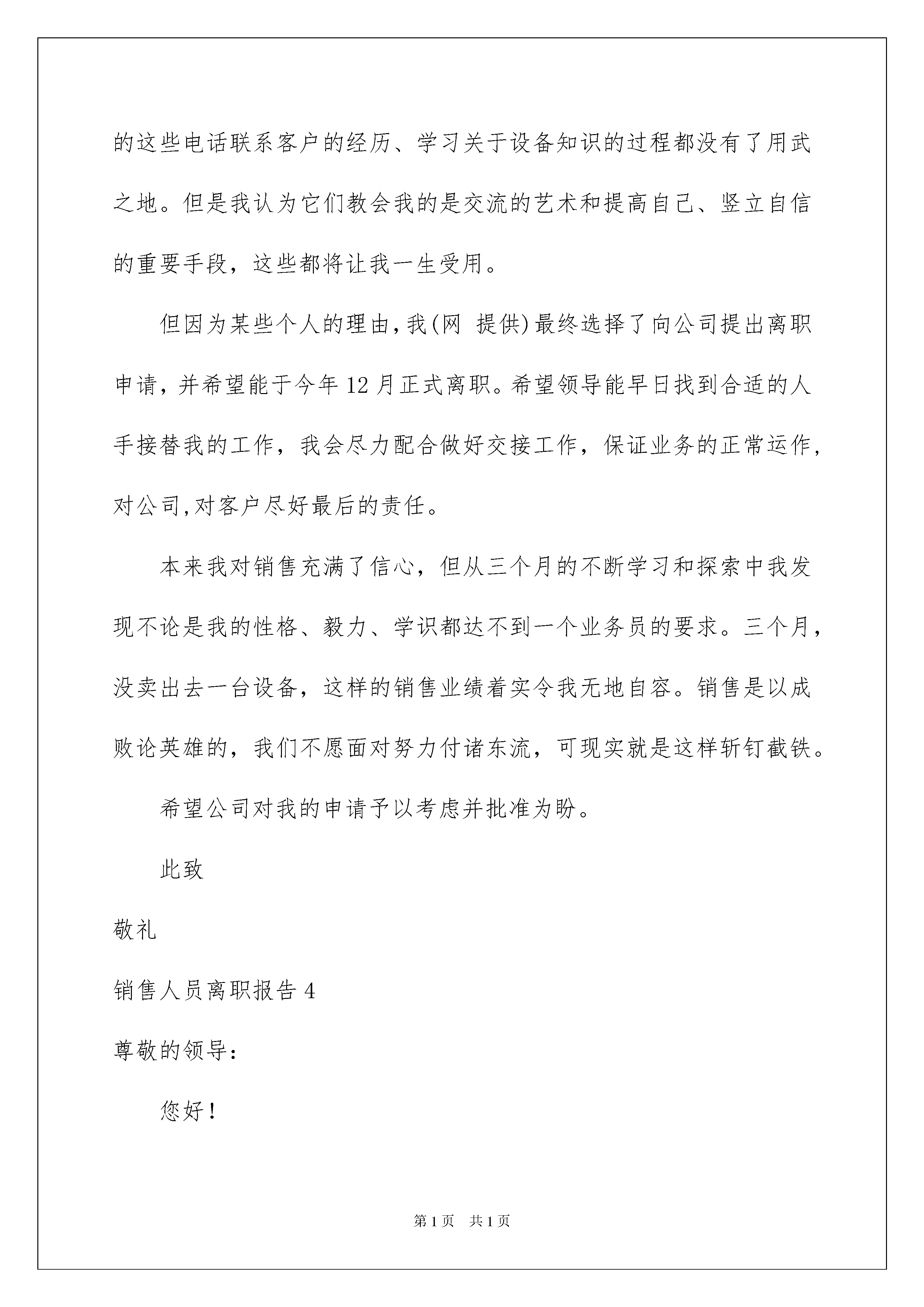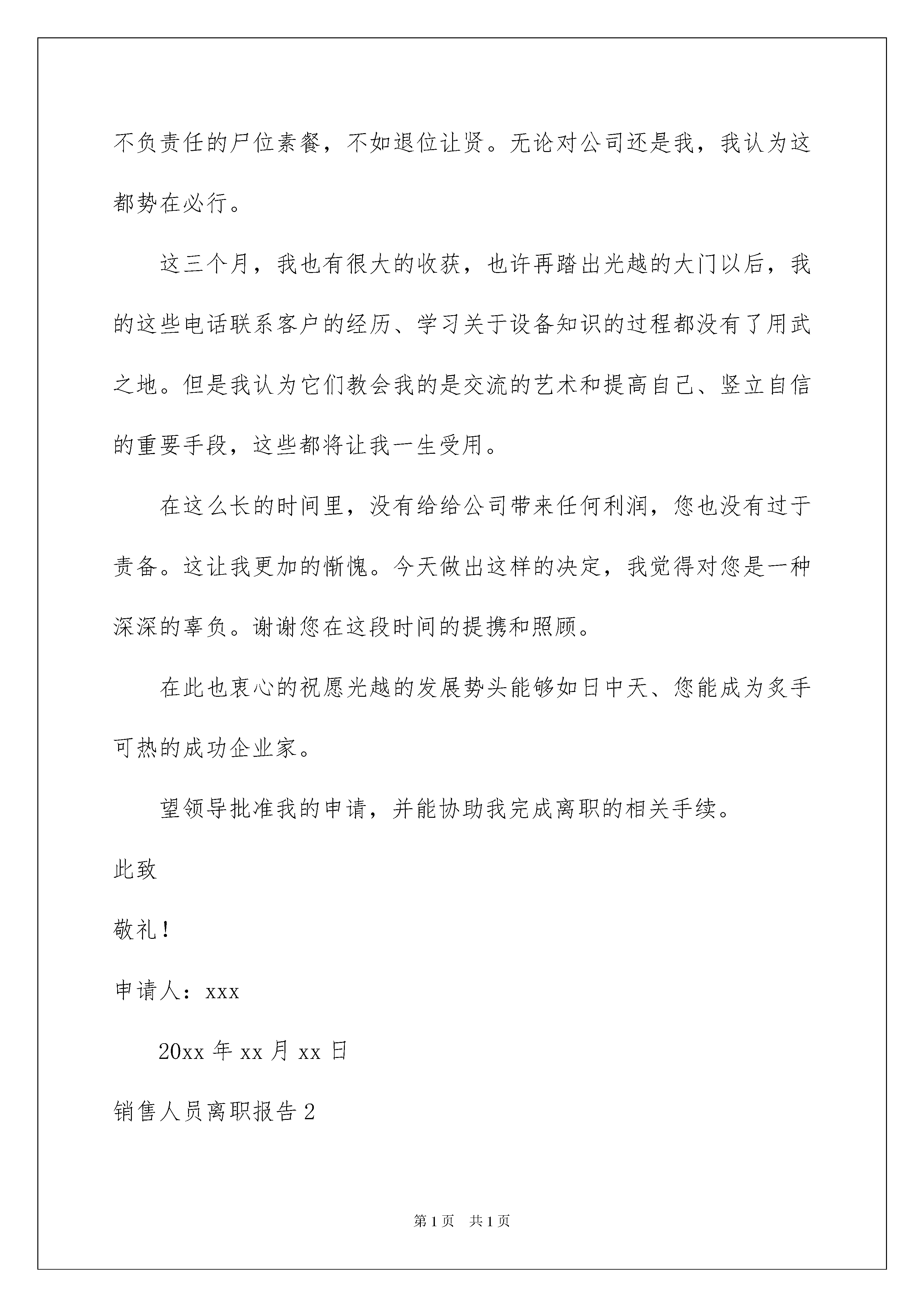 2022销售人员离职报告(6篇)销售人员离职报告(6篇)在不断进步的时代,大家逐渐认识到报告的重要性,报告根据用途的不同也有着不同的类型。我们应当如何写报告呢?以下是我为大家整理的销售人员离职报告,欢迎阅读,希望大家能够喜欢。销售人员离职报告1尊敬的邱总:您好!时光荏苒,不知不觉我来公司已经很长时间了。起初还梦想着成为一个成功的销售员,现在成为了幻影,确实让人沮丧。本来我对销售充满了信心,但从三个月的不断学习和探索中我发现不论是我的性格、毅力、学识都达不到一个业务员的要求。三个月,没卖出去一台设备,这样的销售业绩着实令我无地自容。销售是以成败论英雄的,我们不愿面对努力付诸东流,可现实就是这样斩钉截铁。现在我的工作兴趣锐减、工作态度消极。站在一个员工必须爱岗敬业的最基本的职业操守的立场上,我已经不能胜任这份工作。与其不负责任的尸位素餐,不如退位让贤。无论对公司还是我,我认为这都势在必行。这三个月,我也有很大的收获,也许再踏出光越的大门以后,我的这些电话联系客户的经历、学习关于设备知识的过程都没有了用武之地。但是我认为它们教会我的是交流的艺术和提高自己、竖立自信的重要手段,这些都将让我一生受用。在这么长的时间里,没有给给公司带来任何利润,您也没有过于责备。这让我更加的惭愧。今天做出这样的决定,我觉得对您是一种深深的辜负。谢谢您在这段时间的提携和照顾。在此也衷心的祝愿光越的发展势头能够如日中天、您能成为炙手可热的成功企业家。望领导批准我的申请,并能协助我完成离职的相关手续。此致敬礼!申请人:xxx20xx年xx月xx日销售人员离职报告2尊敬的X总经理,X副总经理:经过这几天的考虑,主要从未来个人技术发展的方面,我决定辞去目前的工作,我已经接受了一个朋友的邀请,去另外一家公司从事XX部门技术经理的工作。我非常重视在XX公司这半年的工作经历,也很荣幸自己曾经成为XX公司这个充满活力团体的一员,我确信我在XX公司的这段经历和经验,将会给我以后的职业发展带来非常大的帮助,很感谢X总经理当初给我一个XX公司工作的机会,我将以在XXX公司工作过而感到荣耀和自豪。由于离职的时间比较紧,我希望会在短时间内完成离职的手续,我的工作在公司内也比较特殊,既是比较专门的一面,目前和公司的主要研发工作又没有涉入太深.对于我曾经开发的系统,如果公司愿意,我仍然可以在短的时间内兼职为公司维护这些东西,随时帮助公司进行这些系统的后续开发和维护,直到公司另外招到适合此职位的人,如果需要,同时我也会抽时间帮助公司对新来的同事进行职位培训。谢谢!希望在20xx年里,XX公司的业务蒸蒸日上,祝我的同事们在事业上获得更大的成功!辞职人:XXX日期:销售人员离职报告3自20xx年入职以来,我一直都很享受这份工作,感谢各位领导的信任、栽培及包容,也感谢各位同事给予的友善、帮助和关心。在过去的近两年的时间里,利用公司给予良好学习时间,学习了一些新的东西来充实了自己,并增加自己的一些知识和实践经验。我对于公司的照顾表示真心的感谢!当然,我也自认为自己在这半年的工作中做出了自己的最大努力。但是我因为个人原因需要辞职,因我新购房屋在城南,到公司的距离超过15公里,每天往返公司的时间超过3个小时,这对我的工作已造成不良影响,(离职原因也可以写成:因本人身体的缘故,需回家调养,希望不要因为我的个人原因,影响了工作的进展。)因此,我不得不忍痛离开热爱的岗位。这三个月,我也有很大的收获,也许再踏出光越的大门以后,我的这些电话联系客户的经历、学习关于设备知识的过程都没有了用武之地。但是我认为它们教会我的是交流的艺术和提高自己、竖立自信的重要手段,这些都将让我一生受用。但因为某些个人的理由,我(网提供)最终选择了向公司提出离职申请,并希望能于今年12月正式离职。希望领导能早日找到合适的人手接替我的工作,我会尽力配合做好交接工作,保证业务的正常运作,对公司,对客户尽好最后的责任。本来我对销售充满了信心,但从三个月的不断学习和探索中我发现不论是我的性格、毅力、学识都达不到一个业务员的要求。三个月,没卖出去一台设备,这样的销售业绩着实令我无地自容。销售是以成败论英雄的,我们不愿面对努力付诸东流,可现实就是这样斩钉截铁。希望公司对我的申请予以考虑并批准为盼。此致敬礼销售人员离职报告4尊敬的领导:您好!在公司工作一年中,学到了很多知识,公司的.营业状态也是一直表现良好态势。非常感激公司给予了我这样的机会在良好的环境工作和学习。虽然在公司里基础的业务知识及专业知识已经基本掌握,但俗话说“学无止境”,有很多方面还是需不断学习。提出离职我想了很久,公司的环境