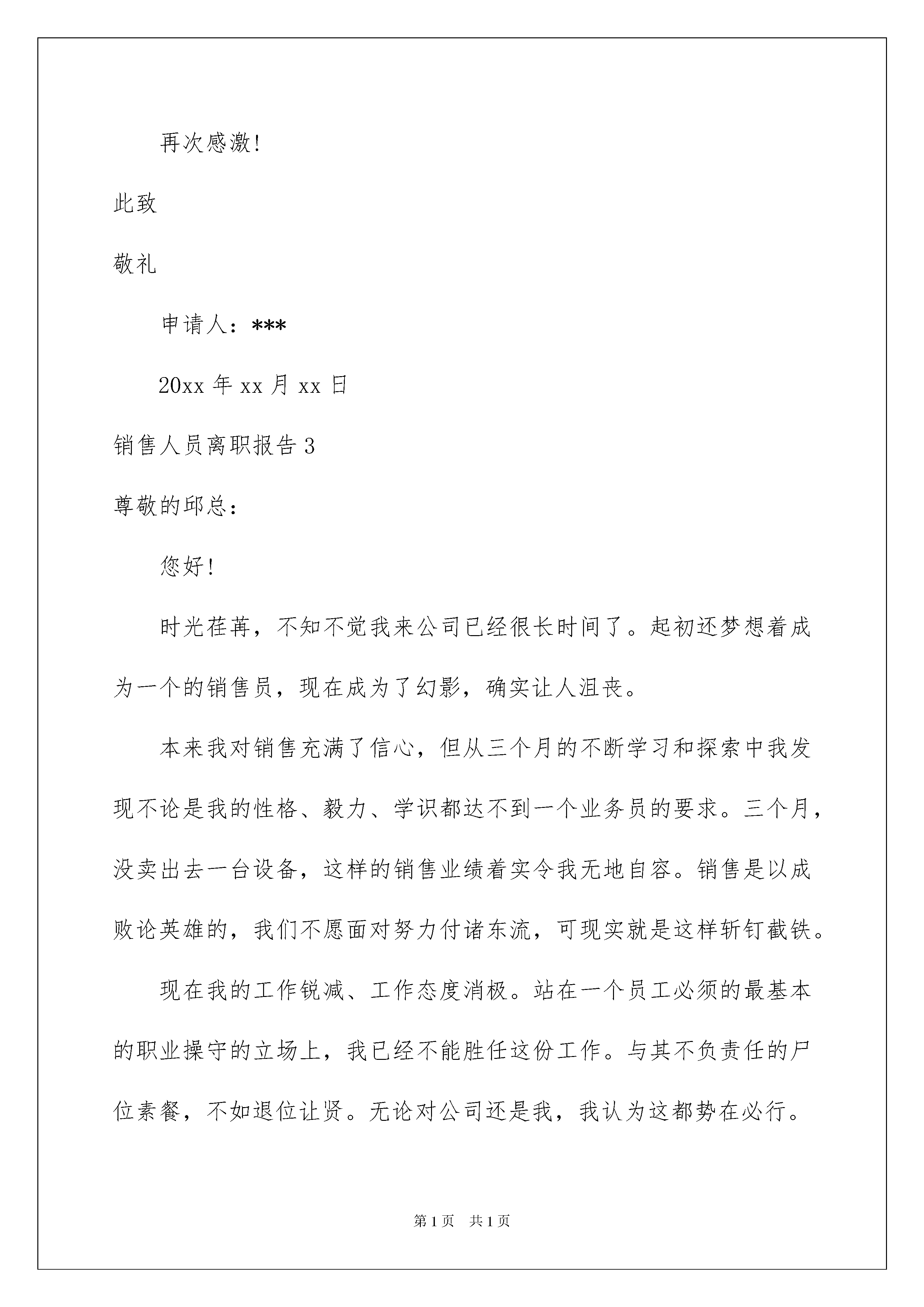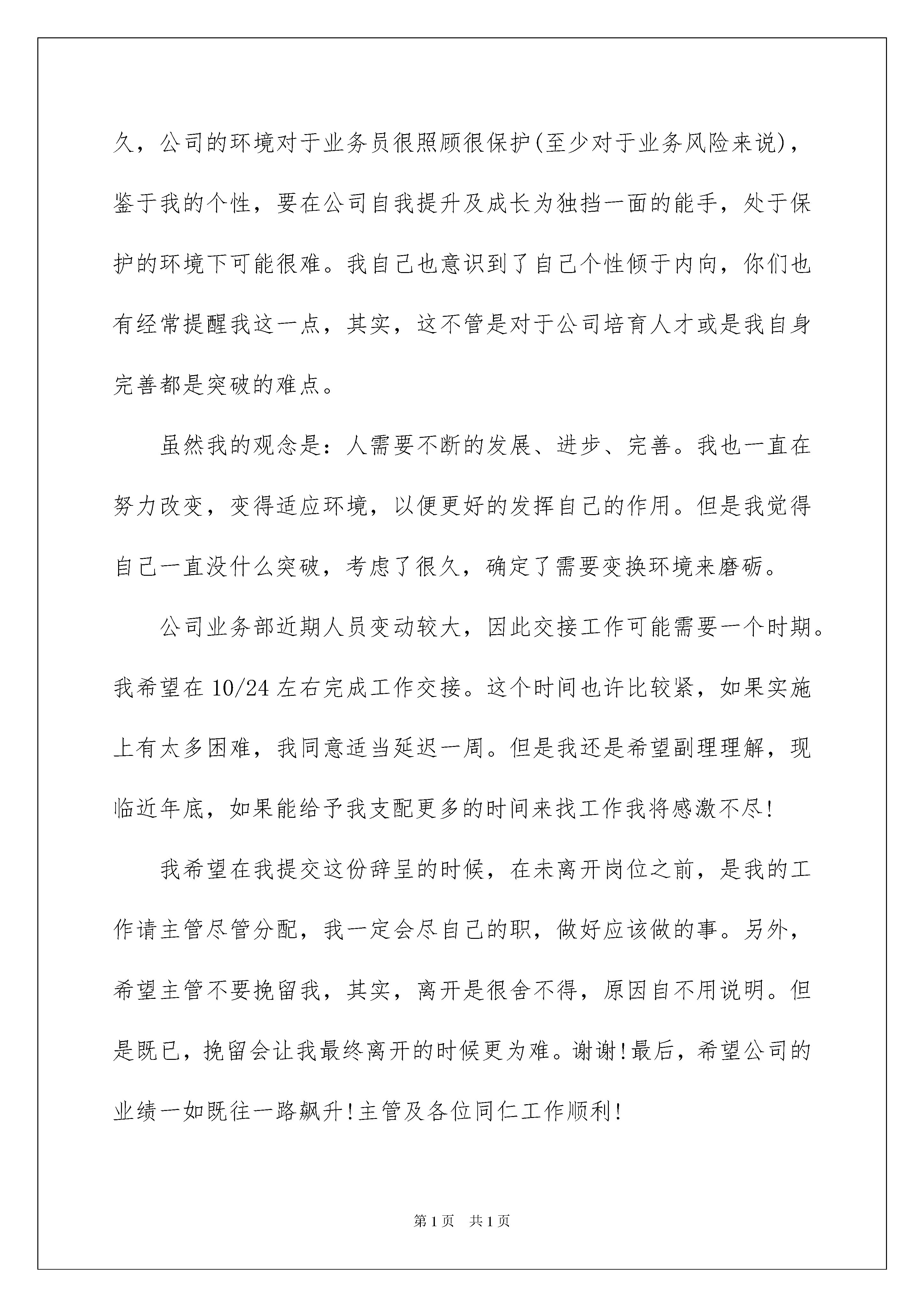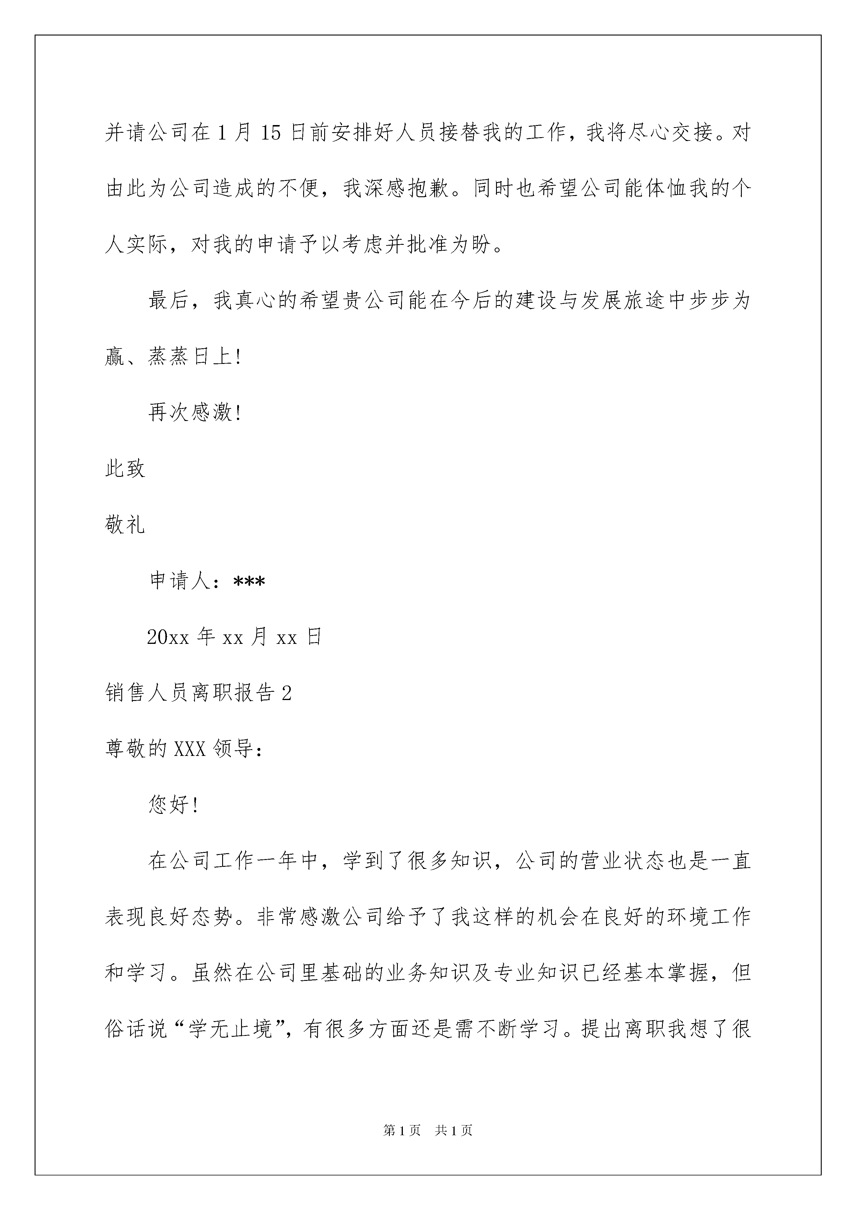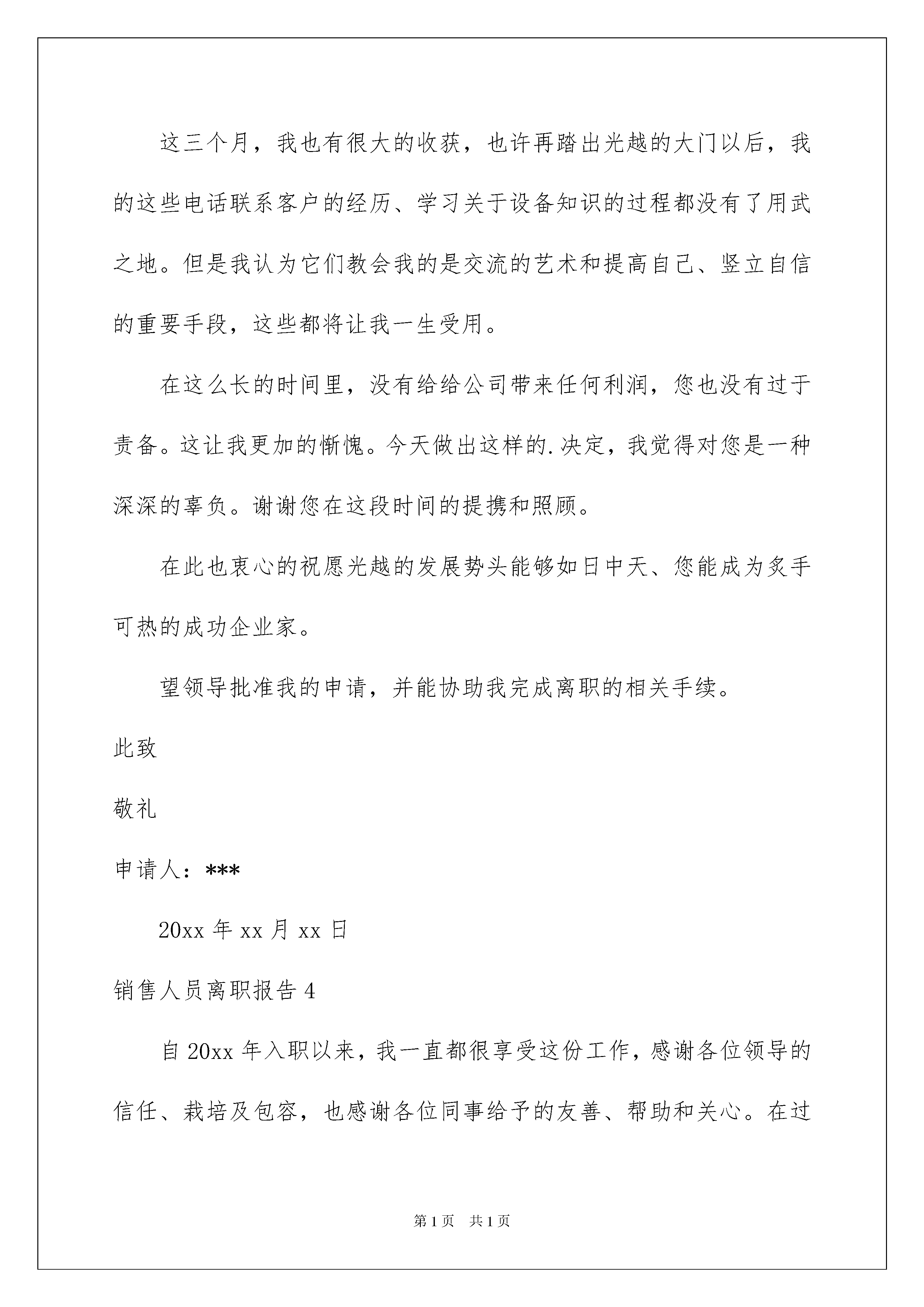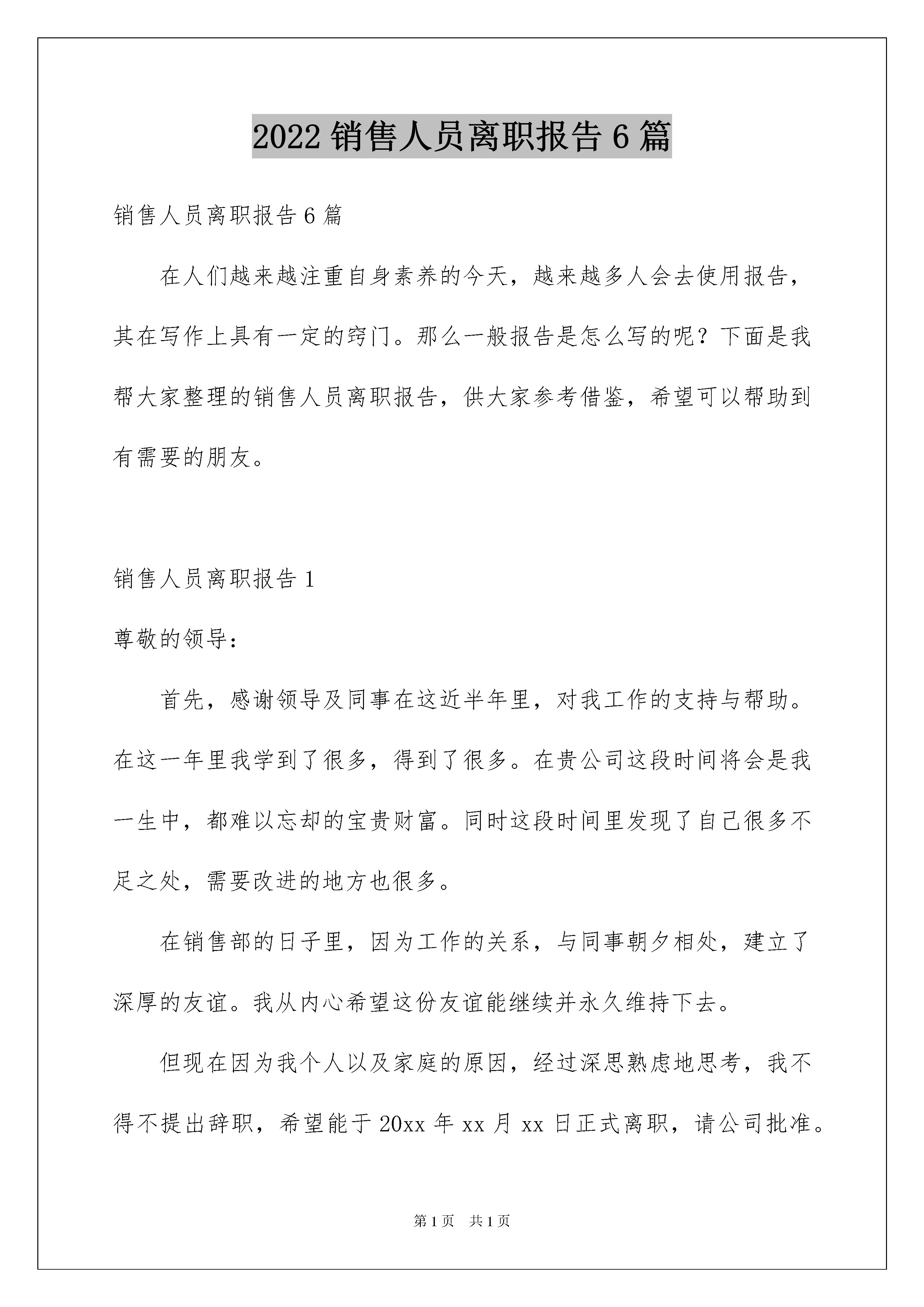 2022销售人员离职报告6篇销售人员离职报告6篇在人们越来越注重自身素养的今天,越来越多人会去使用报告,其在写作上具有一定的窍门。那么一般报告是怎么写的呢?下面是我帮大家整理的销售人员离职报告,供大家参考借鉴,希望可以帮助到有需要的朋友。销售人员离职报告1尊敬的领导:首先,感谢领导及同事在这近半年里,对我工作的支持与帮助。在这一年里我学到了很多,得到了很多。在贵公司这段时间将会是我一生中,都难以忘却的宝贵财富。同时这段时间里发现了自己很多不足之处,需要改进的地方也很多。在销售部的日子里,因为工作的关系,与同事朝夕相处,建立了深厚的友谊。我从内心希望这份友谊能继续并永久维持下去。但现在因为我个人以及家庭的原因,经过深思熟虑地思考,我不得不提出辞职,希望能于20xx年xx月xx日正式离职,请公司批准。并请公司在1月15日前安排好人员接替我的工作,我将尽心交接。对由此为公司造成的不便,我深感抱歉。同时也希望公司能体恤我的个人实际,对我的申请予以考虑并批准为盼。最后,我真心的希望贵公司能在今后的建设与发展旅途中步步为赢、蒸蒸日上!再次感激!此致敬礼申请人:***20xx年xx月xx日销售人员离职报告2尊敬的XXX领导:您好!在公司工作一年中,学到了很多知识,公司的营业状态也是一直表现良好态势。非常感激公司给予了我这样的机会在良好的环境工作和学习。虽然在公司里基础的业务知识及专业知识已经基本掌握,但俗话说“学无止境”,有很多方面还是需不断学习。提出离职我想了很久,公司的环境对于业务员很照顾很保护(至少对于业务风险来说),鉴于我的个性,要在公司自我提升及成长为独挡一面的能手,处于保护的环境下可能很难。我自己也意识到了自己个性倾于内向,你们也有经常提醒我这一点,其实,这不管是对于公司培育人才或是我自身完善都是突破的难点。虽然我的观念是:人需要不断的发展、进步、完善。我也一直在努力改变,变得适应环境,以便更好的发挥自己的作用。但是我觉得自己一直没什么突破,考虑了很久,确定了需要变换环境来磨砺。公司业务部近期人员变动较大,因此交接工作可能需要一个时期。我希望在10/24左右完成工作交接。这个时间也许比较紧,如果实施上有太多困难,我同意适当延迟一周。但是我还是希望副理理解,现临近年底,如果能给予我支配更多的时间来找工作我将感激不尽!我希望在我提交这份辞呈的时候,在未离开岗位之前,是我的工作请主管尽管分配,我一定会尽自己的职,做好应该做的事。另外,希望主管不要挽留我,其实,离开是很舍不得,原因自不用说明。但是既已,挽留会让我最终离开的时候更为难。谢谢!最后,希望公司的业绩一如既往一路飙升!主管及各位同仁工作顺利!再次感激!此致敬礼申请人:***20xx年xx月xx日销售人员离职报告3尊敬的邱总:您好!时光荏苒,不知不觉我来公司已经很长时间了。起初还梦想着成为一个的销售员,现在成为了幻影,确实让人沮丧。本来我对销售充满了信心,但从三个月的不断学习和探索中我发现不论是我的性格、毅力、学识都达不到一个业务员的要求。三个月,没卖出去一台设备,这样的销售业绩着实令我无地自容。销售是以成败论英雄的,我们不愿面对努力付诸东流,可现实就是这样斩钉截铁。现在我的工作锐减、工作态度消极。站在一个员工必须的最基本的职业操守的立场上,我已经不能胜任这份工作。与其不负责任的尸位素餐,不如退位让贤。无论对公司还是我,我认为这都势在必行。这三个月,我也有很大的收获,也许再踏出光越的大门以后,我的这些电话联系客户的经历、学习关于设备知识的过程都没有了用武之地。但是我认为它们教会我的是交流的艺术和提高自己、竖立自信的重要手段,这些都将让我一生受用。在这么长的时间里,没有给给公司带来任何利润,您也没有过于责备。这让我更加的惭愧。今天做出这样的.决定,我觉得对您是一种深深的辜负。谢谢您在这段时间的提携和照顾。在此也衷心的祝愿光越的发展势头能够如日中天、您能成为炙手可热的成功企业家。望领导批准我的申请,并能协助我完成离职的相关手续。此致敬礼申请人:***20xx年xx月xx日销售人员离职报告4自20xx年入职以来,我一直都很享受这份工作,感谢各位领导的信任、栽培及包容,也感谢各位同事给予的友善、帮助和关心。在过去的近两年的时间里,利用公司给予良好学习时间,学习了一些新的东西来充实了自己,并增加自己的一些知识和实践经验。我对于公司的照顾表示真心的感谢!当然,我也自认为自己在这半年的工作中做出了自己的最大努力。但是我因为个人原因需要辞职,因我新购房屋在城南,到公司的距离超过15公里,每天往返公司的时间超过3个小时,这对我的工作已造成不良