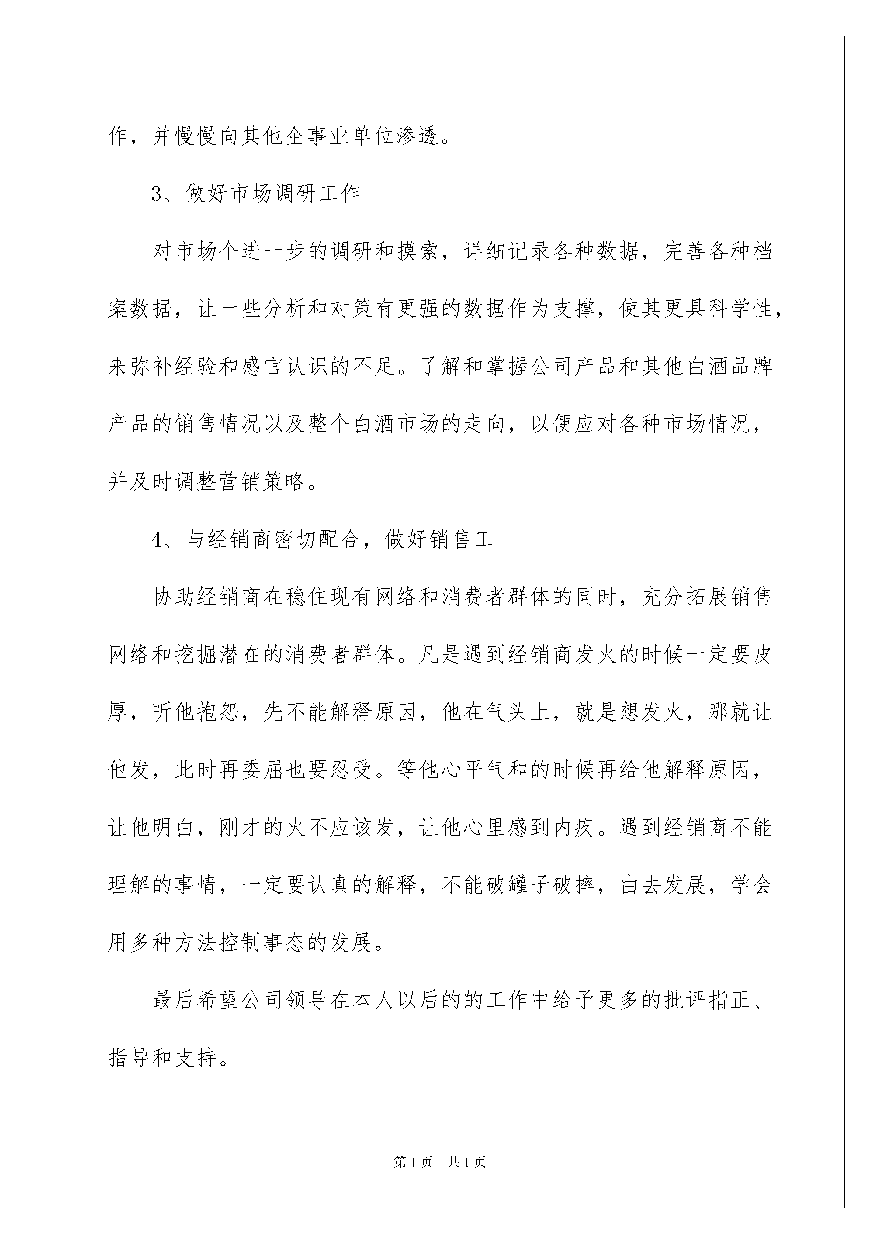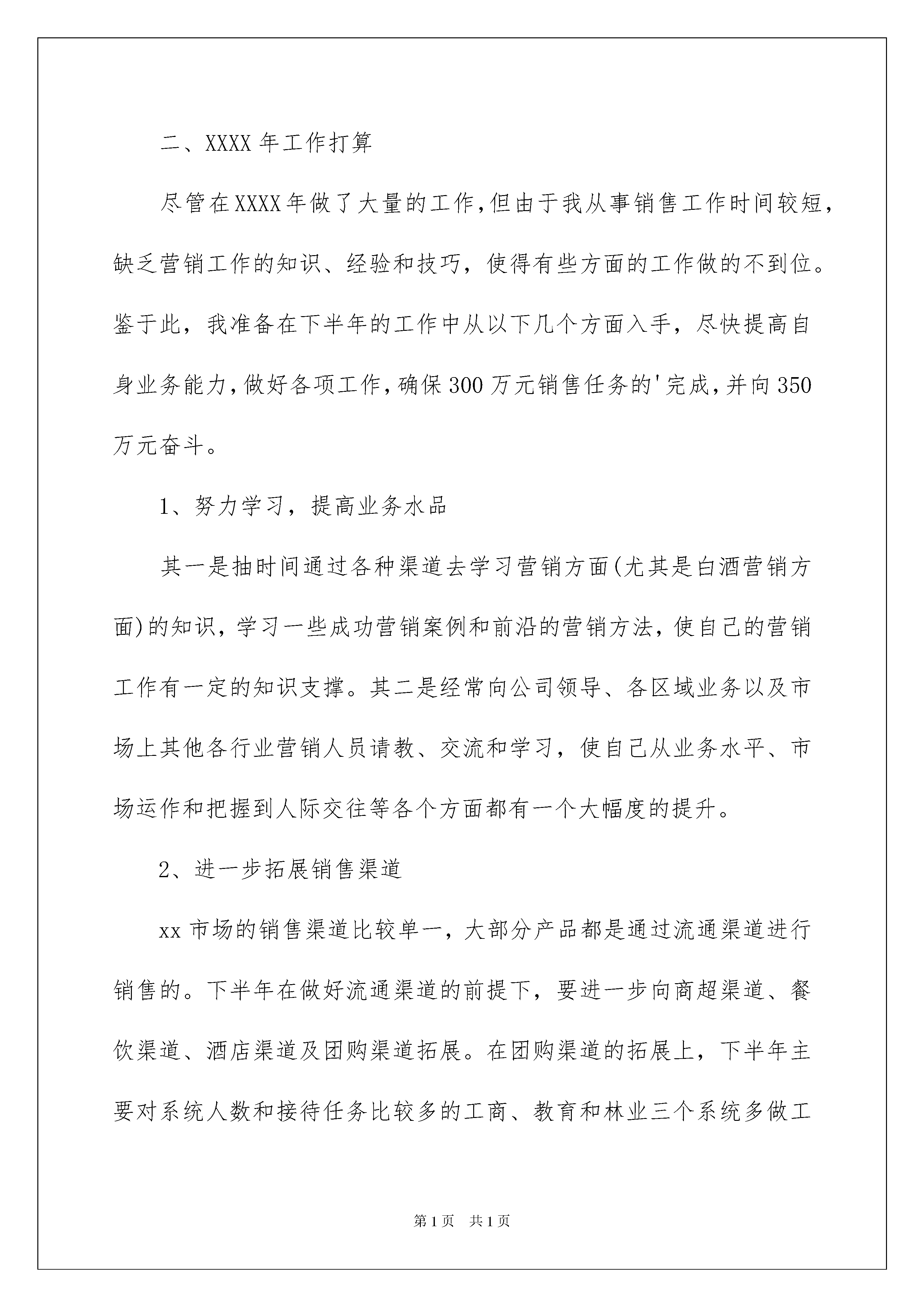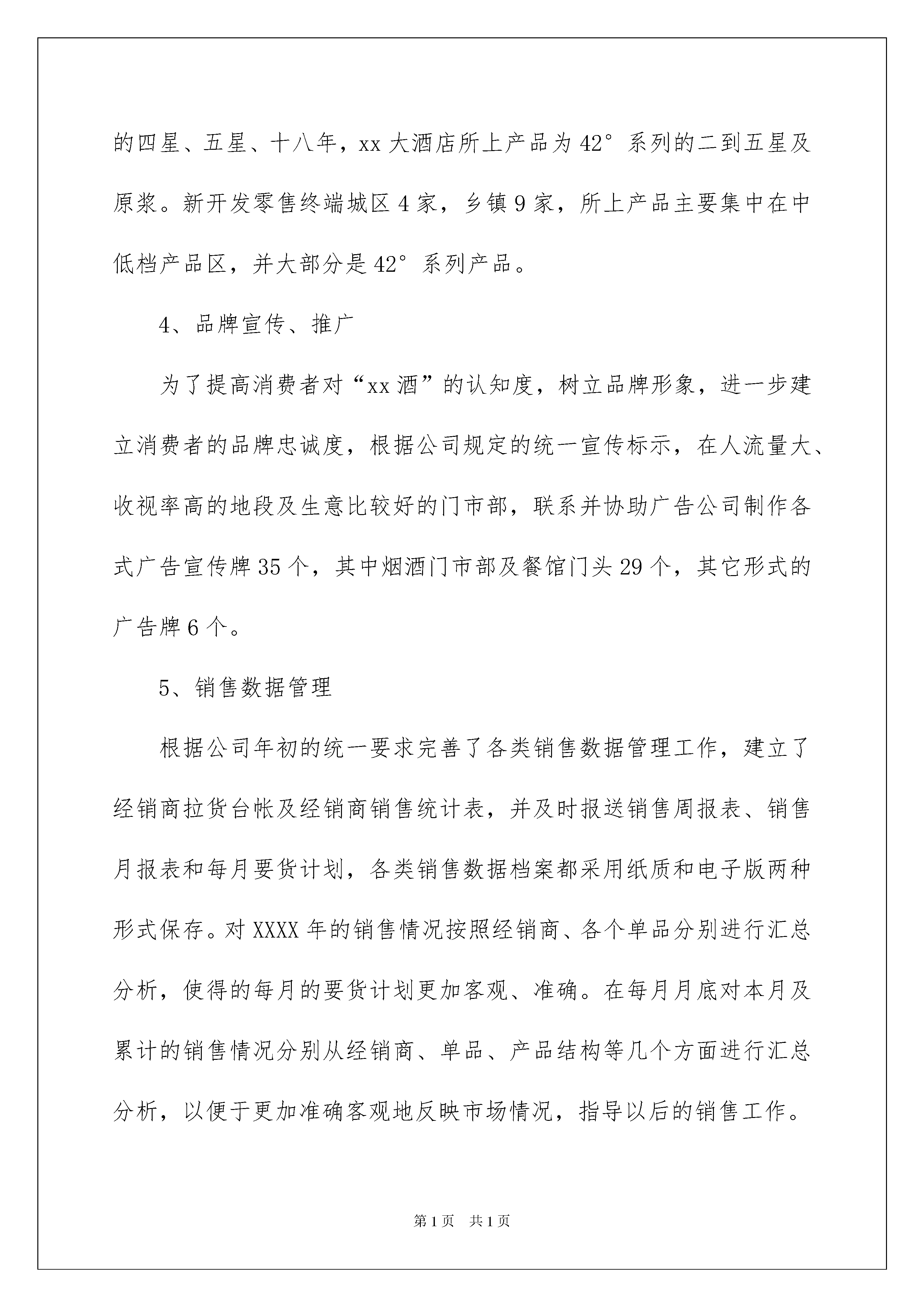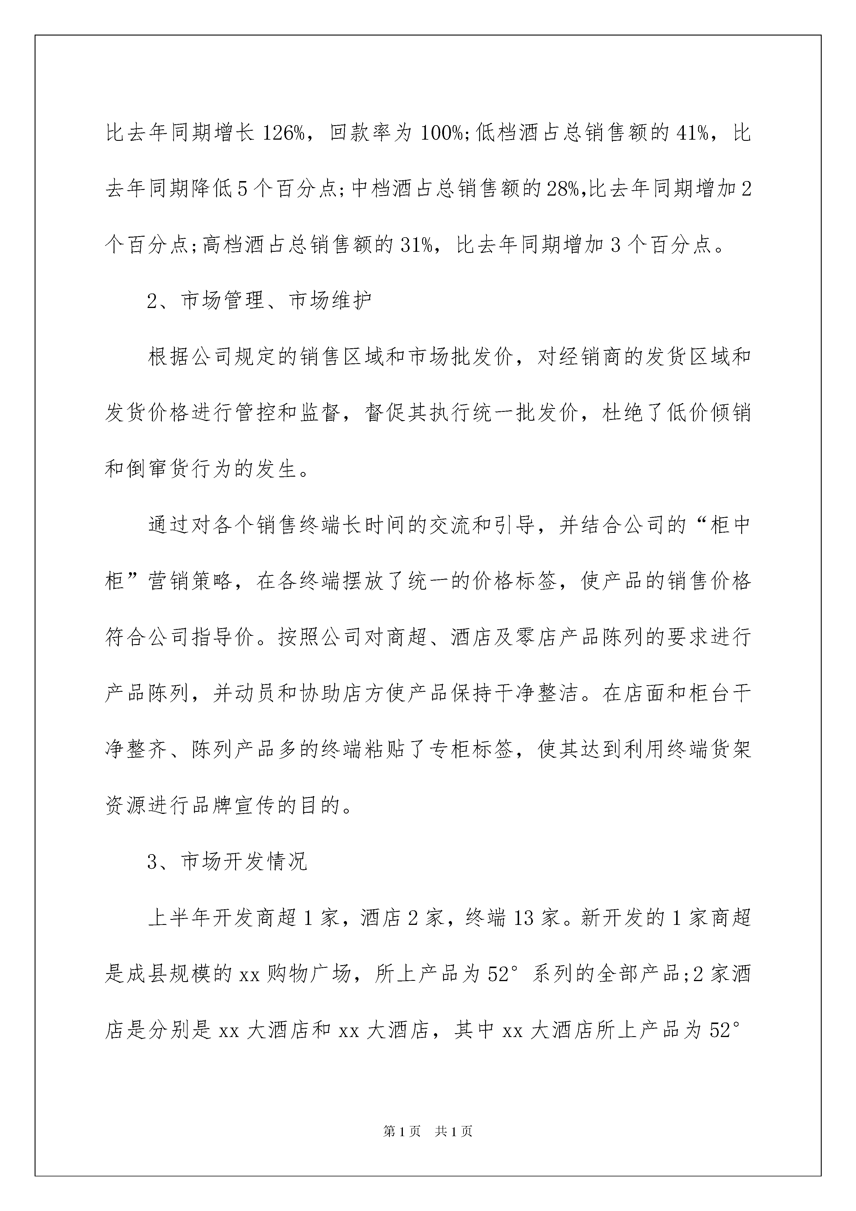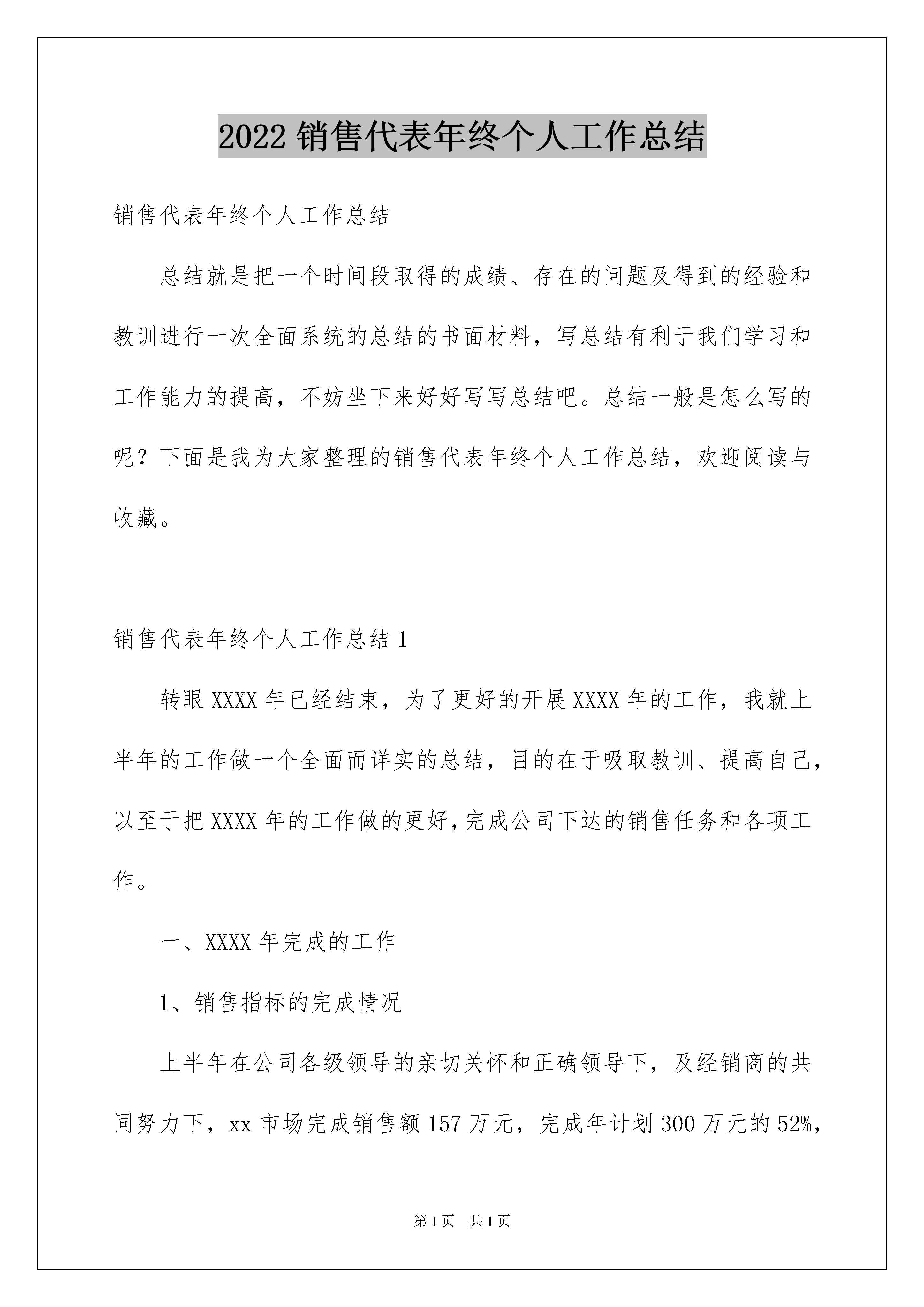 2022销售代表年终个人工作总结销售代表年终个人工作总结总结就是把一个时间段取得的成绩、存在的问题及得到的经验和教训进行一次全面系统的总结的书面材料,写总结有利于我们学习和工作能力的提高,不妨坐下来好好写写总结吧。总结一般是怎么写的呢?下面是我为大家整理的销售代表年终个人工作总结,欢迎阅读与收藏。销售代表年终个人工作总结1转眼XXXX年已经结束,为了更好的开展XXXX年的工作,我就上半年的工作做一个全面而详实的总结,目的在于吸取教训、提高自己,以至于把XXXX年的工作做的更好,完成公司下达的销售任务和各项工作。一、XXXX年完成的工作1、销售指标的完成情况上半年在公司各级领导的亲切关怀和正确领导下,及经销商的共同努力下,xx市场完成销售额157万元,完成年计划300万元的52%,比去年同期增长126%,回款率为100%;低档酒占总销售额的41%,比去年同期降低5个百分点;中档酒占总销售额的28%,比去年同期增加2个百分点;高档酒占总销售额的31%,比去年同期增加3个百分点。2、市场管理、市场维护根据公司规定的销售区域和市场批发价,对经销商的发货区域和发货价格进行管控和监督,督促其执行统一批发价,杜绝了低价倾销和倒窜货行为的发生。通过对各个销售终端长时间的交流和引导,并结合公司的“柜中柜”营销策略,在各终端摆放了统一的价格标签,使产品的销售价格符合公司指导价。按照公司对商超、酒店及零店产品陈列的要求进行产品陈列,并动员和协助店方使产品保持干净整洁。在店面和柜台干净整齐、陈列产品多的终端粘贴了专柜标签,使其达到利用终端货架资源进行品牌宣传的目的。3、市场开发情况上半年开发商超1家,酒店2家,终端13家。新开发的1家商超是成县规模的xx购物广场,所上产品为52°系列的全部产品;2家酒店是分别是xx大酒店和xx大酒店,其中xx大酒店所上产品为52°的四星、五星、十八年,xx大酒店所上产品为42°系列的二到五星及原浆。新开发零售终端城区4家,乡镇9家,所上产品主要集中在中低档产品区,并大部分是42°系列产品。4、品牌宣传、推广为了提高消费者对“xx酒”的认知度,树立品牌形象,进一步建立消费者的品牌忠诚度,根据公司规定的统一宣传标示,在人流量大、收视率高的地段及生意比较好的门市部,联系并协助广告公司制作各式广告宣传牌35个,其中烟酒门市部及餐馆门头29个,其它形式的广告牌6个。5、销售数据管理根据公司年初的统一要求完善了各类销售数据管理工作,建立了经销商拉货台帐及经销商销售统计表,并及时报送销售周报表、销售月报表和每月要货计划,各类销售数据档案都采用纸质和电子版两种形式保存。对XXXX年的销售情况按照经销商、各个单品分别进行汇总分析,使得的每月的要货计划更加客观、准确。在每月月底对本月及累计的销售情况分别从经销商、单品、产品结构等几个方面进行汇总分析,以便于更加准确客观地反映市场情况,指导以后的销售工作。二、XXXX年工作打算尽管在XXXX年做了大量的工作,但由于我从事销售工作时间较短,缺乏营销工作的知识、经验和技巧,使得有些方面的工作做的不到位。鉴于此,我准备在下半年的工作中从以下几个方面入手,尽快提高自身业务能力,做好各项工作,确保300万元销售任务的'完成,并向350万元奋斗。1、努力学习,提高业务水品其一是抽时间通过各种渠道去学习营销方面(尤其是白酒营销方面)的知识,学习一些成功营销案例和前沿的营销方法,使自己的营销工作有一定的知识支撑。其二是经常向公司领导、各区域业务以及市场上其他各行业营销人员请教、交流和学习,使自己从业务水平、市场运作和把握到人际交往等各个方面都有一个大幅度的提升。2、进一步拓展销售渠道xx市场的销售渠道比较单一,大部分产品都是通过流通渠道进行销售的。下半年在做好流通渠道的前提下,要进一步向商超渠道、餐饮渠道、酒店渠道及团购渠道拓展。在团购渠道的拓展上,下半年主要对系统人数和接待任务比较多的工商、教育和林业三个系统多做工作,并慢慢向其他企事业单位渗透。3、做好市场调研工作对市场个进一步的调研和摸索,详细记录各种数据,完善各种档案数据,让一些分析和对策有更强的数据作为支撑,使其更具科学性,来弥补经验和感官认识的不足。了解和掌握公司产品和其他白酒品牌产品的销售情况以及整个白酒市场的走向,以便应对各种市场情况,并及时调整营销策略。4、与经销商密切配合,做好销售工协助经销商在稳住现有网络和消费者群体的同时,充分拓展销售网络和挖掘潜在的消费者群体。凡是遇到经销商发火的时候一定要皮厚,听他抱怨,先不能解释原因,他在气头上,就是想发火,那就让他发,此时再委屈也要忍受。