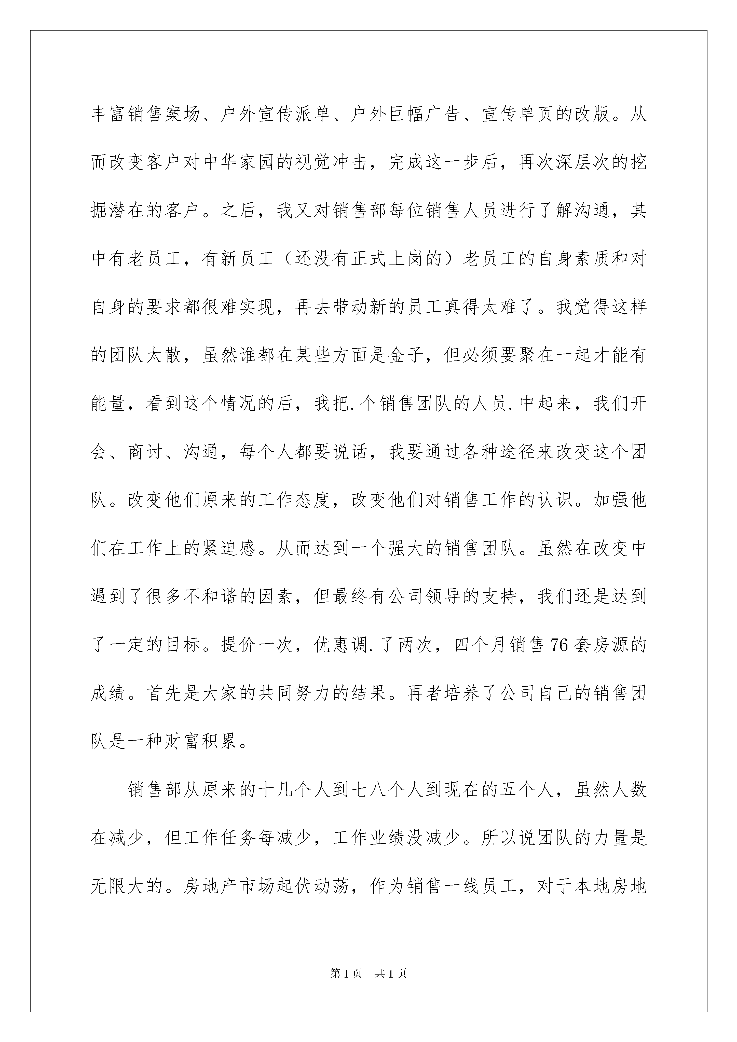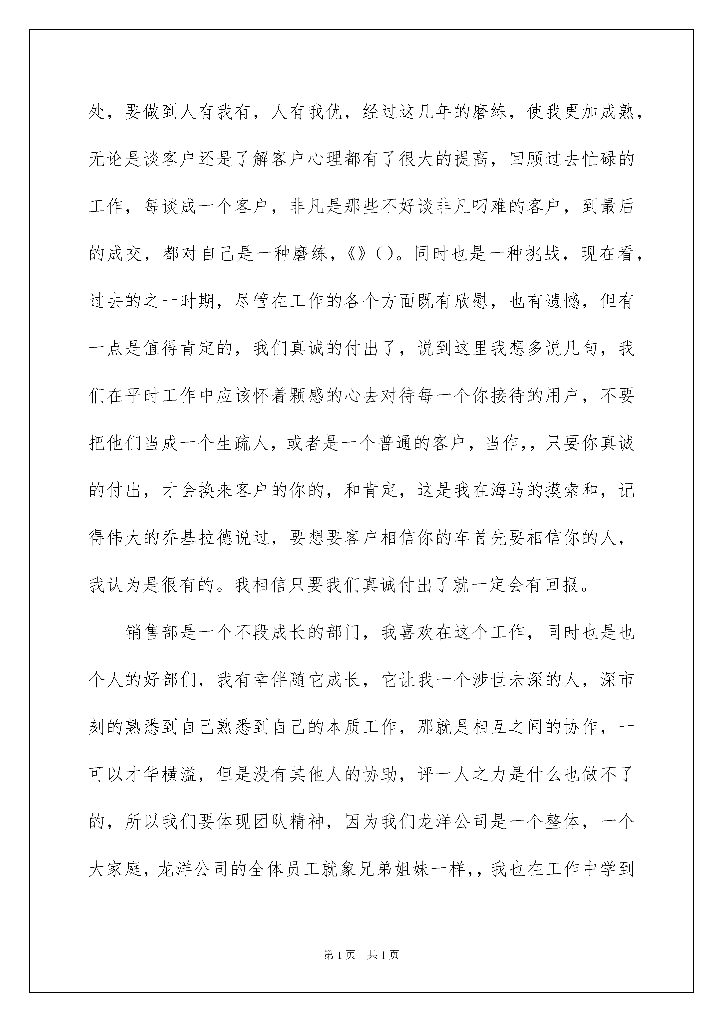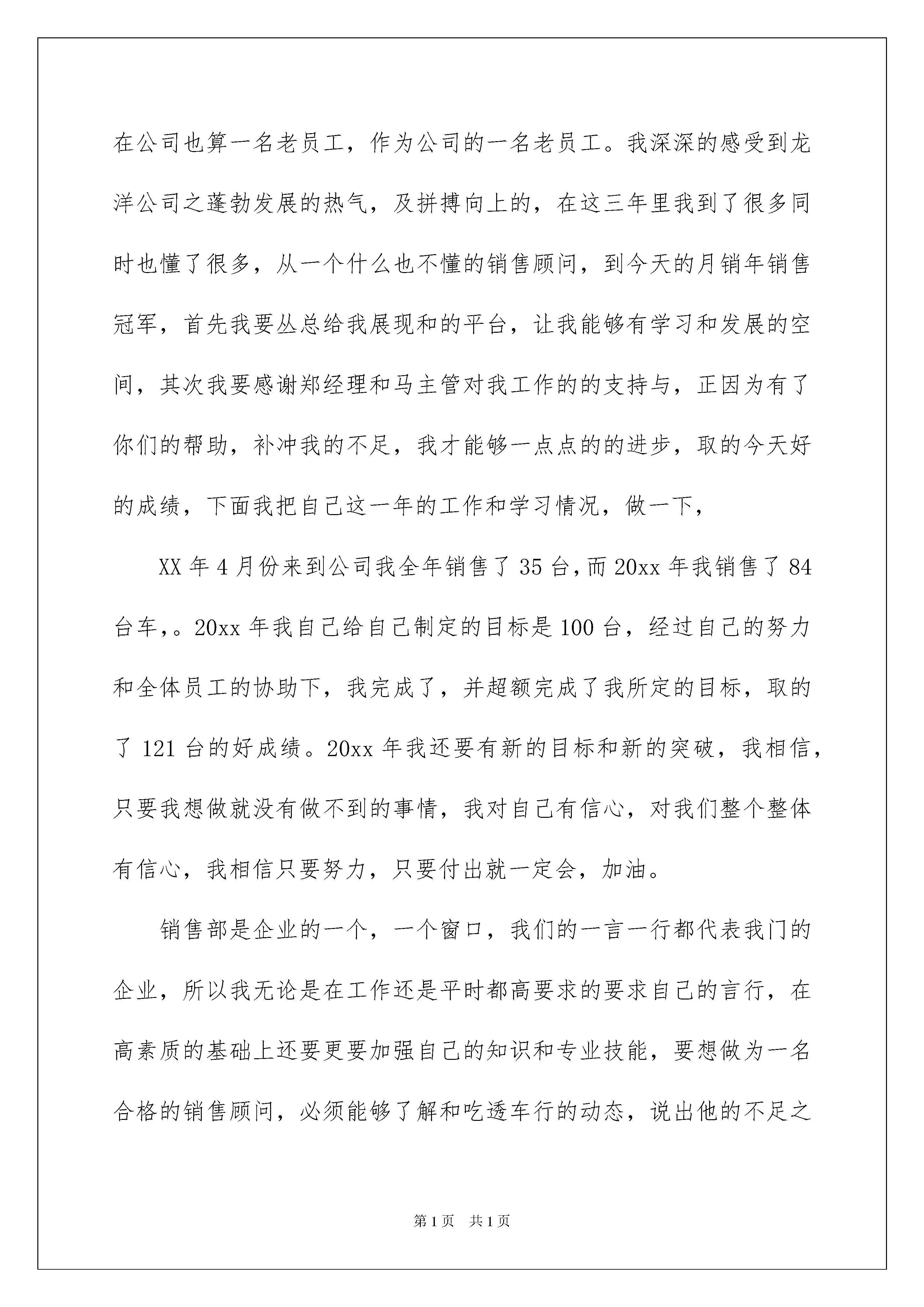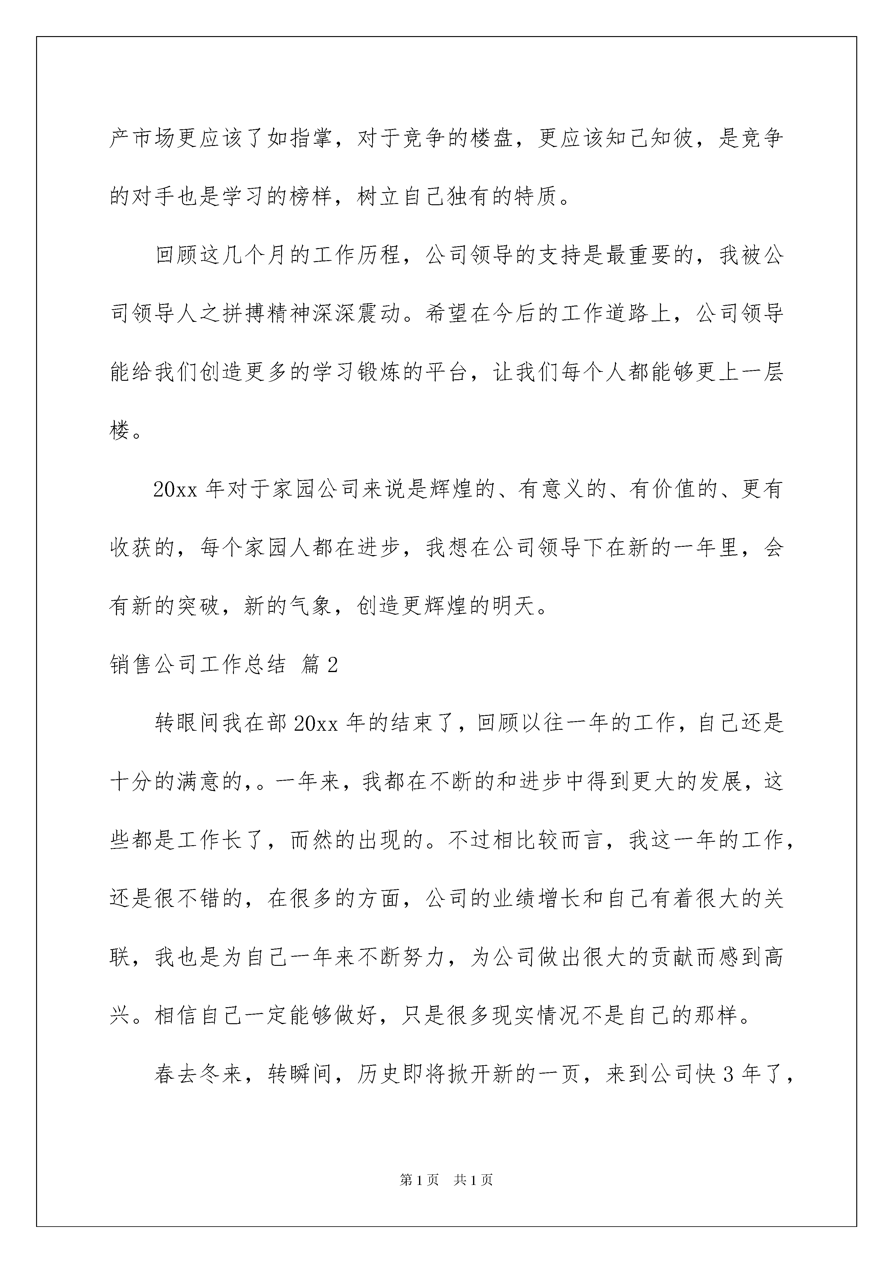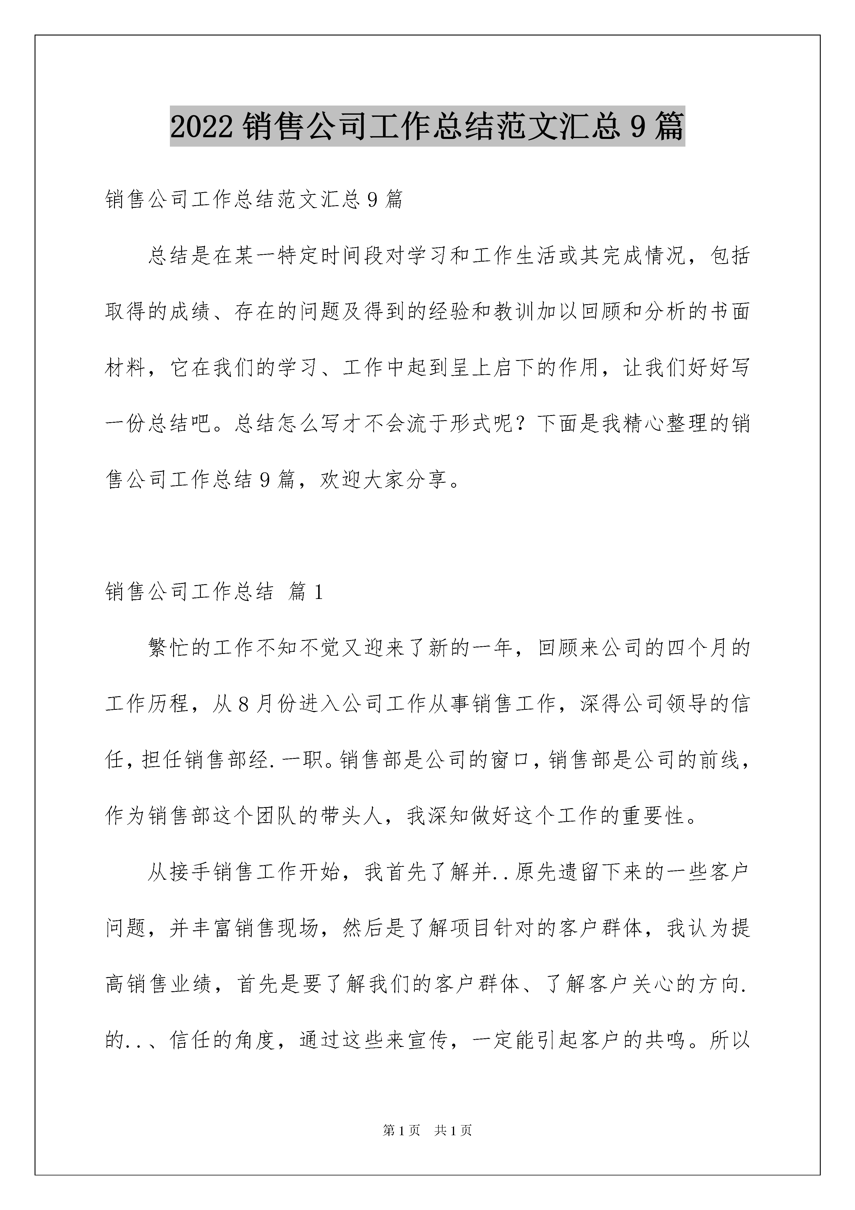 2022销售公司工作总结范文汇总9篇销售公司工作总结范文汇总9篇总结是在某一特定时间段对学习和工作生活或其完成情况,包括取得的成绩、存在的问题及得到的经验和教训加以回顾和分析的书面材料,它在我们的学习、工作中起到呈上启下的作用,让我们好好写一份总结吧。总结怎么写才不会流于形式呢?下面是我精心整理的销售公司工作总结9篇,欢迎大家分享。销售公司工作总结篇1繁忙的工作不知不觉又迎来了新的一年,回顾来公司的四个月的工作历程,从8月份进入公司工作从事销售工作,深得公司领导的信任,担任销售部经.一职。销售部是公司的窗口,销售部是公司的前线,作为销售部这个团队的带头人,我深知做好这个工作的重要性。从接手销售工作开始,我首先了解并..原先遗留下来的一些客户问题,并丰富销售现场,然后是了解项目针对的客户群体,我认为提高销售业绩,首先是要了解我们的客户群体、了解客户关心的方向.的..、信任的角度,通过这些来宣传,一定能引起客户的共鸣。所以丰富销售案场、户外宣传派单、户外巨幅广告、宣传单页的改版。从而改变客户对中华家园的视觉冲击,完成这一步后,再次深层次的挖掘潜在的客户。之后,我又对销售部每位销售人员进行了解沟通,其中有老员工,有新员工(还没有正式上岗的)老员工的自身素质和对自身的要求都很难实现,再去带动新的员工真得太难了。我觉得这样的团队太散,虽然谁都在某些方面是金子,但必须要聚在一起才能有能量,看到这个情况的后,我把.个销售团队的人员.中起来,我们开会、商讨、沟通,每个人都要说话,我要通过各种途径来改变这个团队。改变他们原来的工作态度,改变他们对销售工作的认识。加强他们在工作上的紧迫感。从而达到一个强大的销售团队。虽然在改变中遇到了很多不和谐的因素,但最终有公司领导的支持,我们还是达到了一定的目标。提价一次,优惠调.了两次,四个月销售76套房源的成绩。首先是大家的共同努力的结果。再者培养了公司自己的销售团队是一种财富积累。销售部从原来的十几个人到七八个人到现在的五个人,虽然人数在减少,但工作任务每减少,工作业绩没减少。所以说团队的力量是无限大的。房地产市场起伏动荡,作为销售一线员工,对于本地房地产市场更应该了如指掌,对于竞争的楼盘,更应该知己知彼,是竞争的对手也是学习的榜样,树立自己独有的特质。回顾这几个月的工作历程,公司领导的支持是最重要的,我被公司领导人之拼搏精神深深震动。希望在今后的工作道路上,公司领导能给我们创造更多的学习锻炼的平台,让我们每个人都能够更上一层楼。20xx年对于家园公司来说是辉煌的、有意义的、有价值的、更有收获的,每个家园人都在进步,我想在公司领导下在新的一年里,会有新的突破,新的气象,创造更辉煌的明天。销售公司工作总结篇2转眼间我在部20xx年的结束了,回顾以往一年的工作,自己还是十分的满意的,。一年来,我都在不断的和进步中得到更大的发展,这些都是工作长了,而然的出现的。不过相比较而言,我这一年的工作,还是很不错的,在很多的方面,公司的业绩增长和自己有着很大的关联,我也是为自己一年来不断努力,为公司做出很大的贡献而感到高兴。相信自己一定能够做好,只是很多现实情况不是自己的那样。春去冬来,转瞬间,历史即将掀开新的一页,来到公司快3年了,在公司也算一名老员工,作为公司的一名老员工。我深深的感受到龙洋公司之蓬勃发展的热气,及拼搏向上的,在这三年里我到了很多同时也懂了很多,从一个什么也不懂的销售顾问,到今天的月销年销售冠军,首先我要丛总给我展现和的平台,让我能够有学习和发展的空间,其次我要感谢郑经理和马主管对我工作的的支持与,正因为有了你们的帮助,补冲我的不足,我才能够一点点的的进步,取的今天好的成绩,下面我把自己这一年的工作和学习情况,做一下,XX年4月份来到公司我全年销售了35台,而20xx年我销售了84台车,。20xx年我自己给自己制定的目标是100台,经过自己的努力和全体员工的协助下,我完成了,并超额完成了我所定的目标,取的了121台的好成绩。20xx年我还要有新的目标和新的突破,我相信,只要我想做就没有做不到的事情,我对自己有信心,对我们整个整体有信心,我相信只要努力,只要付出就一定会,加油。销售部是企业的一个,一个窗口,我们的一言一行都代表我门的企业,所以我无论是在工作还是平时都高要求的要求自己的言行,在高素质的基础上还要更要加强自己的知识和专业技能,要想做为一名合格的销售顾问,必须能够了解和吃透车行的动态,说出他的不足之处,要做到人有我有,人有我优,经过这几年的磨练,使我更加成熟,无论是谈客户还是了解客户心理都有了很大的提高,回顾过去忙碌的工作,每谈成一个客