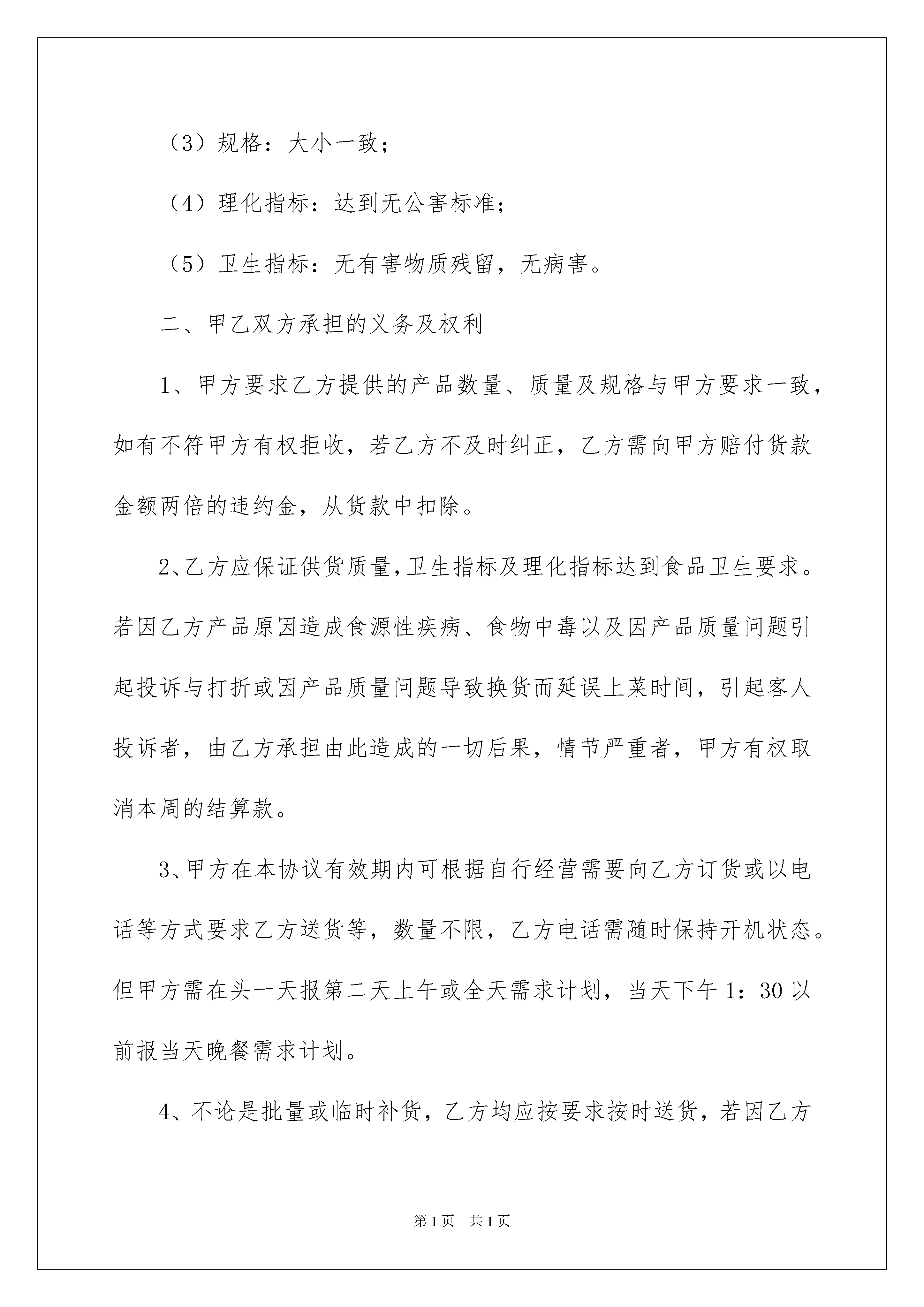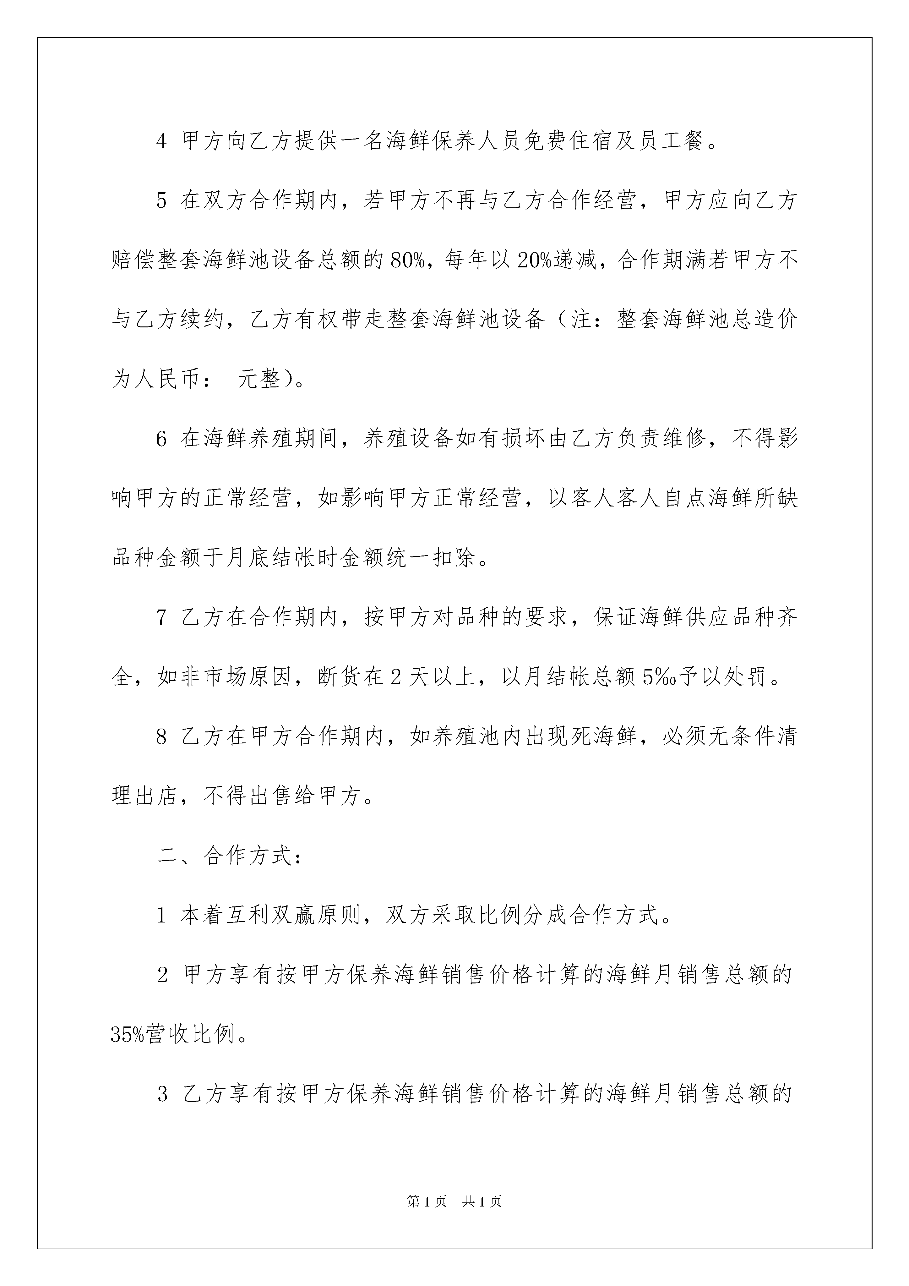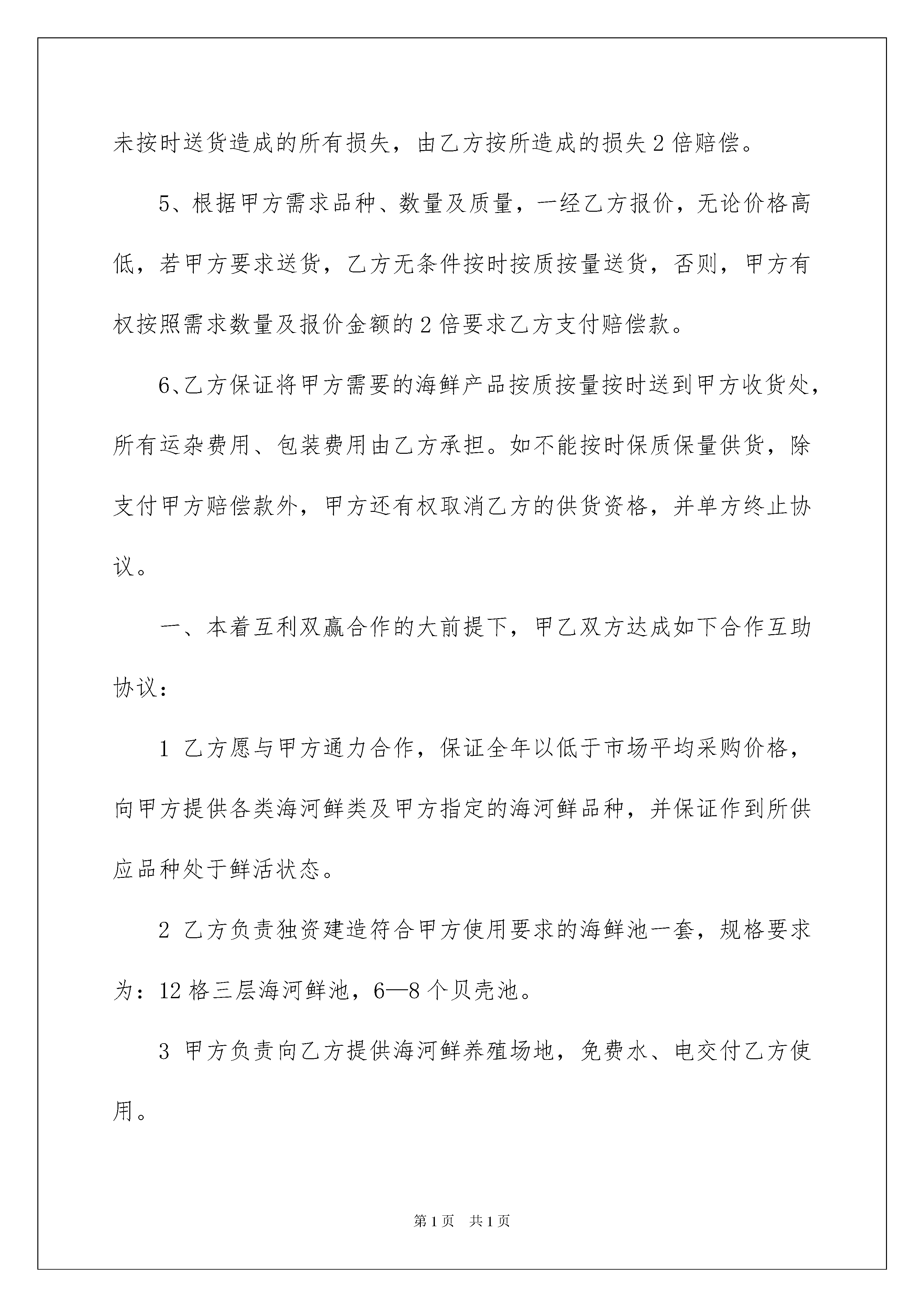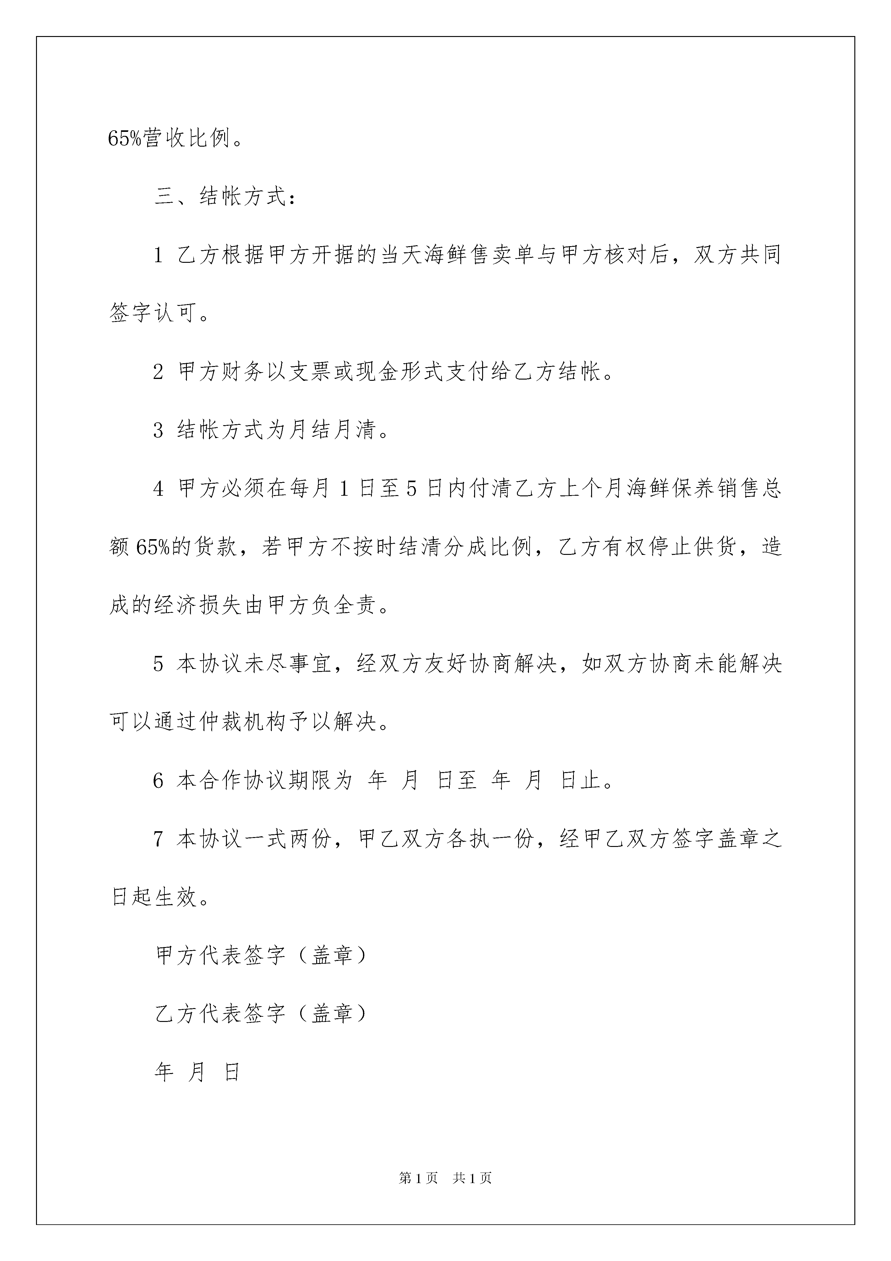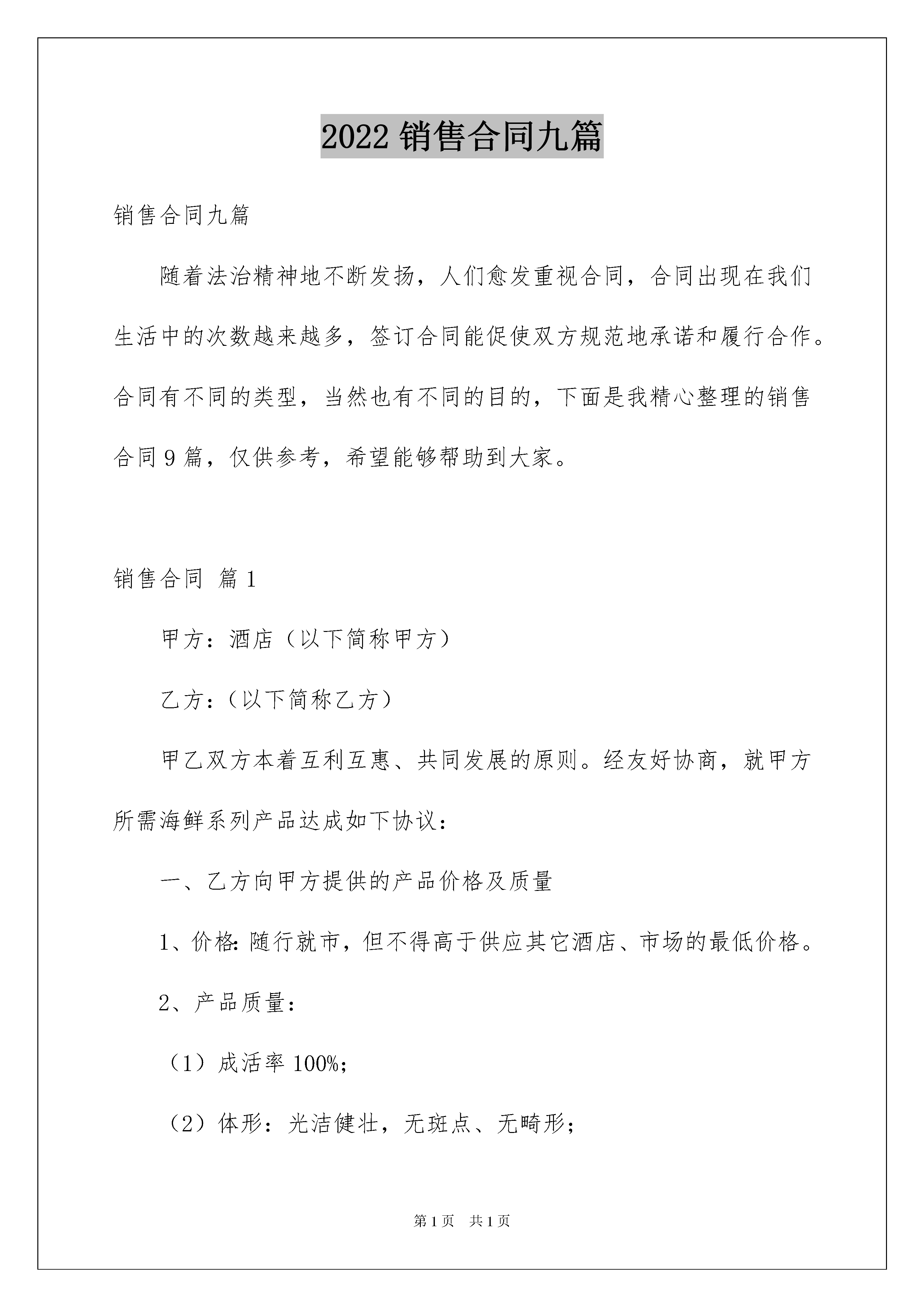 2022销售合同九篇销售合同九篇随着法治精神地不断发扬,人们愈发重视合同,合同出现在我们生活中的次数越来越多,签订合同能促使双方规范地承诺和履行合作。合同有不同的类型,当然也有不同的目的,下面是我精心整理的销售合同9篇,仅供参考,希望能够帮助到大家。销售合同篇1甲方:酒店(以下简称甲方)乙方:(以下简称乙方)甲乙双方本着互利互惠、共同发展的原则。经友好协商,就甲方所需海鲜系列产品达成如下协议:一、乙方向甲方提供的产品价格及质量1、价格:随行就市,但不得高于供应其它酒店、市场的最低价格。2、产品质量:(1)成活率100%;(2)体形:光洁健壮,无斑点、无畸形;(3)规格:大小一致;(4)理化指标:达到无公害标准;(5)卫生指标:无有害物质残留,无病害。二、甲乙双方承担的义务及权利1、甲方要求乙方提供的产品数量、质量及规格与甲方要求一致,如有不符甲方有权拒收,若乙方不及时纠正,乙方需向甲方赔付货款金额两倍的违约金,从货款中扣除。2、乙方应保证供货质量,卫生指标及理化指标达到食品卫生要求。若因乙方产品原因造成食源性疾病、食物中毒以及因产品质量问题引起投诉与打折或因产品质量问题导致换货而延误上菜时间,引起客人投诉者,由乙方承担由此造成的一切后果,情节严重者,甲方有权取消本周的结算款。3、甲方在本协议有效期内可根据自行经营需要向乙方订货或以电话等方式要求乙方送货等,数量不限,乙方电话需随时保持开机状态。但甲方需在头一天报第二天上午或全天需求计划,当天下午1:30以前报当天晚餐需求计划。4、不论是批量或临时补货,乙方均应按要求按时送货,若因乙方未按时送货造成的所有损失,由乙方按所造成的损失2倍赔偿。5、根据甲方需求品种、数量及质量,一经乙方报价,无论价格高低,若甲方要求送货,乙方无条件按时按质按量送货,否则,甲方有权按照需求数量及报价金额的2倍要求乙方支付赔偿款。6、乙方保证将甲方需要的海鲜产品按质按量按时送到甲方收货处,所有运杂费用、包装费用由乙方承担。如不能按时保质保量供货,除支付甲方赔偿款外,甲方还有权取消乙方的供货资格,并单方终止协议。一、本着互利双赢合作的大前提下,甲乙双方达成如下合作互助协议:1乙方愿与甲方通力合作,保证全年以低于市场平均采购价格,向甲方提供各类海河鲜类及甲方指定的海河鲜品种,并保证作到所供应品种处于鲜活状态。2乙方负责独资建造符合甲方使用要求的海鲜池一套,规格要求为:12格三层海河鲜池,6—8个贝壳池。3甲方负责向乙方提供海河鲜养殖场地,免费水、电交付乙方使用。4甲方向乙方提供一名海鲜保养人员免费住宿及员工餐。5在双方合作期内,若甲方不再与乙方合作经营,甲方应向乙方赔偿整套海鲜池设备总额的80%,每年以20%递减,合作期满若甲方不与乙方续约,乙方有权带走整套海鲜池设备(注:整套海鲜池总造价为人民币:元整)。6在海鲜养殖期间,养殖设备如有损坏由乙方负责维修,不得影响甲方的正常经营,如影响甲方正常经营,以客人客人自点海鲜所缺品种金额于月底结帐时金额统一扣除。7乙方在合作期内,按甲方对品种的要求,保证海鲜供应品种齐全,如非市场原因,断货在2天以上,以月结帐总额5‰予以处罚。8乙方在甲方合作期内,如养殖池内出现死海鲜,必须无条件清理出店,不得出售给甲方。二、合作方式:1本着互利双赢原则,双方采取比例分成合作方式。2甲方享有按甲方保养海鲜销售价格计算的海鲜月销售总额的35%营收比例。3乙方享有按甲方保养海鲜销售价格计算的海鲜月销售总额的65%营收比例。三、结帐方式:1乙方根据甲方开据的当天海鲜售卖单与甲方核对后,双方共同签字认可。2甲方财务以支票或现金形式支付给乙方结帐。3结帐方式为月结月清。4甲方必须在每月1日至5日内付清乙方上个月海鲜保养销售总额65%的货款,若甲方不按时结清分成比例,乙方有权停止供货,造成的经济损失由甲方负全责。5本协议未尽事宜,经双方友好协商解决,如双方协商未能解决可以通过仲裁机构予以解决。6本合作协议期限为年月日至年月日止。7本协议一式两份,甲乙双方各执一份,经甲乙双方签字盖章之日起生效。甲方代表签字(盖章)乙方代表签字(盖章)年月日销售合同篇2购货单位(甲方):供货单位(乙方):根据《中华人民共和国合同法》和有关政策规定,经甲乙双方协商一致签订本合同。1、甲方向乙方订购设备型号,数量、单价及金额:此价格含运费。2、供货时间:年月日3、交货地点:4、付款方式:甲方通过银行转帐方式支付乙方货款。5、货品交付方式:甲方于合同签订之日起交付乙方货款(出发票单起一周内)给乙方全部货款元,乙方于年月日前分批次交付甲方合同约定产品,同时甲方须收到发票