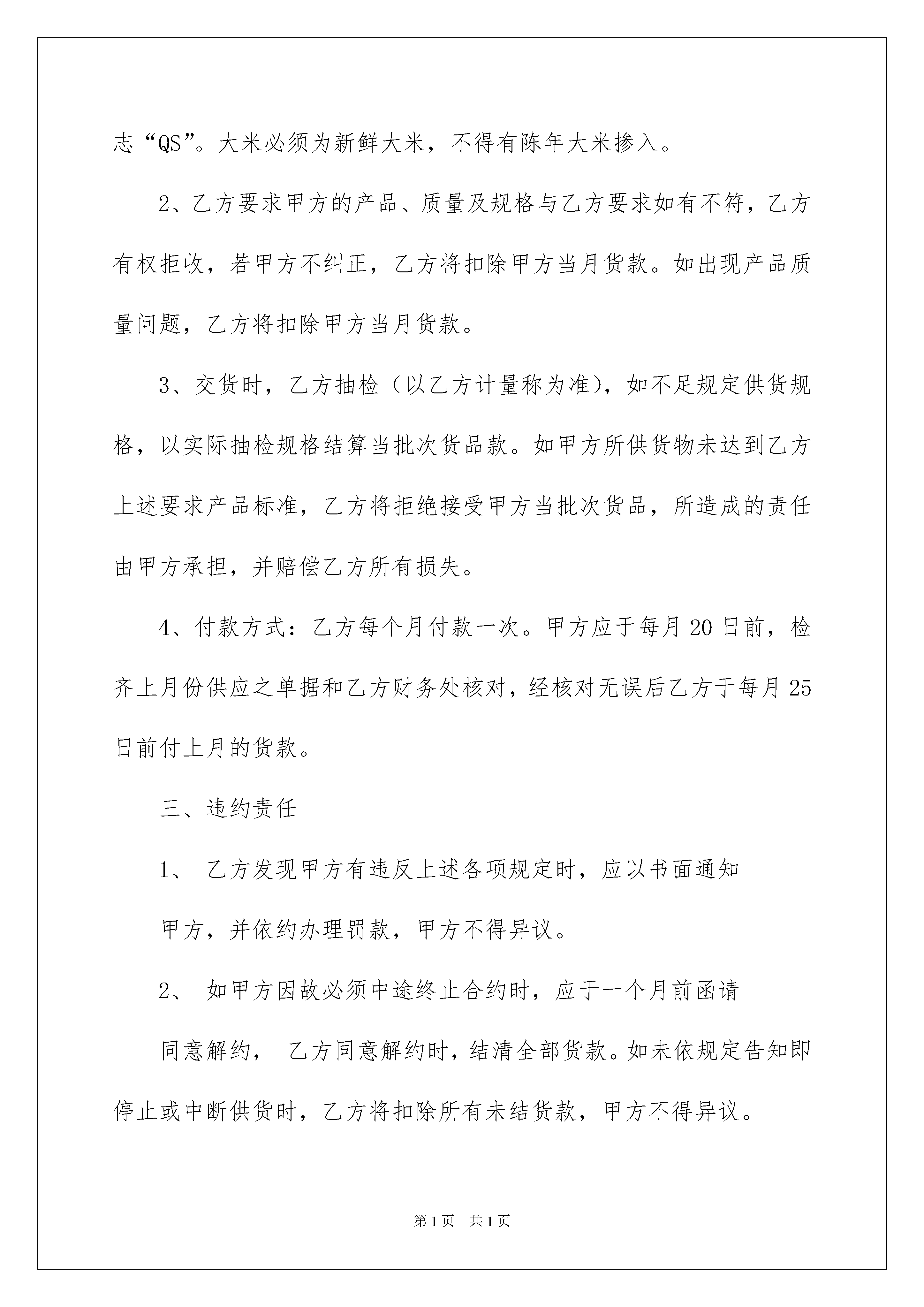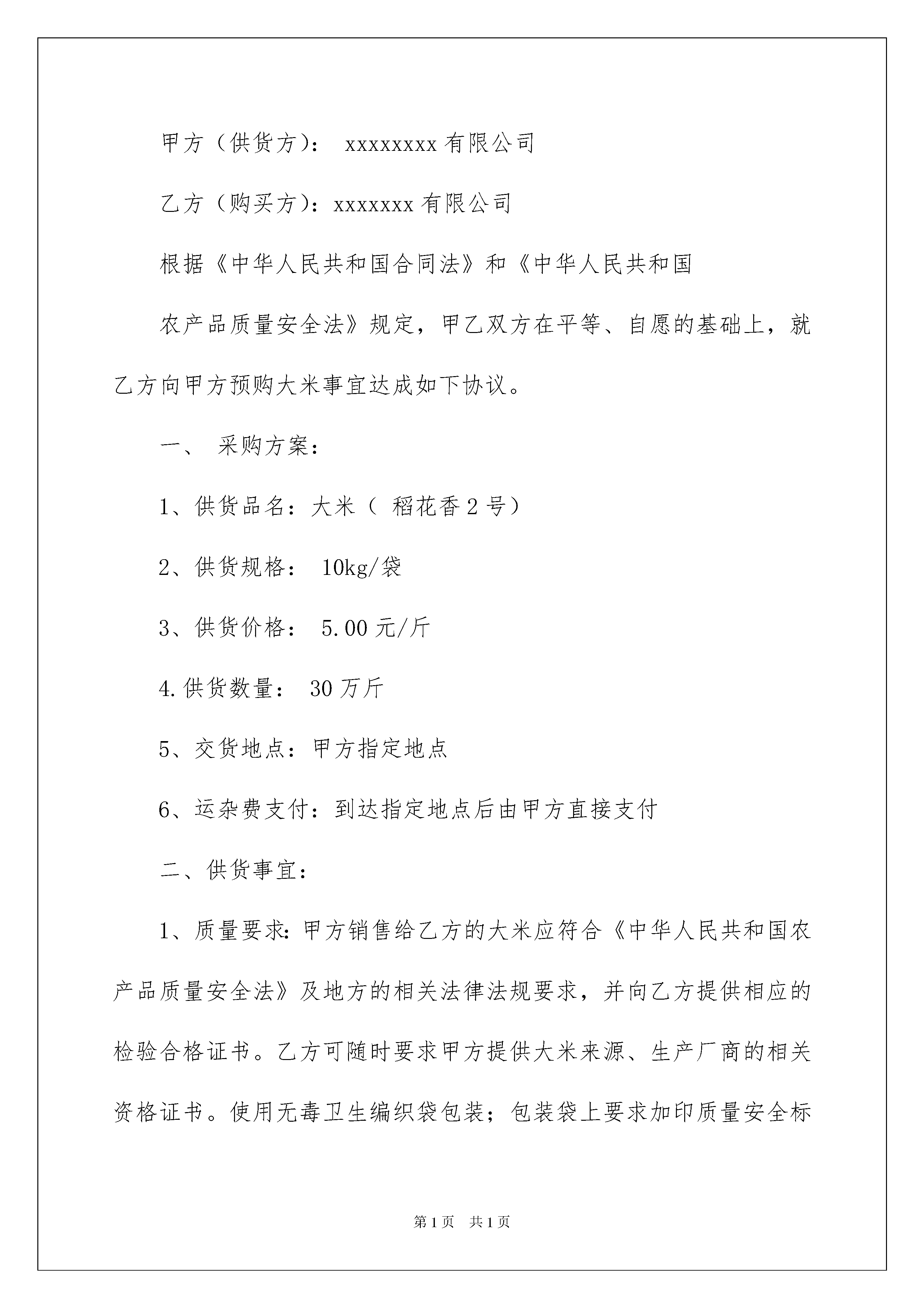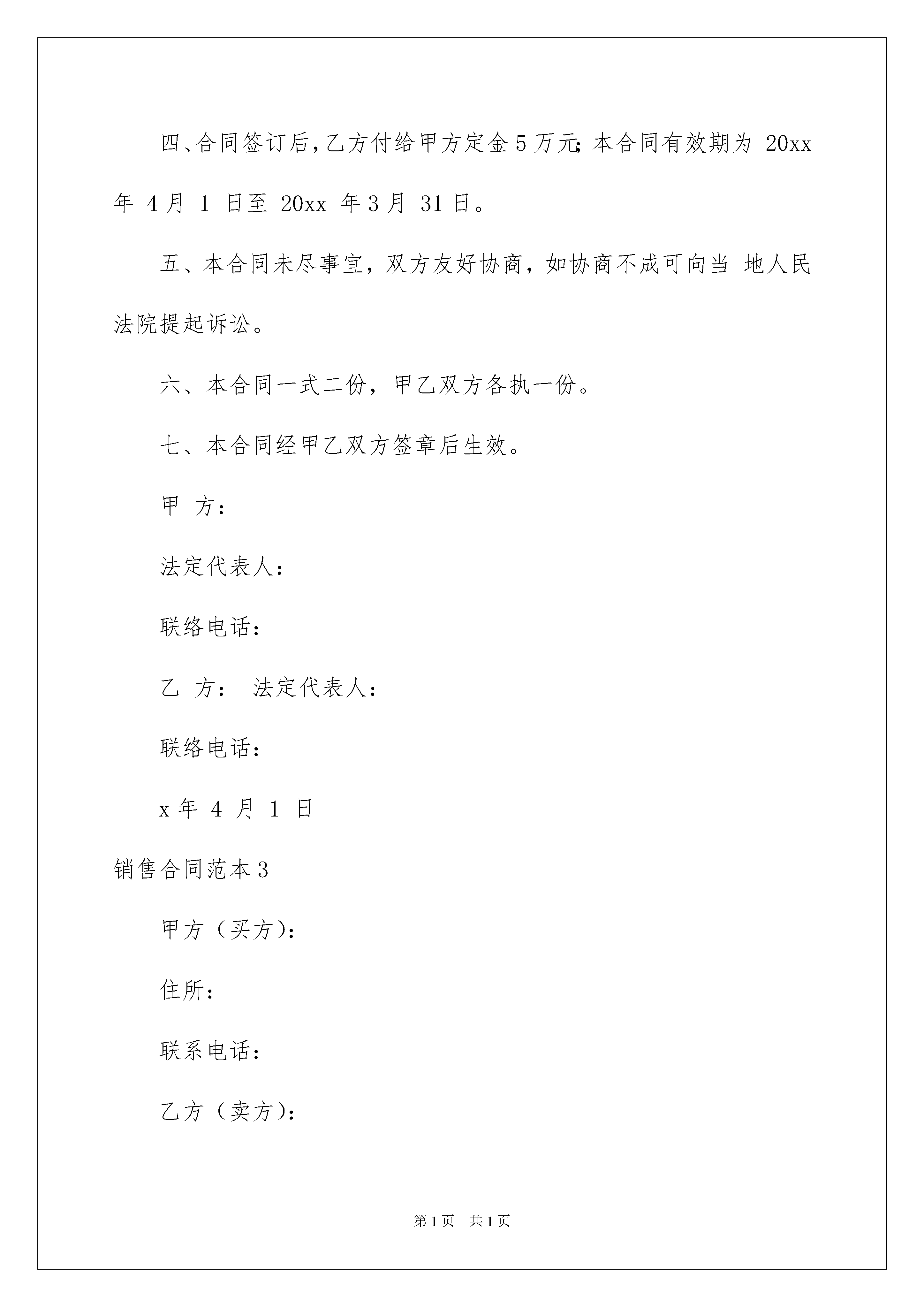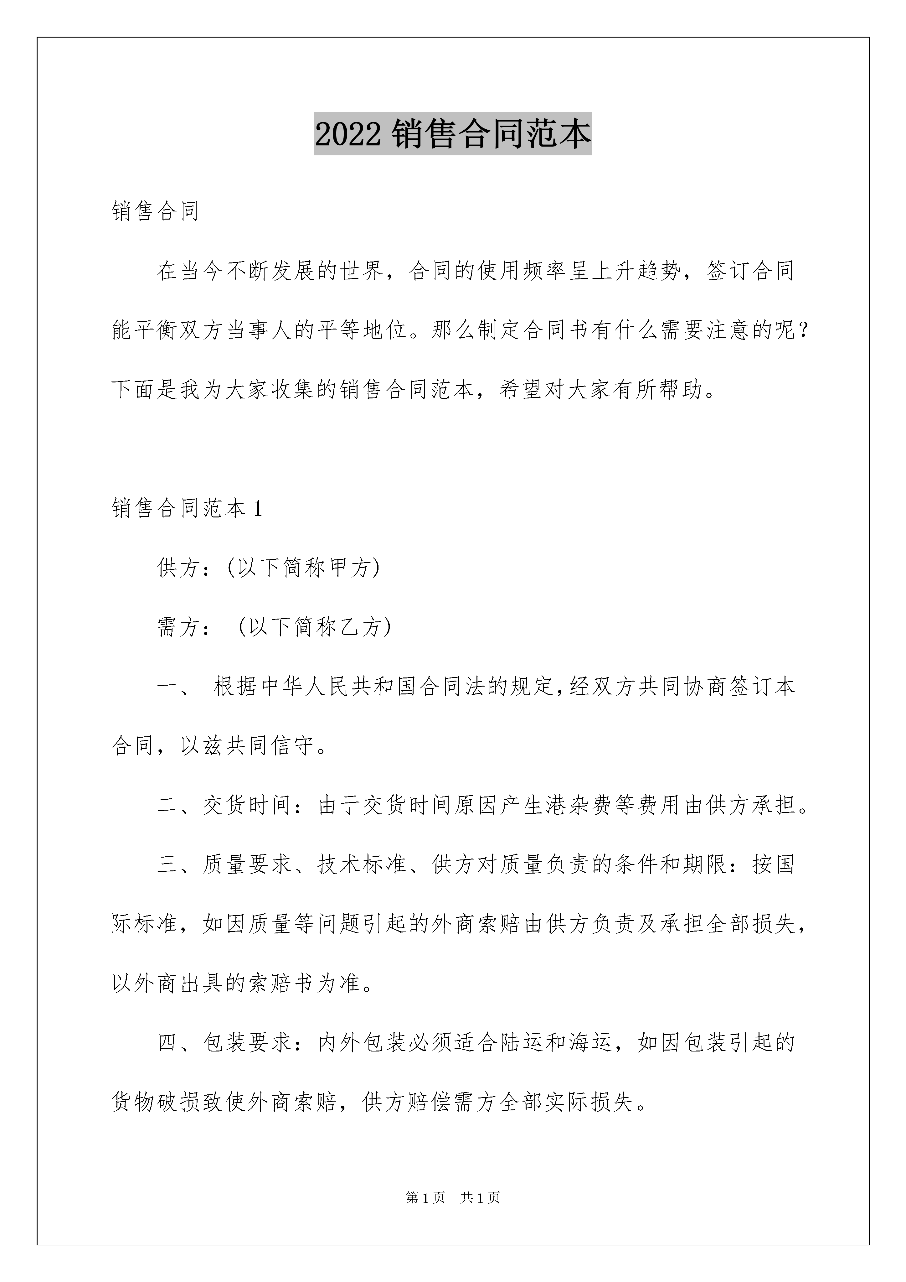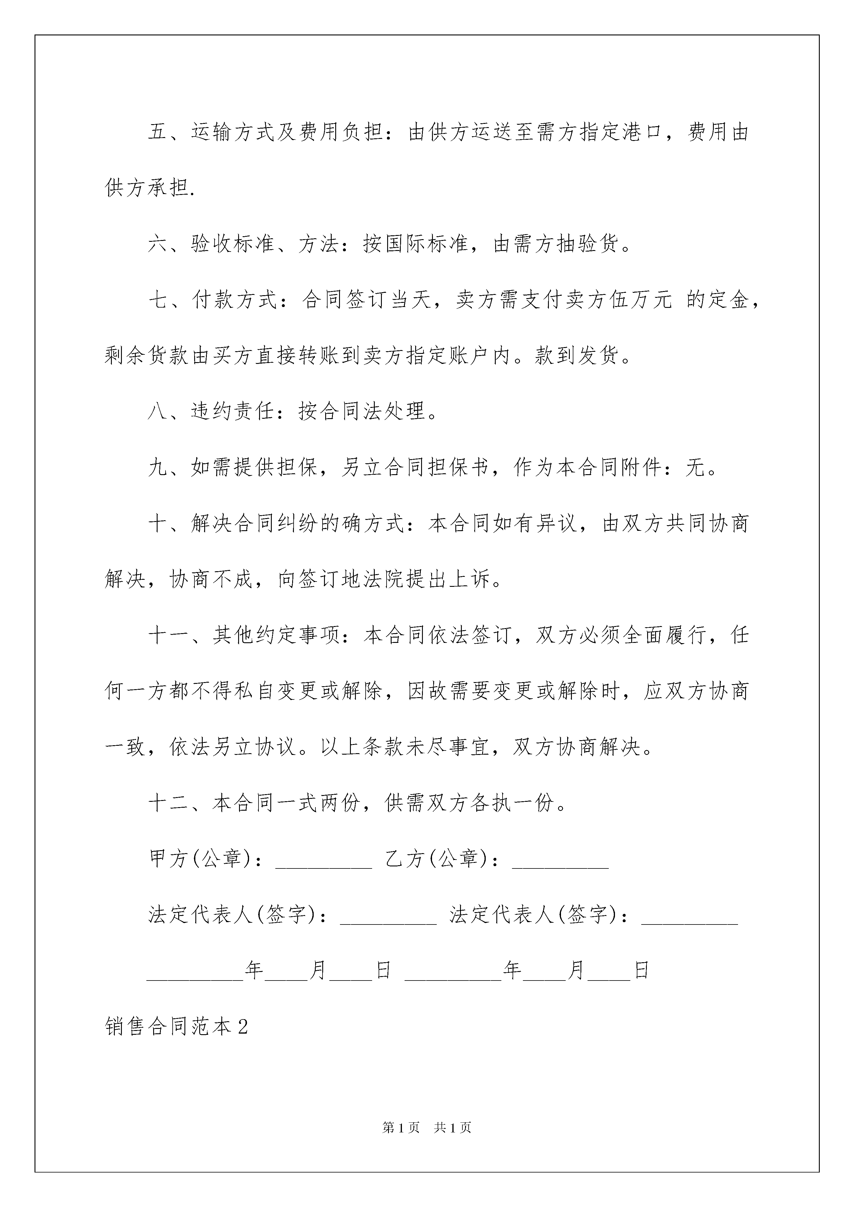 2022销售合同范本销售合同在当今不断发展的世界,合同的使用频率呈上升趋势,签订合同能平衡双方当事人的平等地位。那么制定合同书有什么需要注意的呢?下面是我为大家收集的销售合同范本,希望对大家有所帮助。销售合同范本1供方:(以下简称甲方)需方:(以下简称乙方)一、根据中华人民共和国合同法的规定,经双方共同协商签订本合同,以兹共同信守。二、交货时间:由于交货时间原因产生港杂费等费用由供方承担。三、质量要求、技术标准、供方对质量负责的条件和期限:按国际标准,如因质量等问题引起的外商索赔由供方负责及承担全部损失,以外商出具的索赔书为准。四、包装要求:内外包装必须适合陆运和海运,如因包装引起的货物破损致使外商索赔,供方赔偿需方全部实际损失。五、运输方式及费用负担:由供方运送至需方指定港口,费用由供方承担.六、验收标准、方法:按国际标准,由需方抽验货。七、付款方式:合同签订当天,卖方需支付卖方伍万元的定金,剩余货款由买方直接转账到卖方指定账户内。款到发货。八、违约责任:按合同法处理。九、如需提供担保,另立合同担保书,作为本合同附件:无。十、解决合同纠纷的确方式:本合同如有异议,由双方共同协商解决,协商不成,向签订地法院提出上诉。十一、其他约定事项:本合同依法签订,双方必须全面履行,任何一方都不得私自变更或解除,因故需要变更或解除时,应双方协商一致,依法另立协议。以上条款未尽事宜,双方协商解决。十二、本合同一式两份,供需双方各执一份。甲方(公章):_________乙方(公章):_________法定代表人(签字):_________法定代表人(签字):__________________年____月____日_________年____月____日销售合同范本2甲方(供货方):xxxxxxxx有限公司乙方(购买方):xxxxxxx有限公司根据《中华人民共和国合同法》和《中华人民共和国农产品质量安全法》规定,甲乙双方在平等、自愿的基础上,就乙方向甲方预购大米事宜达成如下协议。一、采购方案:1、供货品名:大米(稻花香2号)2、供货规格:10kg/袋3、供货价格:5.00元/斤4.供货数量:30万斤5、交货地点:甲方指定地点6、运杂费支付:到达指定地点后由甲方直接支付二、供货事宜:1、质量要求:甲方销售给乙方的大米应符合《中华人民共和国农产品质量安全法》及地方的相关法律法规要求,并向乙方提供相应的检验合格证书。乙方可随时要求甲方提供大米来源、生产厂商的相关资格证书。使用无毒卫生编织袋包装;包装袋上要求加印质量安全标志“QS”。大米必须为新鲜大米,不得有陈年大米掺入。2、乙方要求甲方的产品、质量及规格与乙方要求如有不符,乙方有权拒收,若甲方不纠正,乙方将扣除甲方当月货款。如出现产品质量问题,乙方将扣除甲方当月货款。3、交货时,乙方抽检(以乙方计量称为准),如不足规定供货规格,以实际抽检规格结算当批次货品款。如甲方所供货物未达到乙方上述要求产品标准,乙方将拒绝接受甲方当批次货品,所造成的责任由甲方承担,并赔偿乙方所有损失。4、付款方式:乙方每个月付款一次。甲方应于每月20日前,检齐上月份供应之单据和乙方财务处核对,经核对无误后乙方于每月25日前付上月的货款。三、违约责任1、乙方发现甲方有违反上述各项规定时,应以书面通知甲方,并依约办理罚款,甲方不得异议。2、如甲方因故必须中途终止合约时,应于一个月前函请同意解约,乙方同意解约时,结清全部货款。如未依规定告知即停止或中断供货时,乙方将扣除所有未结货款,甲方不得异议。四、合同签订后,乙方付给甲方定金5万元;本合同有效期为20xx年4月1日至20xx年3月31日。五、本合同未尽事宜,双方友好协商,如协商不成可向当地人民法院提起诉讼。六、本合同一式二份,甲乙双方各执一份。七、本合同经甲乙双方签章后生效。甲方:法定代表人:联络电话:乙方:法定代表人:联络电话:x年4月1日销售合同范本3甲方(买方):住所:联系电话:乙方(卖方):住所:联系电话:甲乙双方本着自愿、平等、互惠互利、诚实信用的原则,经充分友好协商,订立如下合同条款,以资共同恪守履行。第一条、买卖标的1、名称:2、品种:3、规格:4、价格:第二条、质量要求乙方在甲方用货前提供货物样品,由乙方提供产品合格证,并提供检测报告给甲方存档,乙方供给甲方同样质量的产品。乙方必须保证原材料为合格产品。第三条、包装1、须用坚固的木箱或纸箱包装,适合长途海运、邮寄、空运和多次搬运、装卸及适应气候的变化。并具备良好的防潮、防霉、防锈、防腐蚀及抗震能力,不能造成运输过程中箱件破损,货物散失。以商品的存放和运输安全为