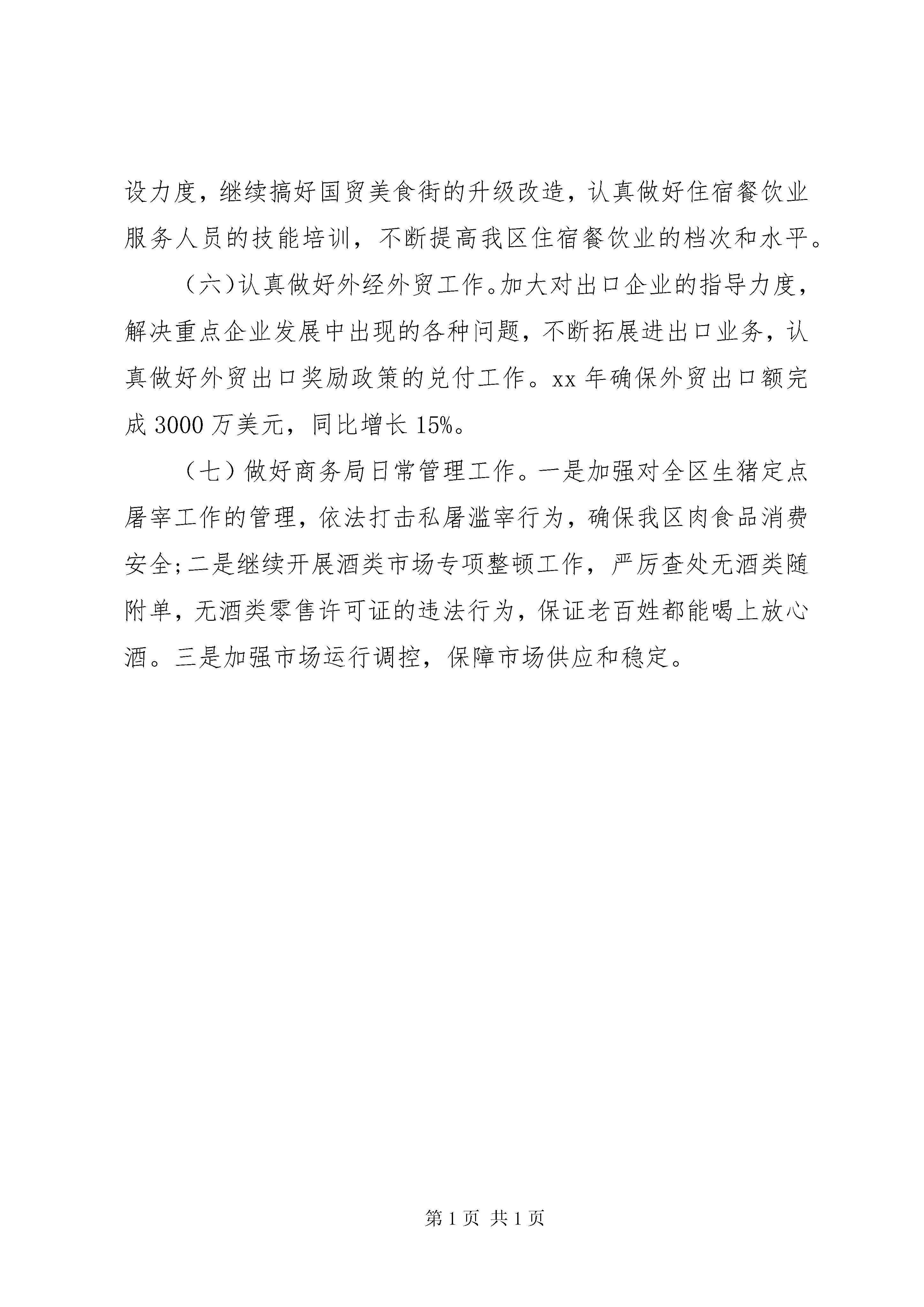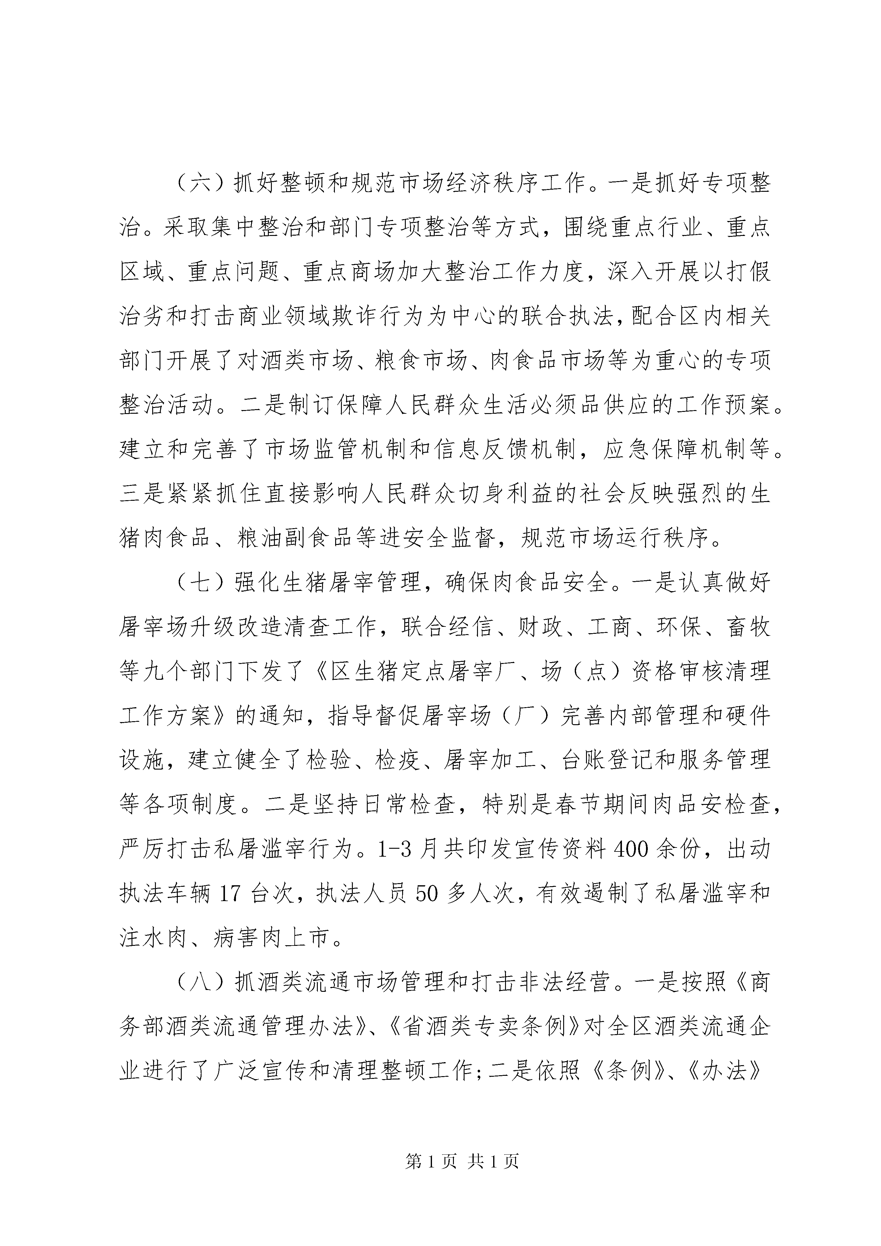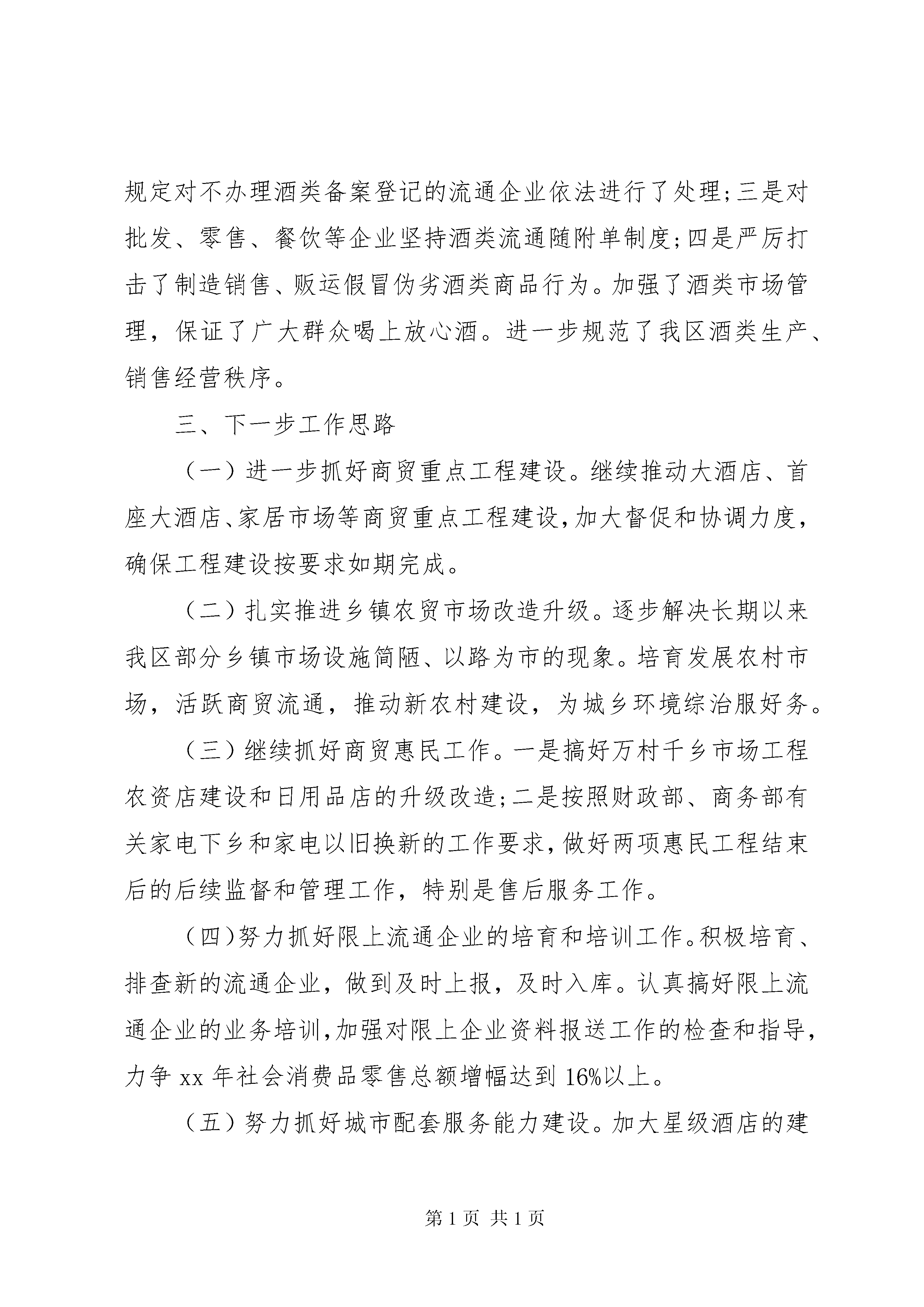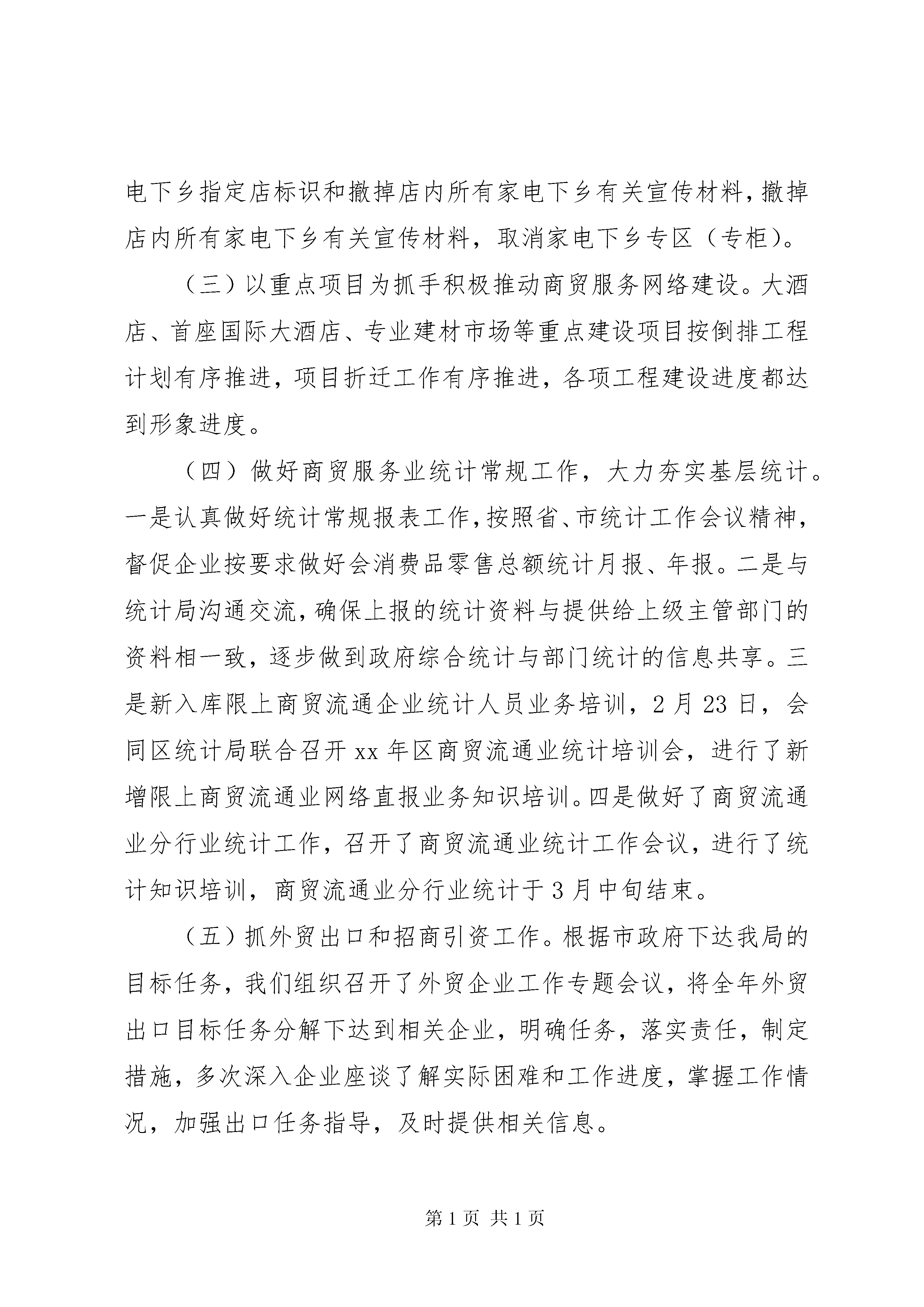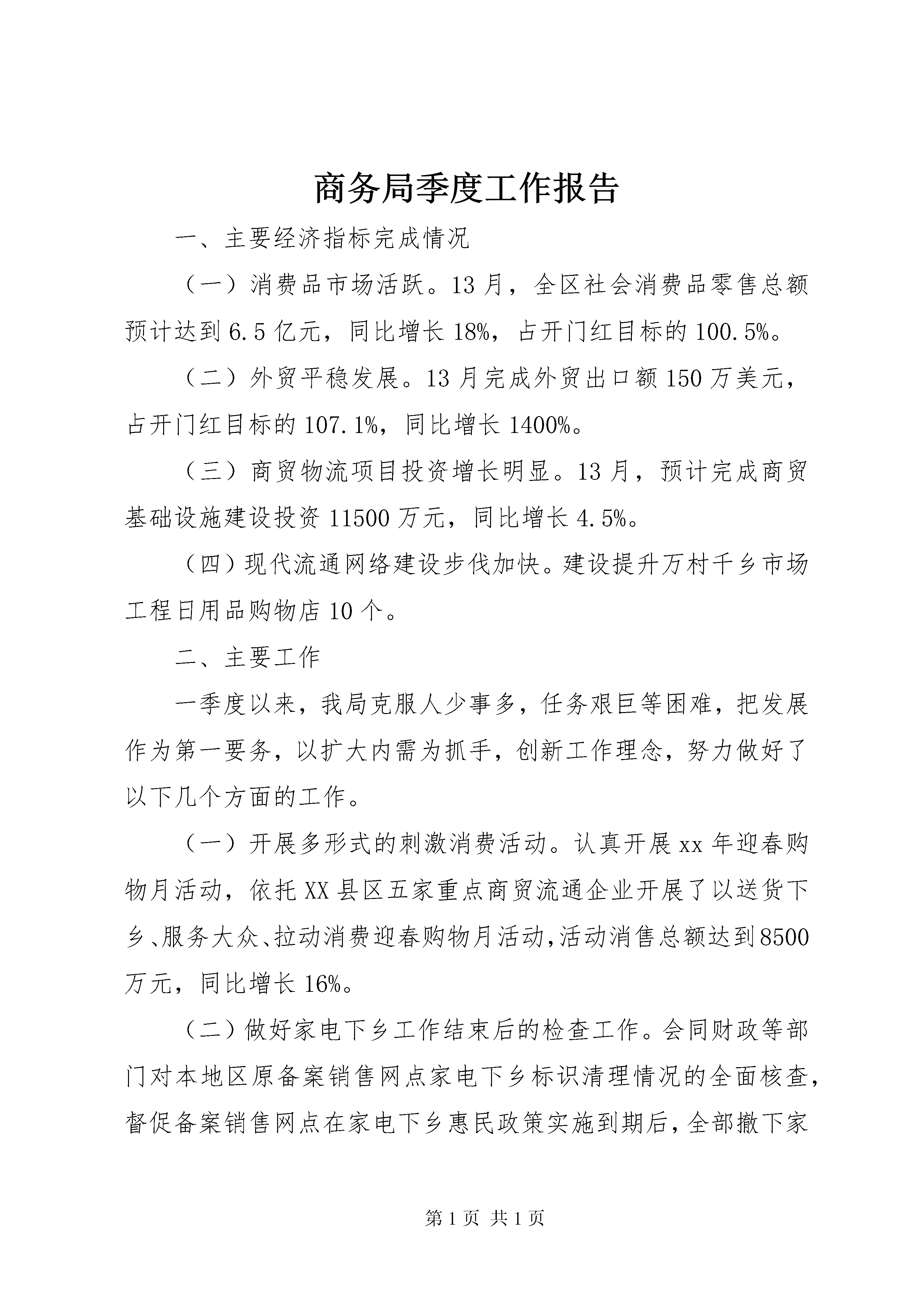 商务局季度工作报告一、主要经济指标完成情况(一)消费品市场活跃。13月,全区社会消费品零售总额预计达到6.5亿元,同比增长18%,占开门红目标的100.5%。(二)外贸平稳发展。13月完成外贸出口额150万美元,占开门红目标的107.1%,同比增长1400%。(三)商贸物流项目投资增长明显。13月,预计完成商贸基础设施建设投资11500万元,同比增长4.5%。(四)现代流通网络建设步伐加快。建设提升万村千乡市场工程日用品购物店10个。二、主要工作一季度以来,我局克服人少事多,任务艰巨等困难,把发展作为第一要务,以扩大内需为抓手,创新工作理念,努力做好了以下几个方面的工作。(一)开展多形式的刺激消费活动。认真开展xx年迎春购物月活动,依托XX县区五家重点商贸流通企业开展了以送货下乡、服务大众、拉动消费迎春购物月活动,活动消售总额达到8500万元,同比增长16%。(二)做好家电下乡工作结束后的检查工作。会同财政等部门对本地区原备案销售网点家电下乡标识清理情况的全面核查,督促备案销售网点在家电下乡惠民政策实施到期后,全部撤下家电下乡指定店标识和撤掉店内所有家电下乡有关宣传材料,撤掉店内所有家电下乡有关宣传材料,取消家电下乡专区(专柜)。(三)以重点项目为抓手积极推动商贸服务网络建设。大酒店、首座国际大酒店、专业建材市场等重点建设项目按倒排工程计划有序推进,项目折迁工作有序推进,各项工程建设进度都达到形象进度。(四)做好商贸服务业统计常规工作,大力夯实基层统计。一是认真做好统计常规报表工作,按照省、市统计工作会议精神,督促企业按要求做好会消费品零售总额统计月报、年报。二是与统计局沟通交流,确保上报的统计资料与提供给上级主管部门的资料相一致,逐步做到政府综合统计与部门统计的信息共享。三是新入库限上商贸流通企业统计人员业务培训,2月23日,会同区统计局联合召开xx年区商贸流通业统计培训会,进行了新增限上商贸流通业网络直报业务知识培训。四是做好了商贸流通业分行业统计工作,召开了商贸流通业统计工作会议,进行了统计知识培训,商贸流通业分行业统计于3月中旬结束。(五)抓外贸出口和招商引资工作。根据市政府下达我局的目标任务,我们组织召开了外贸企业工作专题会议,将全年外贸出口目标任务分解下达到相关企业,明确任务,落实责任,制定措施,多次深入企业座谈了解实际困难和工作进度,掌握工作情况,加强出口任务指导,及时提供相关信息。(六)抓好整顿和规范市场经济秩序工作。一是抓好专项整治。采取集中整治和部门专项整治等方式,围绕重点行业、重点区域、重点问题、重点商场加大整治工作力度,深入开展以打假治劣和打击商业领域欺诈行为为中心的联合执法,配合区内相关部门开展了对酒类市场、粮食市场、肉食品市场等为重心的专项整治活动。二是制订保障人民群众生活必须品供应的工作预案。建立和完善了市场监管机制和信息反馈机制,应急保障机制等。三是紧紧抓住直接影响人民群众切身利益的社会反映强烈的生猪肉食品、粮油副食品等进安全监督,规范市场运行秩序。(七)强化生猪屠宰管理,确保肉食品安全。一是认真做好屠宰场升级改造清查工作,联合经信、财政、工商、环保、畜牧等九个部门下发了《区生猪定点屠宰厂、场(点)资格审核清理工作方案》的通知,指导督促屠宰场(厂)完善内部管理和硬件设施,建立健全了检验、检疫、屠宰加工、台账登记和服务管理等各项制度。二是坚持日常检查,特别是春节期间肉品安检查,严厉打击私屠滥宰行为。1-3月共印发宣传资料400余份,出动执法车辆17台次,执法人员50多人次,有效遏制了私屠滥宰和注水肉、病害肉上市。(八)抓酒类流通市场管理和打击非法经营。一是按照《商务部酒类流通管理办法》、《省酒类专卖条例》对全区酒类流通企业进行了广泛宣传和清理整顿工作;二是依照《条例》、《办法》规定对不办理酒类备案登记的流通企业依法进行了处理;三是对批发、零售、餐饮等企业坚持酒类流通随附单制度;四是严厉打击了制造销售、贩运假冒伪劣酒类商品行为。加强了酒类市场管理,保证了广大群众喝上放心酒。进一步规范了我区酒类生产、销售经营秩序。三、下一步工作思路(一)进一步抓好商贸重点工程建设。继续推动大酒店、首座大酒店、家居市场等商贸重点工程建设,加大督促和协调力度,确保工程建设按要求如期完成。(二)扎实推进乡镇农贸市场改造升级。逐步解决长期以来我区部分乡镇市场设施简陋、以路为市的现象。培育发展农村市场,活跃商贸流通,推动新农村建设,为城乡环境综治服好务。(三)继续抓好商贸惠民工作。一是搞好万村千乡市场工程农资店建设和日用品店的升级改造;二是按照财政部、商务部有关家电下乡和家电以旧换新的工作要求,做好两项惠民工程结束后的后续监督和管理工作,特别是售后服务工作。(四)努力抓好限上流通企业的培育和培训工作。