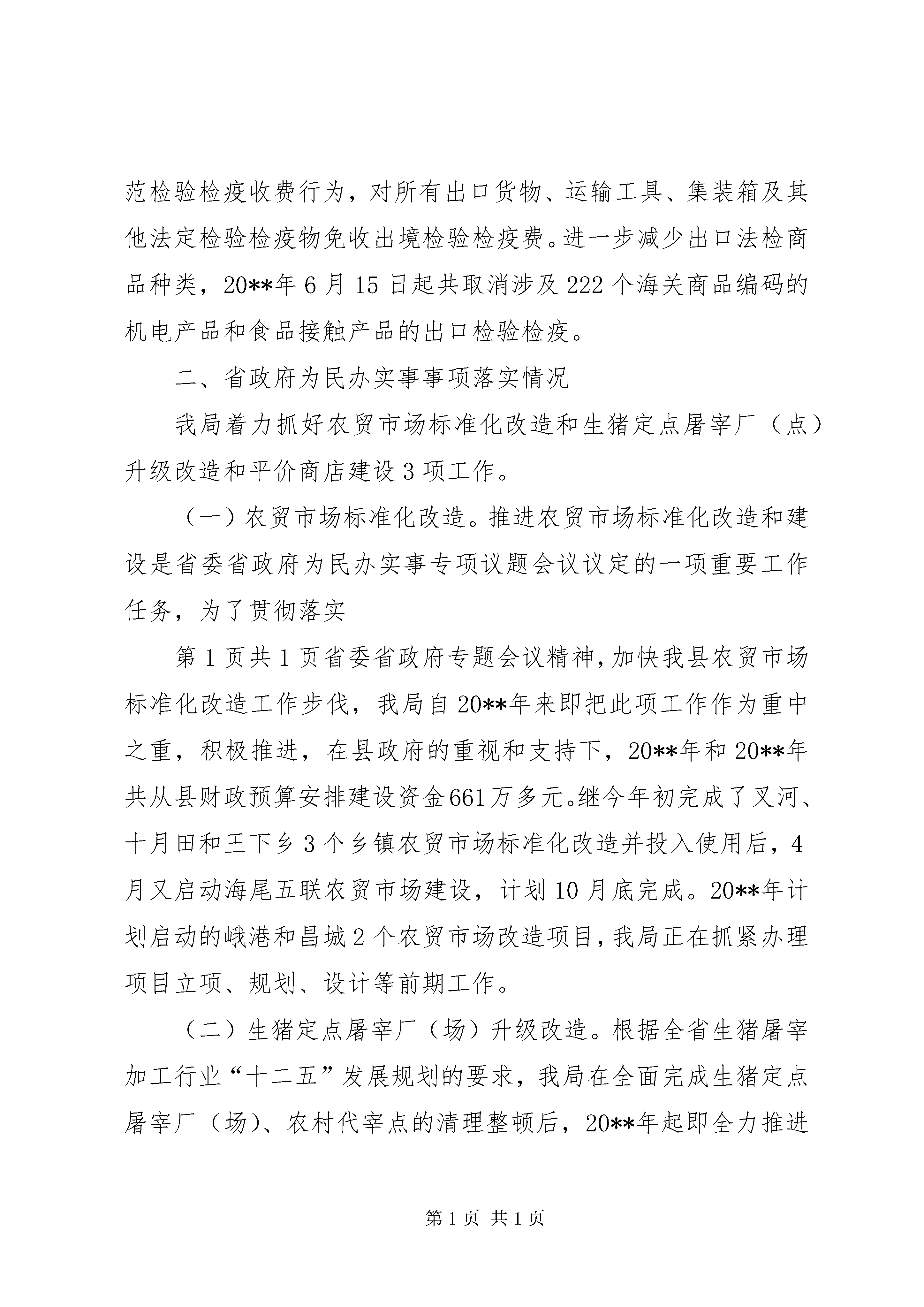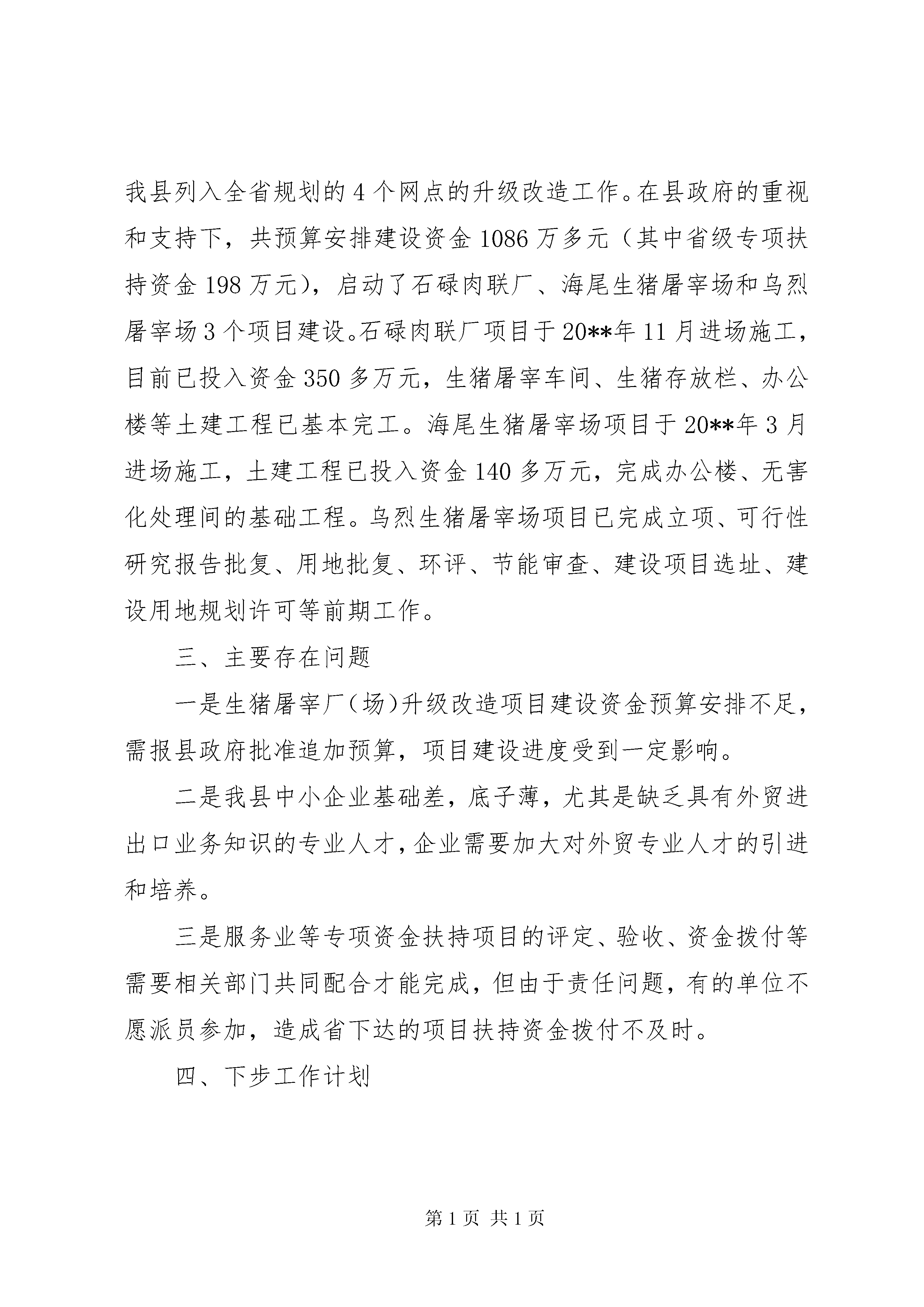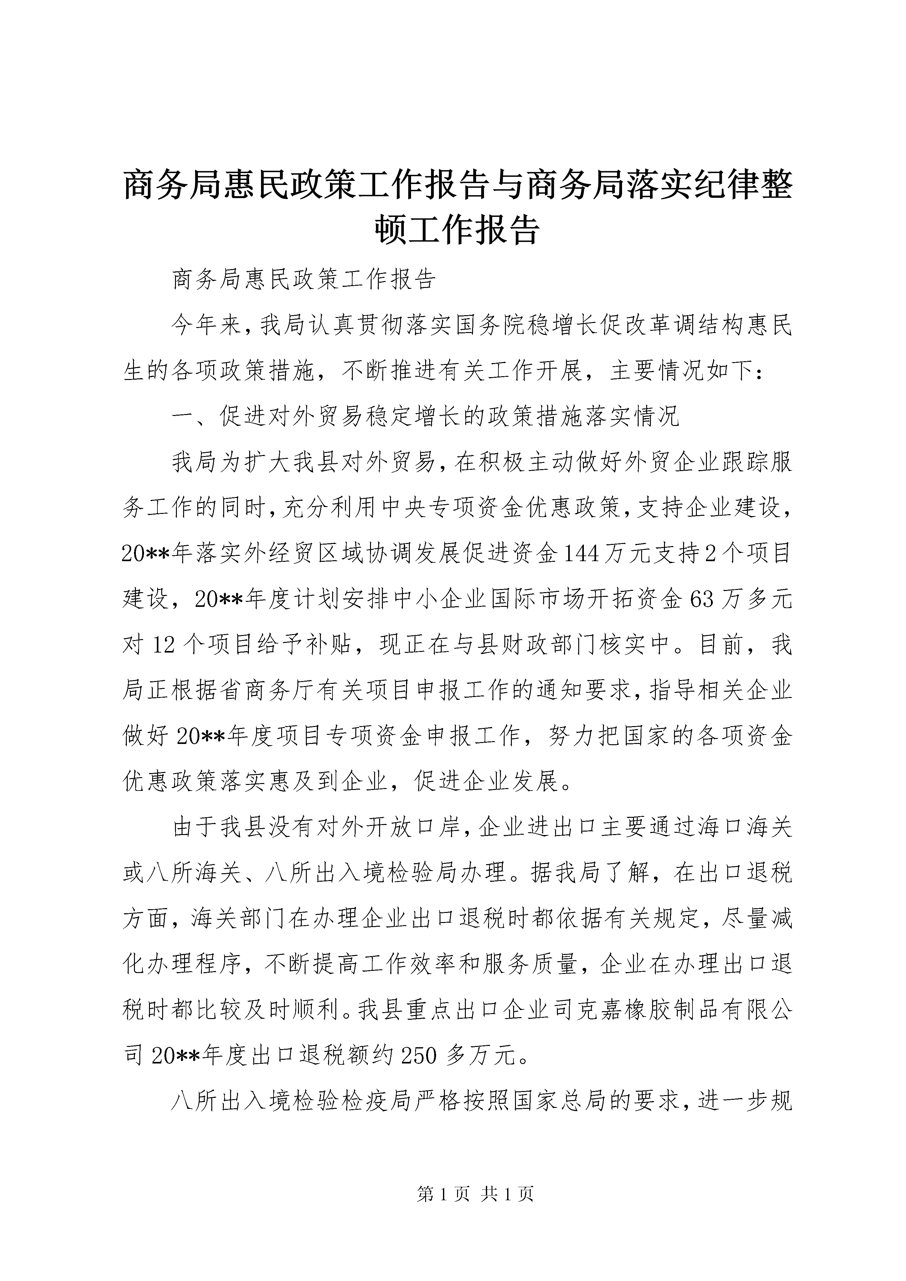 商务局惠民政策工作报告与商务局落实纪律整顿工作报告商务局惠民政策工作报告今年来,我局认真贯彻落实国务院稳增长促改革调结构惠民生的各项政策措施,不断推进有关工作开展,主要情况如下:一、促进对外贸易稳定增长的政策措施落实情况我局为扩大我县对外贸易,在积极主动做好外贸企业跟踪服务工作的同时,充分利用中央专项资金优惠政策,支持企业建设,20**年落实外经贸区域协调发展促进资金144万元支持2个项目建设,20**年度计划安排中小企业国际市场开拓资金63万多元对12个项目给予补贴,现正在与县财政部门核实中。目前,我局正根据省商务厅有关项目申报工作的通知要求,指导相关企业做好20**年度项目专项资金申报工作,努力把国家的各项资金优惠政策落实惠及到企业,促进企业发展。由于我县没有对外开放口岸,企业进出口主要通过海口海关或八所海关、八所出入境检验局办理。据我局了解,在出口退税方面,海关部门在办理企业出口退税时都依据有关规定,尽量减化办理程序,不断提高工作效率和服务质量,企业在办理出口退税时都比较及时顺利。我县重点出口企业司克嘉橡胶制品有限公司20**年度出口退税额约250多万元。八所出入境检验检疫局严格按照国家总局的要求,进一步规范检验检疫收费行为,对所有出口货物、运输工具、集装箱及其他法定检验检疫物免收出境检验检疫费。进一步减少出口法检商品种类,20**年6月15日起共取消涉及222个海关商品编码的机电产品和食品接触产品的出口检验检疫。二、省政府为民办实事事项落实情况我局着力抓好农贸市场标准化改造和生猪定点屠宰厂(点)升级改造和平价商店建设3项工作。(一)农贸市场标准化改造。推进农贸市场标准化改造和建设是省委省政府为民办实事专项议题会议议定的一项重要工作任务,为了贯彻落实省委省政府专题会议精神,加快我县农贸市场标准化改造工作步伐,我局自20**年来即把此项工作作为重中之重,积极推进,在县政府的重视和支持下,20**年和20**年共从县财政预算安排建设资金661万多元。继今年初完成了叉河、十月田和王下乡3个乡镇农贸市场标准化改造并投入使用后,4月又启动海尾五联农贸市场建设,计划10月底完成。20**年计划启动的峨港和昌城2个农贸市场改造项目,我局正在抓紧办理项目立项、规划、设计等前期工作。(二)生猪定点屠宰厂(场)升级改造。根据全省生猪屠宰加工行业“十二五”发展规划的要求,我局在全面完成生猪定点屠宰厂(场)、农村代宰点的清理整顿后,20**年起即全力推进我县列入全省规划的4个网点的升级改造工作。在县政府的重视和支持下,共预算安排建设资金1086万多元(其中省级专项扶持资金198万元),启动了石碌肉联厂、海尾生猪屠宰场和乌烈屠宰场3个项目建设。石碌肉联厂项目于20**年11月进场施工,目前已投入资金350多万元,生猪屠宰车间、生猪存放栏、办公楼等土建工程已基本完工。海尾生猪屠宰场项目于20**年3月进场施工,土建工程已投入资金140多万元,完成办公楼、无害化处理间的基础工程。乌烈生猪屠宰场项目已完成立项、可行性研究报告批复、用地批复、环评、节能审查、建设项目选址、建设用地规划许可等前期工作。三、主要存在问题一是生猪屠宰厂(场)升级改造项目建设资金预算安排不足,需报县政府批准追加预算,项目建设进度受到一定影响。二是我县中小企业基础差,底子薄,尤其是缺乏具有外贸进出口业务知识的专业人才,企业需要加大对外贸专业人才的引进和培养。三是服务业等专项资金扶持项目的评定、验收、资金拨付等需要相关部门共同配合才能完成,但由于责任问题,有的单位不愿派员参加,造成省下达的项目扶持资金拨付不及时。四、下步工作计划