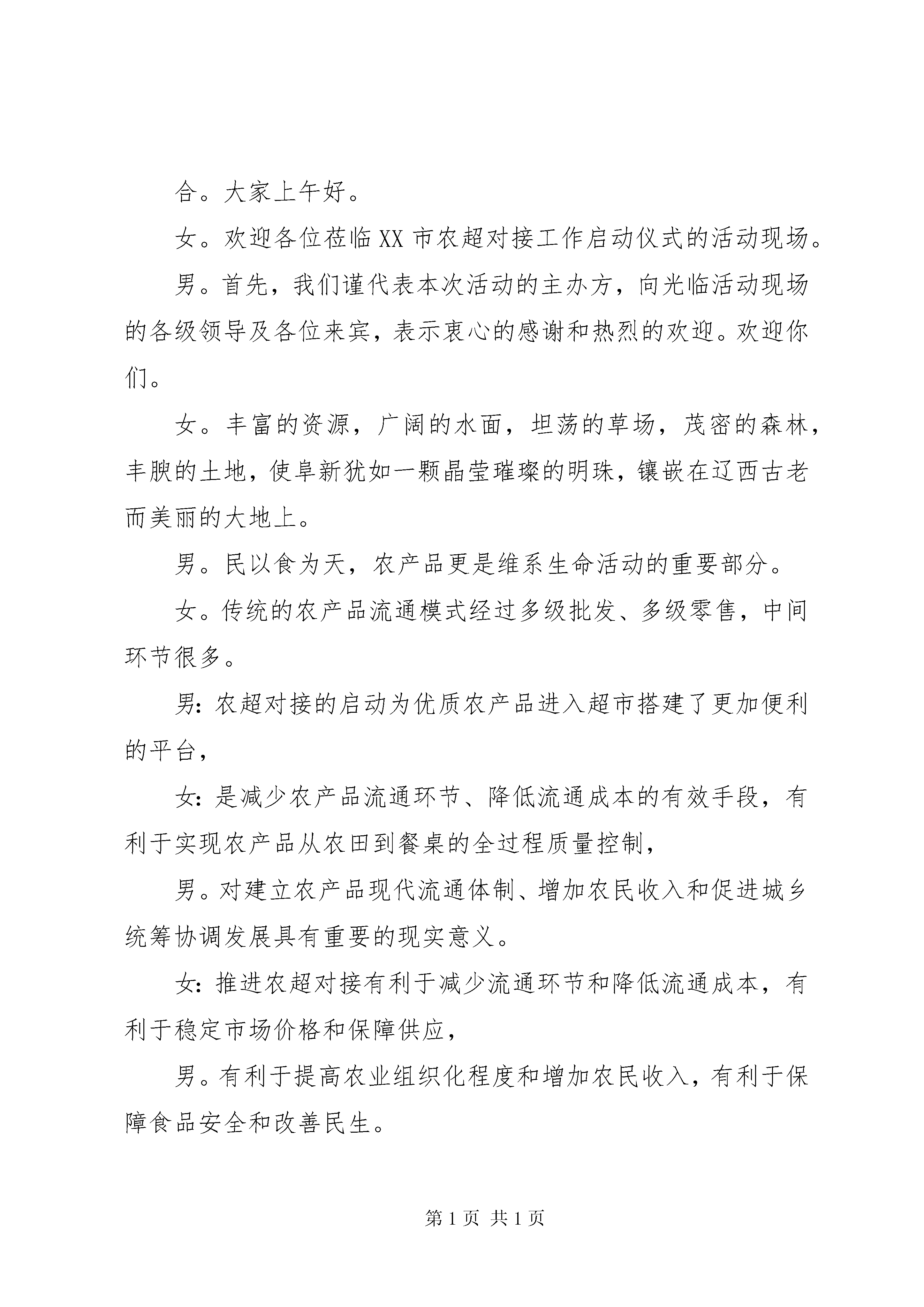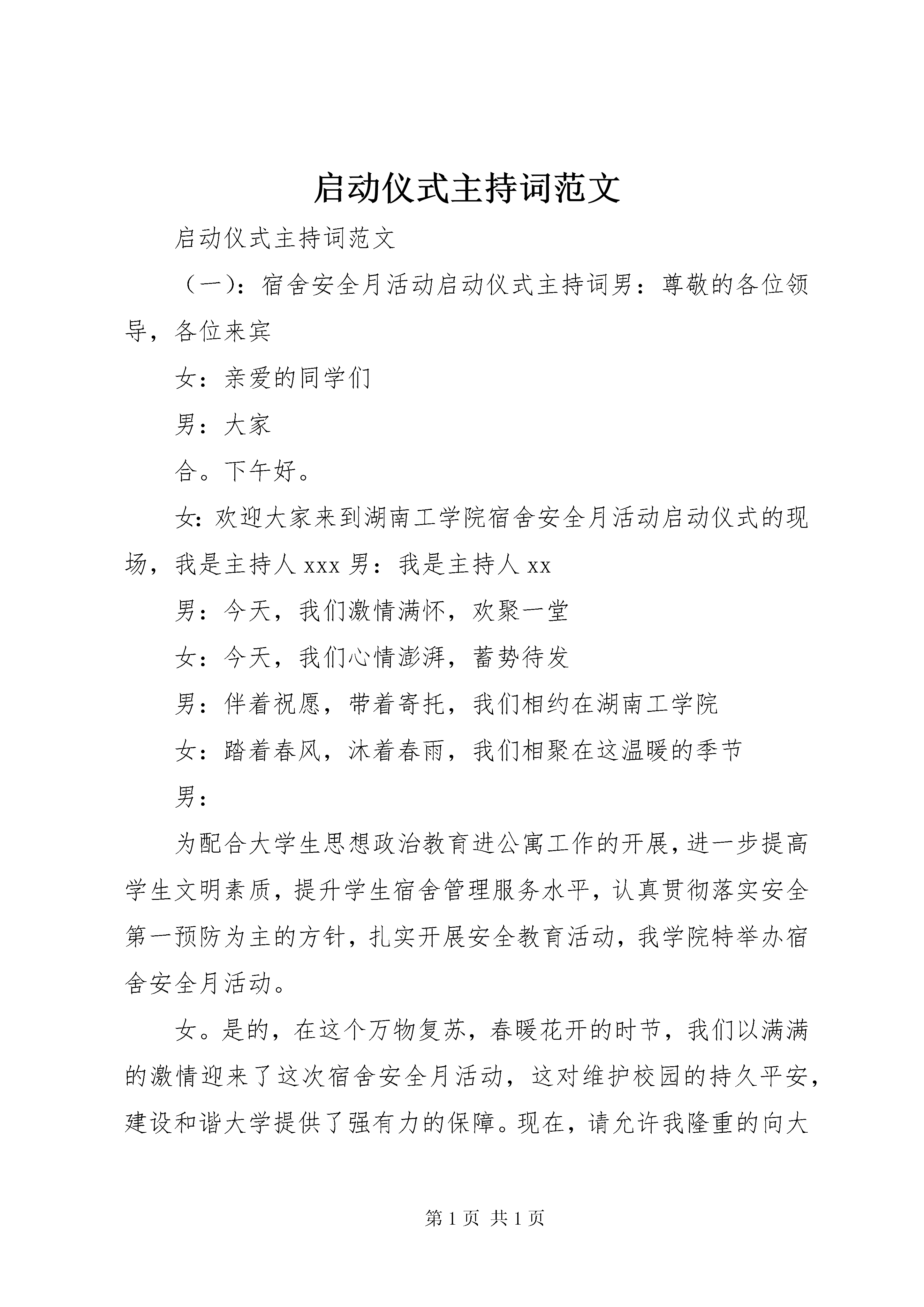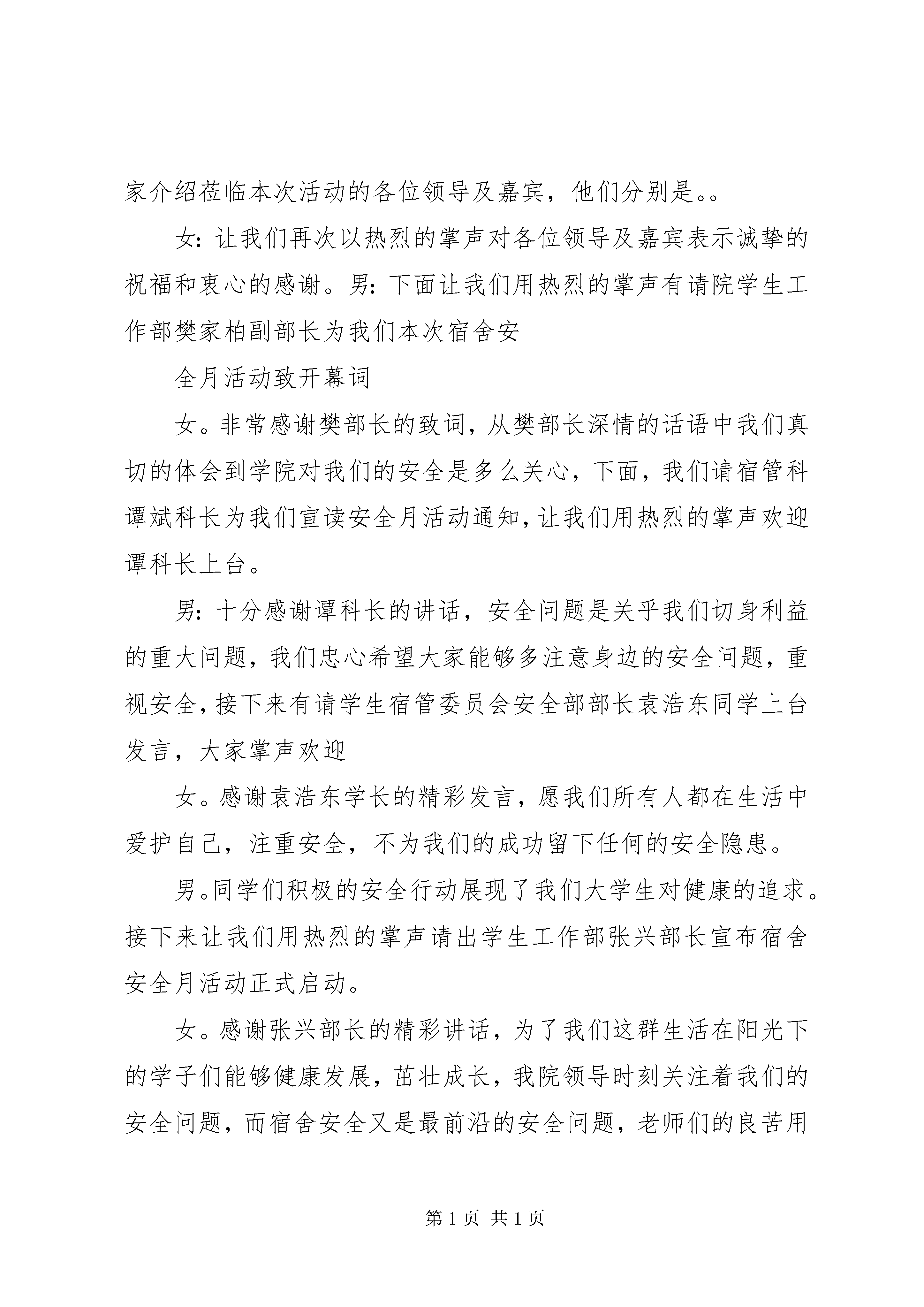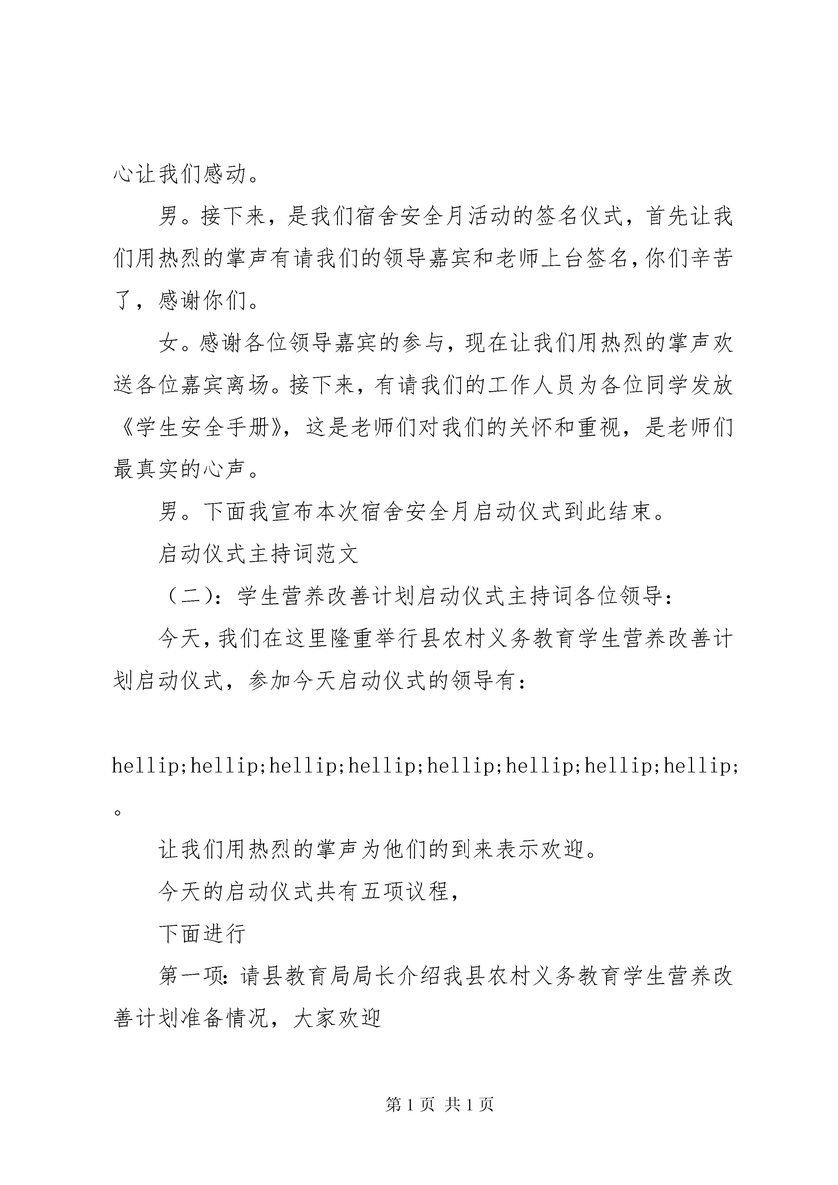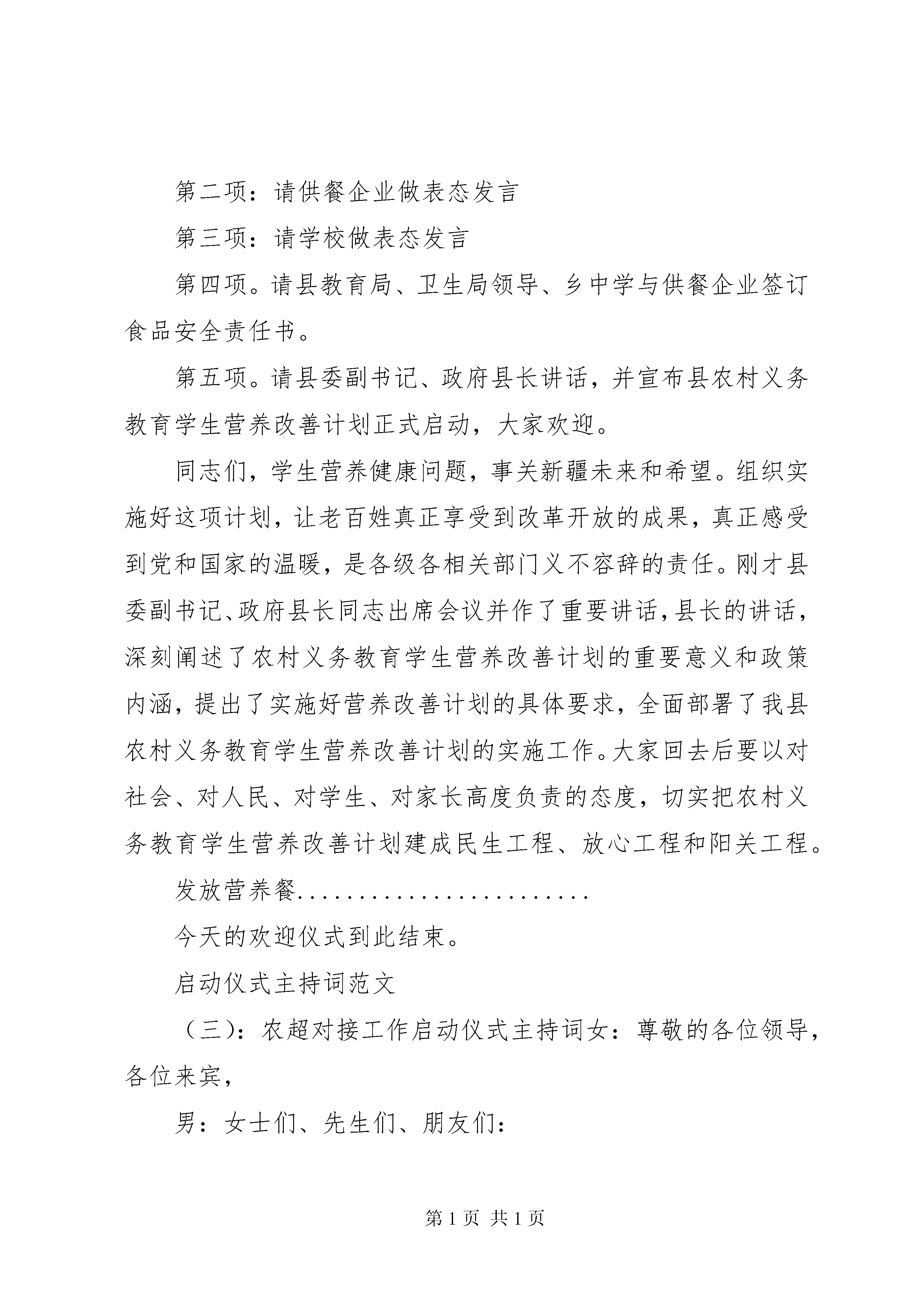 启动仪式主持词范文启动仪式主持词范文(一):宿舍安全月活动启动仪式主持词男:尊敬的各位领导,各位来宾女:亲爱的同学们男:大家合。下午好。女:欢迎大家来到湖南工学院宿舍安全月活动启动仪式的现场,我是主持人xxx男:我是主持人xx男:今天,我们激情满怀,欢聚一堂女:今天,我们心情澎湃,蓄势待发男:伴着祝愿,带着寄托,我们相约在湖南工学院女:踏着春风,沐着春雨,我们相聚在这温暖的季节男:为配合大学生思想政治教育进公寓工作的开展,进一步提高学生文明素质,提升学生宿舍管理服务水平,认真贯彻落实安全第一预防为主的方针,扎实开展安全教育活动,我学院特举办宿舍安全月活动。女。是的,在这个万物复苏,春暖花开的时节,我们以满满的激情迎来了这次宿舍安全月活动,这对维护校园的持久平安,建设和谐大学提供了强有力的保障。现在,请允许我隆重的向大家介绍莅临本次活动的各位领导及嘉宾,他们分别是。。女:让我们再次以热烈的掌声对各位领导及嘉宾表示诚挚的祝福和衷心的感谢。男:下面让我们用热烈的掌声有请院学生工作部樊家柏副部长为我们本次宿舍安全月活动致开幕词女。非常感谢樊部长的致词,从樊部长深情的话语中我们真切的体会到学院对我们的安全是多么关心,下面,我们请宿管科谭斌科长为我们宣读安全月活动通知,让我们用热烈的掌声欢迎谭科长上台。男:十分感谢谭科长的讲话,安全问题是关乎我们切身利益的重大问题,我们忠心希望大家能够多注意身边的安全问题,重视安全,接下来有请学生宿管委员会安全部部长袁浩东同学上台发言,大家掌声欢迎女。感谢袁浩东学长的精彩发言,愿我们所有人都在生活中爱护自己,注重安全,不为我们的成功留下任何的安全隐患。男。同学们积极的安全行动展现了我们大学生对健康的追求。接下来让我们用热烈的掌声请出学生工作部张兴部长宣布宿舍安全月活动正式启动。女。感谢张兴部长的精彩讲话,为了我们这群生活在阳光下的学子们能够健康发展,茁壮成长,我院领导时刻关注着我们的安全问题,而宿舍安全又是最前沿的安全问题,老师们的良苦用心让我们感动。男。接下来,是我们宿舍安全月活动的签名仪式,首先让我们用热烈的掌声有请我们的领导嘉宾和老师上台签名,你们辛苦了,感谢你们。女。感谢各位领导嘉宾的参与,现在让我们用热烈的掌声欢送各位嘉宾离场。接下来,有请我们的工作人员为各位同学发放《学生安全手册》,这是老师们对我们的关怀和重视,是老师们最真实的心声。男。下面我宣布本次宿舍安全月启动仪式到此结束。启动仪式主持词范文(二):学生营养改善计划启动仪式主持词各位领导:今天,我们在这里隆重举行县农村义务教育学生营养改善计划启动仪式,参加今天启动仪式的领导有:hellip;hellip;hellip;hellip;hellip;hellip;hellip;hellip;。让我们用热烈的掌声为他们的到来表示欢迎。今天的启动仪式共有五项议程,下面进行第一项:请县教育局局长介绍我县农村义务教育学生营养改善计划准备情况,大家欢迎第二项:请供餐企业做表态发言第三项:请学校做表态发言第四项。请县教育局、卫生局领导、乡中学与供餐企业签订食品安全责任书。第五项。请县委副书记、政府县长讲话,并宣布县农村义务教育学生营养改善计划正式启动,大家欢迎。同志们,学生营养健康问题,事关新疆未来和希望。组织实施好这项计划,让老百姓真正享受到改革开放的成果,真正感受到党和国家的温暖,是各级各相关部门义不容辞的责任。刚才县委副书记、政府县长同志出席会议并作了重要讲话,县长的讲话,深刻阐述了农村义务教育学生营养改善计划的重要意义和政策内涵,提出了实施好营养改善计划的具体要求,全面部署了我县农村义务教育学生营养改善计划的实施工作。大家回去后要以对社会、对人民、对学生、对家长高度负责的态度,切实把农村义务教育学生营养改善计划建成民生工程、放心工程和阳关工程。发放营养餐........................今天的欢迎仪式到此结束。启动仪式主持词范文(三):农超对接工作启动仪式主持词女:尊敬的各位领导,各位来宾,男:女士们、先生们、朋友们:合。大家上午好。女。欢迎各位莅临XX市农超对接工作启动仪式的活动现场。男。首先,我们谨代表本次活动的主办方,向光临活动现场的各级领导及各位来宾,表示衷心的感谢和热烈的欢迎。欢迎你们。女。丰富的资源,广阔的水面,坦荡的草场,茂密的森林,丰腴的土地,使阜新犹如一颗晶莹璀璨的明珠,镶嵌在辽西古老而美丽的大地上。男。民以食为天,农产品更是维系生命活动的重要部分。女。传统的农产品流通模式经过多级批发、多级零售,中间环节很多。男:农超对接的启动为优质农产品进入超市搭建了更加便利的平台,女:是减少农产品流通环节、降低流通成本的有效手段,有利于实现农产品从农田到餐桌的全过程质量控制,男。对建立农产品现代流通体