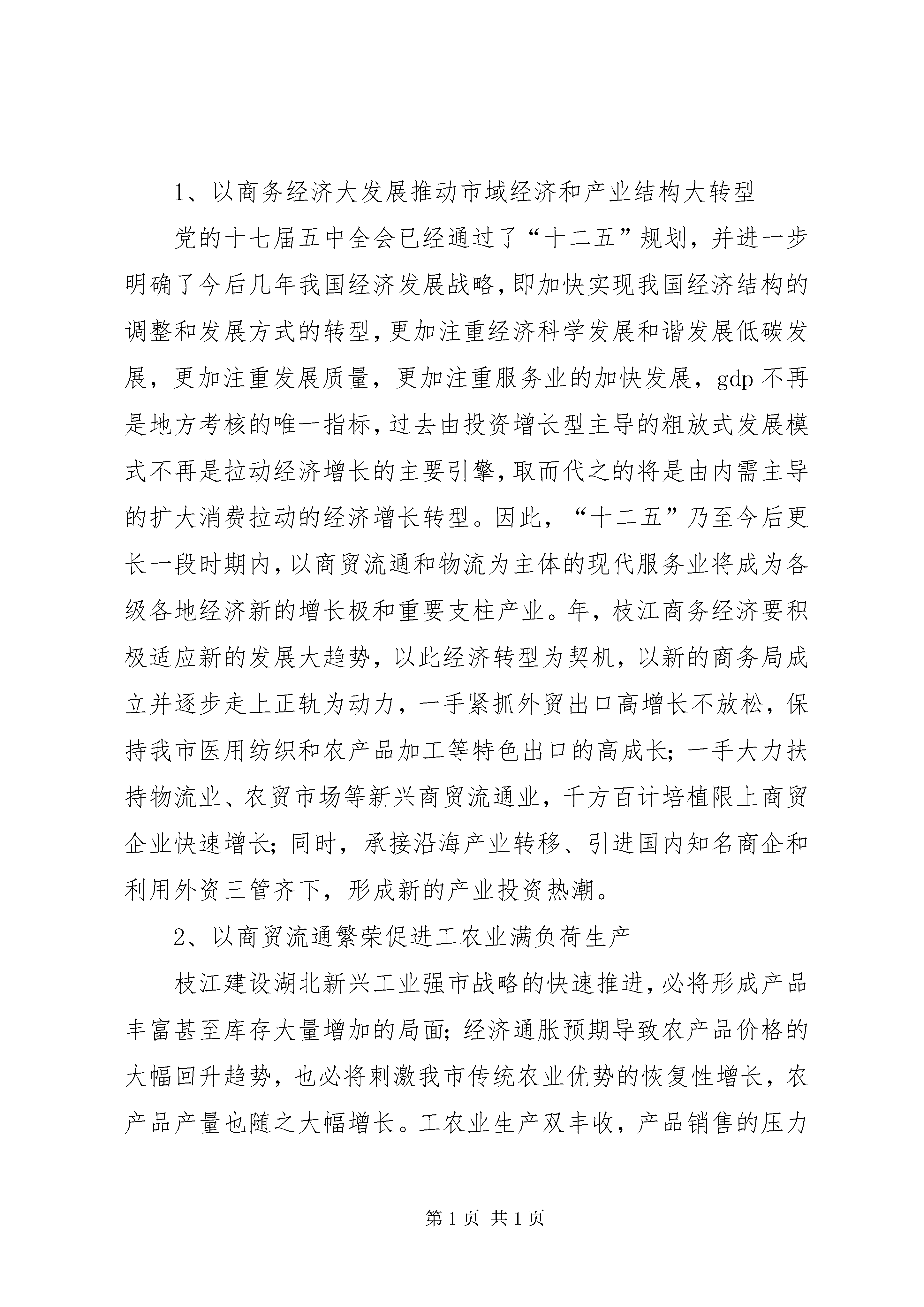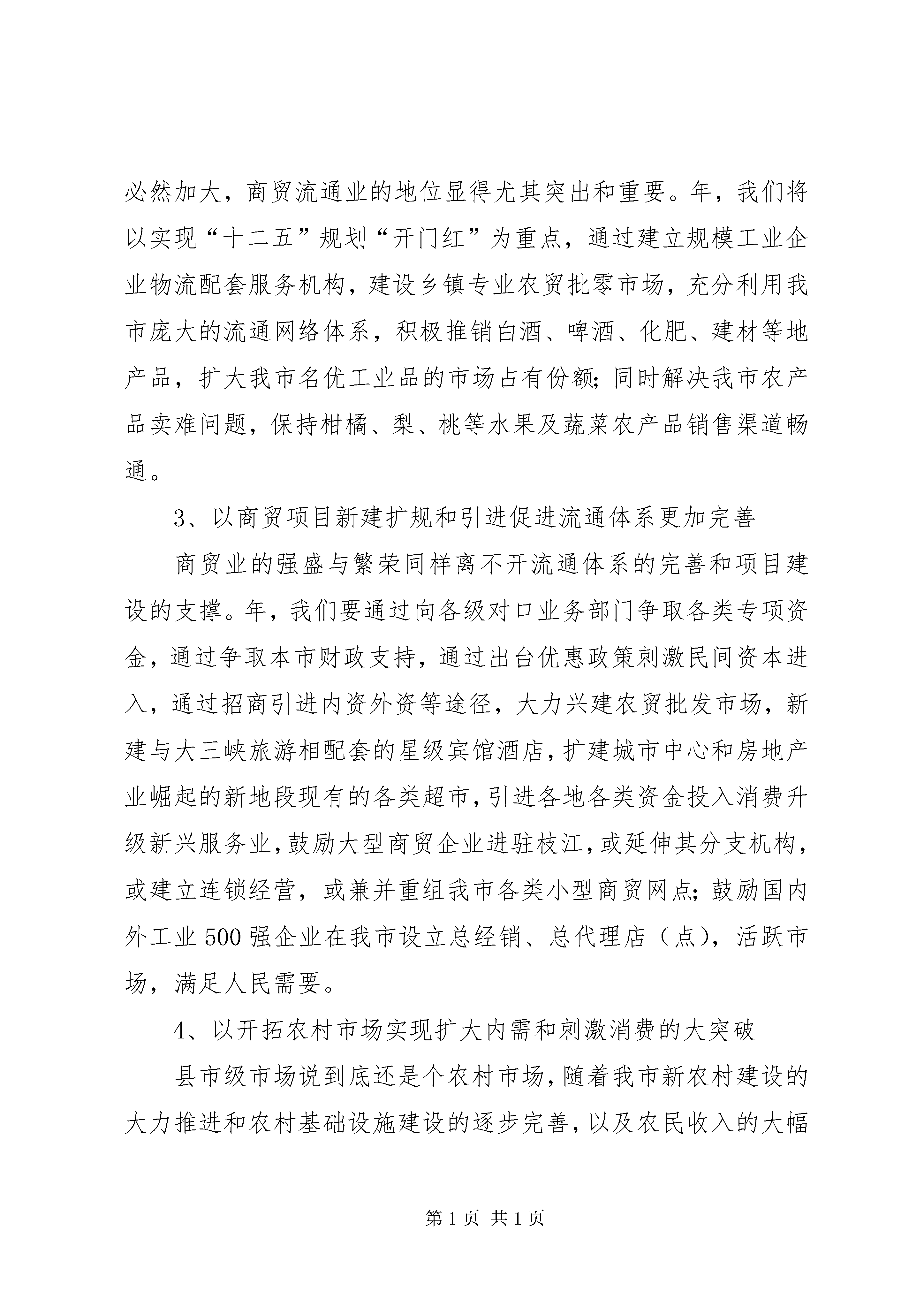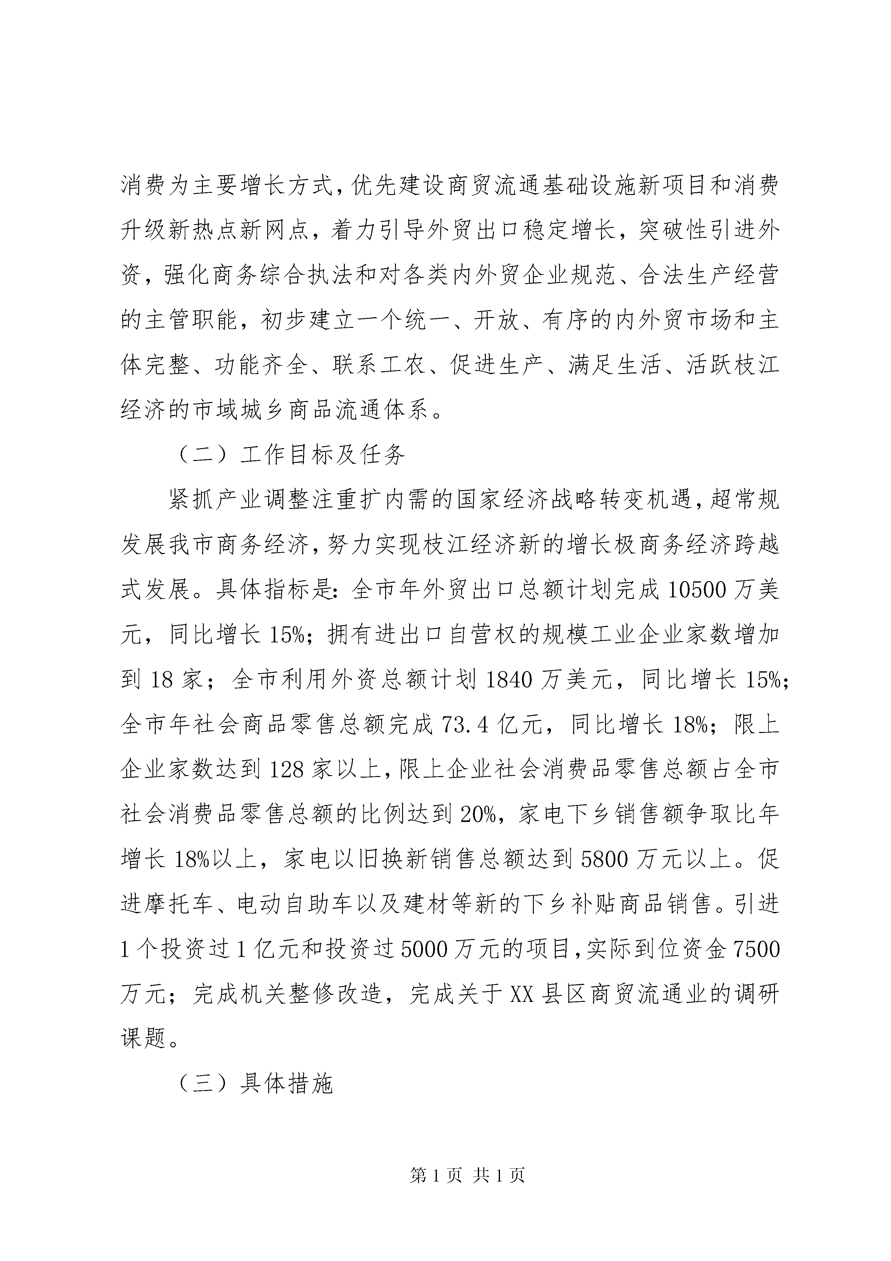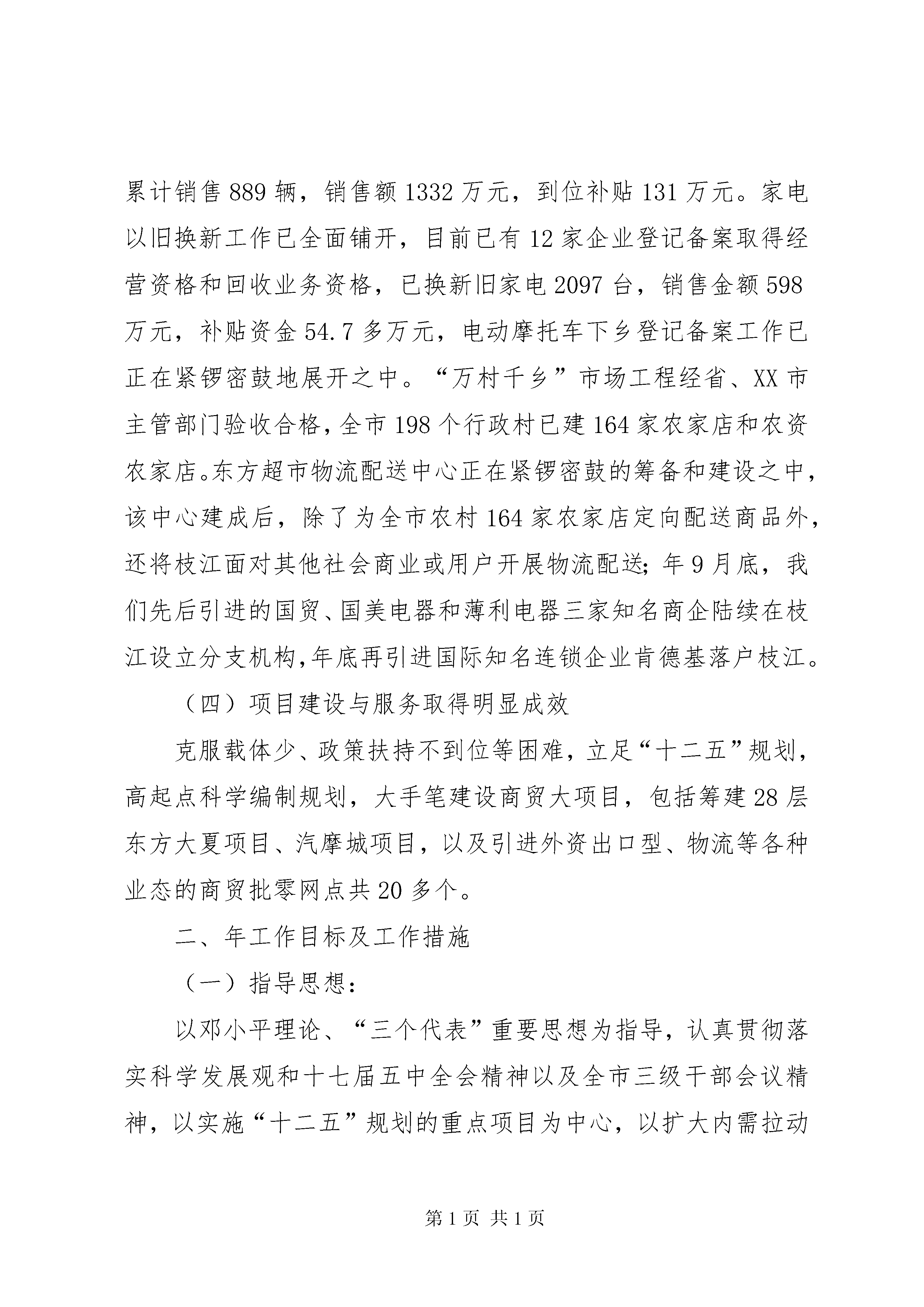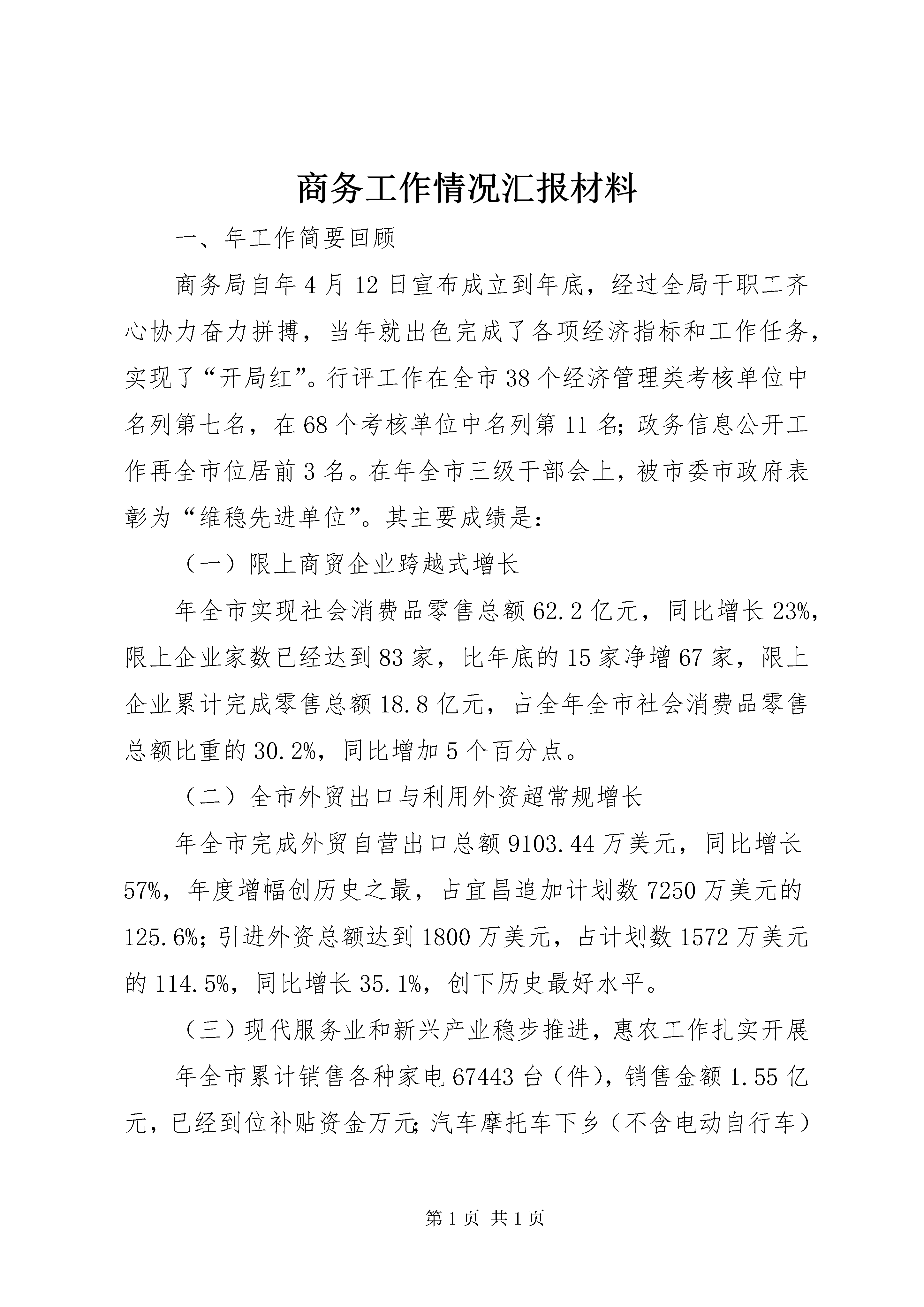 商务工作情况汇报材料一、年工作简要回顾商务局自年4月12日宣布成立到年底,经过全局干职工齐心协力奋力拼搏,当年就出色完成了各项经济指标和工作任务,实现了“开局红”。行评工作在全市38个经济管理类考核单位中名列第七名,在68个考核单位中名列第11名;政务信息公开工作再全市位居前3名。在年全市三级干部会上,被市委市政府表彰为“维稳先进单位”。其主要成绩是:(一)限上商贸企业跨越式增长年全市实现社会消费品零售总额62.2亿元,同比增长23%,限上企业家数已经达到83家,比年底的15家净增67家,限上企业累计完成零售总额18.8亿元,占全年全市社会消费品零售总额比重的30.2%,同比增加5个百分点。(二)全市外贸出口与利用外资超常规增长年全市完成外贸自营出口总额9103.44万美元,同比增长57%,年度增幅创历史之最,占宜昌追加计划数7250万美元的125.6%;引进外资总额达到1800万美元,占计划数1572万美元的114.5%,同比增长35.1%,创下历史最好水平。(三)现代服务业和新兴产业稳步推进,惠农工作扎实开展年全市累计销售各种家电67443台(件),销售金额1.55亿元,已经到位补贴资金万元;汽车摩托车下乡(不含电动自行车)累计销售889辆,销售额1332万元,到位补贴131万元。家电以旧换新工作已全面铺开,目前已有12家企业登记备案取得经营资格和回收业务资格,已换新旧家电2097台,销售金额598万元,补贴资金54.7多万元,电动摩托车下乡登记备案工作已正在紧锣密鼓地展开之中。“万村千乡”市场工程经省、XX市主管部门验收合格,全市198个行政村已建164家农家店和农资农家店。东方超市物流配送中心正在紧锣密鼓的筹备和建设之中,该中心建成后,除了为全市农村164家农家店定向配送商品外,还将枝江面对其他社会商业或用户开展物流配送;年9月底,我们先后引进的国贸、国美电器和薄利电器三家知名商企陆续在枝江设立分支机构,年底再引进国际知名连锁企业肯德基落户枝江。(四)项目建设与服务取得明显成效克服载体少、政策扶持不到位等困难,立足“十二五”规划,高起点科学编制规划,大手笔建设商贸大项目,包括筹建28层东方大夏项目、汽摩城项目,以及引进外资出口型、物流等各种业态的商贸批零网点共20多个。二、年工作目标及工作措施(一)指导思想:以邓小平理论、“三个代表”重要思想为指导,认真贯彻落实科学发展观和十七届五中全会精神以及全市三级干部会议精神,以实施“十二五”规划的重点项目为中心,以扩大内需拉动消费为主要增长方式,优先建设商贸流通基础设施新项目和消费升级新热点新网点,着力引导外贸出口稳定增长,突破性引进外资,强化商务综合执法和对各类内外贸企业规范、合法生产经营的主管职能,初步建立一个统一、开放、有序的内外贸市场和主体完整、功能齐全、联系工农、促进生产、满足生活、活跃枝江经济的市域城乡商品流通体系。(二)工作目标及任务紧抓产业调整注重扩内需的国家经济战略转变机遇,超常规发展我市商务经济,努力实现枝江经济新的增长极商务经济跨越式发展。具体指标是:全市年外贸出口总额计划完成10500万美元,同比增长15%;拥有进出口自营权的规模工业企业家数增加到18家;全市利用外资总额计划1840万美元,同比增长15%;全市年社会商品零售总额完成73.4亿元,同比增长18%;限上企业家数达到128家以上,限上企业社会消费品零售总额占全市社会消费品零售总额的比例达到20%,家电下乡销售额争取比年增长18%以上,家电以旧换新销售总额达到5800万元以上。促进摩托车、电动自助车以及建材等新的下乡补贴商品销售。引进1个投资过1亿元和投资过5000万元的项目,实际到位资金7500万元;完成机关整修改造,完成关于XX县区商贸流通业的调研课题。(三)具体措施1、以商务经济大发展推动市域经济和产业结构大转型党的十七届五中全会已经通过了“十二五”规划,并进一步明确了今后几年我国经济发展战略,即加快实现我国经济结构的调整和发展方式的转型,更加注重经济科学发展和谐发展低碳发展,更加注重发展质量,更加注重服务业的加快发展,gdp不再是地方考核的唯一指标,过去由投资增长型主导的粗放式发展模式不再是拉动经济增长的主要引擎,取而代之的将是由内需主导的扩大消费拉动的经济增长转型。因此,“十二五”乃至今后更长一段时期内,以商贸流通和物流为主体的现代服务业将成为各级各地经济新的增长极和重要支柱产业。年,枝江商务经济要积极适应新的发展大趋势,以此经济转型为契机,以新的商务局成立并逐步走上正轨为动力,一手紧抓外贸出口高增长不放松,保持我市医用纺织和农产品加工等特色出口的高成长;一手大力扶持物流业、农贸市场等新兴商贸流通业,千方百计培植限上商贸企业快速增长;同时,承接沿海产业转移、引