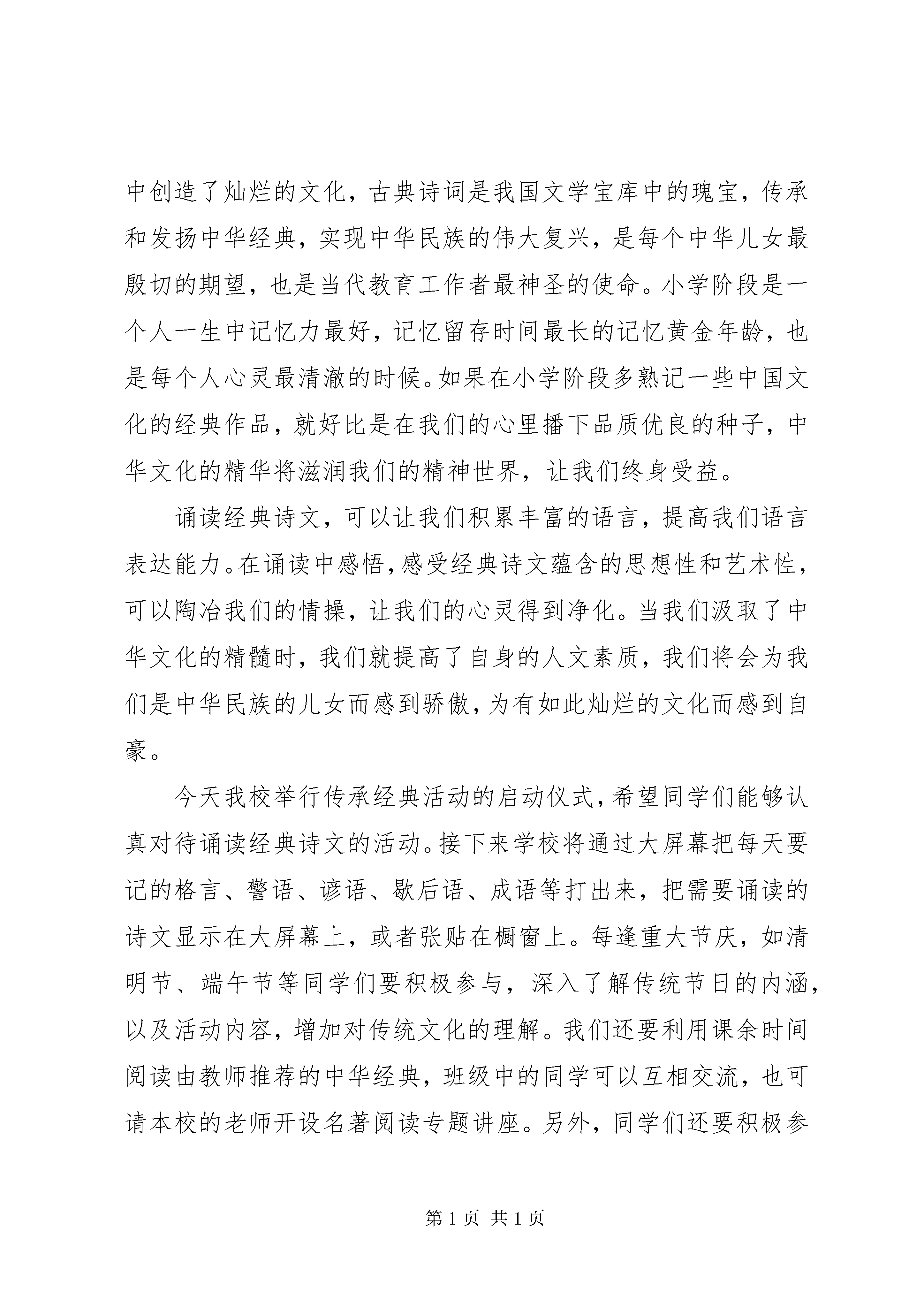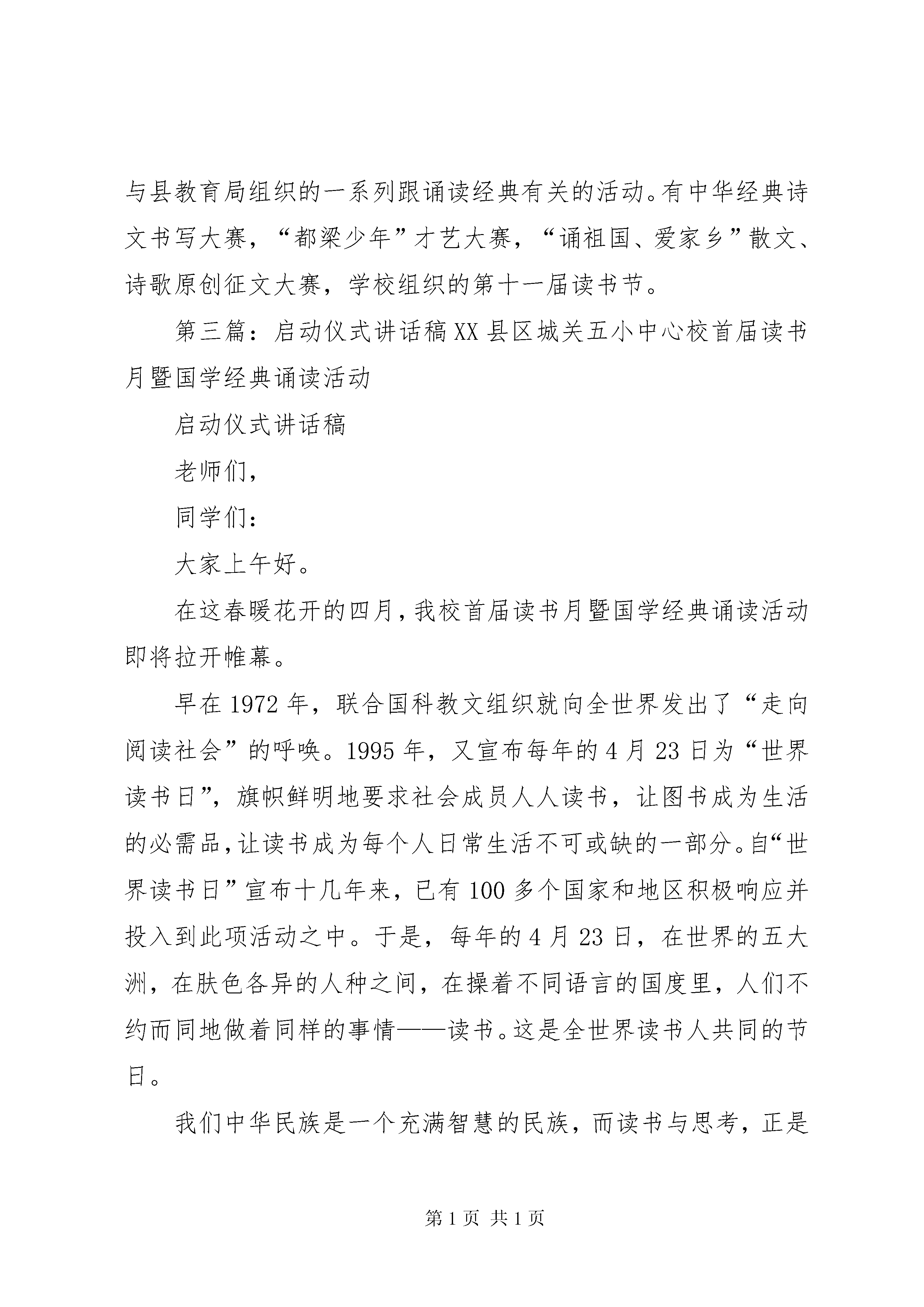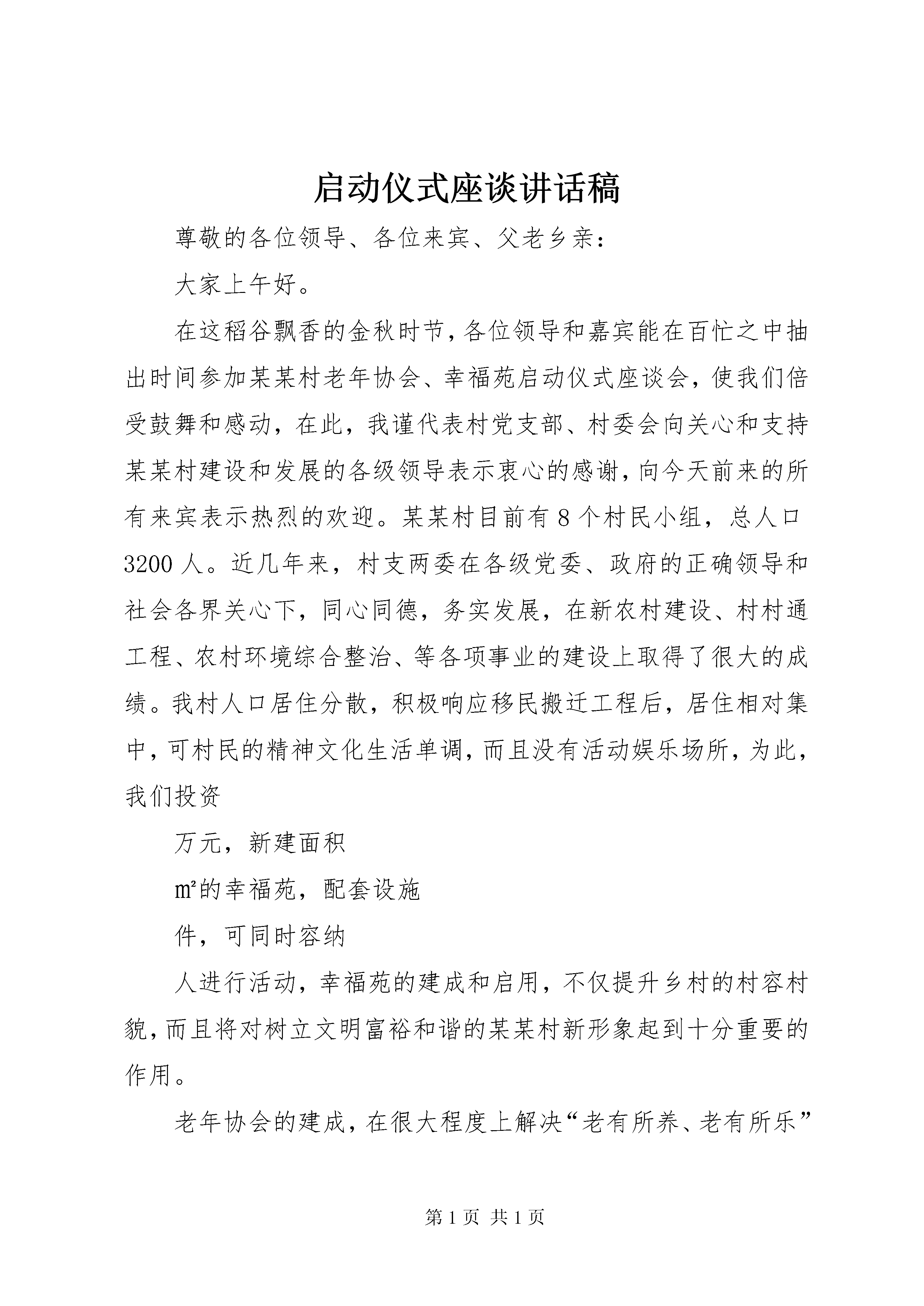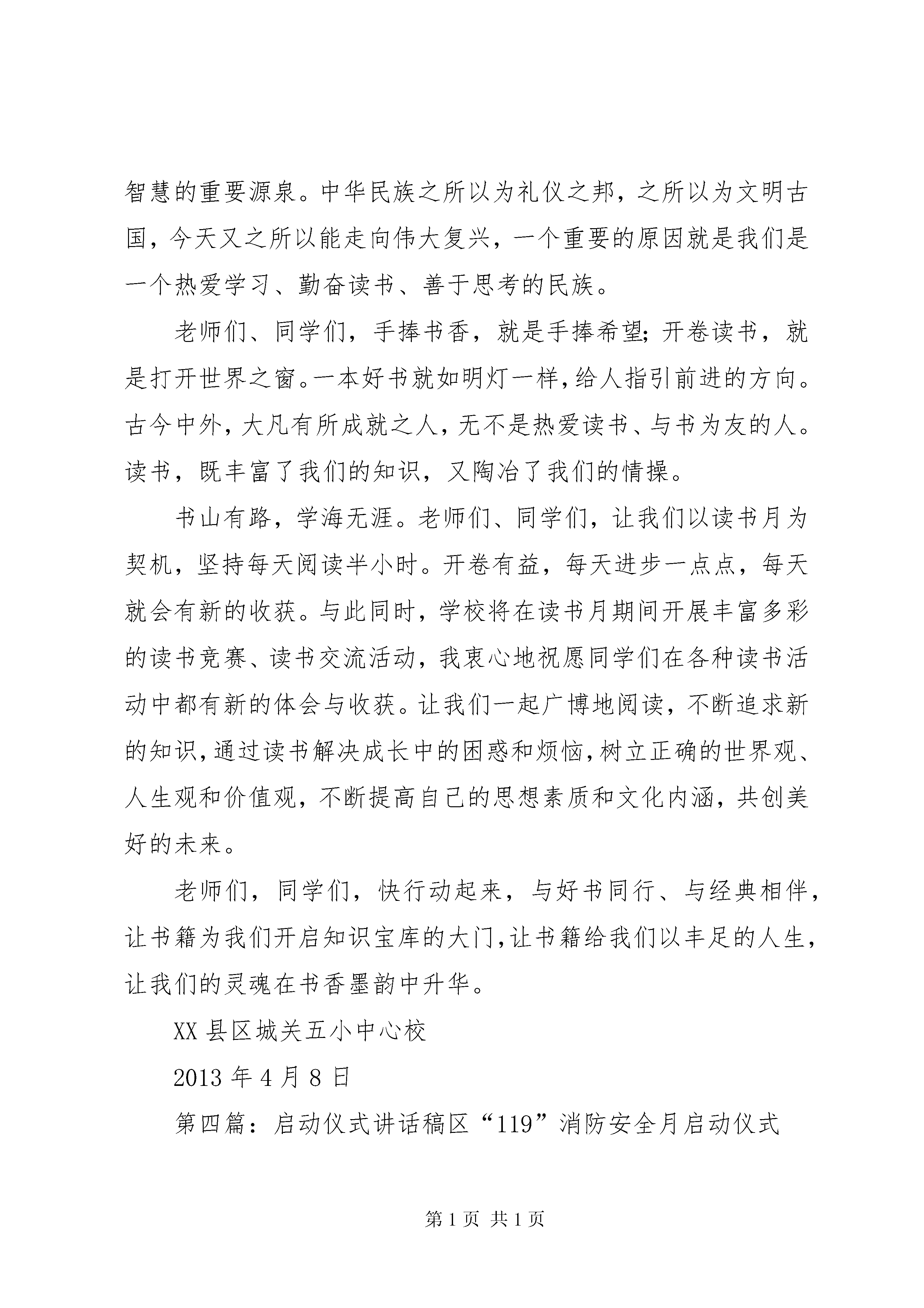 启动仪式座谈讲话稿尊敬的各位领导、各位来宾、父老乡亲:大家上午好。在这稻谷飘香的金秋时节,各位领导和嘉宾能在百忙之中抽出时间参加某某村老年协会、幸福苑启动仪式座谈会,使我们倍受鼓舞和感动,在此,我谨代表村党支部、村委会向关心和支持某某村建设和发展的各级领导表示衷心的感谢,向今天前来的所有来宾表示热烈的欢迎。某某村目前有8个村民小组,总人口3200人。近几年来,村支两委在各级党委、政府的正确领导和社会各界关心下,同心同德,务实发展,在新农村建设、村村通工程、农村环境综合整治、等各项事业的建设上取得了很大的成绩。我村人口居住分散,积极响应移民搬迁工程后,居住相对集中,可村民的精神文化生活单调,而且没有活动娱乐场所,为此,我们投资万元,新建面积㎡的幸福苑,配套设施件,可同时容纳人进行活动,幸福苑的建成和启用,不仅提升乡村的村容村貌,而且将对树立文明富裕和谐的某某村新形象起到十分重要的作用。老年协会的建成,在很大程度上解决“老有所养、老有所乐”的问题,“老吾老以及人之老”。尊老、敬老、爱老是中华民族的传统美德,关心、关照、关爱老人这一弱势群体,积极发展老年事业,为老年人创建健康和谐的生活环境,是党委、政府义不容辞的责任,更是我们的责任。“老有所养、老有所医、老有所教、老有所学、老有所为、老有所乐”的全程服务模式目前还不能完全落实,我们将逐步完善服务设施,力所能及的改善生活条件,把通洞敬老院办成服务、娱乐为一体的老人乐园。尊敬的各位领导、各位来宾、父老乡亲,尽管某某村面貌日新月异,未来的前景更加美好,然而我们不能满足于风景这边独好,这里是仍需要你们投入更多关注与关爱的一方热土,今天我们欢聚一堂畅谈我村发展,我们深感荣幸,希望你们一如既往的关心和支持我村的发展。人气旺则事业兴,承蒙你们的关心、支持与奉献,我们深信,某某村的明天将会更好。最后,向你们致以真诚的祝福:祝愿各位领导、各位来宾、父老乡亲,身体健康,家庭团圆,工作顺利。中秋节快乐。谢谢大家。2016年9月14日第二篇:启动仪式讲话稿“经典诵读”启动仪式讲话稿同学们:大家好。中华民族是一个优秀的民族,华夏子孙在五千年悠久的历史中创造了灿烂的文化,古典诗词是我国文学宝库中的瑰宝,传承和发扬中华经典,实现中华民族的伟大复兴,是每个中华儿女最殷切的期望,也是当代教育工作者最神圣的使命。小学阶段是一个人一生中记忆力最好,记忆留存时间最长的记忆黄金年龄,也是每个人心灵最清澈的时候。如果在小学阶段多熟记一些中国文化的经典作品,就好比是在我们的心里播下品质优良的种子,中华文化的精华将滋润我们的精神世界,让我们终身受益。诵读经典诗文,可以让我们积累丰富的语言,提高我们语言表达能力。在诵读中感悟,感受经典诗文蕴含的思想性和艺术性,可以陶冶我们的情操,让我们的心灵得到净化。当我们汲取了中华文化的精髓时,我们就提高了自身的人文素质,我们将会为我们是中华民族的儿女而感到骄傲,为有如此灿烂的文化而感到自豪。今天我校举行传承经典活动的启动仪式,希望同学们能够认真对待诵读经典诗文的活动。接下来学校将通过大屏幕把每天要记的格言、警语、谚语、歇后语、成语等打出来,把需要诵读的诗文显示在大屏幕上,或者张贴在橱窗上。每逢重大节庆,如清明节、端午节等同学们要积极参与,深入了解传统节日的内涵,以及活动内容,增加对传统文化的理解。我们还要利用课余时间阅读由教师推荐的中华经典,班级中的同学可以互相交流,也可请本校的老师开设名著阅读专题讲座。另外,同学们还要积极参与县教育局组织的一系列跟诵读经典有关的活动。有中华经典诗文书写大赛,“都梁少年”才艺大赛,“诵祖国、爱家乡”散文、诗歌原创征文大赛,学校组织的第十一届读书节。第三篇:启动仪式讲话稿XX县区城关五小中心校首届读书月暨国学经典诵读活动启动仪式讲话稿老师们,同学们:大家上午好。在这春暖花开的四月,我校首届读书月暨国学经典诵读活动即将拉开帷幕。早在1972年,联合国科教文组织就向全世界发出了“走向阅读社会”的呼唤。1995年,又宣布每年的4月23日为“世界读书日”,旗帜鲜明地要求社会成员人人读书,让图书成为生活的必需品,让读书成为每个人日常生活不可或缺的一部分。自“世界读书日”宣布十几年来,已有100多个国家和地区积极响应并投入到此项活动之中。于是,每年的4月23日,在世界的五大洲,在肤色各异的人种之间,在操着不同语言的国度里,人们不约而同地做着同样的事情——读书。这是全世界读书人共同的节日。我们中华民族是一个充满智慧的民族,而读书与思考,正是智慧的重要源泉。中华民族之所以为礼仪之邦,之所以为文明古国,今天又之所以能走向伟大复兴,一个重要的原因就是我们是一个热爱学习、勤奋读书、善于思考的民族。老师们、同学们,手捧书香,就是手捧希望;开卷读书,就是打开世界