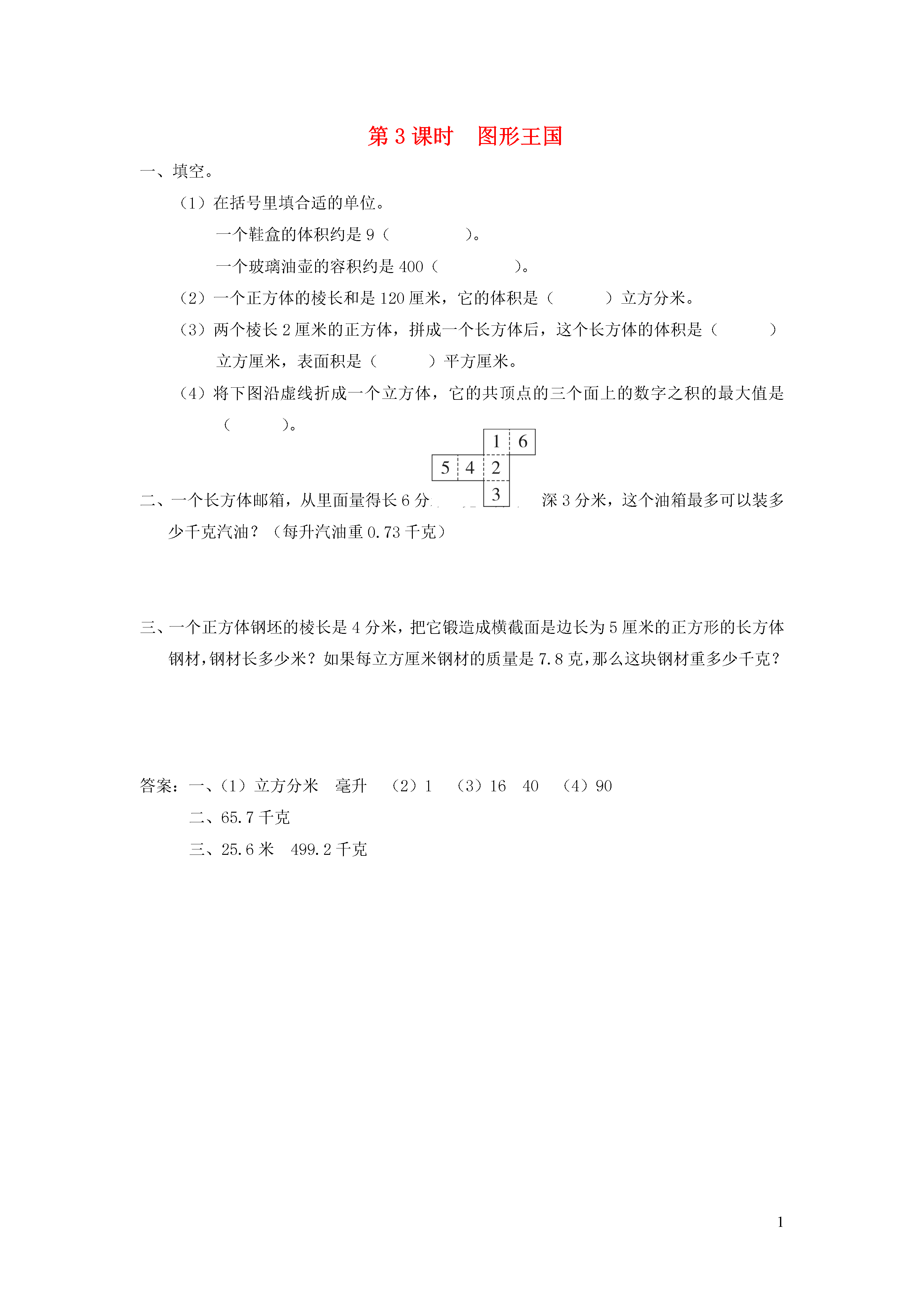 1第3课时图形王国填空。在括号里填合适的单位。一个鞋盒的体积约是9()。一个玻璃油壶的容积约是400()。一个正方体的棱长和是120厘米,它的体积是()立方分米。两个棱长2厘米的正方体,拼成一个长方体后,这个长方体的体积是()立方厘米,表面积是()平方厘米。将下图沿虚线折成一个立方体,它的共顶点的三个面上的数字之积的最大值是()。一个长方体邮箱,从里面量得长6分米、宽5分米、深3分米,这个油箱最多可以装多少千克汽油?(每升汽油重0.73千克)一个正方体钢坯的棱长是4分米,把它锻造成横截面是边长为5厘米的正方形的长方体钢材,钢材长多少米?如果每立方厘米钢材的质量是7.8克,那么这块钢材重多少千克?答案:一、(1)立方分米毫升(2)1(3)1640(4)90二、65.7千克三、25.6米499.2千克