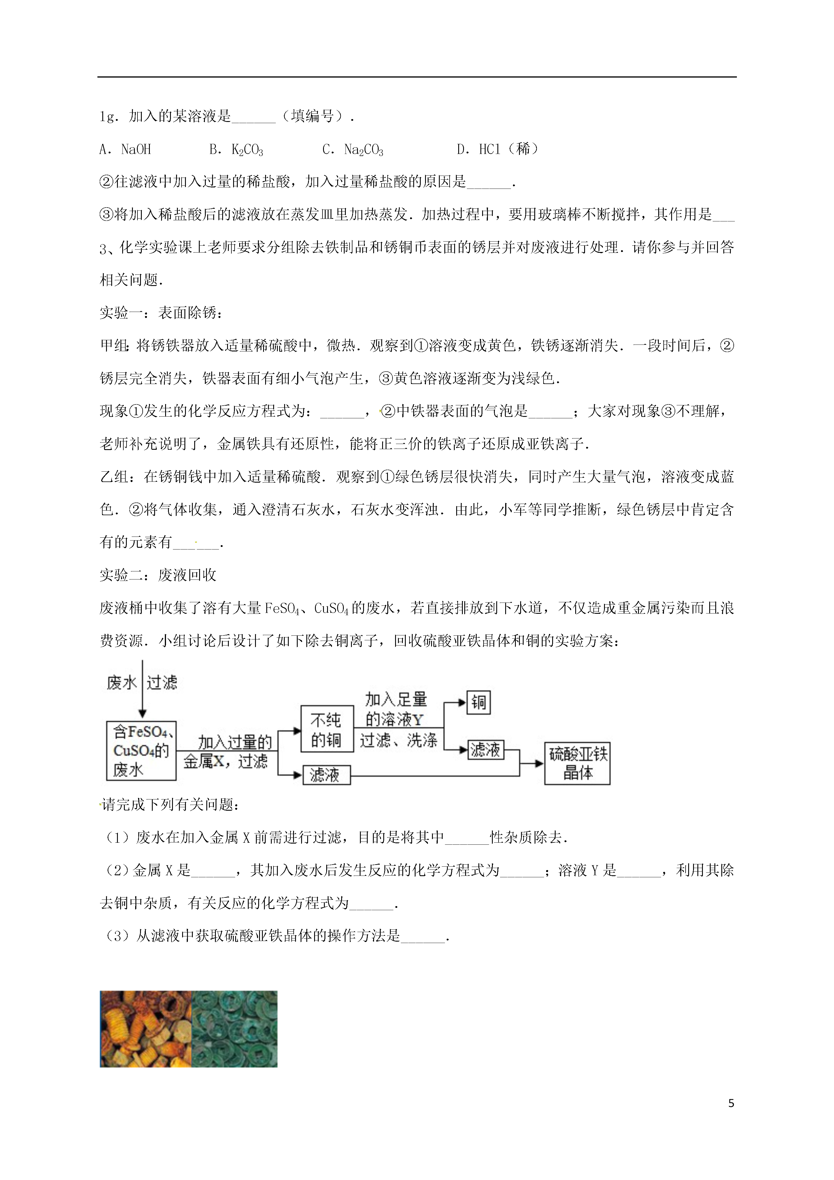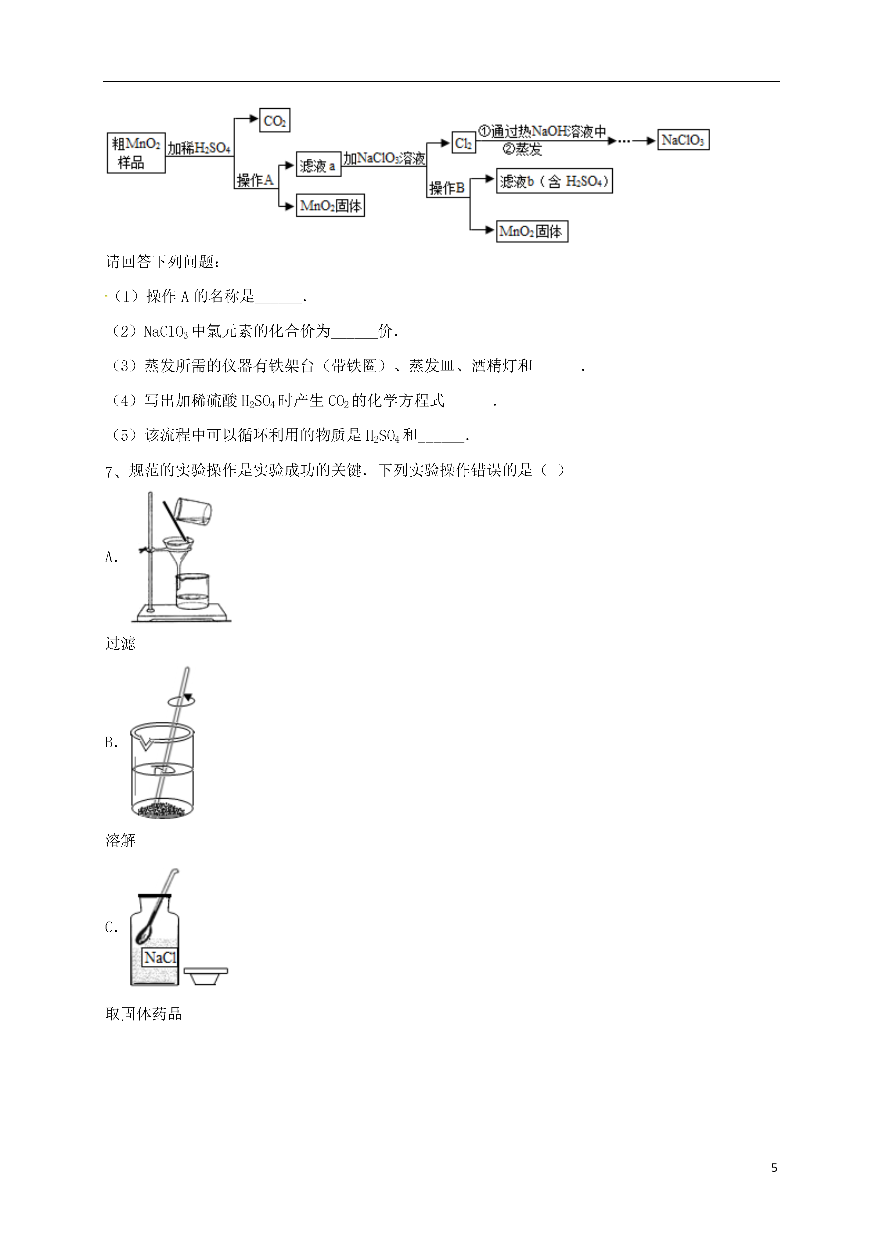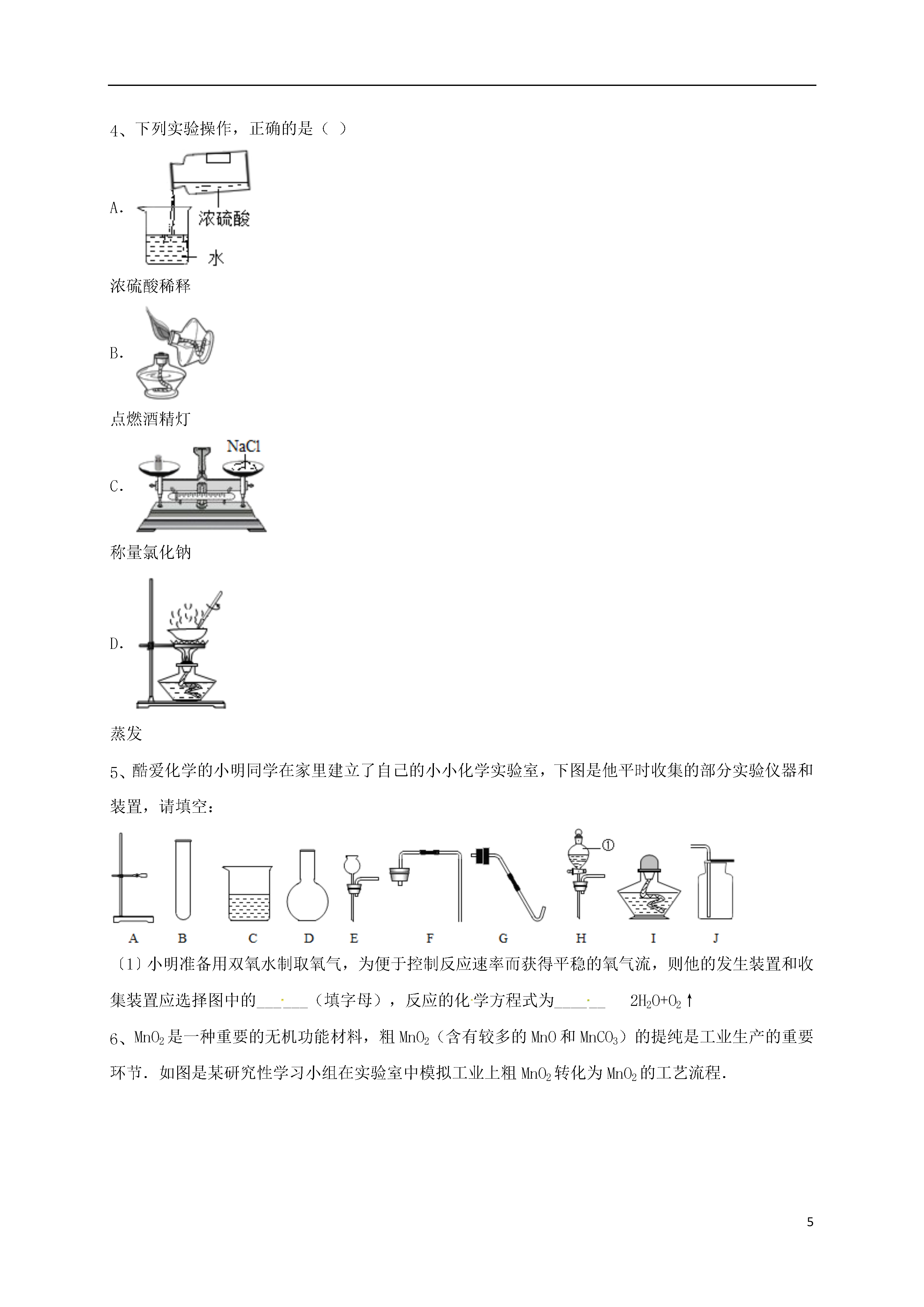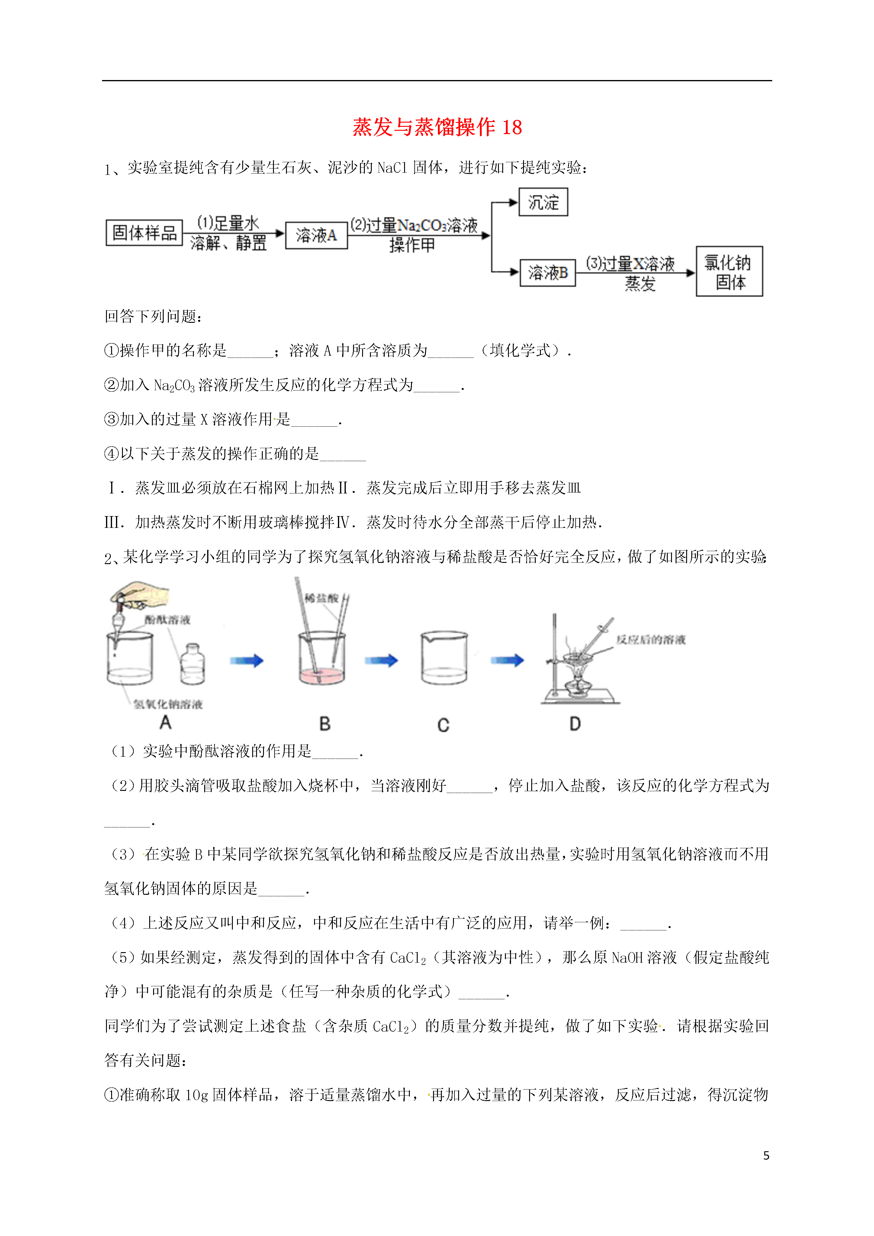 5蒸发与蒸馏操作18实验室提纯含有少量生石灰、泥沙的NaCl固体,进行如下提纯实验:回答下列问题:①操作甲的名称是______;溶液A中所含溶质为______(填化学式).②加入Na2CO3溶液所发生反应的化学方程式为______.③加入的过量X溶液作用是______.④以下关于蒸发的操作正确的是______Ⅰ.蒸发皿必须放在石棉网上加热Ⅱ.蒸发完成后立即用手移去蒸发皿Ⅲ.加热蒸发时不断用玻璃棒搅拌Ⅳ.蒸发时待水分全部蒸干后停止加热.某化学学习小组的同学为了探究氢氧化钠溶液与稀盐酸是否恰好完全反应,做了如图所示的实验:(1)实验中酚酞溶液的作用是______.(2)用胶头滴管吸取盐酸加入烧杯中,当溶液刚好______,停止加入盐酸,该反应的化学方程式为______.(3)在实验B中某同学欲探究氢氧化钠和稀盐酸反应是否放出热量,实验时用氢氧化钠溶液而不用氢氧化钠固体的原因是______.(4)上述反应又叫中和反应,中和反应在生活中有广泛的应用,请举一例:______.(5)如果经测定,蒸发得到的固体中含有CaCl2(其溶液为中性),那么原NaOH溶液(假定盐酸纯净)中可能混有的杂质是(任写一种杂质的化学式)______.同学们为了尝试测定上述食盐(含杂质CaCl2)的质量分数并提纯,做了如下实验.请根据实验回答有关问题:①准确称取10g固体样品,溶于适量蒸馏水中,再加入过量的下列某溶液,反应后过滤,得沉淀物1g.加入的某溶液是______(填编号).A.NaOHB.K2CO3C.Na2CO3D.HCl(稀)②往滤液中加入过量的稀盐酸,加入过量稀盐酸的原因是______.③将加入稀盐酸后的滤液放在蒸发皿里加热蒸发.加热过程中,要用玻璃棒不断搅拌,其作用是___化学实验课上老师要求分组除去铁制品和锈铜币表面的锈层并对废液进行处理.请你参与并回答相关问题.实验一:表面除锈:甲组:将锈铁器放入适量稀硫酸中,微热.观察到①溶液变成黄色,铁锈逐渐消失.一段时间后,②锈层完全消失,铁器表面有细小气泡产生,③黄色溶液逐渐变为浅绿色.现象①发生的化学反应方程式为:______,②中铁器表面的气泡是______;大家对现象③不理解,老师补充说明了,金属铁具有还原性,能将正三价的铁离子还原成亚铁离子.乙组:在锈铜钱中加入适量稀硫酸.观察到①绿色锈层很快消失,同时产生大量气泡,溶液变成蓝色.②将气体收集,通入澄清石灰水,石灰水变浑浊.由此,小军等同学推断,绿色锈层中肯定含有的元素有______.实验二:废液回收废液桶中收集了溶有大量FeSO4、CuSO4的废水,若直接排放到下水道,不仅造成重金属污染而且浪费资源.小组讨论后设计了如下除去铜离子,回收硫酸亚铁晶体和铜的实验方案:请完成下列有关问题:(1)废水在加入金属X前需进行过滤,目的是将其中______性杂质除去.(2)金属X是______,其加入废水后发生反应的化学方程式为______;溶液Y是______,利用其除去铜中杂质,有关反应的化学方程式为______.(3)从滤液中获取硫酸亚铁晶体的操作方法是______.下列实验操作,正确的是()A.浓硫酸稀释B.点燃酒精灯C.称量氯化钠D.蒸发酷爱化学的小明同学在家里建立了自己的小小化学实验室,下图是他平时收集的部分实验仪器和装置,请填空:〔1〕小明准备用双氧水制取氧气,为便于控制反应速率而获得平稳的氧气流,则他的发生装置和收集装置应选择图中的______(填字母),反应的化学方程式为______2H2O+O2↑MnO2是一种重要的无机功能材料,粗MnO2(含有较多的MnO和MnCO3)的提纯是工业生产的重要环节.如图是某研究性学习小组在实验室中模拟工业上粗MnO2转化为MnO2的工艺流程.请回答下列问题:(1)操作A的名称是______.(2)NaClO3中氯元素的化合价为______价.(3)蒸发所需的仪器有铁架台(带铁圈)、蒸发皿、酒精灯和______.(4)写出加稀硫酸H2SO4时产生CO2的化学方程式______.(5)该流程中可以循环利用的物质是H2SO4和______.规范的实验操作是实验成功的关键.下列实验操作错误的是()A.过滤B.溶解C.取固体药品D.蒸发氯化钠是生活必需品,也是重要的化工原料.提纯含少量泥沙的粗盐,一般经过以下操作流程:(1)操作③中需要将圆形滤纸折叠处理,下列图示中不该出现的情形是(填序号).(2)操作④中除用到铁架台(带铁圈)、酒精灯、玻璃棒、坩埚钳外,还需要用到等仪器.该操作中容易造成食盐固体飞溅,为尽量减少飞溅,除连续搅拌外,你认为还可采取等措施.(3)实验结束后称量获得的精盐,并计算精盐的制得率,发现制得率较低,其可能原