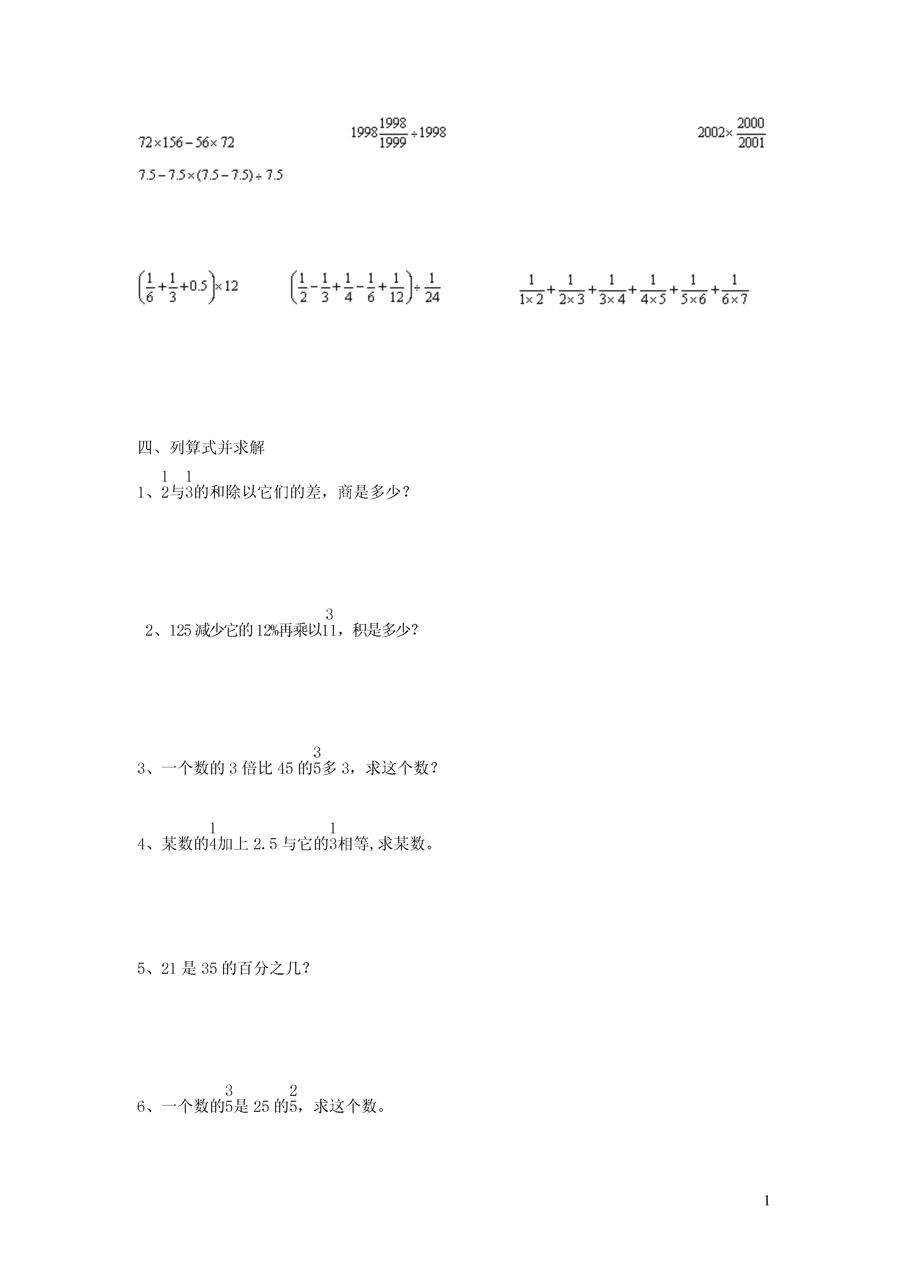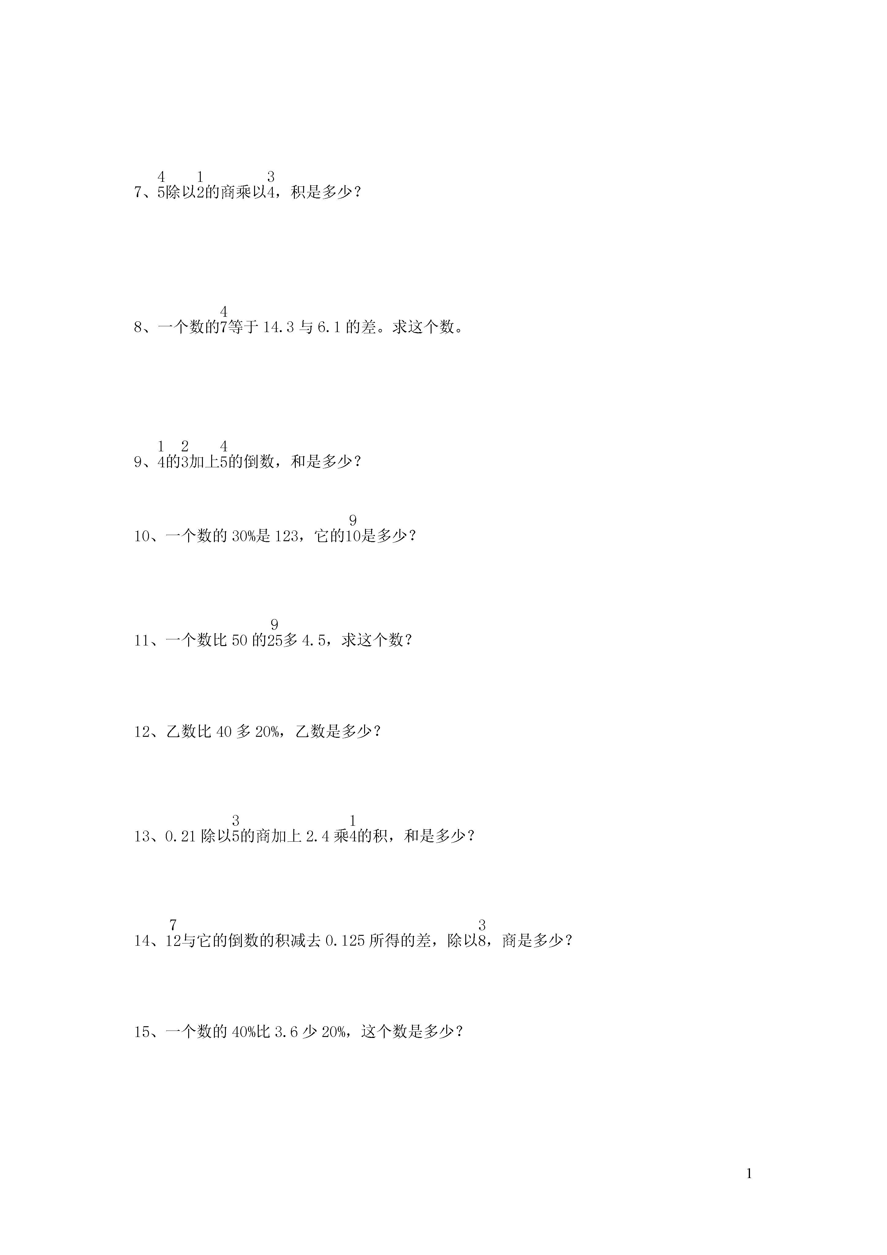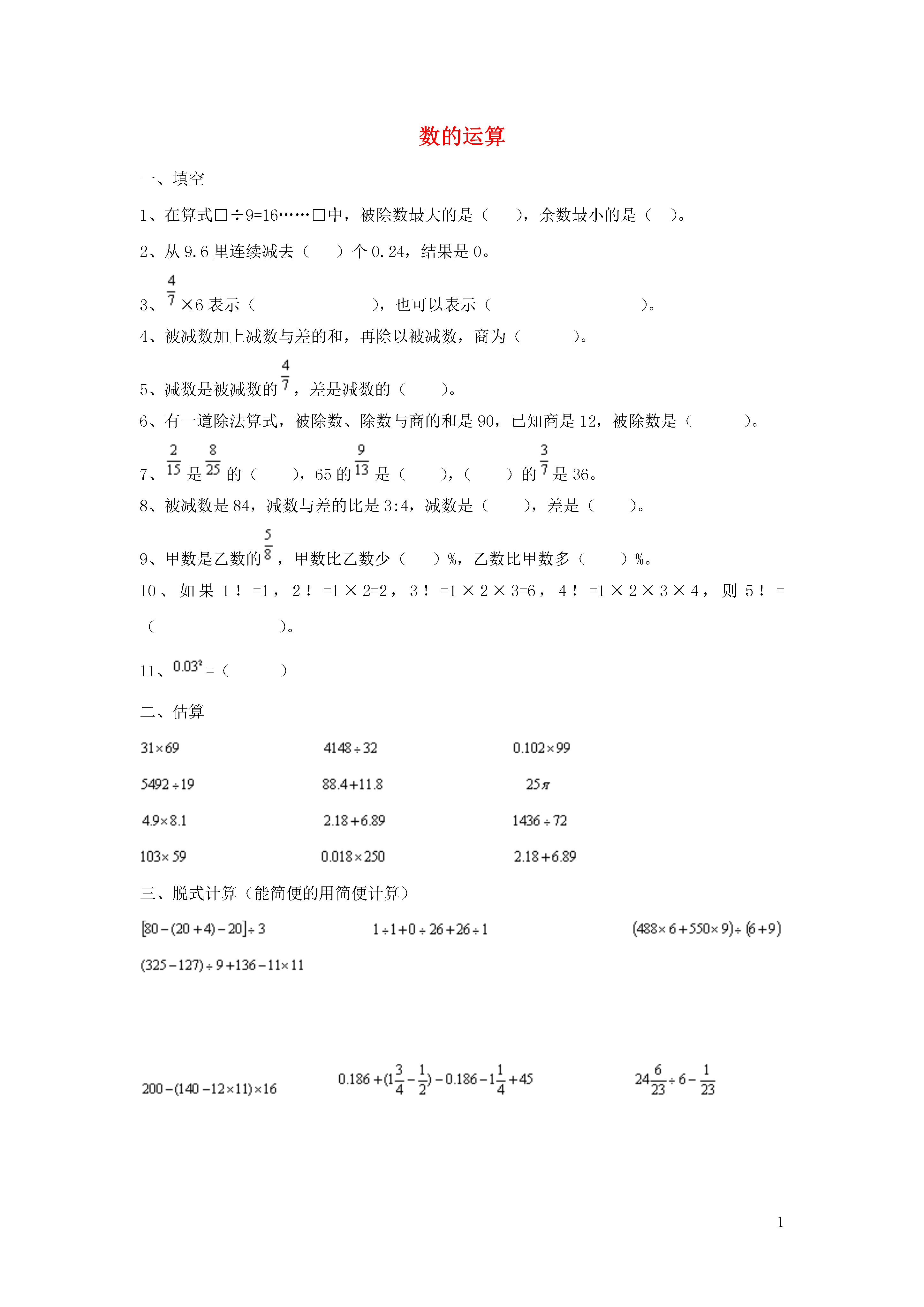 1数的运算一、填空1、在算式□÷9=16……□中,被除数最大的是(),余数最小的是()。2、从9.6里连续减去()个0.24,结果是0。3、×6表示(),也可以表示()。4、被减数加上减数与差的和,再除以被减数,商为()。5、减数是被减数的,差是减数的()。6、有一道除法算式,被除数、除数与商的和是90,已知商是12,被除数是()。7、是的(),65的是(),()的是36。8、被减数是84,减数与差的比是3:4,减数是(),差是()。9、甲数是乙数的,甲数比乙数少()%,乙数比甲数多()%。10、如果1!=1,2!=1×2=2,3!=1×2×3=6,4!=1×2×3×4,则5!=()。11、=()二、估算三、脱式计算(能简便的用简便计算)四、列算式并求解1、与的和除以它们的差,商是多少?2、125减少它的12%再乘以,积是多少?3、一个数的3倍比45的多3,求这个数?4、某数的加上2.5与它的相等,求某数。5、21是35的百分之几?6、一个数的是25的,求这个数。7、除以的商乘以,积是多少?8、一个数的等于14.3与6.1的差。求这个数。9、的加上的倒数,和是多少?10、一个数的30%是123,它的是多少?11、一个数比50的多4.5,求这个数?12、乙数比40多20%,乙数是多少?13、0.21除以的商加上2.4乘的积,和是多少?14、与它的倒数的积减去0.125所得的差,除以,商是多少?15、一个数的40%比3.6少20%,这个数是多少?16、甲数比乙数多25%,甲数是乙数的百分之几?乙数比甲数少百分之几?乙数是甲数的百分之几?