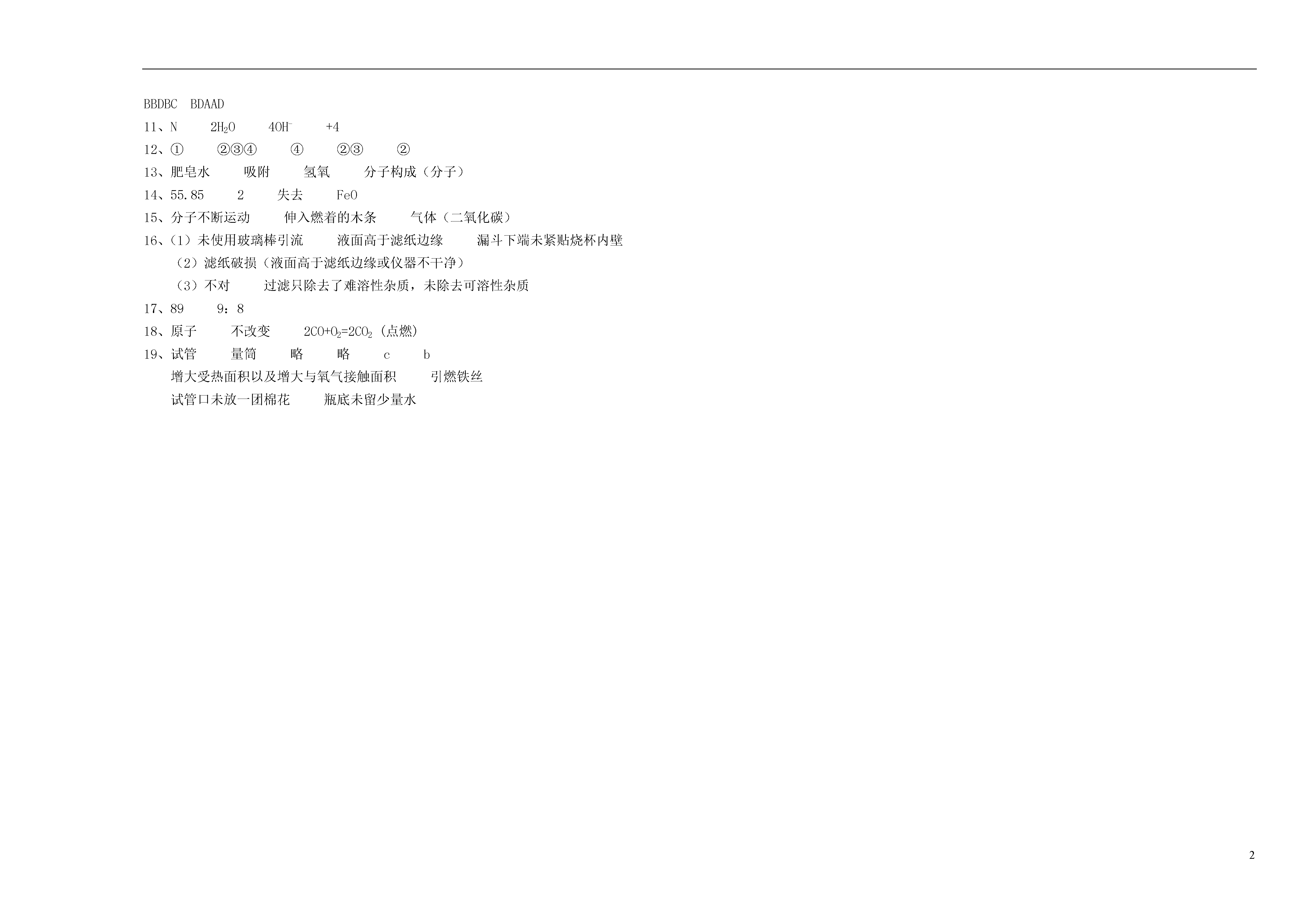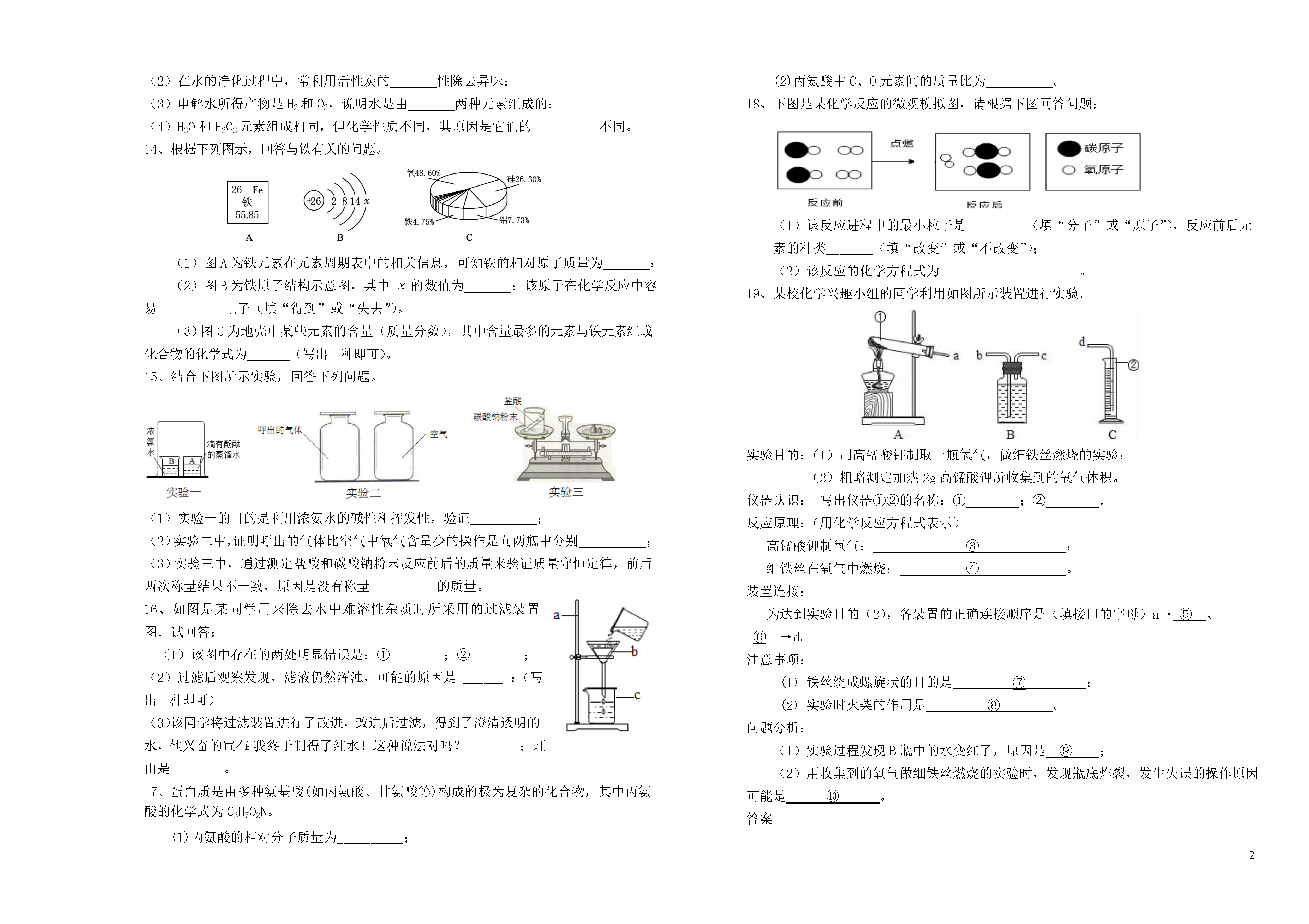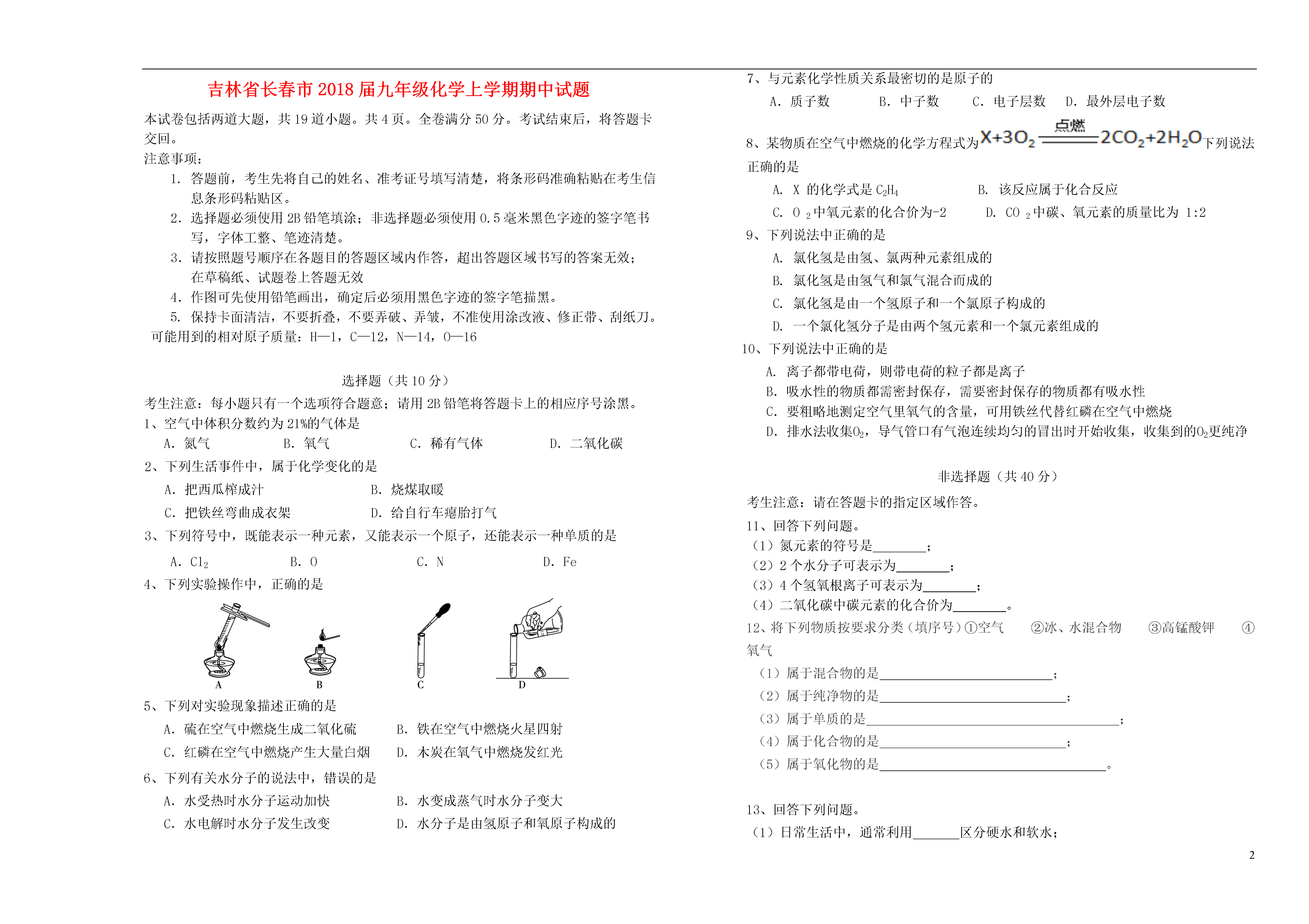 2吉林省长春市2018届九年级化学上学期期中试题本试卷包括两道大题,共19道小题。。全卷满分50分。考试结束后,将答题卡交回。注意事项:1.答题前,考生先将自己的姓名、准考证号填写清楚,将条形码准确粘贴在考生信息条形码粘贴区。2.选择题必须使用2B铅笔填涂;非选择题必须使用0.5毫米黑色字迹的签字笔书写,字体工整、笔迹清楚。3.请按照题号顺序在各题目的答题区域内作答,超出答题区域书写的答案无效;在草稿纸、试题卷上答题无效4.作图可先使用铅笔画出,确定后必须用黑色字迹的签字笔描黑。5.保持卡面清洁,不要折叠,不要弄破、弄皱,不准使用涂改液、修正带、刮纸刀。可能用到的相对原子质量:H—1,C—12,N—14,O—16选择题(共10分)考生注意:每小题只有一个选项符合题意;请用2B铅笔将答题卡上的相应序号涂黑。1、空气中体积分数约为21%的气体是A.氮气B.氧气C.稀有气体D.二氧化碳2、下列生活事件中,属于化学变化的是A.把西瓜榨成汁B.烧煤取暖C.把铁丝弯曲成衣架D.给自行车瘪胎打气3、下列符号中,既能表示一种元素,又能表示一个原子,还能表示一种单质的是A.Cl2B.OC.ND.Fe4、下列实验操作中,正确的是5、下列对实验现象描述正确的是A.硫在空气中燃烧生成二氧化硫B.铁在空气中燃烧火星四射C.红磷在空气中燃烧产生大量白烟D.木炭在氧气中燃烧发红光6、下列有关水分子的说法中,错误的是A.水受热时水分子运动加快B.水变成蒸气时水分子变大C.水电解时水分子发生改变D.水分子是由氢原子和氧原子构成的7、与元素化学性质关系最密切的是原子的A.质子数B.中子数C.电子层数D.最外层电子数8、某物质在空气中燃烧的化学方程式为下列说法正确的是A.X的化学式是C2H4B.该反应属于化合反应C.O2中氧元素的化合价为-2D.CO2中碳、氧元素的质量比为1:29、下列说法中正确的是A.氯化氢是由氢、氯两种元素组成的B.氯化氢是由氢气和氯气混合而成的C.氯化氢是由一个氢原子和一个氯原子构成的D.一个氯化氢分子是由两个氢元素和一个氯元素组成的10、下列说法中正确的是A.离子都带电荷,则带电荷的粒子都是离子B.吸水性的物质都需密封保存,需要密封保存的物质都有吸水性C.要粗略地测定空气里氧气的含量,可用铁丝代替红磷在空气中燃烧D.排水法收集O2,导气管口有气泡连续均匀的冒出时开始收集,收集到的O2更纯净非选择题(共40分)考生注意:请在答题卡的指定区域作答。11、回答下列问题。(1)氮元素的符号是;(2)2个水分子可表示为;(3)4个氢氧根离子可表示为;(4)二氧化碳中碳元素的化合价为。12、将下列物质按要求分类(填序号)①空气②冰、水混合物③高锰酸钾④氧气(1)属于混合物的是;(2)属于纯净物的是;(3)属于单质的是;(4)属于化合物的是;(5)属于氧化物的是。13、回答下列问题。(1)日常生活中,通常利用区分硬水和软水;(2)在水的净化过程中,常利用活性炭的性除去异味;(3)电解水所得产物是H2和O2,说明水是由两种元素组成的;(4)H2O和H2O2元素组成相同,但化学性质不同,其原因是它们的__________不同。14、根据下列图示,回答与铁有关的问题。(1)图A为铁元素在元素周期表中的相关信息,可知铁的相对原子质量为;(2)图B为铁原子结构示意图,其中χ的数值为;该原子在化学反应中容易__________电子(填“得到”或“失去”)。(3)图C为地壳中某些元素的含量(质量分数),其中含量最多的元素与铁元素组成化合物的化学式为(写出一种即可)。15、结合下图所示实验,回答下列问题。(1)实验一的目的是利用浓氨水的碱性和挥发性,验证__________;(2)实验二中,证明呼出的气体比空气中氧气含量少的操作是向两瓶中分别__________;(3)实验三中,通过测定盐酸和碳酸钠粉末反应前后的质量来验证质量守恒定律,前后两次称量结果不一致,原因是没有称量__________的质量。16、如图是某同学用来除去水中难溶性杂质时所采用的过滤装置图.试回答:(1)该图中存在的两处明显错误是:①______;②______;(2)过滤后观察发现,滤液仍然浑浊,可能的原因是______;(写出一种即可)(3)该同学将过滤装置进行了改进,改进后过滤,得到了澄清透明的水,他兴奋的宣布:我终于制得了纯水!这种说法对吗?_