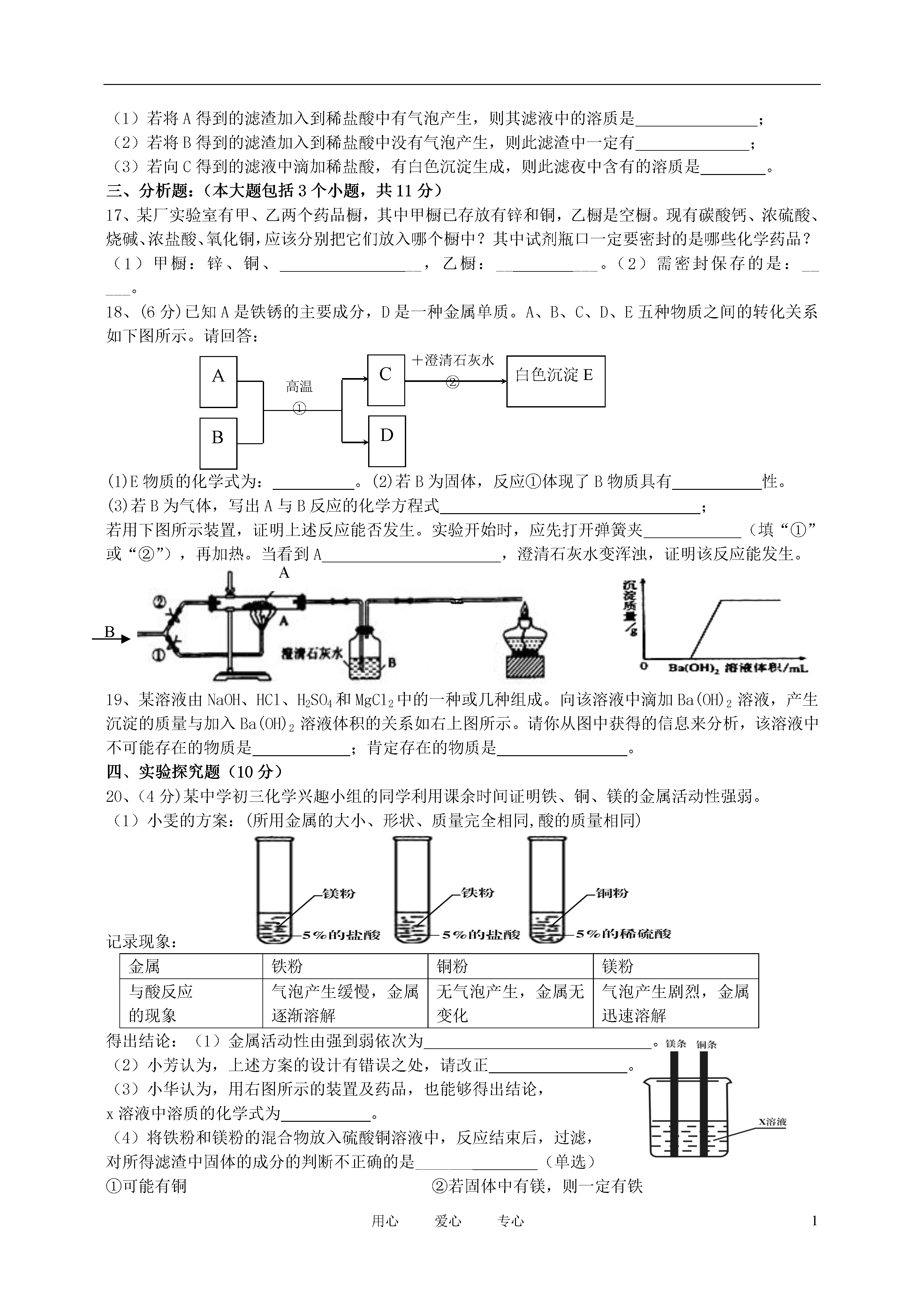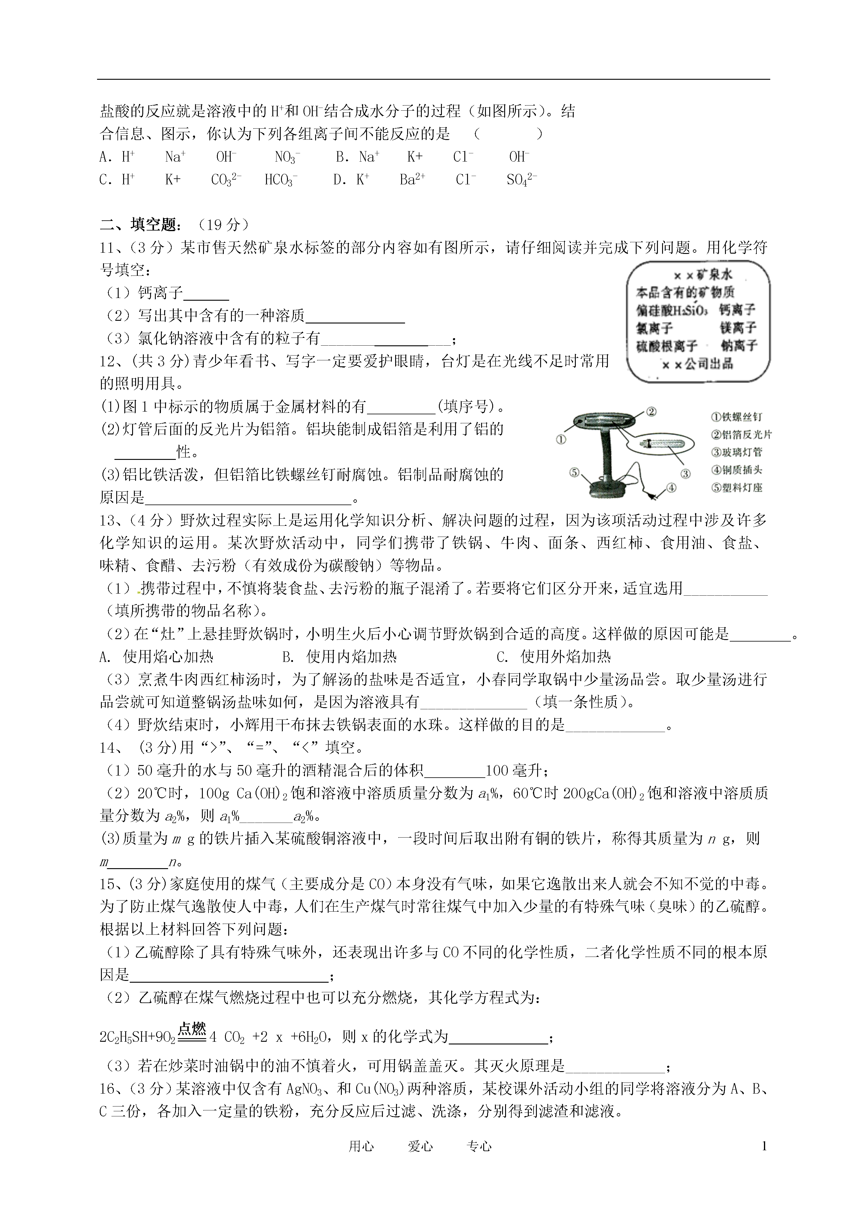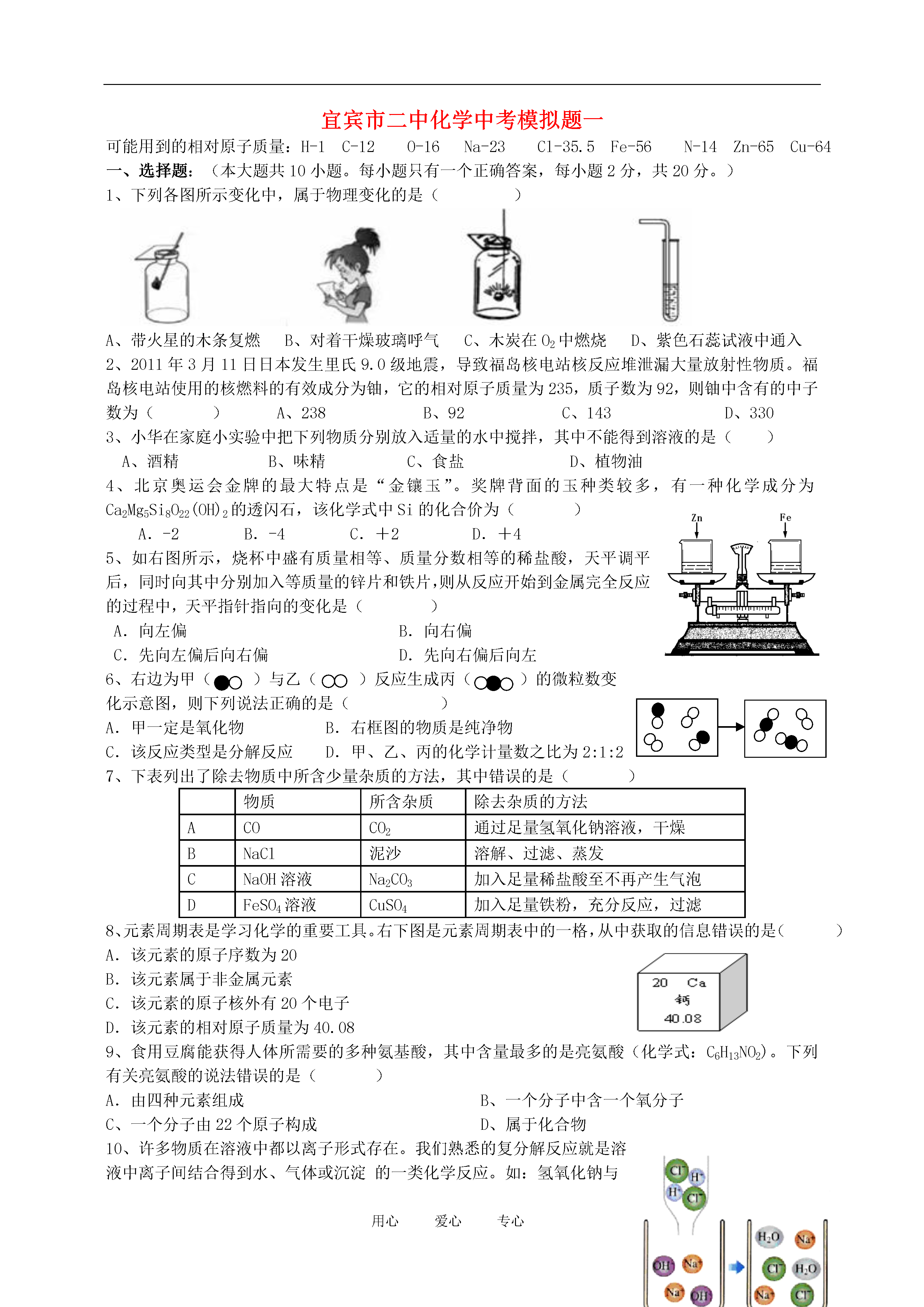1用心爱心专心宜宾市二中化学中考模拟题一可能用到的相对原子质量:H-1C-12O-16Na-23Cl-35.5Fe-56N-14Zn-65Cu-64一、选择题:(本大题共10小题。每小题只有一个正确答案,每小题2分,共20分。)1、下列各图所示变化中,属于物理变化的是()A、带火星的木条复燃B、对着干燥玻璃呼气C、木炭在O2中燃烧D、紫色石蕊试液中通入2、2011年3月11日日本发生里氏9.0级地震,导致福岛核电站核反应堆泄漏大量放射性物质。福岛核电站使用的核燃料的有效成分为铀,它的相对原子质量为235,质子数为92,则铀中含有的中子数为()A、238B、92C、143D、3303、小华在家庭小实验中把下列物质分别放入适量的水中搅拌,其中不能得到溶液的是()A、酒精B、味精C、食盐D、植物油4、北京奥运会金牌的最大特点是“金镶玉”。奖牌背面的玉种类较多,有一种化学成分为Ca2Mg5Si8O22(OH)2的透闪石,该化学式中Si的化合价为()A.-2B.-4C.+2D.+45、如右图所示,烧杯中盛有质量相等、质量分数相等的稀盐酸,天平调平后,同时向其中分别加入等质量的锌片和铁片,则从反应开始到金属完全反应的过程中,天平指针指向的变化是()A.向左偏B.向右偏C.先向左偏后向右偏D.先向右偏后向左6、右边为甲()与乙()反应生成丙()的微粒数变化示意图,则下列说法正确的是()A.甲一定是氧化物B.右框图的物质是纯净物C.该反应类型是分解反应D.甲、乙、丙的化学计量数之比为2:1:27、下表列出了除去物质中所含少量杂质的方法,其中错误的是()物质所含杂质除去杂质的方法ACOCO2通过足量氢氧化钠溶液,干燥BNaCl泥沙溶解、过滤、蒸发CNaOH溶液Na2CO3加入足量稀盐酸至不再产生气泡DFeSO4溶液CuSO4加入足量铁粉,充分反应,过滤8、元素周期表是学习化学的重要工具。右下图是元素周期表中的一格,从中获取的信息错误的是()A.该元素的原子序数为20B.该元素属于非金属元素C.该元素的原子核外有20个电子D.该元素的相对原子质量为40.089、食用豆腐能获得人体所需要的多种氨基酸,其中含量最多的是亮氨酸(化学式:C6H13NO2)。下列有关亮氨酸的说法错误的是()A.由四种元素组成B、一个分子中含一个氧分子C、一个分子由22个原子构成D、属于化合物10、许多物质在溶液中都以离子形式存在。我们熟悉的复分解反应就是溶液中离子间结合得到水、气体或沉淀的一类化学反应。如:氢氧化钠与盐酸的反应就是溶液中的H+和OH-结合成水分子的过程(如图所示)。结合信息、图示,你认为下列各组离子间不能反应的是()A.H+Na+OH-NO3-B.Na+K+Cl-OH-C.H+K+CO32-HCO3-D.K+Ba2+Cl-SO42-二、填空题:(19分)11、(3分)某市售天然矿泉水标签的部分内容如有图所示,请仔细阅读并完成下列问题。用化学符号填空:(1)钙离子(2)写出其中含有的一种溶质(3)氯化钠溶液中含有的粒子有__________;12、(共3分)青少年看书、写字一定要爱护眼睛,台灯是在光线不足时常用的照明用具。(1)图1中标示的物质属于金属材料的有(填序号)。(2)灯管后面的反光片为铝箔。铝块能制成铝箔是利用了铝的性。(3)铝比铁活泼,但铝箔比铁螺丝钉耐腐蚀。铝制品耐腐蚀的原因是。13、(4分)野炊过程实际上是运用化学知识分析、解决问题的过程,因为该项活动过程中涉及许多化学知识的运用。某次野炊活动中,同学们携带了铁锅、牛肉、面条、西红柿、食用油、食盐、味精、食醋、去污粉(有效成份为碳酸钠)等物品。(1)携带过程中,不慎将装食盐、去污粉的瓶子混淆了。若要将它们区分开来,适宜选用___________(填所携带的物品名称)。(2)在“灶”上悬挂野炊锅时,小明生火后小心调节野炊锅到合适的高度。这样做的原因可能是。A.使用焰心加热B.使用内焰加热C.使用外焰加热(3)烹煮牛肉西红柿汤时,为了解汤的盐味是否适宜,小春同学取锅中少量汤品尝。取少量汤进行品尝就可知道整锅汤盐味如何,是因为溶液具有______________(填一条性质)。(4)野炊结束时,小辉用干布抹去铁锅表面的水珠。这样做的目的是_____________。14、(3分)用“>”、“=”、“<”填空。(1)50毫升的水与50毫升的酒精混合后的体积100毫升;(2)20℃时,100gCa(OH)2饱和溶液中溶质质量分数为a1%,60℃时200gCa(OH)2饱和溶液中溶质质量分数为a2%,则a1%_______a2%。(3)质量为mg的铁片插入某硫酸