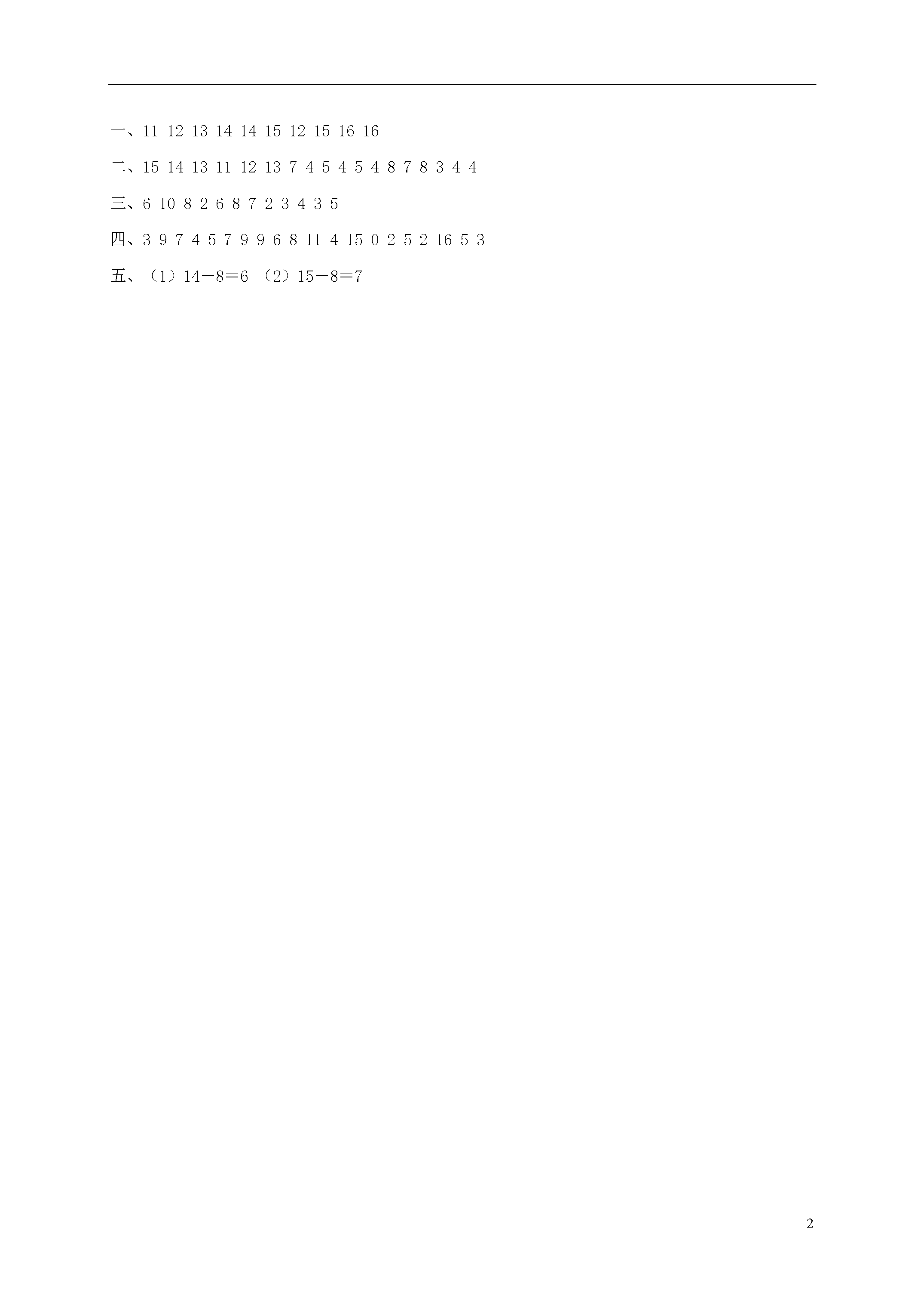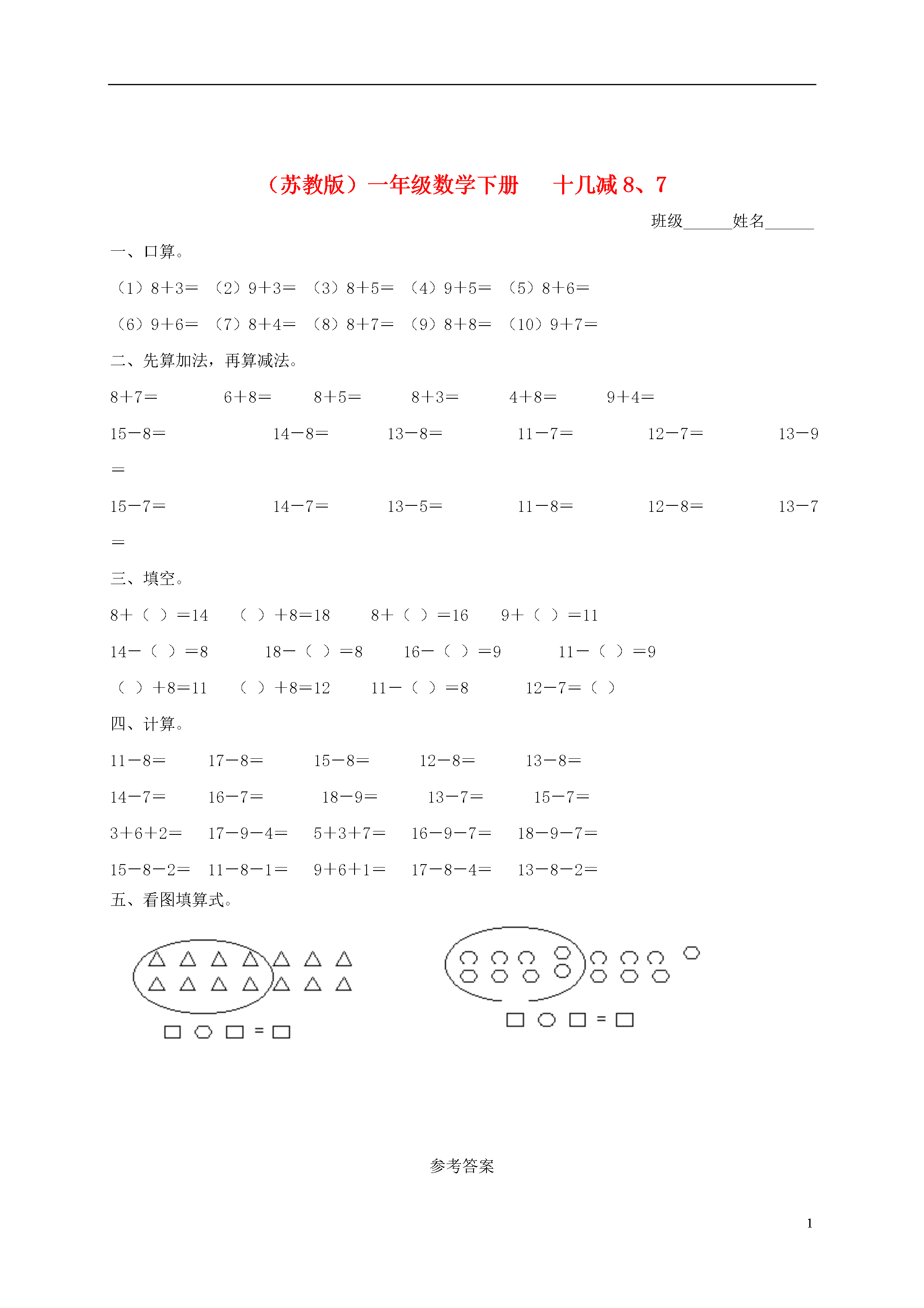2(苏教版)一年级数学下册十几减8、7班级______姓名______一、口算。(1)8+3=(2)9+3=(3)8+5=(4)9+5=(5)8+6=(6)9+6=(7)8+4=(8)8+7=(9)8+8=(10)9+7=二、先算加法,再算减法。8+7=6+8=8+5=8+3=4+8=9+4=15-8=14-8=13-8=11-7=12-7=13-9=15-7=14-7=13-5=11-8=12-8=13-7=三、填空。8+()=14()+8=188+()=169+()=1114-()=818-()=816-()=911-()=9()+8=11()+8=1211-()=812-7=()四、计算。11-8=17-8=15-8=12-8=13-8=14-7=16-7=18-9=13-7=15-7=3+6+2=17-9-4=5+3+7=16-9-7=18-9-7=15-8-2=11-8-1=9+6+1=17-8-4=13-8-2=五、看图填算式。参考答案一、11121314141512151616二、151413111213745454878344三、6108268723435四、39745799681141502521653五、(1)14-8=6(2)15-8=7