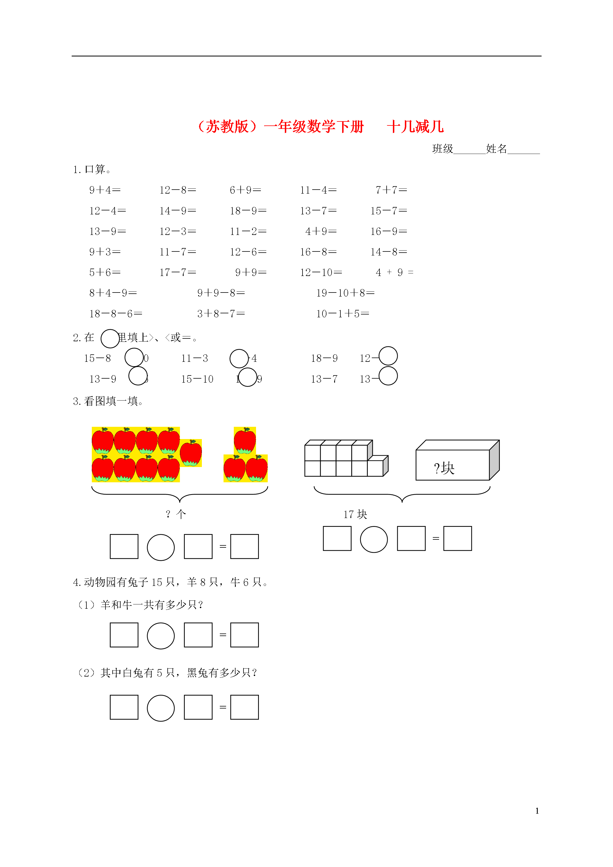 1(苏教版)一年级数学下册十几减几班级______姓名______1.口算。9+4=12-8=6+9=11-4=7+7=12-4=14-9=18-9=13-7=15-7=13-9=12-3=11-2=4+9=16-9=9+3=11-7=12-6=16-8=14-8=5+6=17-7=9+9=12-10=4+9=8+4-9=9+9-8=19-10+8=18-8-6=3+8-7=10-1+5=2.在里填上>、<或=。15-81011-311-418-912-213-9515-1014-913-713-63.看图填一填。?块?个17块==4.动物园有兔子15只,羊8只,牛6只。(1)羊和牛一共有多少只?==(2)其中白兔有5只,黑兔有多少只?