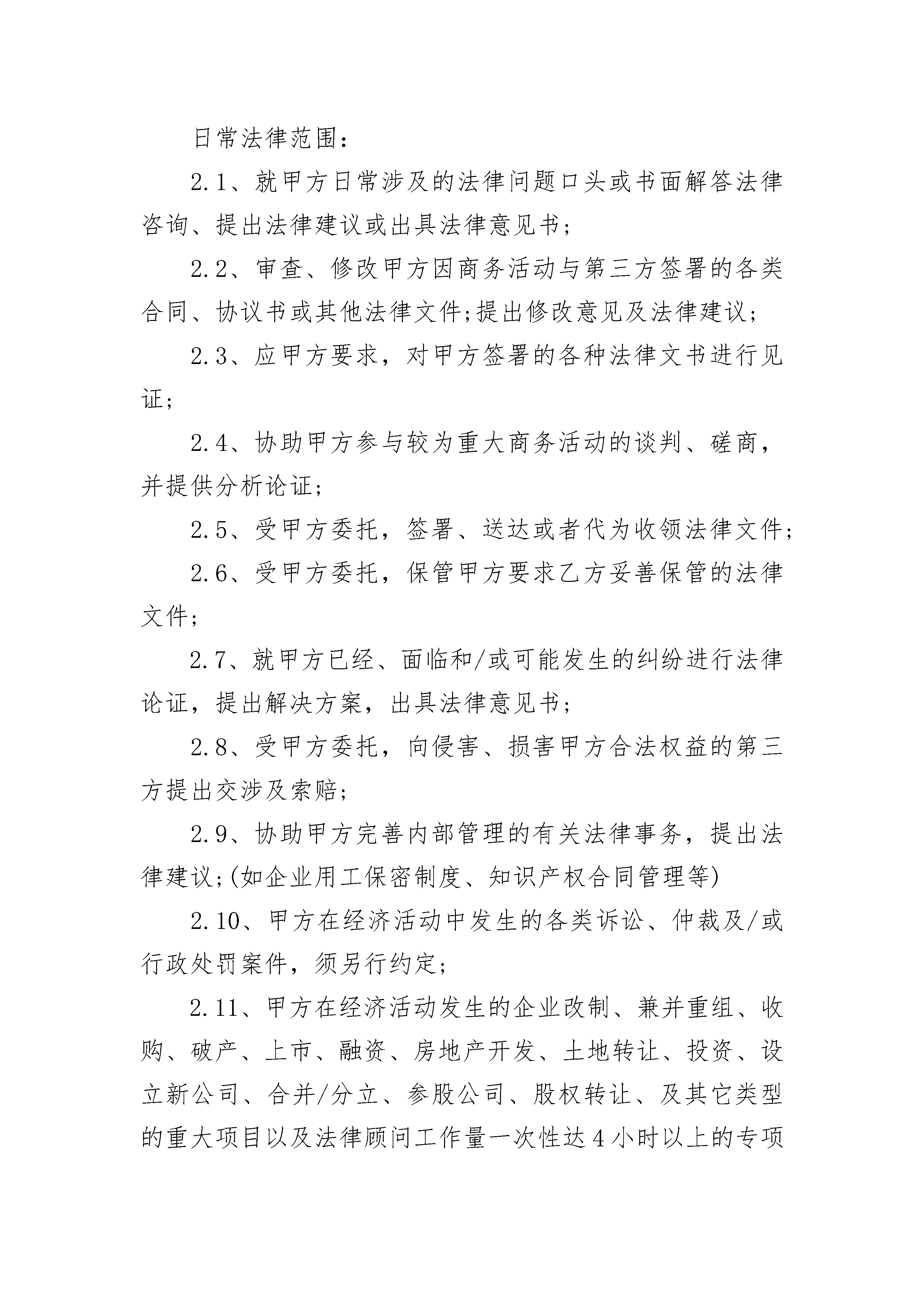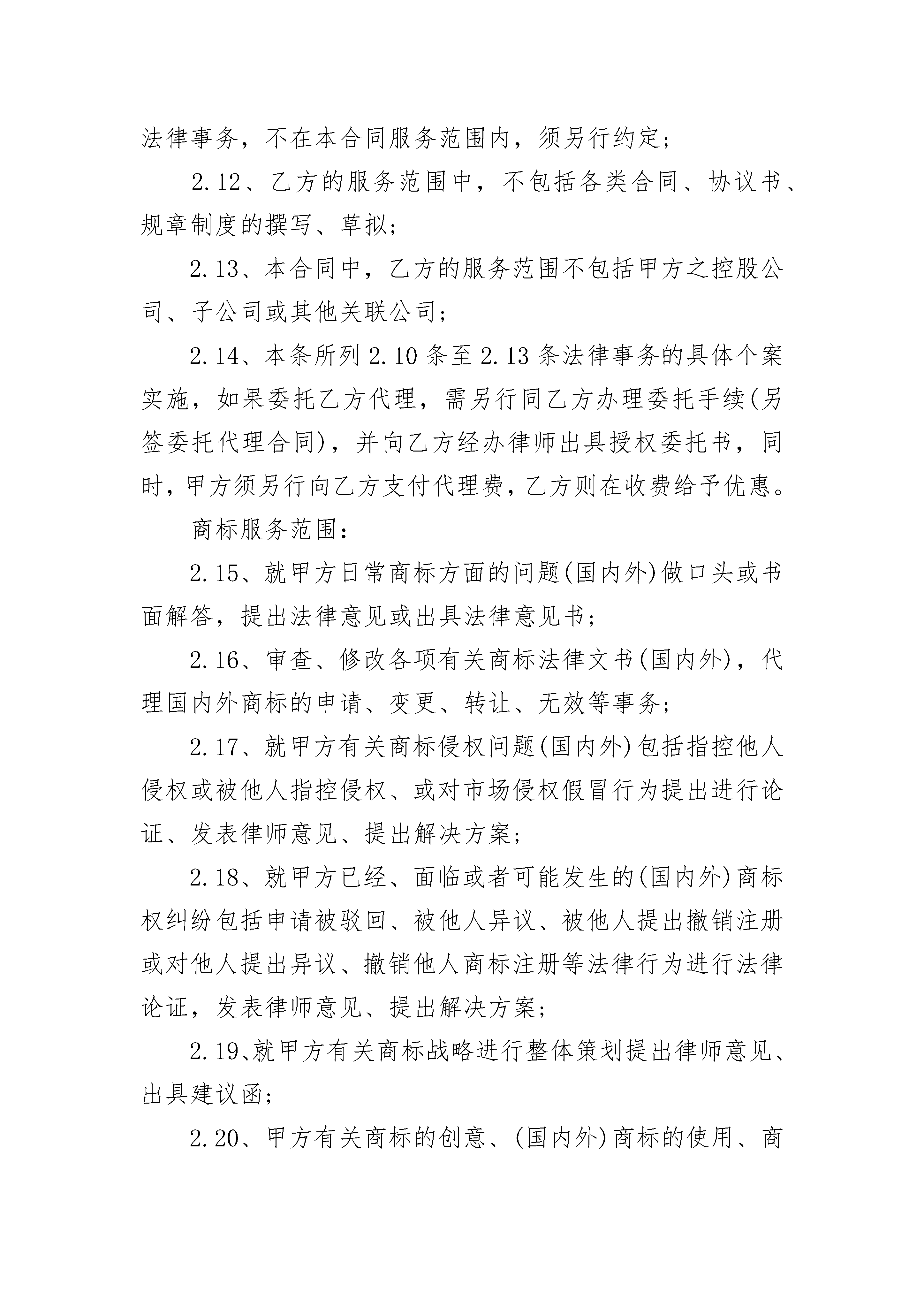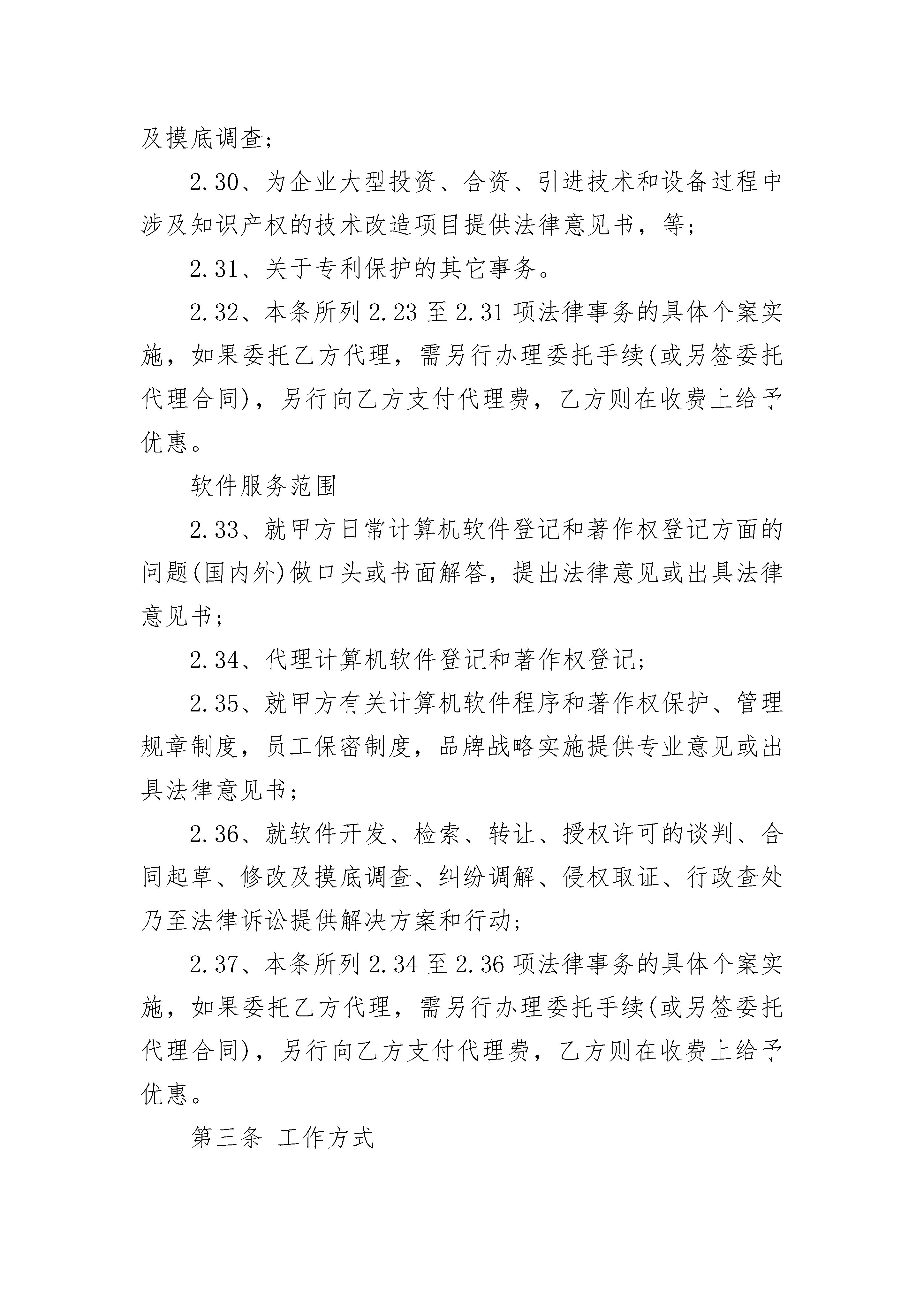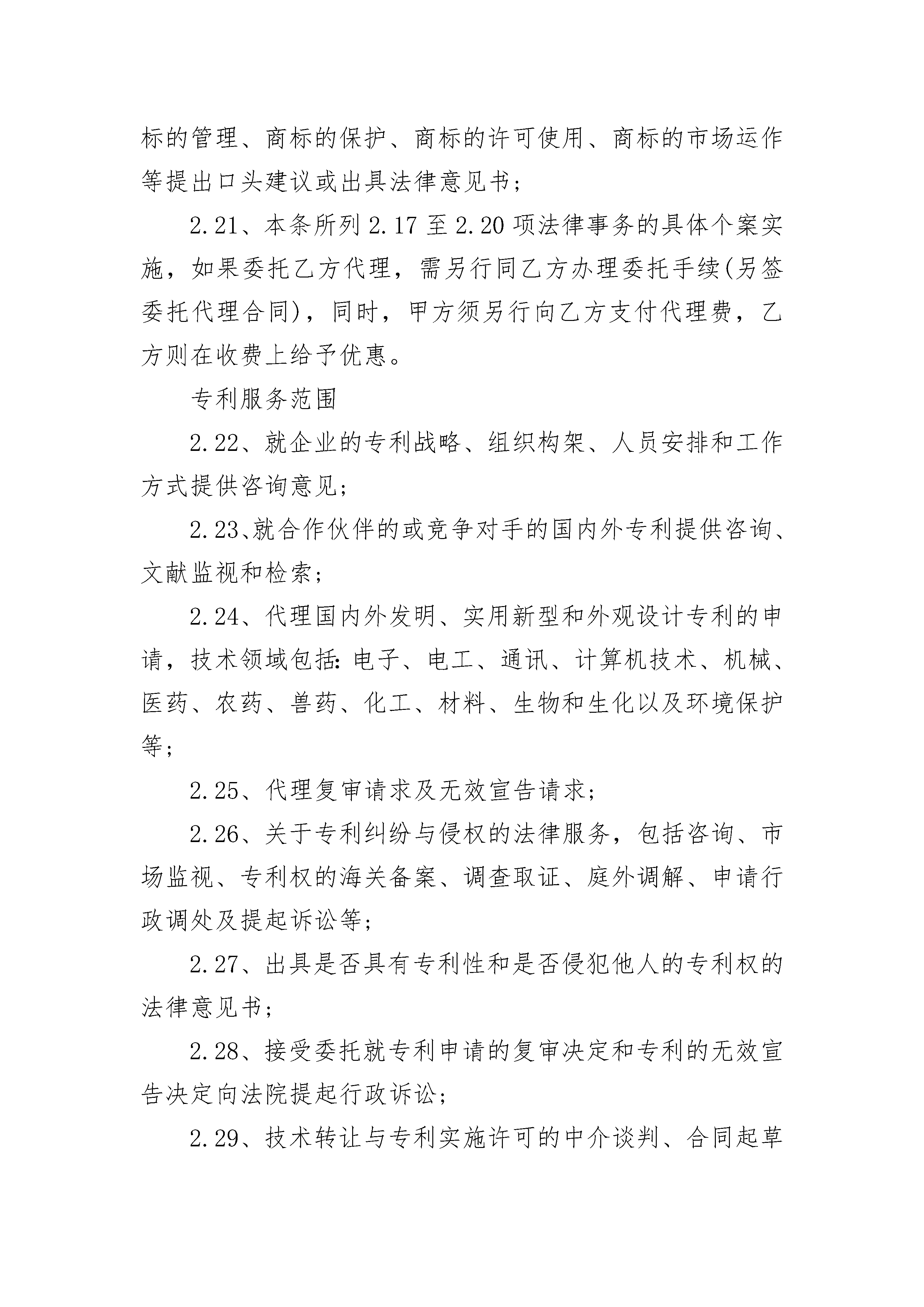 知识产权非诉业务专项法律顾问聘请合同知识产权非诉业务专项法律顾问聘请合同(精选13篇)知识产权非诉业务专项法律顾问聘请合同篇1编号:_____________知识产权非诉业务专项法律顾问聘请合同甲方:___________________________乙方:___________________________签订日期:_______年______月______日聘请单位:________________________________(以下简称甲方)受聘单位:________________________________(以下简称乙方)甲方因业务需要,特聘请乙方担任知识产权非诉业务法律顾问,现经双方协商一致,达成如下协议:第一条乙方指派顾问乙方接受甲方聘请,指派________担任甲方的知识产权非诉业务专项法律顾问,甲方同意前述指派,并认可乙方可能出现的临时委派其他人配合指派人完成第2条所述工作之情形及/或指派的人因故(如疾病、开庭冲突、出差等原因)不能履行职务时,经甲方同意,可由乙方的其他指定人暂时替代处理较急的事务。但乙方更换指派必须经甲方同意。第二条甲方的服务范围日常法律范围:2.1、就甲方日常涉及的法律问题口头或书面解答法律咨询、提出法律建议或出具法律意见书;2.2、审查、修改甲方因商务活动与第三方签署的各类合同、协议书或其他法律文件;提出修改意见及法律建议;2.3、应甲方要求,对甲方签署的各种法律文书进行见证;2.4、协助甲方参与较为重大商务活动的谈判、磋商,并提供分析论证;2.5、受甲方委托,签署、送达或者代为收领法律文件;2.6、受甲方委托,保管甲方要求乙方妥善保管的法律文件;2.7、就甲方已经、面临和/或可能发生的纠纷进行法律论证,提出解决方案,出具法律意见书;2.8、受甲方委托,向侵害、损害甲方合法权益的第三方提出交涉及索赔;2.9、协助甲方完善内部管理的有关法律事务,提出法律建议;(如企业用工保密制度、知识产权合同管理等)2.10、甲方在经济活动中发生的各类诉讼、仲裁及/或行政处罚案件,须另行约定;2.11、甲方在经济活动发生的企业改制、兼并重组、收购、破产、上市、融资、房地产开发、土地转让、投资、设立新公司、合并/分立、参股公司、股权转让、及其它类型的重大项目以及法律顾问工作量一次性达4小时以上的专项法律事务,不在本合同服务范围内,须另行约定;2.12、乙方的服务范围中,不包括各类合同、协议书、规章制度的撰写、草拟;2.13、本合同中,乙方的服务范围不包括甲方之控股公司、子公司或其他关联公司;2.14、本条所列2.10条至2.13条法律事务的具体个案实施,如果委托乙方代理,需另行同乙方办理委托手续(另签委托代理合同),并向乙方经办律师出具授权委托书,同时,甲方须另行向乙方支付代理费,乙方则在收费给予优惠。商标服务范围:2.15、就甲方日常商标方面的问题(国内外)做口头或书面解答,提出法律意见或出具法律意见书;2.16、审查、修改各项有关商标法律文书(国内外),代理国内外商标的申请、变更、转让、无效等事务;2.17、就甲方有关商标侵权问题(国内外)包括指控他人侵权或被他人指控侵权、或对市场侵权假冒行为提出进行论证、发表律师意见、提出解决方案;2.18、就甲方已经、面临或者可能发生的(国内外)商标权纠纷包括申请被驳回、被他人异议、被他人提出撤销注册或对他人提出异议、撤销他人商标注册等法律行为进行法律论证,发表律师意见、提出解决方案;2.19、就甲方有关商标战略进行整体策划提出律师意见、出具建议函;2.20、甲方有关商标的创意、(国内外)商标的使用、商标的管理、商标的保护、商标的许可使用、商标的市场运作等提出口头建议或出具法律意见书;2.21、本条所列2.17至2.20项法律事务的具体个案实施,如果委托乙方代理,需另行同乙方办理委托手续(另签委托代理合同),同时,甲方须另行向乙方支付代理费,乙方则在收费上给予优惠。专利服务范围2.22、就企业的专利战略、组织构架、人员安排和工作方式提供咨询意见;2.23、就合作伙伴的或竞争对手的国内外专利提供咨询、文献监视和检索;2.24、代理国内外发明、实用新型和外观设计专利的申请,技术领域包括:电子、电工、通讯、计算机技术、机械、医药、农药、兽药、化工、材料、生物和生化以及环境保护等;2.25、代理复审请求及无效宣告请求;2.26、关于专利纠纷与侵权的法律服务,包括咨询、市场监视、专利权的海关备案、调查取证、庭外调解、申请行政调处及提起诉讼等;2.27、出具是否具有专利性和是否侵犯他人的专利权的法律意见书;2.28、接受委托就专利申请的复审决定和专利的无效宣告决定向法院提起行政诉讼;2.29、技术转让与专利实施许可的中介谈判、合同起草及摸底调查;2.30、为企业大