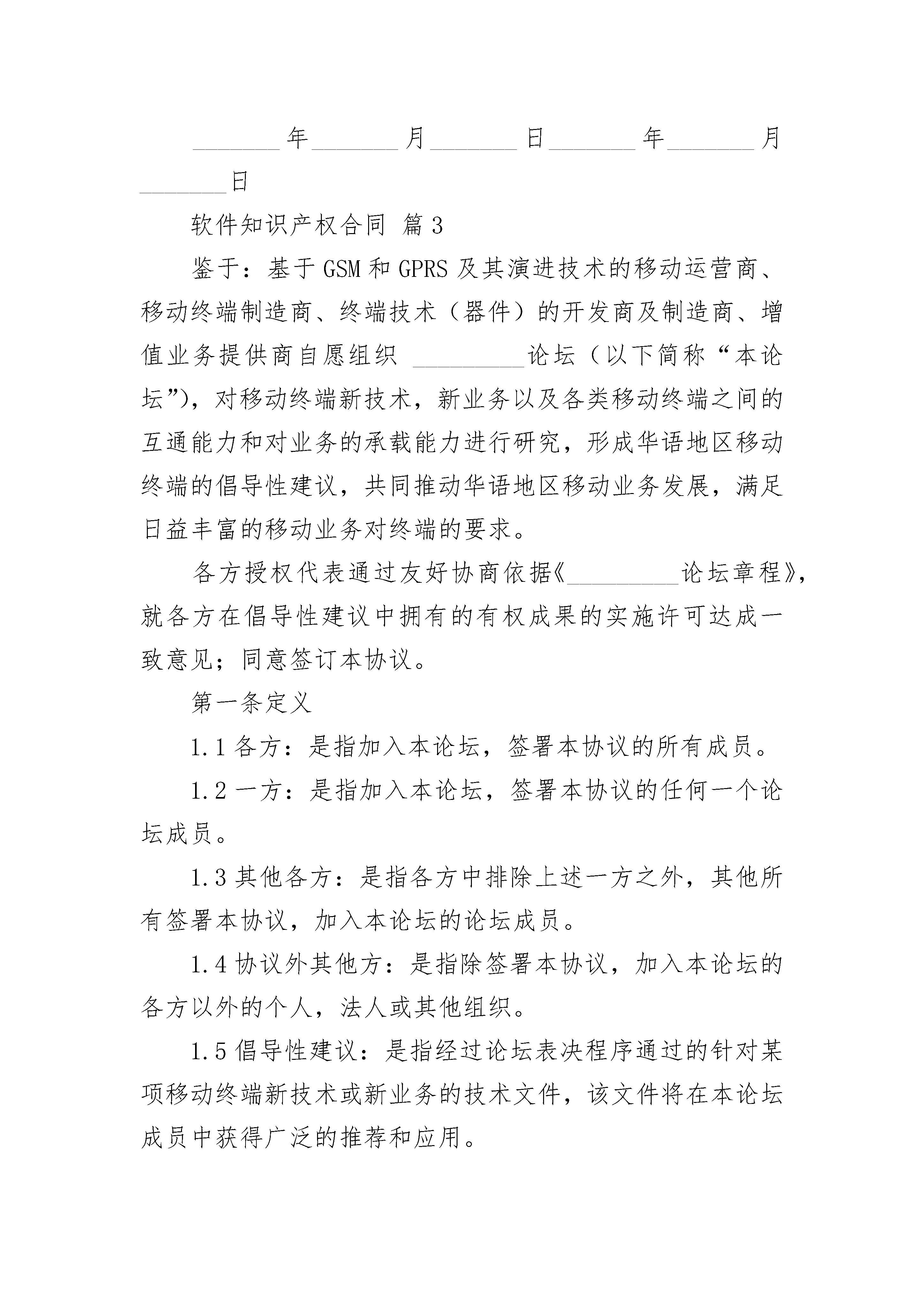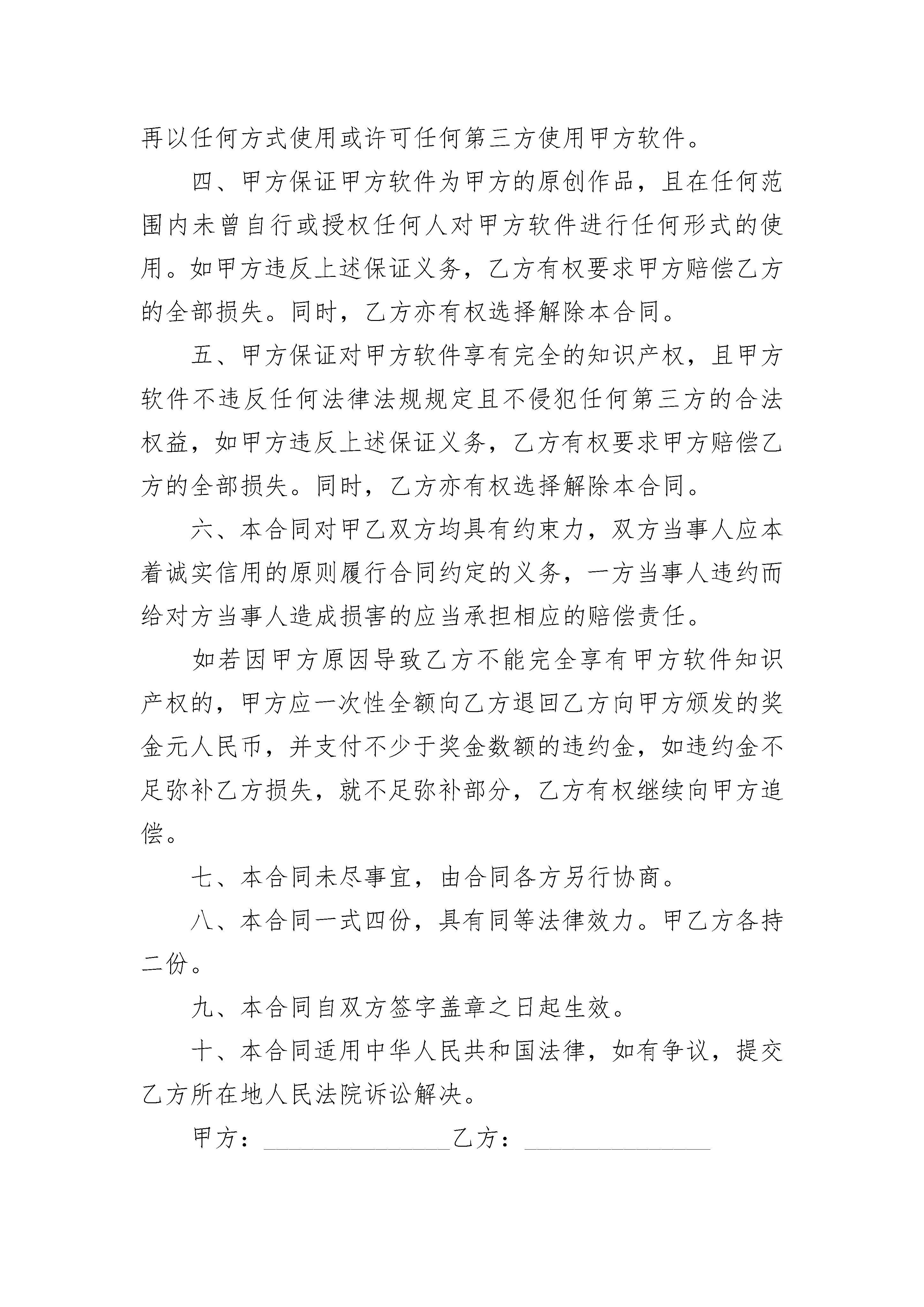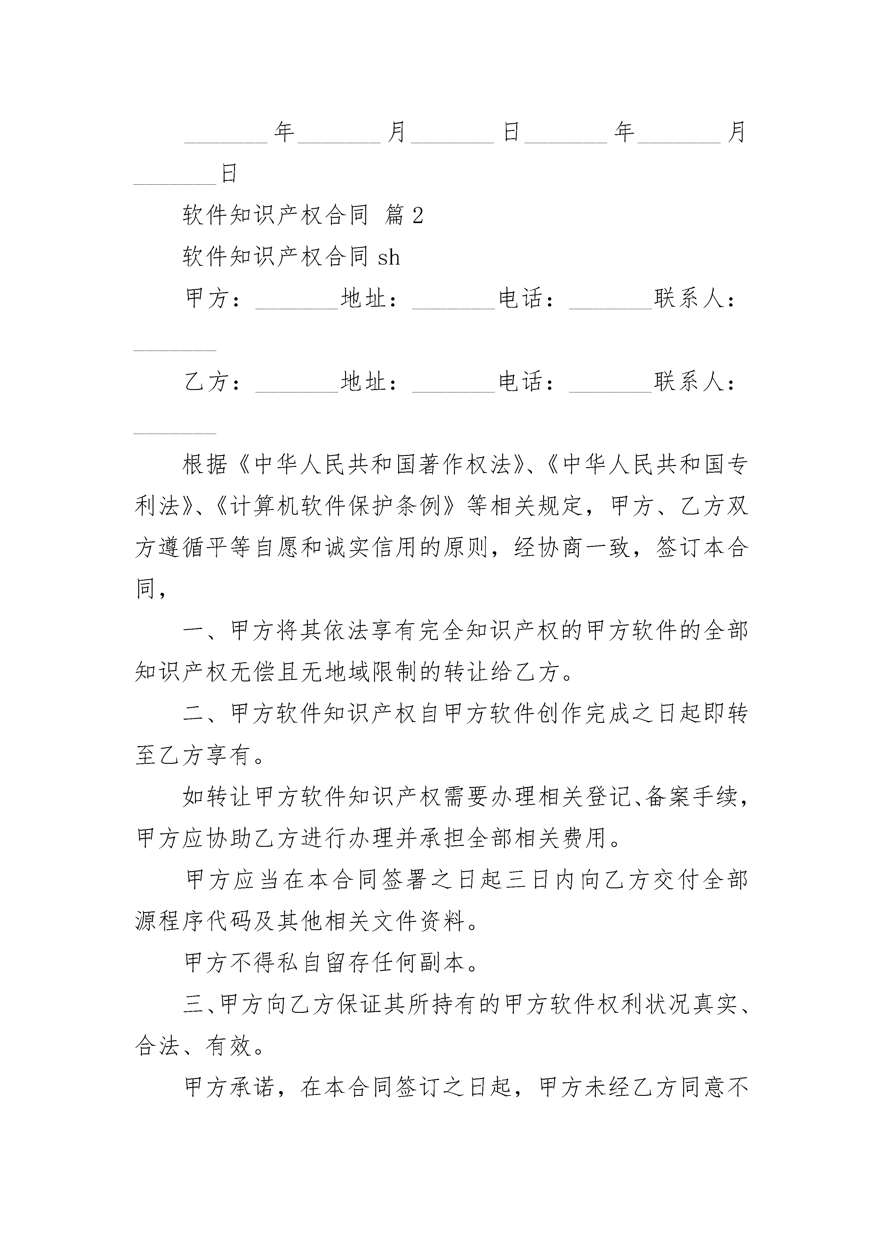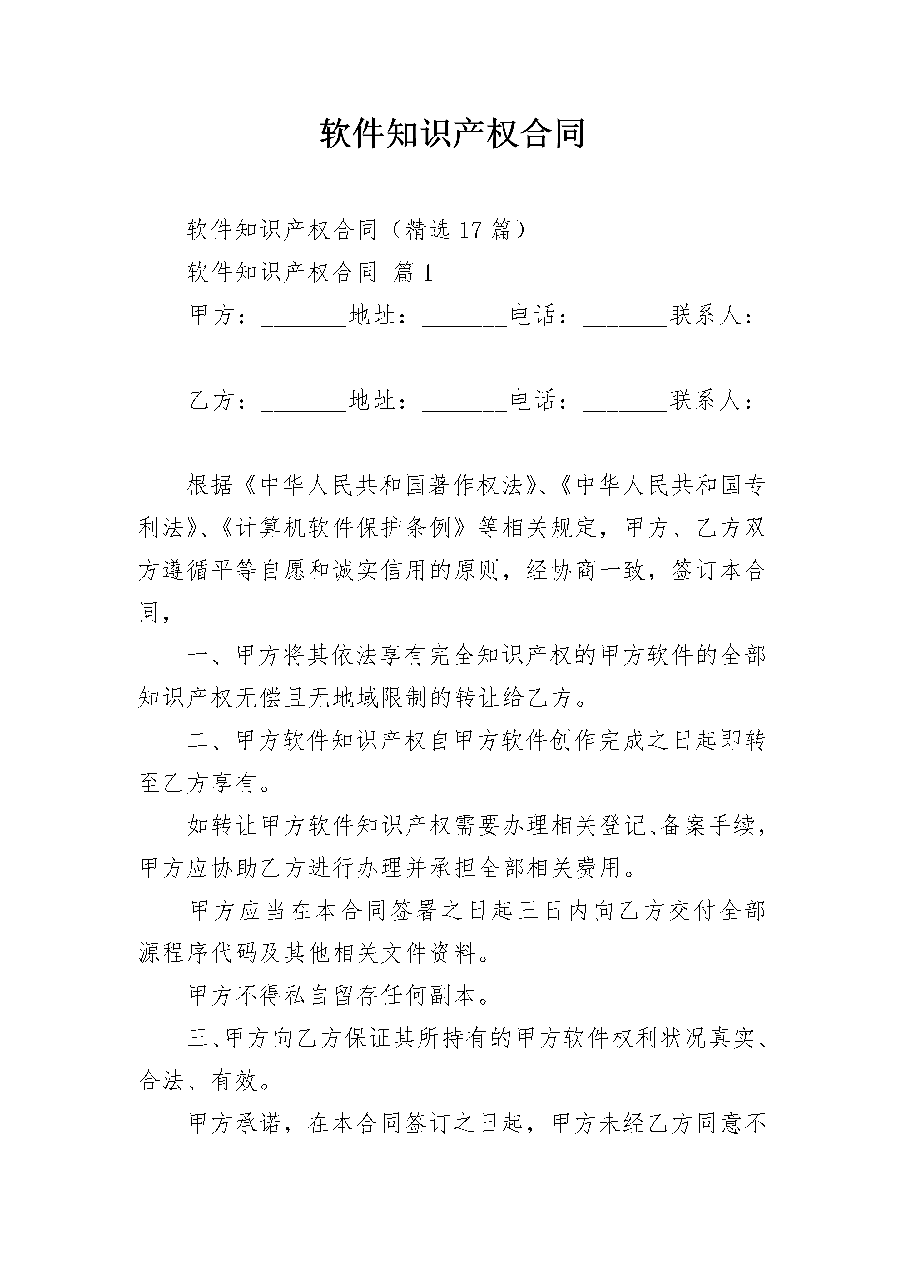 软件知识产权合同软件知识产权合同(精选17篇)软件知识产权合同篇1甲方:_______地址:_______电话:_______联系人:_______乙方:_______地址:_______电话:_______联系人:_______根据《中华人民共和国著作权法》、《中华人民共和国专利法》、《计算机软件保护条例》等相关规定,甲方、乙方双方遵循平等自愿和诚实信用的原则,经协商一致,签订本合同,一、甲方将其依法享有完全知识产权的甲方软件的全部知识产权无偿且无地域限制的转让给乙方。二、甲方软件知识产权自甲方软件创作完成之日起即转至乙方享有。如转让甲方软件知识产权需要办理相关登记、备案手续,甲方应协助乙方进行办理并承担全部相关费用。甲方应当在本合同签署之日起三日内向乙方交付全部源程序代码及其他相关文件资料。甲方不得私自留存任何副本。三、甲方向乙方保证其所持有的甲方软件权利状况真实、合法、有效。甲方承诺,在本合同签订之日起,甲方未经乙方同意不再以任何方式使用或许可任何第三方使用甲方软件。四、甲方保证甲方软件为甲方的原创作品,且在任何范围内未曾自行或授权任何人对甲方软件进行任何形式的使用。如甲方违反上述保证义务,乙方有权要求甲方赔偿乙方的全部损失。同时,乙方亦有权选择解除本合同。五、甲方保证对甲方软件享有完全的知识产权,且甲方软件不违反任何法律法规规定且不侵犯任何第三方的合法权益,如甲方违反上述保证义务,乙方有权要求甲方赔偿乙方的全部损失。同时,乙方亦有权选择解除本合同。六、本合同对甲乙双方均具有约束力,双方当事人应本着诚实信用的原则履行合同约定的义务,一方当事人违约而给对方当事人造成损害的应当承担相应的赔偿责任。如若因甲方原因导致乙方不能完全享有甲方软件知识产权的,甲方应一次性全额向乙方退回乙方向甲方颁发的奖金元人民币,并支付不少于奖金数额的违约金,如违约金不足弥补乙方损失,就不足弥补部分,乙方有权继续向甲方追偿。七、本合同未尽事宜,由合同各方另行协商。八、本合同一式四份,具有同等法律效力。甲乙方各持二份。九、本合同自双方签字盖章之日起生效。十、本合同适用中华人民共和国法律,如有争议,提交乙方所在地人民法院诉讼解决。甲方:_______________乙方:______________________年_______月_______日_______年_______月_______日软件知识产权合同篇2软件知识产权合同sh甲方:_______地址:_______电话:_______联系人:_______乙方:_______地址:_______电话:_______联系人:_______根据《中华人民共和国著作权法》、《中华人民共和国专利法》、《计算机软件保护条例》等相关规定,甲方、乙方双方遵循平等自愿和诚实信用的原则,经协商一致,签订本合同,一、甲方将其依法享有完全知识产权的甲方软件的全部知识产权无偿且无地域限制的转让给乙方。二、甲方软件知识产权自甲方软件创作完成之日起即转至乙方享有。如转让甲方软件知识产权需要办理相关登记、备案手续,甲方应协助乙方进行办理并承担全部相关费用。甲方应当在本合同签署之日起三日内向乙方交付全部源程序代码及其他相关文件资料。甲方不得私自留存任何副本。三、甲方向乙方保证其所持有的甲方软件权利状况真实、合法、有效。甲方承诺,在本合同签订之日起,甲方未经乙方同意不再以任何方式使用或许可任何第三方使用甲方软件。四、甲方保证甲方软件为甲方的原创作品,且在任何范围内未曾自行或授权任何人对甲方软件进行任何形式的使用。如甲方违反上述保证义务,乙方有权要求甲方赔偿乙方的全部损失。同时,乙方亦有权选择解除本合同。五、甲方保证对甲方软件享有完全的知识产权,且甲方软件不违反任何法律法规规定且不侵犯任何第三方的合法权益,如甲方违反上述保证义务,乙方有权要求甲方赔偿乙方的全部损失。同时,乙方亦有权选择解除本合同。六、本合同对甲乙双方均具有约束力,双方当事人应本着诚实信用的原则履行合同约定的义务,一方当事人违约而给对方当事人造成损害的应当承担相应的赔偿责任。如若因甲方原因导致乙方不能完全享有甲方软件知识产权的,甲方应一次性全额向乙方退回乙方向甲方颁发的奖金元人民币,并支付不少于奖金数额的违约金,如违约金不足弥补乙方损失,就不足弥补部分,乙方有权继续向甲方追偿。七、本合同未尽事宜,由合同各方另行协商。八、本合同一式四份,具有同等法律效力。甲乙方各持二份。九、本合同自双方签字盖章之日起生效。十、本合同适用中华人民共和国法律,如有争议,提交乙方所在地人民法院诉讼解决。甲方:_______________乙方:______________________年_______月_______日_______年_______月_______日软件知识产权合同篇