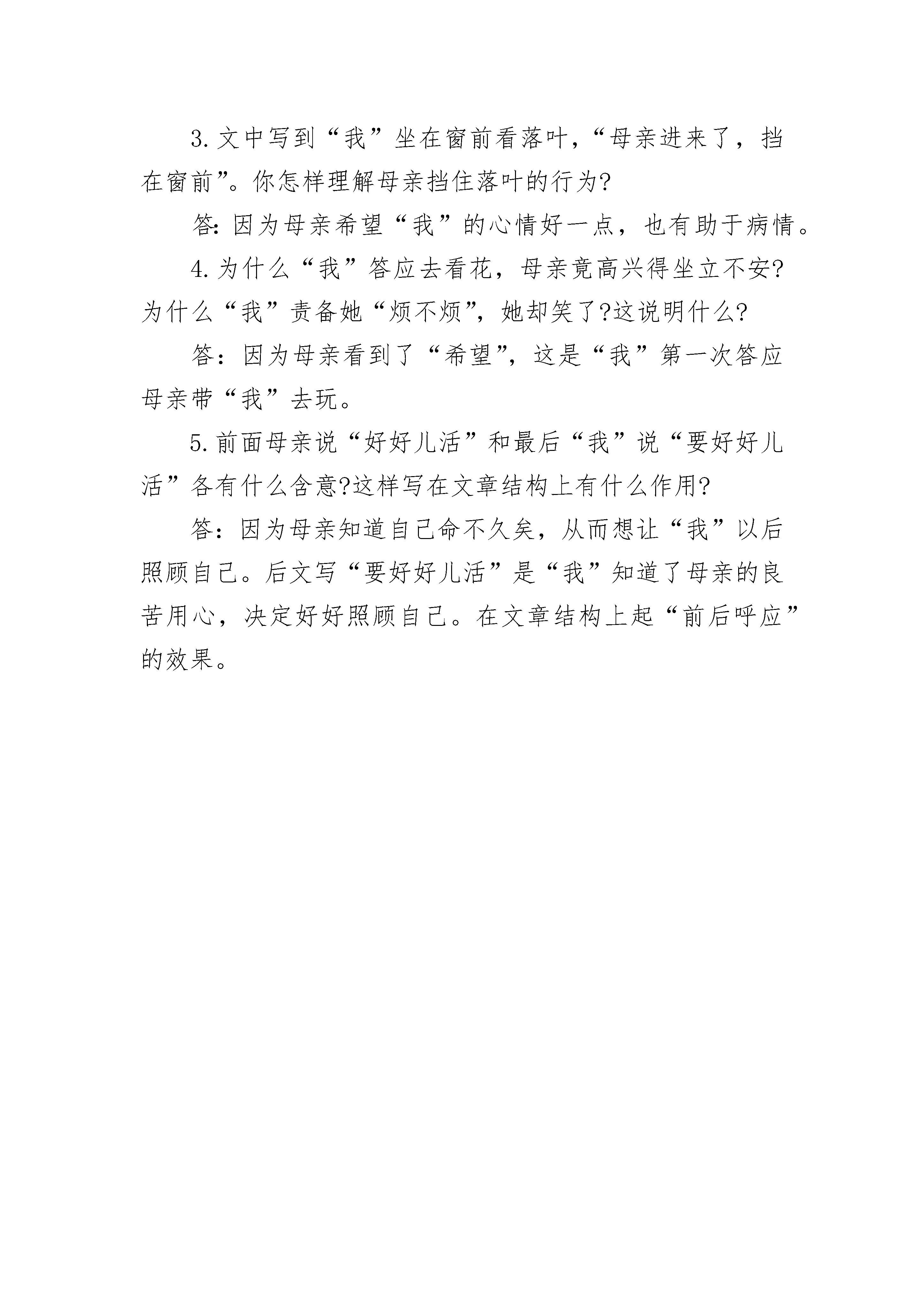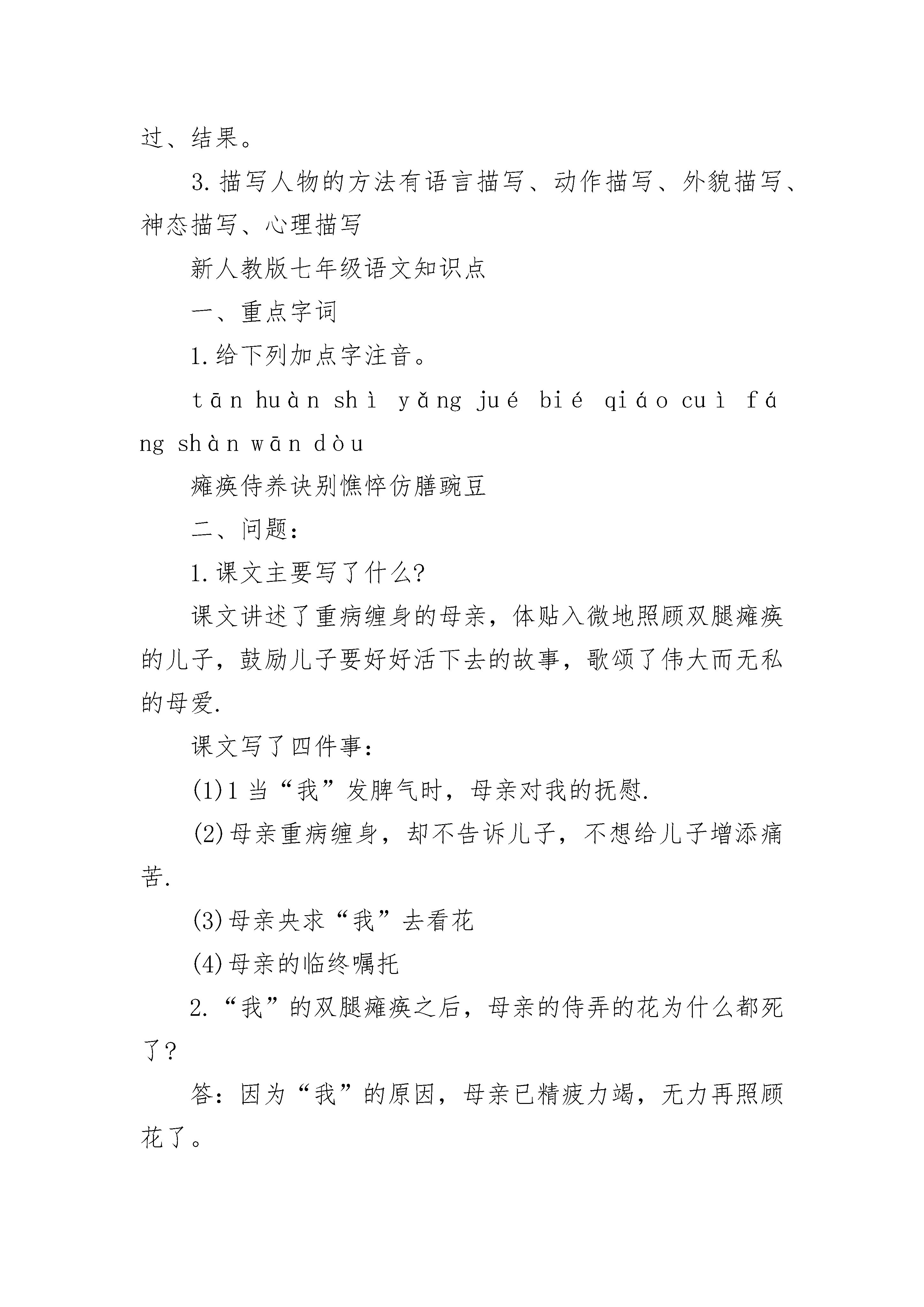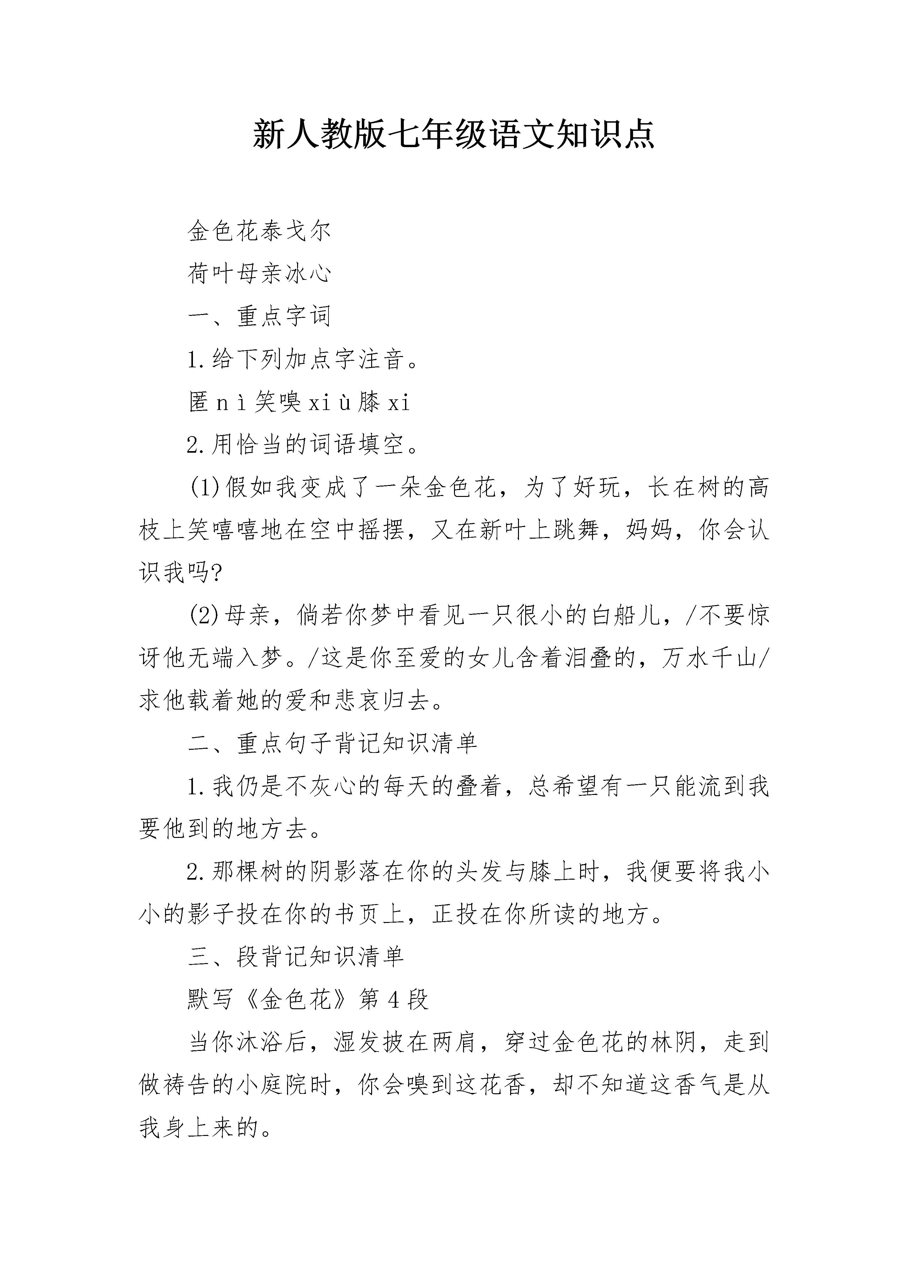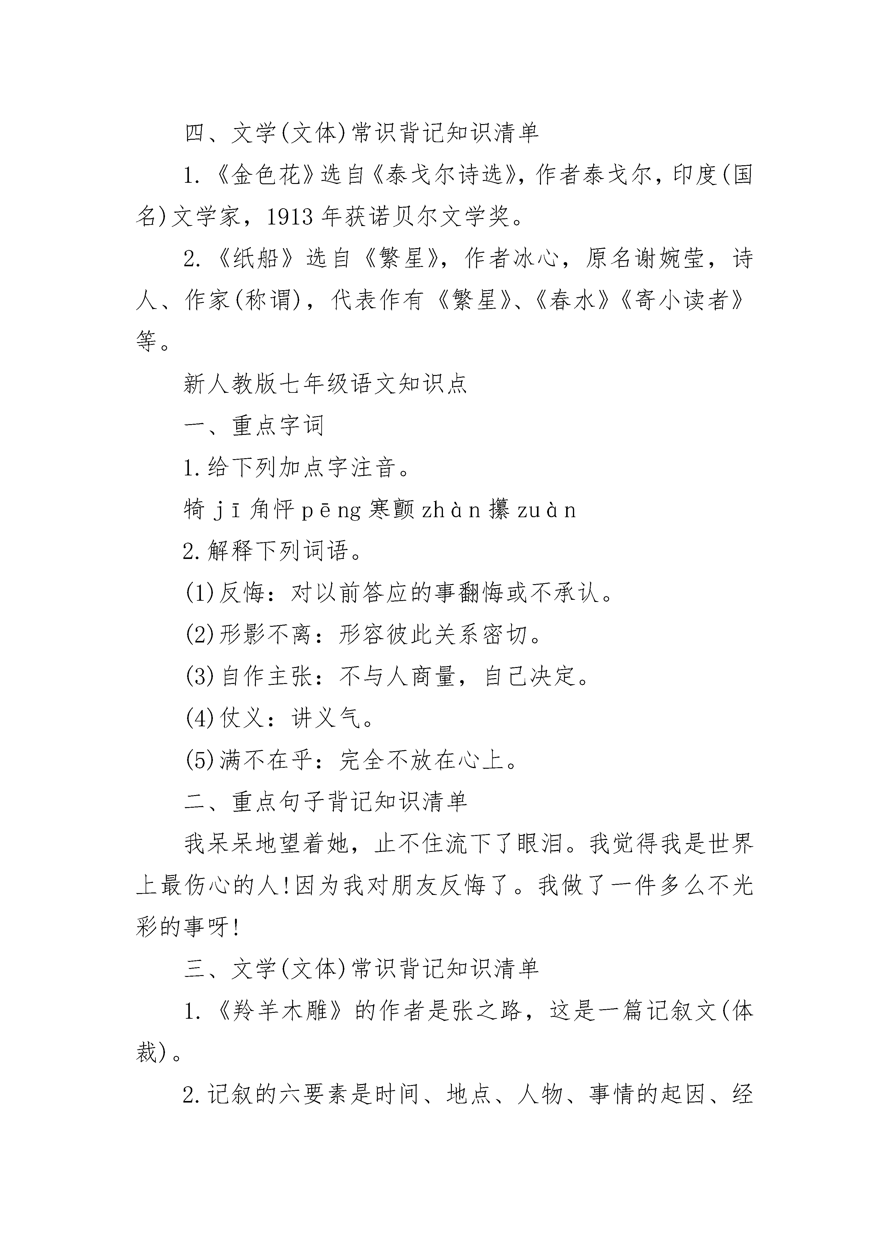 新人教版七年级语文知识点金色花泰戈尔荷叶母亲冰心一、重点字词1.给下列加点字注音。匿nì笑嗅xiù膝xi2.用恰当的词语填空。(1)假如我变成了一朵金色花,为了好玩,长在树的高枝上笑嘻嘻地在空中摇摆,又在新叶上跳舞,妈妈,你会认识我吗?(2)母亲,倘若你梦中看见一只很小的白船儿,/不要惊讶他无端入梦。/这是你至爱的女儿含着泪叠的,万水千山/求他载着她的爱和悲哀归去。二、重点句子背记知识清单1.我仍是不灰心的每天的叠着,总希望有一只能流到我要他到的地方去。2.那棵树的阴影落在你的头发与膝上时,我便要将我小小的影子投在你的书页上,正投在你所读的地方。三、段背记知识清单默写《金色花》第4段当你沐浴后,湿发披在两肩,穿过金色花的林阴,走到做祷告的小庭院时,你会嗅到这花香,却不知道这香气是从我身上来的。四、文学(文体)常识背记知识清单1.《金色花》选自《泰戈尔诗选》,作者泰戈尔,印度(国名)文学家,1913年获诺贝尔文学奖。2.《纸船》选自《繁星》,作者冰心,原名谢婉莹,诗人、作家(称谓),代表作有《繁星》、《春水》《寄小读者》等。新人教版七年级语文知识点一、重点字词1.给下列加点字注音。犄jī角怦pēng寒颤zhàn攥zuàn2.解释下列词语。(1)反悔:对以前答应的事翻悔或不承认。(2)形影不离:形容彼此关系密切。(3)自作主张:不与人商量,自己决定。(4)仗义:讲义气。(5)满不在乎:完全不放在心上。二、重点句子背记知识清单我呆呆地望着她,止不住流下了眼泪。我觉得我是世界上最伤心的人!因为我对朋友反悔了。我做了一件多么不光彩的事呀!三、文学(文体)常识背记知识清单1.《羚羊木雕》的作者是张之路,这是一篇记叙文(体裁)。2.记叙的六要素是时间、地点、人物、事情的起因、经过、结果。3.描写人物的方法有语言描写、动作描写、外貌描写、神态描写、心理描写新人教版七年级语文知识点一、重点字词1.给下列加点字注音。tānhuànshìyǎngjuébiéqiáocuìfángshànwāndòu瘫痪侍养诀别憔悴仿膳豌豆二、问题:1.课文主要写了什么?课文讲述了重病缠身的母亲,体贴入微地照顾双腿瘫痪的儿子,鼓励儿子要好好活下去的故事,歌颂了伟大而无私的母爱.课文写了四件事:(1)1当“我”发脾气时,母亲对我的抚慰.(2)母亲重病缠身,却不告诉儿子,不想给儿子增添痛苦.(3)母亲央求“我”去看花(4)母亲的临终嘱托2.“我”的双腿瘫痪之后,母亲的侍弄的花为什么都死了?答:因为“我”的原因,母亲已精疲力竭,无力再照顾花了。3.文中写到“我”坐在窗前看落叶,“母亲进来了,挡在窗前”。你怎样理解母亲挡住落叶的行为?答:因为母亲希望“我”的心情好一点,也有助于病情。4.为什么“我”答应去看花,母亲竟高兴得坐立不安?为什么“我”责备她“烦不烦”,她却笑了?这说明什么?答:因为母亲看到了“希望”,这是“我”第一次答应母亲带“我”去玩。5.前面母亲说“好好儿活”和最后“我”说“要好好儿活”各有什么含意?这样写在文章结构上有什么作用?答:因为母亲知道自己命不久矣,从而想让“我”以后照顾自己。后文写“要好好儿活”是“我”知道了母亲的良苦用心,决定好好照顾自己。在文章结构上起“前后呼应”的效果。