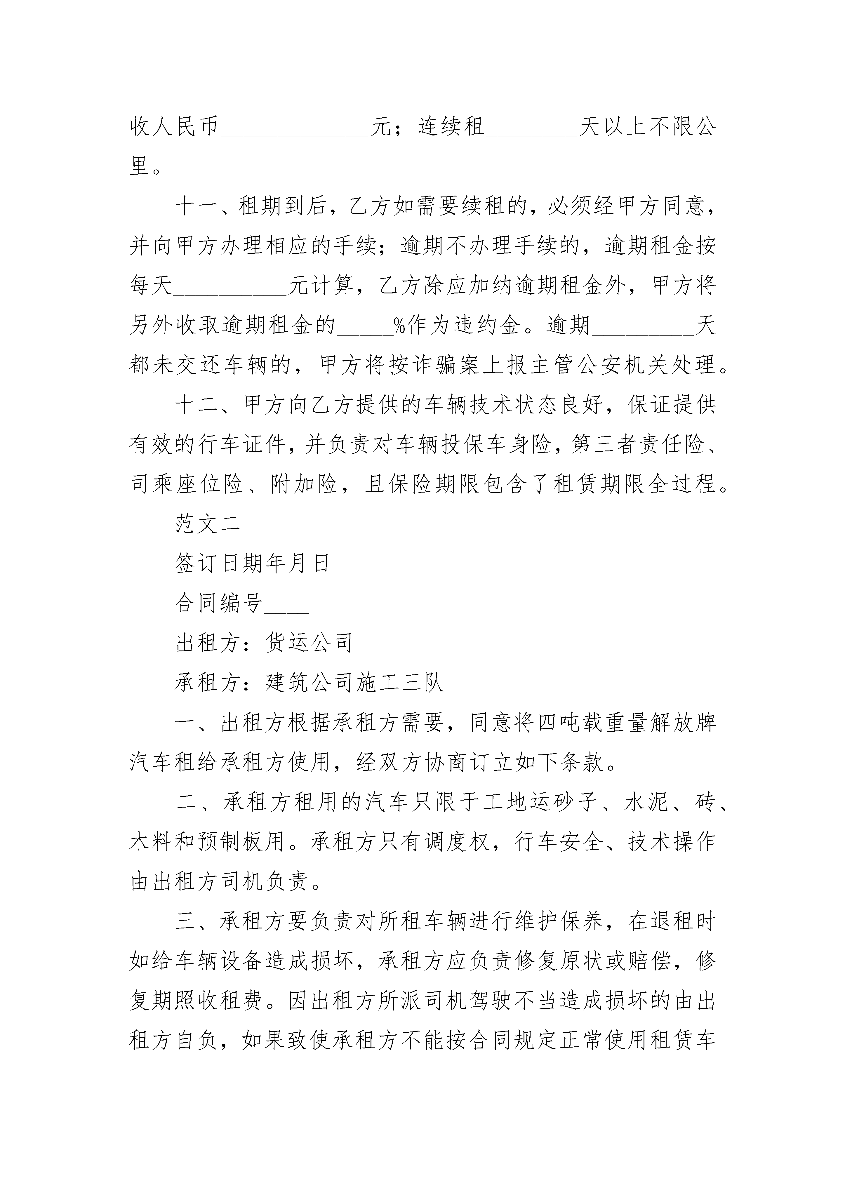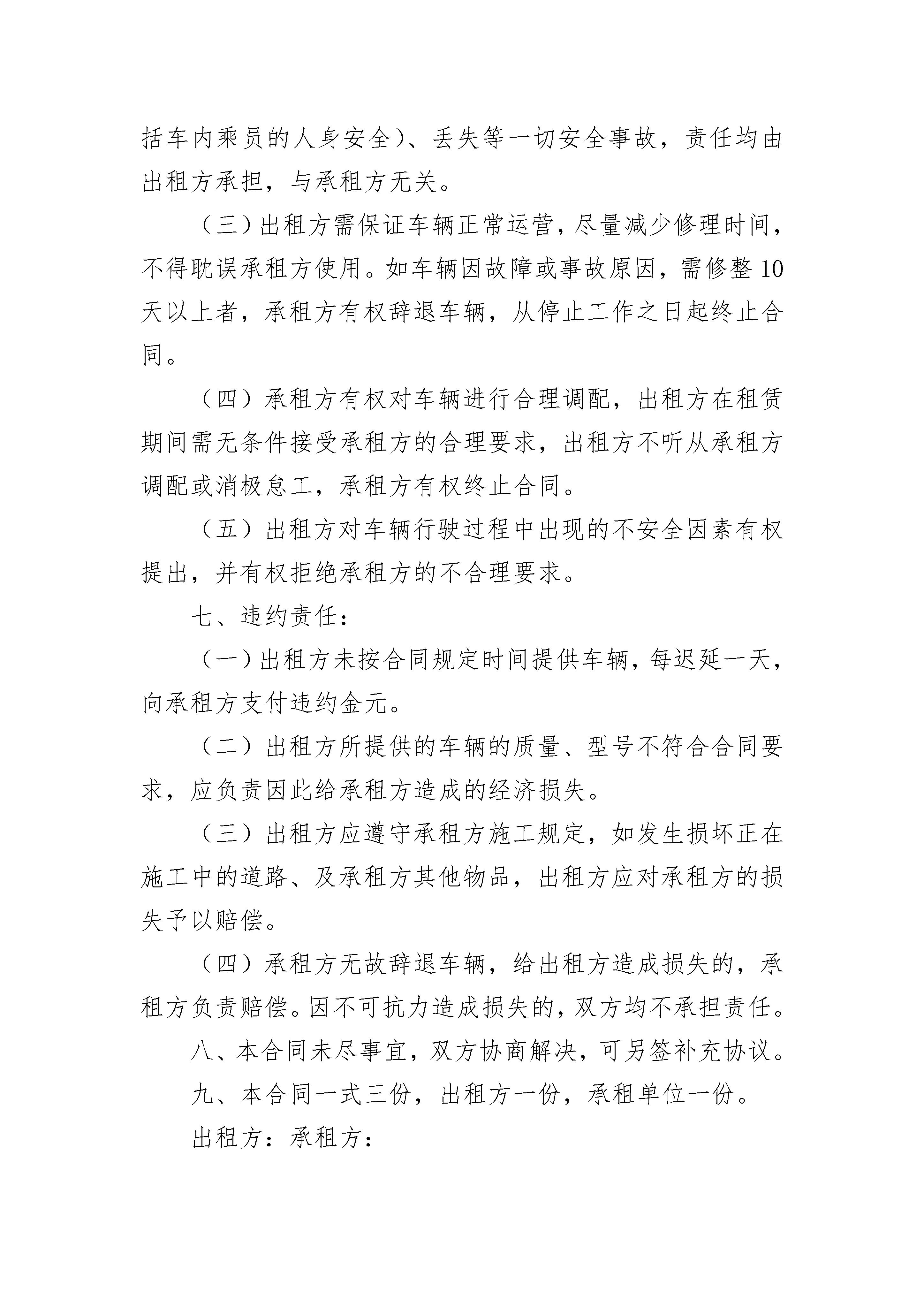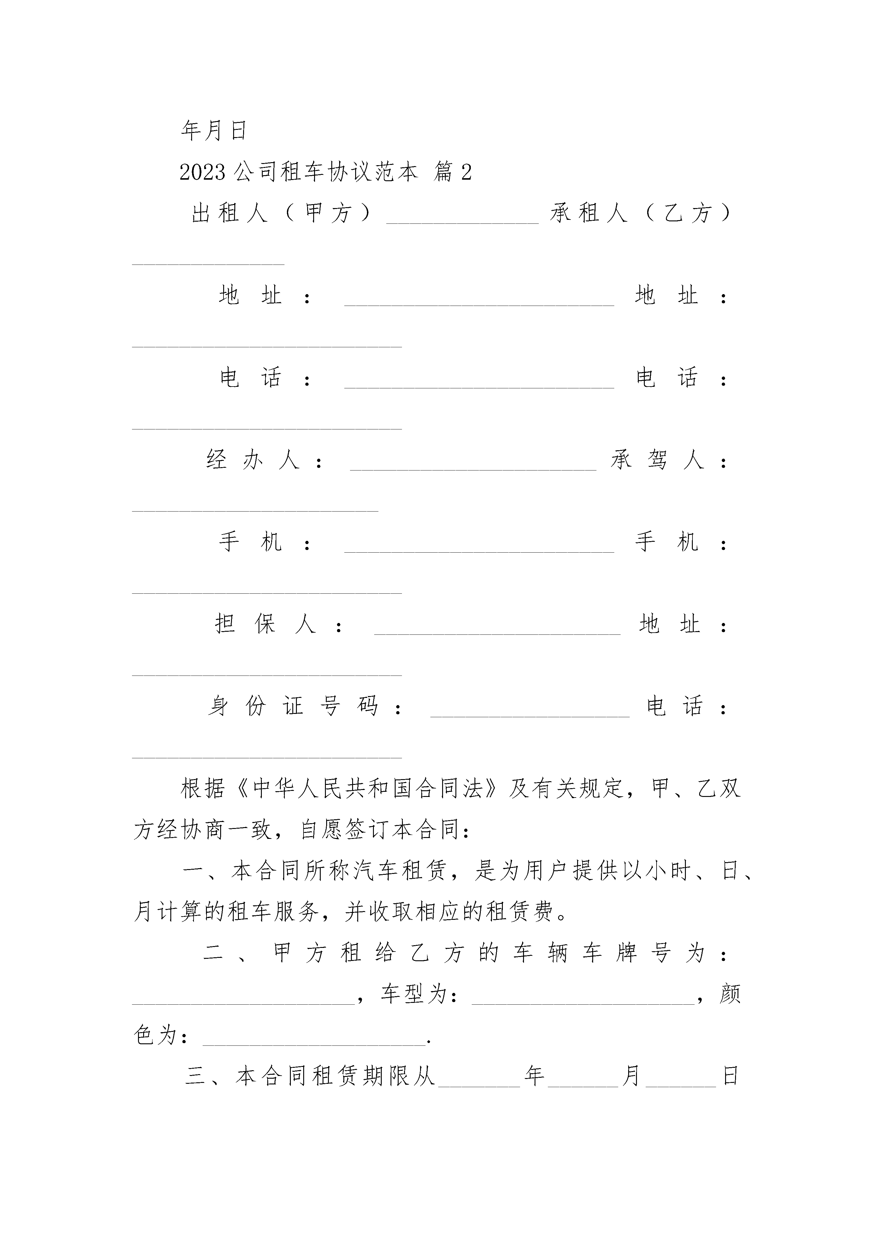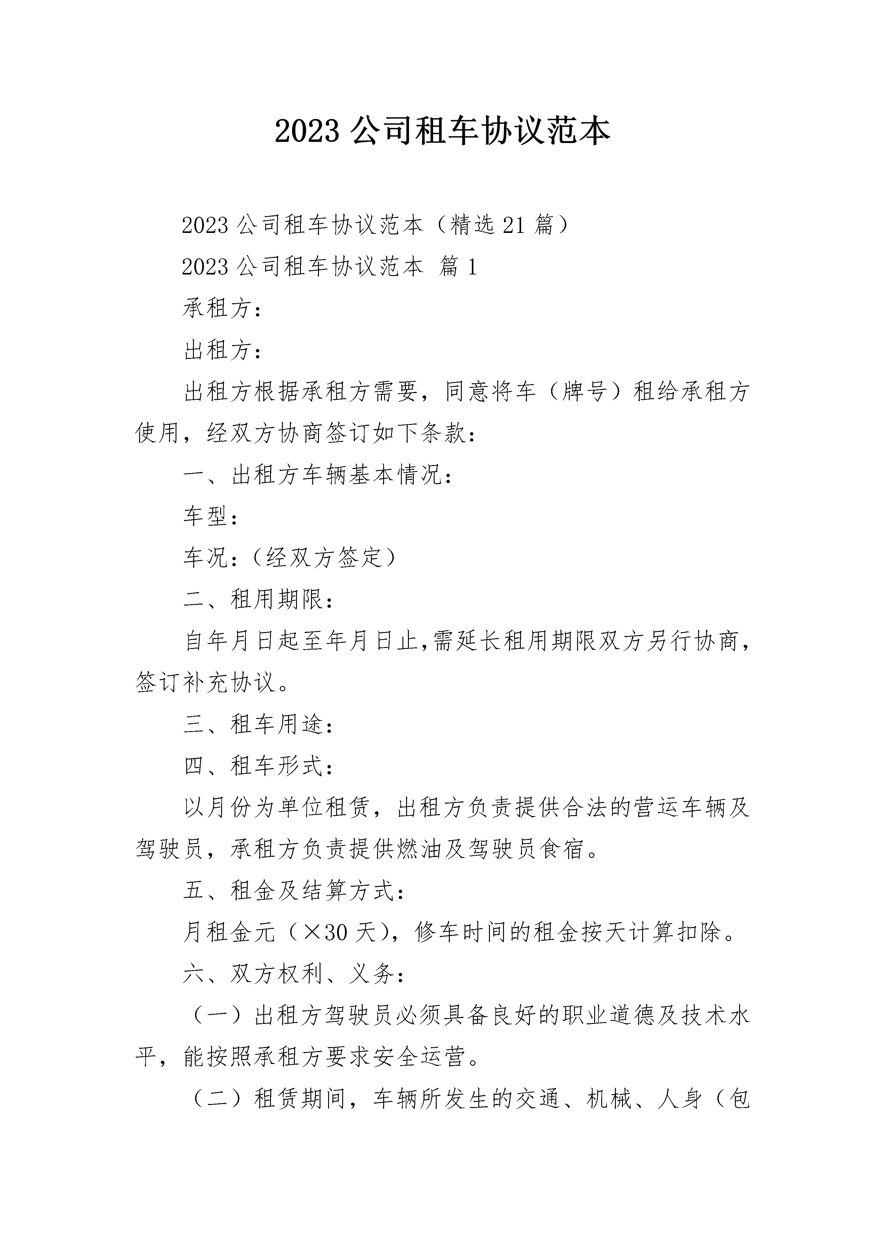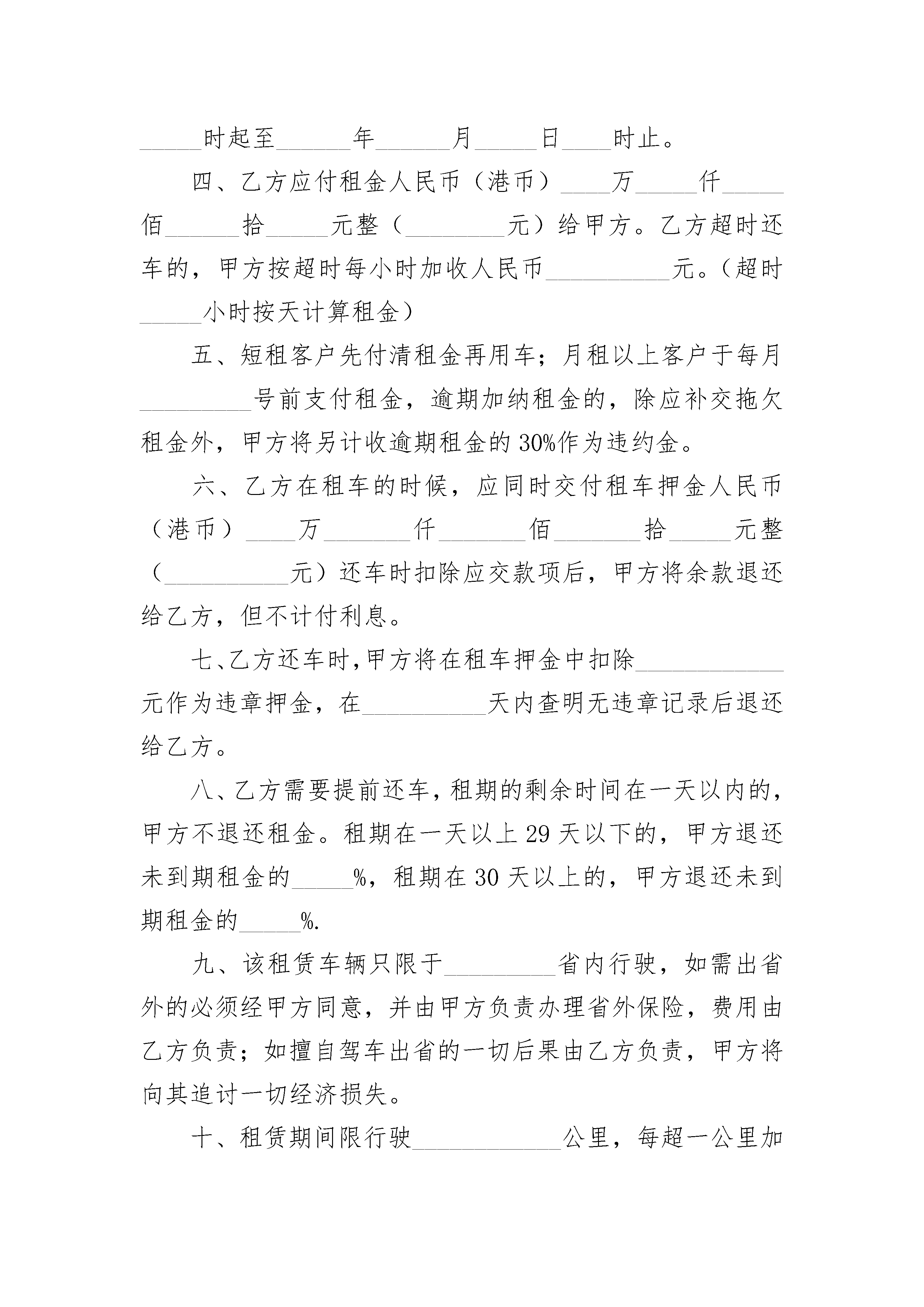 2023公司租车协议范本2023公司租车协议范本(精选21篇)2023公司租车协议范本篇1承租方:出租方:出租方根据承租方需要,同意将车(牌号)租给承租方使用,经双方协商签订如下条款:一、出租方车辆基本情况:车型:车况:(经双方签定)二、租用期限:自年月日起至年月日止,需延长租用期限双方另行协商,签订补充协议。三、租车用途:四、租车形式:以月份为单位租赁,出租方负责提供合法的营运车辆及驾驶员,承租方负责提供燃油及驾驶员食宿。五、租金及结算方式:月租金元(×30天),修车时间的租金按天计算扣除。六、双方权利、义务:(一)出租方驾驶员必须具备良好的职业道德及技术水平,能按照承租方要求安全运营。(二)租赁期间,车辆所发生的交通、机械、人身(包括车内乘员的人身安全)、丢失等一切安全事故,责任均由出租方承担,与承租方无关。(三)出租方需保证车辆正常运营,尽量减少修理时间,不得耽误承租方使用。如车辆因故障或事故原因,需修整10天以上者,承租方有权辞退车辆,从停止工作之日起终止合同。(四)承租方有权对车辆进行合理调配,出租方在租赁期间需无条件接受承租方的合理要求,出租方不听从承租方调配或消极怠工,承租方有权终止合同。(五)出租方对车辆行驶过程中出现的不安全因素有权提出,并有权拒绝承租方的不合理要求。七、违约责任:(一)出租方未按合同规定时间提供车辆,每迟延一天,向承租方支付违约金元。(二)出租方所提供的车辆的质量、型号不符合合同要求,应负责因此给承租方造成的经济损失。(三)出租方应遵守承租方施工规定,如发生损坏正在施工中的道路、及承租方其他物品,出租方应对承租方的损失予以赔偿。(四)承租方无故辞退车辆,给出租方造成损失的,承租方负责赔偿。因不可抗力造成损失的,双方均不承担责任。八、本合同未尽事宜,双方协商解决,可另签补充协议。九、本合同一式三份,出租方一份,承租单位一份。出租方:承租方:年月日2023公司租车协议范本篇2出租人(甲方)_____________承租人(乙方)_____________地址:_______________________地址:_______________________电话:_______________________电话:_______________________经办人:_____________________承驾人:_____________________手机:_______________________手机:_______________________担保人:_____________________地址:_______________________身份证号码:_________________电话:_______________________根据《中华人民共和国合同法》及有关规定,甲、乙双方经协商一致,自愿签订本合同:一、本合同所称汽车租赁,是为用户提供以小时、日、月计算的租车服务,并收取相应的租赁费。二、甲方租给乙方的车辆车牌号为:___________________,车型为:___________________,颜色为:___________________.三、本合同租赁期限从_______年______月______日_____时起至______年______月_____日____时止。四、乙方应付租金人民币(港币)____万_____仟_____佰______拾_____元整(________元)给甲方。乙方超时还车的,甲方按超时每小时加收人民币__________元。(超时_____小时按天计算租金)五、短租客户先付清租金再用车;月租以上客户于每月_________号前支付租金,逾期加纳租金的,除应补交拖欠租金外,甲方将另计收逾期租金的30%作为违约金。六、乙方在租车的时候,应同时交付租车押金人民币(港币)____万_______仟_______佰_______拾_____元整(__________元)还车时扣除应交款项后,甲方将余款退还给乙方,但不计付利息。七、乙方还车时,甲方将在租车押金中扣除____________元作为违章押金,在__________天内查明无违章记录后退还给乙方。八、乙方需要提前还车,租期的剩余时间在一天以内的,甲方不退还租金。租期在一天以上29天以下的,甲方退还未到期租金的_____%,租期在30天以上的,甲方退还未到期租金的_____%.九、该租赁车辆只限于_________省内行驶,如需出省外的必须经甲方同意,并由甲方负责办理省外保险,费用由乙方负责;如擅自驾车出省的一切后果由乙方负责,甲方将向其追讨一切经济损失。十、租赁期间限行驶____________公里,每超一公里加收人民币_____________元;连续租________