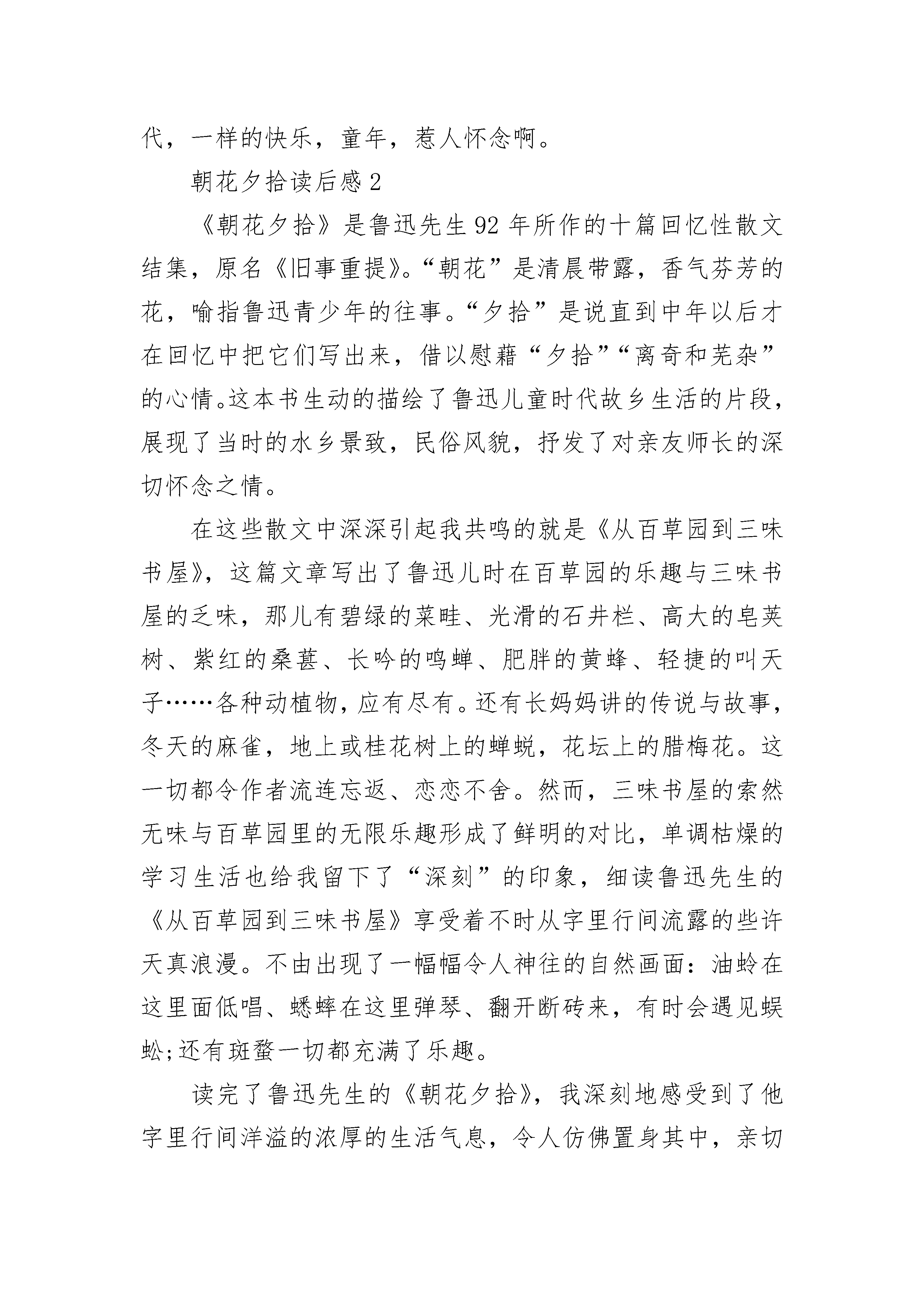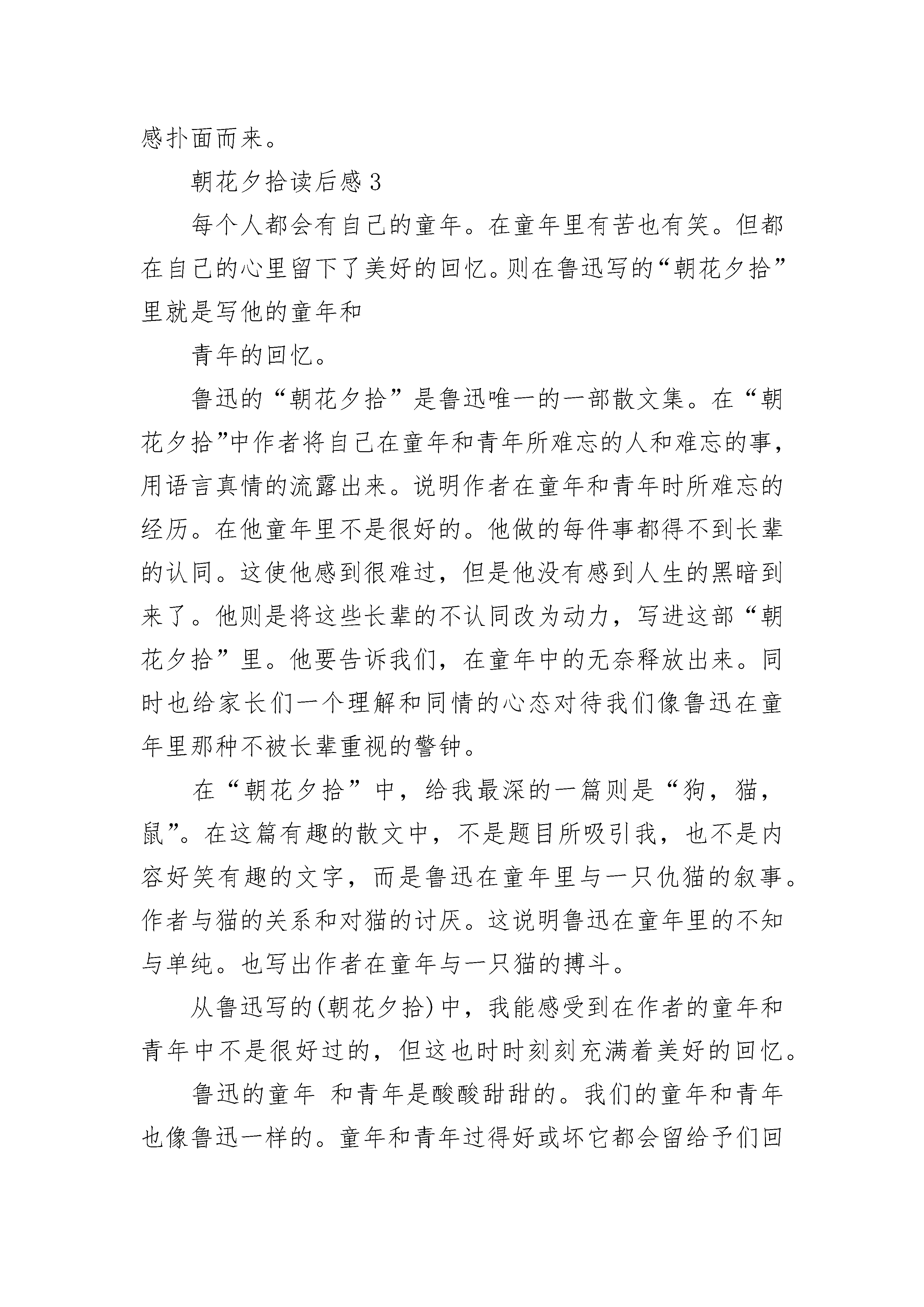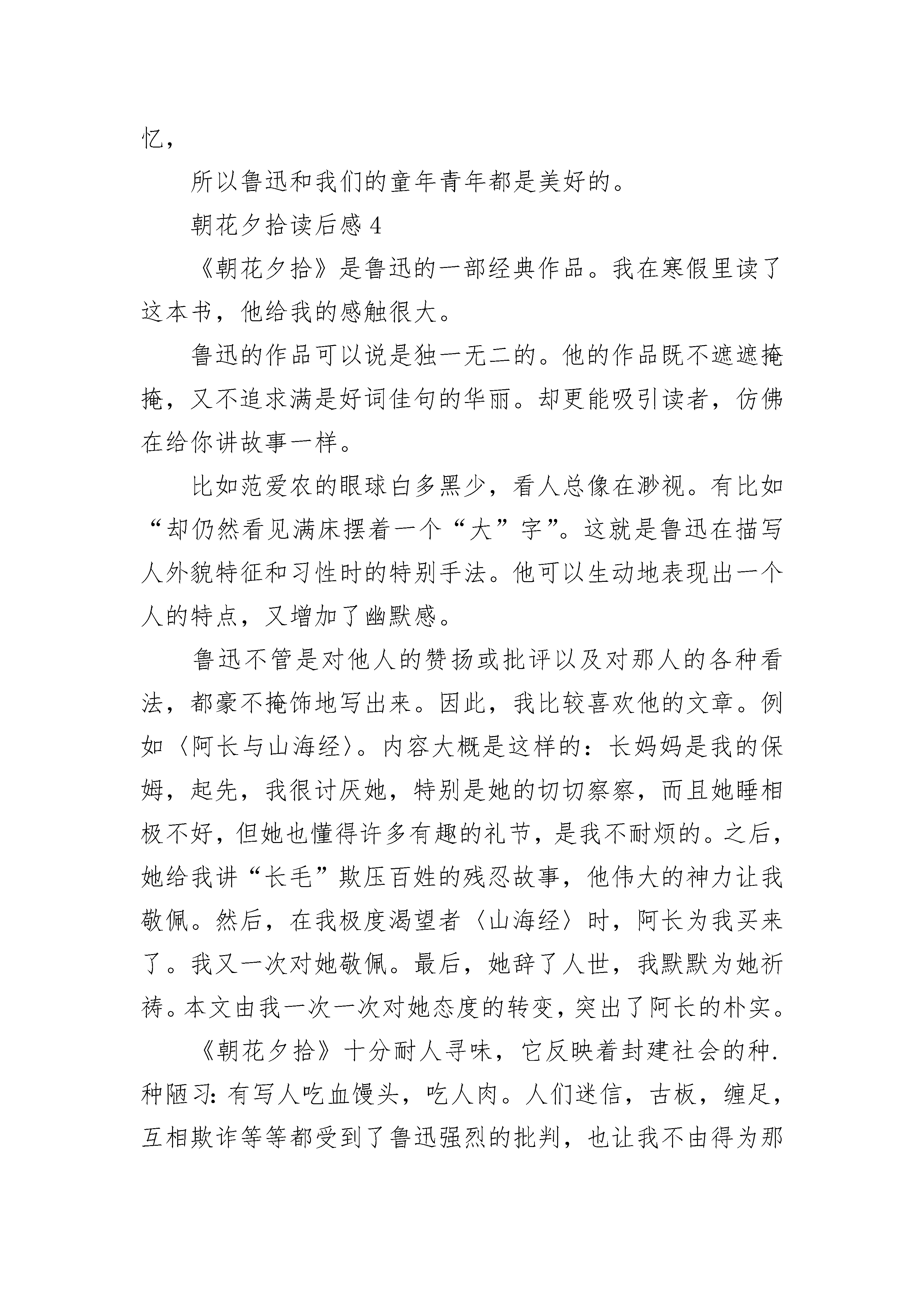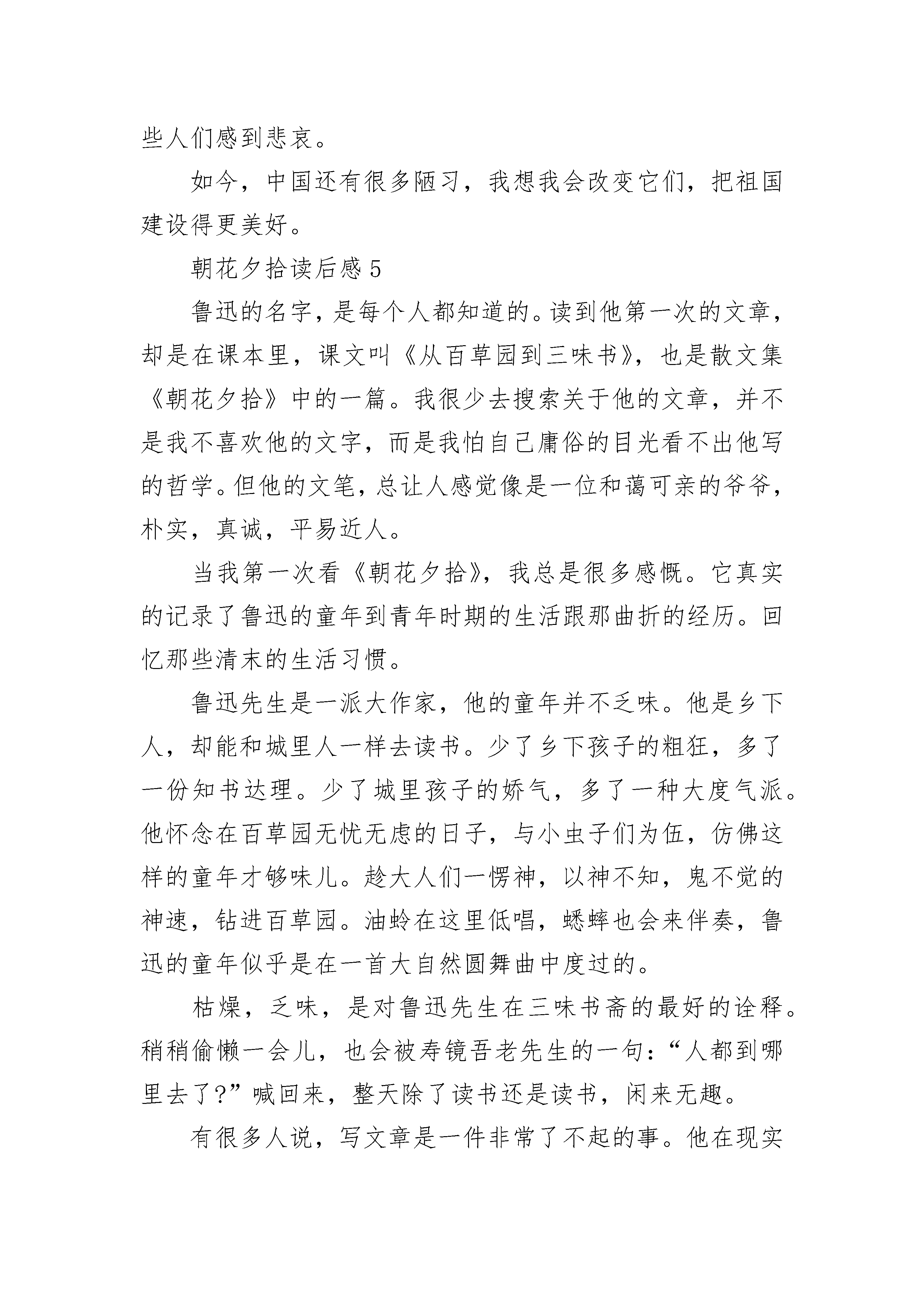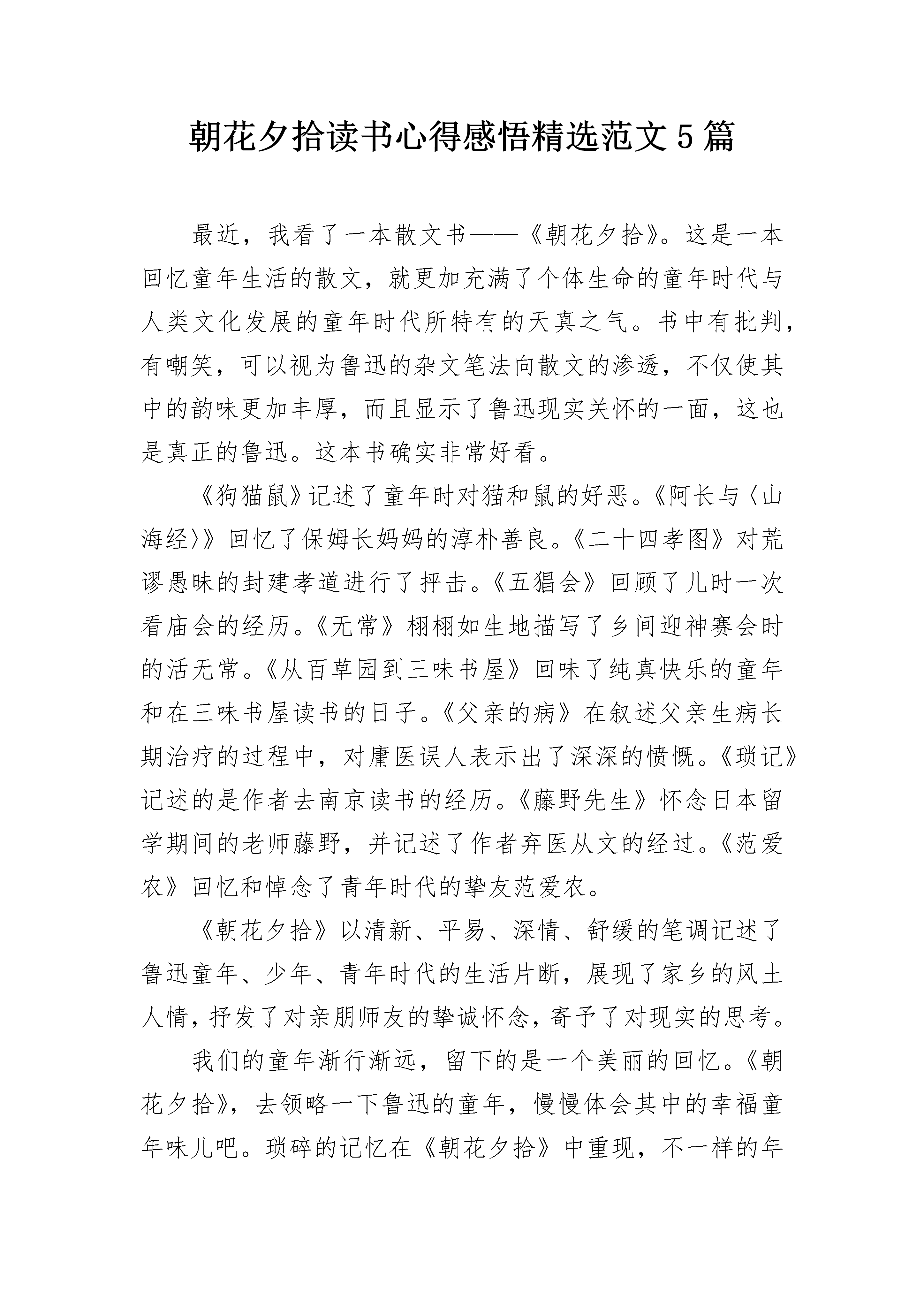 朝花夕拾读书心得感悟精选范文5篇最近,我看了一本散文书——《朝花夕拾》。这是一本回忆童年生活的散文,就更加充满了个体生命的童年时代与人类文化发展的童年时代所特有的天真之气。书中有批判,有嘲笑,可以视为鲁迅的杂文笔法向散文的渗透,不仅使其中的韵味更加丰厚,而且显示了鲁迅现实关怀的一面,这也是真正的鲁迅。这本书确实非常好看。《狗猫鼠》记述了童年时对猫和鼠的好恶。《阿长与〈山海经〉》回忆了保姆长妈妈的淳朴善良。《二十四孝图》对荒谬愚昧的封建孝道进行了抨击。《五猖会》回顾了儿时一次看庙会的经历。《无常》栩栩如生地描写了乡间迎神赛会时的活无常。《从百草园到三味书屋》回味了纯真快乐的童年和在三味书屋读书的日子。《父亲的病》在叙述父亲生病长期治疗的过程中,对庸医误人表示出了深深的愤慨。《琐记》记述的是作者去南京读书的经历。《藤野先生》怀念日本留学期间的老师藤野,并记述了作者弃医从文的经过。《范爱农》回忆和悼念了青年时代的挚友范爱农。《朝花夕拾》以清新、平易、深情、舒缓的笔调记述了鲁迅童年、少年、青年时代的生活片断,展现了家乡的风土人情,抒发了对亲朋师友的挚诚怀念,寄予了对现实的思考。我们的童年渐行渐远,留下的是一个美丽的回忆。《朝花夕拾》,去领略一下鲁迅的童年,慢慢体会其中的幸福童年味儿吧。琐碎的记忆在《朝花夕拾》中重现,不一样的年代,一样的快乐,童年,惹人怀念啊。朝花夕拾读后感2《朝花夕拾》是鲁迅先生92年所作的十篇回忆性散文结集,原名《旧事重提》。“朝花”是清晨带露,香气芬芳的花,喻指鲁迅青少年的往事。“夕拾”是说直到中年以后才在回忆中把它们写出来,借以慰藉“夕拾”“离奇和芜杂”的心情。这本书生动的描绘了鲁迅儿童时代故乡生活的片段,展现了当时的水乡景致,民俗风貌,抒发了对亲友师长的深切怀念之情。在这些散文中深深引起我共鸣的就是《从百草园到三味书屋》,这篇文章写出了鲁迅儿时在百草园的乐趣与三味书屋的乏味,那儿有碧绿的菜畦、光滑的石井栏、高大的皂荚树、紫红的桑葚、长吟的鸣蝉、肥胖的黄蜂、轻捷的叫天子……各种动植物,应有尽有。还有长妈妈讲的传说与故事,冬天的麻雀,地上或桂花树上的蝉蜕,花坛上的腊梅花。这一切都令作者流连忘返、恋恋不舍。然而,三味书屋的索然无味与百草园里的无限乐趣形成了鲜明的对比,单调枯燥的学习生活也给我留下了“深刻”的印象,细读鲁迅先生的《从百草园到三味书屋》享受着不时从字里行间流露的些许天真浪漫。不由出现了一幅幅令人神往的自然画面:油蛉在这里面低唱、蟋蟀在这里弹琴、翻开断砖来,有时会遇见蜈蚣;还有斑蝥一切都充满了乐趣。读完了鲁迅先生的《朝花夕拾》,我深刻地感受到了他字里行间洋溢的浓厚的生活气息,令人仿佛置身其中,亲切感扑面而来。朝花夕拾读后感3每个人都会有自己的童年。在童年里有苦也有笑。但都在自己的心里留下了美好的回忆。则在鲁迅写的“朝花夕拾”里就是写他的童年和青年的回忆。鲁迅的“朝花夕拾”是鲁迅唯一的一部散文集。在“朝花夕拾”中作者将自己在童年和青年所难忘的人和难忘的事,用语言真情的流露出来。说明作者在童年和青年时所难忘的经历。在他童年里不是很好的。他做的每件事都得不到长辈的认同。这使他感到很难过,但是他没有感到人生的黑暗到来了。他则是将这些长辈的不认同改为动力,写进这部“朝花夕拾”里。他要告诉我们,在童年中的无奈释放出来。同时也给家长们一个理解和同情的心态对待我们像鲁迅在童年里那种不被长辈重视的警钟。在“朝花夕拾”中,给我最深的一篇则是“狗,猫,鼠”。在这篇有趣的散文中,不是题目所吸引我,也不是内容好笑有趣的文字,而是鲁迅在童年里与一只仇猫的叙事。作者与猫的关系和对猫的讨厌。这说明鲁迅在童年里的不知与单纯。也写出作者在童年与一只猫的搏斗。从鲁迅写的(朝花夕拾)中,我能感受到在作者的童年和青年中不是很好过的,但这也时时刻刻充满着美好的回忆。鲁迅的童年和青年是酸酸甜甜的。我们的童年和青年也像鲁迅一样的。童年和青年过得好或坏它都会留给予们回忆,所以鲁迅和我们的童年青年都是美好的。朝花夕拾读后感4《朝花夕拾》是鲁迅的一部经典作品。我在寒假里读了这本书,他给我的感触很大。鲁迅的作品可以说是独一无二的。他的作品既不遮遮掩掩,又不追求满是好词佳句的华丽。却更能吸引读者,仿佛在给你讲故事一样。比如范爱农的眼球白多黑少,看人总像在渺视。有比如“却仍然看见满床摆着一个“大”字”。这就是鲁迅在描写人外貌特征和习性时的特别手法。他可以生动地表现出一个人的特点,又增加了幽默感。鲁迅不管是对他人的赞扬或批评以及对那人的各种看法,都豪不掩饰地写出来。因此,我比较喜欢他的文章。例如〈阿长与山海经〉。内容大概是这样的:长妈妈是我的保姆,起先,我很讨厌她,特别是她的切切察察,而且她睡相极不好,但她也懂得许多有趣的礼节,是我不耐烦的。之后,她给我讲“长毛