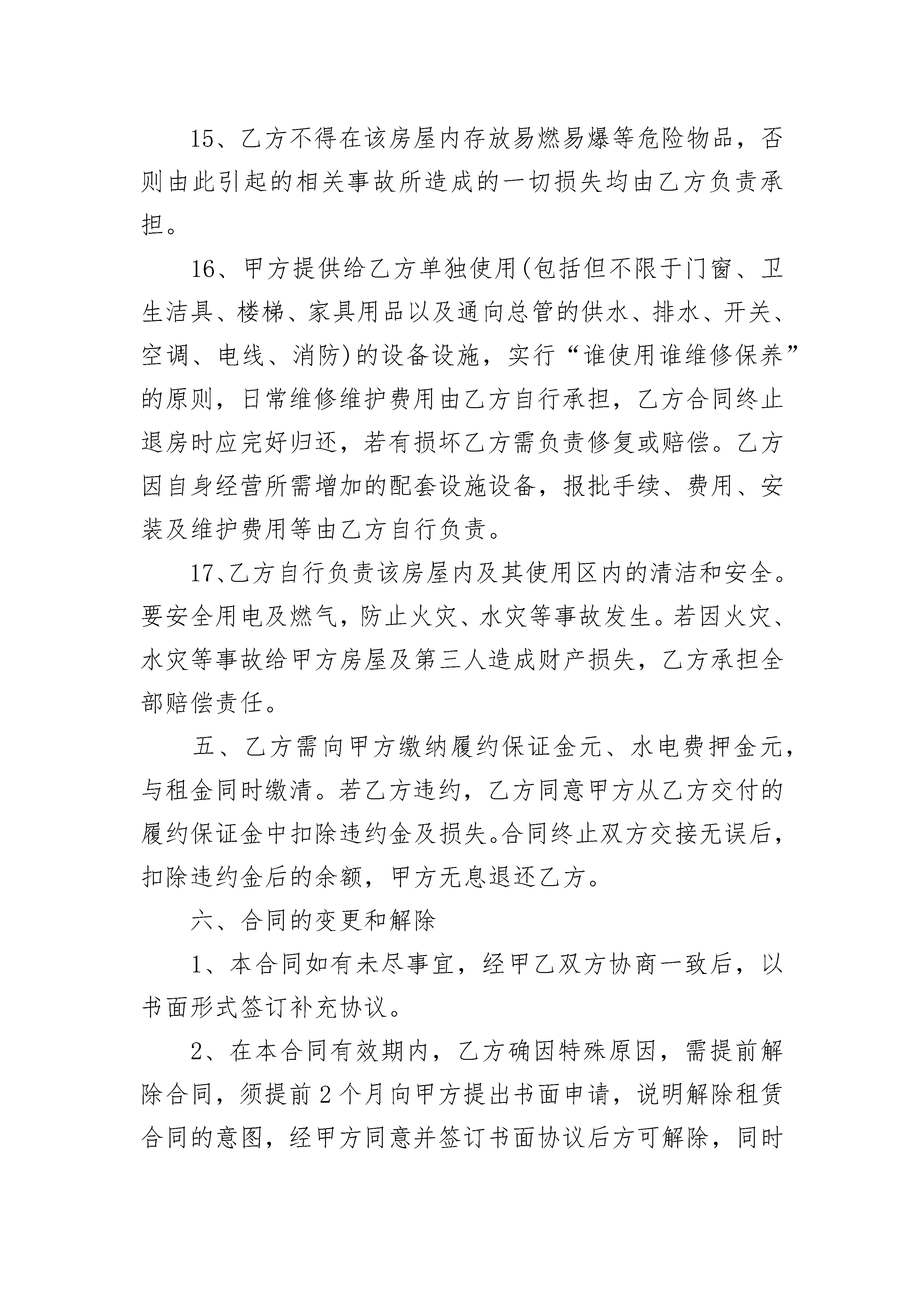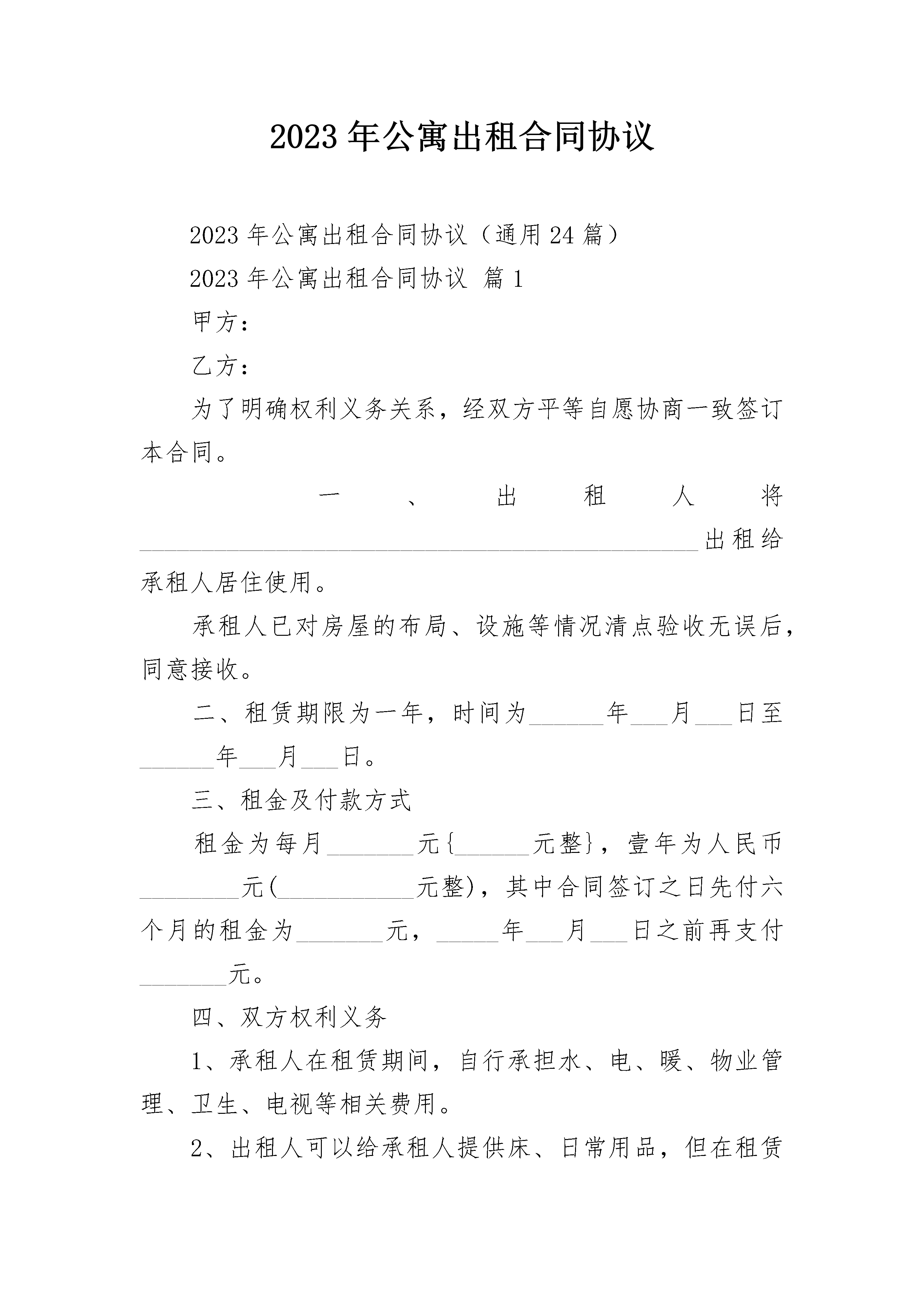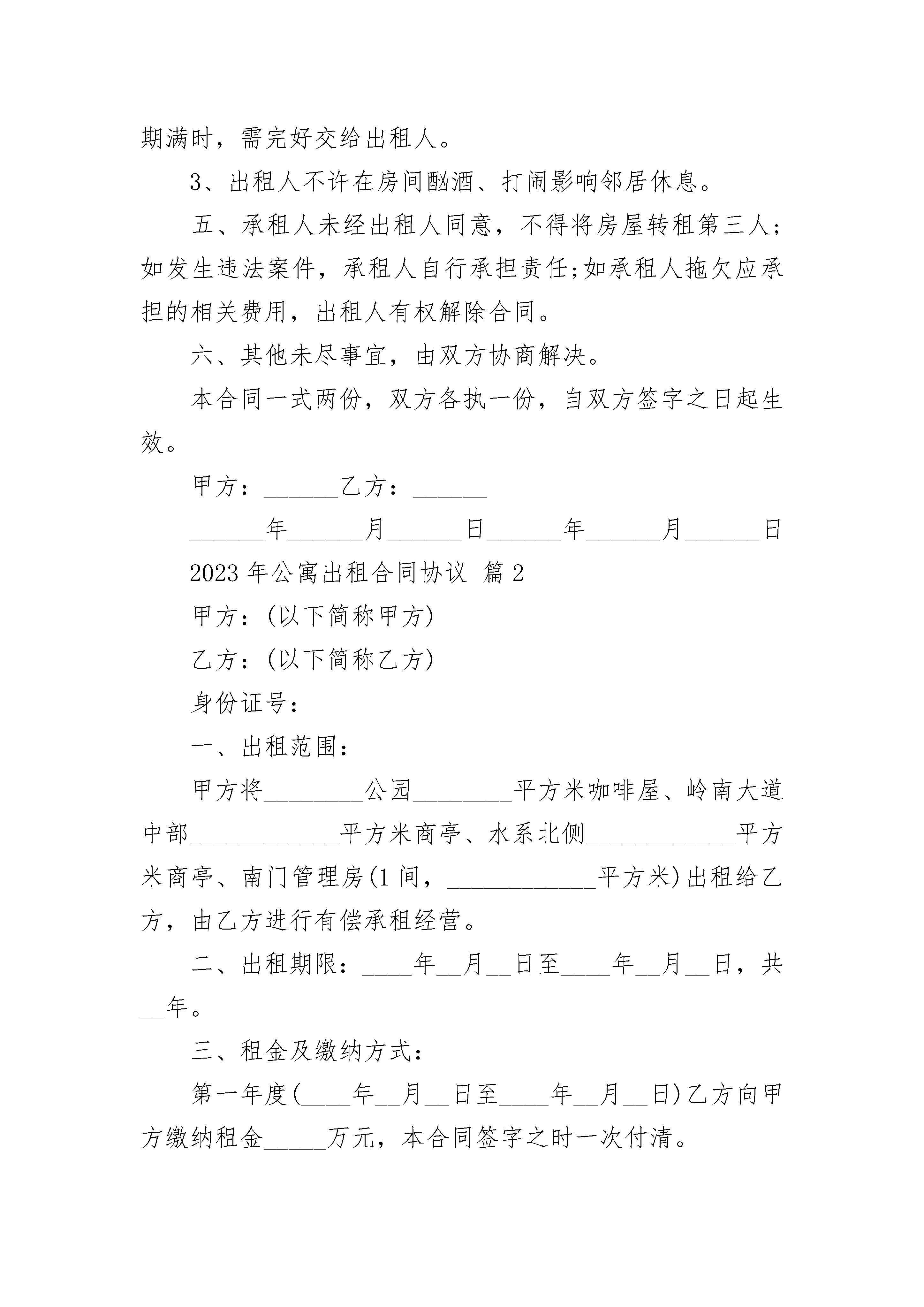 2023年公寓出租合同协议2023年公寓出租合同协议(通用24篇)2023年公寓出租合同协议篇1甲方:乙方:为了明确权利义务关系,经双方平等自愿协商一致签订本合同。一、出租人将_____________________________________________出租给承租人居住使用。承租人已对房屋的布局、设施等情况清点验收无误后,同意接收。二、租赁期限为一年,时间为______年___月___日至______年___月___日。三、租金及付款方式租金为每月_______元{______元整},壹年为人民币________元(___________元整),其中合同签订之日先付六个月的租金为_______元,_____年___月___日之前再支付_______元。四、双方权利义务1、承租人在租赁期间,自行承担水、电、暖、物业管理、卫生、电视等相关费用。2、出租人可以给承租人提供床、日常用品,但在租赁期满时,需完好交给出租人。3、出租人不许在房间酗酒、打闹影响邻居休息。五、承租人未经出租人同意,不得将房屋转租第三人;如发生违法案件,承租人自行承担责任;如承租人拖欠应承担的相关费用,出租人有权解除合同。六、其他未尽事宜,由双方协商解决。本合同一式两份,双方各执一份,自双方签字之日起生效。甲方:______乙方:____________年______月______日______年______月______日2023年公寓出租合同协议篇2甲方:(以下简称甲方)乙方:(以下简称乙方)身份证号:一、出租范围:甲方将________公园________平方米咖啡屋、岭南大道中部____________平方米商亭、水系北侧____________平方米商亭、南门管理房(1间,____________平方米)出租给乙方,由乙方进行有偿承租经营。二、出租期限:____年__月__日至____年__月__日,共__年。三、租金及缴纳方式:第一年度(____年__月__日至____年__月__日)乙方向甲方缴纳租金_____万元,本合同签字之时一次付清。第二年度(____年__月__日至____年__月__日)的租金数额,甲乙双方根据第一年度经营情况协商确定。第三年度的租金,以第二年度租金数额为基数,递增%,于__月__日前全额付清。以后年度的租金在上一年度租金数额的基础上,每年递增%,于每年的__月__日前全额付清,先付后用。四、双方权利与义务:1、本合同签字、乙方支付租金后,甲方将上述房屋交付给乙方,双方在移交明细上签字,并作为本合同的附件。(见附件1,附件中要详细写明房屋位置、房屋中的设备明细、型号、价值,以便收回时双方作为交接的依据。)2、甲方要为乙方创造良好的经营秩序、治安秩序。乙方要遵守甲方制定的各项管理制度,按照自己竞标时的经营方案(见附件2),认真做好经营项目的组织工作。一旦出现违约,违约一次甲方将视情况扣除200-500元的违约金,并督促乙方予以整改,整改期间不得经营。3、乙方承担租赁期内房屋及所有设施、设备维护、维修的全部费用,并承担设施设备毁损的赔偿责任。4、乙方要文明经营,保证饮食卫生,工作岗位要求上岗资格的必须持证上岗。防止发生饮食安全事故,若发生事故及纠纷由乙方承担全部责任。5、甲方定期对乙方安全生产情况进行检查,对发现的安全隐患进行督导整改,未整改结束不得经营。6、未经甲方书面同意,乙方不得将租赁房屋转租给第三人,否则,甲方有权解除合同,不退租金和履约保证金。未经甲方书面同意,乙方不得扩大经营范围。7、乙方对房屋及设施进行改造、装修,必须征得甲方的书面同意。8、乙方要依法经营,工商、税务、卫生许可、消防等经营方面的手续由乙方负责办理并承担费用。甲方给予配合。9、乙方服务价格要符合物价部门的有关规定。10、乙方要自觉维护经营项目及周边的环境卫生,垃圾要清理到指定位置,严禁在园内填埋垃圾,保证环境清洁。出现脏乱差情况,每次甲方视情况扣100-300元的违约金,并监督乙方予以整改。11、乙方要按时足额支付水电费用。12、合同期间,政府或相关主管部门有重大接待时,乙方要毫无条件地给予支持,并积极按要求配合相关部门做好接待。13、本合同终止时,该房屋内的不可移动的装潢、设施的所有权归甲方所有(若必须拆除固定装潢物时,乙方必须按其装修前的原样修复用地和墙体等),合同终止后,乙方应及时撤离该房屋物品,如合同终止5日后尚在该房屋内的所有物品和设备、设施等,视为乙方放弃之所有权,归甲方所有。乙方不得对该房屋装潢、设施、设备及其它投入向甲方提出任何赔偿或补偿要求。14、乙方设置经营招牌的,需经相关主管部门审批,并向甲方出示相关审批证件。15、乙方不得在该房屋内存放易燃易爆等危险物品,否则由此引起的相关事故所造成的一切损失均由乙方负责承担