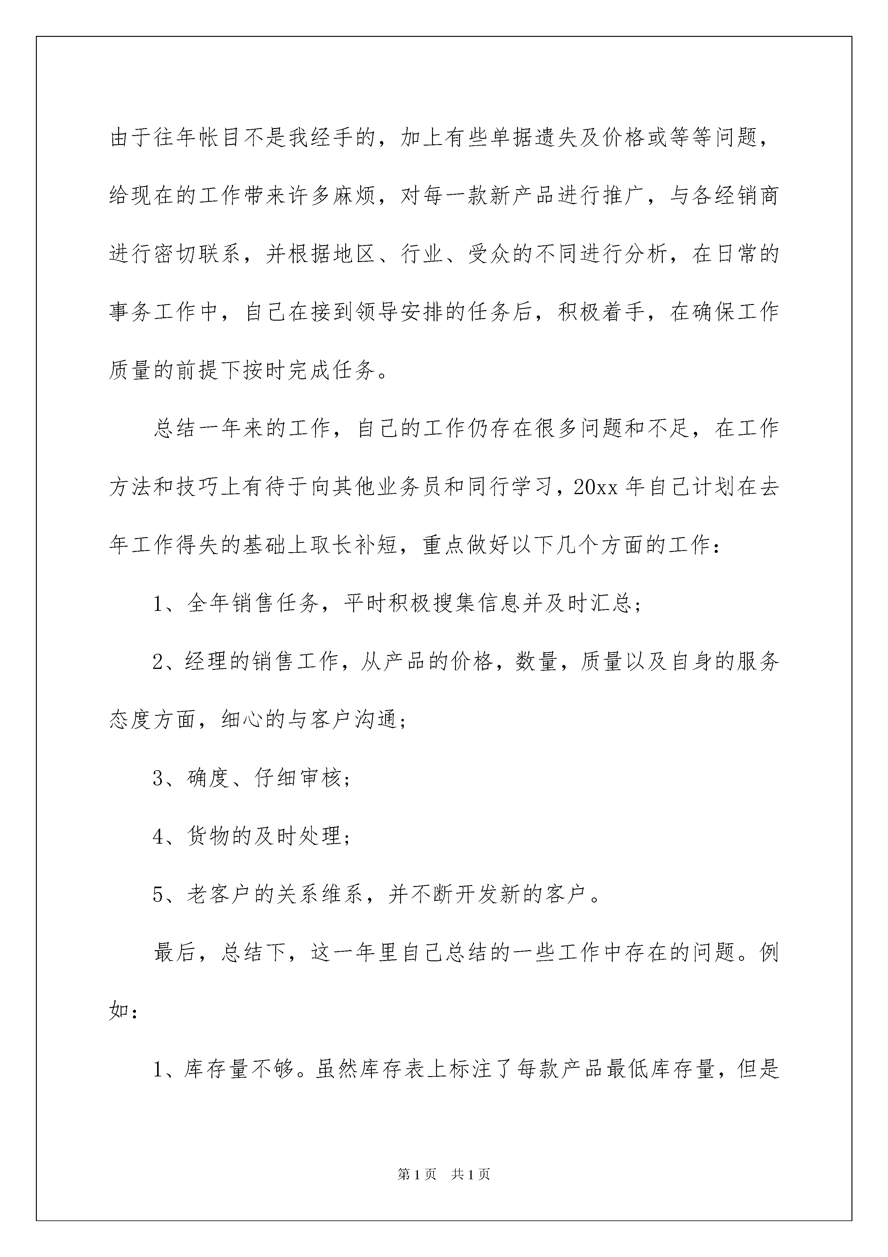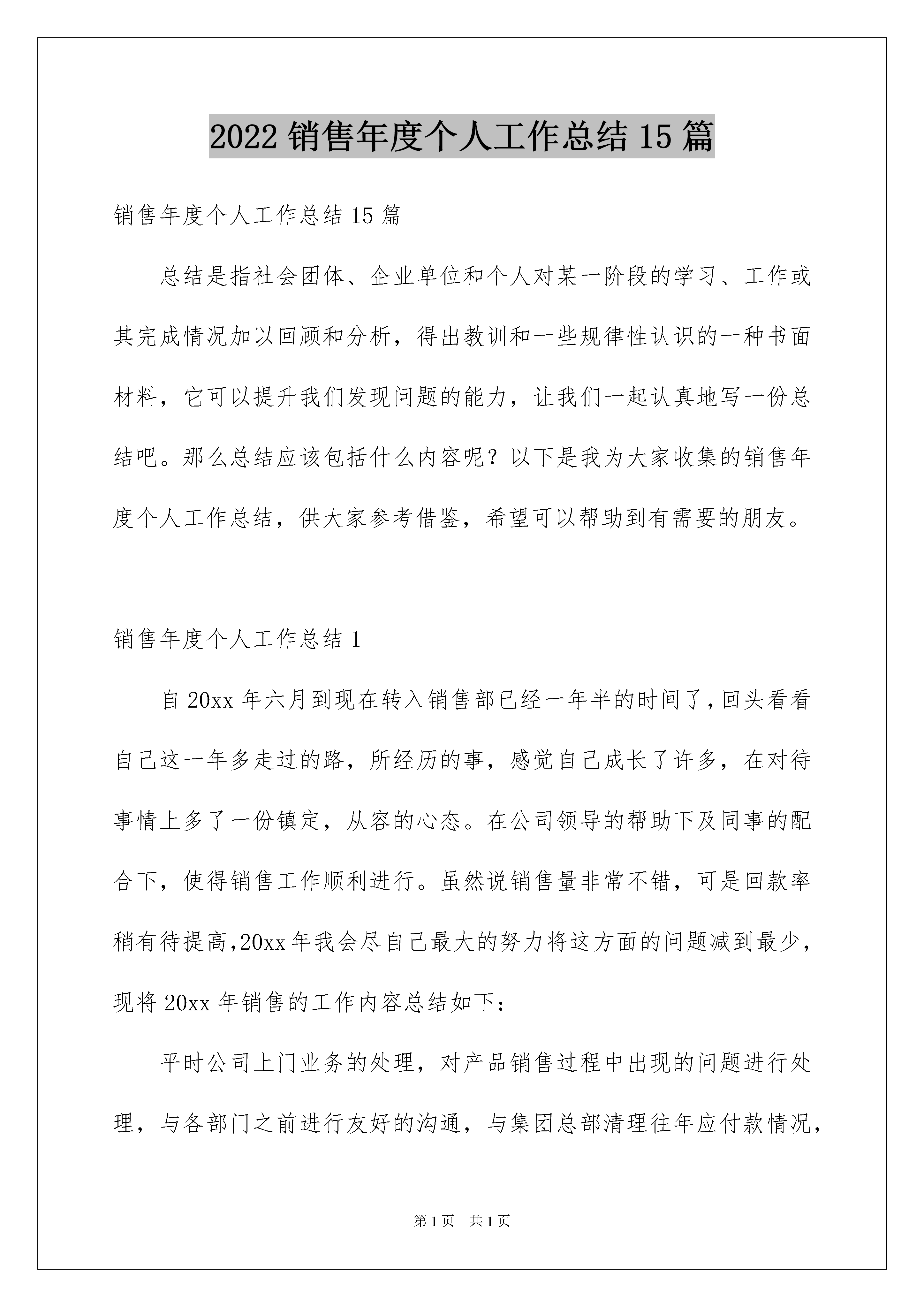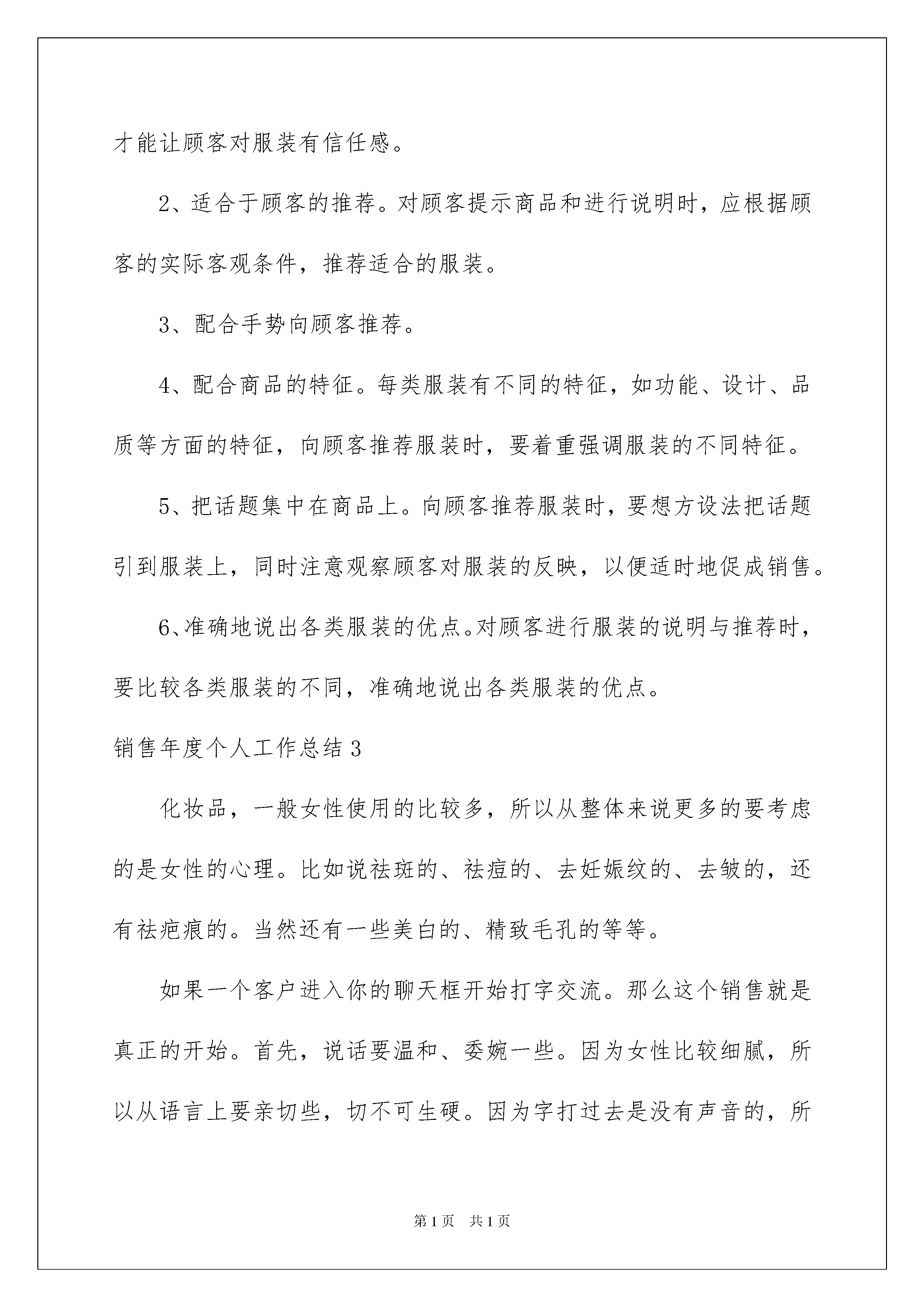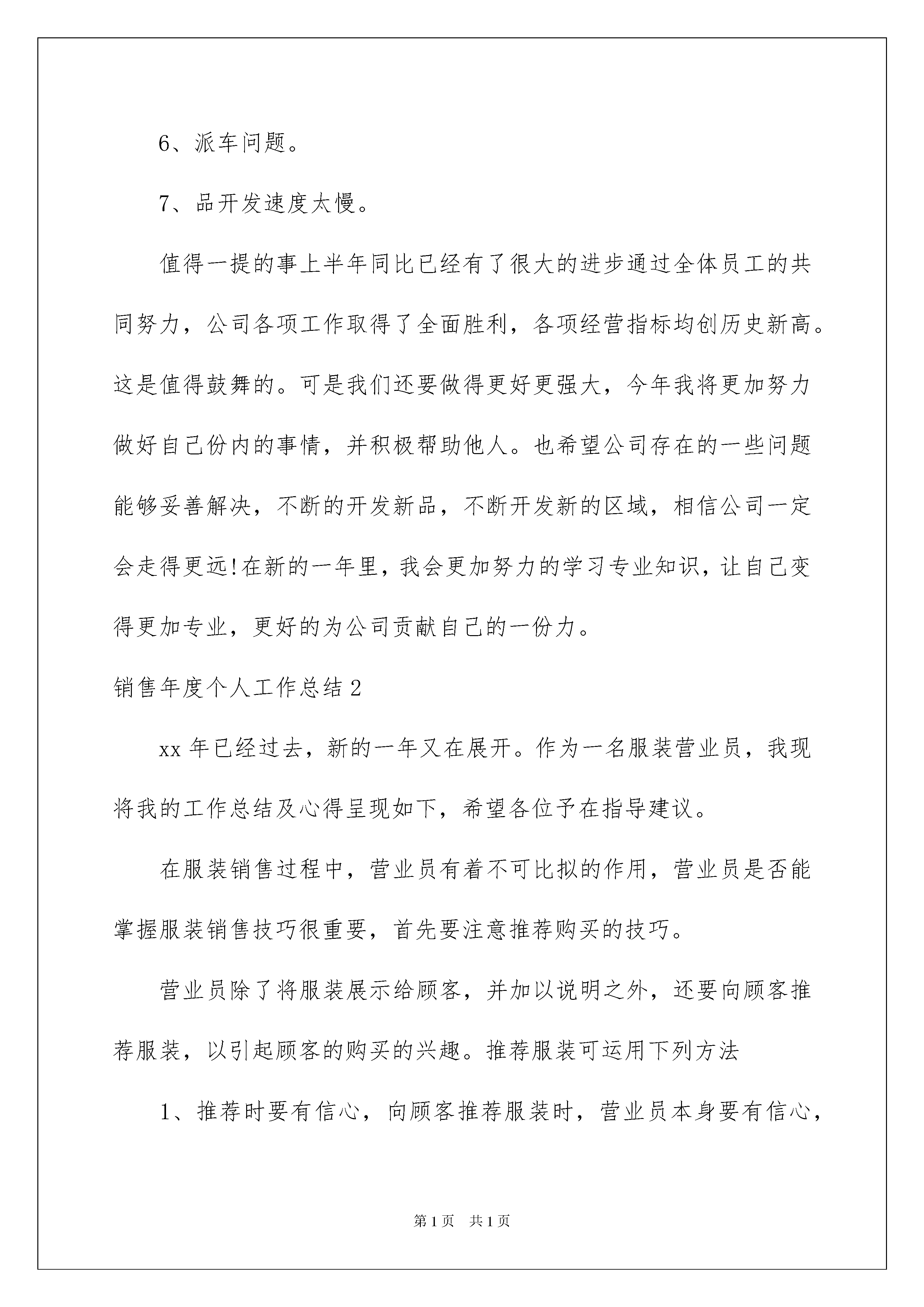 2022销售年度个人工作总结15篇销售年度个人工作总结15篇总结是指社会团体、企业单位和个人对某一阶段的学习、工作或其完成情况加以回顾和分析,得出教训和一些规律性认识的一种书面材料,它可以提升我们发现问题的能力,让我们一起认真地写一份总结吧。那么总结应该包括什么内容呢?以下是我为大家收集的销售年度个人工作总结,供大家参考借鉴,希望可以帮助到有需要的朋友。销售年度个人工作总结1自20xx年六月到现在转入销售部已经一年半的时间了,回头看看自己这一年多走过的路,所经历的事,感觉自己成长了许多,在对待事情上多了一份镇定,从容的心态。在公司领导的帮助下及同事的配合下,使得销售工作顺利进行。虽然说销售量非常不错,可是回款率稍有待提高,20xx年我会尽自己最大的努力将这方面的问题减到最少,现将20xx年销售的工作内容总结如下:平时公司上门业务的处理,对产品销售过程中出现的问题进行处理,与各部门之前进行友好的沟通,与集团总部清理往年应付款情况,由于往年帐目不是我经手的,加上有些单据遗失及价格或等等问题,给现在的工作带来许多麻烦,对每一款新产品进行推广,与各经销商进行密切联系,并根据地区、行业、受众的不同进行分析,在日常的事务工作中,自己在接到领导安排的任务后,积极着手,在确保工作质量的前提下按时完成任务。总结一年来的工作,自己的工作仍存在很多问题和不足,在工作方法和技巧上有待于向其他业务员和同行学习,20xx年自己计划在去年工作得失的基础上取长补短,重点做好以下几个方面的工作:1、全年销售任务,平时积极搜集信息并及时汇总;2、经理的销售工作,从产品的价格,数量,质量以及自身的服务态度方面,细心的与客户沟通;3、确度、仔细审核;4、货物的及时处理;5、老客户的关系维系,并不断开发新的客户。最后,总结下,这一年里自己总结的一些工作中存在的问题。例如:1、库存量不够。虽然库存表上标注了每款产品最低库存量,但是实际却不相符,有许多产品甚至已经断货。在库存不多的情况下,建议仓库及时与生产联系下单,或者与销售联系提醒下单,飞单的情况大多于库存量不足有关。2、回货不及时。回货时间总会延迟,对于这种现象,采购人员的态度大多都是事不关已,很少会想着怎么去与供应商解决,而是希望销售人员与客户沟通延缓时间。这样会让客户对我们的信誉度降低。(这种现象非常严重)3、对供应商退货的处理。很多不合格的产品,由于时间拖延,最后在逼不得已的情况下一挑再挑,并当成合格产品销售,这样对我们“追求高品质”的信念是非常不吻合的。经常有拿出去的东西因为质量问题让销售人员非常难堪。4、应定期对销售却未回款的业务进行催款或者提醒。有许多已经回款的业务,财务在几个月之后才告诉销售人员,期间销售人员以为没回款一直都在催,给客户印象非常不好!5、部门之间不协调。为了自己的工作方便,往往不会太关心他人,不会考虑给他人带来的麻烦。有时候因为一句话或者一点小事情就可以解决了,可是却让销售人员走了许多弯路。6、派车问题。7、品开发速度太慢。值得一提的事上半年同比已经有了很大的进步通过全体员工的共同努力,公司各项工作取得了全面胜利,各项经营指标均创历史新高。这是值得鼓舞的。可是我们还要做得更好更强大,今年我将更加努力做好自己份内的事情,并积极帮助他人。也希望公司存在的一些问题能够妥善解决,不断的开发新品,不断开发新的区域,相信公司一定会走得更远!在新的一年里,我会更加努力的学习专业知识,让自己变得更加专业,更好的为公司贡献自己的一份力。销售年度个人工作总结2xx年已经过去,新的一年又在展开。作为一名服装营业员,我现将我的工作总结及心得呈现如下,希望各位予在指导建议。在服装销售过程中,营业员有着不可比拟的作用,营业员是否能掌握服装销售技巧很重要,首先要注意推荐购买的技巧。营业员除了将服装展示给顾客,并加以说明之外,还要向顾客推荐服装,以引起顾客的购买的兴趣。推荐服装可运用下列方法1、推荐时要有信心,向顾客推荐服装时,营业员本身要有信心,才能让顾客对服装有信任感。2、适合于顾客的推荐。对顾客提示商品和进行说明时,应根据顾客的实际客观条件,推荐适合的服装。3、配合手势向顾客推荐。4、配合商品的特征。每类服装有不同的特征,如功能、设计、品质等方面的特征,向顾客推荐服装时,要着重强调服装的不同特征。5、把话题集中在商品上。向顾客推荐服装时,要想方设法把话题引到服装上,同时注意观察顾客对服装的反映,以便适时地促成销售。6、准确地说出各类服装的优点。对顾客进行服装的说明与推荐时,要比较各类服装的不同,准确地说出各类服装的优点。销售年度个人工作总结3化妆品,一般女性