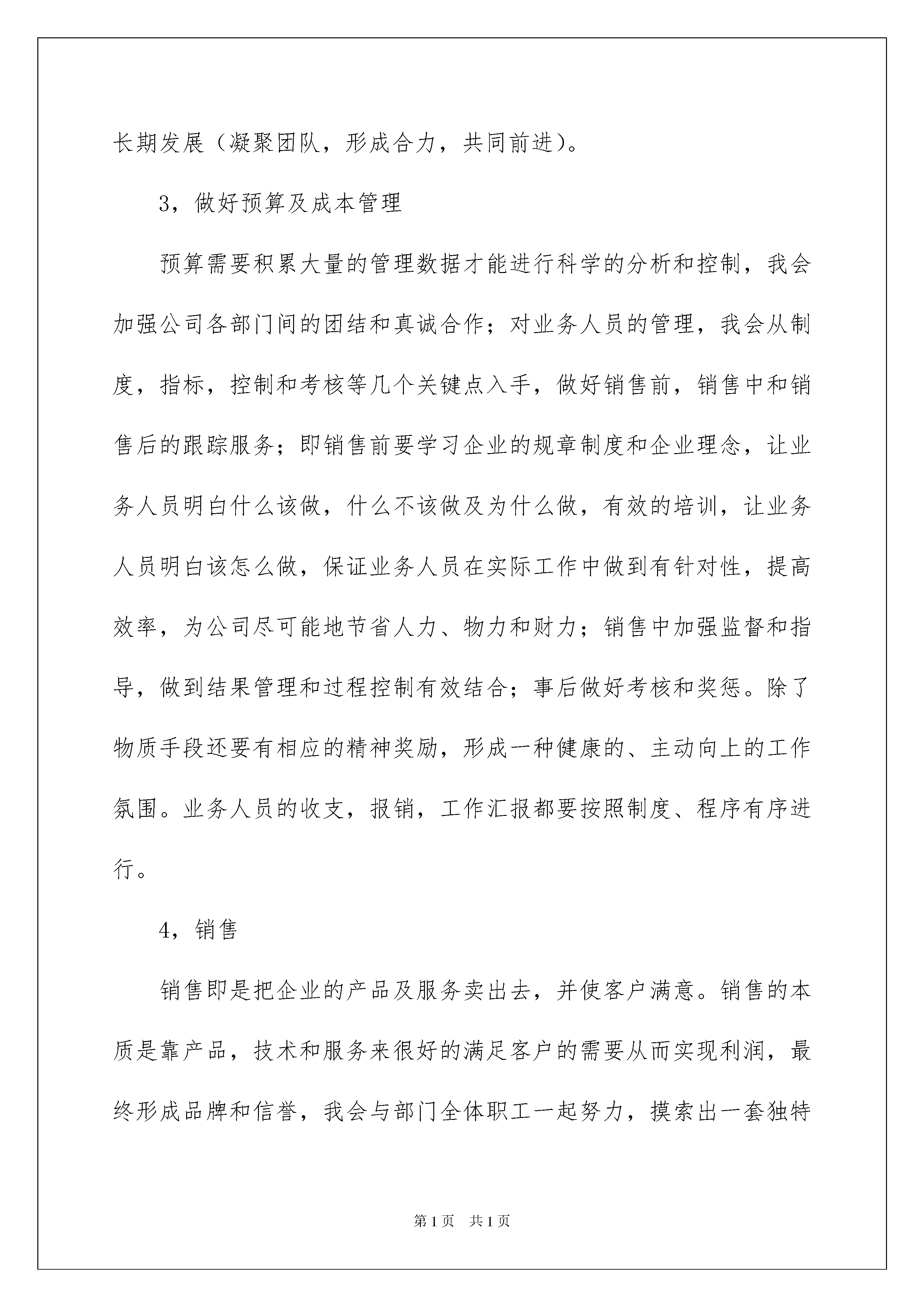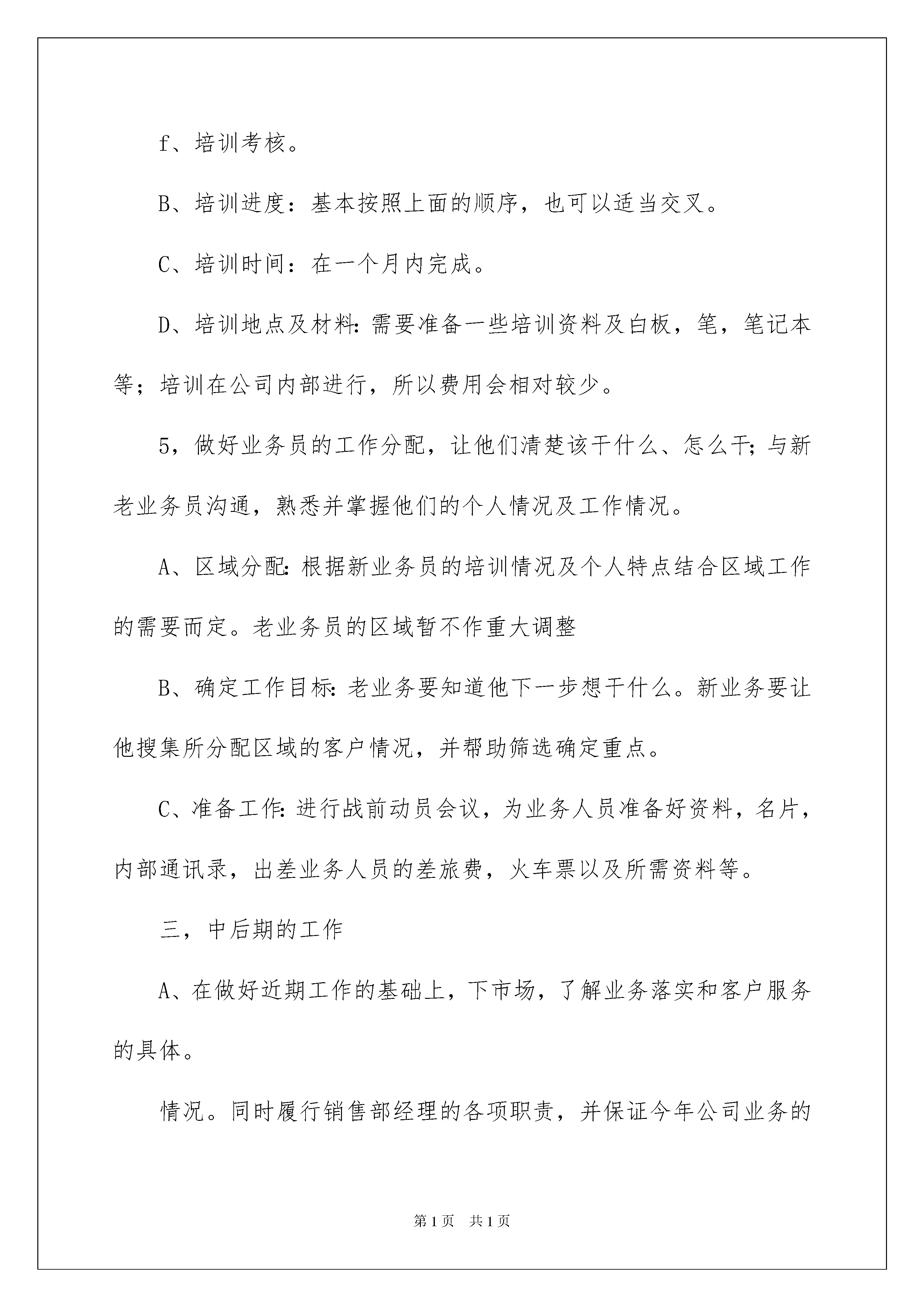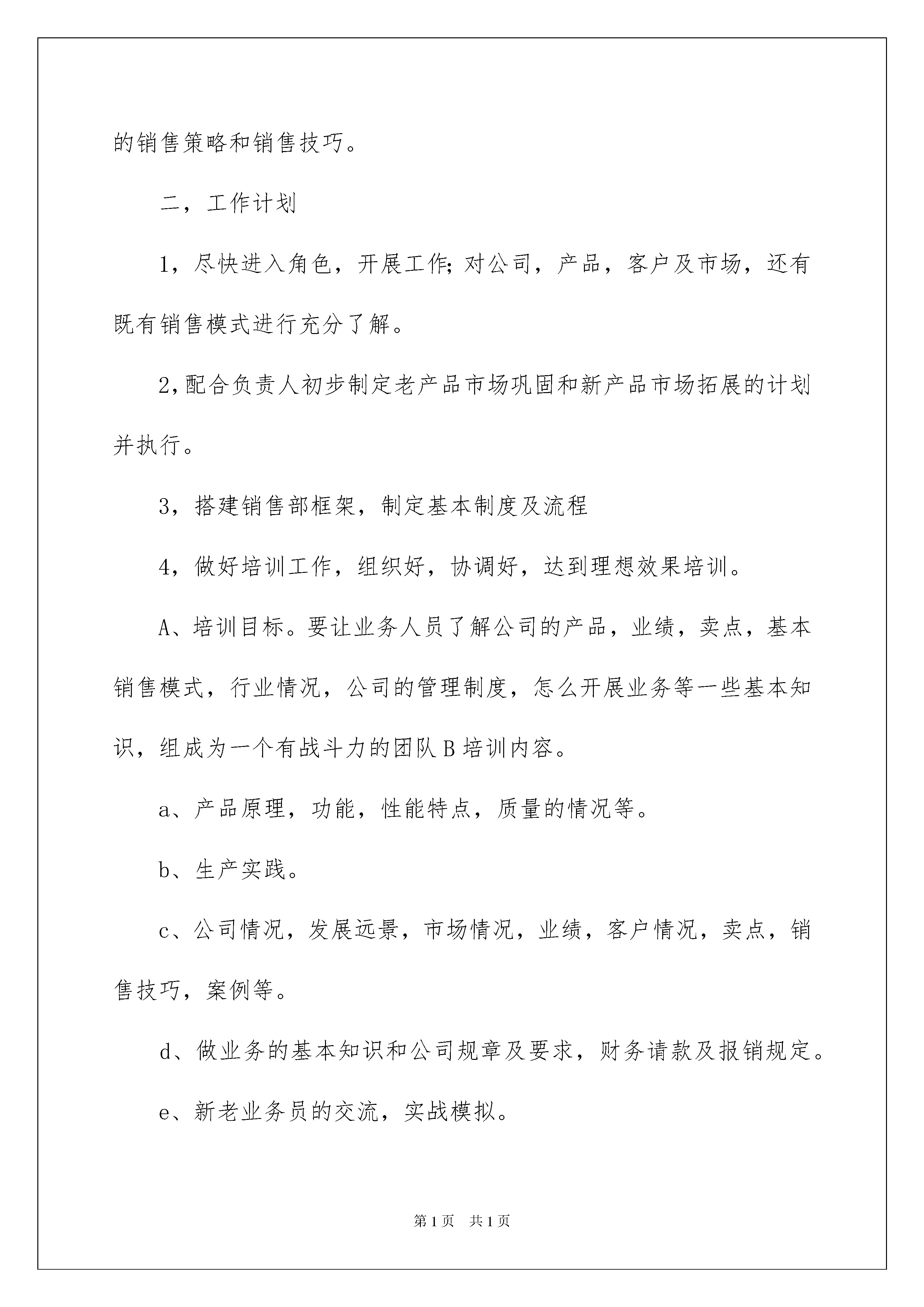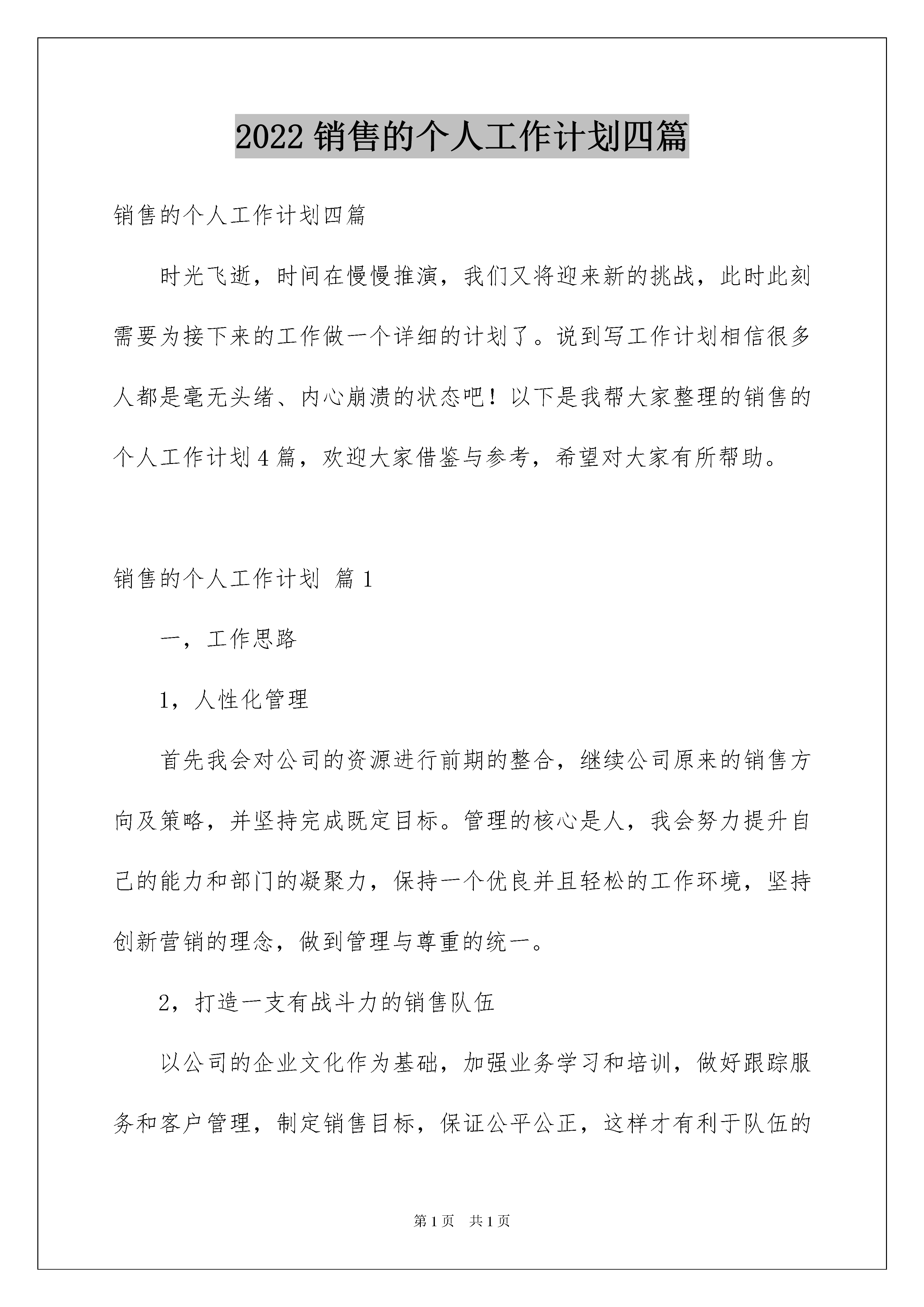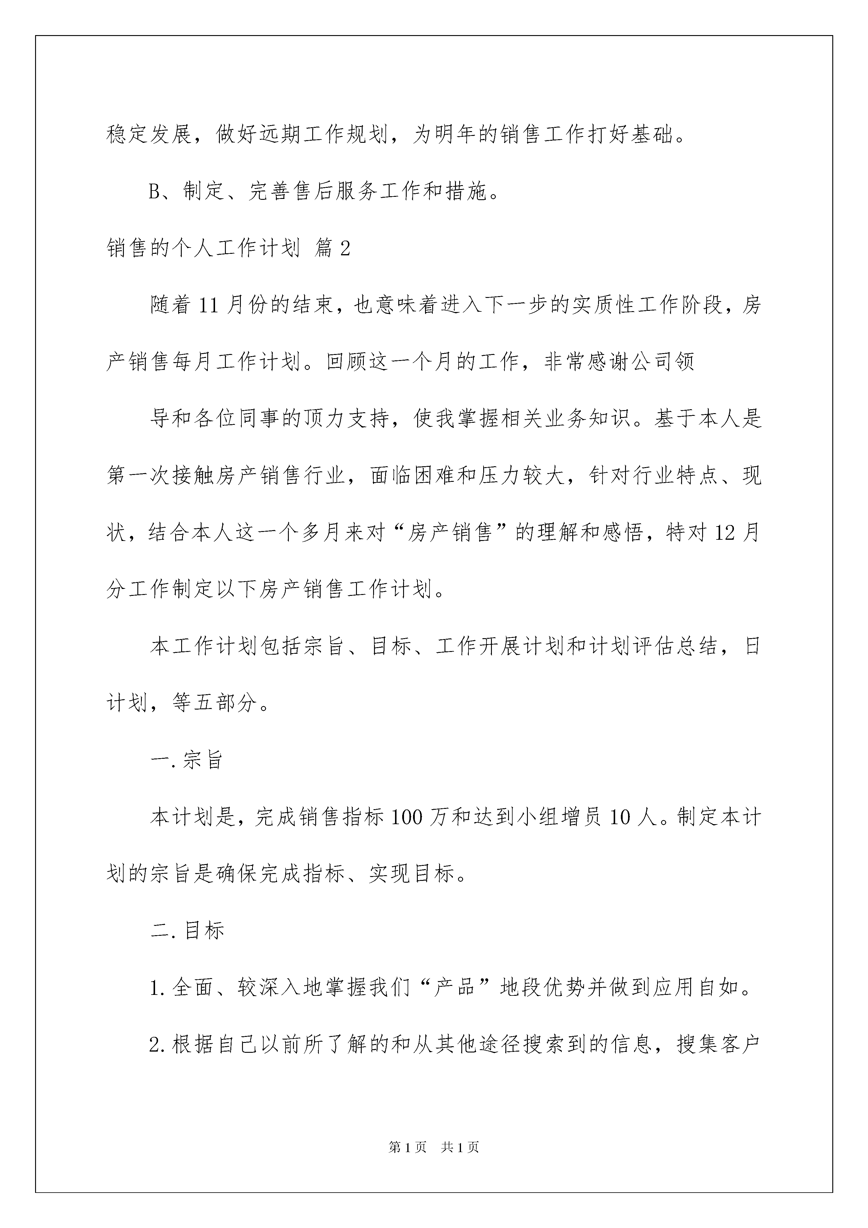 2022销售的个人工作计划四篇销售的个人工作计划四篇时光飞逝,时间在慢慢推演,我们又将迎来新的挑战,此时此刻需要为接下来的工作做一个详细的计划了。说到写工作计划相信很多人都是毫无头绪、内心崩溃的状态吧!以下是我帮大家整理的销售的个人工作计划4篇,欢迎大家借鉴与参考,希望对大家有所帮助。销售的个人工作计划篇1一,工作思路1,人性化管理首先我会对公司的资源进行前期的整合,继续公司原来的销售方向及策略,并坚持完成既定目标。管理的核心是人,我会努力提升自己的能力和部门的凝聚力,保持一个优良并且轻松的工作环境,坚持创新营销的理念,做到管理与尊重的统一。2,打造一支有战斗力的销售队伍以公司的企业文化作为基础,加强业务学习和培训,做好跟踪服务和客户管理,制定销售目标,保证公平公正,这样才有利于队伍的长期发展(凝聚团队,形成合力,共同前进)。3,做好预算及成本管理预算需要积累大量的管理数据才能进行科学的分析和控制,我会加强公司各部门间的团结和真诚合作;对业务人员的管理,我会从制度,指标,控制和考核等几个关键点入手,做好销售前,销售中和销售后的跟踪服务;即销售前要学习企业的规章制度和企业理念,让业务人员明白什么该做,什么不该做及为什么做,有效的培训,让业务人员明白该怎么做,保证业务人员在实际工作中做到有针对性,提高效率,为公司尽可能地节省人力、物力和财力;销售中加强监督和指导,做到结果管理和过程控制有效结合;事后做好考核和奖惩。除了物质手段还要有相应的精神奖励,形成一种健康的、主动向上的工作氛围。业务人员的收支,报销,工作汇报都要按照制度、程序有序进行。4,销售销售即是把企业的产品及服务卖出去,并使客户满意。销售的本质是靠产品,技术和服务来很好的满足客户的需要从而实现利润,最终形成品牌和信誉,我会与部门全体职工一起努力,摸索出一套独特的销售策略和销售技巧。二,工作计划1,尽快进入角色,开展工作;对公司,产品,客户及市场,还有既有销售模式进行充分了解。2,配合负责人初步制定老产品市场巩固和新产品市场拓展的计划并执行。3,搭建销售部框架,制定基本制度及流程4,做好培训工作,组织好,协调好,达到理想效果培训。A、培训目标。要让业务人员了解公司的产品,业绩,卖点,基本销售模式,行业情况,公司的管理制度,怎么开展业务等一些基本知识,组成为一个有战斗力的团队B培训内容。a、产品原理,功能,性能特点,质量的情况等。b、生产实践。c、公司情况,发展远景,市场情况,业绩,客户情况,卖点,销售技巧,案例等。d、做业务的基本知识和公司规章及要求,财务请款及报销规定。e、新老业务员的交流,实战模拟。f、培训考核。B、培训进度:基本按照上面的顺序,也可以适当交叉。C、培训时间:在一个月内完成。D、培训地点及材料:需要准备一些培训资料及白板,笔,笔记本等;培训在公司内部进行,所以费用会相对较少。5,做好业务员的工作分配,让他们清楚该干什么、怎么干;与新老业务员沟通,熟悉并掌握他们的个人情况及工作情况。A、区域分配:根据新业务员的培训情况及个人特点结合区域工作的需要而定。老业务员的区域暂不作重大调整B、确定工作目标:老业务要知道他下一步想干什么。新业务要让他搜集所分配区域的客户情况,并帮助筛选确定重点。C、准备工作:进行战前动员会议,为业务人员准备好资料,名片,内部通讯录,出差业务人员的差旅费,火车票以及所需资料等。三,中后期的工作A、在做好近期工作的基础上,下市场,了解业务落实和客户服务的具体。情况。同时履行销售部经理的各项职责,并保证今年公司业务的稳定发展,做好远期工作规划,为明年的销售工作打好基础。B、制定、完善售后服务工作和措施。销售的个人工作计划篇2随着11月份的结束,也意味着进入下一步的实质性工作阶段,房产销售每月工作计划。回顾这一个月的工作,非常感谢公司领导和各位同事的顶力支持,使我掌握相关业务知识。基于本人是第一次接触房产销售行业,面临困难和压力较大,针对行业特点、现状,结合本人这一个多月来对“房产销售”的理解和感悟,特对12月分工作制定以下房产销售工作计划。本工作计划包括宗旨、目标、工作开展计划和计划评估总结,日计划,等五部分。一.宗旨本计划是,完成销售指标100万和达到小组增员10人。制定本计划的宗旨是确保完成指标、实现目标。二.目标1.全面、较深入地掌握我们“产品”地段优势并做到应用自如。2.根据自己以前所了解的和从其他途径搜索到的信息,搜集客户信息1000个。3.锁定有意向客户30家。4.力争完成销售指标。三.工作开展计划众所周知,现代房产销售的竞争,就是服务的竞争。服务分为售前服务、售中服务和