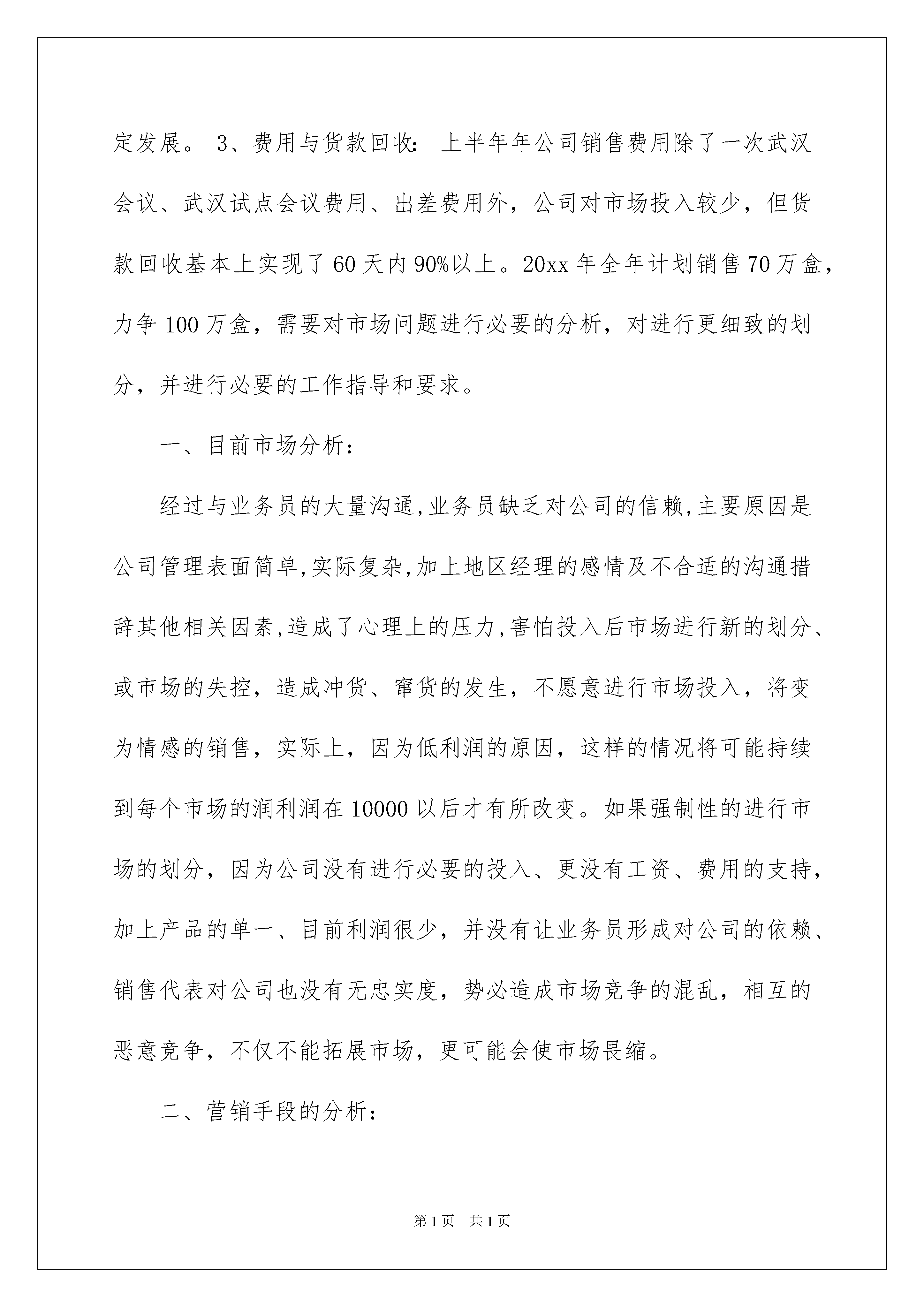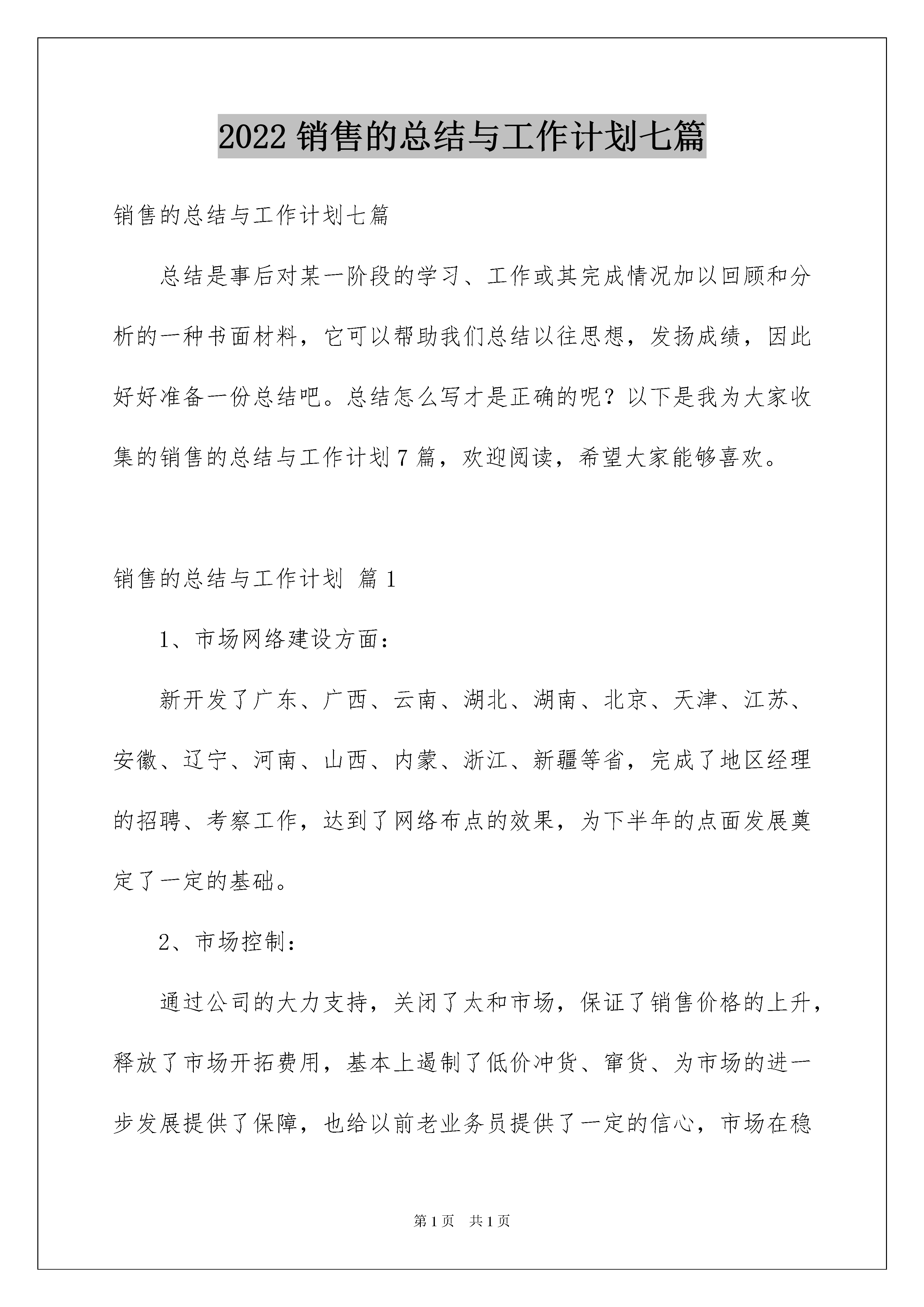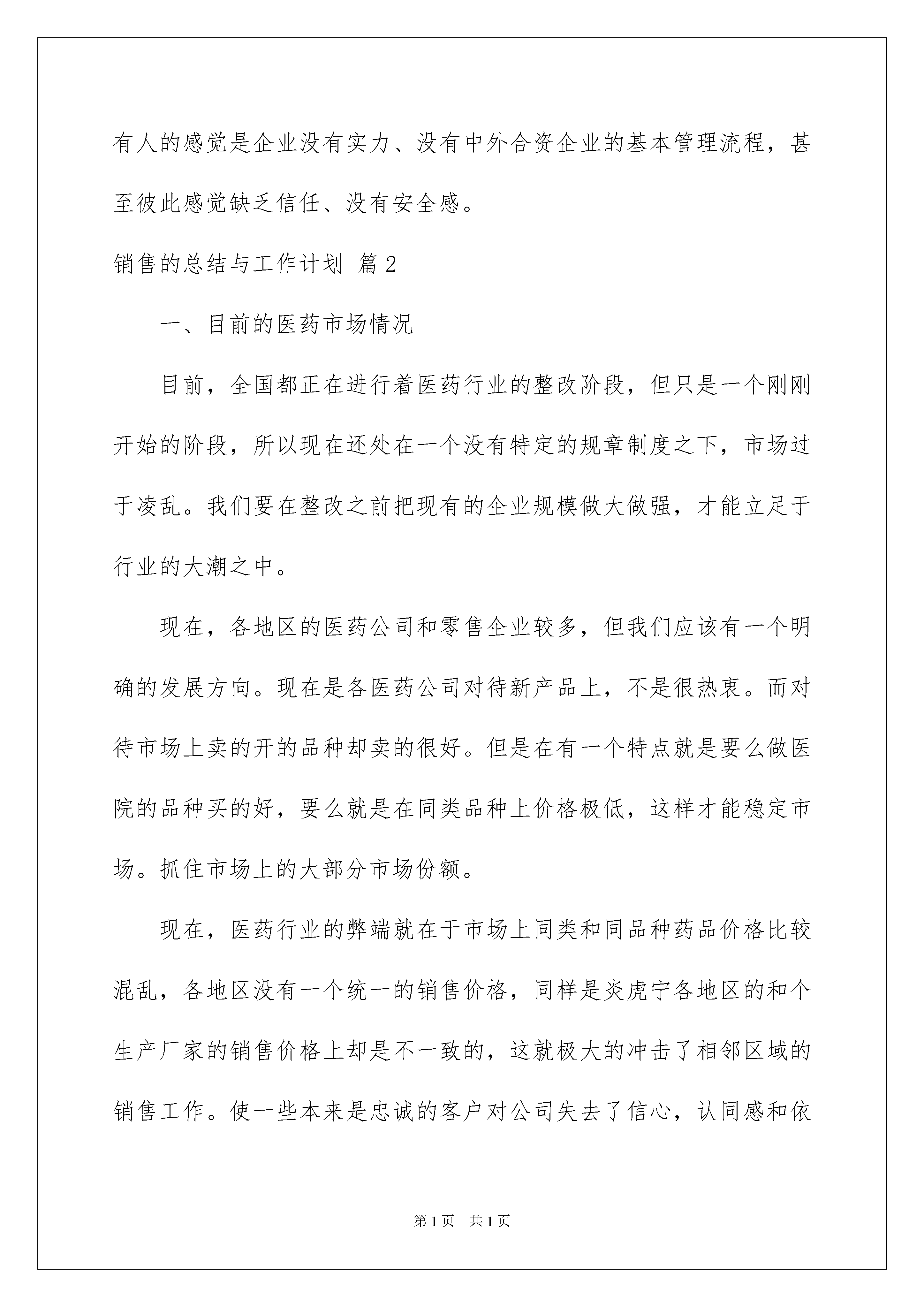 2022销售的总结与工作计划七篇销售的总结与工作计划七篇总结是事后对某一阶段的学习、工作或其完成情况加以回顾和分析的一种书面材料,它可以帮助我们总结以往思想,发扬成绩,因此好好准备一份总结吧。总结怎么写才是正确的呢?以下是我为大家收集的销售的总结与工作计划7篇,欢迎阅读,希望大家能够喜欢。销售的总结与工作计划篇11、市场网络建设方面:新开发了广东、广西、云南、湖北、湖南、北京、天津、江苏、安徽、辽宁、河南、山西、内蒙、浙江、新疆等省,完成了地区经理的招聘、考察工作,达到了网络布点的效果,为下半年的点面发展奠定了一定的基础。2、市场控制:通过公司的大力支持,关闭了太和市场,保证了销售价格的上升,释放了市场开拓费用,基本上遏制了低价冲货、窜货、为市场的进一步发展提供了保障,也给以前老业务员提供了一定的信心,市场在稳定发展。3、费用与货款回收:上半年年公司销售费用除了一次武汉会议、武汉试点会议费用、出差费用外,公司对市场投入较少,但货款回收基本上实现了60天内90%以上。20xx年全年计划销售70万盒,力争100万盒,需要对市场问题进行必要的分析,对进行更细致的划分,并进行必要的工作指导和要求。一、目前市场分析:经过与业务员的大量沟通,业务员缺乏对公司的信赖,主要原因是公司管理表面简单,实际复杂,加上地区经理的感情及不合适的沟通措辞其他相关因素,造成了心理上的压力,害怕投入后市场进行新的划分、或市场的失控,造成冲货、窜货的发生,不愿意进行市场投入,将变为情感的销售,实际上,因为低利润的原因,这样的情况将可能持续到每个市场的润利润在10000以后才有所改变。如果强制性的进行市场的划分,因为公司没有进行必要的投入、更没有工资、费用的支持,加上产品的单一、目前利润很少,并没有让业务员形成对公司的依赖、销售代表对公司也没有无忠实度,势必造成市场竞争的混乱,相互的恶意竞争,不仅不能拓展市场,更可能会使市场畏缩。二、营销手段的分析:所有经营活动必须有一个统一的营销模式,而不是所谓的放任自流,凭借代理商的主观能动性去把握和操作市场,因为产品价格定位、产品用途的定位、同类产品的竞争分析等综合因素的考虑,更不可能期望于业务员替换单盒利润空间大的某个产品,事实上也是如此,与我来公司的前提出的以0TC、以农村市场为目标市场的市场销售定位为主、以会议营销实现网络的组建和管理,迅速提高市场的占有率。而依据业务员的自觉性来任其发展,公司只能听凭市场的自然发展,失去主动性。三、公司的支持方面分析:公司对市场支持工作基本上为0,而所有新产品进行市场开拓期,没有哪个企业没有进行市场的适当投入,因为目前医药市场的相对透明,市场开拓费用的逐步增加,销售代表在考虑风险的同时,更在考虑资金投入的收益和产出比例,如果在相同投入、而产出比例悬殊过大,代表对其的忠实度也过底。而比较成功的企业无疑在新产品进入市场前期进行必要的支持与投入。四、管理方面分析:新业务员及绝大部分业务员对公司管理存在较大的怀疑,几乎所有人的感觉是企业没有实力、没有中外合资企业的基本管理流程,甚至彼此感觉缺乏信任、没有安全感。销售的总结与工作计划篇2一、目前的医药市场情况目前,全国都正在进行着医药行业的整改阶段,但只是一个刚刚开始的阶段,所以现在还处在一个没有特定的规章制度之下,市场过于凌乱。我们要在整改之前把现有的企业规模做大做强,才能立足于行业的大潮之中。现在,各地区的医药公司和零售企业较多,但我们应该有一个明确的发展方向。现在是各医药公司对待新产品上,不是很热衷。而对待市场上卖的开的品种却卖的很好。但是在有一个特点就是要么做医院的品种买的好,要么就是在同类品种上价格极低,这样才能稳定市场。抓住市场上的大部分市场份额。现在,医药行业的弊端就在于市场上同类和同品种药品价格比较混乱,各地区没有一个统一的销售价格,同样是炎虎宁各地区的和个生产厂家的销售价格上却是不一致的,这就极大的冲击了相邻区域的销售工作。使一些本来是忠诚的客户对公司失去了信心,认同感和依赖性。以前各地区之间穿插,各自做各自的业务,业务员对相连的区域销售情况不是很了解,势必会对自己或他人的销售区域造成冲击。在药品的销售价格方面,在同等比例条件下,利润和销货数量是成正比的,也就是说销量和利润是息息相关。二、工作总结自从做业务以来负责xxx和xxx地区,可以说xxx和xxx把这两个非常好的销售区域给了我,对我有相当大的期望,可是对于我来说却是一个相当大的考验,在这过程中我学会了很多很多。包括和客户之间的言谈举止,自己的口才得到了锻炼,自己的胆量得到了很大的提升。可以说自己在这一年中,自己对自
