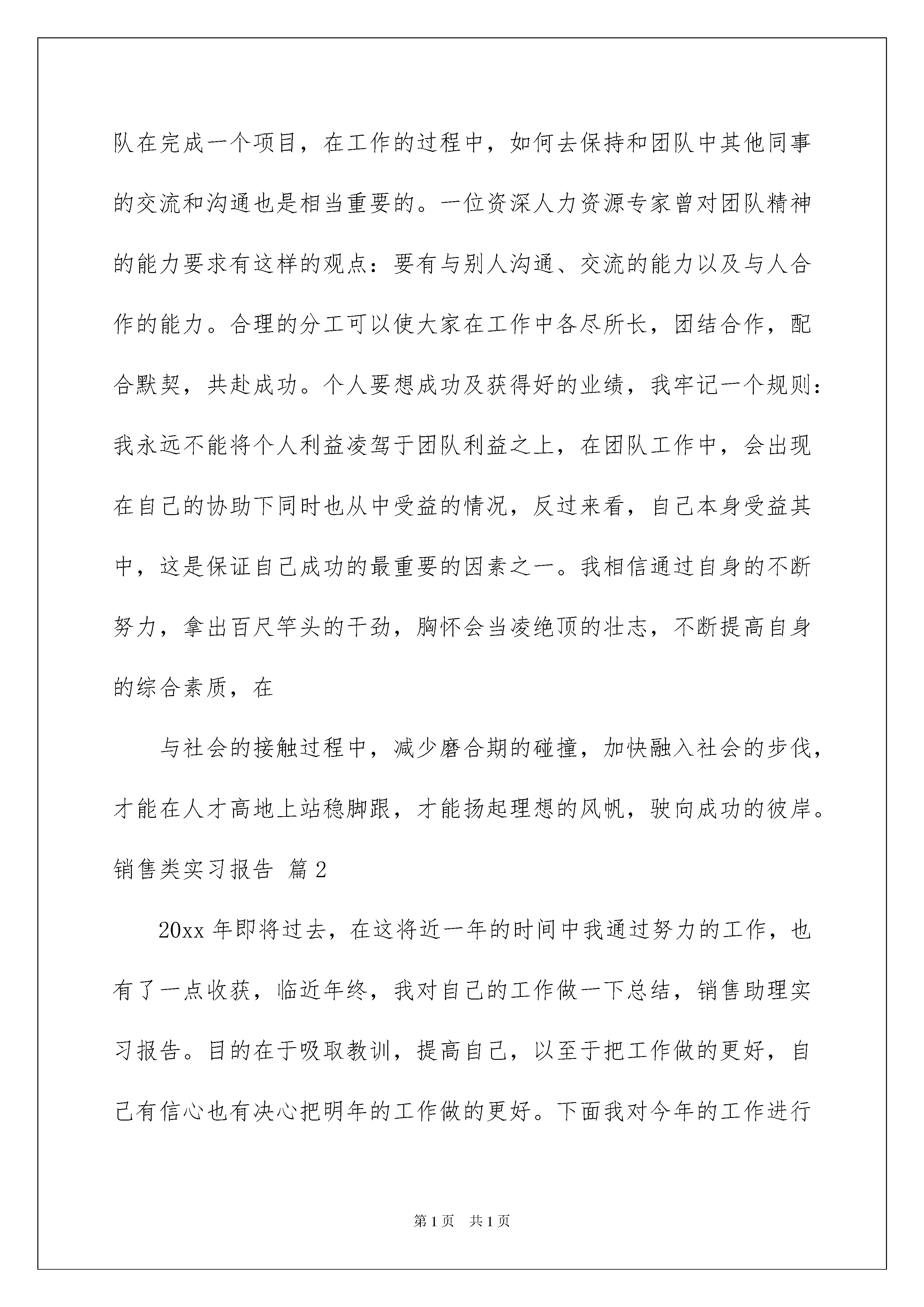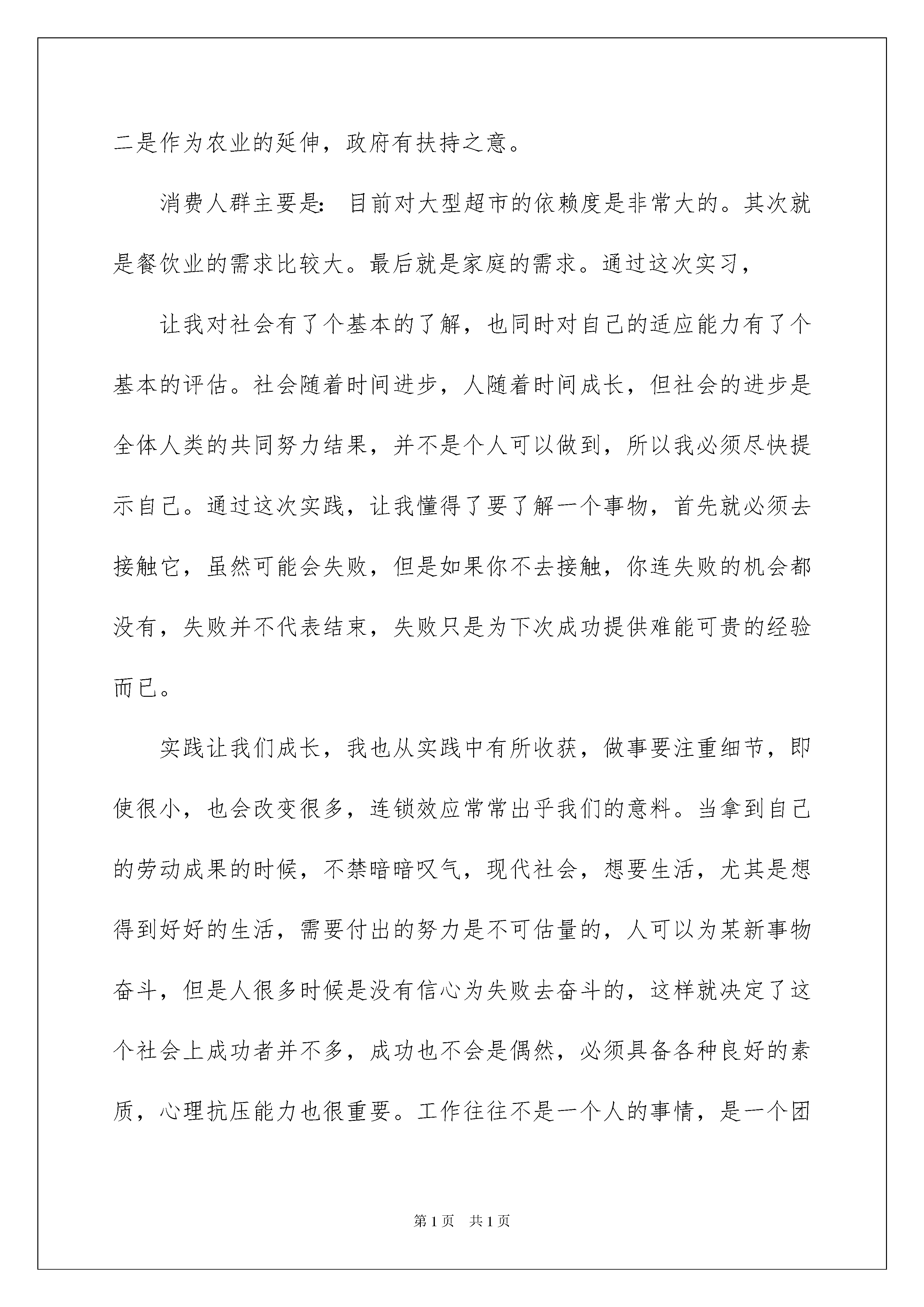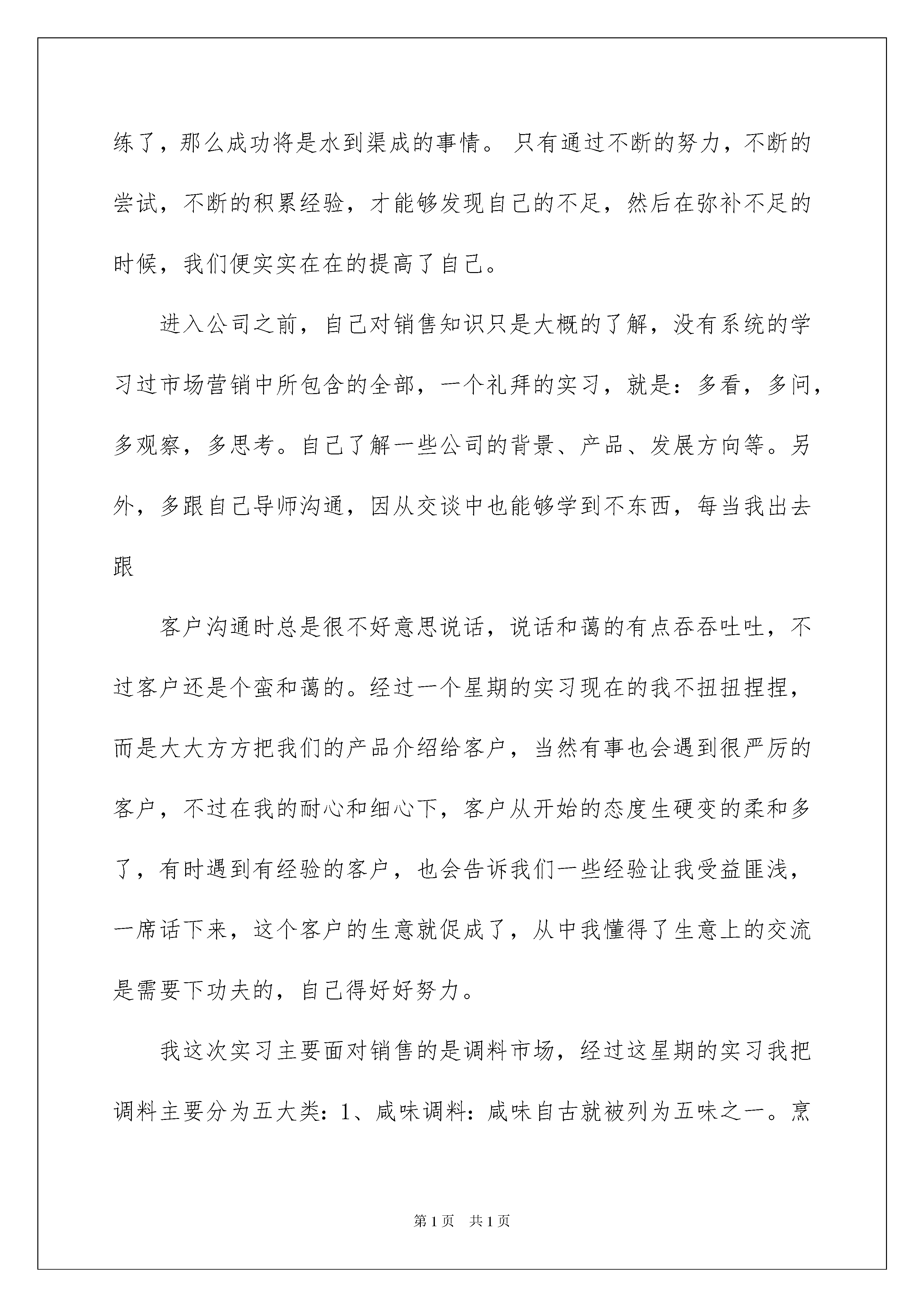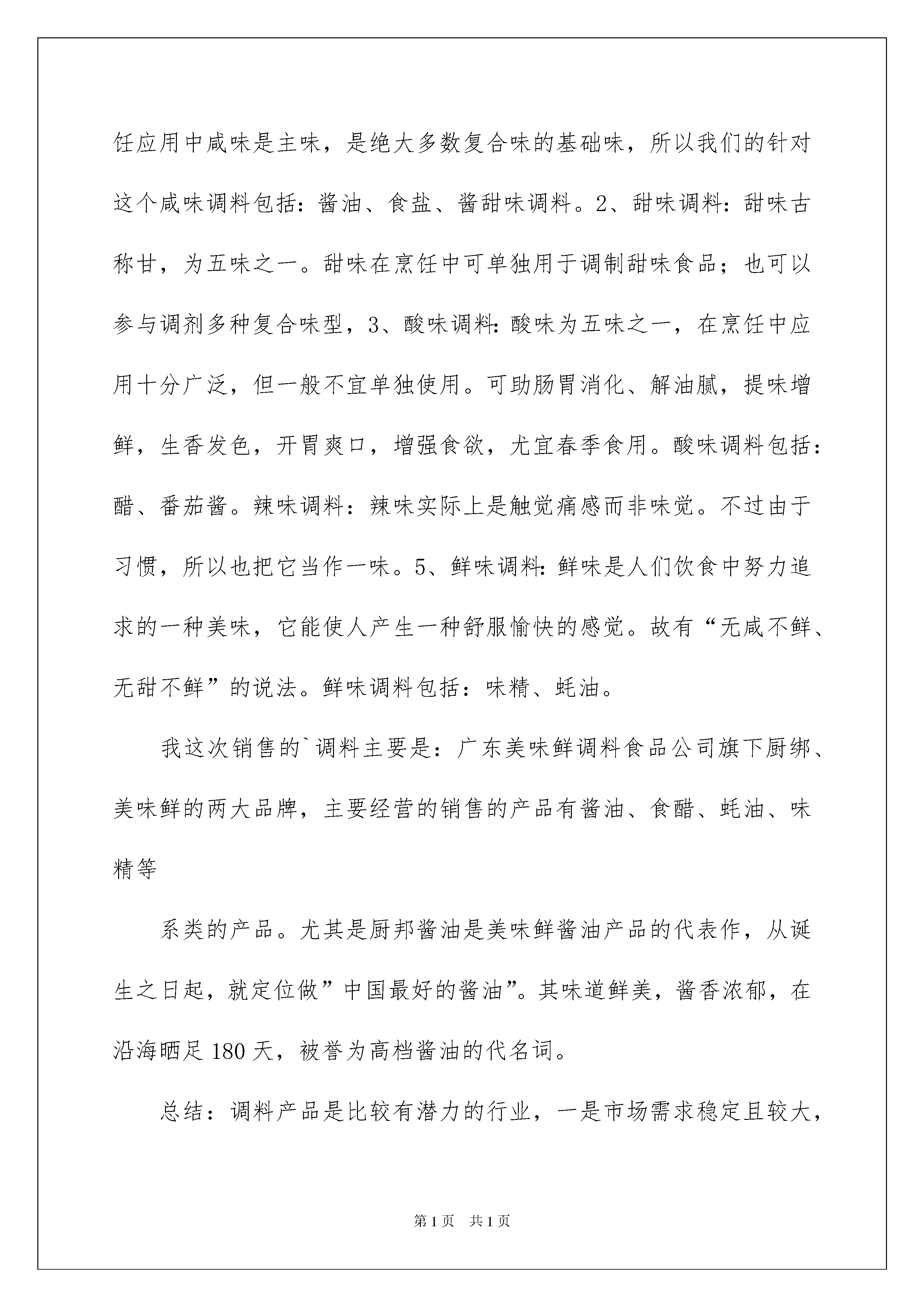 2022销售类实习报告三篇销售类实习报告三篇在当下社会,报告的适用范围越来越广泛,不同种类的报告具有不同的用途。写起报告来就毫无头绪?以下是我整理的销售类实习报告3篇,希望能够帮助到大家。销售类实习报告篇1为期一个星期的实习即将结束,回想起这一个星期的生活,一个人在新的环境里,应对新的人际关系,面对新的生活,苦当然是有的,但是乐在其中。因为任何知识都源于实践,所以需要这段时间的实习将学校所学理论知识付诸实践,让其来检验所学。然而,并不能仅仅将实践的意义定义于此,我们还要从实践中总结经验教训,为以后如何更好的工作打下坚实的基础。人往往都是这样,没有经历过的话,永远都不知道事情到底是怎么一个样子,是真的那么难,还是并非如此,所以,不管怎么样,即使是自己完全陌生的事情,只要有机会,都一定要去尝试,努力去做好。因为没有经验,那么就需要做更多的准备工作。另外就是不要害怕失败,只要用心去做就可以了。等到熟练了,那么成功将是水到渠成的事情。只有通过不断的努力,不断的尝试,不断的积累经验,才能够发现自己的不足,然后在弥补不足的时候,我们便实实在在的提高了自己。进入公司之前,自己对销售知识只是大概的了解,没有系统的学习过市场营销中所包含的全部,一个礼拜的实习,就是:多看,多问,多观察,多思考。自己了解一些公司的背景、产品、发展方向等。另外,多跟自己导师沟通,因从交谈中也能够学到不东西,每当我出去跟客户沟通时总是很不好意思说话,说话和蔼的有点吞吞吐吐,不过客户还是个蛮和蔼的。经过一个星期的实习现在的我不扭扭捏捏,而是大大方方把我们的产品介绍给客户,当然有事也会遇到很严厉的客户,不过在我的耐心和细心下,客户从开始的态度生硬变的柔和多了,有时遇到有经验的客户,也会告诉我们一些经验让我受益匪浅,一席话下来,这个客户的生意就促成了,从中我懂得了生意上的交流是需要下功夫的,自己得好好努力。我这次实习主要面对销售的是调料市场,经过这星期的实习我把调料主要分为五大类:1、咸味调料:咸味自古就被列为五味之一。烹饪应用中咸味是主味,是绝大多数复合味的基础味,所以我们的针对这个咸味调料包括:酱油、食盐、酱甜味调料。2、甜味调料:甜味古称甘,为五味之一。甜味在烹饪中可单独用于调制甜味食品;也可以参与调剂多种复合味型,3、酸味调料:酸味为五味之一,在烹饪中应用十分广泛,但一般不宜单独使用。可助肠胃消化、解油腻,提味增鲜,生香发色,开胃爽口,增强食欲,尤宜春季食用。酸味调料包括:醋、番茄酱。辣味调料:辣味实际上是触觉痛感而非味觉。不过由于习惯,所以也把它当作一味。5、鲜味调料:鲜味是人们饮食中努力追求的一种美味,它能使人产生一种舒服愉快的感觉。故有“无咸不鲜、无甜不鲜”的说法。鲜味调料包括:味精、蚝油。我这次销售的`调料主要是:广东美味鲜调料食品公司旗下厨绑、美味鲜的两大品牌,主要经营的销售的产品有酱油、食醋、蚝油、味精等系类的产品。尤其是厨邦酱油是美味鲜酱油产品的代表作,从诞生之日起,就定位做”中国最好的酱油”。其味道鲜美,酱香浓郁,在沿海晒足180天,被誉为高档酱油的代名词。总结:调料产品是比较有潜力的行业,一是市场需求稳定且较大,二是作为农业的延伸,政府有扶持之意。消费人群主要是:目前对大型超市的依赖度是非常大的。其次就是餐饮业的需求比较大。最后就是家庭的需求。通过这次实习,让我对社会有了个基本的了解,也同时对自己的适应能力有了个基本的评估。社会随着时间进步,人随着时间成长,但社会的进步是全体人类的共同努力结果,并不是个人可以做到,所以我必须尽快提示自己。通过这次实践,让我懂得了要了解一个事物,首先就必须去接触它,虽然可能会失败,但是如果你不去接触,你连失败的机会都没有,失败并不代表结束,失败只是为下次成功提供难能可贵的经验而已。实践让我们成长,我也从实践中有所收获,做事要注重细节,即使很小,也会改变很多,连锁效应常常出乎我们的意料。当拿到自己的劳动成果的时候,不禁暗暗叹气,现代社会,想要生活,尤其是想得到好好的生活,需要付出的努力是不可估量的,人可以为某新事物奋斗,但是人很多时候是没有信心为失败去奋斗的,这样就决定了这个社会上成功者并不多,成功也不会是偶然,必须具备各种良好的素质,心理抗压能力也很重要。工作往往不是一个人的事情,是一个团队在完成一个项目,在工作的过程中,如何去保持和团队中其他同事的交流和沟通也是相当重要的。一位资深人力资源专家曾对团队精神的能力要求有这样的观点:要有与别人沟通、交流的能力以及与人合作的能力。合理的分工可以使大家在工作中各尽所长,团结合作,配合默契,共赴成功。个人要想成功及获得好