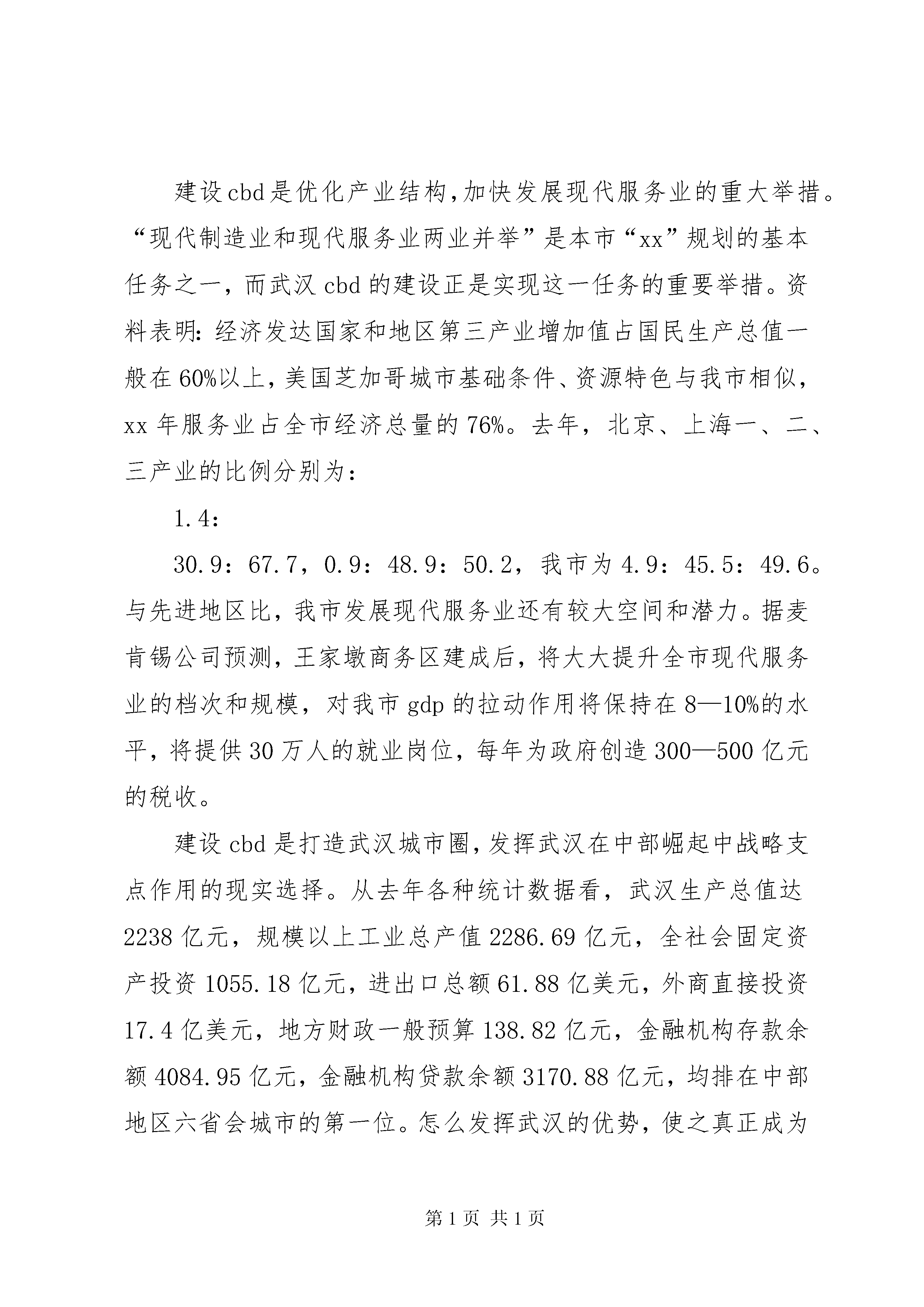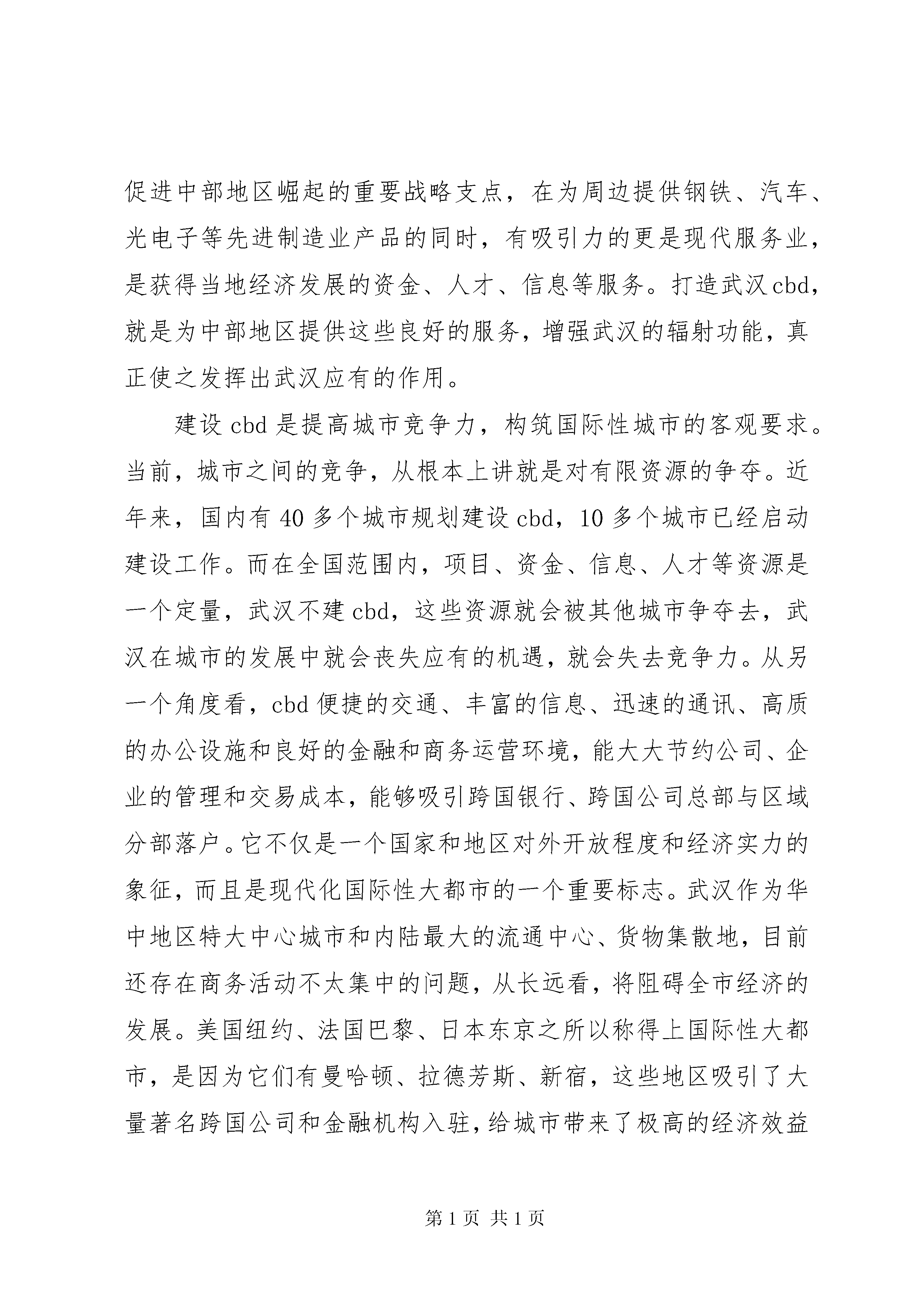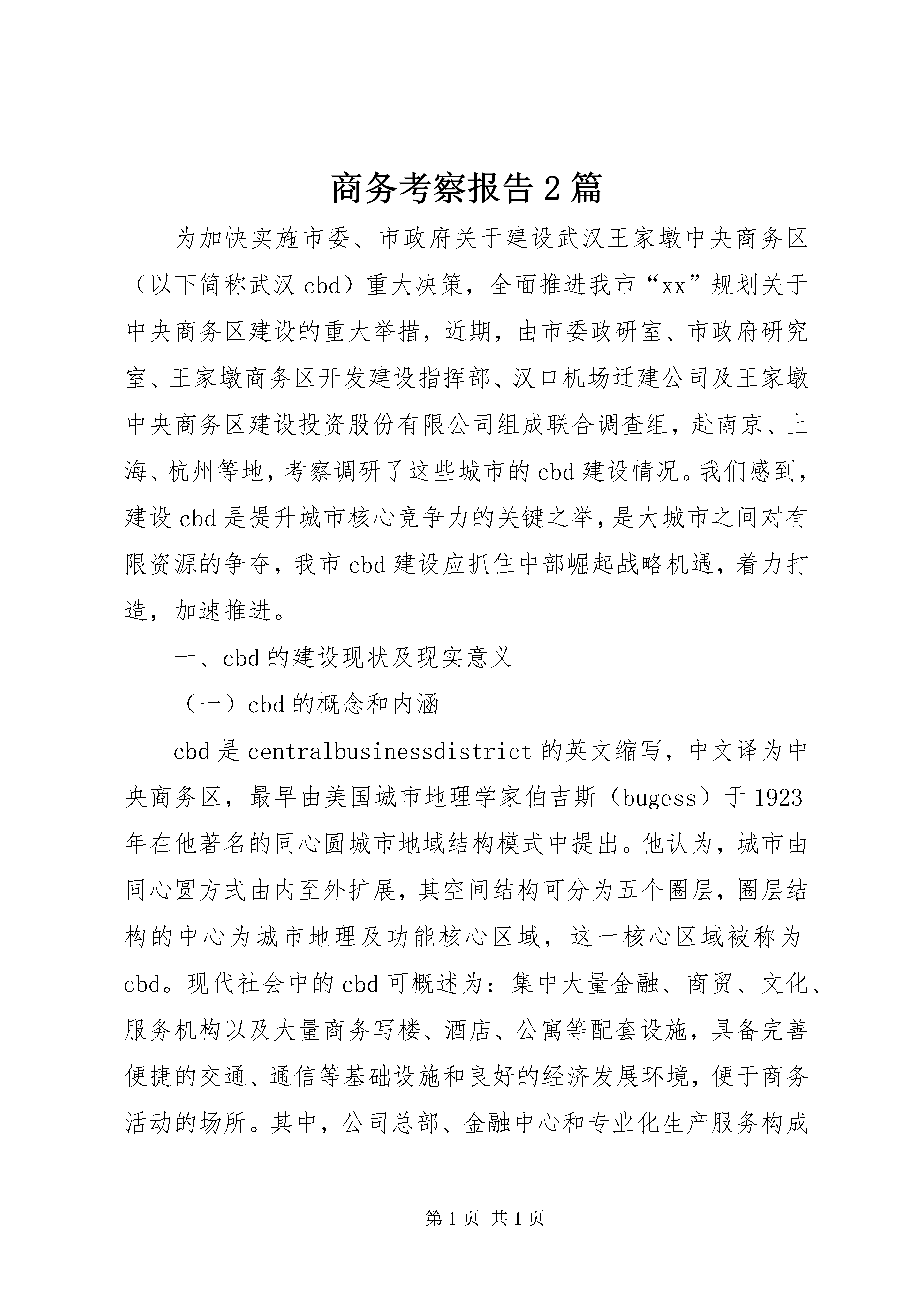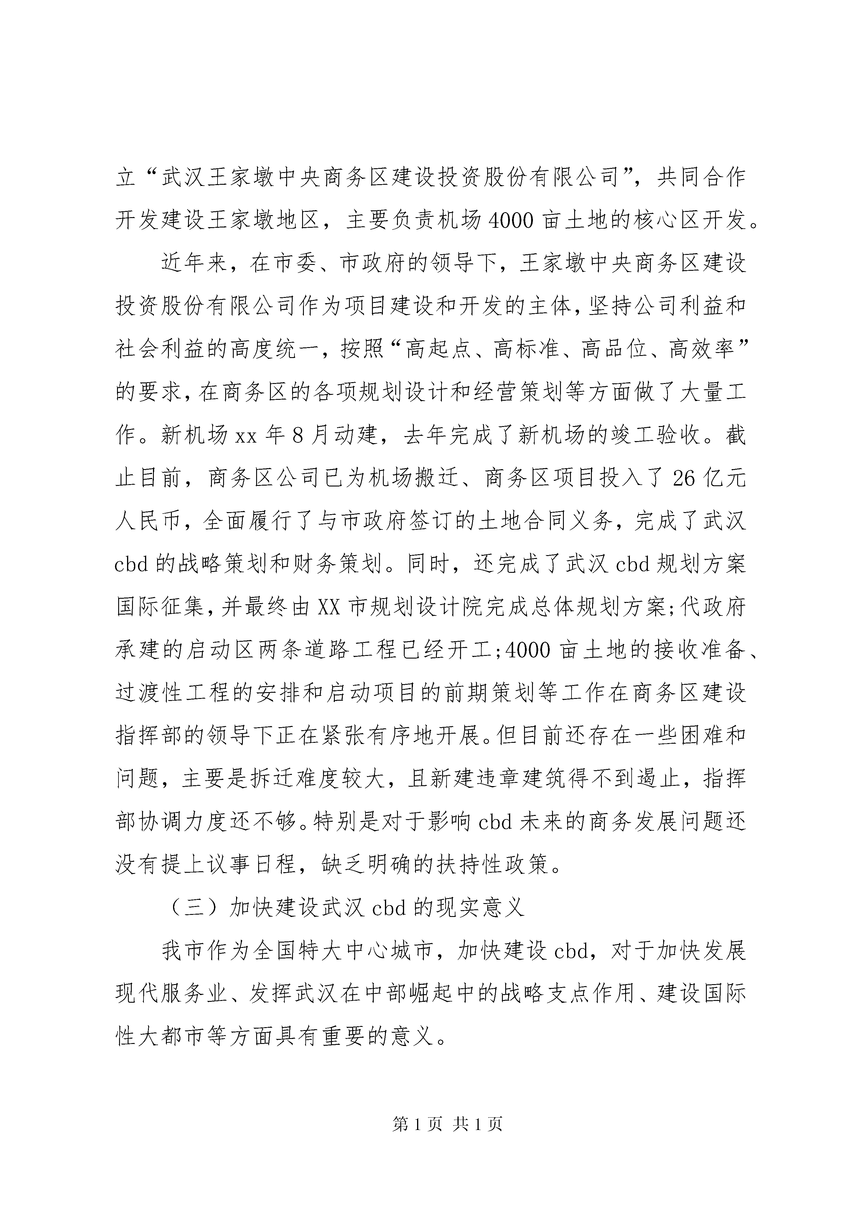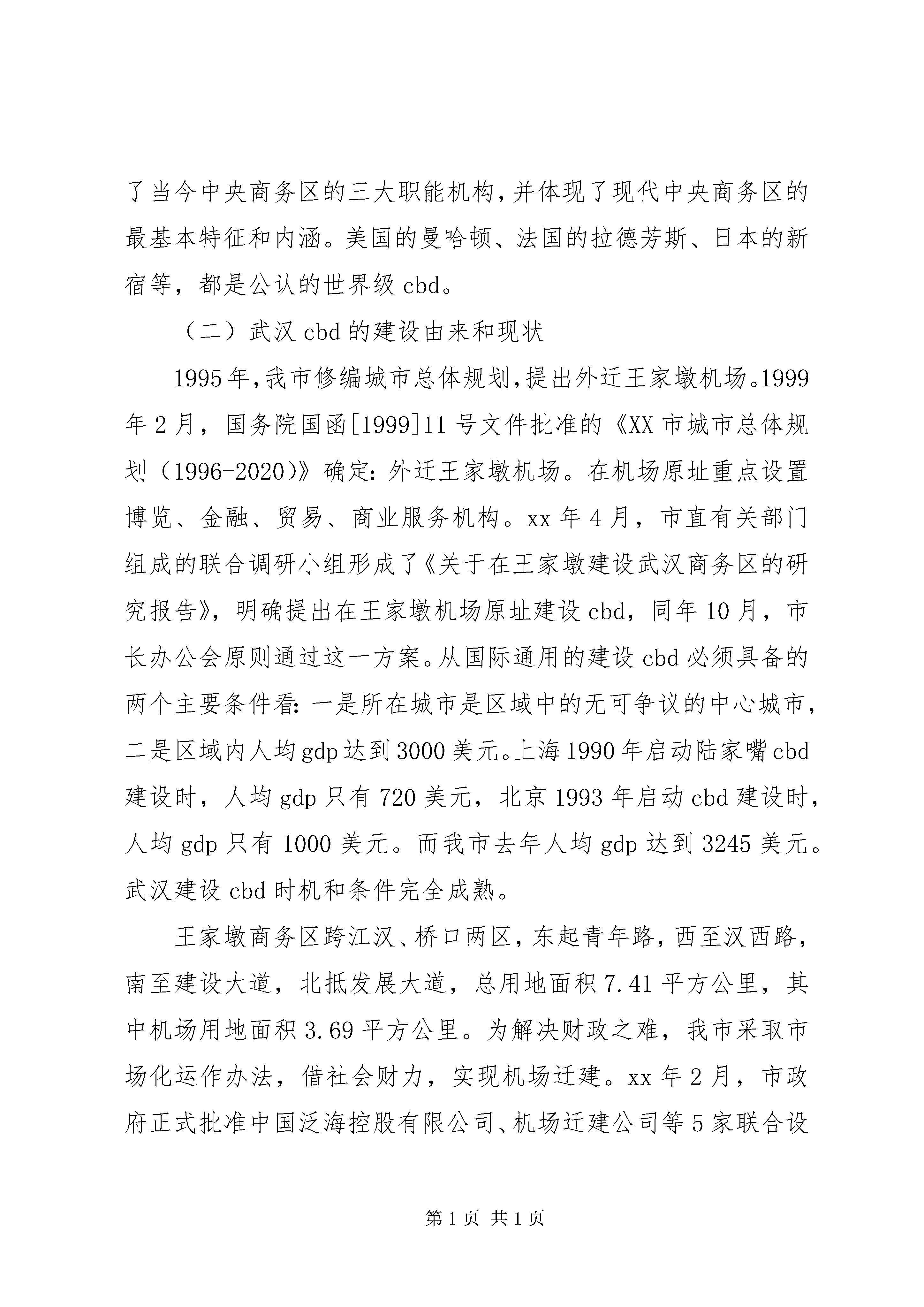 商务考察报告2篇为加快实施市委、市政府关于建设武汉王家墩中央商务区(以下简称武汉cbd)重大决策,全面推进我市“xx”规划关于中央商务区建设的重大举措,近期,由市委政研室、市政府研究室、王家墩商务区开发建设指挥部、汉口机场迁建公司及王家墩中央商务区建设投资股份有限公司组成联合调查组,赴南京、上海、杭州等地,考察调研了这些城市的cbd建设情况。我们感到,建设cbd是提升城市核心竞争力的关键之举,是大城市之间对有限资源的争夺,我市cbd建设应抓住中部崛起战略机遇,着力打造,加速推进。一、cbd的建设现状及现实意义(一)cbd的概念和内涵cbd是centralbusinessdistrict的英文缩写,中文译为中央商务区,最早由美国城市地理学家伯吉斯(bugess)于1923年在他著名的同心圆城市地域结构模式中提出。他认为,城市由同心圆方式由内至外扩展,其空间结构可分为五个圈层,圈层结构的中心为城市地理及功能核心区域,这一核心区域被称为cbd。现代社会中的cbd可概述为:集中大量金融、商贸、文化、服务机构以及大量商务写楼、酒店、公寓等配套设施,具备完善便捷的交通、通信等基础设施和良好的经济发展环境,便于商务活动的场所。其中,公司总部、金融中心和专业化生产服务构成了当今中央商务区的三大职能机构,并体现了现代中央商务区的最基本特征和内涵。美国的曼哈顿、法国的拉德芳斯、日本的新宿等,都是公认的世界级cbd。(二)武汉cbd的建设由来和现状1995年,我市修编城市总体规划,提出外迁王家墩机场。1999年2月,国务院国函[1999]11号文件批准的《XX市城市总体规划(1996-2020)》确定:外迁王家墩机场。在机场原址重点设置博览、金融、贸易、商业服务机构。xx年4月,市直有关部门组成的联合调研小组形成了《关于在王家墩建设武汉商务区的研究报告》,明确提出在王家墩机场原址建设cbd,同年10月,市长办公会原则通过这一方案。从国际通用的建设cbd必须具备的两个主要条件看:一是所在城市是区域中的无可争议的中心城市,二是区域内人均gdp达到3000美元。上海1990年启动陆家嘴cbd建设时,人均gdp只有720美元,北京1993年启动cbd建设时,人均gdp只有1000美元。而我市去年人均gdp达到3245美元。武汉建设cbd时机和条件完全成熟。王家墩商务区跨江汉、桥口两区,东起青年路,西至汉西路,南至建设大道,北抵发展大道,总用地面积7.41平方公里,其中机场用地面积3.69平方公里。为解决财政之难,我市采取市场化运作办法,借社会财力,实现机场迁建。xx年2月,市政府正式批准中国泛海控股有限公司、机场迁建公司等5家联合设立“武汉王家墩中央商务区建设投资股份有限公司”,共同合作开发建设王家墩地区,主要负责机场4000亩土地的核心区开发。近年来,在市委、市政府的领导下,王家墩中央商务区建设投资股份有限公司作为项目建设和开发的主体,坚持公司利益和社会利益的高度统一,按照“高起点、高标准、高品位、高效率”的要求,在商务区的各项规划设计和经营策划等方面做了大量工作。新机场xx年8月动建,去年完成了新机场的竣工验收。截止目前,商务区公司已为机场搬迁、商务区项目投入了26亿元人民币,全面履行了与市政府签订的土地合同义务,完成了武汉cbd的战略策划和财务策划。同时,还完成了武汉cbd规划方案国际征集,并最终由XX市规划设计院完成总体规划方案;代政府承建的启动区两条道路工程已经开工;4000亩土地的接收准备、过渡性工程的安排和启动项目的前期策划等工作在商务区建设指挥部的领导下正在紧张有序地开展。但目前还存在一些困难和问题,主要是拆迁难度较大,且新建违章建筑得不到遏止,指挥部协调力度还不够。特别是对于影响cbd未来的商务发展问题还没有提上议事日程,缺乏明确的扶持性政策。(三)加快建设武汉cbd的现实意义我市作为全国特大中心城市,加快建设cbd,对于加快发展现代服务业、发挥武汉在中部崛起中的战略支点作用、建设国际性大都市等方面具有重要的意义。建设cbd是优化产业结构,加快发展现代服务业的重大举措。“现代制造业和现代服务业两业并举”是本市“xx”规划的基本任务之一,而武汉cbd的建设正是实现这一任务的重要举措。资料表明:经济发达国家和地区第三产业增加值占国民生产总值一般在60%以上,美国芝加哥城市基础条件、资源特色与我市相似,xx年服务业占全市经济总量的76%。去年,北京、上海一、二、三产业的比例分别为:1.4:30.9:67.7,0.9:48.9:50.2,我市为4.9:45.5:49.6。与先进地区比,我市发展现代服务业还有较大空间和潜力。据麦肯锡公司预测,王家墩商务区建成后,将大大提升全市现代服务业的档次和规模,对我市gdp的拉动作用将