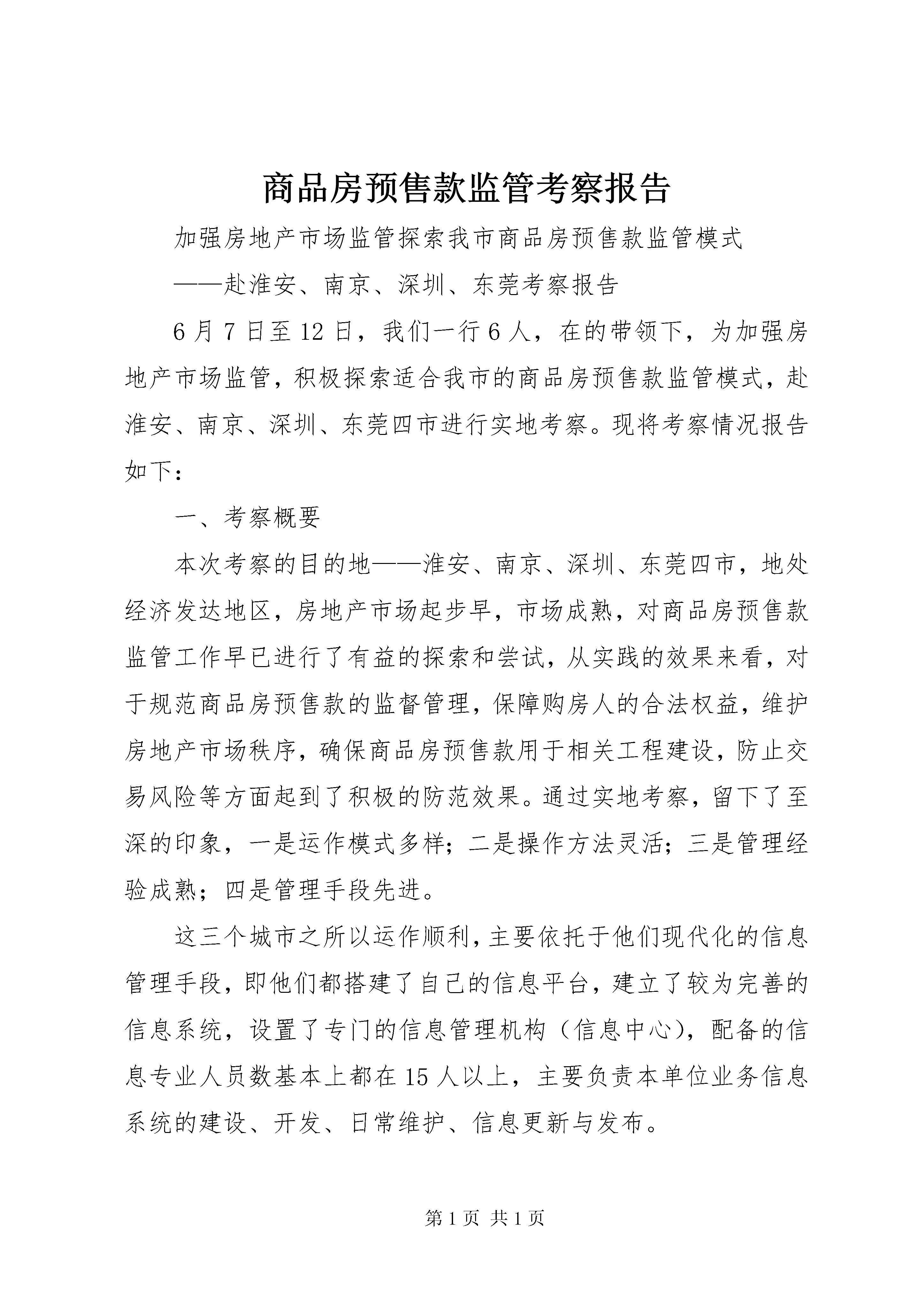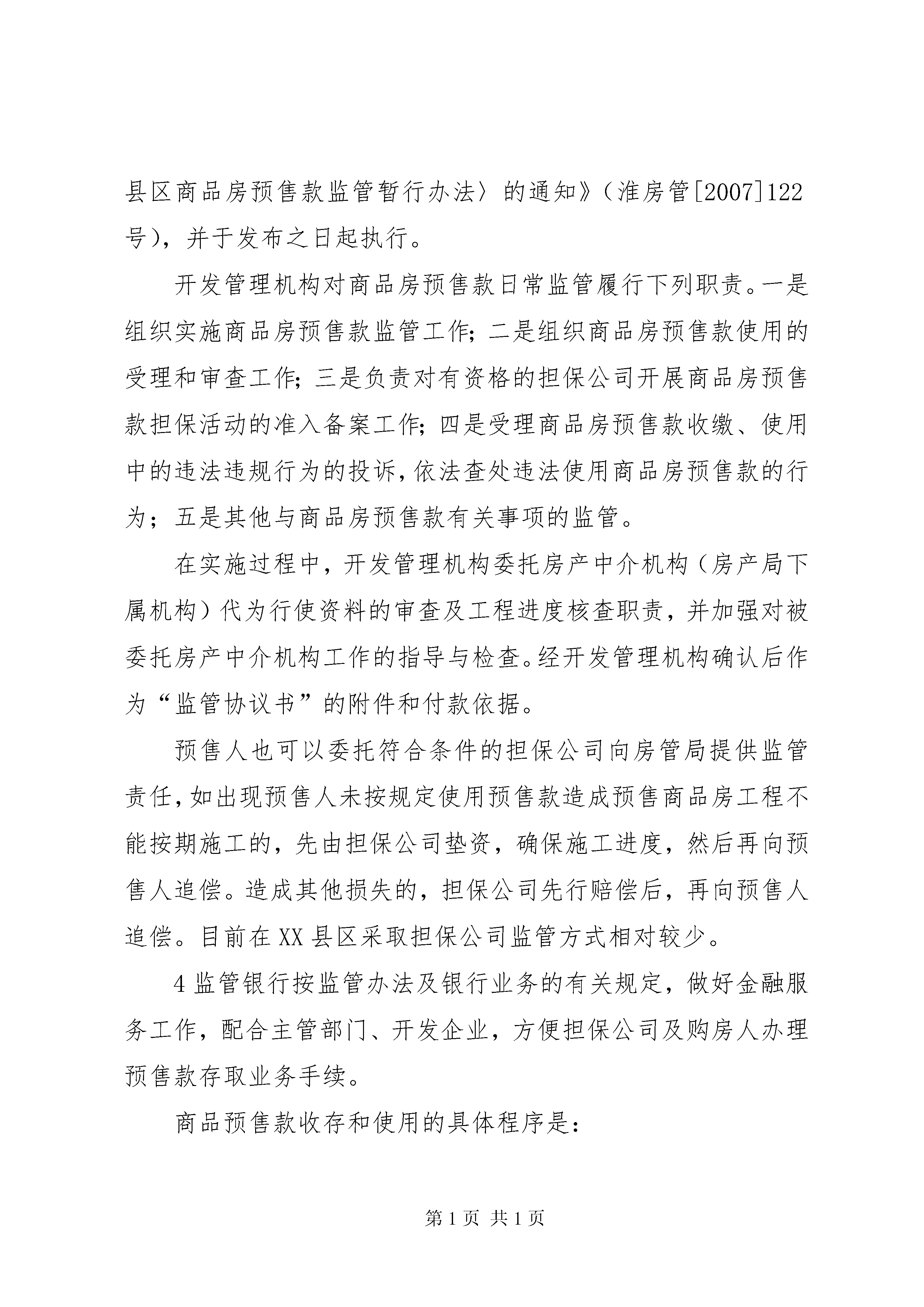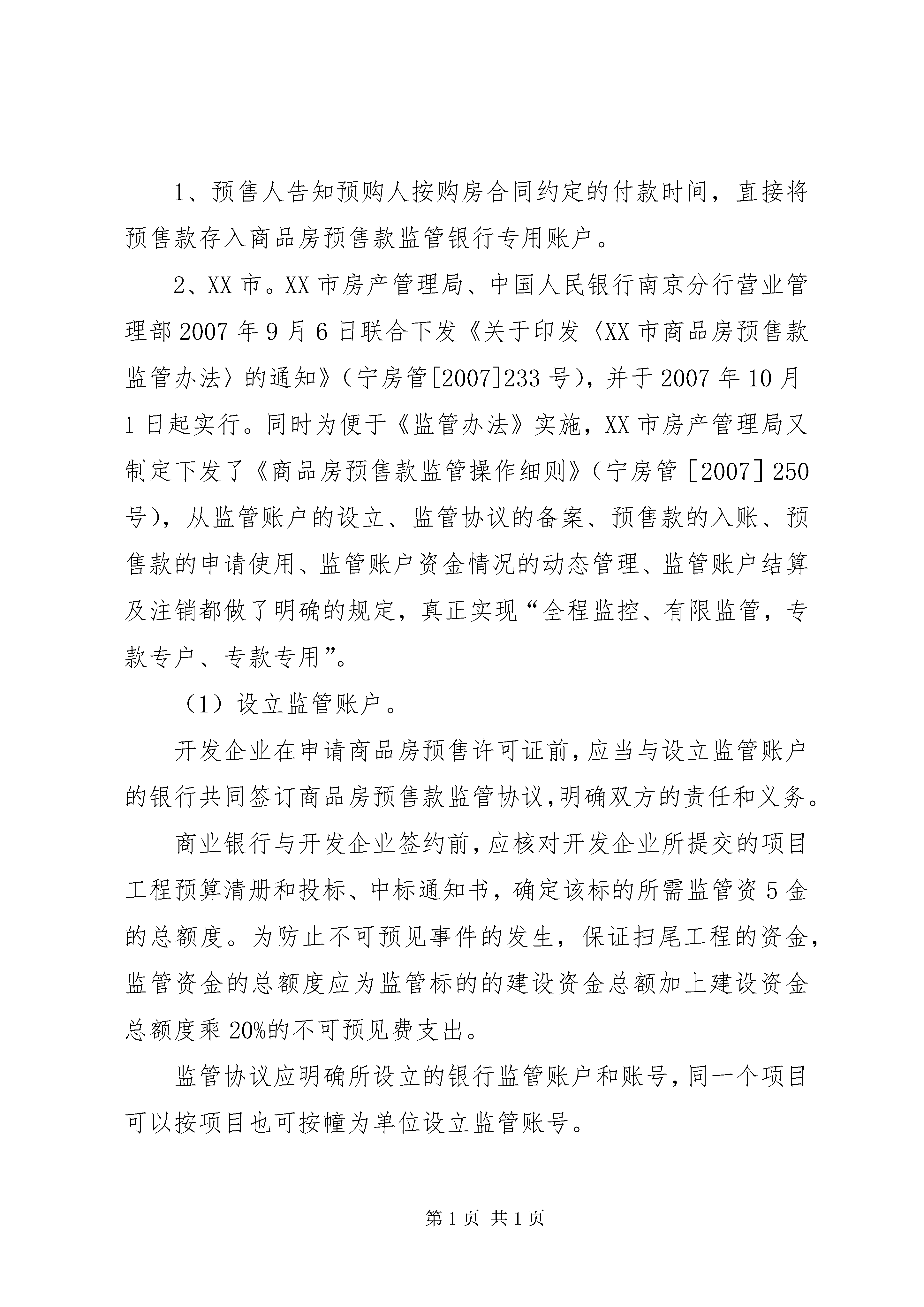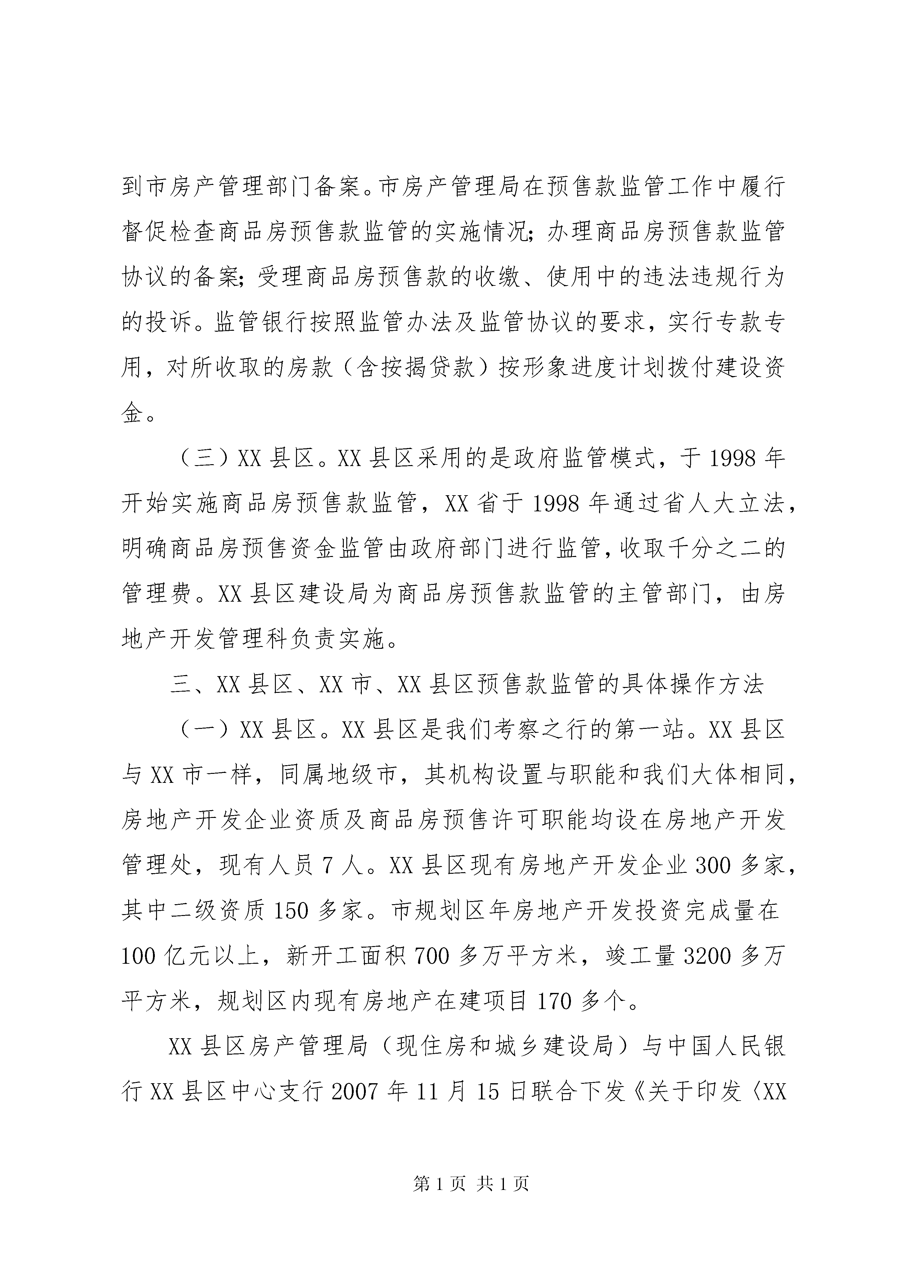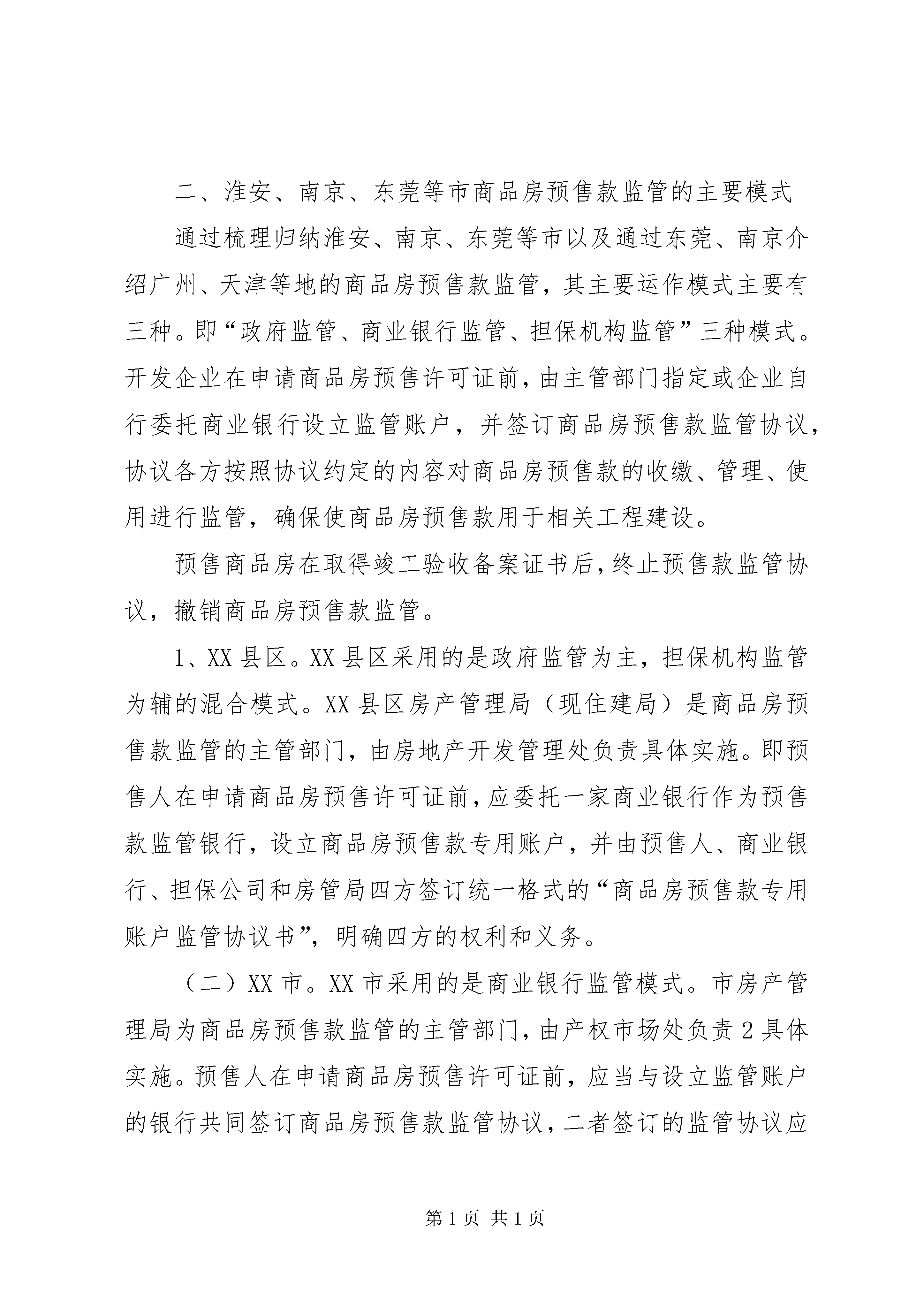 商品房预售款监管考察报告加强房地产市场监管探索我市商品房预售款监管模式——赴淮安、南京、深圳、东莞考察报告6月7日至12日,我们一行6人,在的带领下,为加强房地产市场监管,积极探索适合我市的商品房预售款监管模式,赴淮安、南京、深圳、东莞四市进行实地考察。现将考察情况报告如下:一、考察概要本次考察的目的地——淮安、南京、深圳、东莞四市,地处经济发达地区,房地产市场起步早,市场成熟,对商品房预售款监管工作早已进行了有益的探索和尝试,从实践的效果来看,对于规范商品房预售款的监督管理,保障购房人的合法权益,维护房地产市场秩序,确保商品房预售款用于相关工程建设,防止交易风险等方面起到了积极的防范效果。通过实地考察,留下了至深的印象,一是运作模式多样;二是操作方法灵活;三是管理经验成熟;四是管理手段先进。这三个城市之所以运作顺利,主要依托于他们现代化的信息管理手段,即他们都搭建了自己的信息平台,建立了较为完善的信息系统,设置了专门的信息管理机构(信息中心),配备的信息专业人员数基本上都在15人以上,主要负责本单位业务信息系统的建设、开发、日常维护、信息更新与发布。二、淮安、南京、东莞等市商品房预售款监管的主要模式通过梳理归纳淮安、南京、东莞等市以及通过东莞、南京介绍广州、天津等地的商品房预售款监管,其主要运作模式主要有三种。即“政府监管、商业银行监管、担保机构监管”三种模式。开发企业在申请商品房预售许可证前,由主管部门指定或企业自行委托商业银行设立监管账户,并签订商品房预售款监管协议,协议各方按照协议约定的内容对商品房预售款的收缴、管理、使用进行监管,确保使商品房预售款用于相关工程建设。预售商品房在取得竣工验收备案证书后,终止预售款监管协议,撤销商品房预售款监管。1、XX县区。XX县区采用的是政府监管为主,担保机构监管为辅的混合模式。XX县区房产管理局(现住建局)是商品房预售款监管的主管部门,由房地产开发管理处负责具体实施。即预售人在申请商品房预售许可证前,应委托一家商业银行作为预售款监管银行,设立商品房预售款专用账户,并由预售人、商业银行、担保公司和房管局四方签订统一格式的“商品房预售款专用账户监管协议书”,明确四方的权利和义务。(二)XX市。XX市采用的是商业银行监管模式。市房产管理局为商品房预售款监管的主管部门,由产权市场处负责2具体实施。预售人在申请商品房预售许可证前,应当与设立监管账户的银行共同签订商品房预售款监管协议,二者签订的监管协议应到市房产管理部门备案。市房产管理局在预售款监管工作中履行督促检查商品房预售款监管的实施情况;办理商品房预售款监管协议的备案;受理商品房预售款的收缴、使用中的违法违规行为的投诉。监管银行按照监管办法及监管协议的要求,实行专款专用,对所收取的房款(含按揭贷款)按形象进度计划拨付建设资金。(三)XX县区。XX县区采用的是政府监管模式,于1998年开始实施商品房预售款监管,XX省于1998年通过省人大立法,明确商品房预售资金监管由政府部门进行监管,收取千分之二的管理费。XX县区建设局为商品房预售款监管的主管部门,由房地产开发管理科负责实施。三、XX县区、XX市、XX县区预售款监管的具体操作方法(一)XX县区。XX县区是我们考察之行的第一站。XX县区与XX市一样,同属地级市,其机构设置与职能和我们大体相同,房地产开发企业资质及商品房预售许可职能均设在房地产开发管理处,现有人员7人。XX县区现有房地产开发企业300多家,其中二级资质150多家。市规划区年房地产开发投资完成量在100亿元以上,新开工面积700多万平方米,竣工量3200多万平方米,规划区内现有房地产在建项目170多个。XX县区房产管理局(现住房和城乡建设局)与中国人民银行XX县区中心支行2007年11月15日联合下发《关于印发〈XX县区商品房预售款监管暂行办法〉的通知》(淮房管[2007]122号),并于发布之日起执行。开发管理机构对商品房预售款日常监管履行下列职责。一是组织实施商品房预售款监管工作;二是组织商品房预售款使用的受理和审查工作;三是负责对有资格的担保公司开展商品房预售款担保活动的准入备案工作;四是受理商品房预售款收缴、使用中的违法违规行为的投诉,依法查处违法使用商品房预售款的行为;五是其他与商品房预售款有关事项的监管。在实施过程中,开发管理机构委托房产中介机构(房产局下属机构)代为行使资料的审查及工程进度核查职责,并加强对被委托房产中介机构工作的指导与检查。经开发管理机构确认后作为“监管协议书”的附件和付款依据。预售人也可以委托符合条件的担保公司向房管局提供监管责任,如出现预售人未按规定使用预售款造成预售商品房工程不能按期施工的,先由担保公司垫资,确保施工进度,然后再向预售人追偿。造成其他损失的,担保公