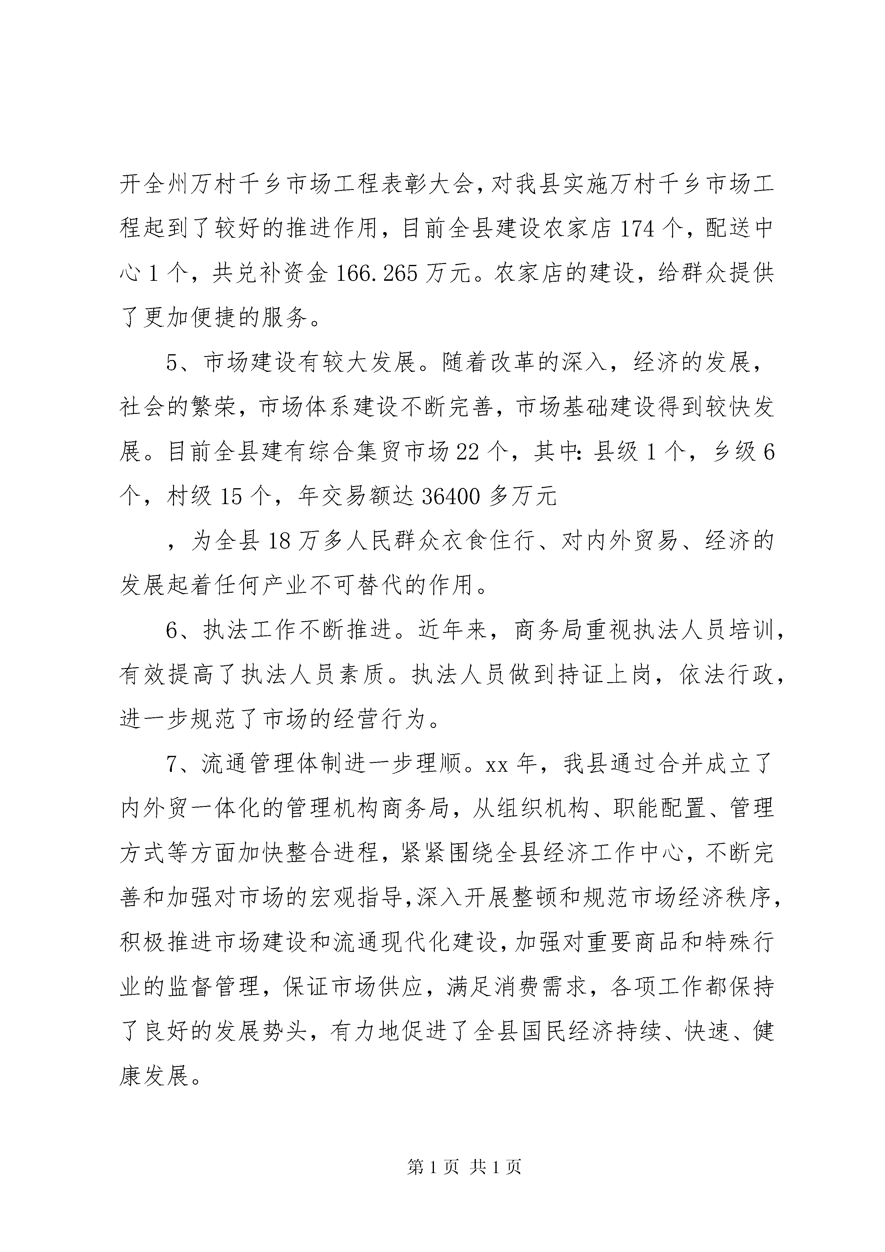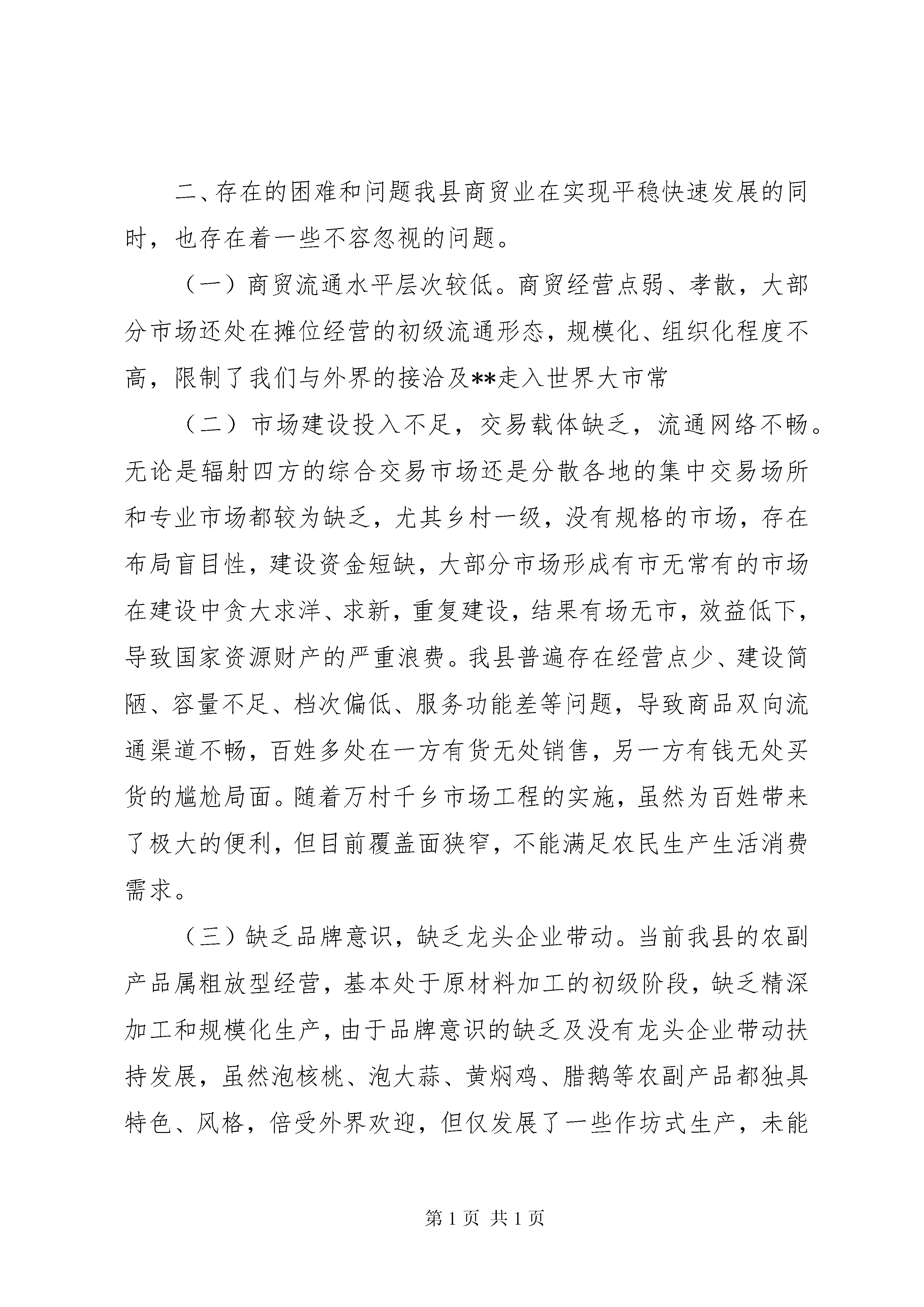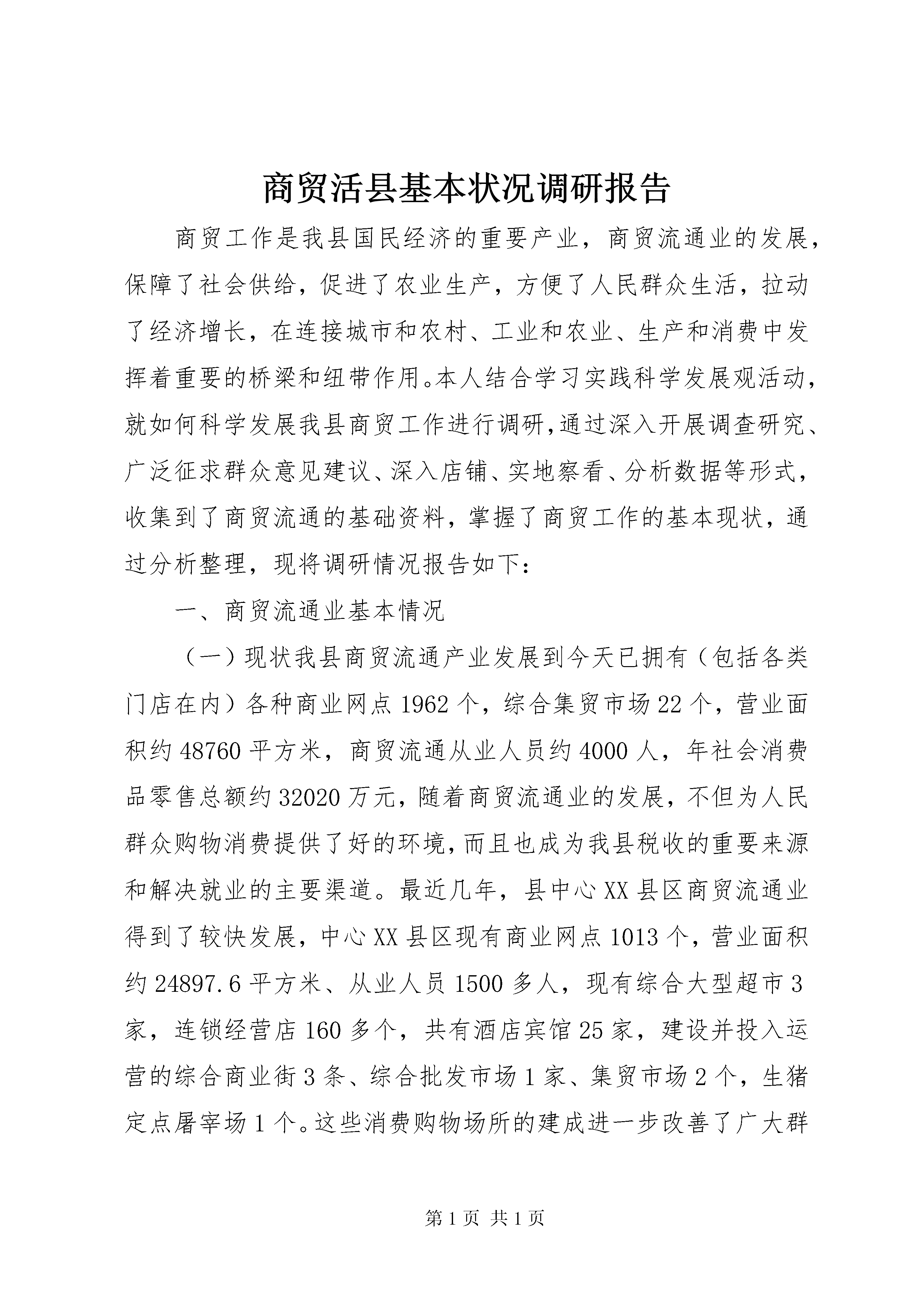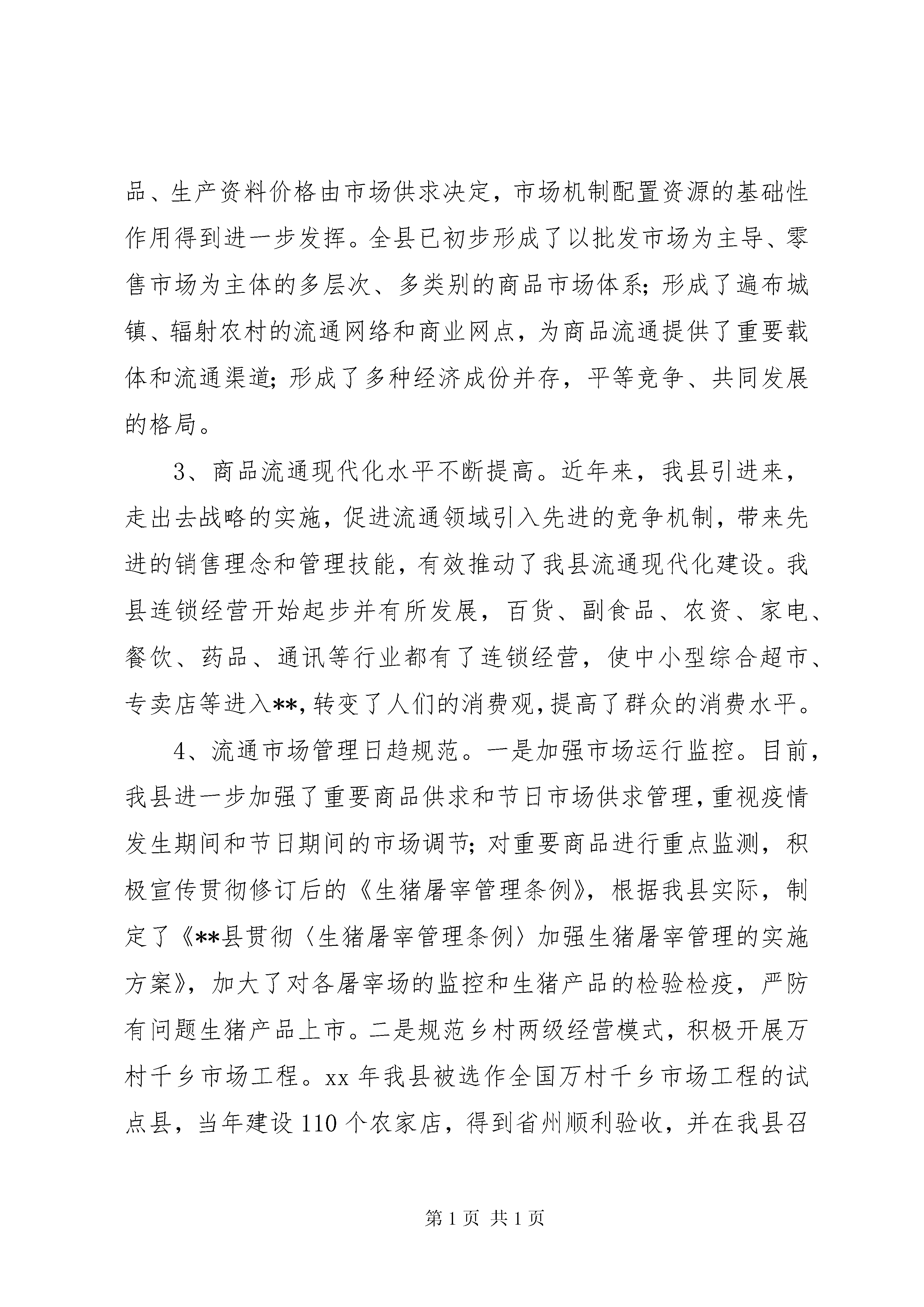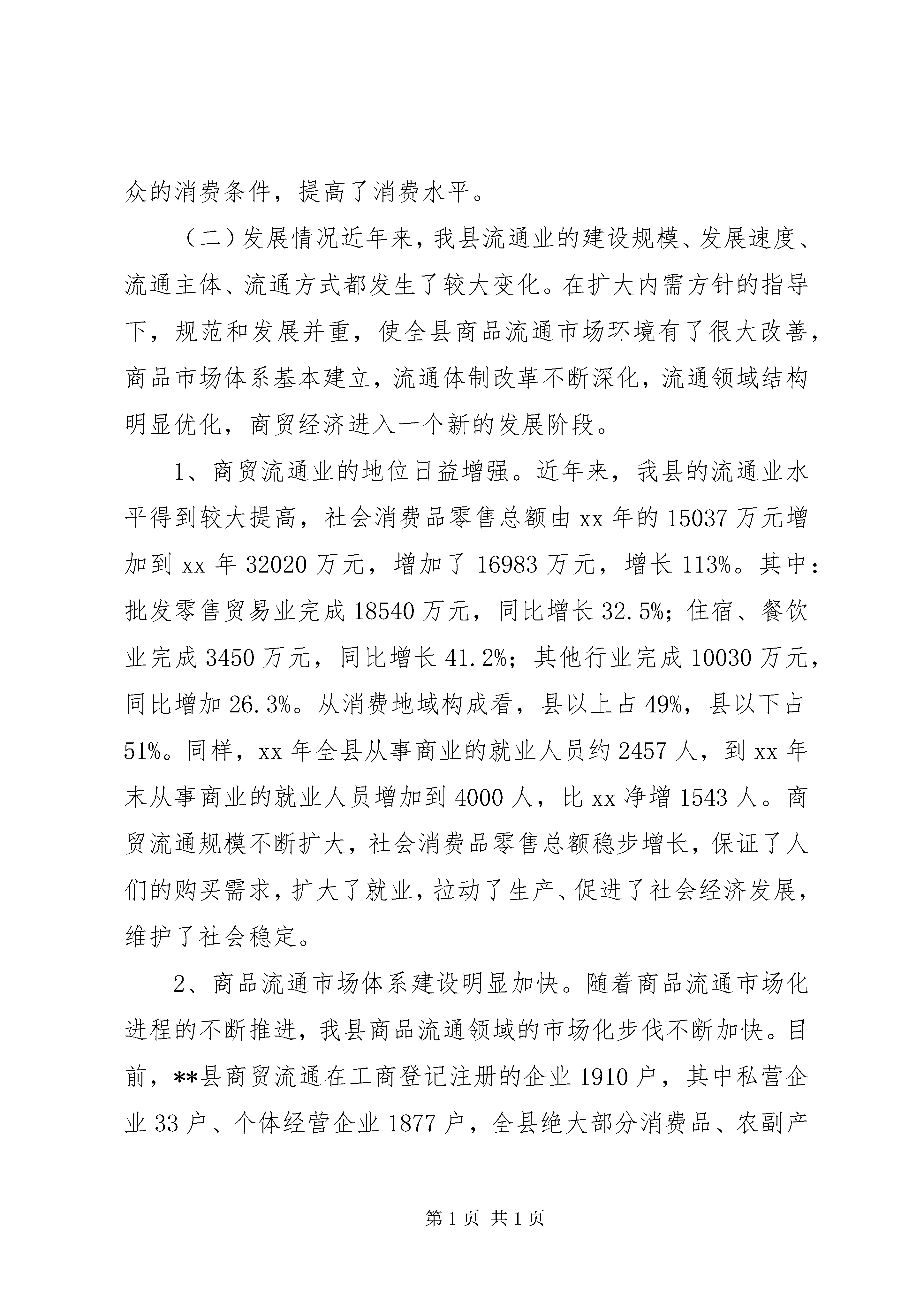 商贸活县基本状况调研报告商贸工作是我县国民经济的重要产业,商贸流通业的发展,保障了社会供给,促进了农业生产,方便了人民群众生活,拉动了经济增长,在连接城市和农村、工业和农业、生产和消费中发挥着重要的桥梁和纽带作用。本人结合学习实践科学发展观活动,就如何科学发展我县商贸工作进行调研,通过深入开展调查研究、广泛征求群众意见建议、深入店铺、实地察看、分析数据等形式,收集到了商贸流通的基础资料,掌握了商贸工作的基本现状,通过分析整理,现将调研情况报告如下:一、商贸流通业基本情况(一)现状我县商贸流通产业发展到今天已拥有(包括各类门店在内)各种商业网点1962个,综合集贸市场22个,营业面积约48760平方米,商贸流通从业人员约4000人,年社会消费品零售总额约32020万元,随着商贸流通业的发展,不但为人民群众购物消费提供了好的环境,而且也成为我县税收的重要来源和解决就业的主要渠道。最近几年,县中心XX县区商贸流通业得到了较快发展,中心XX县区现有商业网点1013个,营业面积约24897.6平方米、从业人员1500多人,现有综合大型超市3家,连锁经营店160多个,共有酒店宾馆25家,建设并投入运营的综合商业街3条、综合批发市场1家、集贸市场2个,生猪定点屠宰场1个。这些消费购物场所的建成进一步改善了广大群众的消费条件,提高了消费水平。(二)发展情况近年来,我县流通业的建设规模、发展速度、流通主体、流通方式都发生了较大变化。在扩大内需方针的指导下,规范和发展并重,使全县商品流通市场环境有了很大改善,商品市场体系基本建立,流通体制改革不断深化,流通领域结构明显优化,商贸经济进入一个新的发展阶段。1、商贸流通业的地位日益增强。近年来,我县的流通业水平得到较大提高,社会消费品零售总额由xx年的15037万元增加到xx年32020万元,增加了16983万元,增长113%。其中:批发零售贸易业完成18540万元,同比增长32.5%;住宿、餐饮业完成3450万元,同比增长41.2%;其他行业完成10030万元,同比增加26.3%。从消费地域构成看,县以上占49%,县以下占51%。同样,xx年全县从事商业的就业人员约2457人,到xx年末从事商业的就业人员增加到4000人,比xx净增1543人。商贸流通规模不断扩大,社会消费品零售总额稳步增长,保证了人们的购买需求,扩大了就业,拉动了生产、促进了社会经济发展,维护了社会稳定。2、商品流通市场体系建设明显加快。随着商品流通市场化进程的不断推进,我县商品流通领域的市场化步伐不断加快。目前,**县商贸流通在工商登记注册的企业1910户,其中私营企业33户、个体经营企业1877户,全县绝大部分消费品、农副产品、生产资料价格由市场供求决定,市场机制配置资源的基础性作用得到进一步发挥。全县已初步形成了以批发市场为主导、零售市场为主体的多层次、多类别的商品市场体系;形成了遍布城镇、辐射农村的流通网络和商业网点,为商品流通提供了重要载体和流通渠道;形成了多种经济成份并存,平等竞争、共同发展的格局。3、商品流通现代化水平不断提高。近年来,我县引进来,走出去战略的实施,促进流通领域引入先进的竞争机制,带来先进的销售理念和管理技能,有效推动了我县流通现代化建设。我县连锁经营开始起步并有所发展,百货、副食品、农资、家电、餐饮、药品、通讯等行业都有了连锁经营,使中小型综合超市、专卖店等进入**,转变了人们的消费观,提高了群众的消费水平。4、流通市场管理日趋规范。一是加强市场运行监控。目前,我县进一步加强了重要商品供求和节日市场供求管理,重视疫情发生期间和节日期间的市场调节;对重要商品进行重点监测,积极宣传贯彻修订后的《生猪屠宰管理条例》,根据我县实际,制定了《**县贯彻〈生猪屠宰管理条例〉加强生猪屠宰管理的实施方案》,加大了对各屠宰场的监控和生猪产品的检验检疫,严防有问题生猪产品上市。二是规范乡村两级经营模式,积极开展万村千乡市场工程。xx年我县被选作全国万村千乡市场工程的试点县,当年建设110个农家店,得到省州顺利验收,并在我县召开全州万村千乡市场工程表彰大会,对我县实施万村千乡市场工程起到了较好的推进作用,目前全县建设农家店174个,配送中心1个,共兑补资金166.265万元。农家店的建设,给群众提供了更加便捷的服务。5、市场建设有较大发展。随着改革的深入,经济的发展,社会的繁荣,市场体系建设不断完善,市场基础建设得到较快发展。目前全县建有综合集贸市场22个,其中:县级1个,乡级6个,村级15个,年交易额达36400多万元,为全县18万多人民群众衣食住行、对内外贸易、经济的发展起着任何产业不可替代的作用。6、执法工作不断推进。近年来,商务局重视执法人员培训,有效提高了执法人员素质。执法人员做到持证