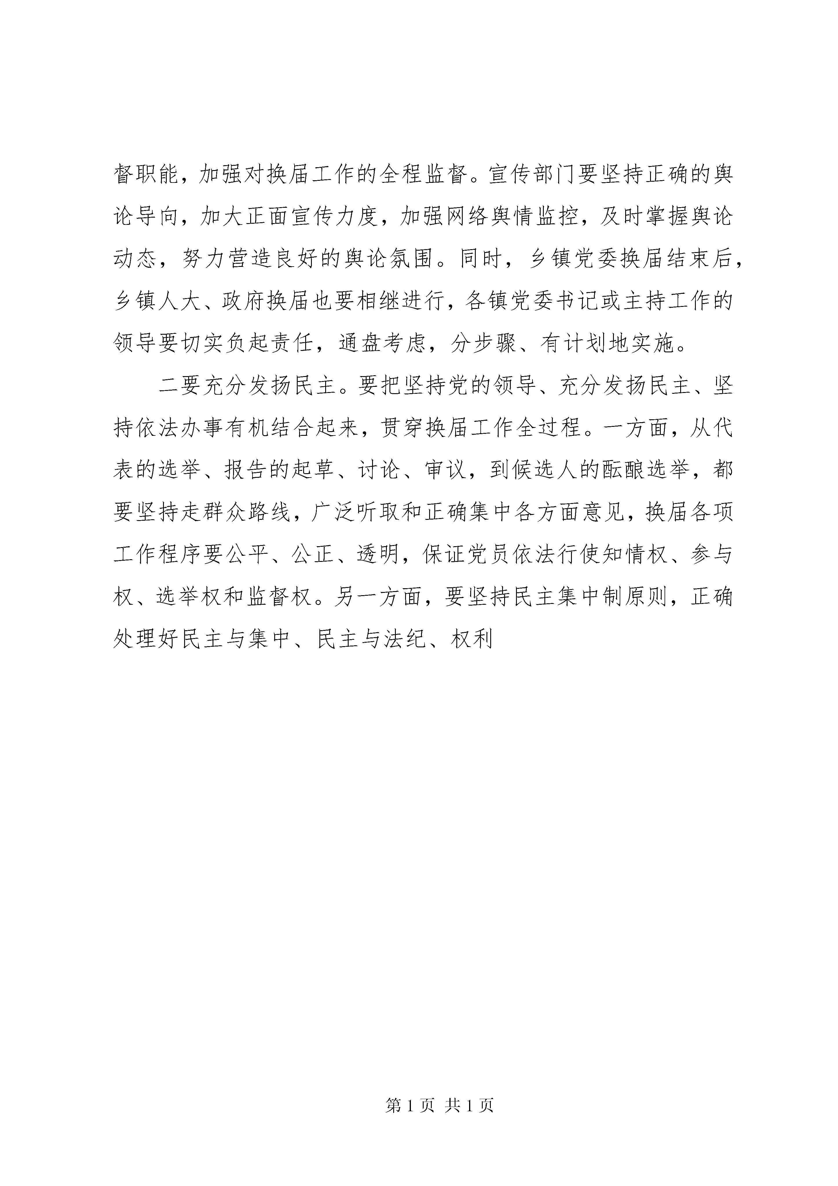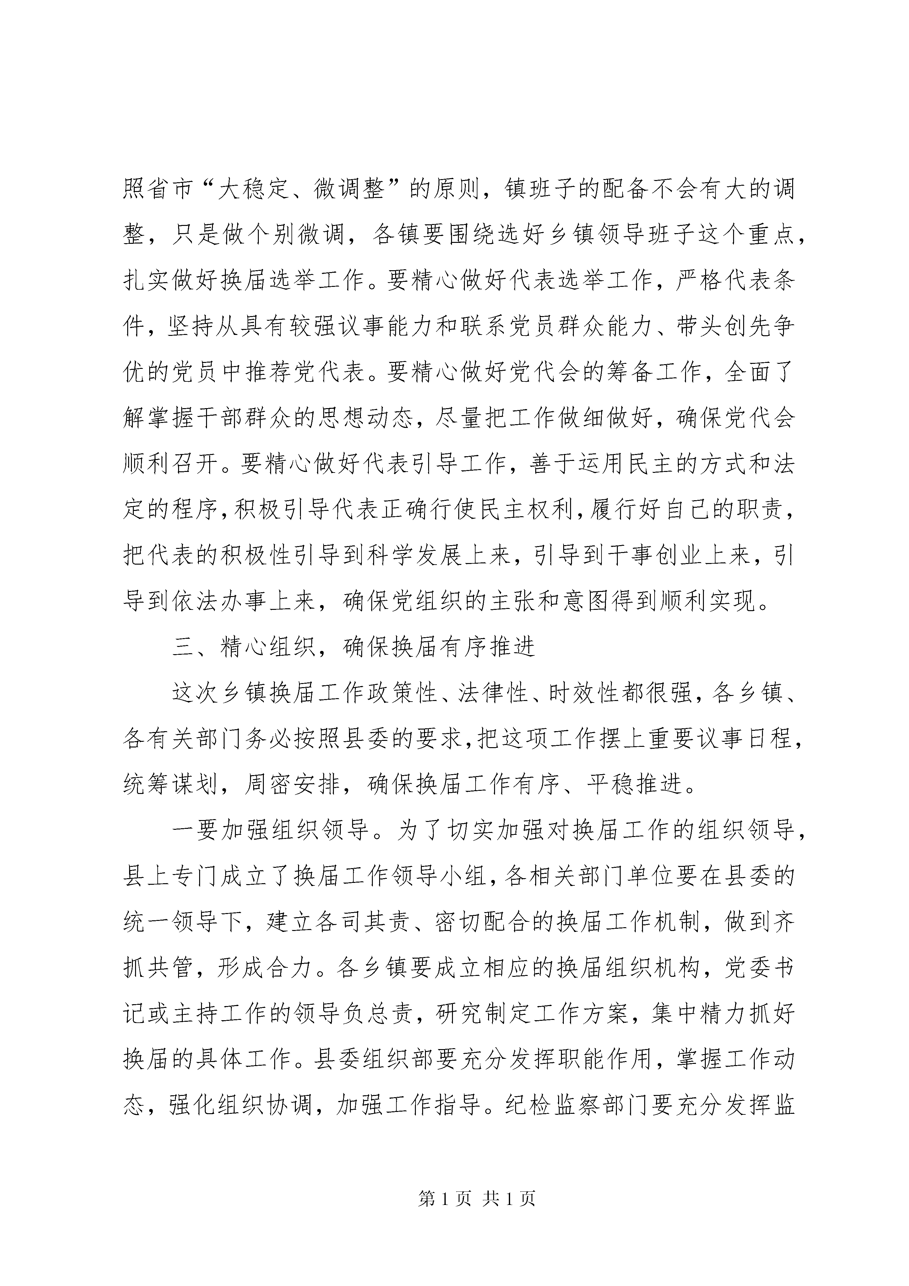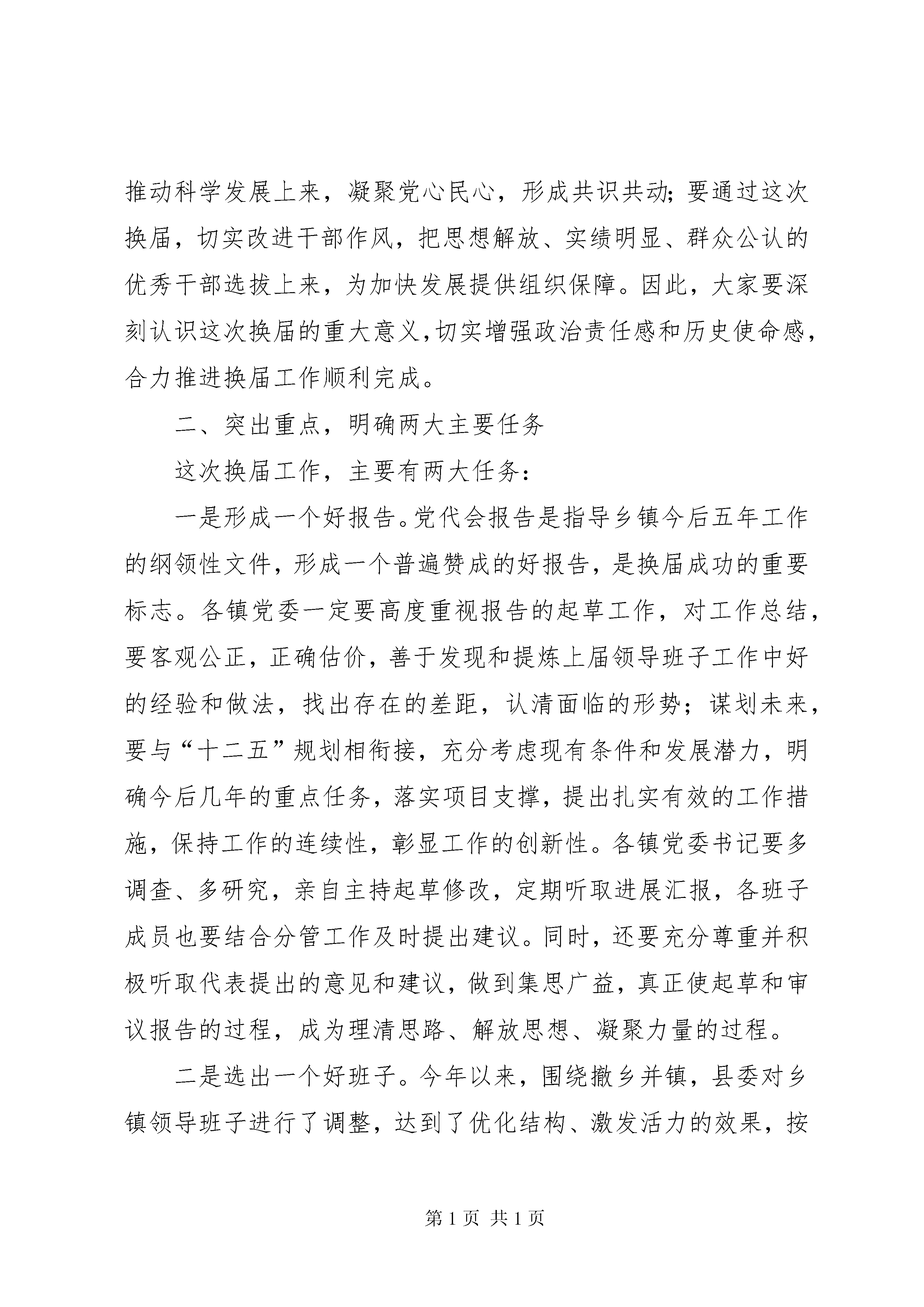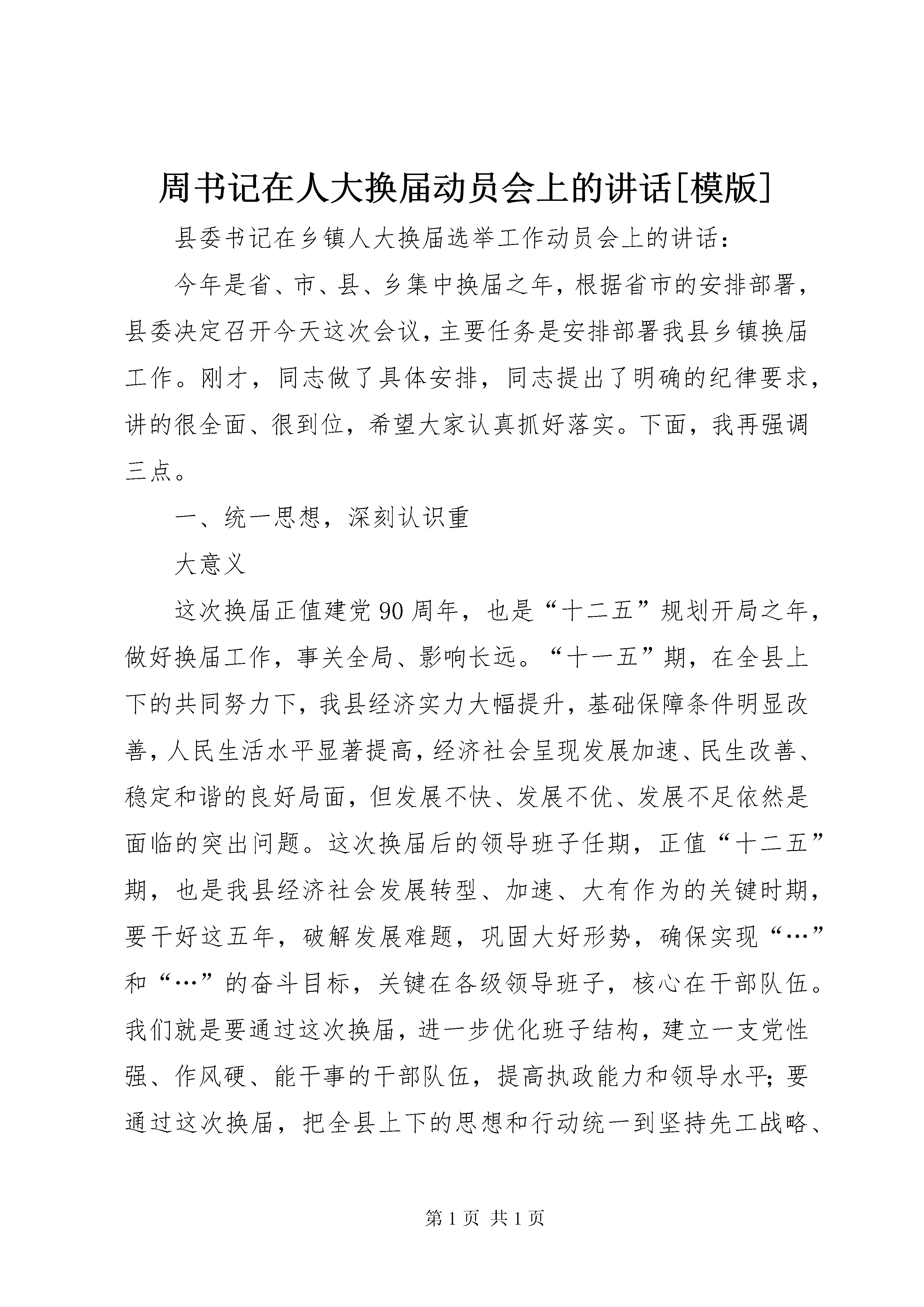 周书记在人大换届动员会上的讲话[模版]县委书记在乡镇人大换届选举工作动员会上的讲话:今年是省、市、县、乡集中换届之年,根据省市的安排部署,县委决定召开今天这次会议,主要任务是安排部署我县乡镇换届工作。刚才,同志做了具体安排,同志提出了明确的纪律要求,讲的很全面、很到位,希望大家认真抓好落实。下面,我再强调三点。一、统一思想,深刻认识重大意义这次换届正值建党90周年,也是“十二五”规划开局之年,做好换届工作,事关全局、影响长远。“十一五”期,在全县上下的共同努力下,我县经济实力大幅提升,基础保障条件明显改善,人民生活水平显著提高,经济社会呈现发展加速、民生改善、稳定和谐的良好局面,但发展不快、发展不优、发展不足依然是面临的突出问题。这次换届后的领导班子任期,正值“十二五”期,也是我县经济社会发展转型、加速、大有作为的关键时期,要干好这五年,破解发展难题,巩固大好形势,确保实现“…”和“…”的奋斗目标,关键在各级领导班子,核心在干部队伍。我们就是要通过这次换届,进一步优化班子结构,建立一支党性强、作风硬、能干事的干部队伍,提高执政能力和领导水平;要通过这次换届,把全县上下的思想和行动统一到坚持先工战略、推动科学发展上来,凝聚党心民心,形成共识共动;要通过这次换届,切实改进干部作风,把思想解放、实绩明显、群众公认的优秀干部选拔上来,为加快发展提供组织保障。因此,大家要深刻认识这次换届的重大意义,切实增强政治责任感和历史使命感,合力推进换届工作顺利完成。二、突出重点,明确两大主要任务这次换届工作,主要有两大任务:一是形成一个好报告。党代会报告是指导乡镇今后五年工作的纲领性文件,形成一个普遍赞成的好报告,是换届成功的重要标志。各镇党委一定要高度重视报告的起草工作,对工作总结,要客观公正,正确估价,善于发现和提炼上届领导班子工作中好的经验和做法,找出存在的差距,认清面临的形势;谋划未来,要与“十二五”规划相衔接,充分考虑现有条件和发展潜力,明确今后几年的重点任务,落实项目支撑,提出扎实有效的工作措施,保持工作的连续性,彰显工作的创新性。各镇党委书记要多调查、多研究,亲自主持起草修改,定期听取进展汇报,各班子成员也要结合分管工作及时提出建议。同时,还要充分尊重并积极听取代表提出的意见和建议,做到集思广益,真正使起草和审议报告的过程,成为理清思路、解放思想、凝聚力量的过程。二是选出一个好班子。今年以来,围绕撤乡并镇,县委对乡镇领导班子进行了调整,达到了优化结构、激发活力的效果,按照省市“大稳定、微调整”的原则,镇班子的配备不会有大的调整,只是做个别微调,各镇要围绕选好乡镇领导班子这个重点,扎实做好换届选举工作。要精心做好代表选举工作,严格代表条件,坚持从具有较强议事能力和联系党员群众能力、带头创先争优的党员中推荐党代表。要精心做好党代会的筹备工作,全面了解掌握干部群众的思想动态,尽量把工作做细做好,确保党代会顺利召开。要精心做好代表引导工作,善于运用民主的方式和法定的程序,积极引导代表正确行使民主权利,履行好自己的职责,把代表的积极性引导到科学发展上来,引导到干事创业上来,引导到依法办事上来,确保党组织的主张和意图得到顺利实现。三、精心组织,确保换届有序推进这次乡镇换届工作政策性、法律性、时效性都很强,各乡镇、各有关部门务必按照县委的要求,把这项工作摆上重要议事日程,统筹谋划,周密安排,确保换届工作有序、平稳推进。一要加强组织领导。为了切实加强对换届工作的组织领导,县上专门成立了换届工作领导小组,各相关部门单位要在县委的统一领导下,建立各司其责、密切配合的换届工作机制,做到齐抓共管,形成合力。各乡镇要成立相应的换届组织机构,党委书记或主持工作的领导负总责,研究制定工作方案,集中精力抓好换届的具体工作。县委组织部要充分发挥职能作用,掌握工作动态,强化组织协调,加强工作指导。纪检监察部门要充分发挥监督职能,加强对换届工作的全程监督。宣传部门要坚持正确的舆论导向,加大正面宣传力度,加强网络舆情监控,及时掌握舆论动态,努力营造良好的舆论氛围。同时,乡镇党委换届结束后,乡镇人大、政府换届也要相继进行,各镇党委书记或主持工作的领导要切实负起责任,通盘考虑,分步骤、有计划地实施。二要充分发扬民主。要把坚持党的领导、充分发扬民主、坚持依法办事有机结合起来,贯穿换届工作全过程。一方面,从代表的选举、报告的起草、讨论、审议,到候选人的酝酿选举,都要坚持走群众路线,广泛听取和正确集中各方面意见,换届各项工作程序要公平、公正、透明,保证党员依法行使知情权、参与权、选举权和监督权。另一方面,要坚持民主集中制原则,正确处理好民主与集中、民主与法纪、权利