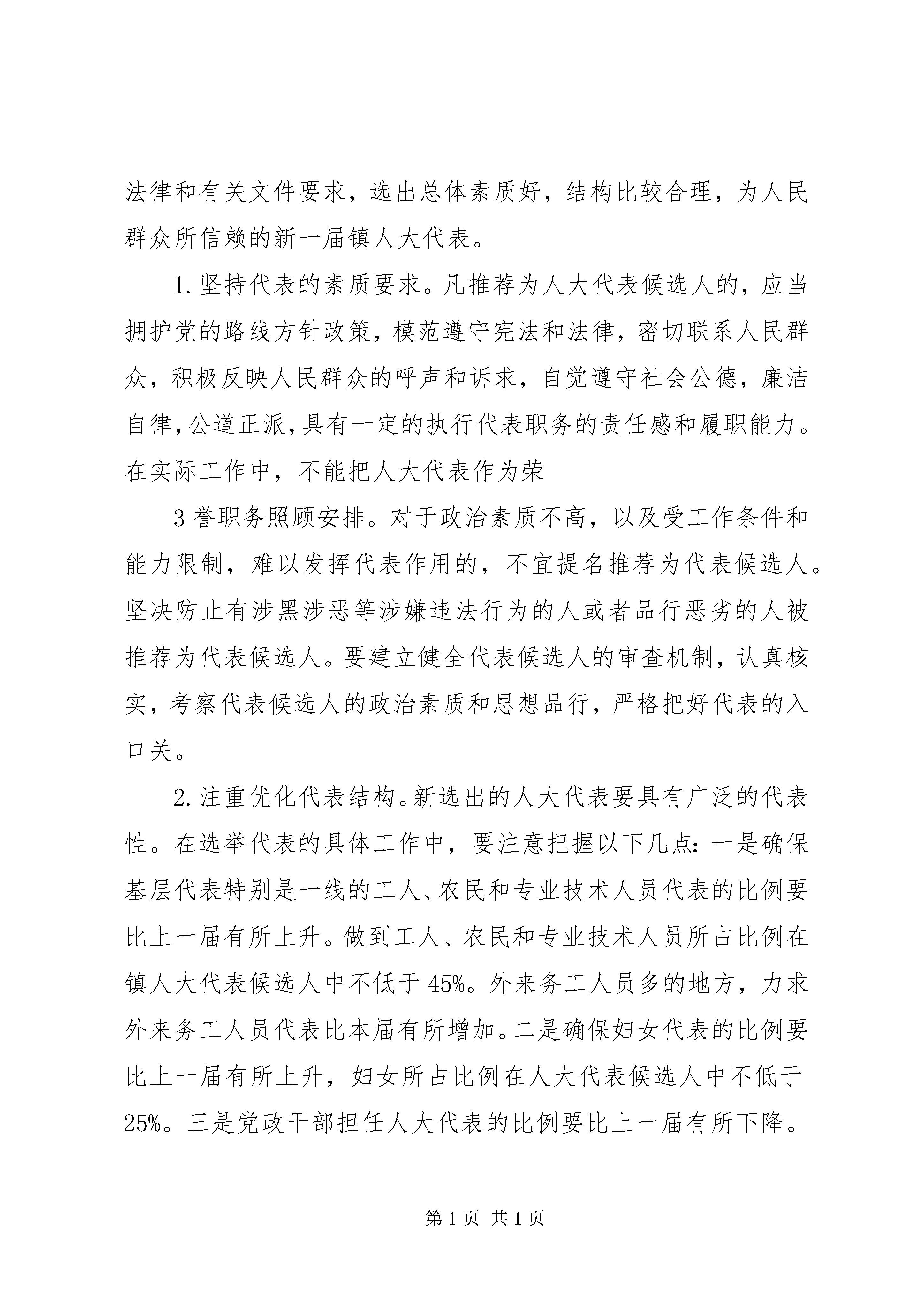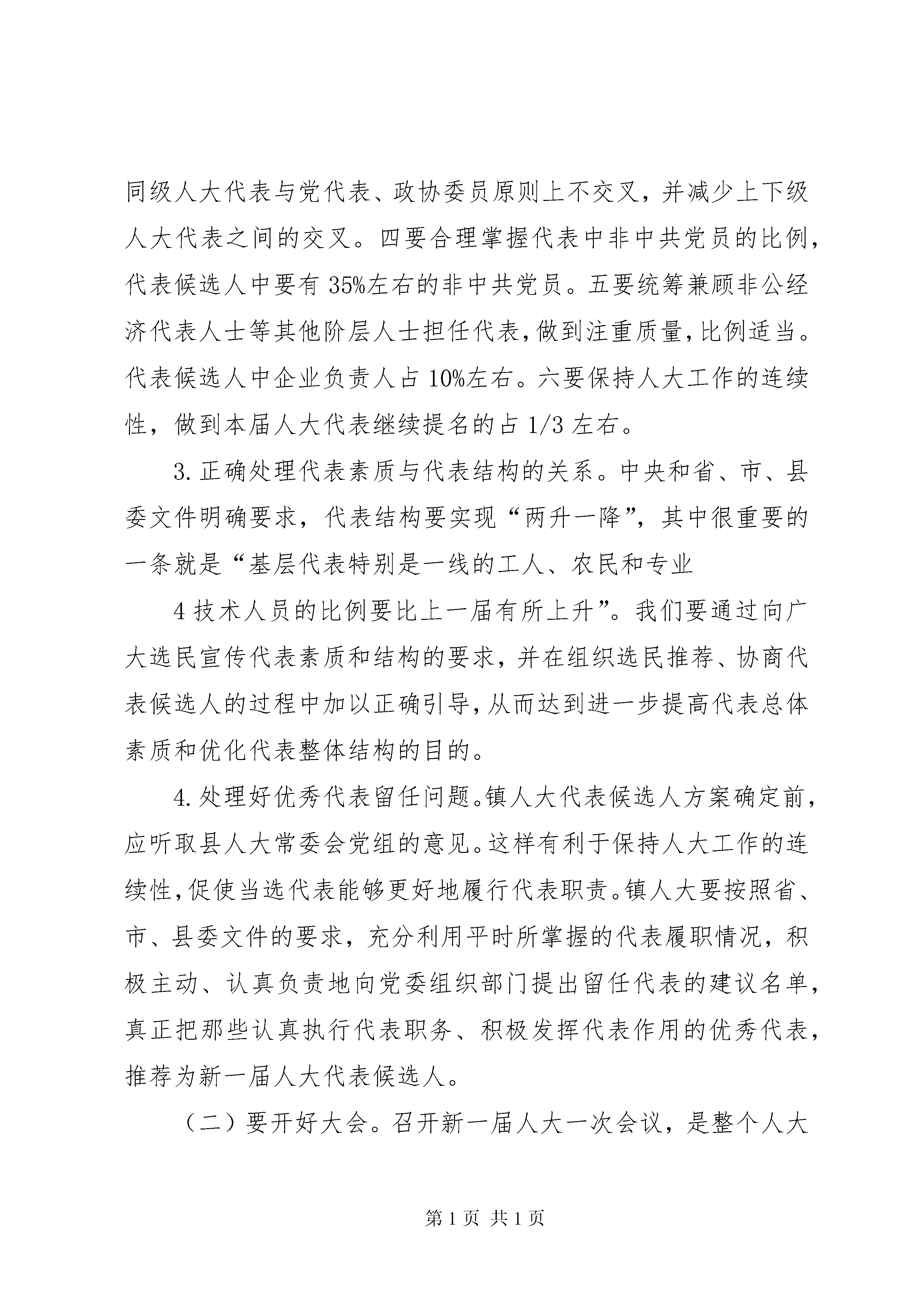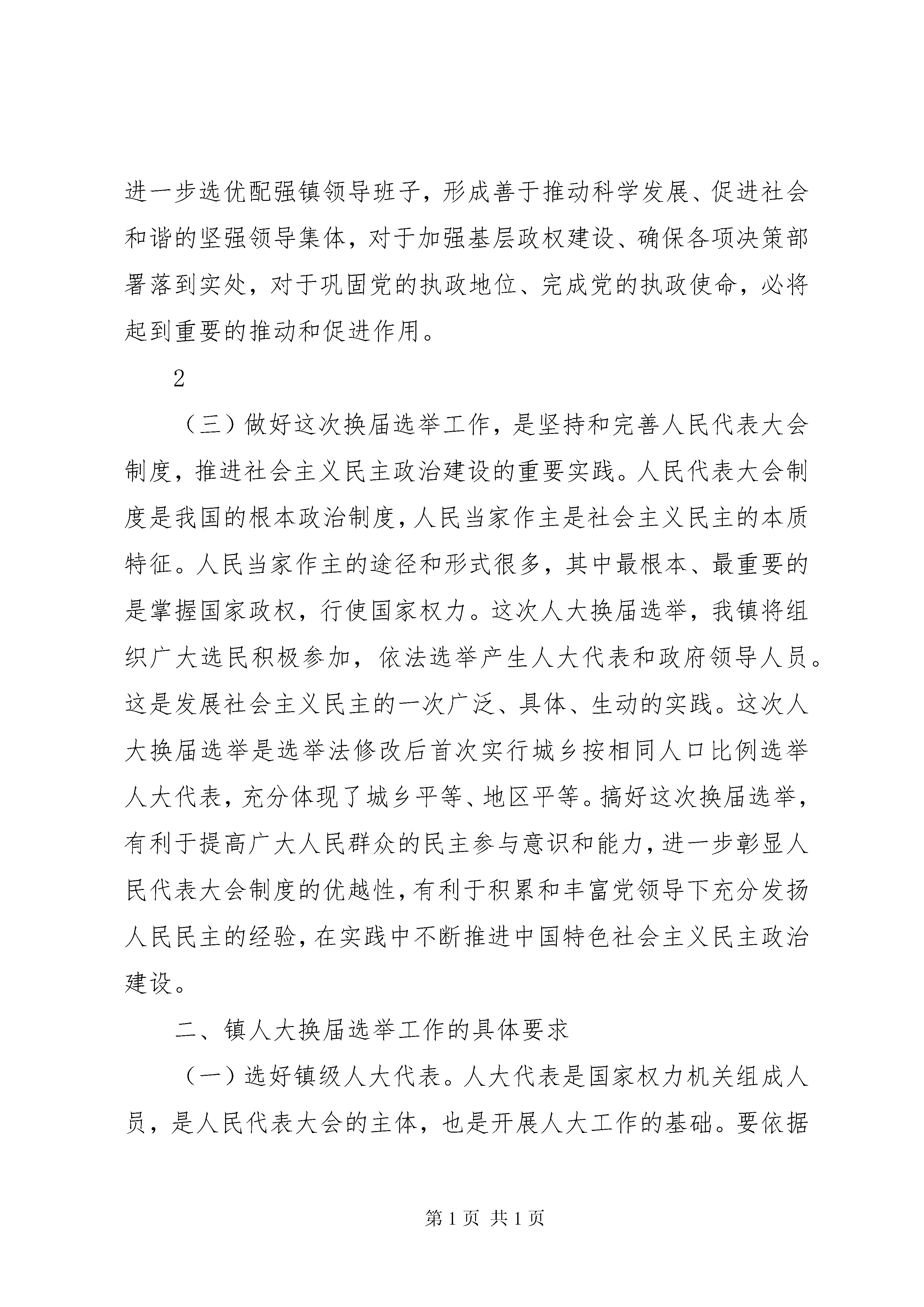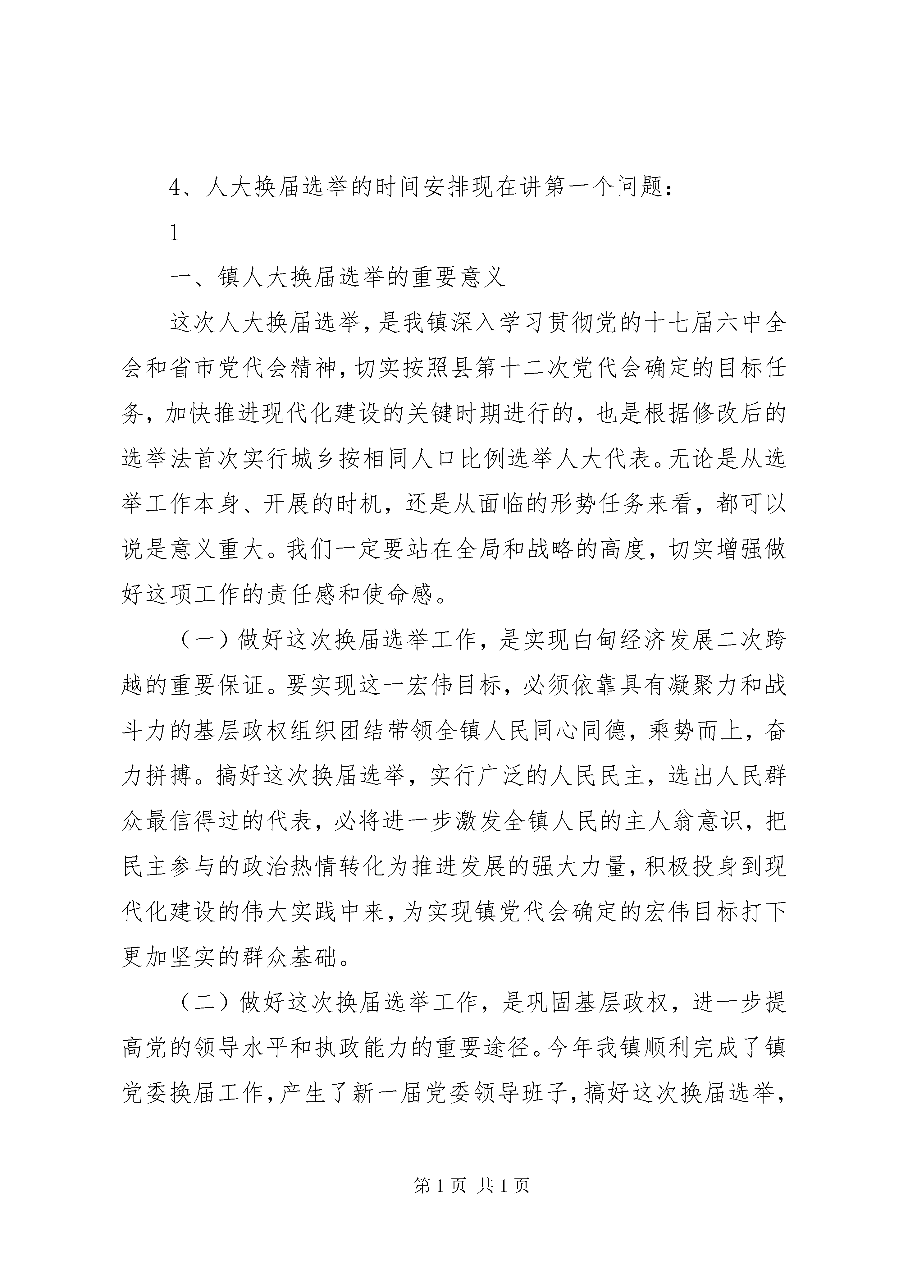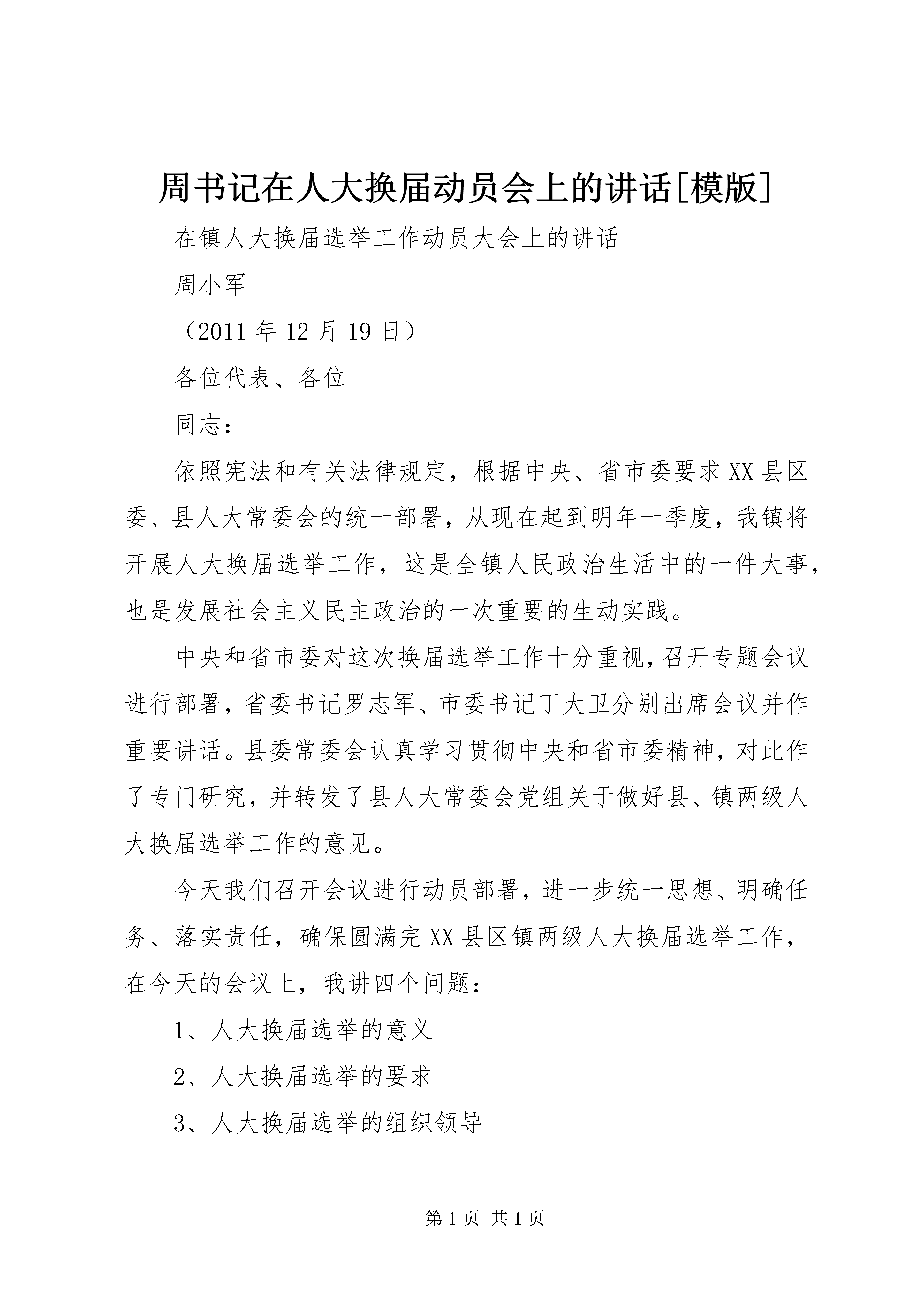 周书记在人大换届动员会上的讲话[模版]在镇人大换届选举工作动员大会上的讲话周小军(2011年12月19日)各位代表、各位同志:依照宪法和有关法律规定,根据中央、省市委要求XX县区委、县人大常委会的统一部署,从现在起到明年一季度,我镇将开展人大换届选举工作,这是全镇人民政治生活中的一件大事,也是发展社会主义民主政治的一次重要的生动实践。中央和省市委对这次换届选举工作十分重视,召开专题会议进行部署,省委书记罗志军、市委书记丁大卫分别出席会议并作重要讲话。县委常委会认真学习贯彻中央和省市委精神,对此作了专门研究,并转发了县人大常委会党组关于做好县、镇两级人大换届选举工作的意见。今天我们召开会议进行动员部署,进一步统一思想、明确任务、落实责任,确保圆满完XX县区镇两级人大换届选举工作,在今天的会议上,我讲四个问题:1、人大换届选举的意义2、人大换届选举的要求3、人大换届选举的组织领导4、人大换届选举的时间安排现在讲第一个问题:1一、镇人大换届选举的重要意义这次人大换届选举,是我镇深入学习贯彻党的十七届六中全会和省市党代会精神,切实按照县第十二次党代会确定的目标任务,加快推进现代化建设的关键时期进行的,也是根据修改后的选举法首次实行城乡按相同人口比例选举人大代表。无论是从选举工作本身、开展的时机,还是从面临的形势任务来看,都可以说是意义重大。我们一定要站在全局和战略的高度,切实增强做好这项工作的责任感和使命感。(一)做好这次换届选举工作,是实现白甸经济发展二次跨越的重要保证。要实现这一宏伟目标,必须依靠具有凝聚力和战斗力的基层政权组织团结带领全镇人民同心同德,乘势而上,奋力拼搏。搞好这次换届选举,实行广泛的人民民主,选出人民群众最信得过的代表,必将进一步激发全镇人民的主人翁意识,把民主参与的政治热情转化为推进发展的强大力量,积极投身到现代化建设的伟大实践中来,为实现镇党代会确定的宏伟目标打下更加坚实的群众基础。(二)做好这次换届选举工作,是巩固基层政权,进一步提高党的领导水平和执政能力的重要途径。今年我镇顺利完成了镇党委换届工作,产生了新一届党委领导班子,搞好这次换届选举,进一步选优配强镇领导班子,形成善于推动科学发展、促进社会和谐的坚强领导集体,对于加强基层政权建设、确保各项决策部署落到实处,对于巩固党的执政地位、完成党的执政使命,必将起到重要的推动和促进作用。2(三)做好这次换届选举工作,是坚持和完善人民代表大会制度,推进社会主义民主政治建设的重要实践。人民代表大会制度是我国的根本政治制度,人民当家作主是社会主义民主的本质特征。人民当家作主的途径和形式很多,其中最根本、最重要的是掌握国家政权,行使国家权力。这次人大换届选举,我镇将组织广大选民积极参加,依法选举产生人大代表和政府领导人员。这是发展社会主义民主的一次广泛、具体、生动的实践。这次人大换届选举是选举法修改后首次实行城乡按相同人口比例选举人大代表,充分体现了城乡平等、地区平等。搞好这次换届选举,有利于提高广大人民群众的民主参与意识和能力,进一步彰显人民代表大会制度的优越性,有利于积累和丰富党领导下充分发扬人民民主的经验,在实践中不断推进中国特色社会主义民主政治建设。二、镇人大换届选举工作的具体要求(一)选好镇级人大代表。人大代表是国家权力机关组成人员,是人民代表大会的主体,也是开展人大工作的基础。要依据法律和有关文件要求,选出总体素质好,结构比较合理,为人民群众所信赖的新一届镇人大代表。1.坚持代表的素质要求。凡推荐为人大代表候选人的,应当拥护党的路线方针政策,模范遵守宪法和法律,密切联系人民群众,积极反映人民群众的呼声和诉求,自觉遵守社会公德,廉洁自律,公道正派,具有一定的执行代表职务的责任感和履职能力。在实际工作中,不能把人大代表作为荣3誉职务照顾安排。对于政治素质不高,以及受工作条件和能力限制,难以发挥代表作用的,不宜提名推荐为代表候选人。坚决防止有涉黑涉恶等涉嫌违法行为的人或者品行恶劣的人被推荐为代表候选人。要建立健全代表候选人的审查机制,认真核实,考察代表候选人的政治素质和思想品行,严格把好代表的入口关。2.注重优化代表结构。新选出的人大代表要具有广泛的代表性。在选举代表的具体工作中,要注意把握以下几点:一是确保基层代表特别是一线的工人、农民和专业技术人员代表的比例要比上一届有所上升。做到工人、农民和专业技术人员所占比例在镇人大代表候选人中不低于45%。外来务工人员多的地方,力求外来务工人员代表比本届有所增加。二是确保妇女代表的比例要比上一届有所上升,妇女所占比例在人大代表候选人中不低于25%。三是党政干部担任人大代表的比例要比上一届有所下降。同级人大代表与党代表、政协委员原则上不交叉,并减少上下级人大代表之间的交叉。四要合理掌握代表中非中