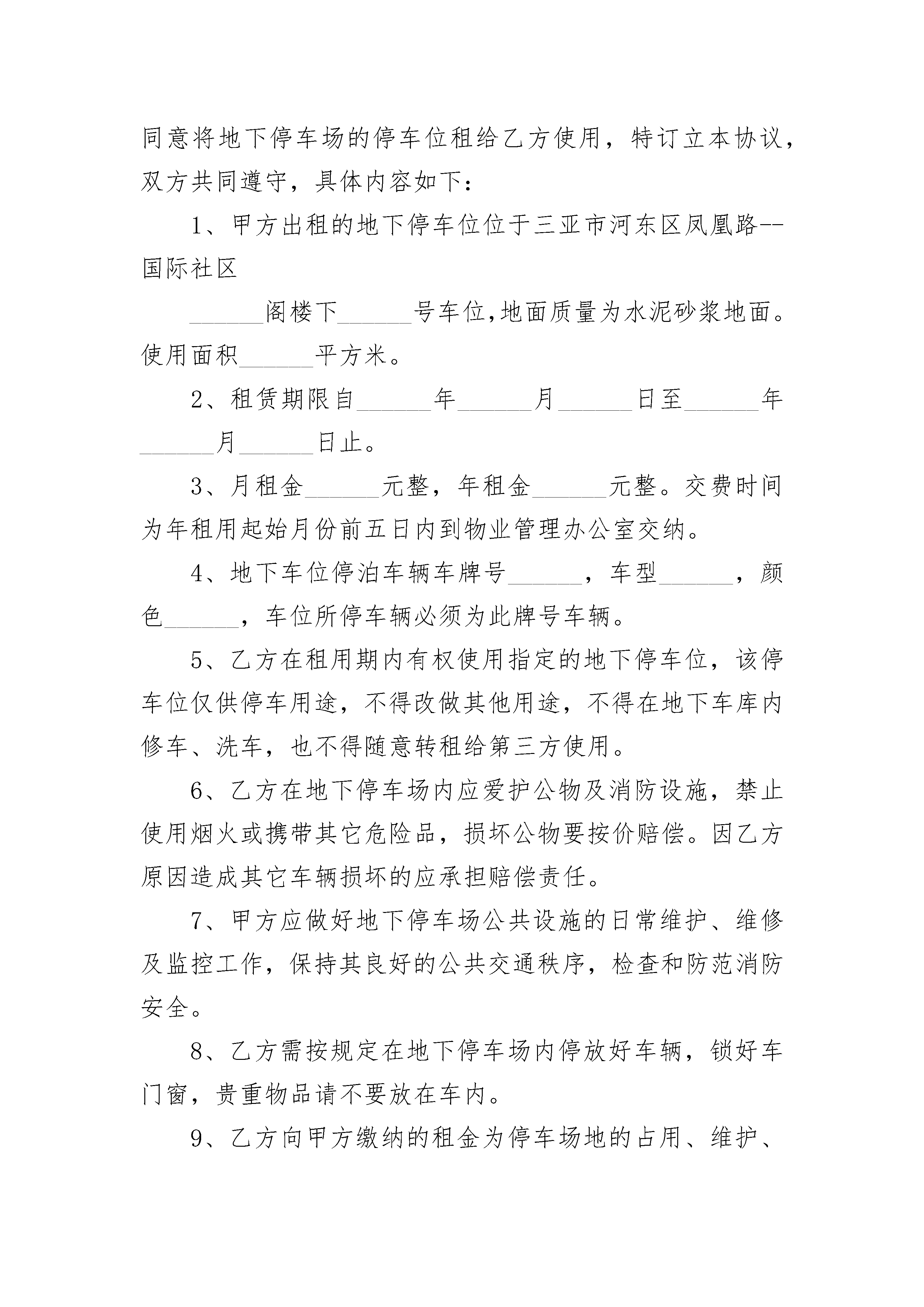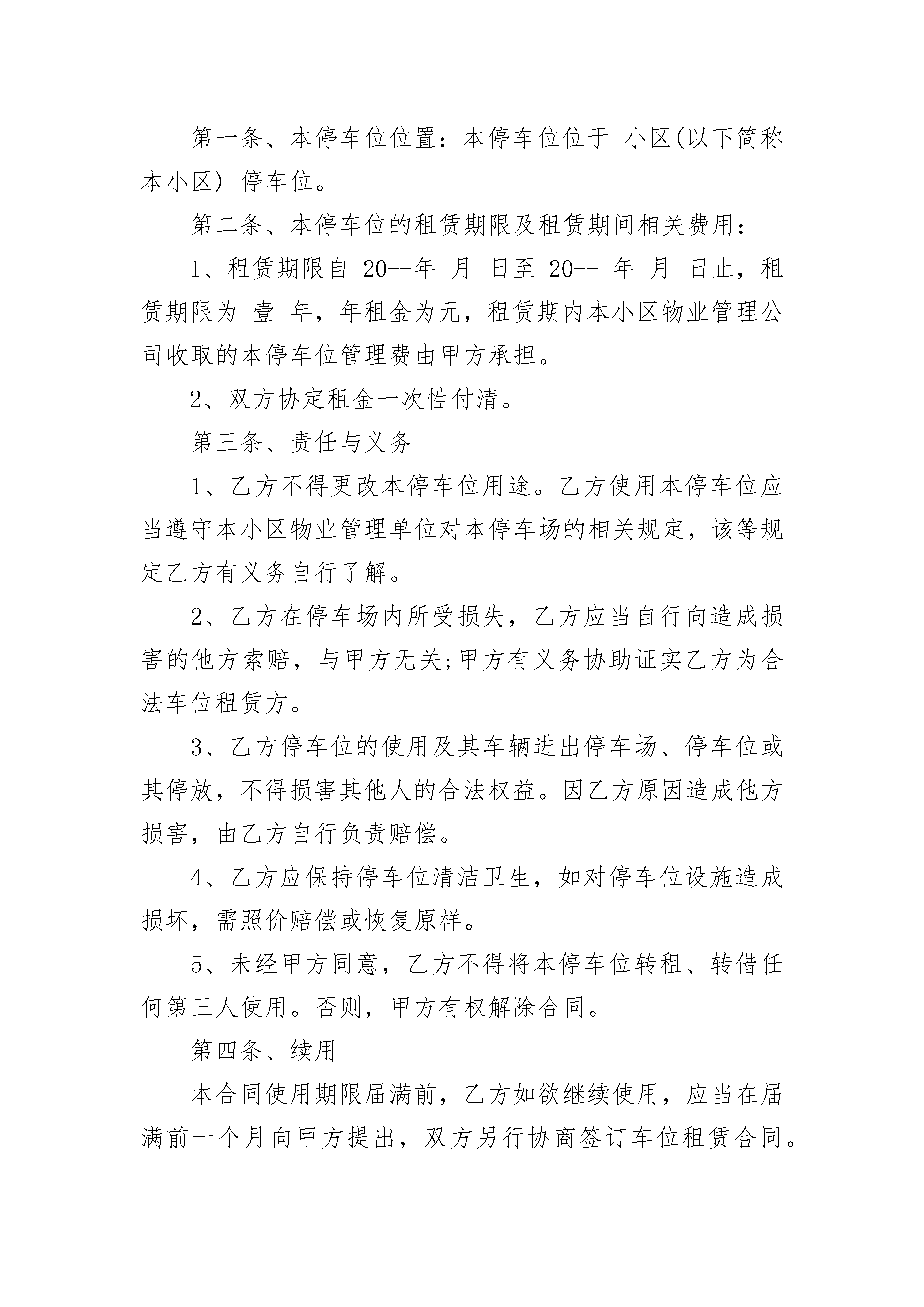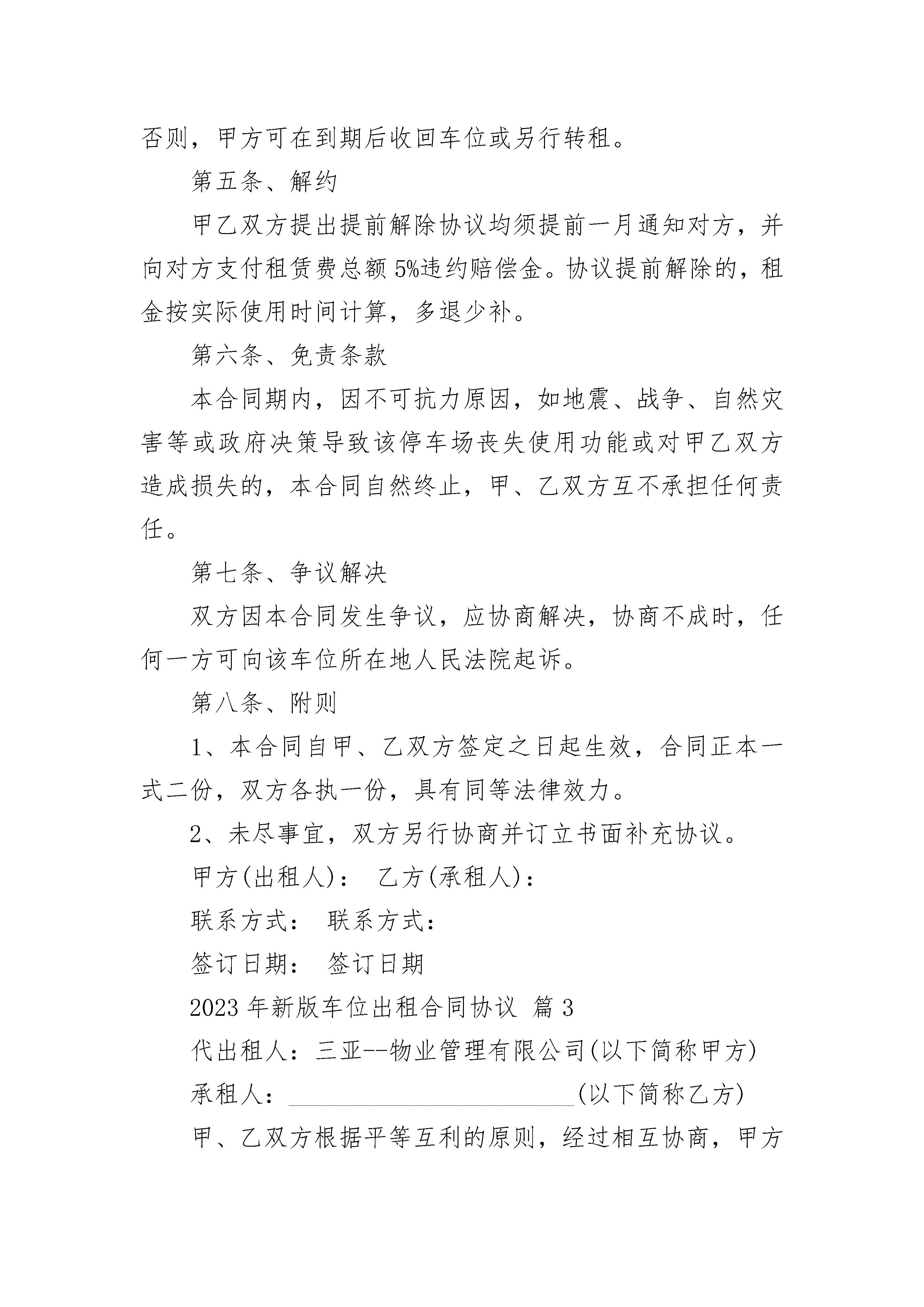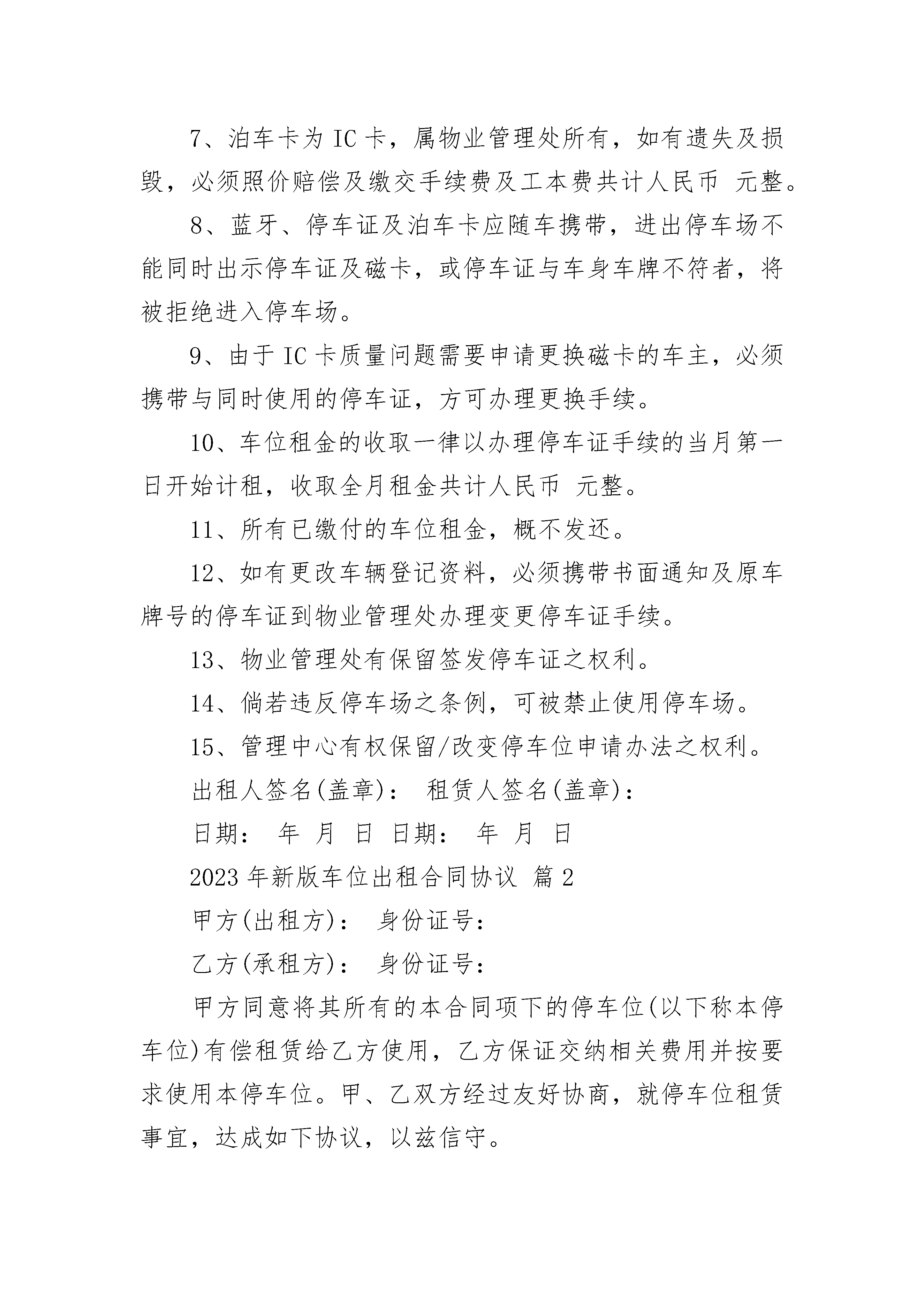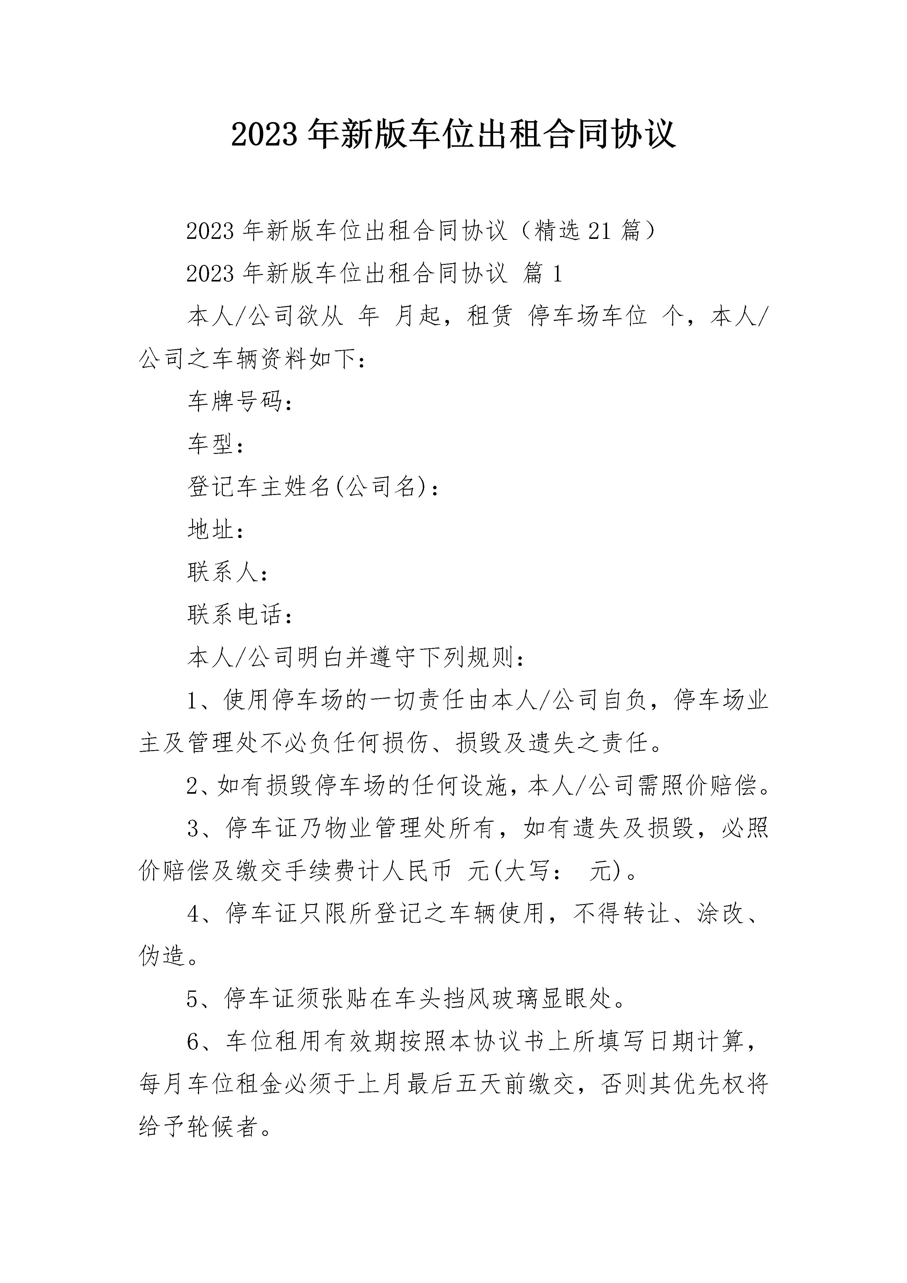 2023年新版车位出租合同协议2023年新版车位出租合同协议(精选21篇)2023年新版车位出租合同协议篇1本人/公司欲从年月起,租赁停车场车位个,本人/公司之车辆资料如下:车牌号码:车型:登记车主姓名(公司名):地址:联系人:联系电话:本人/公司明白并遵守下列规则:1、使用停车场的一切责任由本人/公司自负,停车场业主及管理处不必负任何损伤、损毁及遗失之责任。2、如有损毁停车场的任何设施,本人/公司需照价赔偿。3、停车证乃物业管理处所有,如有遗失及损毁,必照价赔偿及缴交手续费计人民币元(大写:元)。4、停车证只限所登记之车辆使用,不得转让、涂改、伪造。5、停车证须张贴在车头挡风玻璃显眼处。6、车位租用有效期按照本协议书上所填写日期计算,每月车位租金必须于上月最后五天前缴交,否则其优先权将给予轮候者。7、泊车卡为IC卡,属物业管理处所有,如有遗失及损毁,必须照价赔偿及缴交手续费及工本费共计人民币元整。8、蓝牙、停车证及泊车卡应随车携带,进出停车场不能同时出示停车证及磁卡,或停车证与车身车牌不符者,将被拒绝进入停车场。9、由于IC卡质量问题需要申请更换磁卡的车主,必须携带与同时使用的停车证,方可办理更换手续。10、车位租金的收取一律以办理停车证手续的当月第一日开始计租,收取全月租金共计人民币元整。11、所有已缴付的车位租金,概不发还。12、如有更改车辆登记资料,必须携带书面通知及原车牌号的停车证到物业管理处办理变更停车证手续。13、物业管理处有保留签发停车证之权利。14、倘若违反停车场之条例,可被禁止使用停车场。15、管理中心有权保留/改变停车位申请办法之权利。出租人签名(盖章):租赁人签名(盖章):日期:年月日日期:年月日2023年新版车位出租合同协议篇2甲方(出租方):身份证号:乙方(承租方):身份证号:甲方同意将其所有的本合同项下的停车位(以下称本停车位)有偿租赁给乙方使用,乙方保证交纳相关费用并按要求使用本停车位。甲、乙双方经过友好协商,就停车位租赁事宜,达成如下协议,以兹信守。第一条、本停车位位置:本停车位位于小区(以下简称本小区)停车位。第二条、本停车位的租赁期限及租赁期间相关费用:1、租赁期限自20--年月日至20--年月日止,租赁期限为壹年,年租金为元,租赁期内本小区物业管理公司收取的本停车位管理费由甲方承担。2、双方协定租金一次性付清。第三条、责任与义务1、乙方不得更改本停车位用途。乙方使用本停车位应当遵守本小区物业管理单位对本停车场的相关规定,该等规定乙方有义务自行了解。2、乙方在停车场内所受损失,乙方应当自行向造成损害的他方索赔,与甲方无关;甲方有义务协助证实乙方为合法车位租赁方。3、乙方停车位的使用及其车辆进出停车场、停车位或其停放,不得损害其他人的合法权益。因乙方原因造成他方损害,由乙方自行负责赔偿。4、乙方应保持停车位清洁卫生,如对停车位设施造成损坏,需照价赔偿或恢复原样。5、未经甲方同意,乙方不得将本停车位转租、转借任何第三人使用。否则,甲方有权解除合同。第四条、续用本合同使用期限届满前,乙方如欲继续使用,应当在届满前一个月向甲方提出,双方另行协商签订车位租赁合同。否则,甲方可在到期后收回车位或另行转租。第五条、解约甲乙双方提出提前解除协议均须提前一月通知对方,并向对方支付租赁费总额5%违约赔偿金。协议提前解除的,租金按实际使用时间计算,多退少补。第六条、免责条款本合同期内,因不可抗力原因,如地震、战争、自然灾害等或政府决策导致该停车场丧失使用功能或对甲乙双方造成损失的,本合同自然终止,甲、乙双方互不承担任何责任。第七条、争议解决双方因本合同发生争议,应协商解决,协商不成时,任何一方可向该车位所在地人民法院起诉。第八条、附则1、本合同自甲、乙双方签定之日起生效,合同正本一式二份,双方各执一份,具有同等法律效力。2、未尽事宜,双方另行协商并订立书面补充协议。甲方(出租人):乙方(承租人):联系方式:联系方式:签订日期:签订日期2023年新版车位出租合同协议篇3代出租人:三亚--物业管理有限公司(以下简称甲方)承租人:_______________________(以下简称乙方)甲、乙双方根据平等互利的原则,经过相互协商,甲方同意将地下停车场的停车位租给乙方使用,特订立本协议,双方共同遵守,具体内容如下:1、甲方出租的地下停车位位于三亚市河东区凤凰路--国际社区______阁楼下______号车位,地面质量为水泥砂浆地面。使用面积______平方米。2、租赁期限自______年______月______日至______年______月______日止。3、月租金______元整,年租金______元整。交费时间为年租用起始月份前五日内到物业管理办公室交纳。4、地下车位停泊车辆车牌号______,车型_