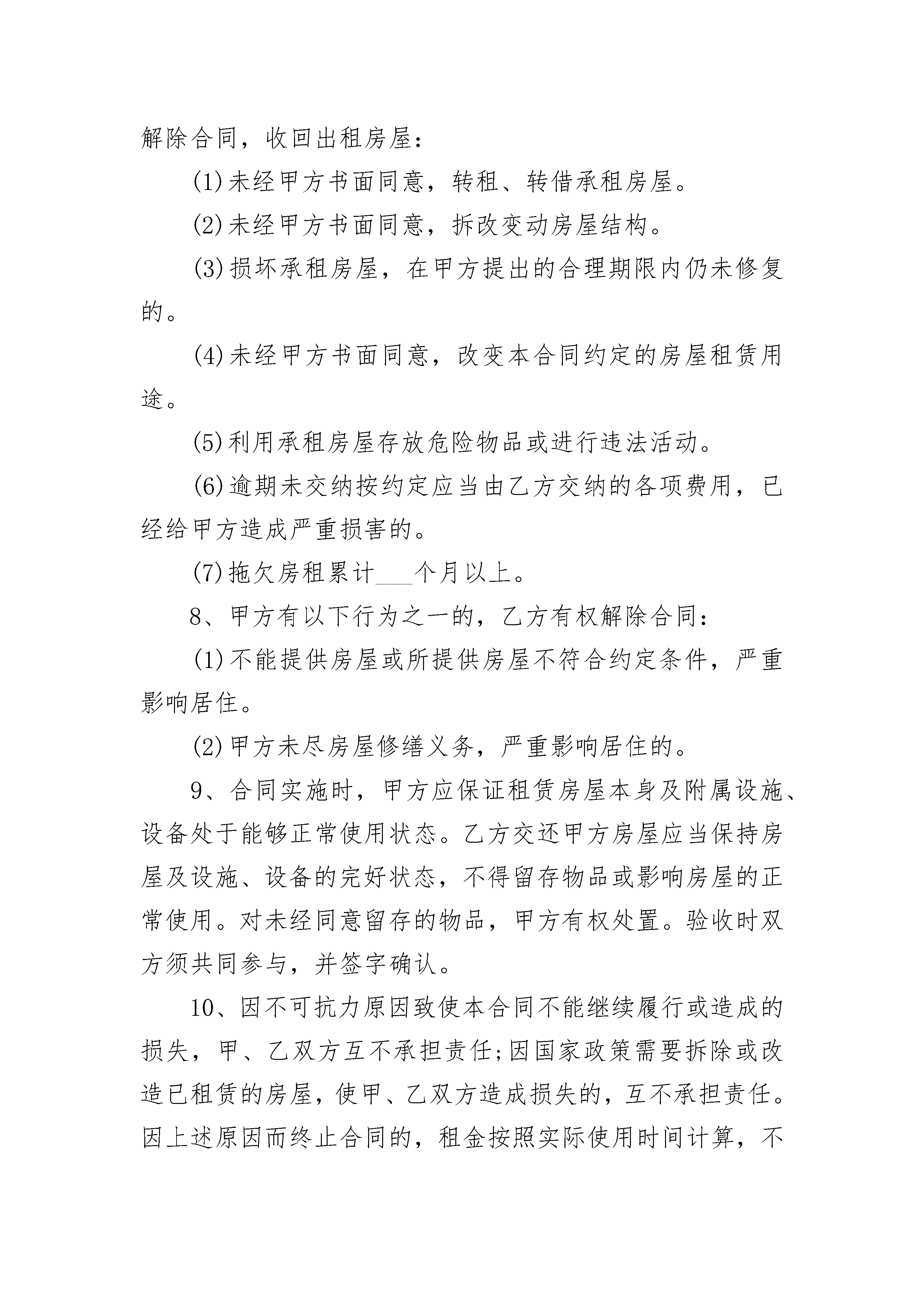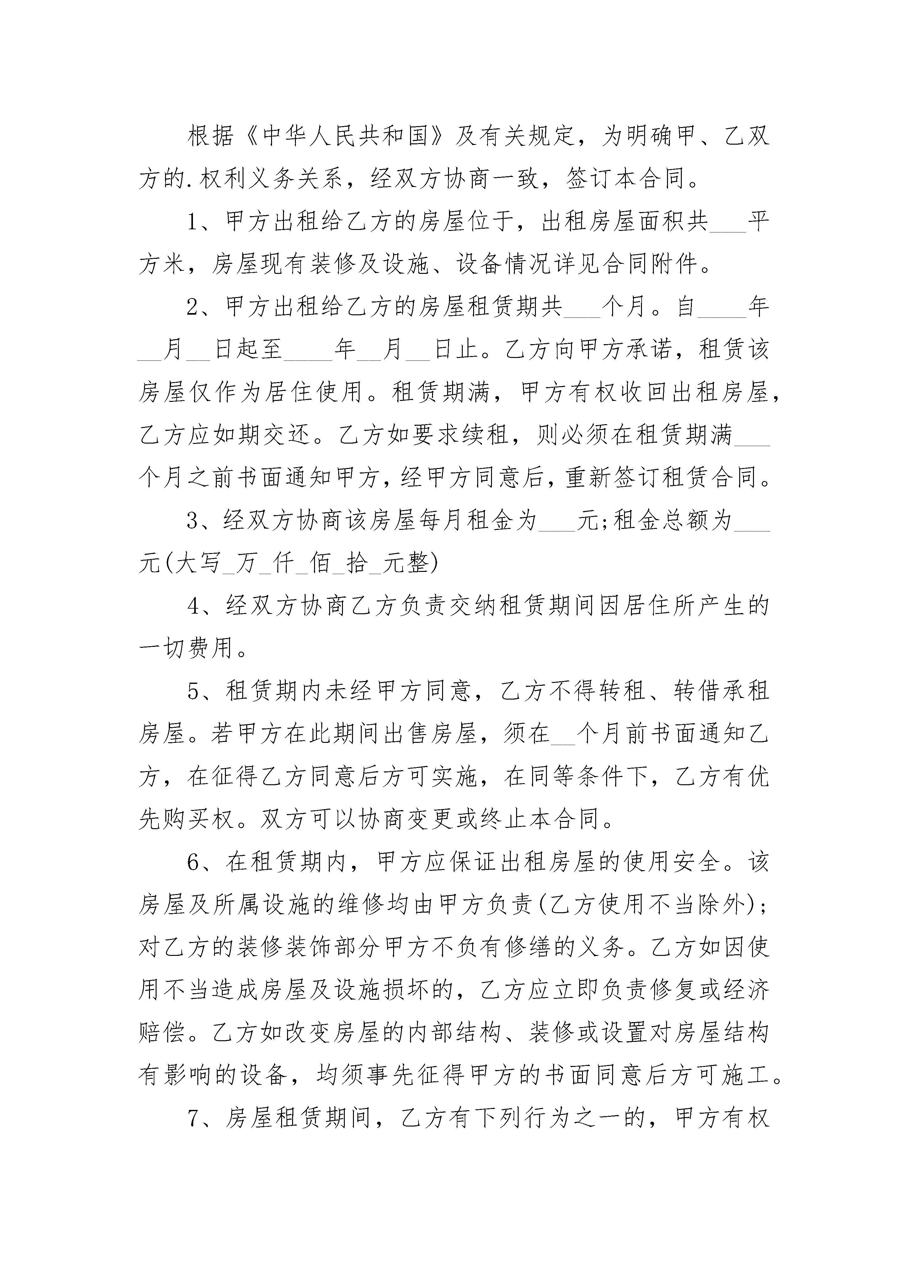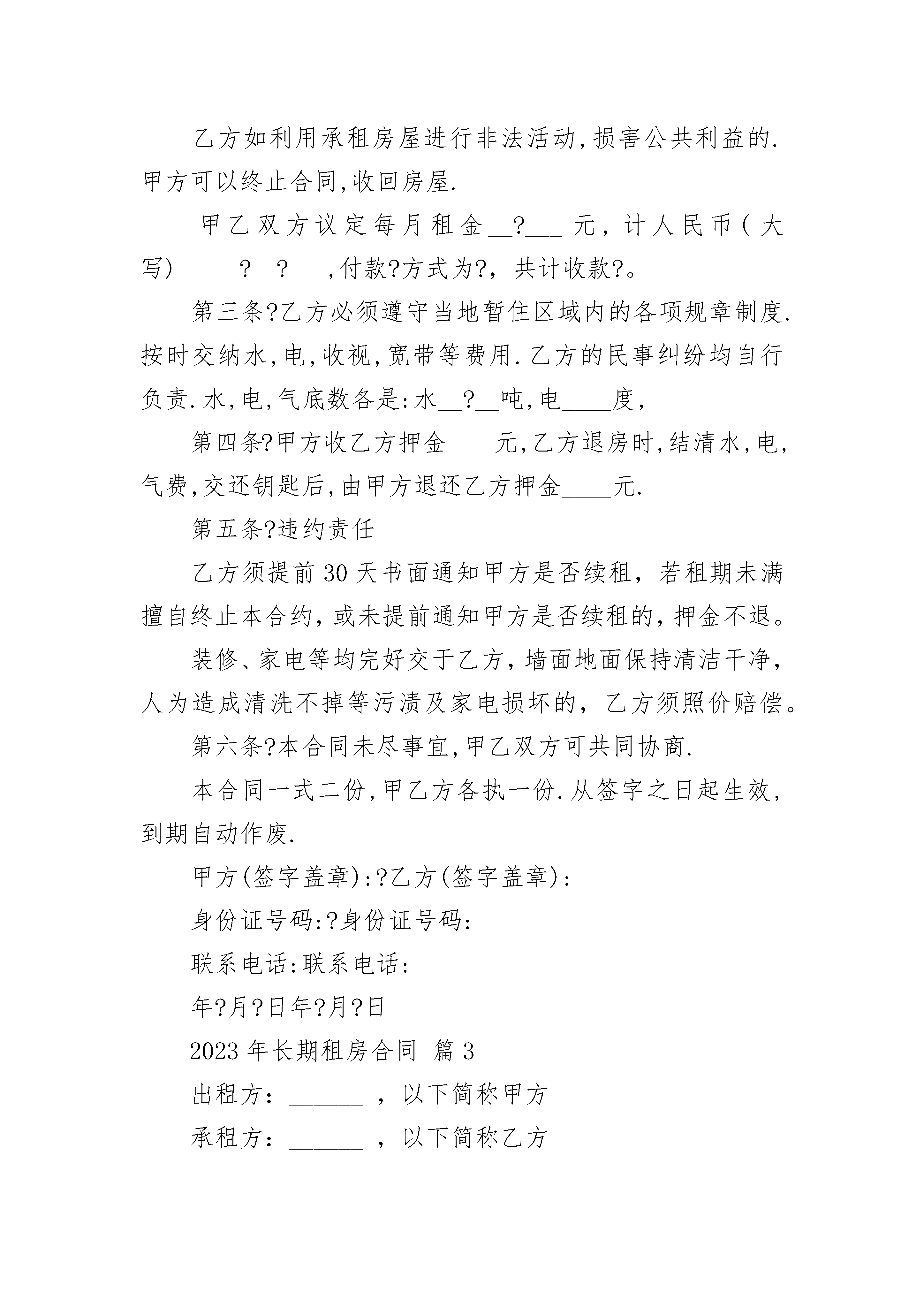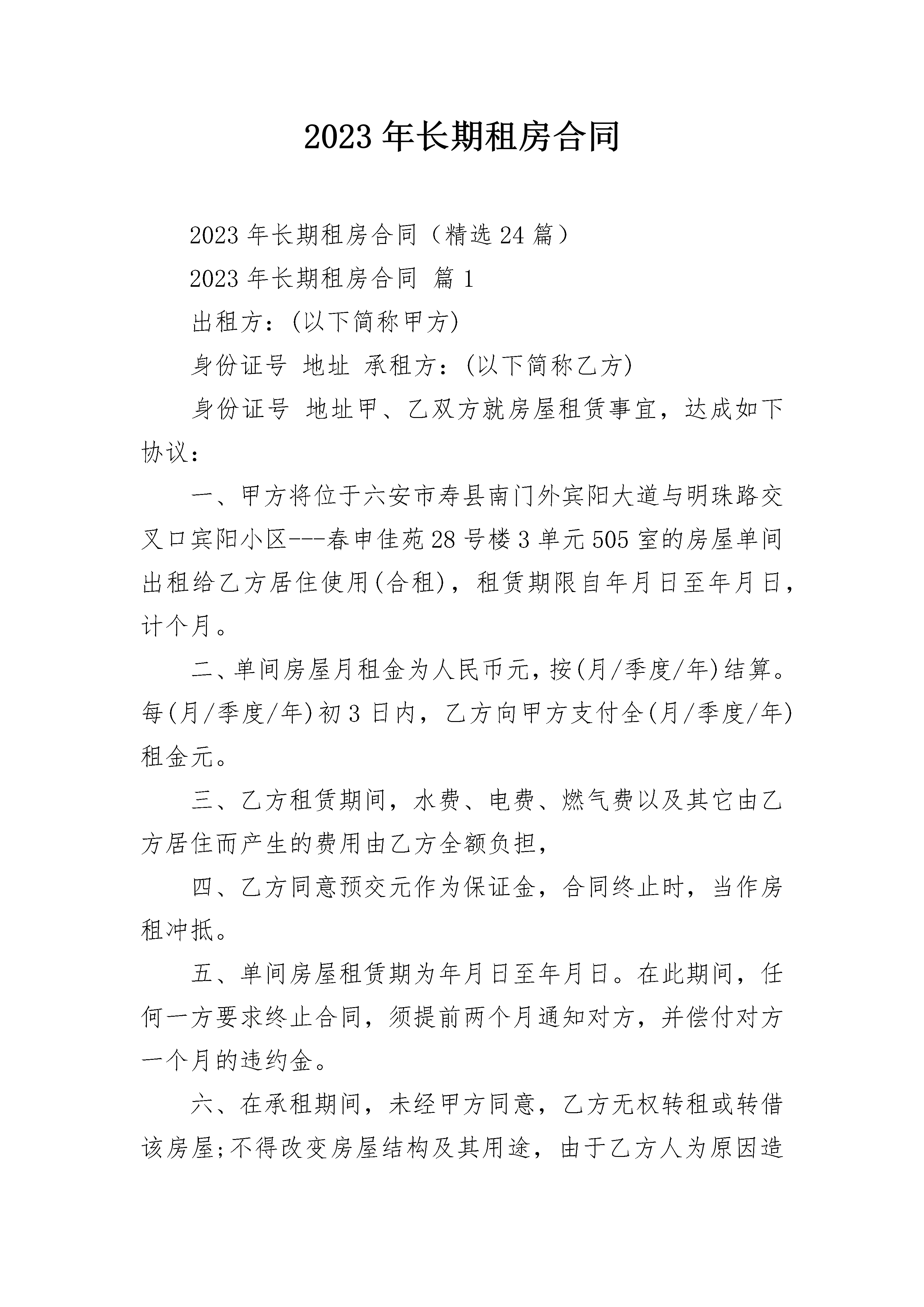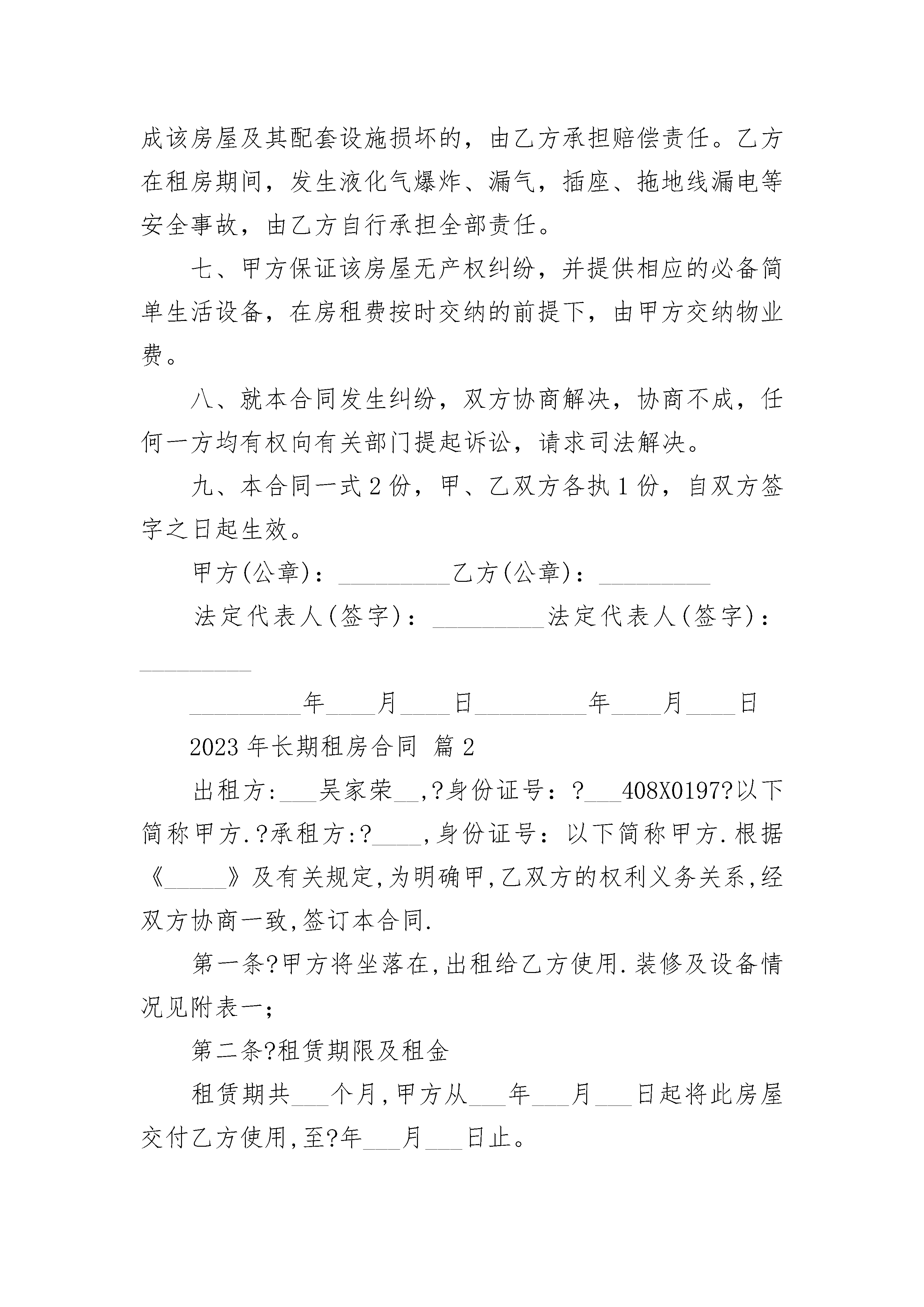 2023年长期租房合同2023年长期租房合同(精选24篇)2023年长期租房合同篇1出租方:(以下简称甲方)身份证号地址承租方:(以下简称乙方)身份证号地址甲、乙双方就房屋租赁事宜,达成如下协议:一、甲方将位于六安市寿县南门外宾阳大道与明珠路交叉口宾阳小区---春申佳苑28号楼3单元505室的房屋单间出租给乙方居住使用(合租),租赁期限自年月日至年月日,计个月。二、单间房屋月租金为人民币元,按(月/季度/年)结算。每(月/季度/年)初3日内,乙方向甲方支付全(月/季度/年)租金元。三、乙方租赁期间,水费、电费、燃气费以及其它由乙方居住而产生的费用由乙方全额负担,四、乙方同意预交元作为保证金,合同终止时,当作房租冲抵。五、单间房屋租赁期为年月日至年月日。在此期间,任何一方要求终止合同,须提前两个月通知对方,并偿付对方一个月的违约金。六、在承租期间,未经甲方同意,乙方无权转租或转借该房屋;不得改变房屋结构及其用途,由于乙方人为原因造成该房屋及其配套设施损坏的,由乙方承担赔偿责任。乙方在租房期间,发生液化气爆炸、漏气,插座、拖地线漏电等安全事故,由乙方自行承担全部责任。七、甲方保证该房屋无产权纠纷,并提供相应的必备简单生活设备,在房租费按时交纳的前提下,由甲方交纳物业费。八、就本合同发生纠纷,双方协商解决,协商不成,任何一方均有权向有关部门提起诉讼,请求司法解决。九、本合同一式2份,甲、乙双方各执1份,自双方签字之日起生效。甲方(公章):_________乙方(公章):_________法定代表人(签字):_________法定代表人(签字):__________________年____月____日_________年____月____日2023年长期租房合同篇2出租方:___吴家荣__,?身份证号:?___408X0197?以下简称甲方.?承租方:?____,身份证号:以下简称甲方.根据《_____》及有关规定,为明确甲,乙双方的权利义务关系,经双方协商一致,签订本合同.第一条?甲方将坐落在,出租给乙方使用.装修及设备情况见附表一;第二条?租赁期限及租金租赁期共___个月,甲方从___年___月___日起将此房屋交付乙方使用,至?年___月___日止。乙方如利用承租房屋进行非法活动,损害公共利益的.甲方可以终止合同,收回房屋.甲乙双方议定每月租金__?___元,计人民币(大写)_____?__?___,付款?方式为?,共计收款?。第三条?乙方必须遵守当地暂住区域内的各项规章制度.按时交纳水,电,收视,宽带等费用.乙方的民事纠纷均自行负责.水,电,气底数各是:水__?__吨,电____度,第四条?甲方收乙方押金____元,乙方退房时,结清水,电,气费,交还钥匙后,由甲方退还乙方押金____元.第五条?违约责任乙方须提前30天书面通知甲方是否续租,若租期未满擅自终止本合约,或未提前通知甲方是否续租的,押金不退。装修、家电等均完好交于乙方,墙面地面保持清洁干净,人为造成清洗不掉等污渍及家电损坏的,乙方须照价赔偿。第六条?本合同未尽事宜,甲乙双方可共同协商.本合同一式二份,甲乙方各执一份.从签字之日起生效,到期自动作废.甲方(签字盖章):?乙方(签字盖章):身份证号码:?身份证号码:联系电话:联系电话:年?月?日年?月?日2023年长期租房合同篇3出租方:______,以下简称甲方承租方:______,以下简称乙方根据《中华人民共和国》及有关规定,为明确甲、乙双方的.权利义务关系,经双方协商一致,签订本合同。1、甲方出租给乙方的房屋位于,出租房屋面积共___平方米,房屋现有装修及设施、设备情况详见合同附件。2、甲方出租给乙方的房屋租赁期共___个月。自____年__月__日起至____年__月__日止。乙方向甲方承诺,租赁该房屋仅作为居住使用。租赁期满,甲方有权收回出租房屋,乙方应如期交还。乙方如要求续租,则必须在租赁期满___个月之前书面通知甲方,经甲方同意后,重新签订租赁合同。3、经双方协商该房屋每月租金为___元;租金总额为___元(大写_万_仟_佰_拾_元整)4、经双方协商乙方负责交纳租赁期间因居住所产生的一切费用。5、租赁期内未经甲方同意,乙方不得转租、转借承租房屋。若甲方在此期间出售房屋,须在__个月前书面通知乙方,在征得乙方同意后方可实施,在同等条件下,乙方有优先购买权。双方可以协商变更或终止本合同。6、在租赁期内,甲方应保证出租房屋的使用安全。该房屋及所属设施的维修均由甲方负责(乙方使用不当除外);对乙方的装修装饰部分甲方不负有修缮的义务。乙方如因使用不当造成房屋及设施损坏的,乙方应立即负责修复或经济赔偿。乙方如改变房屋的内部结构、装修或设置对房屋结构有影响的设备,均须事先征得甲方的书面同意后方可施工。7、房屋租赁期
