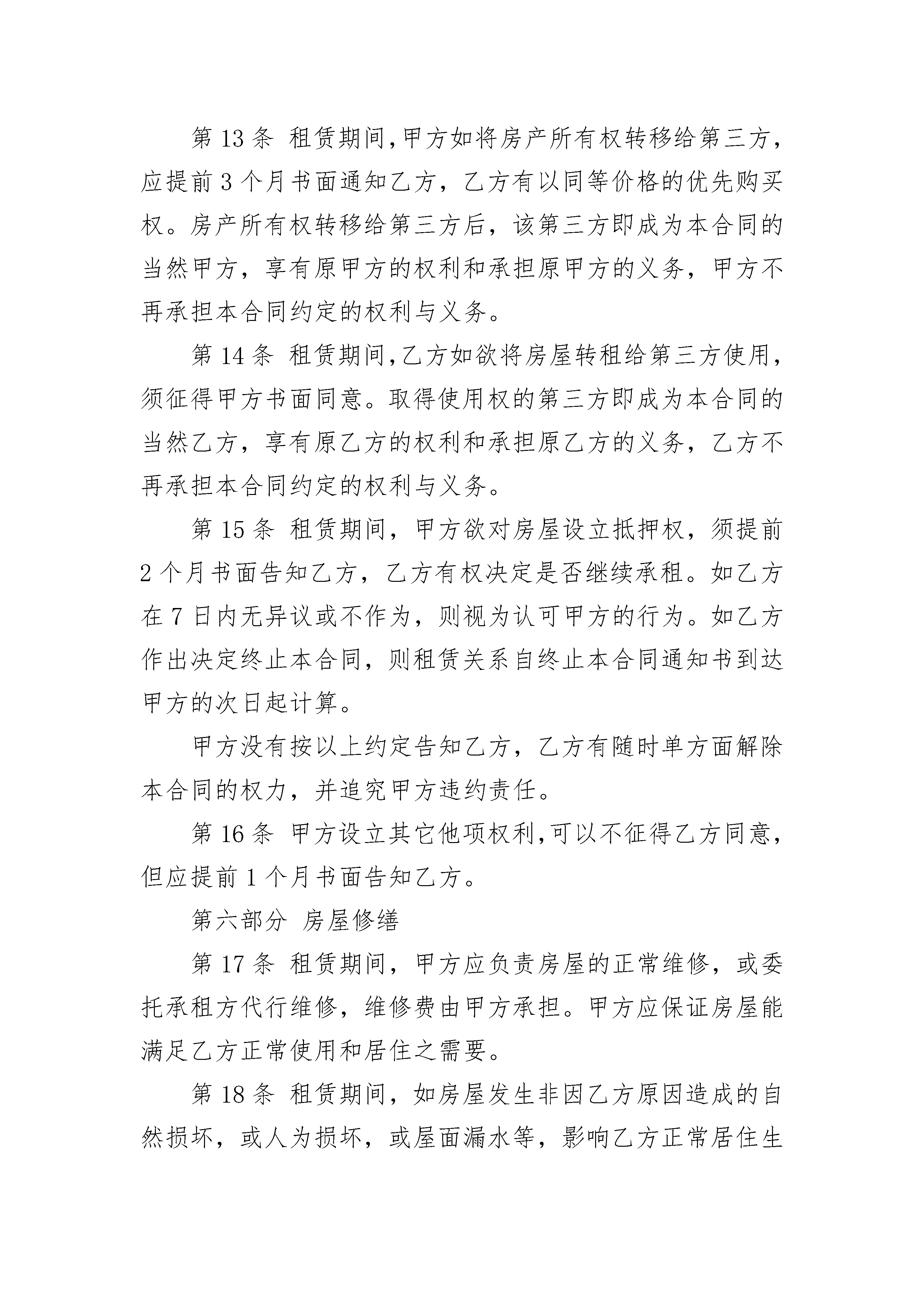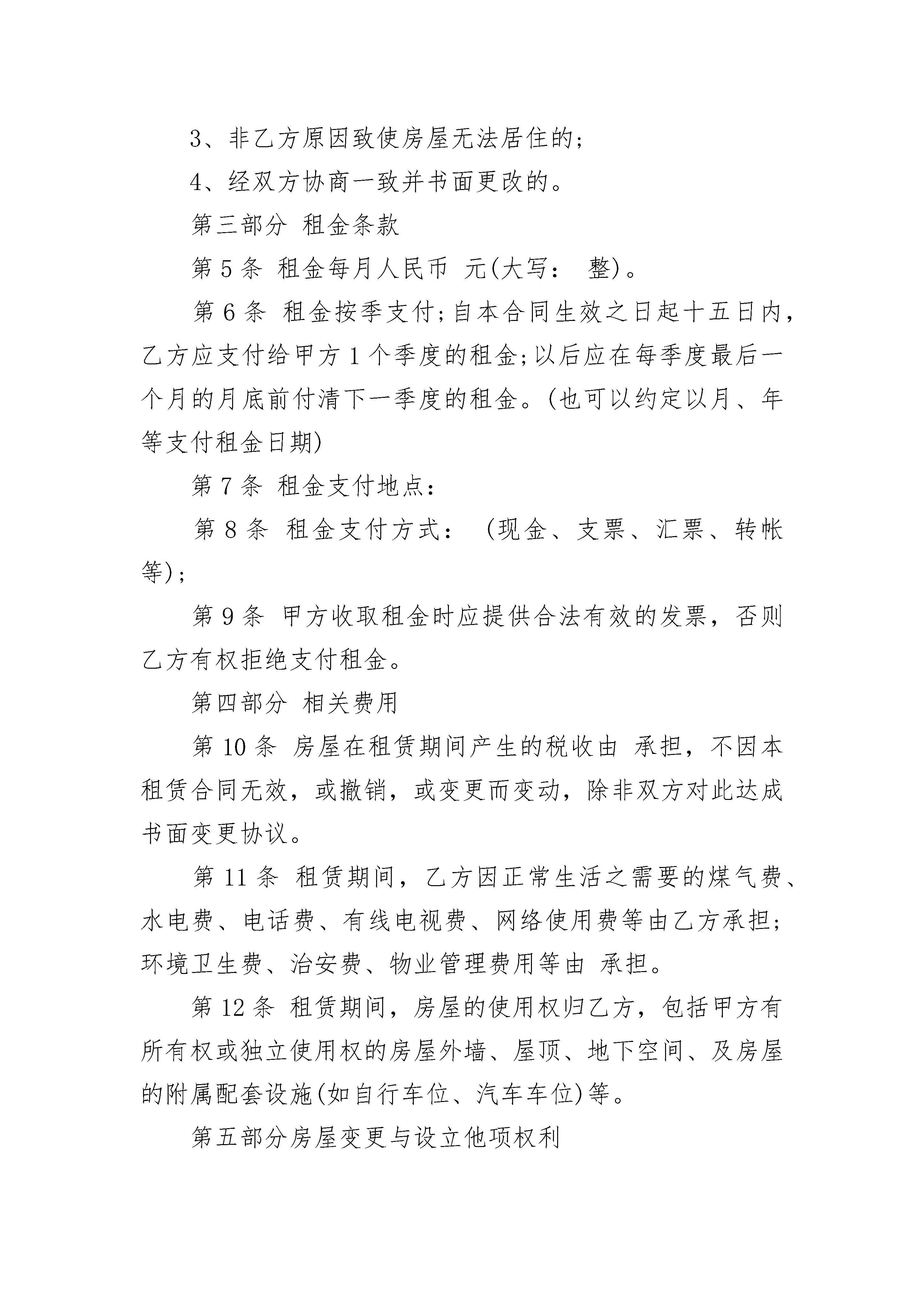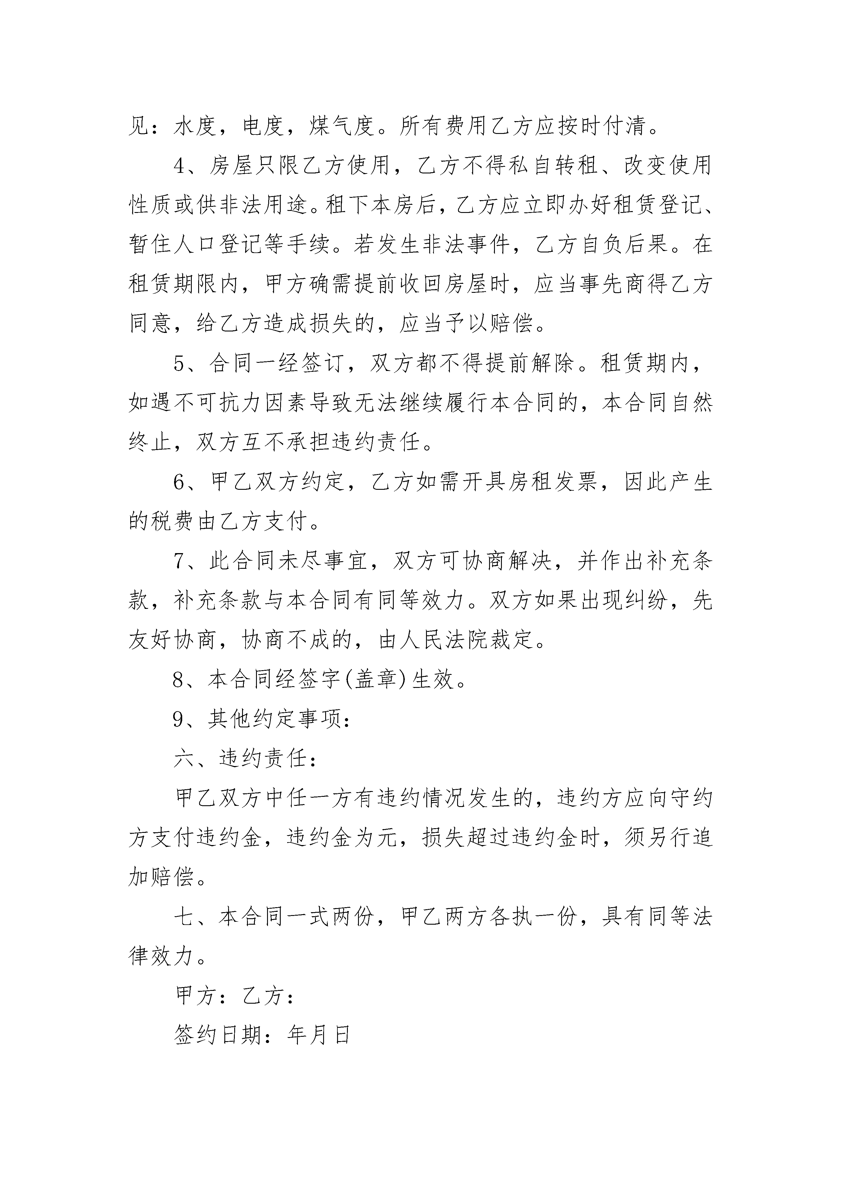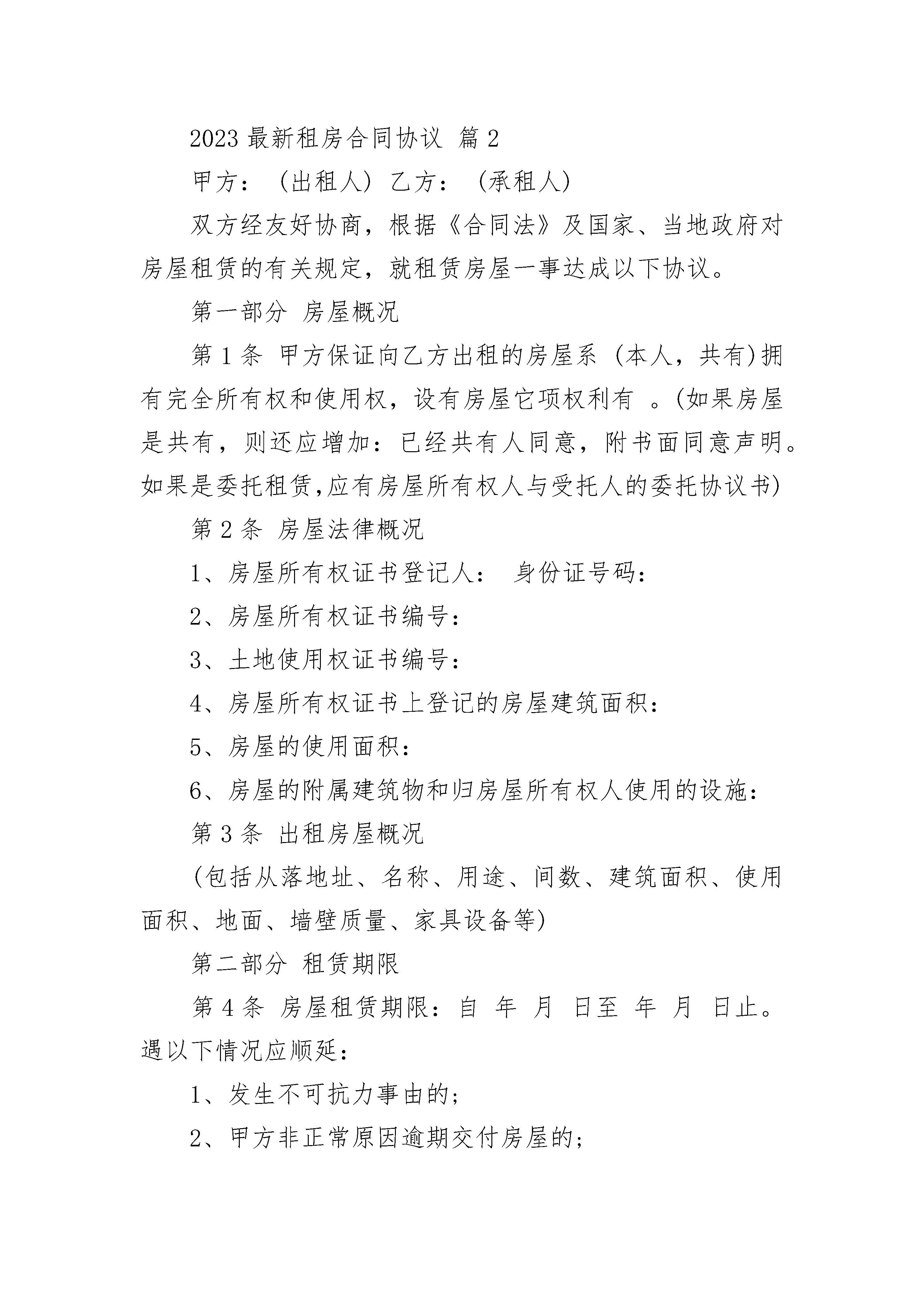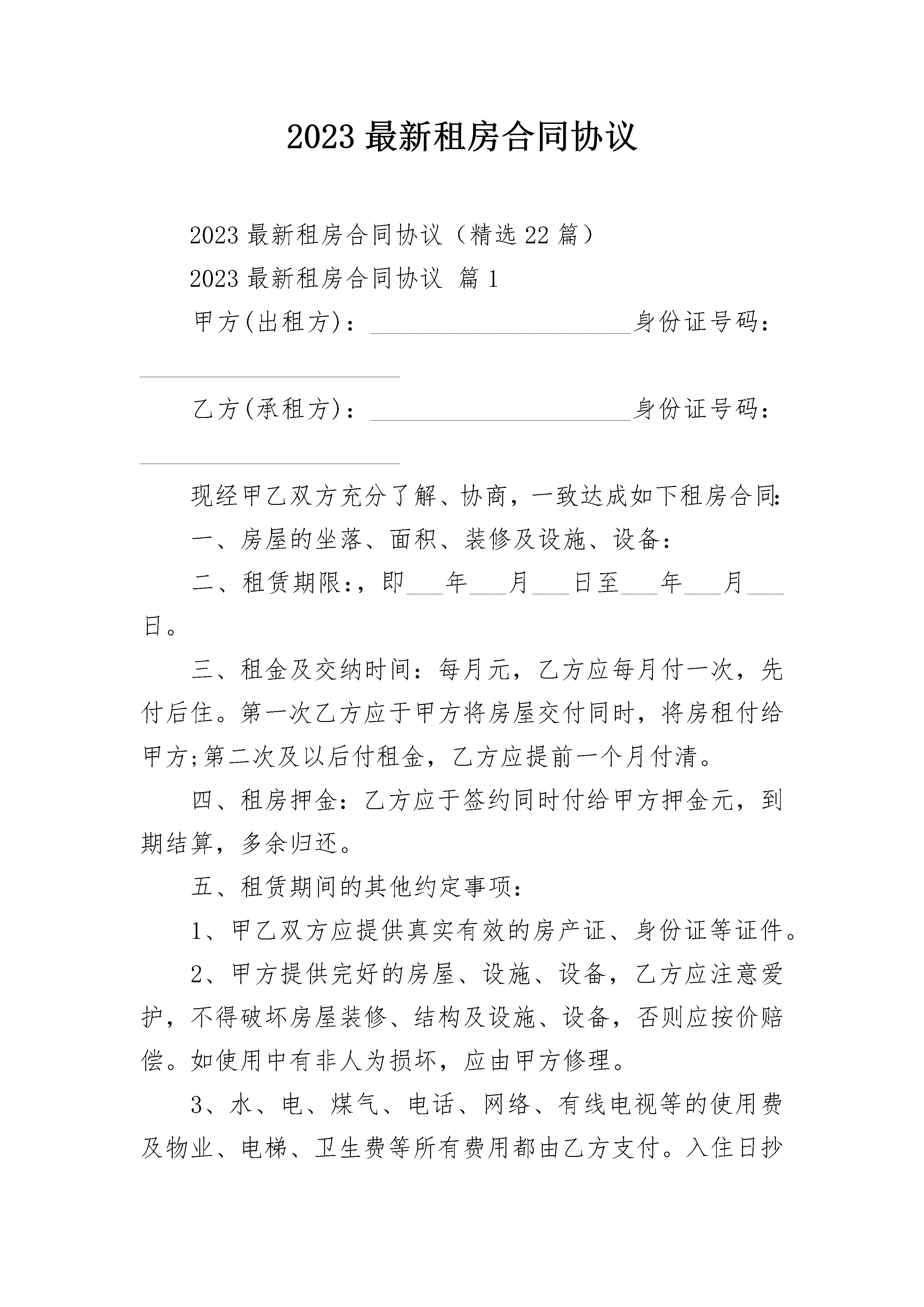 2023最新租房合同协议2023最新租房合同协议(精选22篇)2023最新租房合同协议篇1甲方(出租方):_____________________身份证号码:_____________________乙方(承租方):_____________________身份证号码:_____________________现经甲乙双方充分了解、协商,一致达成如下租房合同:一、房屋的坐落、面积、装修及设施、设备:二、租赁期限:,即___年___月___日至___年___月___日。三、租金及交纳时间:每月元,乙方应每月付一次,先付后住。第一次乙方应于甲方将房屋交付同时,将房租付给甲方;第二次及以后付租金,乙方应提前一个月付清。四、租房押金:乙方应于签约同时付给甲方押金元,到期结算,多余归还。五、租赁期间的其他约定事项:1、甲乙双方应提供真实有效的房产证、身份证等证件。2、甲方提供完好的房屋、设施、设备,乙方应注意爱护,不得破坏房屋装修、结构及设施、设备,否则应按价赔偿。如使用中有非人为损坏,应由甲方修理。3、水、电、煤气、电话、网络、有线电视等的使用费及物业、电梯、卫生费等所有费用都由乙方支付。入住日抄见:水度,电度,煤气度。所有费用乙方应按时付清。4、房屋只限乙方使用,乙方不得私自转租、改变使用性质或供非法用途。租下本房后,乙方应立即办好租赁登记、暂住人口登记等手续。若发生非法事件,乙方自负后果。在租赁期限内,甲方确需提前收回房屋时,应当事先商得乙方同意,给乙方造成损失的,应当予以赔偿。5、合同一经签订,双方都不得提前解除。租赁期内,如遇不可抗力因素导致无法继续履行本合同的,本合同自然终止,双方互不承担违约责任。6、甲乙双方约定,乙方如需开具房租发票,因此产生的税费由乙方支付。7、此合同未尽事宜,双方可协商解决,并作出补充条款,补充条款与本合同有同等效力。双方如果出现纠纷,先友好协商,协商不成的,由人民法院裁定。8、本合同经签字(盖章)生效。9、其他约定事项:六、违约责任:甲乙双方中任一方有违约情况发生的,违约方应向守约方支付违约金,违约金为元,损失超过违约金时,须另行追加赔偿。七、本合同一式两份,甲乙两方各执一份,具有同等法律效力。甲方:乙方:签约日期:年月日2023最新租房合同协议篇2甲方:(出租人)乙方:(承租人)双方经友好协商,根据《合同法》及国家、当地政府对房屋租赁的有关规定,就租赁房屋一事达成以下协议。第一部分房屋概况第1条甲方保证向乙方出租的房屋系(本人,共有)拥有完全所有权和使用权,设有房屋它项权利有。(如果房屋是共有,则还应增加:已经共有人同意,附书面同意声明。如果是委托租赁,应有房屋所有权人与受托人的委托协议书)第2条房屋法律概况1、房屋所有权证书登记人:身份证号码:2、房屋所有权证书编号:3、土地使用权证书编号:4、房屋所有权证书上登记的房屋建筑面积:5、房屋的使用面积:6、房屋的附属建筑物和归房屋所有权人使用的设施:第3条出租房屋概况(包括从落地址、名称、用途、间数、建筑面积、使用面积、地面、墙壁质量、家具设备等)第二部分租赁期限第4条房屋租赁期限:自年月日至年月日止。遇以下情况应顺延:1、发生不可抗力事由的;2、甲方非正常原因逾期交付房屋的;3、非乙方原因致使房屋无法居住的;4、经双方协商一致并书面更改的。第三部分租金条款第5条租金每月人民币元(大写:整)。第6条租金按季支付;自本合同生效之日起十五日内,乙方应支付给甲方1个季度的租金;以后应在每季度最后一个月的月底前付清下一季度的租金。(也可以约定以月、年等支付租金日期)第7条租金支付地点:第8条租金支付方式:(现金、支票、汇票、转帐等);第9条甲方收取租金时应提供合法有效的发票,否则乙方有权拒绝支付租金。第四部分相关费用第10条房屋在租赁期间产生的税收由承担,不因本租赁合同无效,或撤销,或变更而变动,除非双方对此达成书面变更协议。第11条租赁期间,乙方因正常生活之需要的煤气费、水电费、电话费、有线电视费、网络使用费等由乙方承担;环境卫生费、治安费、物业管理费用等由承担。第12条租赁期间,房屋的使用权归乙方,包括甲方有所有权或独立使用权的房屋外墙、屋顶、地下空间、及房屋的附属配套设施(如自行车位、汽车车位)等。第五部分房屋变更与设立他项权利第13条租赁期间,甲方如将房产所有权转移给第三方,应提前3个月书面通知乙方,乙方有以同等价格的优先购买权。房产所有权转移给第三方后,该第三方即成为本合同的当然甲方,享有原甲方的权利和承担原甲方的义务,甲方不再承担本合同约定的权利与义务。第14条租赁期间,乙方如欲将房屋转租给第三方使用,须征得甲方书面同意。取得使用权的第三方即成为本合同的当然乙方,享有原乙方的权利和承担原乙方的义务,乙方不再承担本合同约定的权利与义务。第1