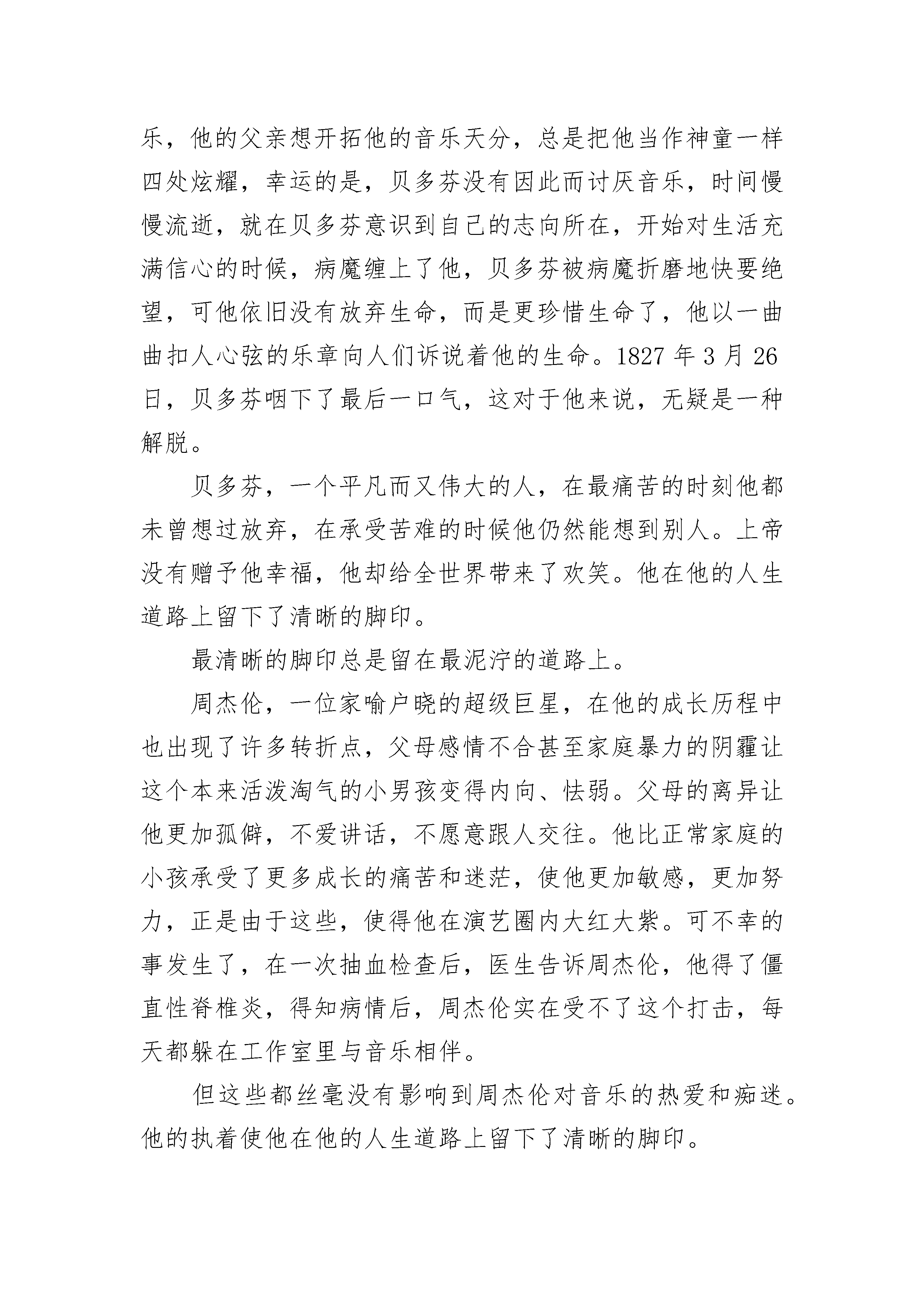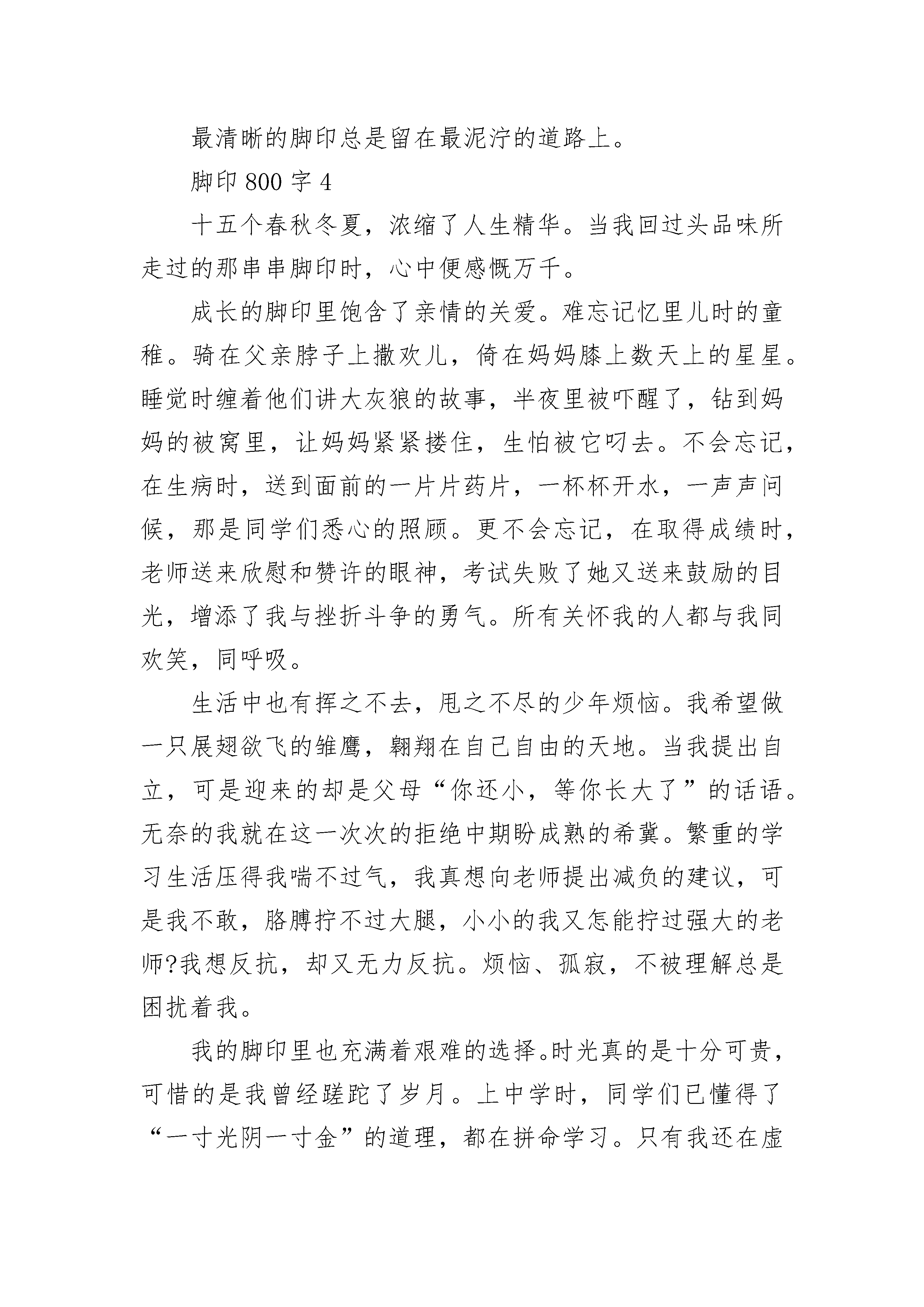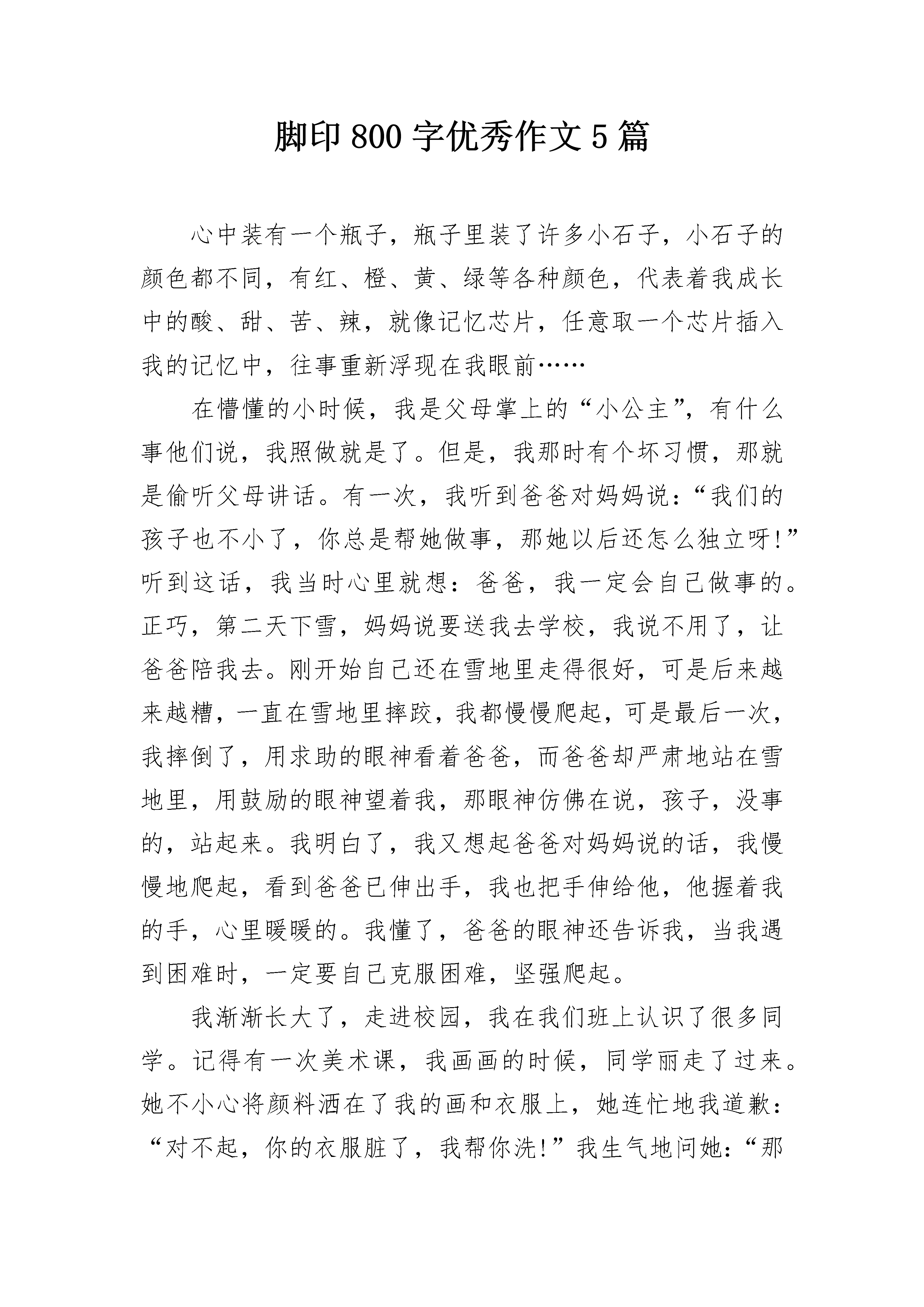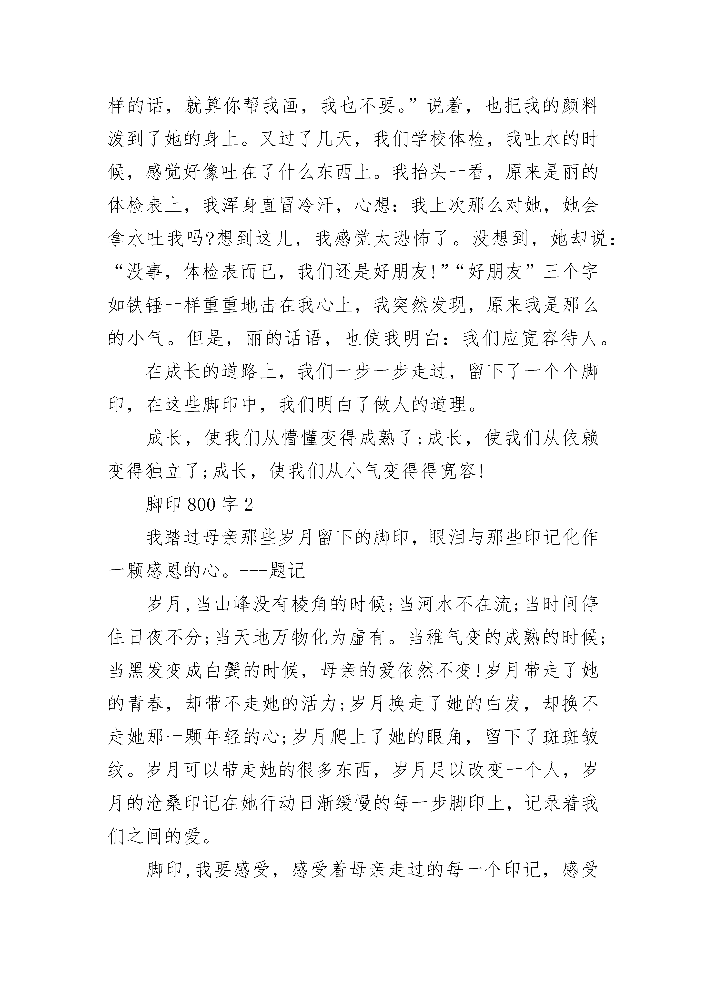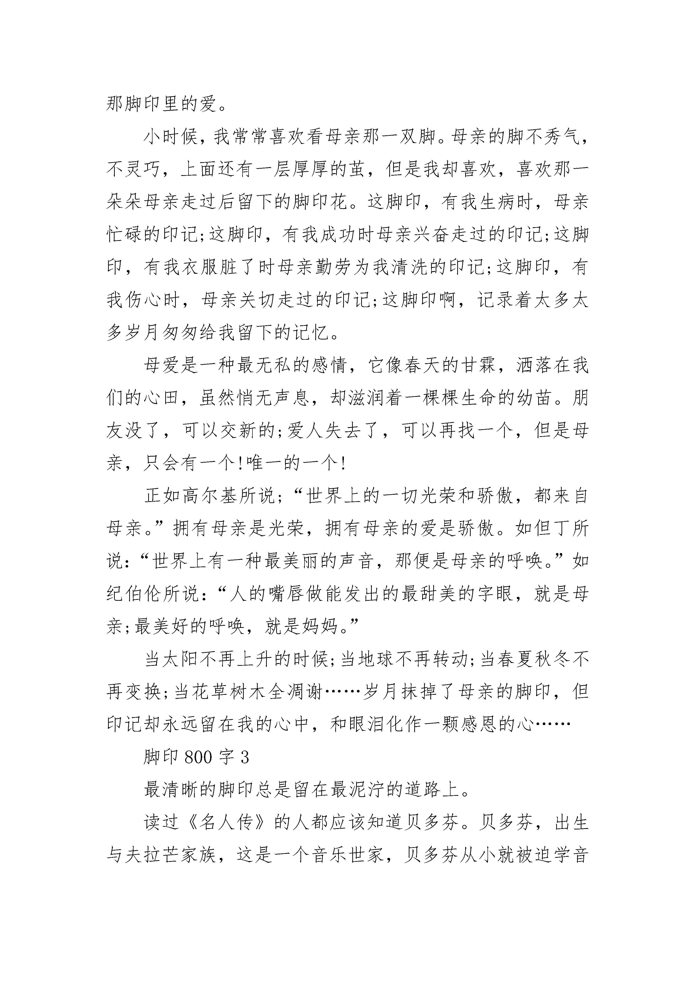 脚印800字优秀作文5篇心中装有一个瓶子,瓶子里装了许多小石子,小石子的颜色都不同,有红、橙、黄、绿等各种颜色,代表着我成长中的酸、甜、苦、辣,就像记忆芯片,任意取一个芯片插入我的记忆中,往事重新浮现在我眼前……在懵懂的小时候,我是父母掌上的“小公主”,有什么事他们说,我照做就是了。但是,我那时有个坏习惯,那就是偷听父母讲话。有一次,我听到爸爸对妈妈说:“我们的孩子也不小了,你总是帮她做事,那她以后还怎么独立呀!”听到这话,我当时心里就想:爸爸,我一定会自己做事的。正巧,第二天下雪,妈妈说要送我去学校,我说不用了,让爸爸陪我去。刚开始自己还在雪地里走得很好,可是后来越来越糟,一直在雪地里摔跤,我都慢慢爬起,可是最后一次,我摔倒了,用求助的眼神看着爸爸,而爸爸却严肃地站在雪地里,用鼓励的眼神望着我,那眼神仿佛在说,孩子,没事的,站起来。我明白了,我又想起爸爸对妈妈说的话,我慢慢地爬起,看到爸爸已伸出手,我也把手伸给他,他握着我的手,心里暖暖的。我懂了,爸爸的眼神还告诉我,当我遇到困难时,一定要自己克服困难,坚强爬起。我渐渐长大了,走进校园,我在我们班上认识了很多同学。记得有一次美术课,我画画的时候,同学丽走了过来。她不小心将颜料洒在了我的画和衣服上,她连忙地我道歉:“对不起,你的衣服脏了,我帮你洗!”我生气地问她:“那样的话,就算你帮我画,我也不要。”说着,也把我的颜料泼到了她的身上。又过了几天,我们学校体检,我吐水的时候,感觉好像吐在了什么东西上。我抬头一看,原来是丽的体检表上,我浑身直冒冷汗,心想:我上次那么对她,她会拿水吐我吗?想到这儿,我感觉太恐怖了。没想到,她却说:“没事,体检表而已,我们还是好朋友!”“好朋友”三个字如铁锤一样重重地击在我心上,我突然发现,原来我是那么的小气。但是,丽的话语,也使我明白:我们应宽容待人。在成长的道路上,我们一步一步走过,留下了一个个脚印,在这些脚印中,我们明白了做人的道理。成长,使我们从懵懂变得成熟了;成长,使我们从依赖变得独立了;成长,使我们从小气变得得宽容!脚印800字2我踏过母亲那些岁月留下的脚印,眼泪与那些印记化作一颗感恩的心。---题记岁月,当山峰没有棱角的时候;当河水不在流;当时间停住日夜不分;当天地万物化为虚有。当稚气变的成熟的时候;当黑发变成白鬓的时候,母亲的爱依然不变!岁月带走了她的青春,却带不走她的活力;岁月换走了她的白发,却换不走她那一颗年轻的心;岁月爬上了她的眼角,留下了斑斑皱纹。岁月可以带走她的很多东西,岁月足以改变一个人,岁月的沧桑印记在她行动日渐缓慢的每一步脚印上,记录着我们之间的爱。脚印,我要感受,感受着母亲走过的每一个印记,感受那脚印里的爱。小时候,我常常喜欢看母亲那一双脚。母亲的脚不秀气,不灵巧,上面还有一层厚厚的茧,但是我却喜欢,喜欢那一朵朵母亲走过后留下的脚印花。这脚印,有我生病时,母亲忙碌的印记;这脚印,有我成功时母亲兴奋走过的印记;这脚印,有我衣服脏了时母亲勤劳为我清洗的印记;这脚印,有我伤心时,母亲关切走过的印记;这脚印啊,记录着太多太多岁月匆匆给我留下的记忆。母爱是一种最无私的感情,它像春天的甘霖,洒落在我们的心田,虽然悄无声息,却滋润着一棵棵生命的幼苗。朋友没了,可以交新的;爱人失去了,可以再找一个,但是母亲,只会有一个!唯一的一个!正如高尔基所说;“世界上的一切光荣和骄傲,都来自母亲。”拥有母亲是光荣,拥有母亲的爱是骄傲。如但丁所说:“世界上有一种最美丽的声音,那便是母亲的呼唤。”如纪伯伦所说:“人的嘴唇做能发出的最甜美的字眼,就是母亲;最美好的呼唤,就是妈妈。”当太阳不再上升的时候;当地球不再转动;当春夏秋冬不再变换;当花草树木全凋谢……岁月抹掉了母亲的脚印,但印记却永远留在我的心中,和眼泪化作一颗感恩的心……脚印800字3最清晰的脚印总是留在最泥泞的道路上。读过《名人传》的人都应该知道贝多芬。贝多芬,出生与夫拉芒家族,这是一个音乐世家,贝多芬从小就被迫学音乐,他的父亲想开拓他的音乐天分,总是把他当作神童一样四处炫耀,幸运的是,贝多芬没有因此而讨厌音乐,时间慢慢流逝,就在贝多芬意识到自己的志向所在,开始对生活充满信心的时候,病魔缠上了他,贝多芬被病魔折磨地快要绝望,可他依旧没有放弃生命,而是更珍惜生命了,他以一曲曲扣人心弦的乐章向人们诉说着他的生命。1827年3月26日,贝多芬咽下了最后一口气,这对于他来说,无疑是一种解脱。贝多芬,一个平凡而又伟大的人,在最痛苦的时刻他都未曾想过放弃,在承受苦难的时候他仍然能想到别人。上帝没有赠予他幸福,他却给全世界带来了欢笑。他在他的人生道路上留下了清晰的脚印。最清晰的脚印总是留在最泥泞的道路上。周杰伦,一位家喻户晓的超级巨星,在他的成长历程中也出现了许多转折点,父母感情不合甚至家庭暴力的阴霾