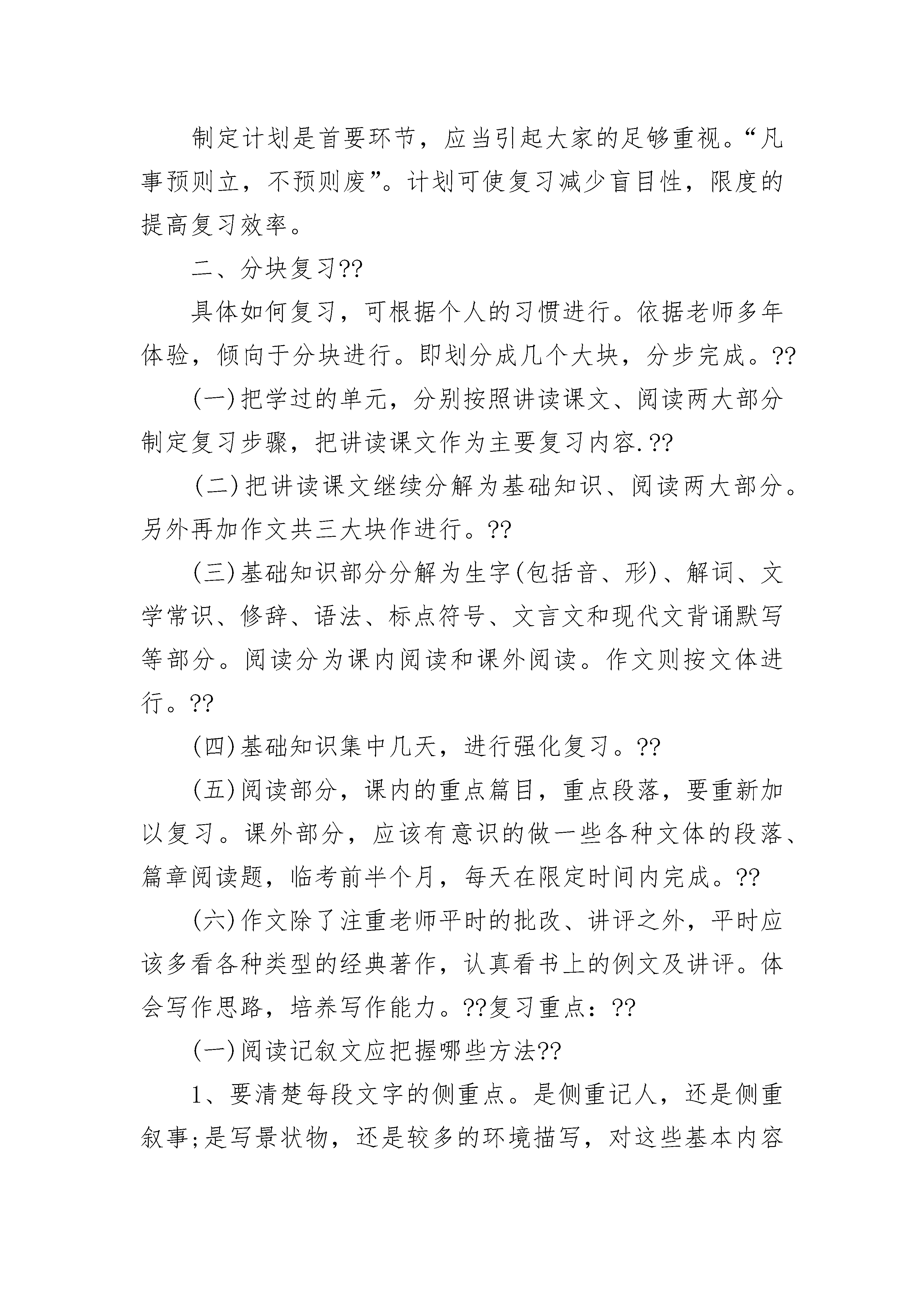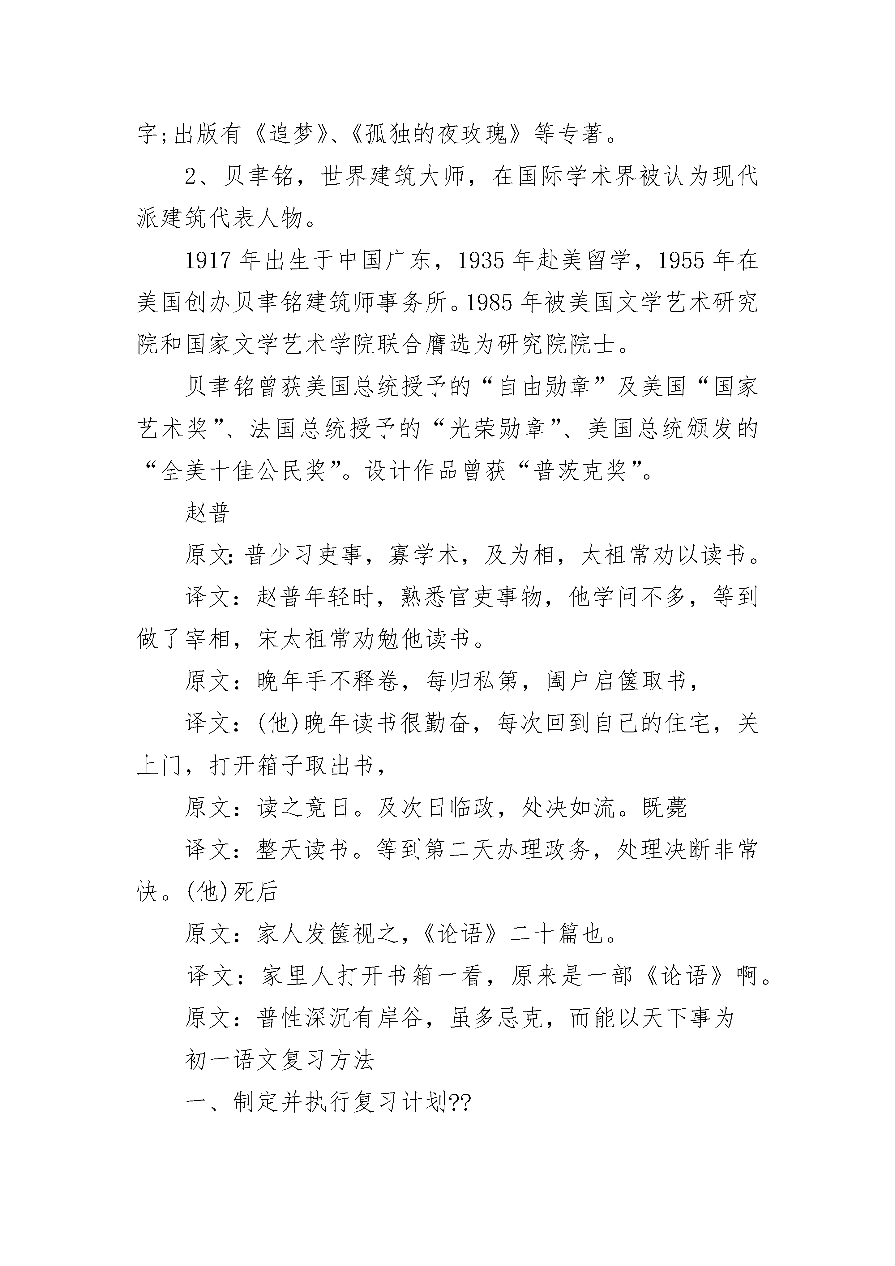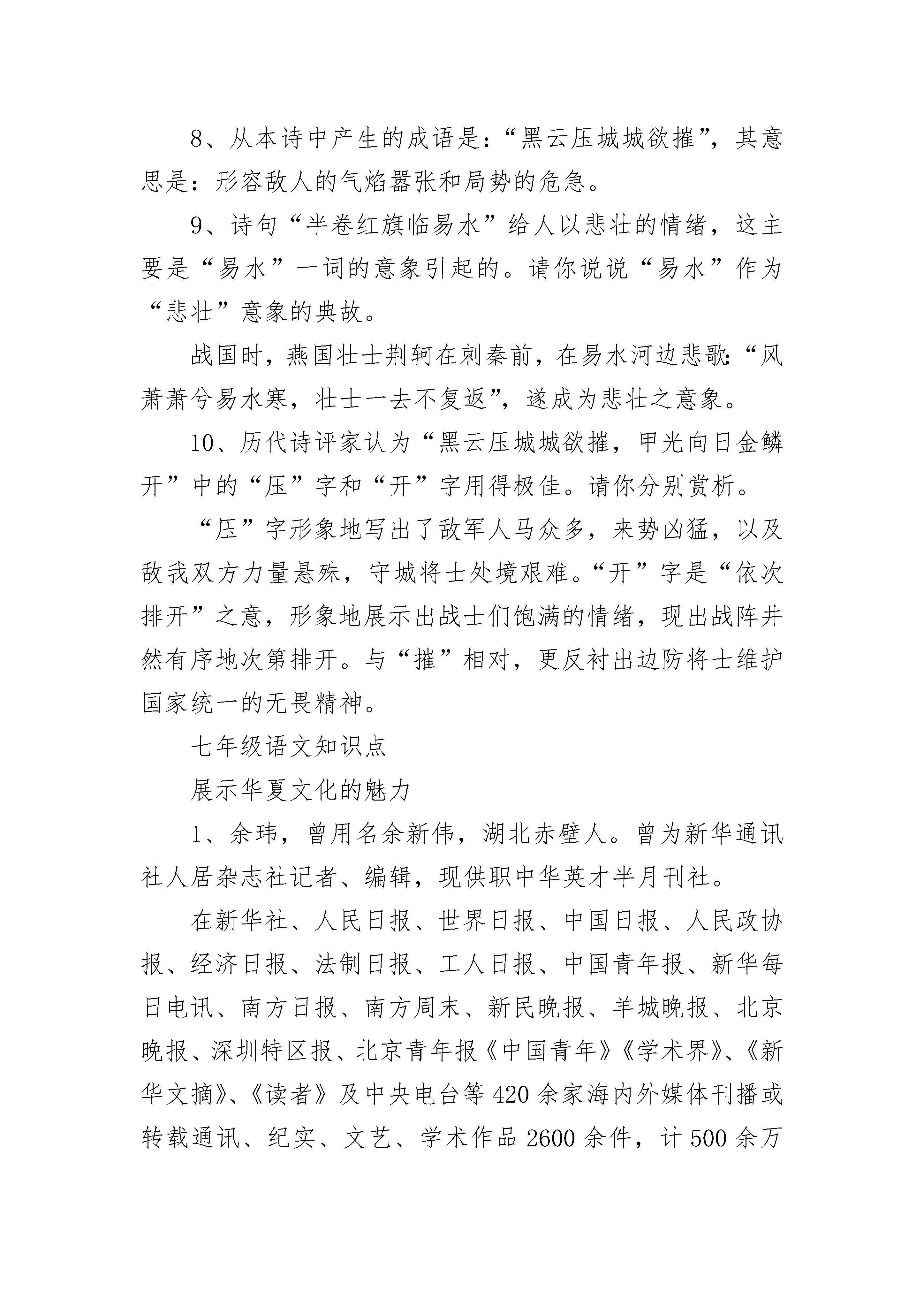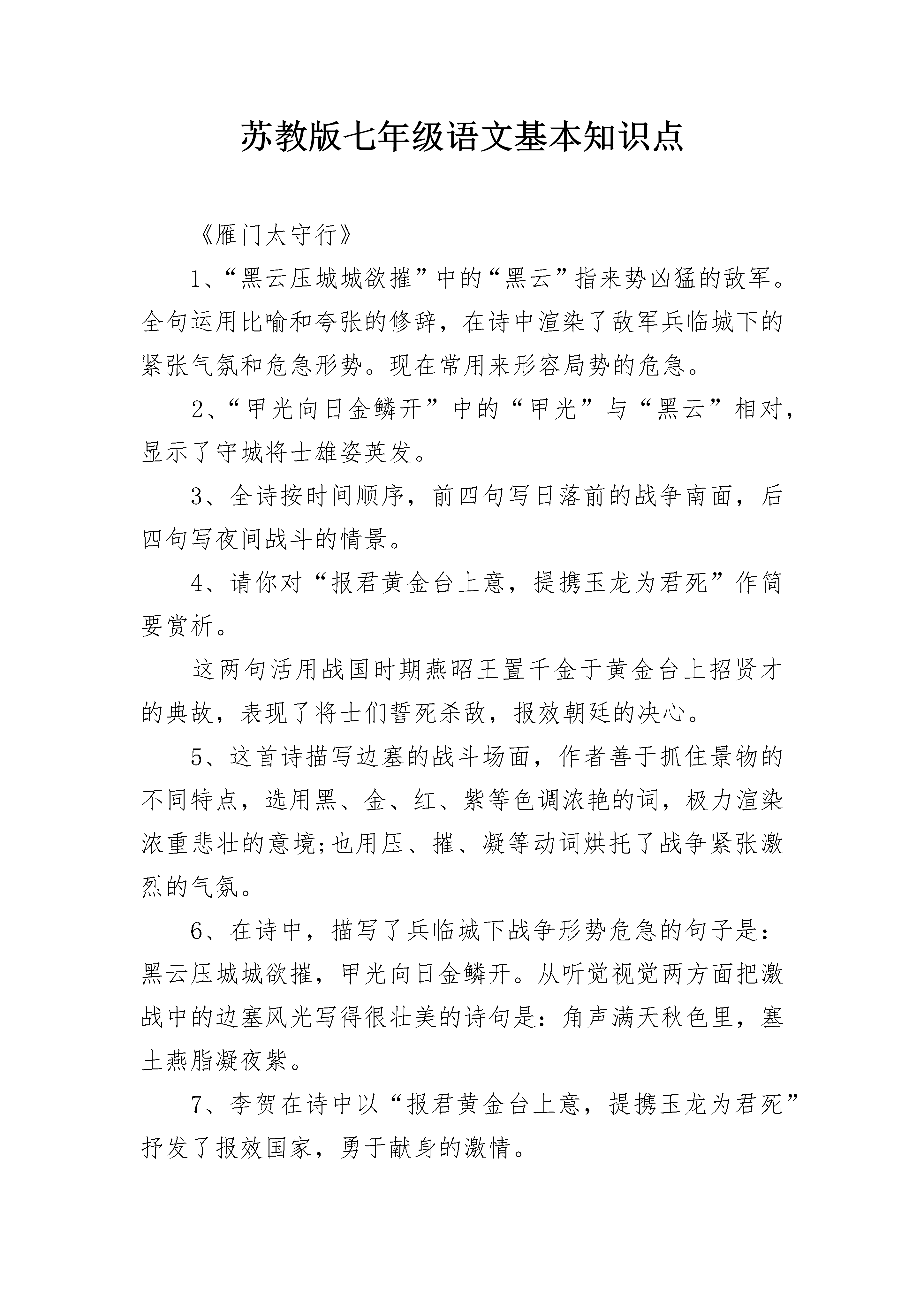 苏教版七年级语文基本知识点《雁门太守行》1、“黑云压城城欲摧”中的“黑云”指来势凶猛的敌军。全句运用比喻和夸张的修辞,在诗中渲染了敌军兵临城下的紧张气氛和危急形势。现在常用来形容局势的危急。2、“甲光向日金鳞开”中的“甲光”与“黑云”相对,显示了守城将士雄姿英发。3、全诗按时间顺序,前四句写日落前的战争南面,后四句写夜间战斗的情景。4、请你对“报君黄金台上意,提携玉龙为君死”作简要赏析。这两句活用战国时期燕昭王置千金于黄金台上招贤才的典故,表现了将士们誓死杀敌,报效朝廷的决心。5、这首诗描写边塞的战斗场面,作者善于抓住景物的不同特点,选用黑、金、红、紫等色调浓艳的词,极力渲染浓重悲壮的意境;也用压、摧、凝等动词烘托了战争紧张激烈的气氛。6、在诗中,描写了兵临城下战争形势危急的句子是:黑云压城城欲摧,甲光向日金鳞开。从听觉视觉两方面把激战中的边塞风光写得很壮美的诗句是:角声满天秋色里,塞土燕脂凝夜紫。7、李贺在诗中以“报君黄金台上意,提携玉龙为君死”抒发了报效国家,勇于献身的激情。8、从本诗中产生的成语是:“黑云压城城欲摧”,其意思是:形容敌人的气焰嚣张和局势的危急。9、诗句“半卷红旗临易水”给人以悲壮的情绪,这主要是“易水”一词的意象引起的。请你说说“易水”作为“悲壮”意象的典故。战国时,燕国壮士荆轲在刺秦前,在易水河边悲歌:“风萧萧兮易水寒,壮士一去不复返”,遂成为悲壮之意象。10、历代诗评家认为“黑云压城城欲摧,甲光向日金鳞开”中的“压”字和“开”字用得极佳。请你分别赏析。“压”字形象地写出了敌军人马众多,来势凶猛,以及敌我双方力量悬殊,守城将士处境艰难。“开”字是“依次排开”之意,形象地展示出战士们饱满的情绪,现出战阵井然有序地次第排开。与“摧”相对,更反衬出边防将士维护国家统一的无畏精神。七年级语文知识点展示华夏文化的魅力1、余玮,曾用名余新伟,湖北赤壁人。曾为新华通讯社人居杂志社记者、编辑,现供职中华英才半月刊社。在新华社、人民日报、世界日报、中国日报、人民政协报、经济日报、法制日报、工人日报、中国青年报、新华每日电讯、南方日报、南方周末、新民晚报、羊城晚报、北京晚报、深圳特区报、北京青年报《中国青年》《学术界》、《新华文摘》、《读者》及中央电台等420余家海内外媒体刊播或转载通讯、纪实、文艺、学术作品2600余件,计500余万字;出版有《追梦》、《孤独的夜玫瑰》等专著。2、贝聿铭,世界建筑大师,在国际学术界被认为现代派建筑代表人物。1917年出生于中国广东,1935年赴美留学,1955年在美国创办贝聿铭建筑师事务所。1985年被美国文学艺术研究院和国家文学艺术学院联合膺选为研究院院士。贝聿铭曾获美国总统授予的“自由勋章”及美国“国家艺术奖”、法国总统授予的“光荣勋章”、美国总统颁发的“全美十佳公民奖”。设计作品曾获“普茨克奖”。赵普原文:普少习吏事,寡学术,及为相,太祖常劝以读书。译文:赵普年轻时,熟悉官吏事物,他学问不多,等到做了宰相,宋太祖常劝勉他读书。原文:晚年手不释卷,每归私第,阖户启箧取书,译文:(他)晚年读书很勤奋,每次回到自己的住宅,关上门,打开箱子取出书,原文:读之竟日。及次日临政,处决如流。既薨译文:整天读书。等到第二天办理政务,处理决断非常快。(他)死后原文:家人发箧视之,《论语》二十篇也。译文:家里人打开书箱一看,原来是一部《论语》啊。原文:普性深沉有岸谷,虽多忌克,而能以天下事为初一语文复习方法一、制定并执行复习计划??制定计划是首要环节,应当引起大家的足够重视。“凡事预则立,不预则废”。计划可使复习减少盲目性,限度的提高复习效率。二、分块复习??具体如何复习,可根据个人的习惯进行。依据老师多年体验,倾向于分块进行。即划分成几个大块,分步完成。??(一)把学过的单元,分别按照讲读课文、阅读两大部分制定复习步骤,把讲读课文作为主要复习内容.??(二)把讲读课文继续分解为基础知识、阅读两大部分。另外再加作文共三大块作进行。??(三)基础知识部分分解为生字(包括音、形)、解词、文学常识、修辞、语法、标点符号、文言文和现代文背诵默写等部分。阅读分为课内阅读和课外阅读。作文则按文体进行。??(四)基础知识集中几天,进行强化复习。??(五)阅读部分,课内的重点篇目,重点段落,要重新加以复习。课外部分,应该有意识的做一些各种文体的段落、篇章阅读题,临考前半个月,每天在限定时间内完成。??(六)作文除了注重老师平时的批改、讲评之外,平时应该多看各种类型的经典著作,认真看书上的例文及讲评。体会写作思路,培养写作能力。??复习重点:??(一)阅读记叙文应把握哪些方法??1、要清楚每段文字的侧重点。是侧重记人,还是侧重叙事;是写景状物,还是较多的环境描写,对这些基本内容有正确的判断。??2、要清楚地知道记叙的