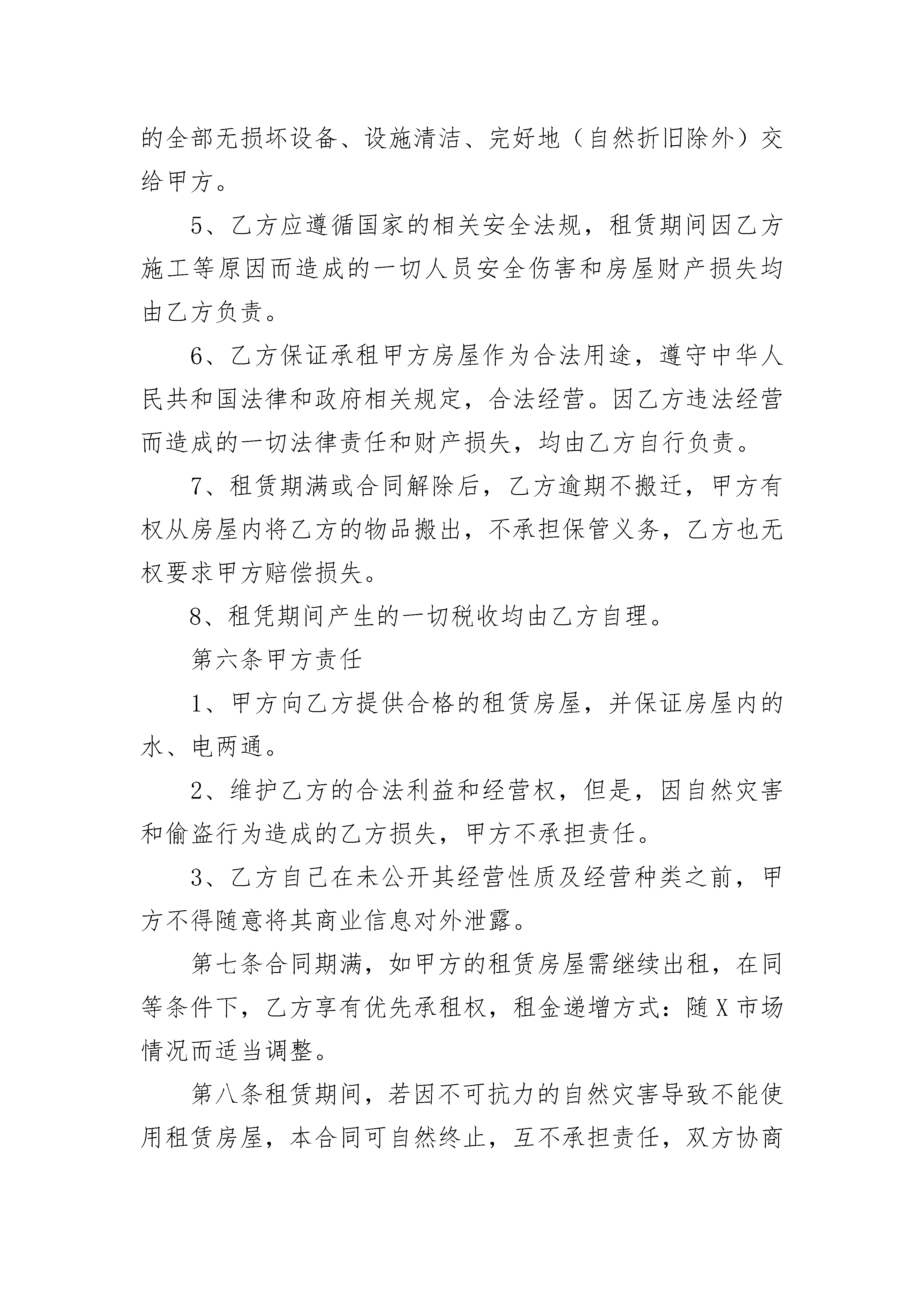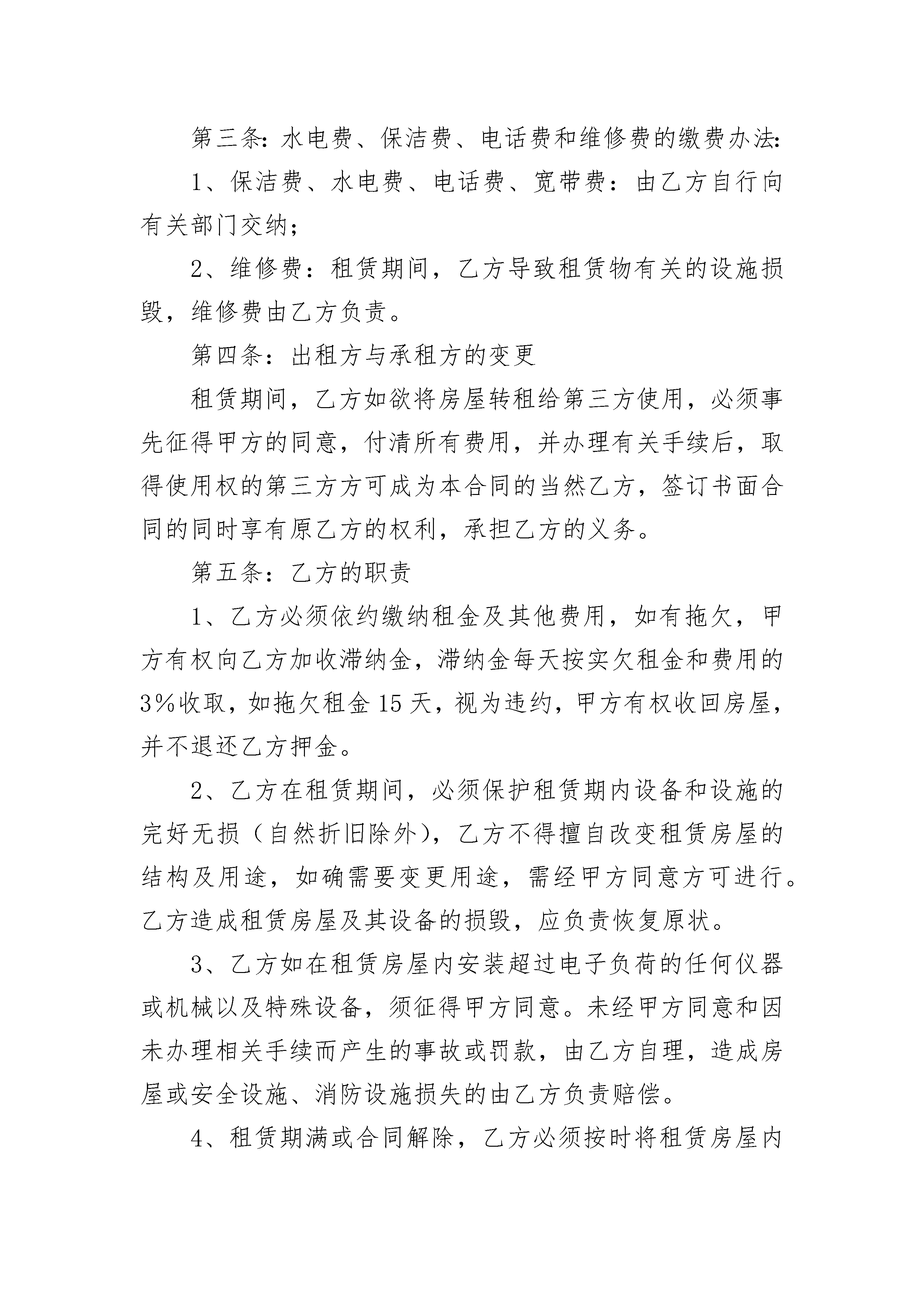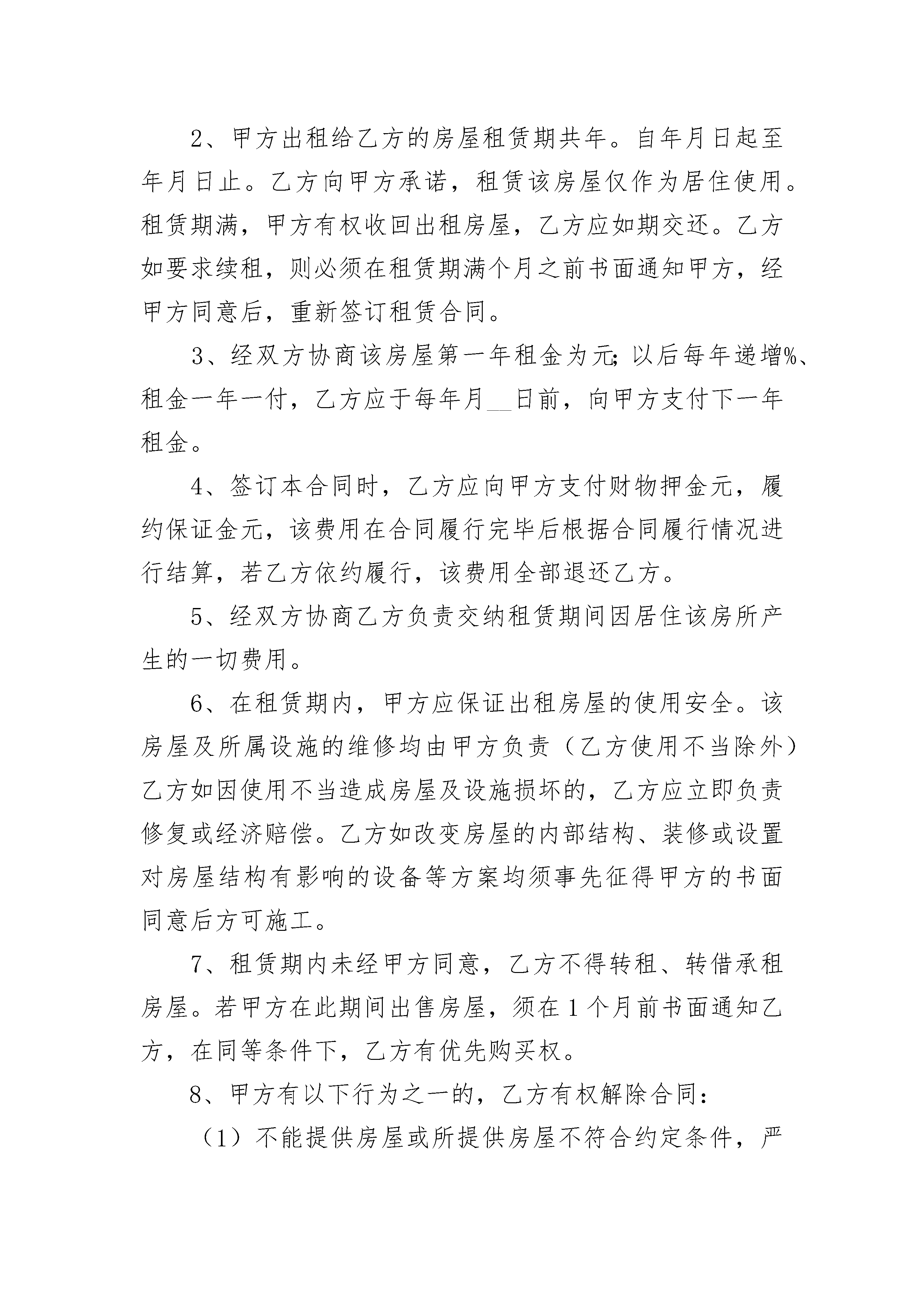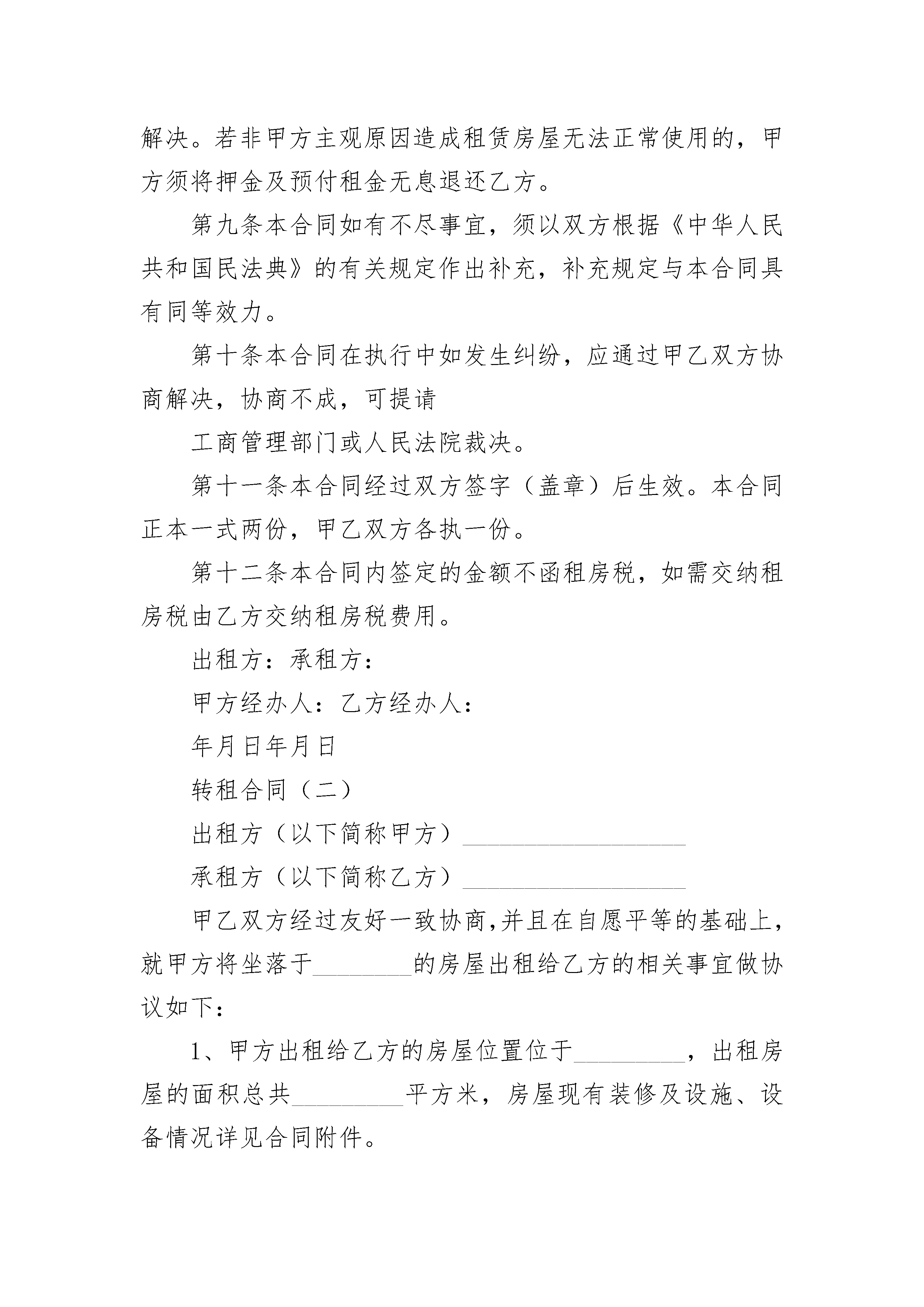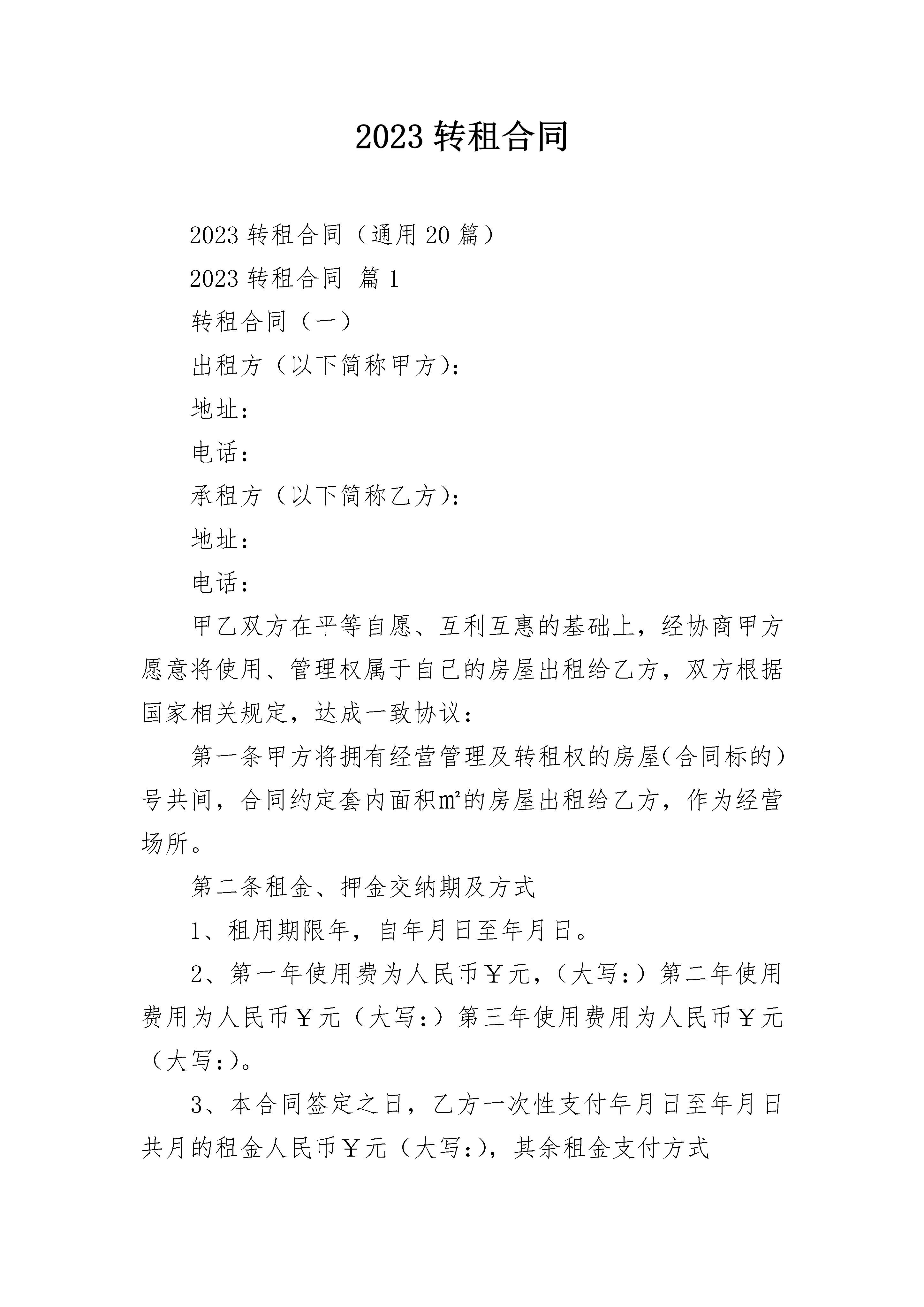 2023转租合同2023转租合同(通用20篇)2023转租合同篇1转租合同(一)出租方(以下简称甲方):地址:电话:承租方(以下简称乙方):地址:电话:甲乙双方在平等自愿、互利互惠的基础上,经协商甲方愿意将使用、管理权属于自己的房屋出租给乙方,双方根据国家相关规定,达成一致协议:第一条甲方将拥有经营管理及转租权的房屋(合同标的)号共间,合同约定套内面积㎡的房屋出租给乙方,作为经营场所。第二条租金、押金交纳期及方式1、租用期限年,自年月日至年月日。2、第一年使用费为人民币¥元,(大写:)第二年使用费用为人民币¥元(大写:)第三年使用费用为人民币¥元(大写:)。3、本合同签定之日,乙方一次性支付年月日至年月日共月的租金人民币¥元(大写:),其余租金支付方式第三条:水电费、保洁费、电话费和维修费的缴费办法:1、保洁费、水电费、电话费、宽带费:由乙方自行向有关部门交纳;2、维修费:租赁期间,乙方导致租赁物有关的设施损毁,维修费由乙方负责。第四条:出租方与承租方的变更租赁期间,乙方如欲将房屋转租给第三方使用,必须事先征得甲方的同意,付清所有费用,并办理有关手续后,取得使用权的第三方方可成为本合同的当然乙方,签订书面合同的同时享有原乙方的权利,承担乙方的义务。第五条:乙方的职责1、乙方必须依约缴纳租金及其他费用,如有拖欠,甲方有权向乙方加收滞纳金,滞纳金每天按实欠租金和费用的3%收取,如拖欠租金15天,视为违约,甲方有权收回房屋,并不退还乙方押金。2、乙方在租赁期间,必须保护租赁期内设备和设施的完好无损(自然折旧除外),乙方不得擅自改变租赁房屋的结构及用途,如确需要变更用途,需经甲方同意方可进行。乙方造成租赁房屋及其设备的损毁,应负责恢复原状。3、乙方如在租赁房屋内安装超过电子负荷的任何仪器或机械以及特殊设备,须征得甲方同意。未经甲方同意和因未办理相关手续而产生的事故或罚款,由乙方自理,造成房屋或安全设施、消防设施损失的由乙方负责赔偿。4、租赁期满或合同解除,乙方必须按时将租赁房屋内的全部无损坏设备、设施清洁、完好地(自然折旧除外)交给甲方。5、乙方应遵循国家的相关安全法规,租赁期间因乙方施工等原因而造成的一切人员安全伤害和房屋财产损失均由乙方负责。6、乙方保证承租甲方房屋作为合法用途,遵守中华人民共和国法律和政府相关规定,合法经营。因乙方违法经营而造成的一切法律责任和财产损失,均由乙方自行负责。7、租赁期满或合同解除后,乙方逾期不搬迁,甲方有权从房屋内将乙方的物品搬出,不承担保管义务,乙方也无权要求甲方赔偿损失。8、租凭期间产生的一切税收均由乙方自理。第六条甲方责任1、甲方向乙方提供合格的租赁房屋,并保证房屋内的水、电两通。2、维护乙方的合法利益和经营权,但是,因自然灾害和偷盗行为造成的乙方损失,甲方不承担责任。3、乙方自己在未公开其经营性质及经营种类之前,甲方不得随意将其商业信息对外泄露。第七条合同期满,如甲方的租赁房屋需继续出租,在同等条件下,乙方享有优先承租权,租金递增方式:随X市场情况而适当调整。第八条租赁期间,若因不可抗力的自然灾害导致不能使用租赁房屋,本合同可自然终止,互不承担责任,双方协商解决。若非甲方主观原因造成租赁房屋无法正常使用的,甲方须将押金及预付租金无息退还乙方。第九条本合同如有不尽事宜,须以双方根据《中华人民共和国民法典》的有关规定作出补充,补充规定与本合同具有同等效力。第十条本合同在执行中如发生纠纷,应通过甲乙双方协商解决,协商不成,可提请工商管理部门或人民法院裁决。第十一条本合同经过双方签字(盖章)后生效。本合同正本一式两份,甲乙双方各执一份。第十二条本合同内签定的金额不函租房税,如需交纳租房税由乙方交纳租房税费用。出租方:承租方:甲方经办人:乙方经办人:年月日年月日转租合同(二)出租方(以下简称甲方)__________________承租方(以下简称乙方)__________________甲乙双方经过友好一致协商,并且在自愿平等的基础上,就甲方将坐落于________的房屋出租给乙方的相关事宜做协议如下:1、甲方出租给乙方的房屋位置位于_________,出租房屋的面积总共_________平方米,房屋现有装修及设施、设备情况详见合同附件。2、甲方出租给乙方的房屋租赁期共年。自年月日起至年月日止。乙方向甲方承诺,租赁该房屋仅作为居住使用。租赁期满,甲方有权收回出租房屋,乙方应如期交还。乙方如要求续租,则必须在租赁期满个月之前书面通知甲方,经甲方同意后,重新签订租赁合同。3、经双方协商该房屋第一年租金为元;以后每年递增%、租金一年一付,乙方应于每年月__日前,向甲方支付下一年租金。4、签订本合同时,乙方应向甲方支付财物押金元,履约保证金元,该费用在合同履行完毕后根据合同履行情况进行结算,若乙方依约履