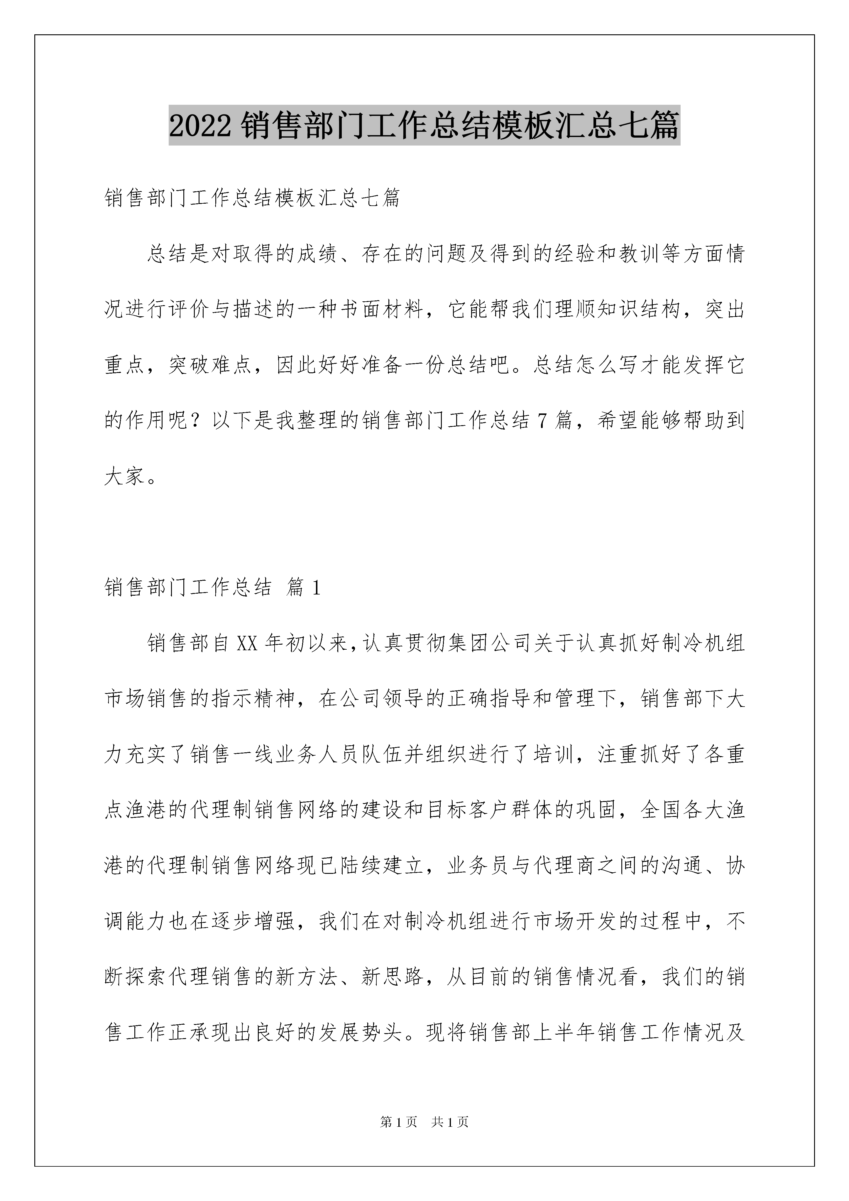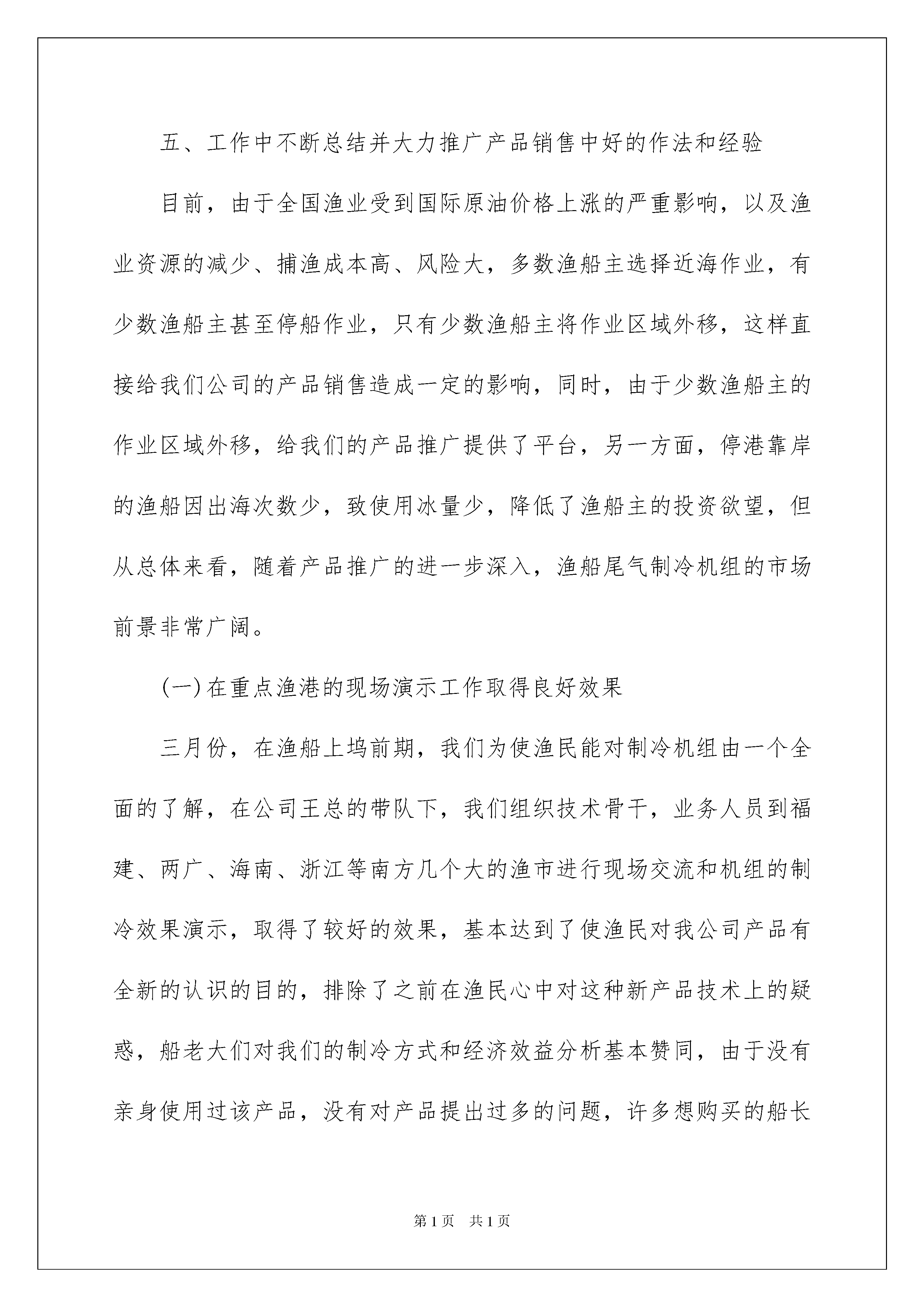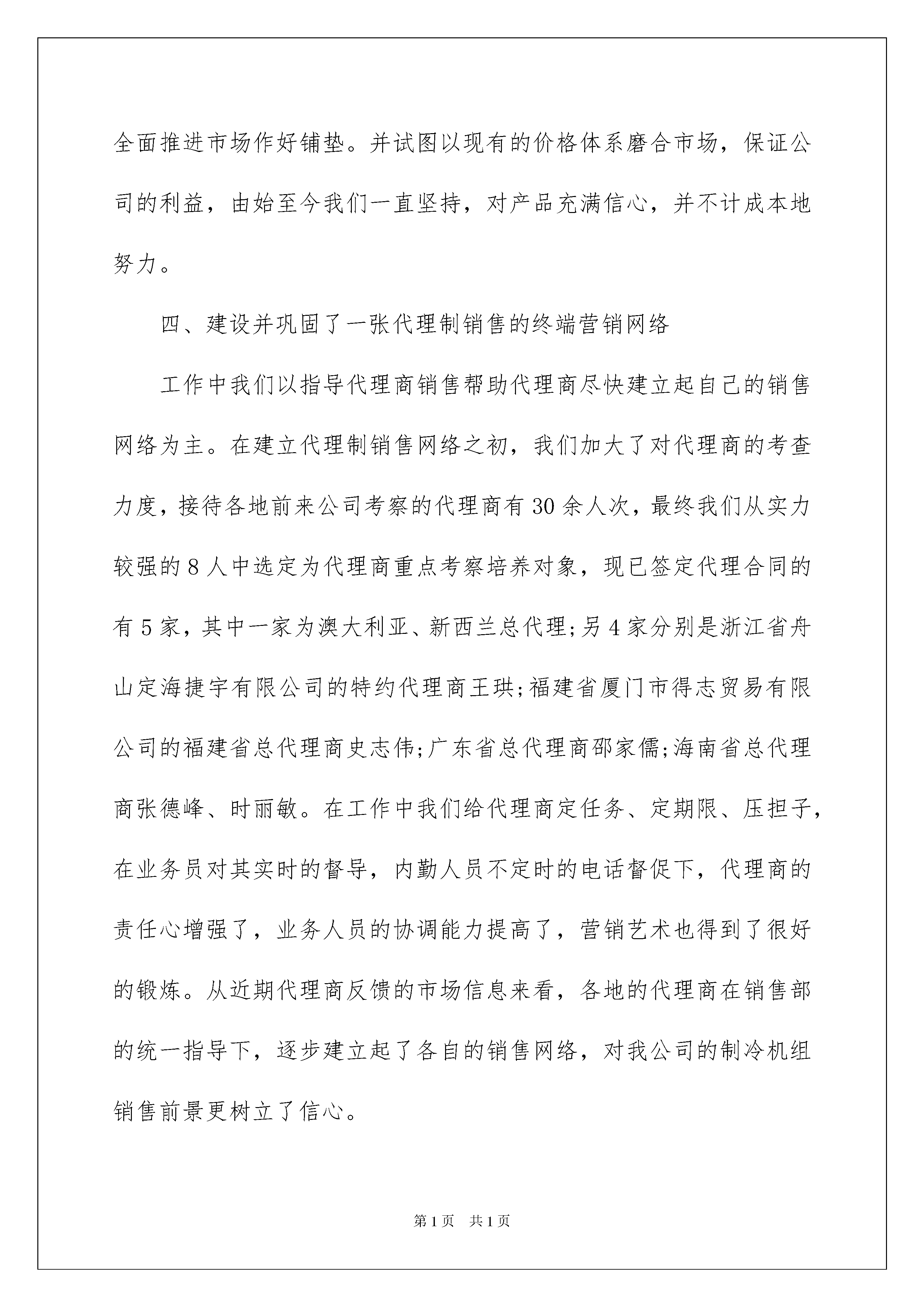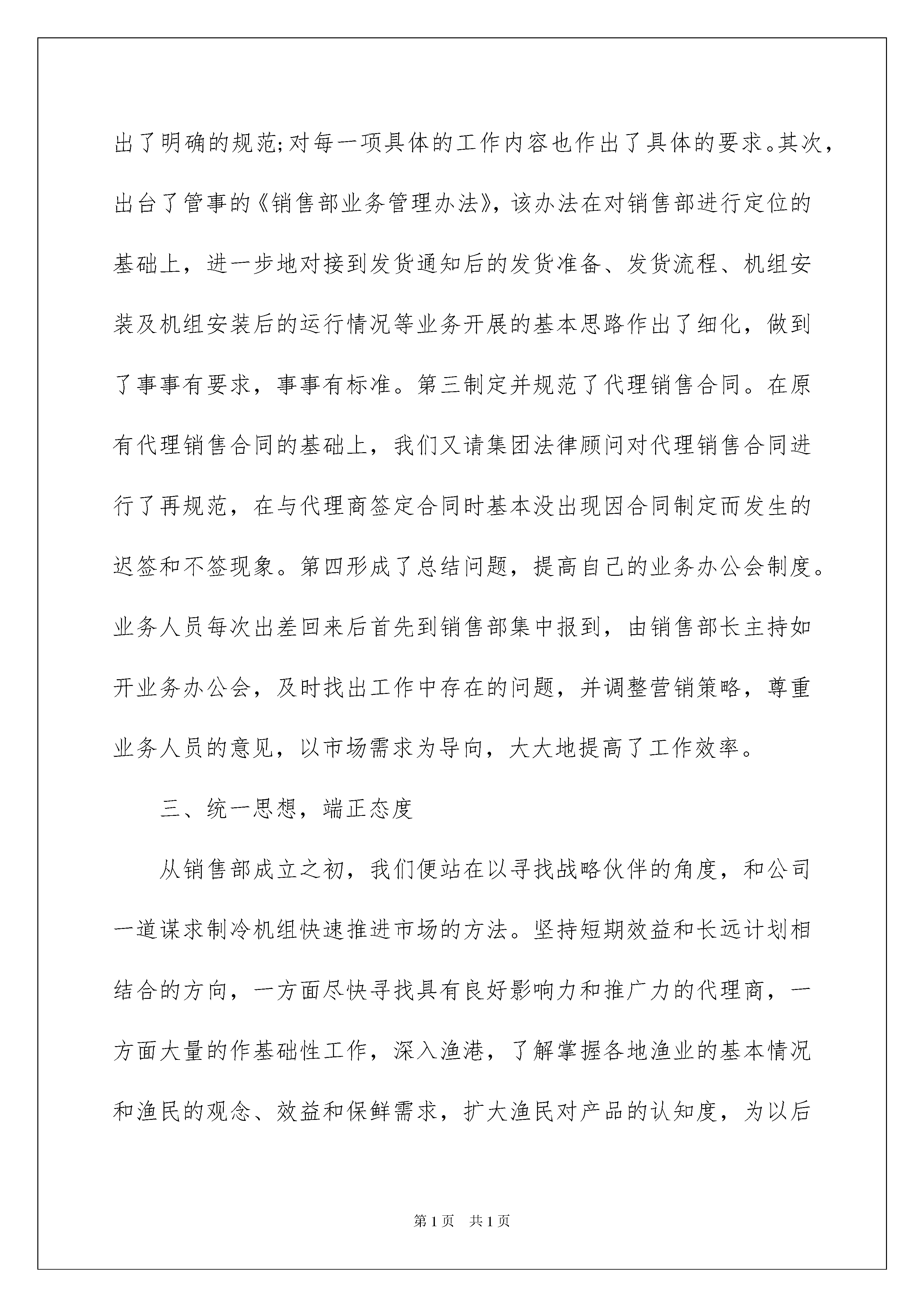 2022销售部门工作总结模板汇总七篇销售部门工作总结模板汇总七篇总结是对取得的成绩、存在的问题及得到的经验和教训等方面情况进行评价与描述的一种书面材料,它能帮我们理顺知识结构,突出重点,突破难点,因此好好准备一份总结吧。总结怎么写才能发挥它的作用呢?以下是我整理的销售部门工作总结7篇,希望能够帮助到大家。销售部门工作总结篇1销售部自XX年初以来,认真贯彻集团公司关于认真抓好制冷机组市场销售的指示精神,在公司领导的正确指导和管理下,销售部下大力充实了销售一线业务人员队伍并组织进行了培训,注重抓好了各重点渔港的代理制销售网络的建设和目标客户群体的巩固,全国各大渔港的代理制销售网络现已陆续建立,业务员与代理商之间的沟通、协调能力也在逐步增强,我们在对制冷机组进行市场开发的过程中,不断探索代理销售的新方法、新思路,从目前的销售情况看,我们的销售工作正承现出良好的发展势头。现将销售部上半年销售工作情况及所存在的问题作一简单的总结,并对销售部下一步工作的开展提几点看法。一、销售部成员组成目前,销售部共有业务人员9人,他们进公司的时间最短的也有3个月,经过公司多次系统地培训后,他们已基本熟悉了制冷机组的技术性能、构造以及代理制销售业务运作的相关流程。对这9名业务人员,我们按业务对象和重点进行了任务区分,在业务人员比较少的情况下,使每名业务员既当终端客户的业务员又当代理商主管,既突出了业务工作的重点,又防止了市场出现空白和漏洞。与此同时,销售部长在统抓全面销售的情况下,不定时的对各个分点进行实地检查督导,与代理商当面沟通,探讨分季节段的制冷机组销售工作,使销售部的工作稳步发展。二、建立了一套系统的业务管理制度和办法我们在总结去年工作的基础上,再加上近半年来的摸索,我们已经初步地建立了一套适合于代理商销售队伍及业务开展的管理办法,各项办法正在试运行之中。首先制定了管人的《销售部业务人员考核办法》,对业务人员的考勤办法及每天的工作重点和建立的客户对象作出了明确的规范;对每一项具体的工作内容也作出了具体的要求。其次,出台了管事的《销售部业务管理办法》,该办法在对销售部进行定位的基础上,进一步地对接到发货通知后的发货准备、发货流程、机组安装及机组安装后的运行情况等业务开展的基本思路作出了细化,做到了事事有要求,事事有标准。第三制定并规范了代理销售合同。在原有代理销售合同的基础上,我们又请集团法律顾问对代理销售合同进行了再规范,在与代理商签定合同时基本没出现因合同制定而发生的迟签和不签现象。第四形成了总结问题,提高自己的业务办公会制度。业务人员每次出差回来后首先到销售部集中报到,由销售部长主持如开业务办公会,及时找出工作中存在的问题,并调整营销策略,尊重业务人员的意见,以市场需求为导向,大大地提高了工作效率。三、统一思想,端正态度从销售部成立之初,我们便站在以寻找战略伙伴的角度,和公司一道谋求制冷机组快速推进市场的方法。坚持短期效益和长远计划相结合的方向,一方面尽快寻找具有良好影响力和推广力的代理商,一方面大量的作基础性工作,深入渔港,了解掌握各地渔业的基本情况和渔民的观念、效益和保鲜需求,扩大渔民对产品的认知度,为以后全面推进市场作好铺垫。并试图以现有的价格体系磨合市场,保证公司的利益,由始至今我们一直坚持,对产品充满信心,并不计成本地努力。四、建设并巩固了一张代理制销售的终端营销网络工作中我们以指导代理商销售帮助代理商尽快建立起自己的销售网络为主。在建立代理制销售网络之初,我们加大了对代理商的考查力度,接待各地前来公司考察的代理商有30余人次,最终我们从实力较强的8人中选定为代理商重点考察培养对象,现已签定代理合同的有5家,其中一家为澳大利亚、新西兰总代理;另4家分别是浙江省舟山定海捷宇有限公司的特约代理商王珙;福建省厦门市得志贸易有限公司的福建省总代理商史志伟;广东省总代理商邵家儒;海南省总代理商张德峰、时丽敏。在工作中我们给代理商定任务、定期限、压担子,在业务员对其实时的督导,内勤人员不定时的电话督促下,代理商的责任心增强了,业务人员的协调能力提高了,营销艺术也得到了很好的锻炼。从近期代理商反馈的市场信息来看,各地的代理商在销售部的统一指导下,逐步建立起了各自的销售网络,对我公司的制冷机组销售前景更树立了信心。五、工作中不断总结并大力推广产品销售中好的作法和经验目前,由于全国渔业受到国际原油价格上涨的严重影响,以及渔业资源的减少、捕渔成本高、风险大,多数渔船主选择近海作业,有少数渔船主甚至停船作业,只有少数渔船主将作业区域外移,这样直接给我们公司的产品销售造成一定的影响,同时,由于少数渔船